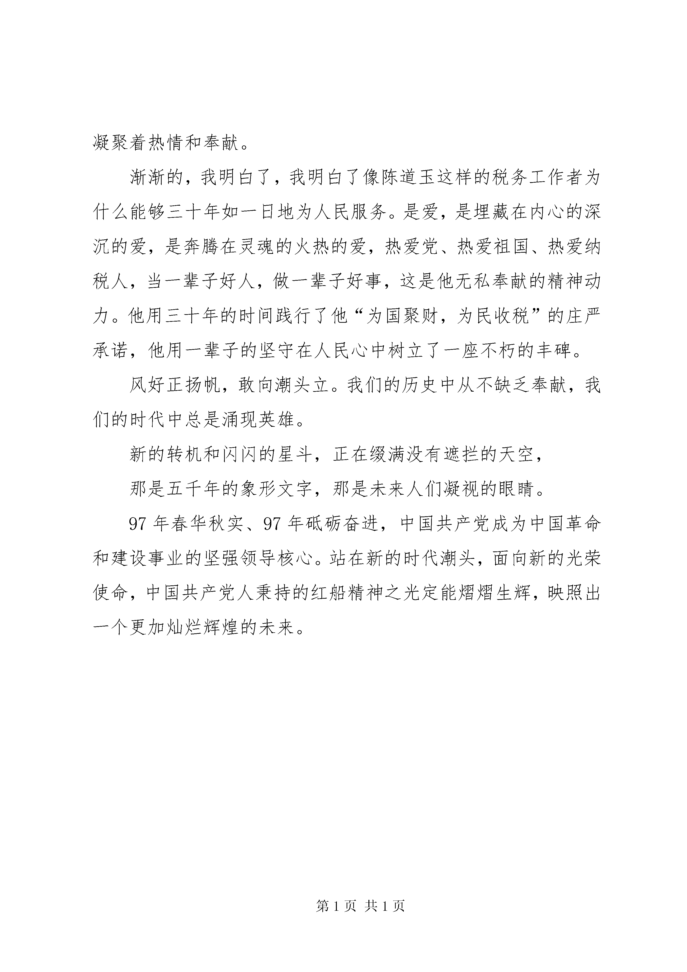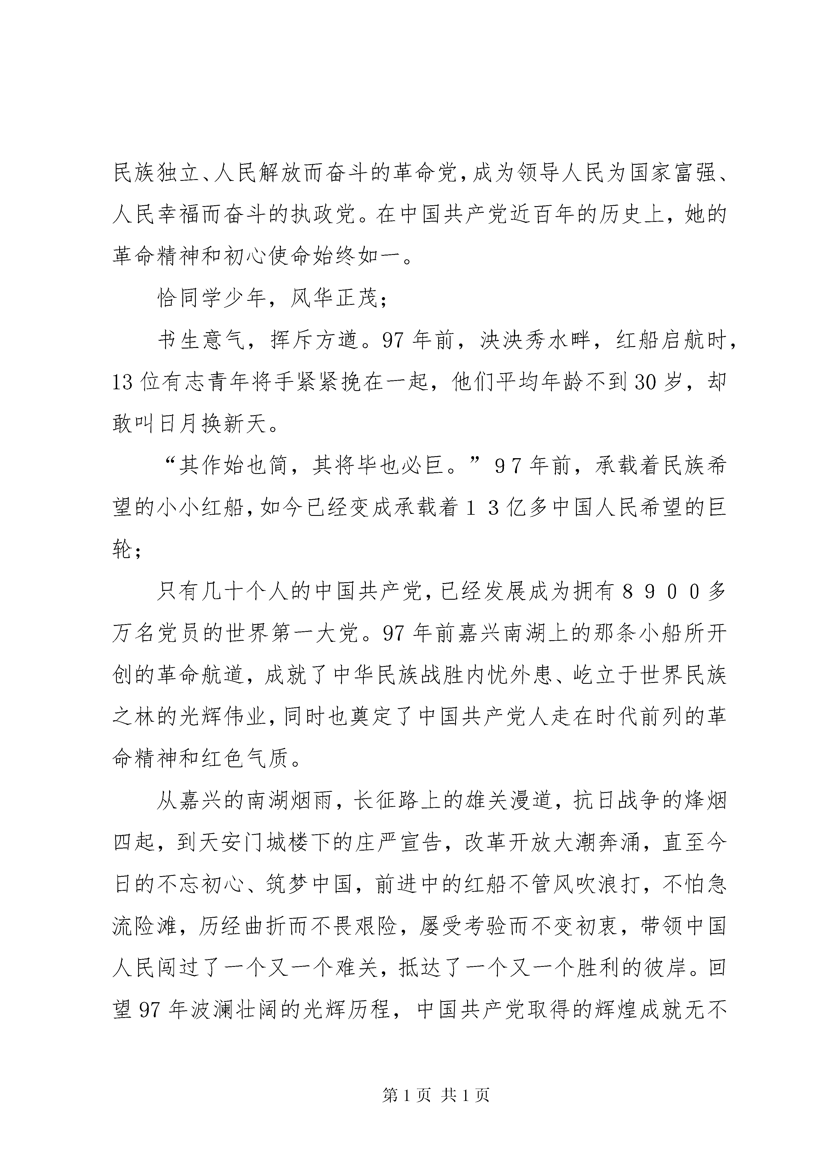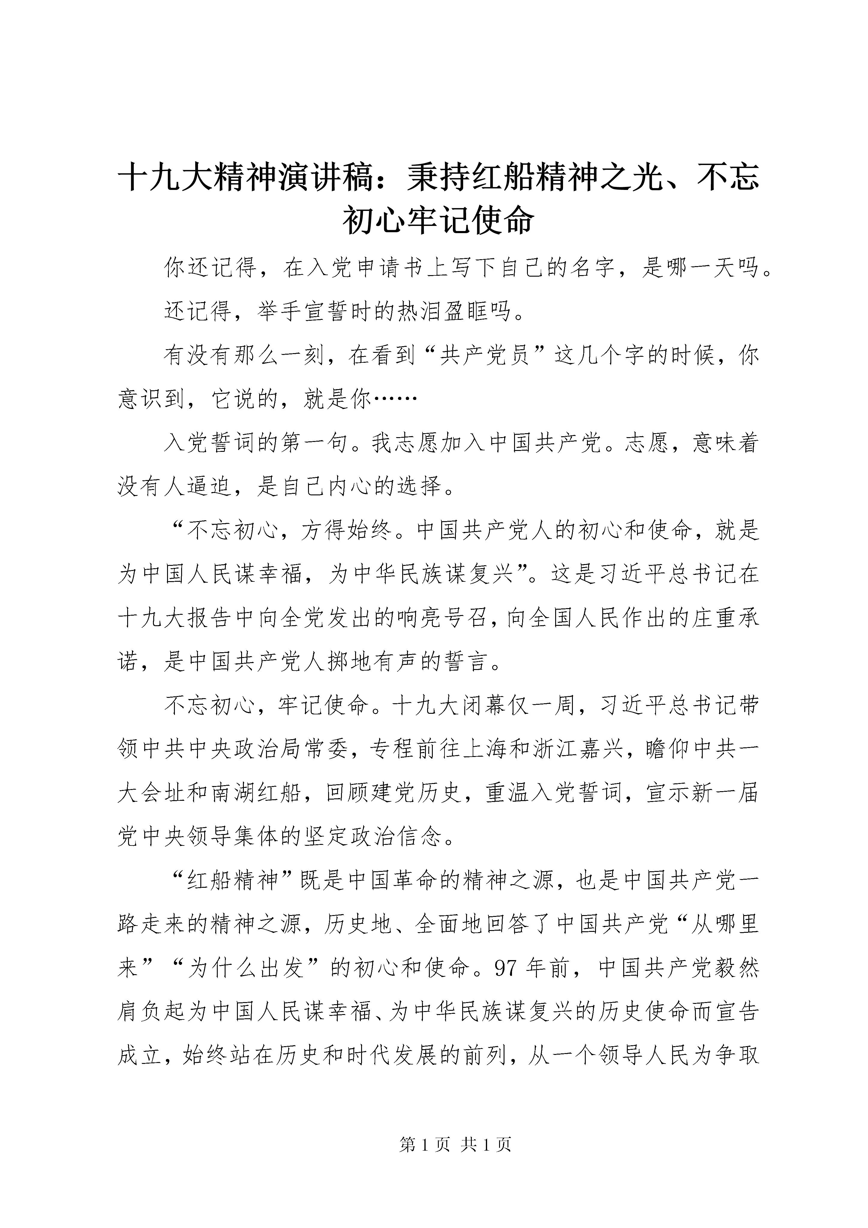 十九大精神演讲稿:秉持红船精神之光、不忘初心牢记使命你还记得,在入党申请书上写下自己的名字,是哪一天吗。还记得,举手宣誓时的热泪盈眶吗。有没有那么一刻,在看到“共产党员”这几个字的时候,你意识到,它说的,就是你……入党誓词的第一句。我志愿加入中国共产党。志愿,意味着没有人逼迫,是自己内心的选择。“不忘初心,方得始终。中国共产党人的初心和使命,就是为中国人民谋幸福,为中华民族谋复兴”。这是习近平总书记在十九大报告中向全党发出的响亮号召,向全国人民作出的庄重承诺,是中国共产党人掷地有声的誓言。不忘初心,牢记使命。十九大闭幕仅一周,习近平总书记带领中共中央政治局常委,专程前往上海和浙江嘉兴,瞻仰中共一大会址和南湖红船,回顾建党历史,重温入党誓词,宣示新一届党中央领导集体的坚定政治信念。“红船精神”既是中国革命的精神之源,也是中国共产党一路走来的精神之源,历史地、全面地回答了中国共产党“从哪里来”“为什么出发”的初心和使命。97年前,中国共产党毅然肩负起为中国人民谋幸福、为中华民族谋复兴的历史使命而宣告成立,始终站在历史和时代发展的前列,从一个领导人民为争取民族独立、人民解放而奋斗的革命党,成为领导人民为国家富强、人民幸福而奋斗的执政党。在中国共产党近百年的历史上,她的革命精神和初心使命始终如一。恰同学少年,风华正茂;书生意气,挥斥方遒。97年前,泱泱秀水畔,红船启航时,13位有志青年将手紧紧挽在一起,他们平均年龄不到30岁,却敢叫日月换新天。“其作始也简,其将毕也必巨。”97年前,承载着民族希望的小小红船,如今已经变成承载着13亿多中国人民希望的巨轮;只有几十个人的中国共产党,已经发展成为拥有8900多万名党员的世界第一大党。97年前嘉兴南湖上的那条小船所开创的革命航道,成就了中华民族战胜内忧外患、屹立于世界民族之林的光辉伟业,同时也奠定了中国共产党人走在时代前列的革命精神和红色气质。从嘉兴的南湖烟雨,长征路上的雄关漫道,抗日战争的烽烟四起,到天安门城楼下的庄严宣告,改革开放大潮奔涌,直至今日的不忘初心、筑梦中国,前进中的红船不管风吹浪打,不怕急流险滩,历经曲折而不畏艰险,屡受考验而不变初衷,带领中国人民闯过了一个又一个难关,抵达了一个又一个胜利的彼岸。回望97年波澜壮阔的光辉历程,中国共产党取得的辉煌成就无不凝聚着热情和奉献。渐渐的,我明白了,我明白了像陈道玉这样的税务工作者为什么能够三十年如一日地为人民服务。是爱,是埋藏在内心的深沉的爱,是奔腾在灵魂的火热的爱,热爱党、热爱祖国、热爱纳税人,当一辈子好人,做一辈子好事,这是他无私奉献的精神动力。他用三十年的时间践行了他“为国聚财,为民收税”的庄严承诺,他用一辈子的坚守在人民心中树立了一座不朽的丰碑。风好正扬帆,敢向潮头立。我们的历史中从不缺乏奉献,我们的时代中总是涌现英雄。新的转机和闪闪的星斗,正在缀满没有遮拦的天空,那是五千年的象形文字,那是未来人们凝视的眼睛。97年春华秋实、97年砥砺奋进,中国共产党成为中国革命和建设事业的坚强领导核心。站在新的时代潮头,面向新的光荣使命,中国共产党人秉持的红船精神之光定能熠熠生辉,映照出一个更加灿烂辉煌的未来。