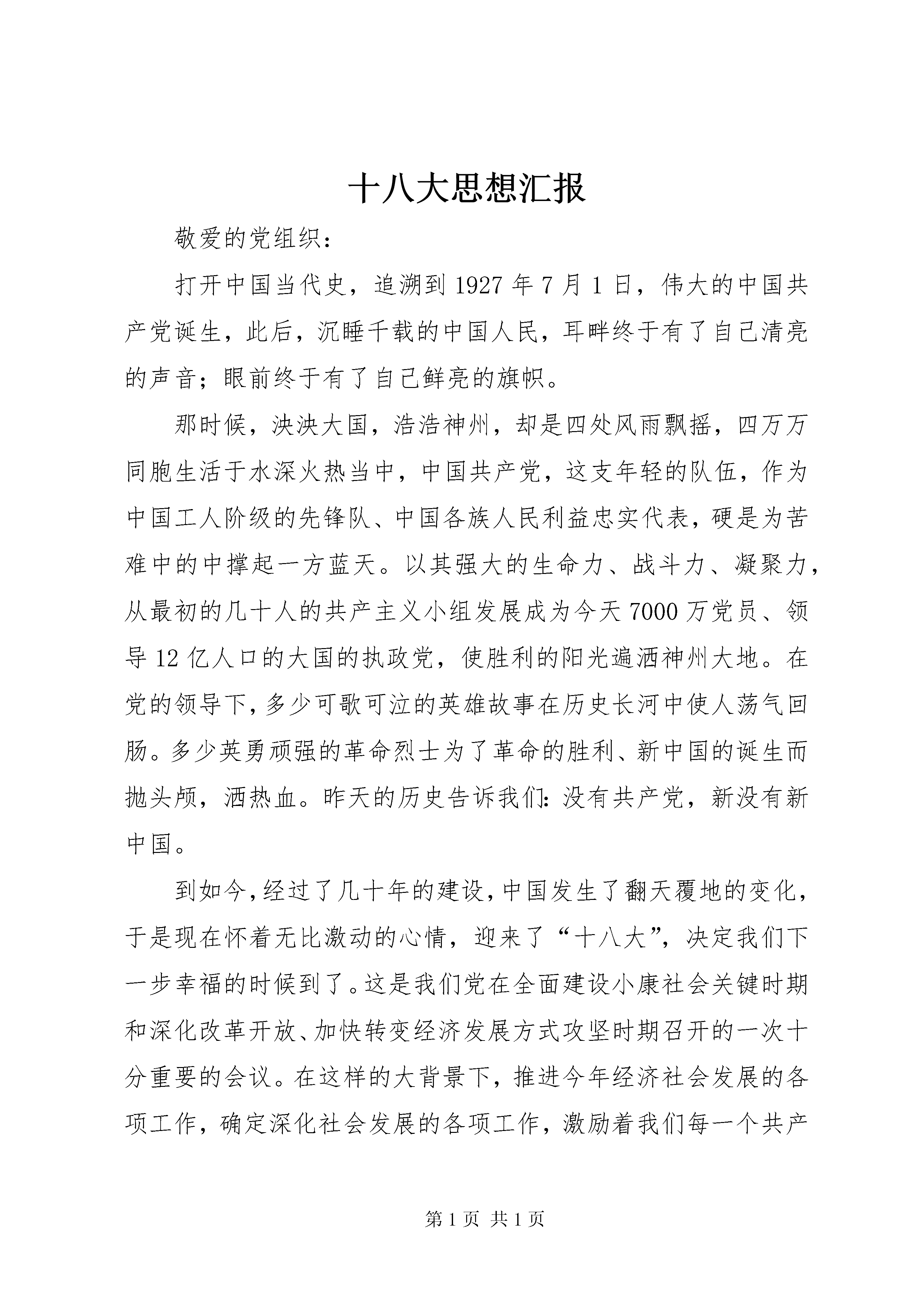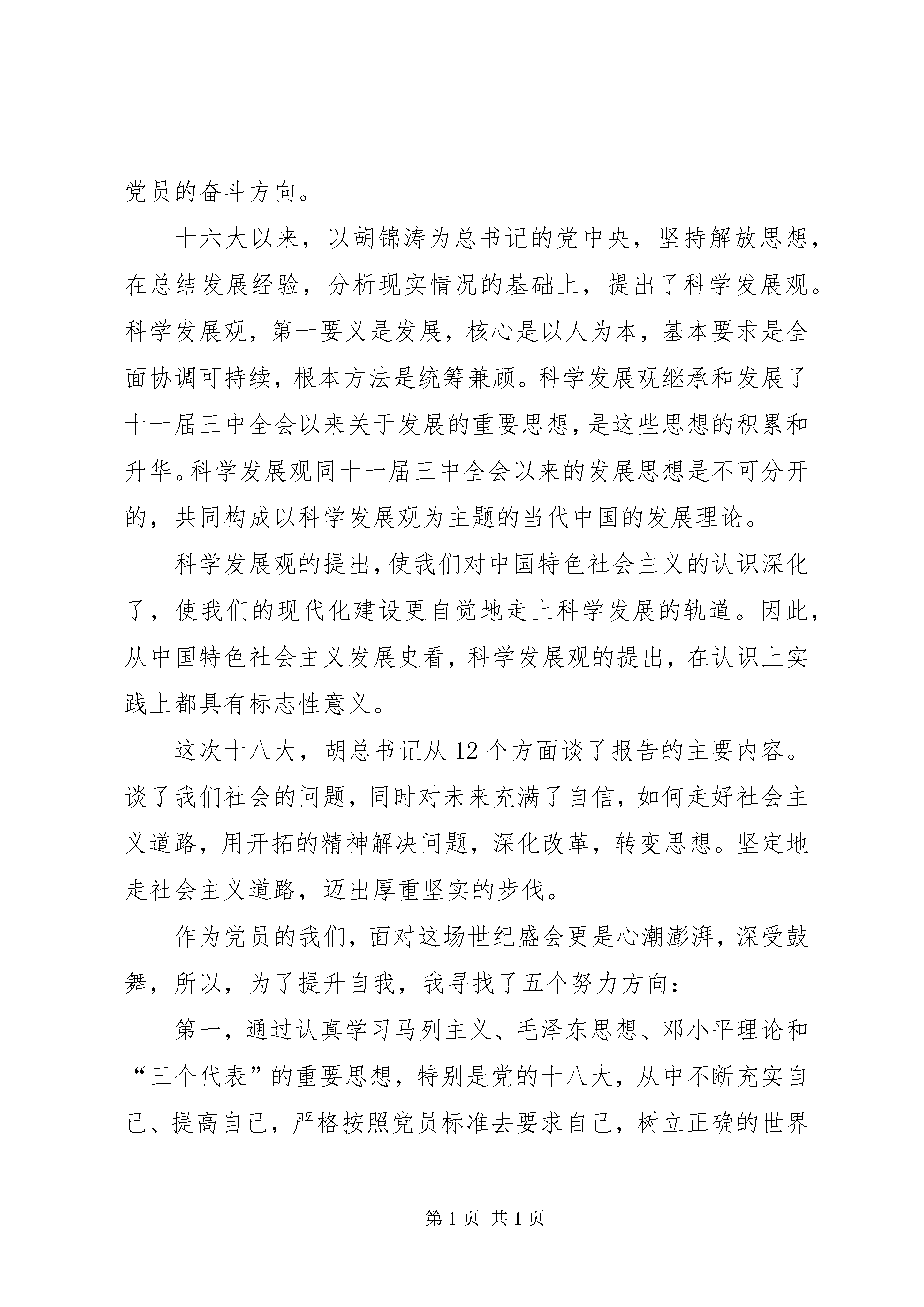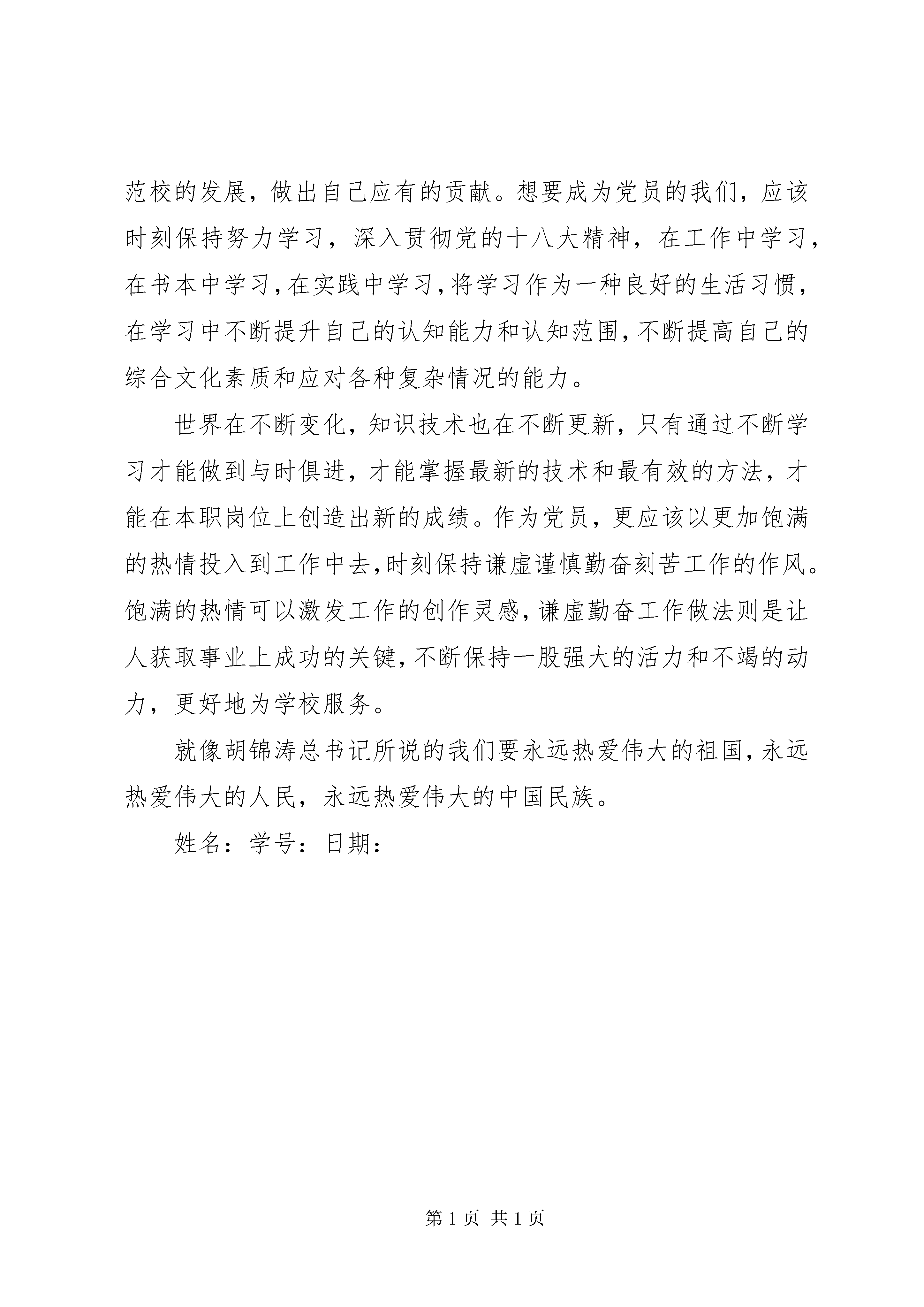十八大思想汇报敬爱的党组织:打开中国当代史,追溯到1927年7月1日,伟大的中国共产党诞生,此后,沉睡千载的中国人民,耳畔终于有了自己清亮的声音;眼前终于有了自己鲜亮的旗帜。那时候,泱泱大国,浩浩神州,却是四处风雨飘摇,四万万同胞生活于水深火热当中,中国共产党,这支年轻的队伍,作为中国工人阶级的先锋队、中国各族人民利益忠实代表,硬是为苦难中的中撑起一方蓝天。以其强大的生命力、战斗力、凝聚力,从最初的几十人的共产主义小组发展成为今天7000万党员、领导12亿人口的大国的执政党,使胜利的阳光遍洒神州大地。在党的领导下,多少可歌可泣的英雄故事在历史长河中使人荡气回肠。多少英勇顽强的革命烈士为了革命的胜利、新中国的诞生而抛头颅,洒热血。昨天的历史告诉我们:没有共产党,新没有新中国。到如今,经过了几十年的建设,中国发生了翻天覆地的变化,于是现在怀着无比激动的心情,迎来了“十八大”,决定我们下一步幸福的时候到了。这是我们党在全面建设小康社会关键时期和深化改革开放、加快转变经济发展方式攻坚时期召开的一次十分重要的会议。在这样的大背景下,推进今年经济社会发展的各项工作,确定深化社会发展的各项工作,激励着我们每一个共产党员的奋斗方向。十六大以来,以胡锦涛为总书记的党中央,坚持解放思想,在总结发展经验,分析现实情况的基础上,提出了科学发展观。科学发展观,第一要义是发展,核心是以人为本,基本要求是全面协调可持续,根本方法是统筹兼顾。科学发展观继承和发展了十一届三中全会以来关于发展的重要思想,是这些思想的积累和升华。科学发展观同十一届三中全会以来的发展思想是不可分开的,共同构成以科学发展观为主题的当代中国的发展理论。科学发展观的提出,使我们对中国特色社会主义的认识深化了,使我们的现代化建设更自觉地走上科学发展的轨道。因此,从中国特色社会主义发展史看,科学发展观的提出,在认识上实践上都具有标志性意义。这次十八大,胡总书记从12个方面谈了报告的主要内容。谈了我们社会的问题,同时对未来充满了自信,如何走好社会主义道路,用开拓的精神解决问题,深化改革,转变思想。坚定地走社会主义道路,迈出厚重坚实的步伐。作为党员的我们,面对这场世纪盛会更是心潮澎湃,深受鼓舞,所以,为了提升自我,我寻找了五个努力方向:第一,通过认真学习马列主义、毛泽东思想、邓小平理论和“三个代表”的重要思想,特别是党的十八大,从中不断充实自己、提高自己,严格按照党员标准去要求自己,树立正确的世界观、人生观和价值观,坚定了共产主义理想和社会主义信念,在思想上与党中央保持一致,在政治上保持清醒的头脑。第二,在工作上不断严格要求自己,注意搞好与同事之间关系,在单位领导的支持和帮助下,逐步克服在管理经验和管理能力上的不足之处,不断积累管理经验。第三,坚持党和人民的利益高于一切,克己奉公,勇于牺牲的高尚情操。正确处理局部利益与全局利益,眼前利益与长远利益,个人利益与党和人民利益的关系,诚心诚意的为单位集体着想,不计较个人得失。第四,不断加强对科学文化知识的学习,另外还积极利用自己的业余时间,认真阅读有关书籍,汲取知识,开拓眼界。尊重科学,勤奋学习,熟练掌握做好本职工作所需的管理知识和科学文化业务知识,充分发挥自己的聪明才智。第五,有真抓实干,有全局意识。一切从实际出发,说实话,办实事,讲实效。我从点点滴滴开始关心同事,倾听同事呼声,帮助同事排忧解难,尽自己所能为同事多干实事,坚决反对形式主义,使同事们能做好各自工作。在组织的关怀与培养下,我一定会严格要求自己,时时事事不忘创先争优,努力争创一流,应该主动思考,不断创新工作方法,不断攻克工作的难题;应该勤奋工作,热情服务,不断为人民群众提供优质的服务,不断完善本职工作,努力为推动全国示范校的发展,做出自己应有的贡献。想要成为党员的我们,应该时刻保持努力学习,深入贯彻党的十八大精神,在工作中学习,在书本中学习,在实践中学习,将学习作为一种良好的生活习惯,在学习中不断提升自己的认知能力和认知范围,不断提高自己的综合文化素质和应对各种复杂情况的能力。世界在不断变化,知识技术也在不断更新,只有通过不断学习才能做到与时俱进,才能掌握最新的技术和最有效的方法,才能在本职岗位上创造出新的成绩。作为党员,更应该以更加饱满的热情投入到工作中去,时刻保持谦虚谨慎勤奋刻苦工作的作风。饱满的热情可以激发工作的创作灵感,谦虚勤奋工作做法则是让人获取事业上成功的关键,不断保持一股强大的活力和不竭的动力,更好地为学校服务。就像胡锦涛总书记所说的我们要永远热爱伟大的祖国,永远热爱伟大的人民,永远热爱伟大的中国民族。姓名:学号:日期: