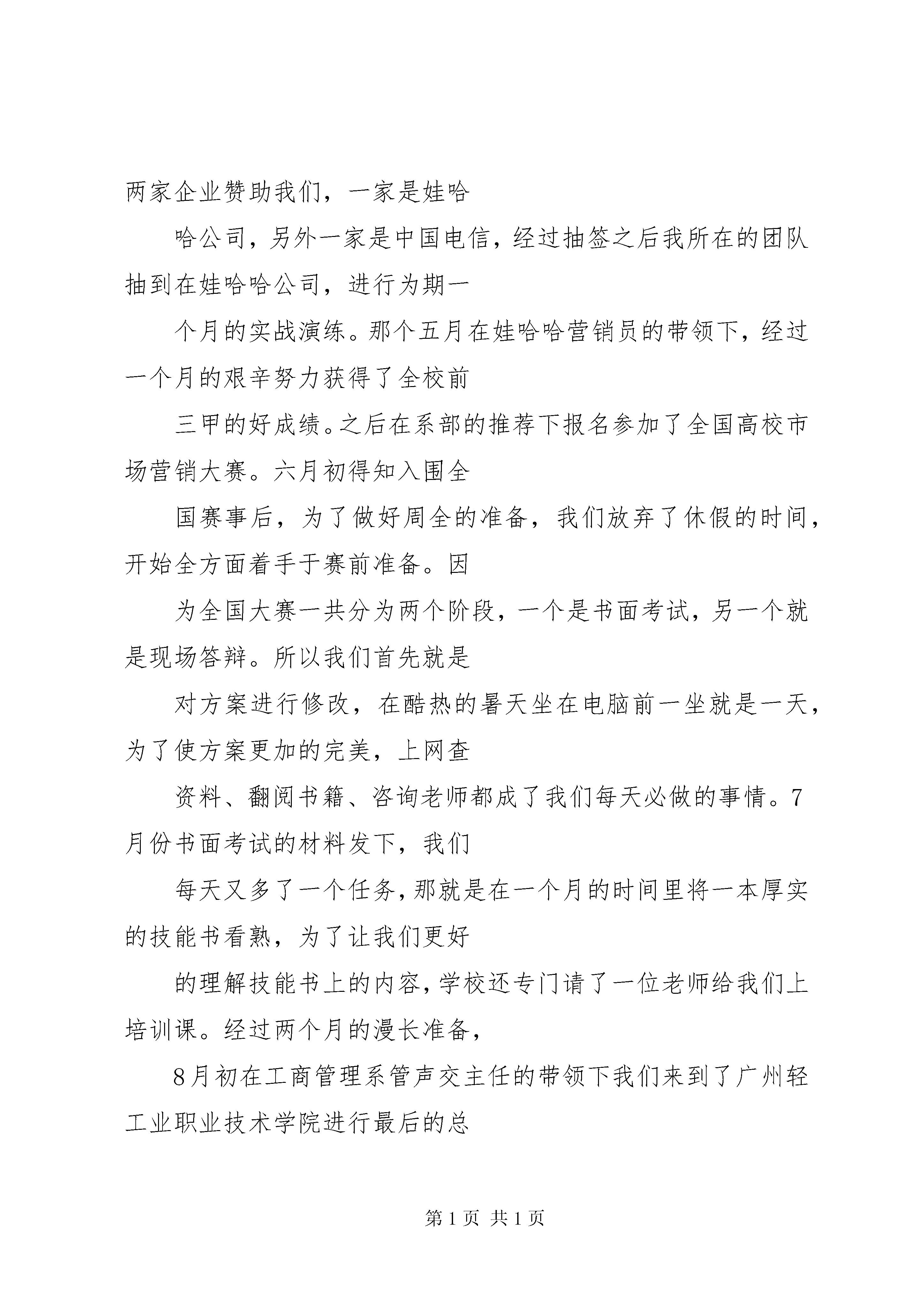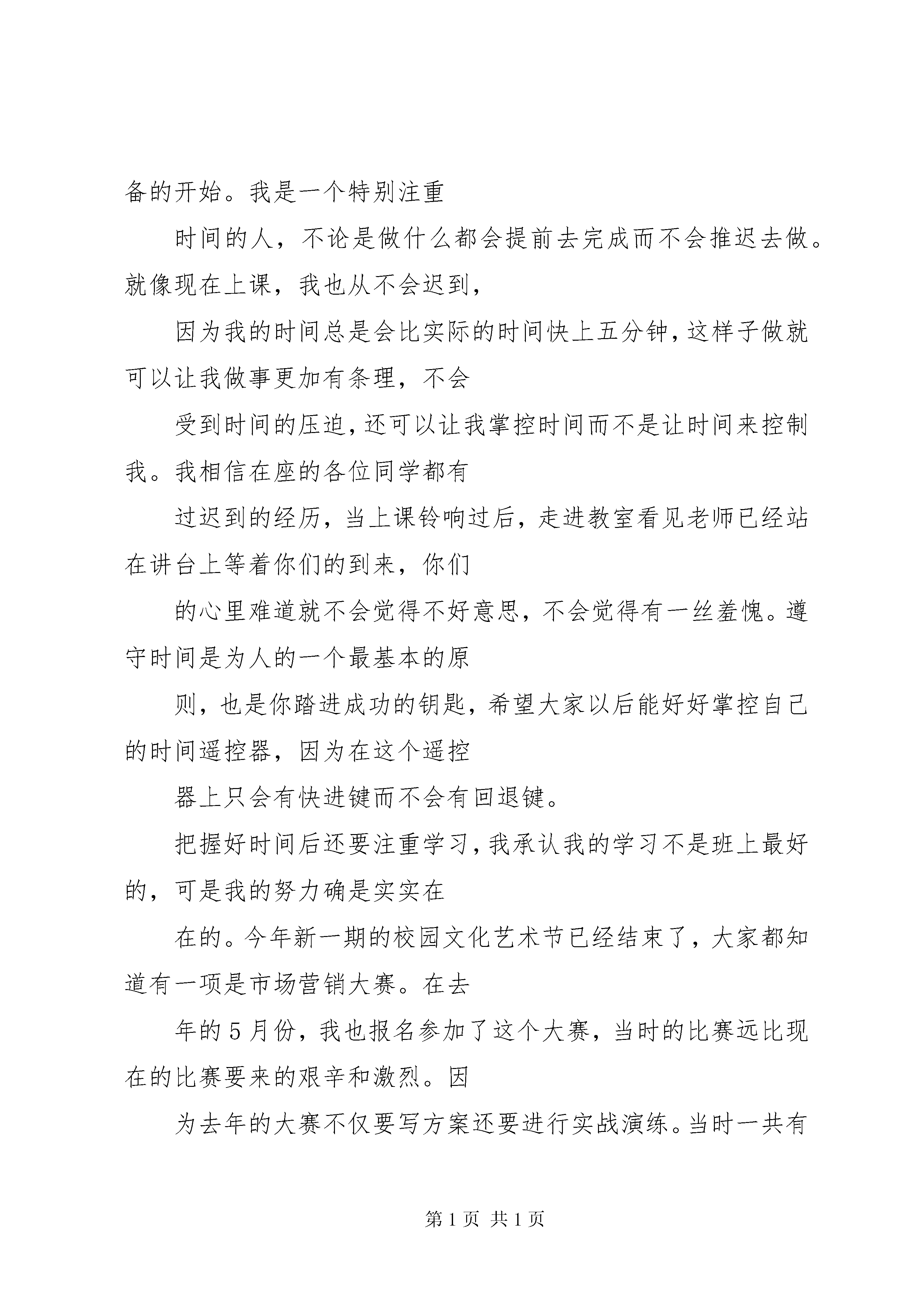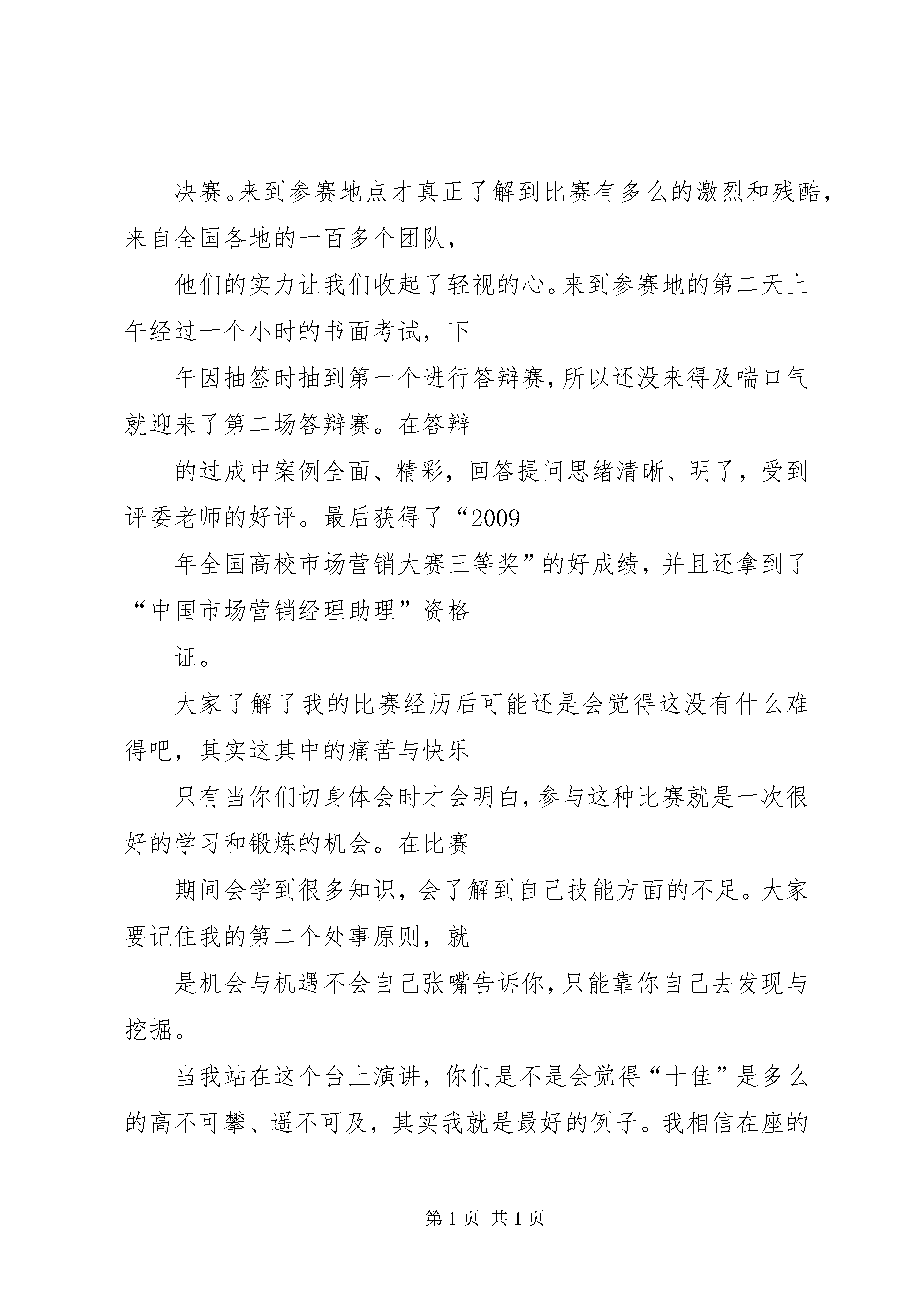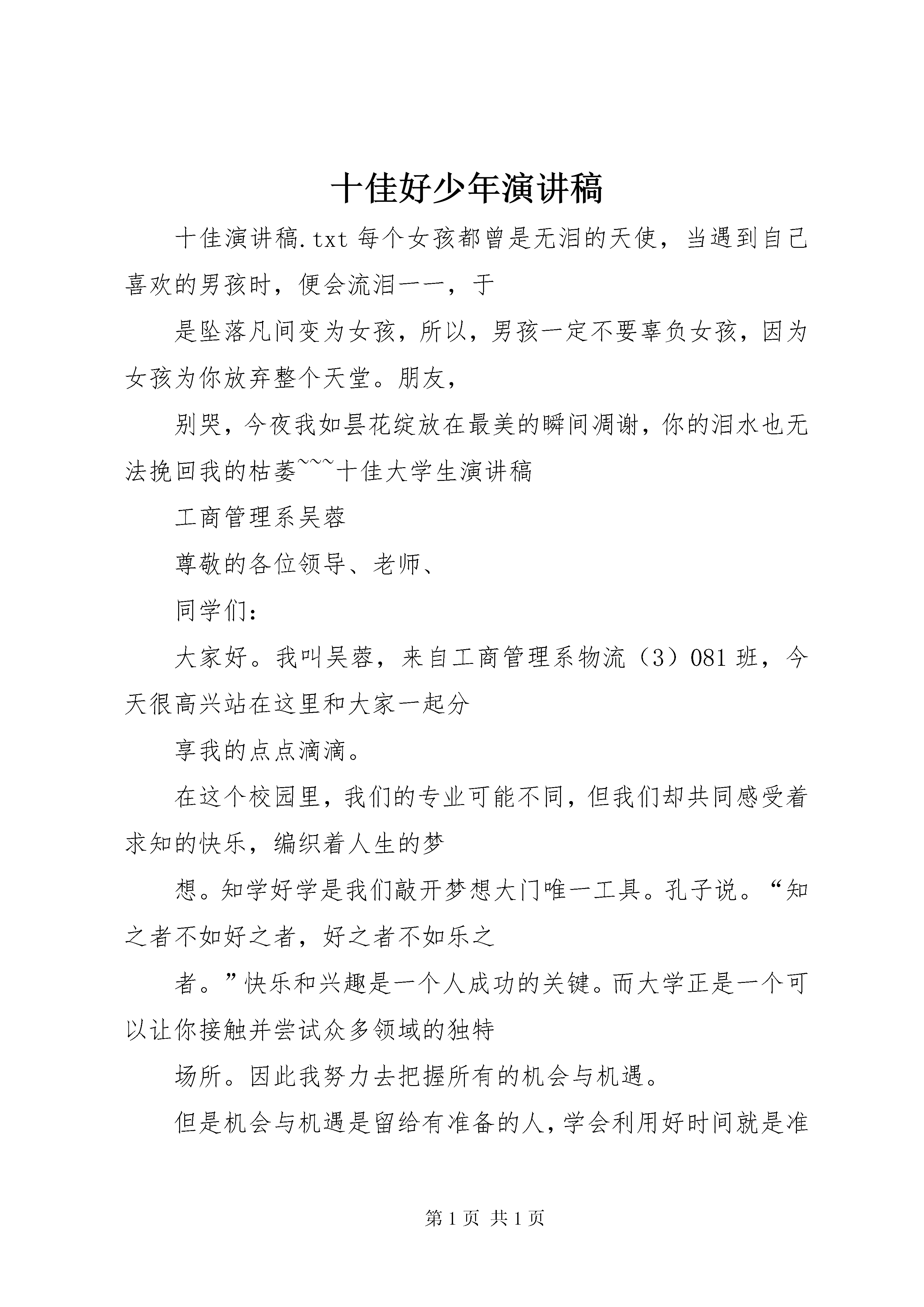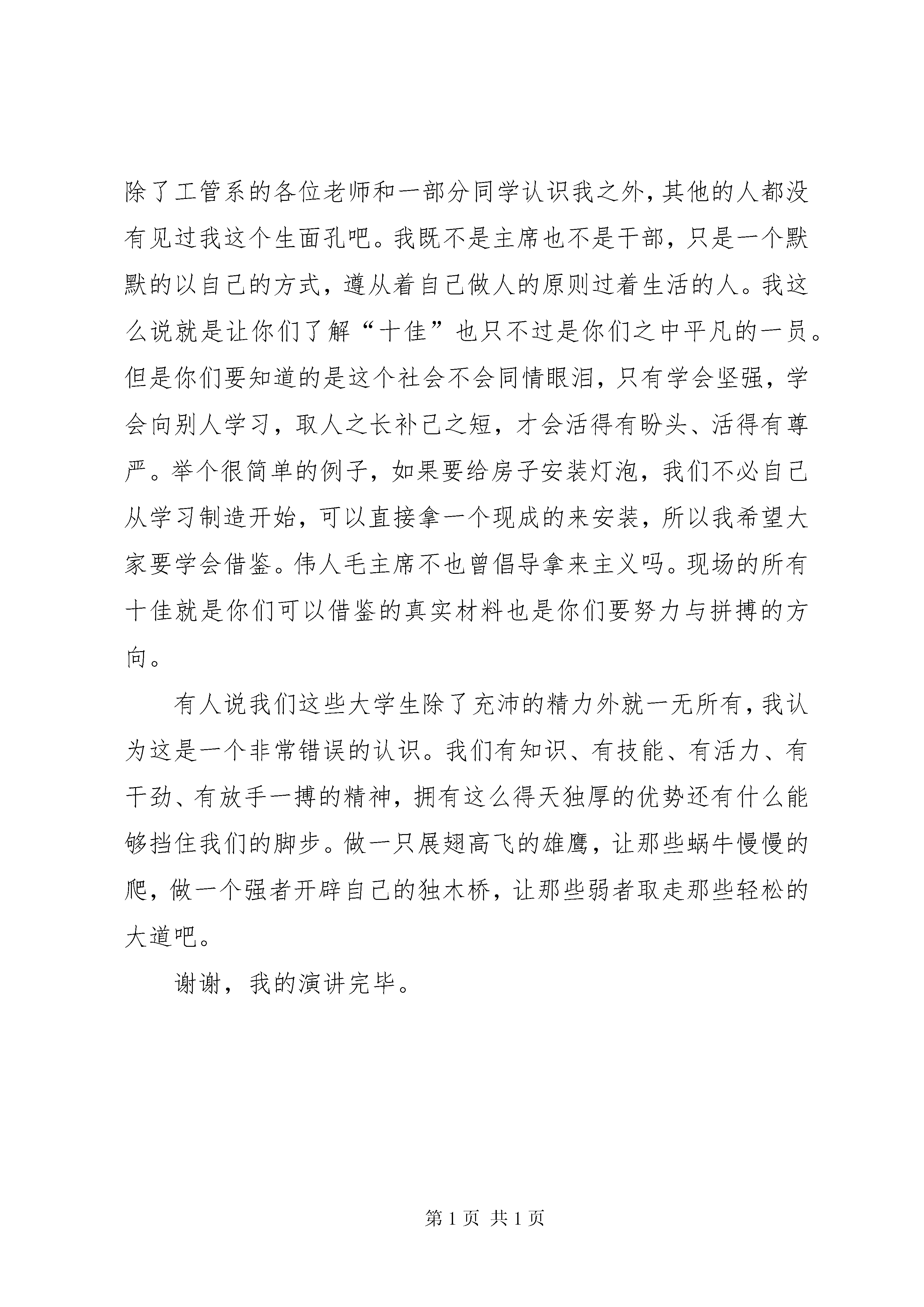 十佳好少年演讲稿十佳演讲稿.txt每个女孩都曾是无泪的天使,当遇到自己喜欢的男孩时,便会流泪一一,于是坠落凡间变为女孩,所以,男孩一定不要辜负女孩,因为女孩为你放弃整个天堂。朋友,别哭,今夜我如昙花绽放在最美的瞬间凋谢,你的泪水也无法挽回我的枯萎~~~十佳大学生演讲稿工商管理系吴蓉尊敬的各位领导、老师、同学们:大家好。我叫吴蓉,来自工商管理系物流(3)081班,今天很高兴站在这里和大家一起分享我的点点滴滴。在这个校园里,我们的专业可能不同,但我们却共同感受着求知的快乐,编织着人生的梦想。知学好学是我们敲开梦想大门唯一工具。孔子说。“知之者不如好之者,好之者不如乐之者。”快乐和兴趣是一个人成功的关键。而大学正是一个可以让你接触并尝试众多领域的独特场所。因此我努力去把握所有的机会与机遇。但是机会与机遇是留给有准备的人,学会利用好时间就是准备的开始。我是一个特别注重时间的人,不论是做什么都会提前去完成而不会推迟去做。就像现在上课,我也从不会迟到,因为我的时间总是会比实际的时间快上五分钟,这样子做就可以让我做事更加有条理,不会受到时间的压迫,还可以让我掌控时间而不是让时间来控制我。我相信在座的各位同学都有过迟到的经历,当上课铃响过后,走进教室看见老师已经站在讲台上等着你们的到来,你们的心里难道就不会觉得不好意思,不会觉得有一丝羞愧。遵守时间是为人的一个最基本的原则,也是你踏进成功的钥匙,希望大家以后能好好掌控自己的时间遥控器,因为在这个遥控器上只会有快进键而不会有回退键。把握好时间后还要注重学习,我承认我的学习不是班上最好的,可是我的努力确是实实在在的。今年新一期的校园文化艺术节已经结束了,大家都知道有一项是市场营销大赛。在去年的5月份,我也报名参加了这个大赛,当时的比赛远比现在的比赛要来的艰辛和激烈。因为去年的大赛不仅要写方案还要进行实战演练。当时一共有两家企业赞助我们,一家是娃哈哈公司,另外一家是中国电信,经过抽签之后我所在的团队抽到在娃哈哈公司,进行为期一个月的实战演练。那个五月在娃哈哈营销员的带领下,经过一个月的艰辛努力获得了全校前三甲的好成绩。之后在系部的推荐下报名参加了全国高校市场营销大赛。六月初得知入围全国赛事后,为了做好周全的准备,我们放弃了休假的时间,开始全方面着手于赛前准备。因为全国大赛一共分为两个阶段,一个是书面考试,另一个就是现场答辩。所以我们首先就是对方案进行修改,在酷热的暑天坐在电脑前一坐就是一天,为了使方案更加的完美,上网查资料、翻阅书籍、咨询老师都成了我们每天必做的事情。7月份书面考试的材料发下,我们每天又多了一个任务,那就是在一个月的时间里将一本厚实的技能书看熟,为了让我们更好的理解技能书上的内容,学校还专门请了一位老师给我们上培训课。经过两个月的漫长准备,8月初在工商管理系管声交主任的带领下我们来到了广州轻工业职业技术学院进行最后的总决赛。来到参赛地点才真正了解到比赛有多么的激烈和残酷,来自全国各地的一百多个团队,他们的实力让我们收起了轻视的心。来到参赛地的第二天上午经过一个小时的书面考试,下午因抽签时抽到第一个进行答辩赛,所以还没来得及喘口气就迎来了第二场答辩赛。在答辩的过成中案例全面、精彩,回答提问思绪清晰、明了,受到评委老师的好评。最后获得了“2009年全国高校市场营销大赛三等奖”的好成绩,并且还拿到了“中国市场营销经理助理”资格证。大家了解了我的比赛经历后可能还是会觉得这没有什么难得吧,其实这其中的痛苦与快乐只有当你们切身体会时才会明白,参与这种比赛就是一次很好的学习和锻炼的机会。在比赛期间会学到很多知识,会了解到自己技能方面的不足。大家要记住我的第二个处事原则,就是机会与机遇不会自己张嘴告诉你,只能靠你自己去发现与挖掘。当我站在这个台上演讲,你们是不是会觉得“十佳”是多么的高不可攀、遥不可及,其实我就是最好的例子。我相信在座的除了工管系的各位老师和一部分同学认识我之外,其他的人都没有见过我这个生面孔吧。我既不是主席也不是干部,只是一个默默的以自己的方式,遵从着自己做人的原则过着生活的人。我这么说就是让你们了解“十佳”也只不过是你们之中平凡的一员。但是你们要知道的是这个社会不会同情眼泪,只有学会坚强,学会向别人学习,取人之长补己之短,才会活得有盼头、活得有尊严。举个很简单的例子,如果要给房子安装灯泡,我们不必自己从学习制造开始,可以直接拿一个现成的来安装,所以我希望大家要学会借鉴。伟人毛主席不也曾倡导拿来主义吗。现场的所有十佳就是你们可以借鉴的真实材料也是你们要努力与拼搏的方向。有人说我们这些大学生除了充沛的精力外就一无所有,我认为这是一个非常错误的认识。我们有知识、有技能、有活力、有干劲、有放手一搏的精神,拥有这么得天独厚的优势还有什么能够挡住我们的脚步。做一只展