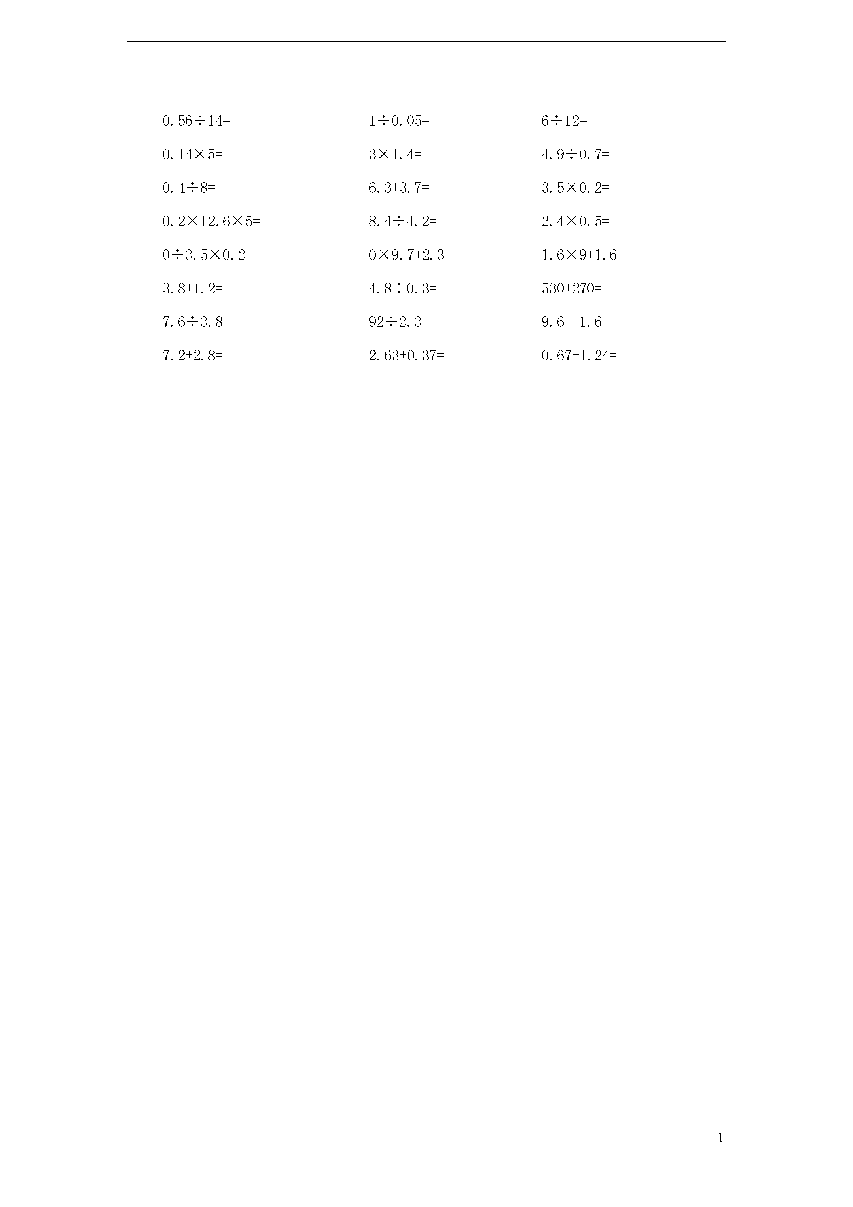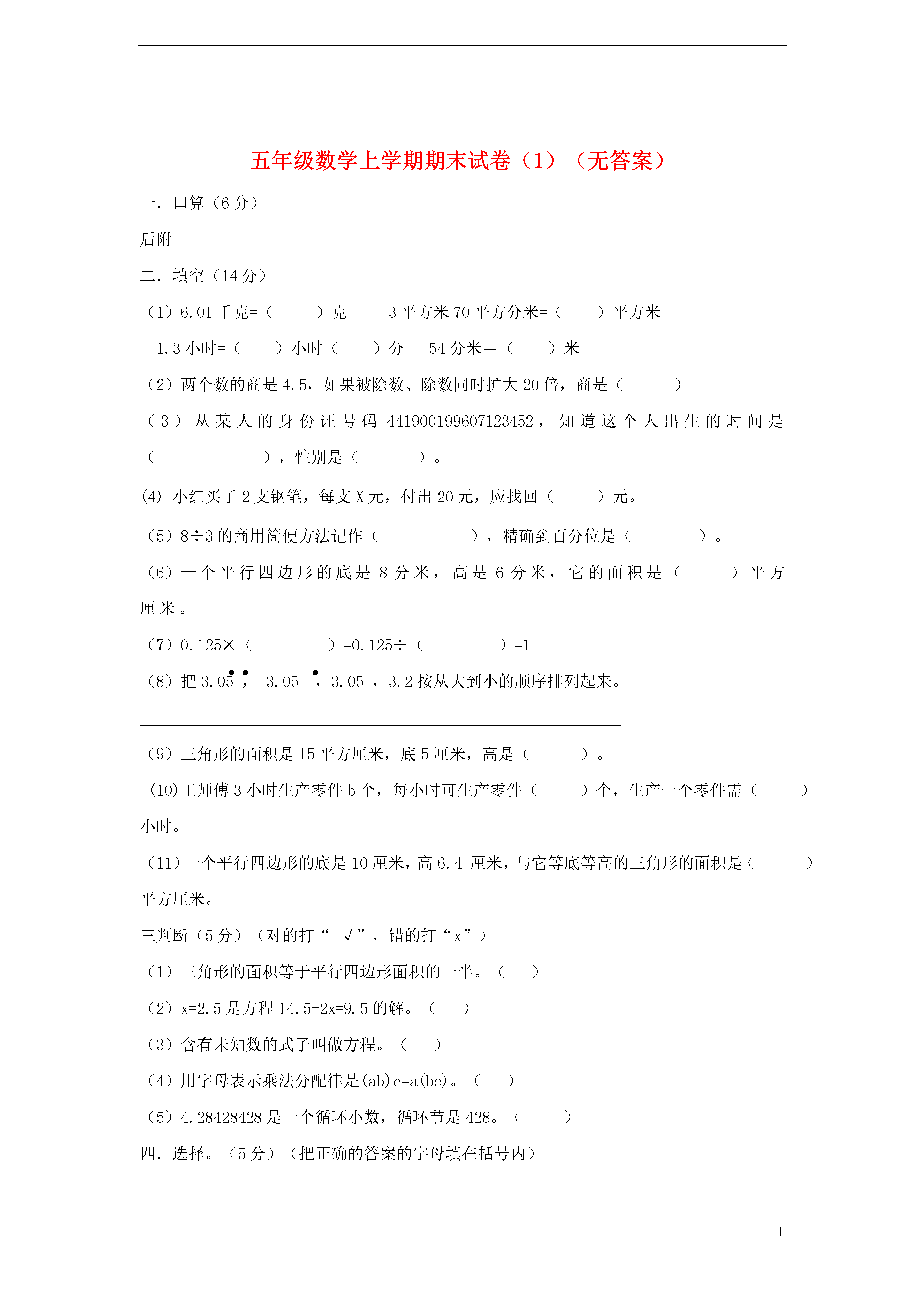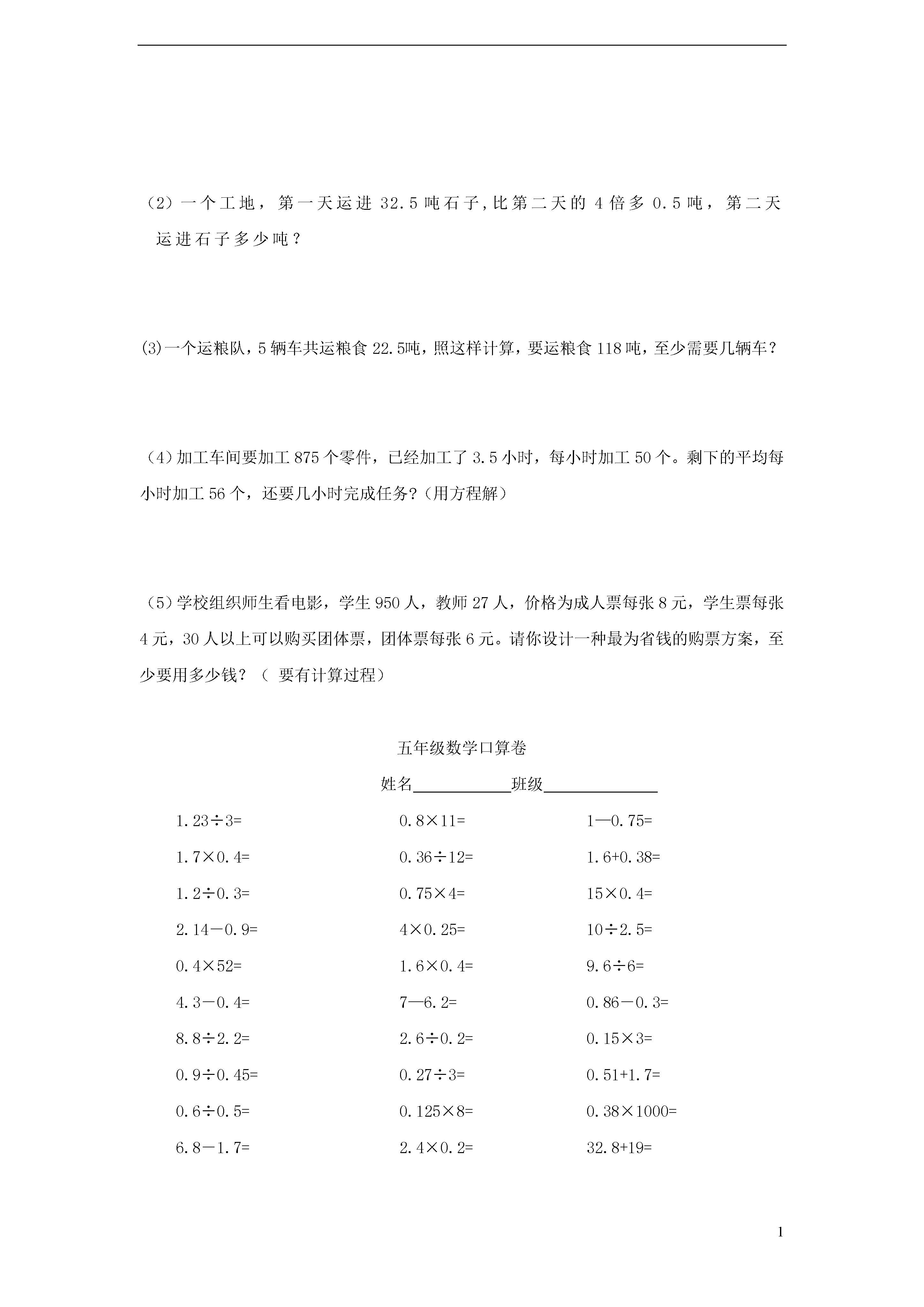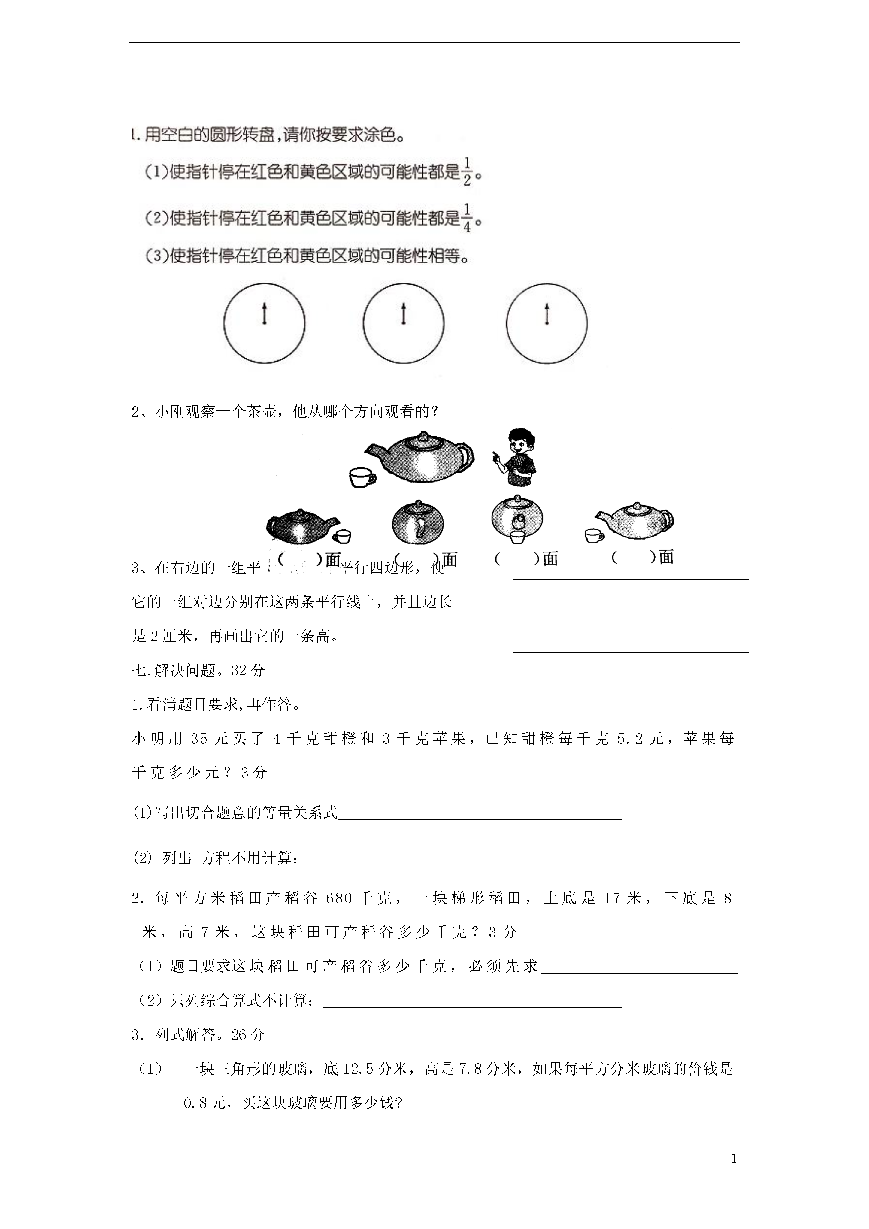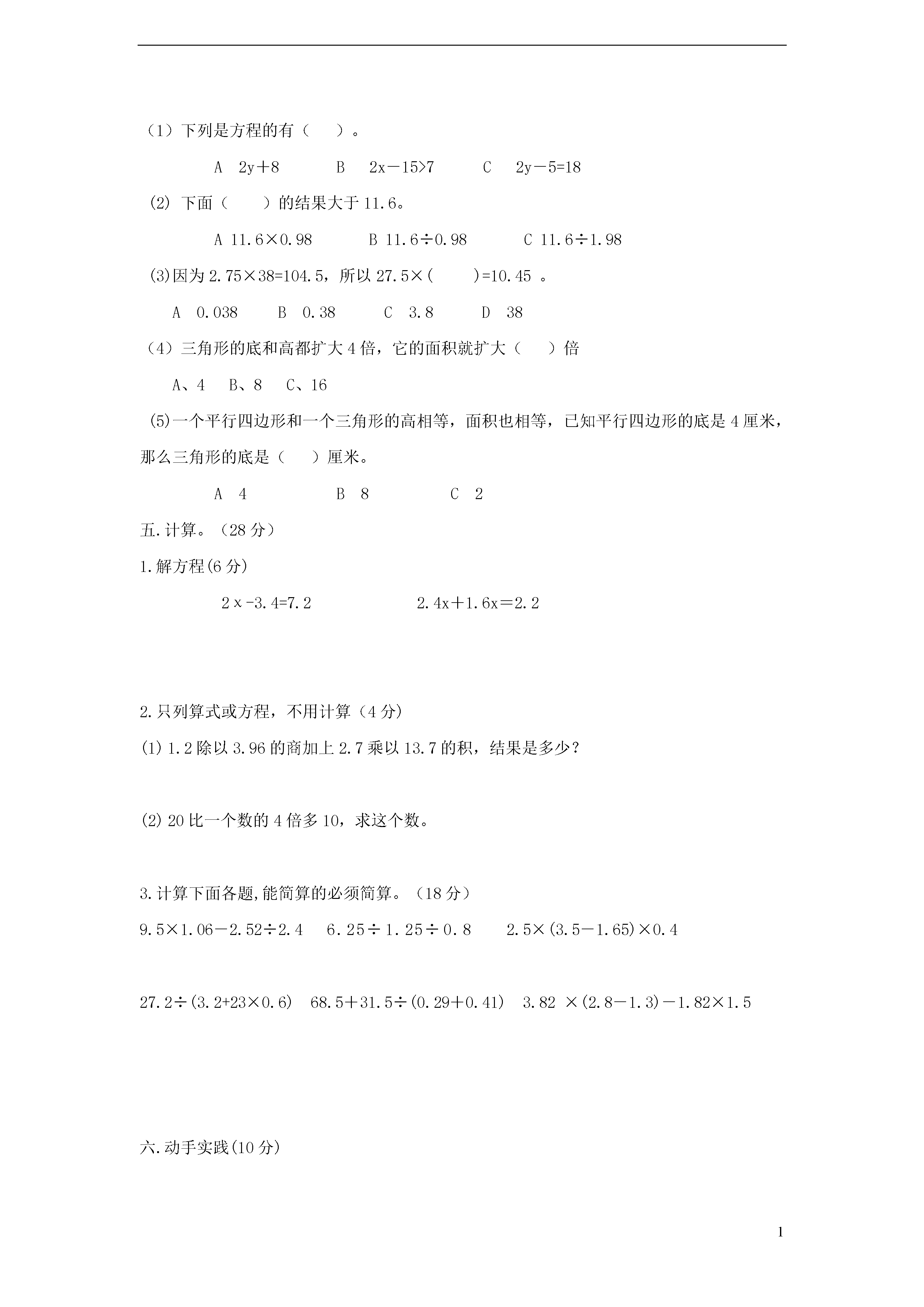1五年级数学上学期期末试卷(1)(无答案)口算(6分)后附填空(14分)(1)6.01千克=()克3平方米70平方分米=()平方米1.3小时=()小时()分54分米=()米(2)两个数的商是4.5,如果被除数、除数同时扩大20倍,商是()(3)从某人的身份证号码441900199607123452,知道这个人出生的时间是(),性别是()。(4)小红买了2支钢笔,每支X元,付出20元,应找回()元。(5)8÷3的商用简便方法记作(),精确到百分位是()。(6)一个平行四边形的底是8分米,高是6分米,它的面积是()平方厘米。(7)0.125×()=0.125÷()=1(8)把3.05,3.05,3.05,3.2按从大到小的顺序排列起来。(9)三角形的面积是15平方厘米,底5厘米,高是()。(10)王师傅3小时生产零件b个,每小时可生产零件()个,生产一个零件需()小时。(11)一个平行四边形的底是10厘米,高6.4厘米,与它等底等高的三角形的面积是()平方厘米。三判断(5分)(对的打“√”,错的打“x”)(1)三角形的面积等于平行四边形面积的一半。()(2)x=2.5是方程14.5-2x=9.5的解。()(3)含有未知数的式子叫做方程。()(4)用字母表示乘法分配律是(ab)c=a(bc)。()(5)4.28428428是一个循环小数,循环节是428。()四.选择。(5分)(把正确的答案的字母填在括号内)(1)下列是方程的有()。A2y+8B2x-15>7C2y-5=18(2)下面()的结果大于11.6。A11.6×0.98B11.6÷0.98C11.6÷1.98(3)因为2.75×38=104.5,所以27.5×()=10.45。A0.038B0.38C3.8D38(4)三角形的底和高都扩大4倍,它的面积就扩大()倍A、4B、8C、16(5)一个平行四边形和一个三角形的高相等,面积也相等,已知平行四边形的底是4厘米,那么三角形的底是()厘米。A4B8C2五.计算。(28分)1.解方程(6分)2χ-3.4=7.22.4x+1.6x=2.22.只列算式或方程,不用计算(4分)1.2除以3.96的商加上2.7乘以13.7的积,结果是多少?20比一个数的4倍多10,求这个数。3.计算下面各题,能简算的必须简算。(18分)9.5×1.06-2.52÷2.46.25÷1.25÷0.82.5×(3.5-1.65)×0.427.2÷(3.2+23×0.6)68.5+31.5÷(0.29+0.41)3.82×(2.8-1.3)-1.82×1.5六.动手实践(10分)2、小刚观察一个茶壶,他从哪个方向观看的?3、在右边的一组平行线画一个平行四边形,使它的一组对边分别在这两条平行线上,并且边长是2厘米,再画出它的一条高。七.解决问题。32分1.看清题目要求,再作答。小明用35元买了4千克甜橙和3千克苹果,已知甜橙每千克5.2元,苹果每千克多少元?3分(1)写出切合题意的等量关系式(2)列出方程不用计算:2.每平方米稻田产稻谷680千克,一块梯形稻田,上底是17米,下底是8米,高7米,这块稻田可产稻谷多少千克?3分(1)题目要求这块稻田可产稻谷多少千克,必须先求(2)只列综合算式不计算:3.列式解答。26分一块三角形的玻璃,底12.5分米,高是7.8分米,如果每平方分米玻璃的价钱是0.8元,买这块玻璃要用多少钱?(2)一个工地,第一天运进32.5吨石子,比第二天的4倍多0.5吨,第二天运进石子多少吨?(3)一个运粮队,5辆车共运粮食22.5吨,照这样计算,要运粮食118吨,至少需要几辆车?(4)加工车间要加工875个零件,已经加工了3.5小时,每小时加工50个。剩下的平均每小时加工56个,还要几小时完成任务?(用方程解)(5)学校组织师生看电影,学生950人,教师27人,价格为成人票每张8元,学生票每张4元,30人以上可以购买团体票,团体票每张6元。请你设计一种最为省钱的购票方案,至少要用多少钱?(要有计算过程)五年级数学口算卷姓名班级1.23÷3=0.8×11=1—0.75=1.7×0.4=0.36÷12=1.6+0.38=1.2÷0.3=0.75×4=15×0.4=2.14-0.9=4×0.25=10÷2.5=0.4×52=1.6×0.4=9.6÷6=4.3-0.4=7—6.2=0.86-0.3=8.8÷2.2=2.6÷0.2=0.15×3=0.9÷0.45=0.27÷3=0.51+1.7=0.6÷0.5=0.125×8=0.38×1000=6.8-1.7=2.