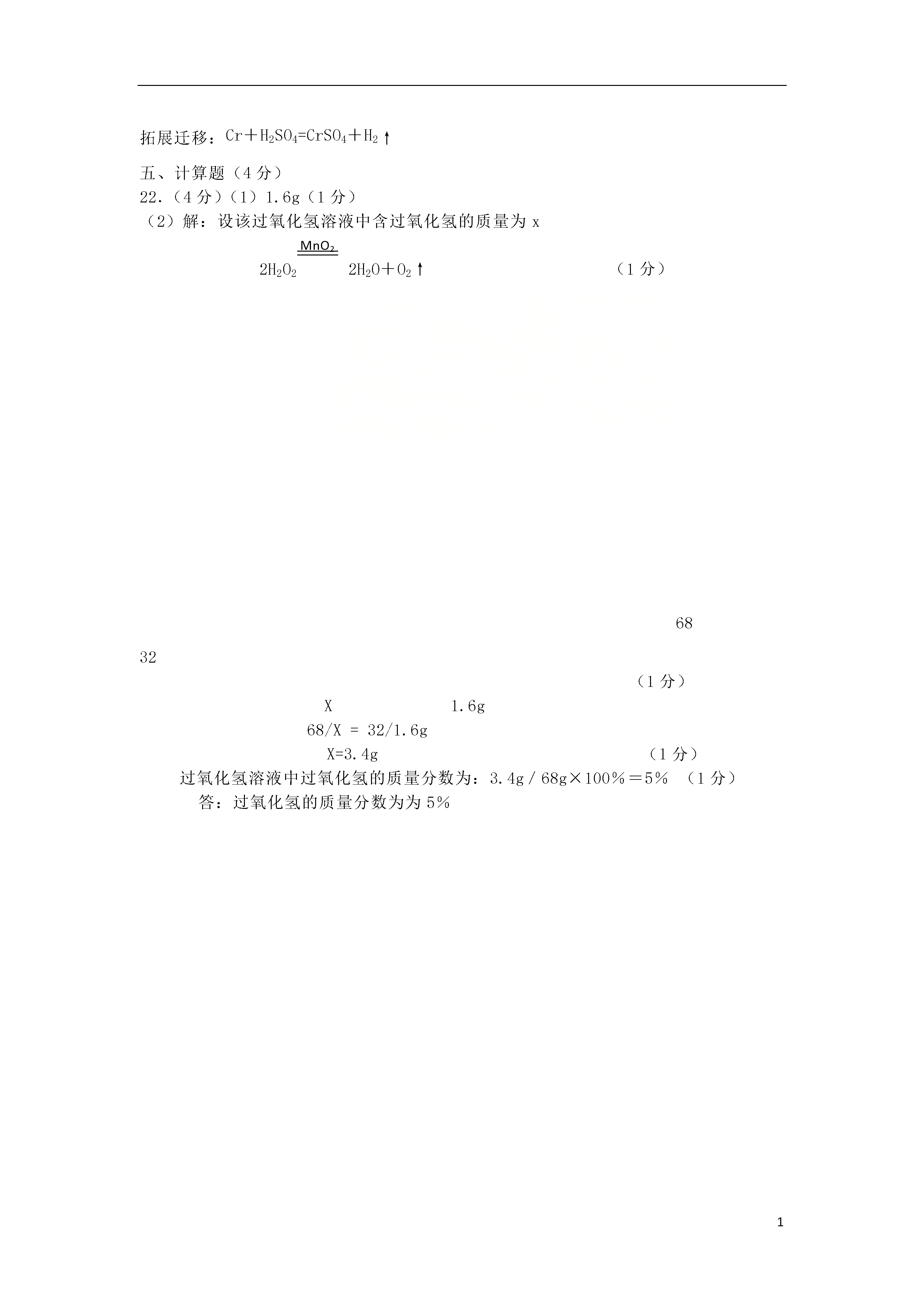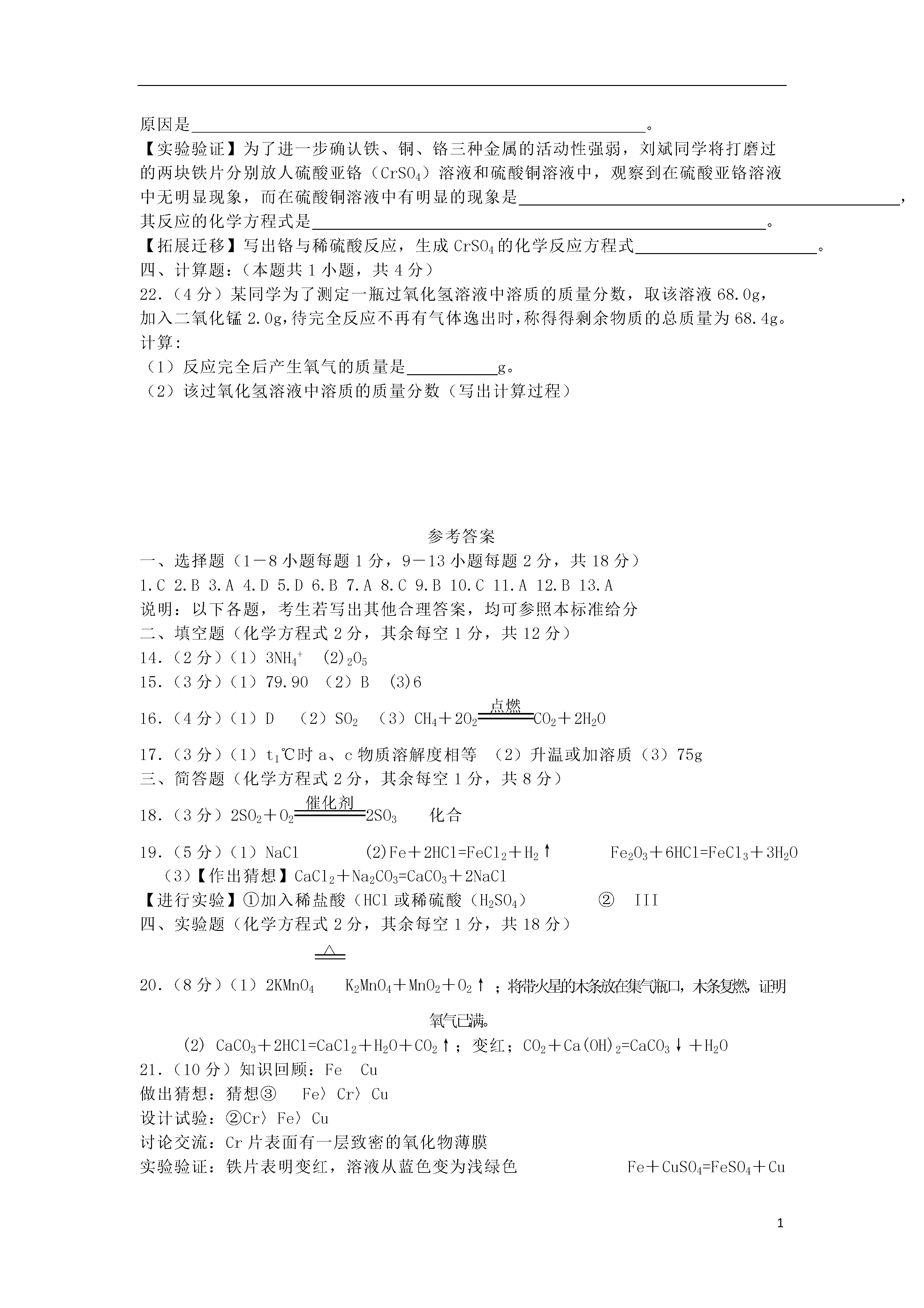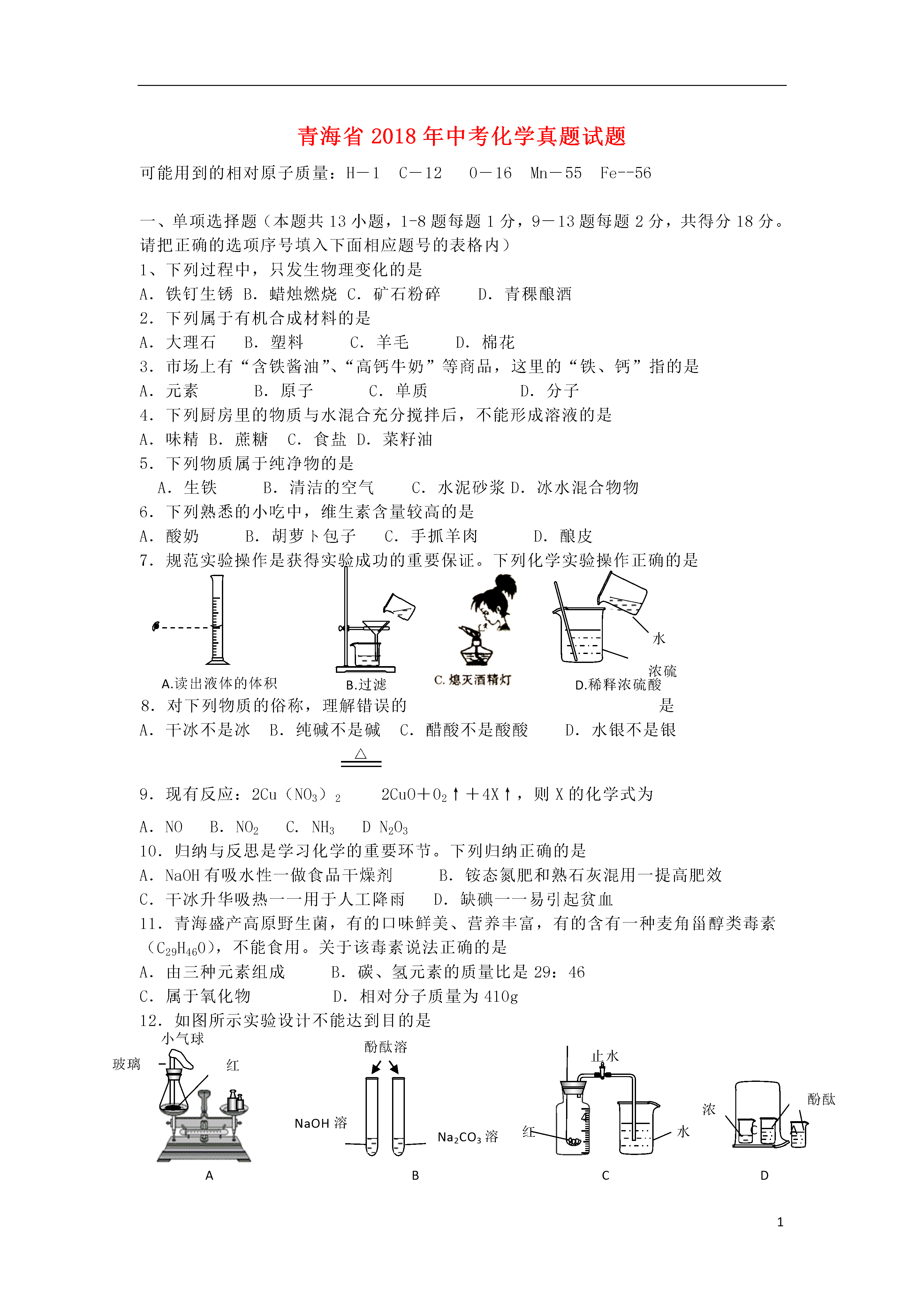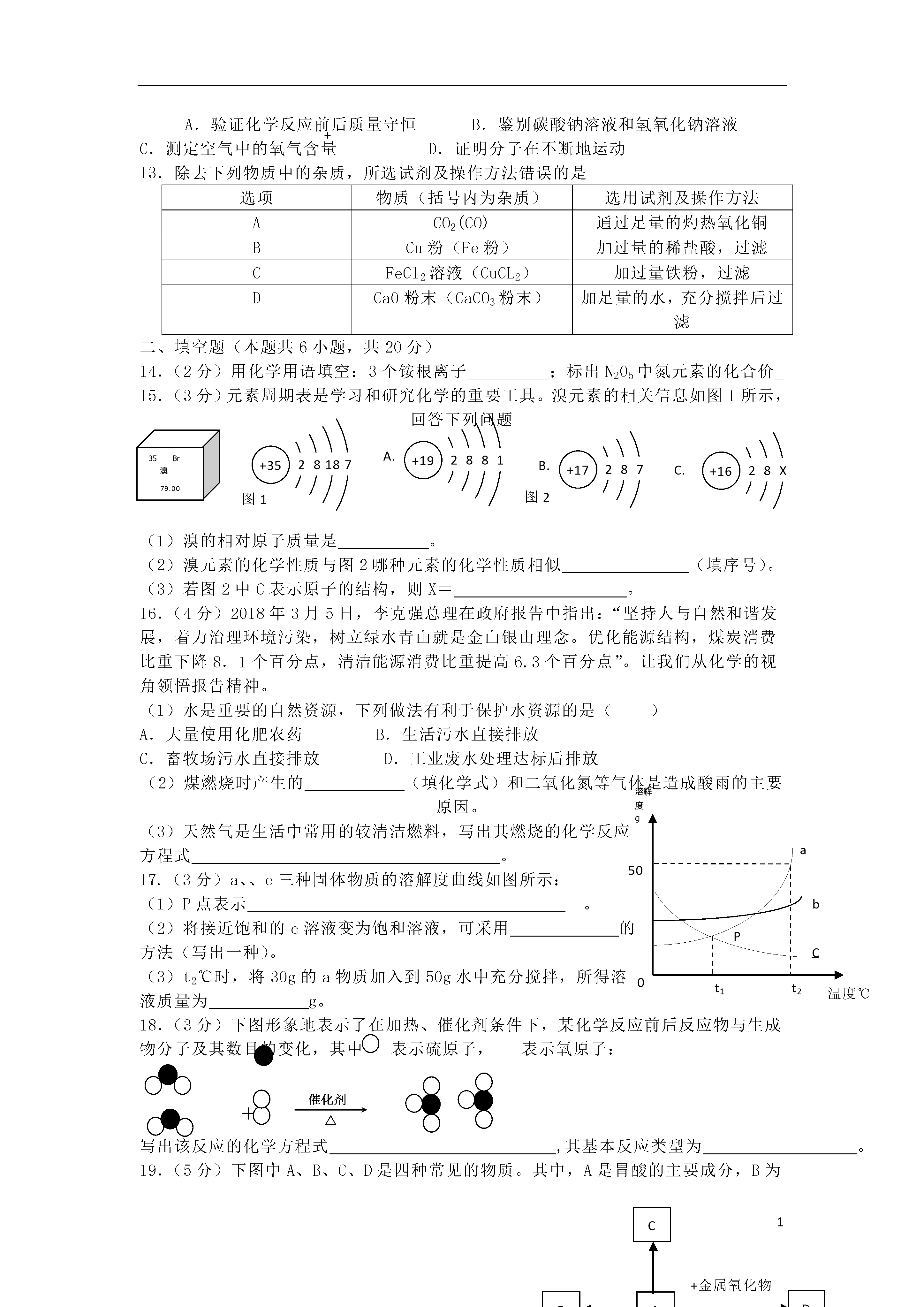 1青海省2018年中考化学真题试题可能用到的相对原子质量:H-1C-120-16Mn-55Fe--56一、单项选择题(本题共13小题,1-8题每题1分,9-13题每题2分,共得分18分。请把正确的选项序号填入下面相应题号的表格内)1、下列过程中,只发生物理变化的是A.铁钉生锈B.蜡烛燃烧C.矿石粉碎D.青稞酿酒2.下列属于有机合成材料的是A.大理石B.塑料C.羊毛D.棉花3.市场上有“含铁酱油”、“高钙牛奶”等商品,这里的“铁、钙”指的是A.元素B.原子C.单质D.分子4.下列厨房里的物质与水混合充分搅拌后,不能形成溶液的是A.味精B.蔗糖C.食盐D.菜籽油5.下列物质属于纯净物的是A.生铁B.清洁的空气C.水泥砂浆D.冰水混合物物6.下列熟悉的小吃中,维生素含量较高的是A.酸奶B.胡萝ト包子C.手抓羊肉D.酿皮浓硫酸水水水A.读出液体的体积B.过滤D.稀释浓硫酸7.规范实验操作是获得实验成功的重要保证。下列化学实验操作正确的是8.对下列物质的俗称,理解错误的是A.干冰不是冰B.纯碱不是碱C.醋酸不是酸酸D.水银不是银9.现有反应:2Cu(NO3)2△2CuO+02↑+4X↑,则X的化学式为A.NOB.NO2C.NH3DN2O310.归纳与反思是学习化学的重要环节。下列归纳正确的是A.NaOH有吸水性一做食品干燥剂B.铵态氮肥和熟石灰混用一提高肥效C.干冰升华吸热一一用于人工降雨D.缺碘一一易引起贫血11.青海盛产高原野生菌,有的口味鲜美、营养丰富,有的含有一种麦角甾醇类毒素(C29H460),不能食用。关于该毒素说法正确的是A.由三种元素组成B.碳、氢元素的质量比是29:46C.属于氧化物D.相对分子质量为410g4321止水夹红磷水小气球玻璃管红磷NaOH溶液Na2CO3溶液酚酞溶液CAB酚酞溶液浓氨水ABCD12.如图所示实验设计不能达到目的是A.验证化学反应前后质量守恒B.鉴别碳酸钠溶液和氢氧化钠溶液C.测定空气中的氧气含量D.证明分子在不断地运动13.除去下列物质中的杂质,所选试剂及操作方法错误的是选项物质(括号内为杂质)选用试剂及操作方法ACO2(CO)通过足量的灼热氧化铜BCu粉(Fe粉)加过量的稀盐酸,过滤CFeCl2溶液(CuCL2)加过量铁粉,过滤DCa0粉末(CaCO3粉末)加足量的水,充分搅拌后过滤二、填空题(本题共6小题,共20分)14.(2分)用化学用语填空:3个铵根离子;标出N205中氮元素的化合价+3528187+192881+17287+1628X35Br溴79.00图1图2A.B.C.15.(3分)元素周期表是学习和研究化学的重要工具。溴元素的相关信息如图1所示,回答下列问题(1)溴的相对原子质量是。(2)溴元素的化学性质与图2哪种元素的化学性质相似(填序号)。(3)若图2中C表示原子的结构,则X=。16.(4分)2018年3月5日,李克强总理在政府报告中指出:“坚持人与自然和谐发展,着力治理环境污染,树立绿水青山就是金山银山理念。优化能源结构,煤炭消费比重下降8.1个百分点,清洁能源消费比重提高6.3个百分点”。让我们从化学的视角领悟报告精神。(1)水是重要的自然资源,下列做法有利于保护水资源的是()A.大量使用化肥农药B.生活污水直接排放C.畜牧场污水直接排放D.工业废水处理达标后排放溶解度g温度℃aCt2050t1bP(2)煤燃烧时产生的(填化学式)和二氧化氮等气体是造成酸雨的主要原因。(3)天然气是生活中常用的较清洁燃料,写出其燃烧的化学反应方程式。17.(3分)a、、e三种固体物质的溶解度曲线如图所示:(1)P点表示。(2)将接近饱和的c溶液变为饱和溶液,可采用的方法(写出一种)。(3)t2℃时,将30g的a物质加入到50g水中充分搅拌,所得溶液质量为g。18.(3分)下图形象地表示了在加热、催化剂条件下,某化学反应前后反应物与生成物分子及其数目的变化,其中表示硫原子,表示氧原子:+++写出该反应的化学方程式,其基本反应类型为。CBAD+金属氧化物19.(5分)下图中A、B、C、D是四种常见的物质。其中,A是胃酸的主要成分,B为最轻的气体,C属于盐类,是用小苏打治疗胃酸过多症时发生反应的生成物之一,D的溶液呈黄色。(1)C物质的化学式是。(2)写出符合下列转化的化学反应方程式:A→B:(只写一个)A→D:。三、实验题(本题共2小题,共18分)20.(8分)下图是实验室制取气体并验证气体