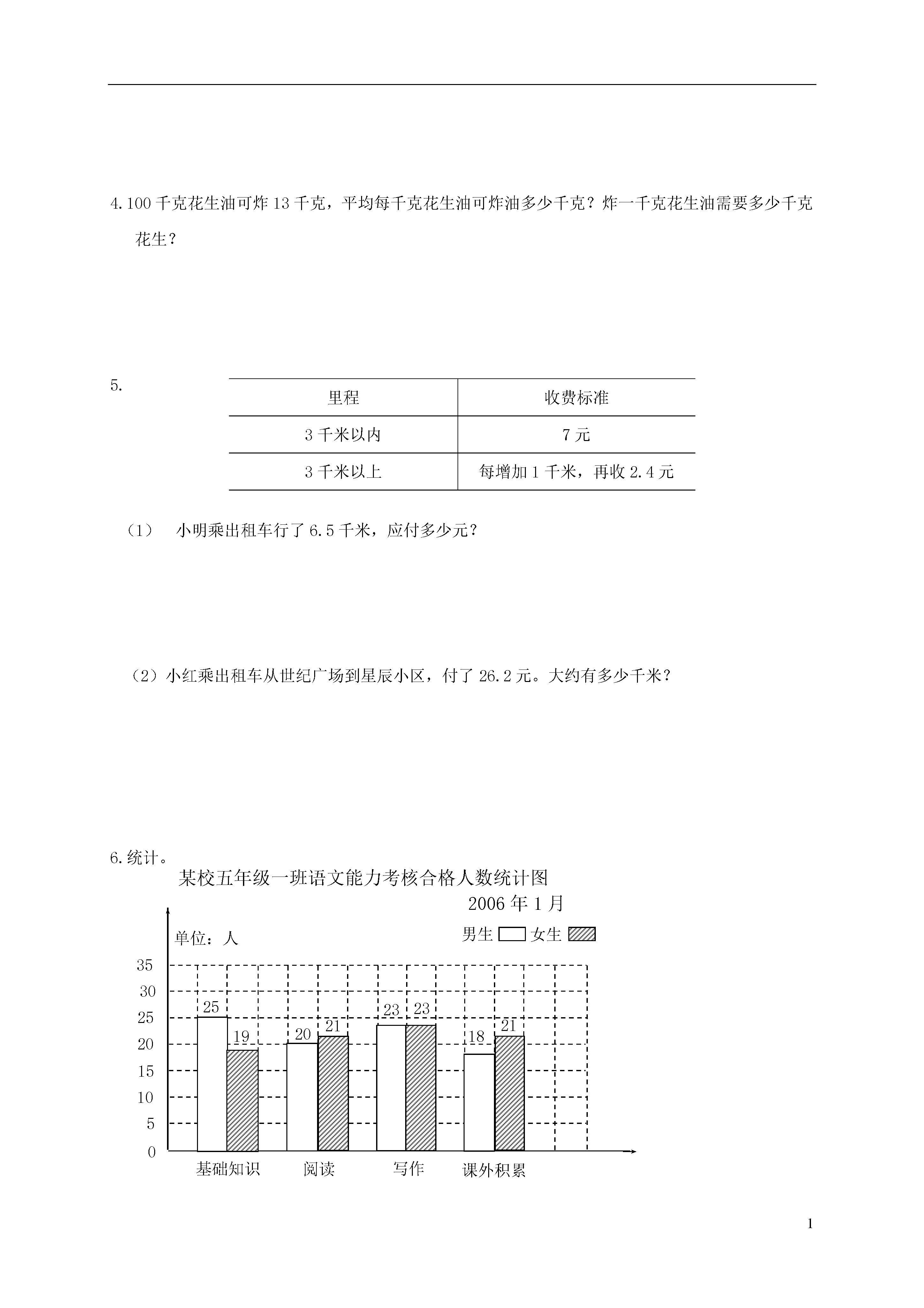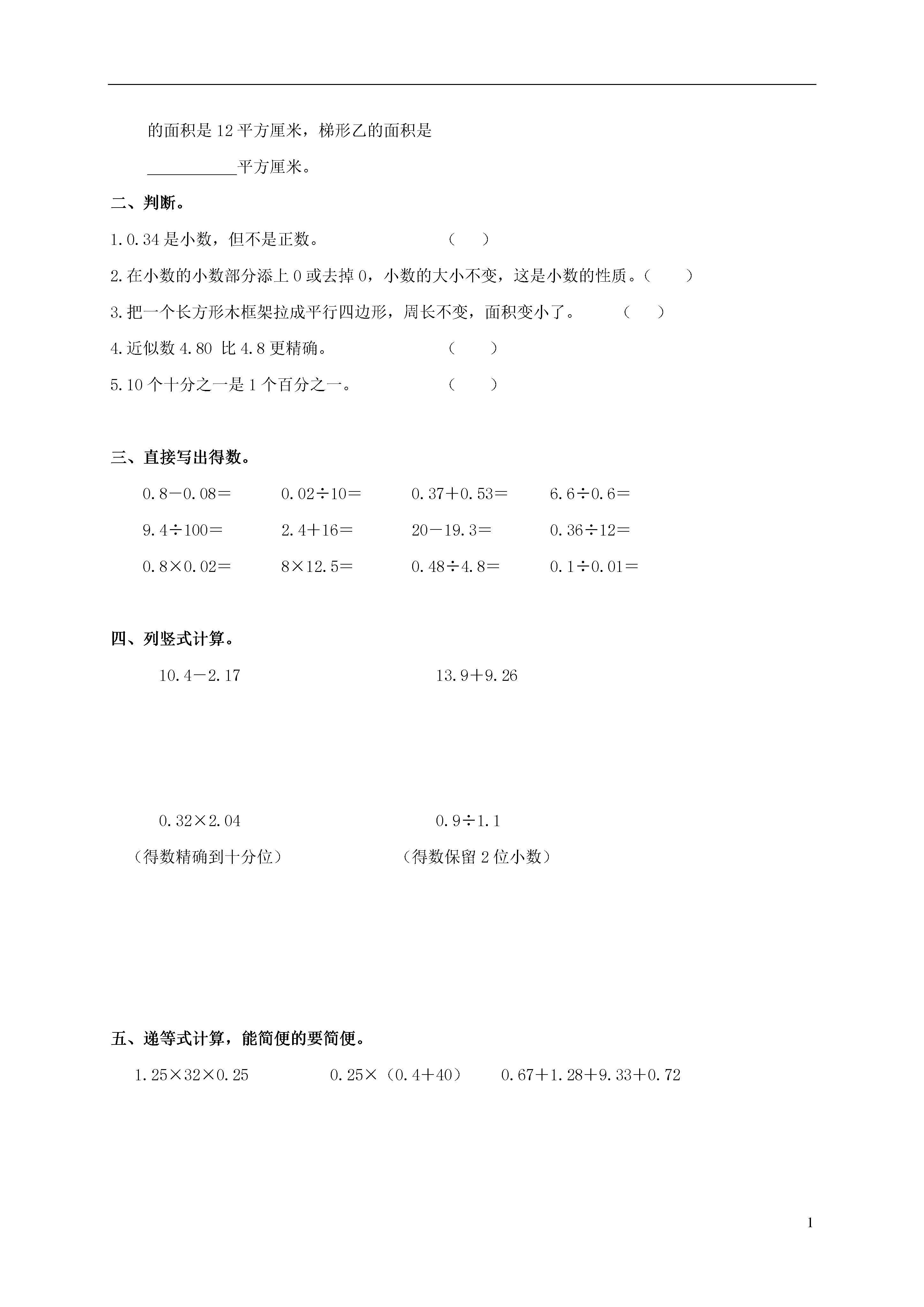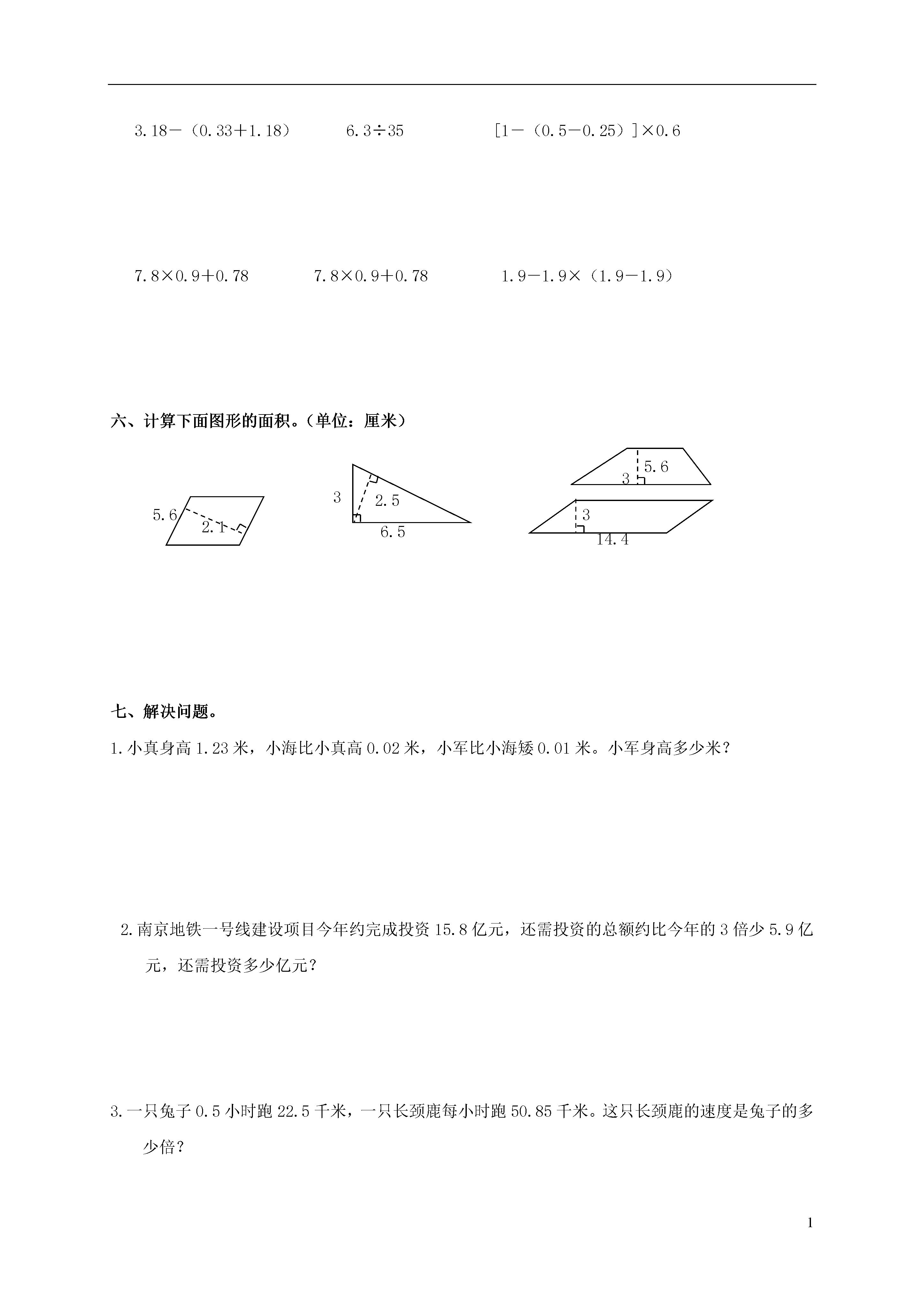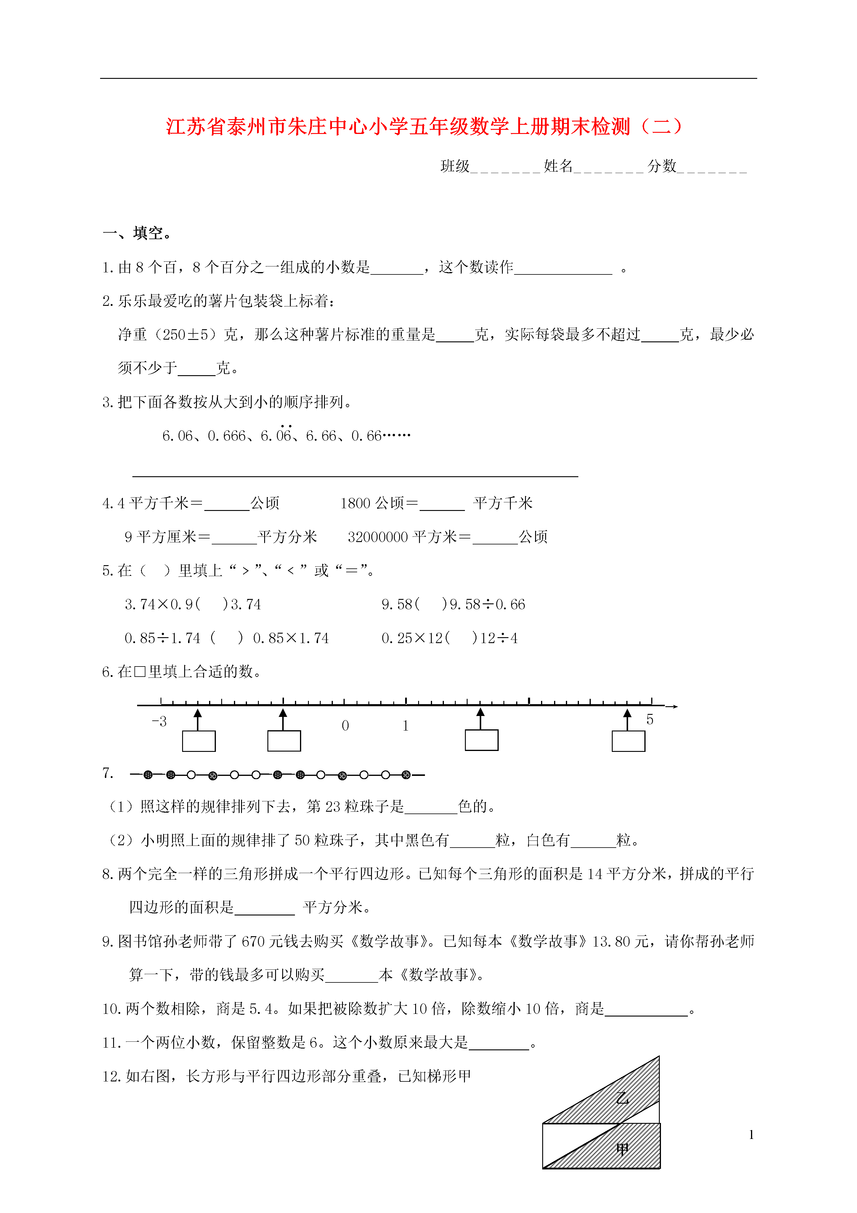 1江苏省泰州市朱庄中心小学五年级数学上册期末检测(二)班级_______姓名_______分数_______一、填空。1.由8个百,8个百分之一组成的小数是,这个数读作。2.乐乐最爱吃的薯片包装袋上标着:净重(250±5)克,那么这种薯片标准的重量是克,实际每袋最多不超过克,最少必须不少于克。..3.把下面各数按从大到小的顺序排列。6.06、0.666、6.06、6.66、0.66……4.4平方千米=公顷1800公顷=平方千米9平方厘米=平方分米32000000平方米=公顷5.在()里填上“﹥”、“﹤”或“=”。3.74×0.9()3.749.58()9.58÷0.660.85÷1.74()0.85×1.740.25×12()12÷46.在□里填上合适的数。01-3→57.(1)照这样的规律排列下去,第23粒珠子是色的。(2)小明照上面的规律排了50粒珠子,其中黑色有粒,白色有粒。8.两个完全一样的三角形拼成一个平行四边形。已知每个三角形的面积是14平方分米,拼成的平行四边形的面积是平方分米。9.图书馆孙老师带了670元钱去购买《数学故事》。已知每本《数学故事》13.80元,请你帮孙老师算一下,带的钱最多可以购买本《数学故事》。10.两个数相除,商是5.4。如果把被除数扩大10倍,除数缩小10倍,商是。甲乙11.一个两位小数,保留整数是6。这个小数原来最大是。12.如右图,长方形与平行四边形部分重叠,已知梯形甲的面积是12平方厘米,梯形乙的面积是平方厘米。二、判断。1.0.34是小数,但不是正数。()2.在小数的小数部分添上0或去掉0,小数的大小不变,这是小数的性质。()3.把一个长方形木框架拉成平行四边形,周长不变,面积变小了。()4.近似数4.80比4.8更精确。()5.10个十分之一是1个百分之一。()三、直接写出得数。0.8-0.08=0.02÷10=0.37+0.53=6.6÷0.6=9.4÷100=2.4+16=20-19.3=0.36÷12=0.8×0.02=8×12.5=0.48÷4.8=0.1÷0.01=四、列竖式计算。10.4-2.1713.9+9.260.32×2.040.9÷1.1(得数精确到十分位)(得数保留2位小数)五、递等式计算,能简便的要简便。1.25×32×0.250.25×(0.4+40)0.67+1.28+9.33+0.723.18-(0.33+1.18)6.3÷35[1-(0.5-0.25)]×0.67.8×0.9+0.787.8×0.9+0.781.9-1.9×(1.9-1.9)六、计算下面图形的面积。(单位:厘米)35.66.532.532.15.614.4七、解决问题。1.小真身高1.23米,小海比小真高0.02米,小军比小海矮0.01米。小军身高多少米?2.南京地铁一号线建设项目今年约完成投资15.8亿元,还需投资的总额约比今年的3倍少5.9亿元,还需投资多少亿元?3.一只兔子0.5小时跑22.5千米,一只长颈鹿每小时跑50.85千米。这只长颈鹿的速度是兔子的多少倍?4.100千克花生油可炸13千克,平均每千克花生油可炸油多少千克?炸一千克花生油需要多少千克花生?里程收费标准3千米以内7元3千米以上每增加1千米,再收2.4元5.小明乘出租车行了6.5千米,应付多少元?(2)小红乘出租车从世纪广场到星辰小区,付了26.2元。大约有多少千米?→基础知识阅读课外积累某校五年级一班语文能力考核合格人数统计图2006年1月353025201510单位:人男生女生05写作↑19252021232123186.统计。1.根据上面的统计图,填写下面的统计表。项目人数性别男女基础知识课外积累阅读写作2.这个班至少有多少人?哪一个项目合格的人数最多?3.从上面的统计图或统计表中,你还能知道些什么?(至少写两条)
