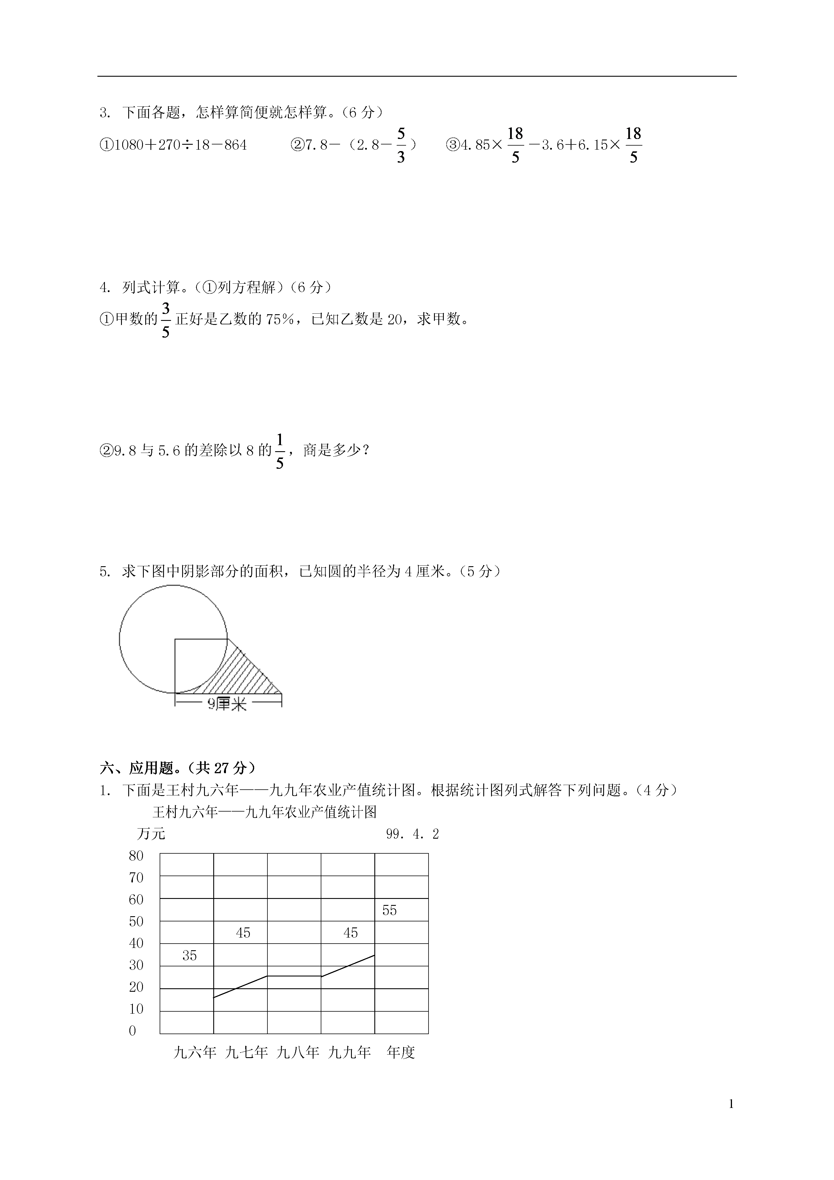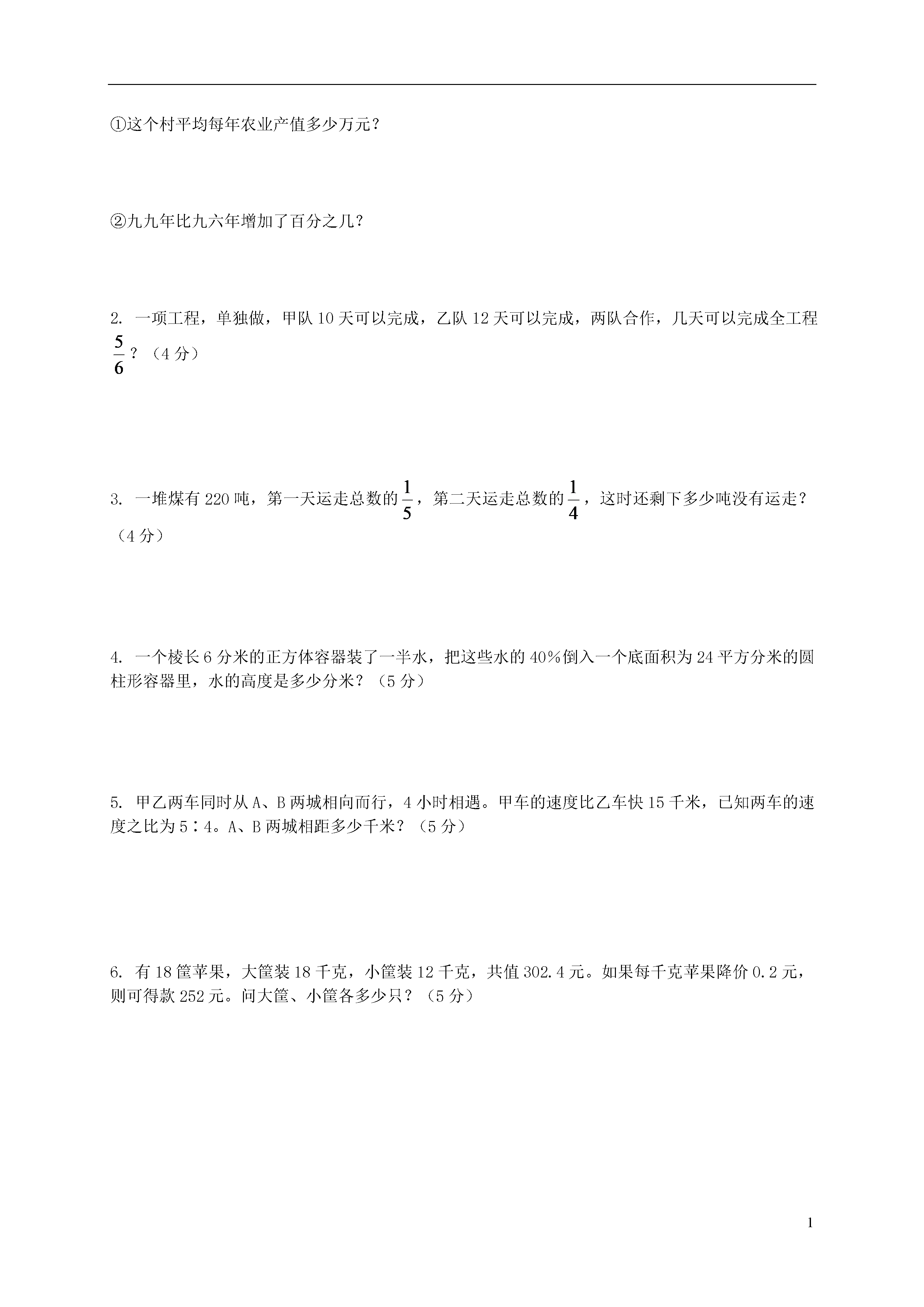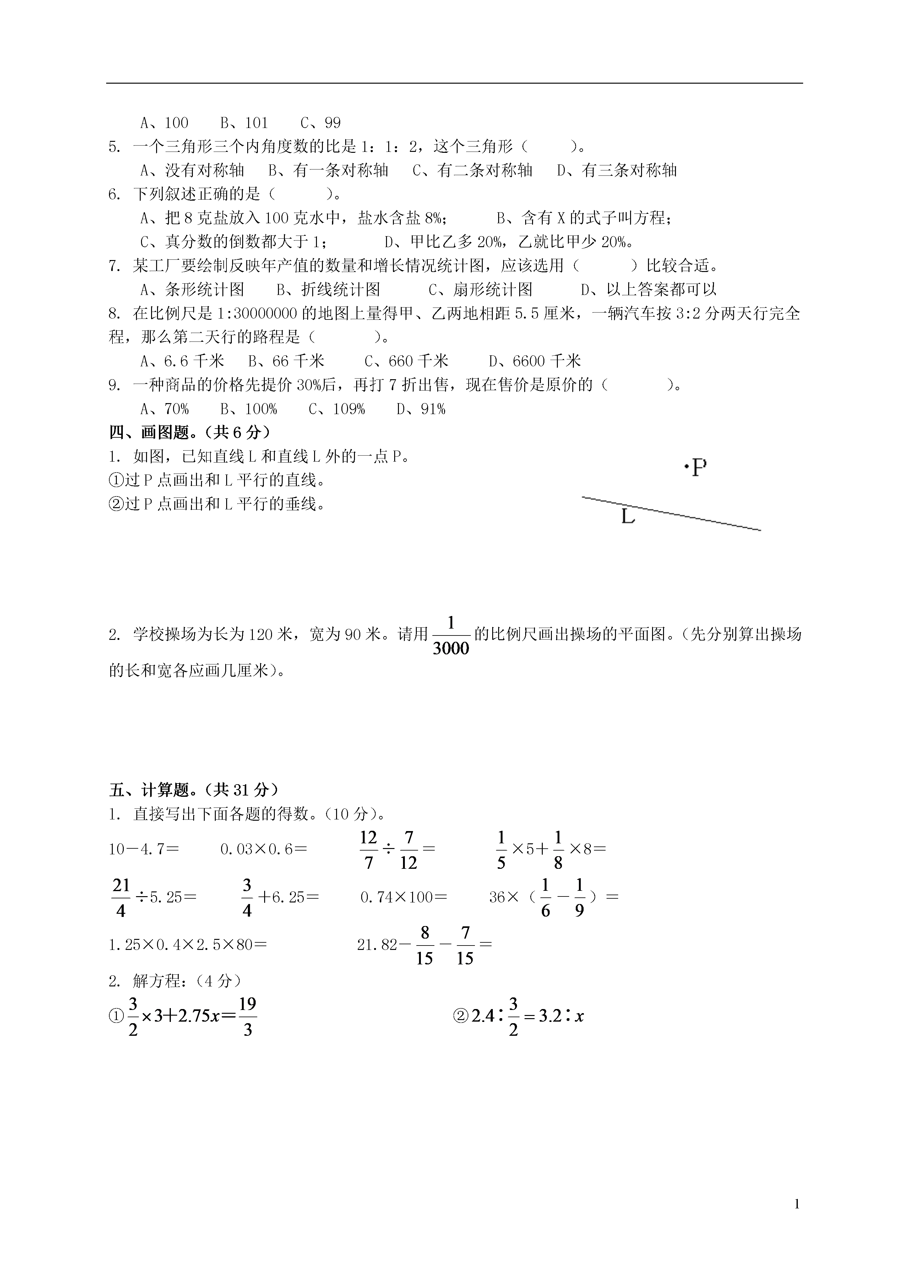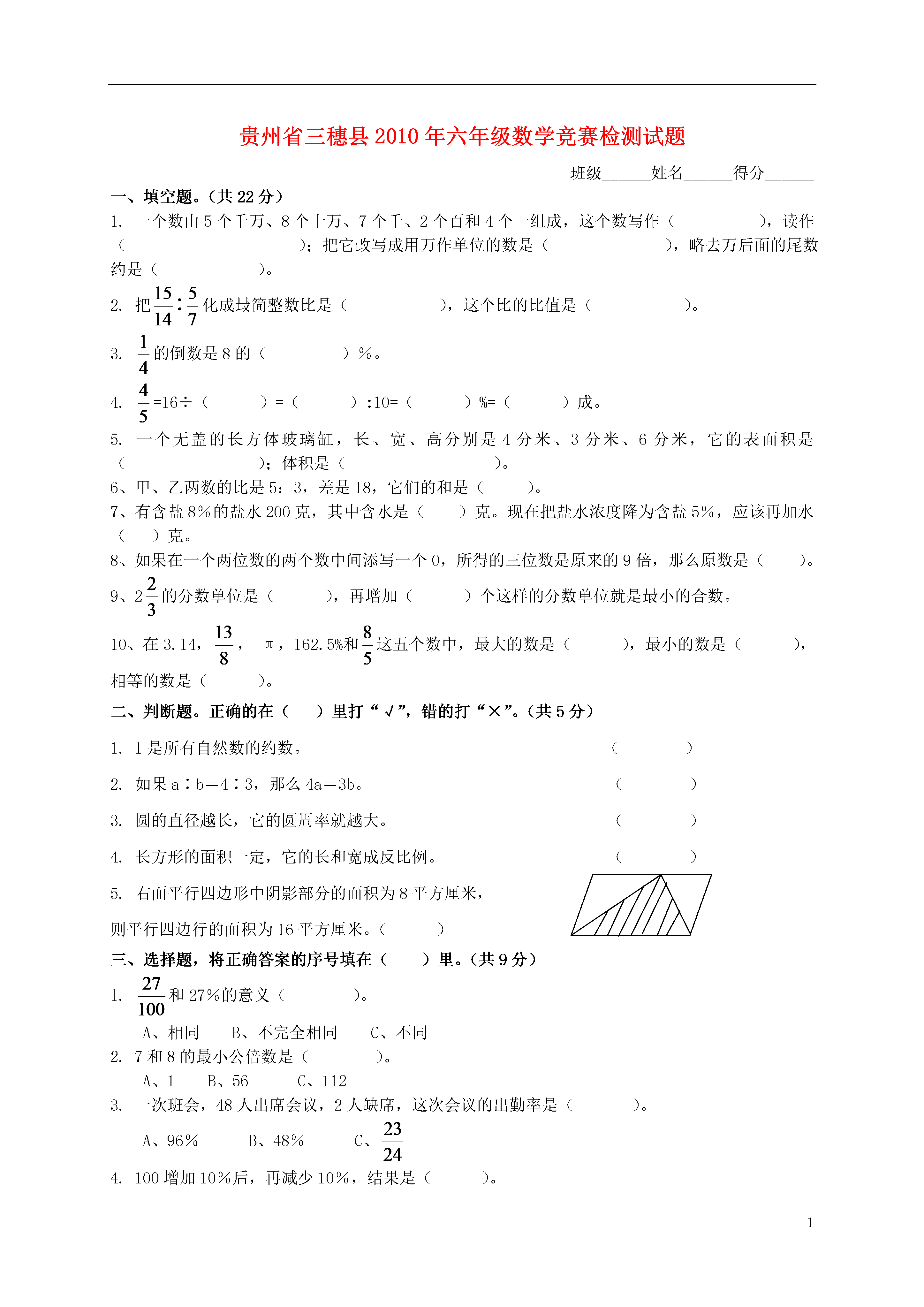 1贵州省三穗县2010年六年级数学竞赛检测试题班级______姓名______得分______一、填空题。(共22分)1.一个数由5个千万、8个十万、7个千、2个百和4个一组成,这个数写作(),读作();把它改写成用万作单位的数是(),略去万后面的尾数约是()。2.把化成最简整数比是(),这个比的比值是()。3.的倒数是8的()%。4.=16÷()=():10=()%=()成。5.一个无盖的长方体玻璃缸,长、宽、高分别是4分米、3分米、6分米,它的表面积是();体积是()。6、甲、乙两数的比是5:3,差是18,它们的和是()。7、有含盐8%的盐水200克,其中含水是()克。现在把盐水浓度降为含盐5%,应该再加水()克。8、如果在一个两位数的两个数中间添写一个0,所得的三位数是原来的9倍,那么原数是()。9、2的分数单位是(),再增加()个这样的分数单位就是最小的合数。10、在3.14,,π,162.5%和这五个数中,最大的数是(),最小的数是(),相等的数是()。二、判断题。正确的在()里打“√”,错的打“×”。(共5分)1.l是所有自然数的约数。()2.如果a∶b=4∶3,那么4a=3b。()3.圆的直径越长,它的圆周率就越大。()4.长方形的面积一定,它的长和宽成反比例。()5.右面平行四边形中阴影部分的面积为8平方厘米,则平行四边行的面积为16平方厘米。()三、选择题,将正确答案的序号填在()里。(共9分)l.和27%的意义()。A、相同B、不完全相同C、不同2.7和8的最小公倍数是()。A、1B、56C、1123.一次班会,48人出席会议,2人缺席,这次会议的出勤率是()。A、96%B、48%C、4.100增加10%后,再减少10%,结果是()。A、100B、101C、995.一个三角形三个内角度数的比是1:1:2,这个三角形()。A、没有对称轴B、有一条对称轴C、有二条对称轴D、有三条对称轴6.下列叙述正确的是()。A、把8克盐放入100克水中,盐水含盐8%;B、含有X的式子叫方程;C、真分数的倒数都大于1;D、甲比乙多20%,乙就比甲少20%。7.某工厂要绘制反映年产值的数量和增长情况统计图,应该选用()比较合适。A、条形统计图B、折线统计图C、扇形统计图D、以上答案都可以8.在比例尺是1:30000000的地图上量得甲、乙两地相距5.5厘米,一辆汽车按3:2分两天行完全程,那么第二天行的路程是()。A、6.6千米B、66千米C、660千米D、6600千米9.一种商品的价格先提价30%后,再打7折出售,现在售价是原价的()。A、70%B、100%C、109%D、91%四、画图题。(共6分)1.如图,已知直线L和直线L外的一点P。①过P点画出和L平行的直线。②过P点画出和L平行的垂线。2.学校操场为长为120米,宽为90米。请用的比例尺画出操场的平面图。(先分别算出操场的长和宽各应画几厘米)。五、计算题。(共31分)l.直接写出下面各题的得数。(10分)。10-4.7=0.03×0.6=÷=×5+×8=÷5.25=+6.25=0.74×100=36×(-)=1.25×0.4×2.5×80=21.82--=2.解方程:(4分)①②3.下面各题,怎样算简便就怎样算。(6分)①1080+270÷18-864②7.8-(2.8-)③4.85×-3.6+6.15×4.列式计算。(①列方程解)(6分)①甲数的正好是乙数的75%,已知乙数是20,求甲数。②9.8与5.6的差除以8的,商是多少?5.求下图中阴影部分的面积,已知圆的半径为4厘米。(5分)六、应用题。(共27分)1.下面是王村九六年——九九年农业产值统计图。根据统计图列式解答下列问题。(4分)王村九六年——九九年农业产值统计图万元99.4.25545453580706050403020100九六年九七年九八年九九年年度①这个村平均每年农业产值多少万元?②九九年比九六年增加了百分之几?2.一项工程,单独做,甲队10天可以完成,乙队12天可以完成,两队合作,几天可以完成全工程?(4分)3.一堆煤有220吨,第一天运走总数的,第二天运走总数的,这时还剩下多少吨没有运走?(4分)4.一个棱长6分米的正方体容器装了一半水,把这些水的40%倒入一个底面积为24平方分米的圆柱形容器里,水的高度是多少分米?(5分)5.甲乙两车同时从A、B两城相向而行,4小时相遇。甲车的速度比乙车快15千米,已知两车的速度之比为5∶4