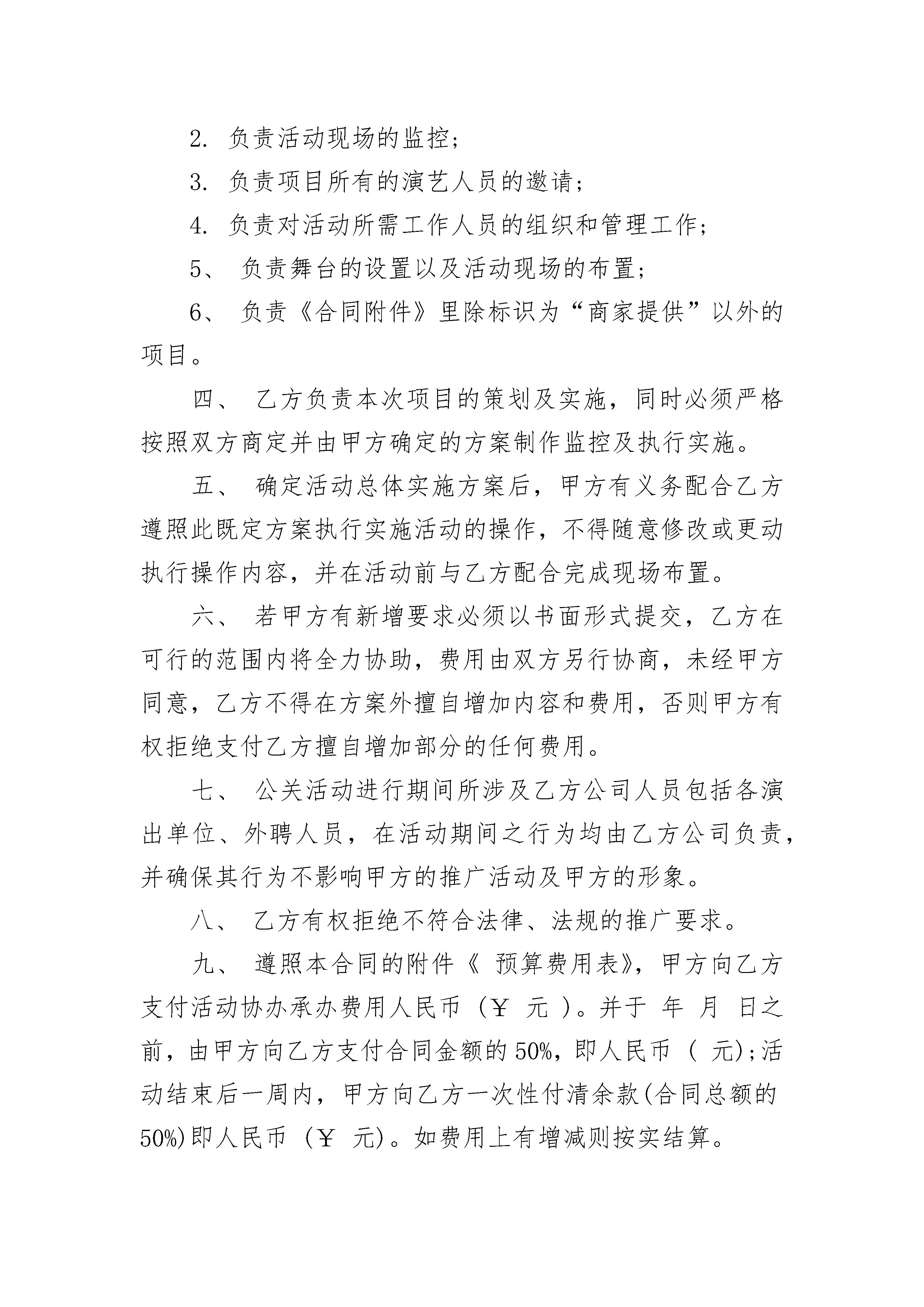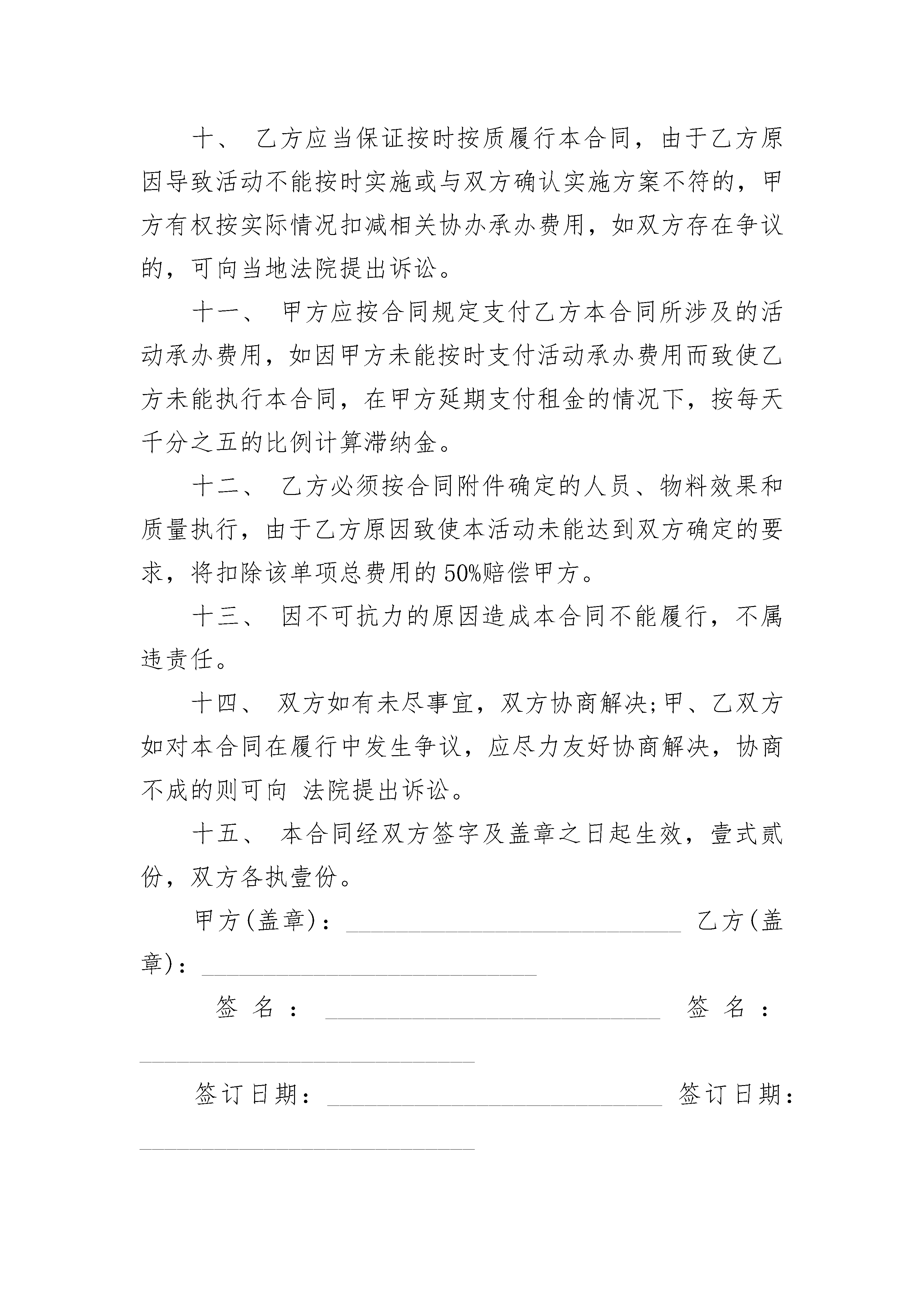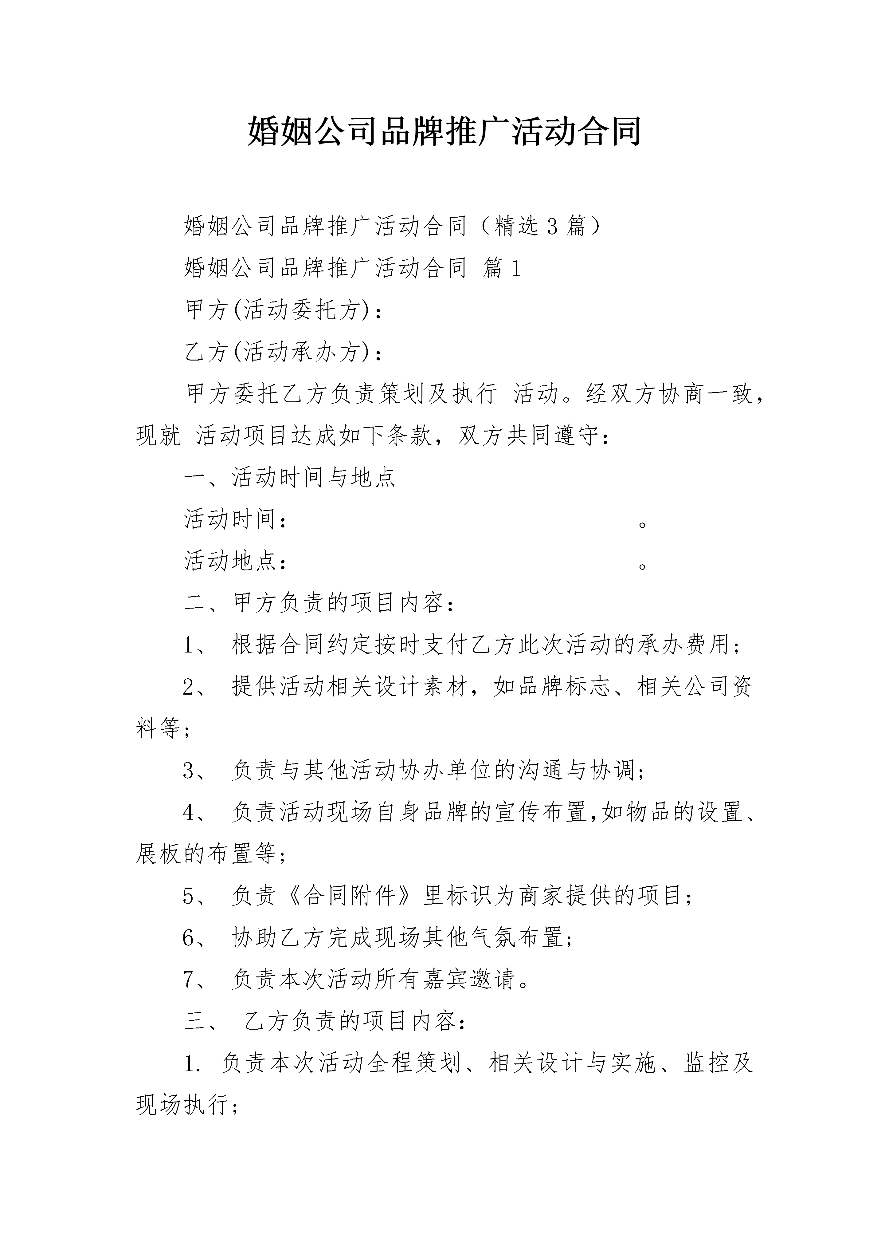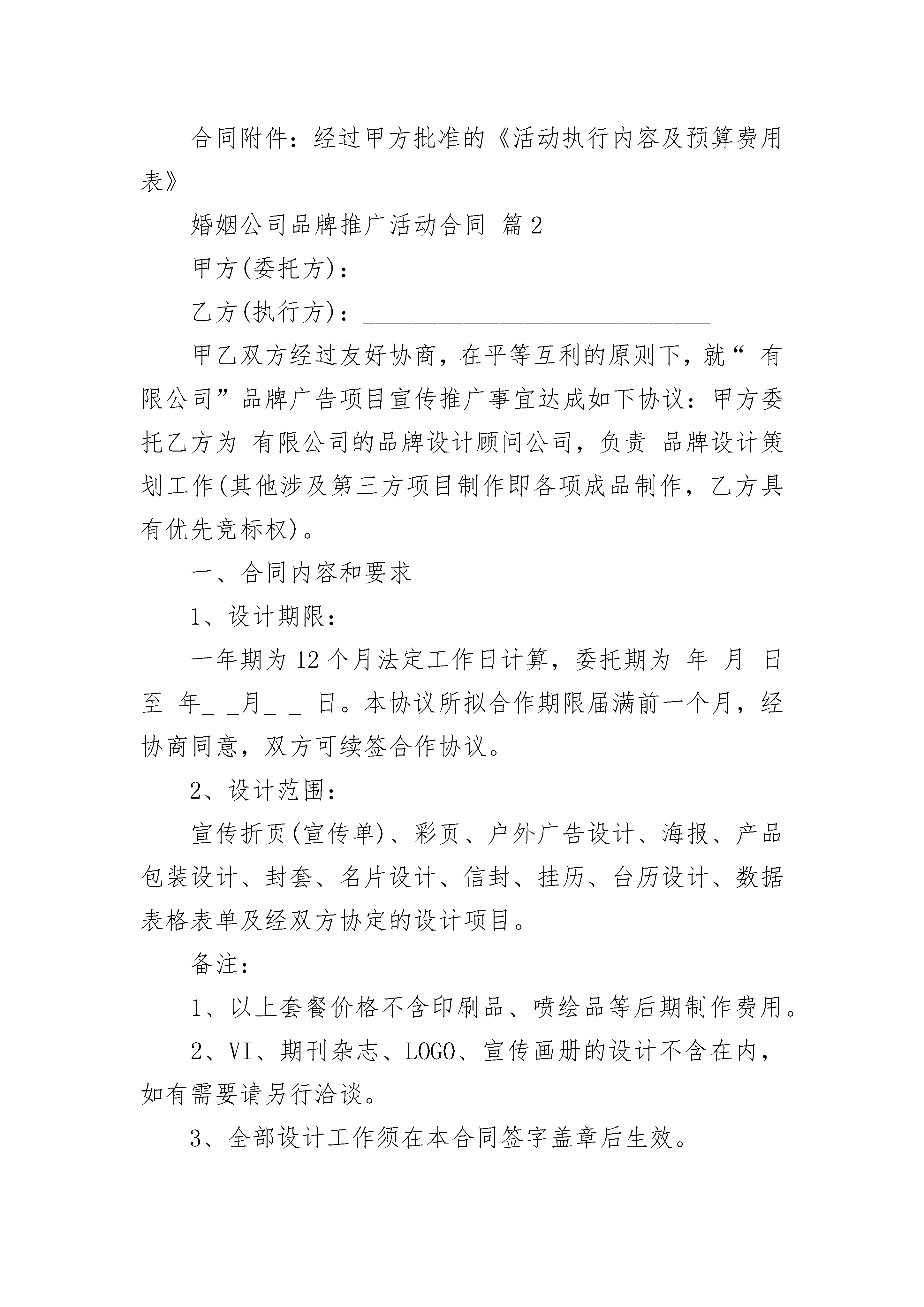 婚姻公司品牌推广活动合同婚姻公司品牌推广活动合同(精选3篇)婚姻公司品牌推广活动合同篇1甲方(活动委托方):___________________________乙方(活动承办方):___________________________甲方委托乙方负责策划及执行活动。经双方协商一致,现就活动项目达成如下条款,双方共同遵守:一、活动时间与地点活动时间:___________________________。活动地点:___________________________。二、甲方负责的项目内容:1、根据合同约定按时支付乙方此次活动的承办费用;2、提供活动相关设计素材,如品牌标志、相关公司资料等;3、负责与其他活动协办单位的沟通与协调;4、负责活动现场自身品牌的宣传布置,如物品的设置、展板的布置等;5、负责《合同附件》里标识为商家提供的项目;6、协助乙方完成现场其他气氛布置;7、负责本次活动所有嘉宾邀请。三、乙方负责的项目内容:1.负责本次活动全程策划、相关设计与实施、监控及现场执行;2.负责活动现场的监控;3.负责项目所有的演艺人员的邀请;4.负责对活动所需工作人员的组织和管理工作;5、负责舞台的设置以及活动现场的布置;6、负责《合同附件》里除标识为“商家提供”以外的项目。四、乙方负责本次项目的策划及实施,同时必须严格按照双方商定并由甲方确定的方案制作监控及执行实施。五、确定活动总体实施方案后,甲方有义务配合乙方遵照此既定方案执行实施活动的操作,不得随意修改或更动执行操作内容,并在活动前与乙方配合完成现场布置。六、若甲方有新增要求必须以书面形式提交,乙方在可行的范围内将全力协助,费用由双方另行协商,未经甲方同意,乙方不得在方案外擅自增加内容和费用,否则甲方有权拒绝支付乙方擅自增加部分的任何费用。七、公关活动进行期间所涉及乙方公司人员包括各演出单位、外聘人员,在活动期间之行为均由乙方公司负责,并确保其行为不影响甲方的推广活动及甲方的形象。八、乙方有权拒绝不符合法律、法规的推广要求。九、遵照本合同的附件《预算费用表》,甲方向乙方支付活动协办承办费用人民币(¥元)。并于年月日之前,由甲方向乙方支付合同金额的50%,即人民币(元);活动结束后一周内,甲方向乙方一次性付清余款(合同总额的50%)即人民币(¥元)。如费用上有增减则按实结算。十、乙方应当保证按时按质履行本合同,由于乙方原因导致活动不能按时实施或与双方确认实施方案不符的,甲方有权按实际情况扣减相关协办承办费用,如双方存在争议的,可向当地法院提出诉讼。十一、甲方应按合同规定支付乙方本合同所涉及的活动承办费用,如因甲方未能按时支付活动承办费用而致使乙方未能执行本合同,在甲方延期支付租金的情况下,按每天千分之五的比例计算滞纳金。十二、乙方必须按合同附件确定的人员、物料效果和质量执行,由于乙方原因致使本活动未能达到双方确定的要求,将扣除该单项总费用的50%赔偿甲方。十三、因不可抗力的原因造成本合同不能履行,不属违责任。十四、双方如有未尽事宜,双方协商解决;甲、乙双方如对本合同在履行中发生争议,应尽力友好协商解决,协商不成的则可向法院提出诉讼。十五、本合同经双方签字及盖章之日起生效,壹式贰份,双方各执壹份。甲方(盖章):___________________________乙方(盖章):___________________________签名:___________________________签名:___________________________签订日期:___________________________签订日期:___________________________合同附件:经过甲方批准的《活动执行内容及预算费用表》婚姻公司品牌推广活动合同篇2甲方(委托方):____________________________乙方(执行方):____________________________甲乙双方经过友好协商,在平等互利的原则下,就“有限公司”品牌广告项目宣传推广事宜达成如下协议:甲方委托乙方为有限公司的品牌设计顾问公司,负责品牌设计策划工作(其他涉及第三方项目制作即各项成品制作,乙方具有优先竞标权)。一、合同内容和要求1、设计期限:一年期为12个月法定工作日计算,委托期为年月日至年__月__日。本协议所拟合作期限届满前一个月,经协商同意,双方可续签合作协议。2、设计范围:宣传折页(宣传单)、彩页、户外广告设计、海报、产品包装设计、封套、名片设计、信封、挂历、台历设计、数据表格表单及经双方协定的设计项目。备注:1、以上套餐价格不含印刷品、喷绘品等后期制作费用。2、VI、期刊杂志、LOGO、宣传画册的设计不含在内,如有需要请另行洽谈。3、全部设计工作须在本合同签字盖章后生