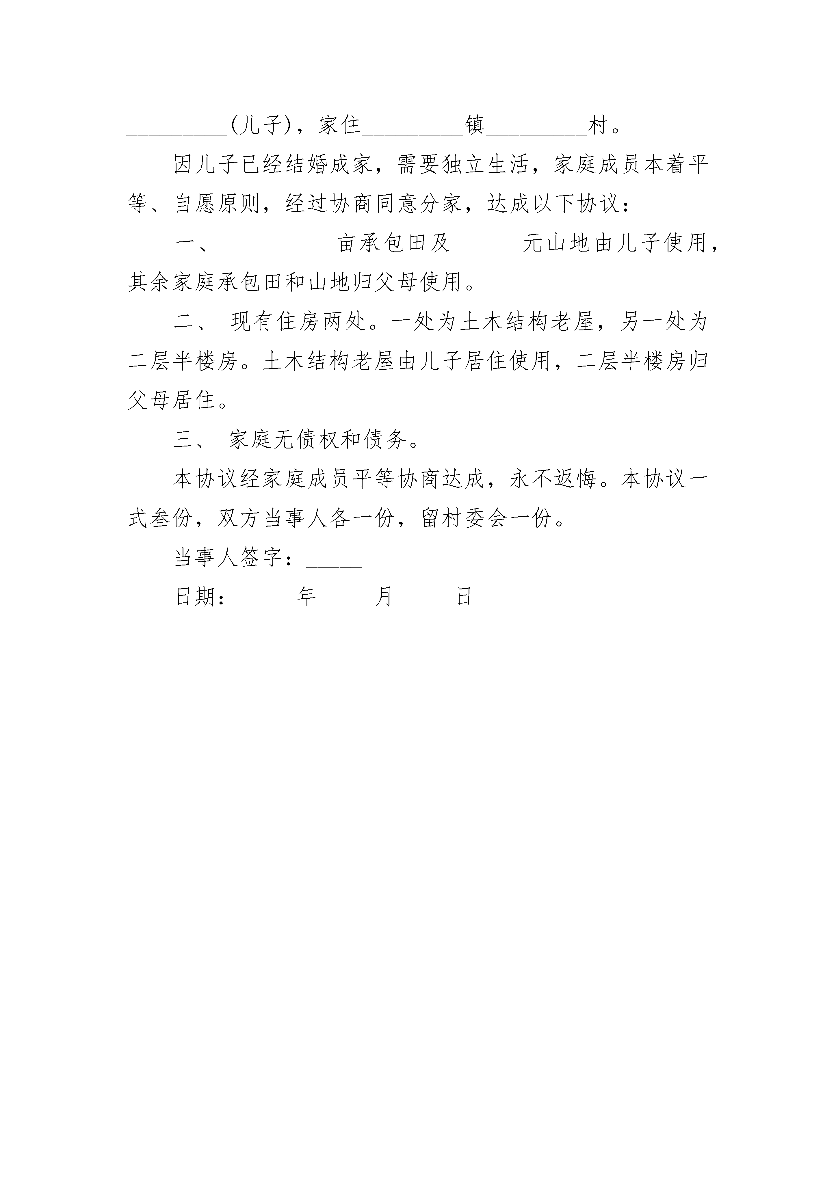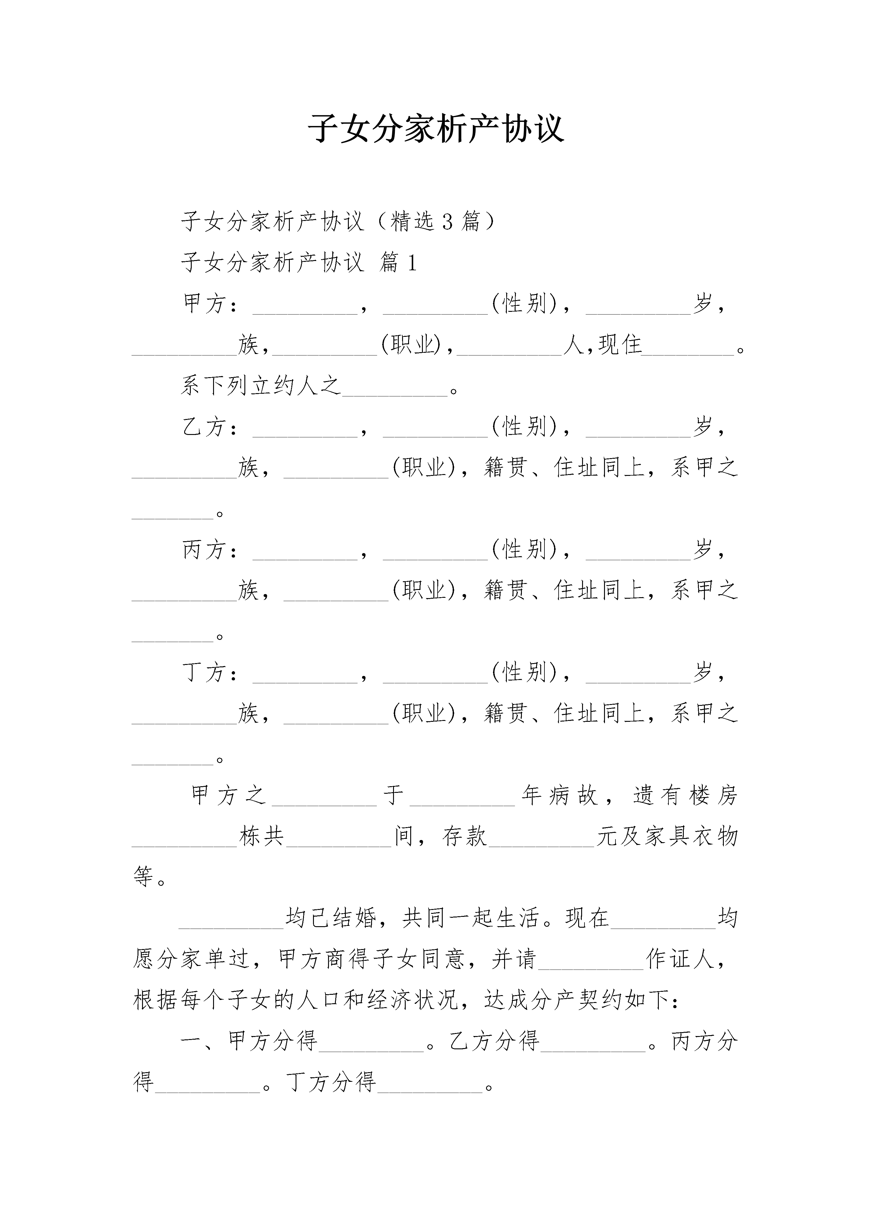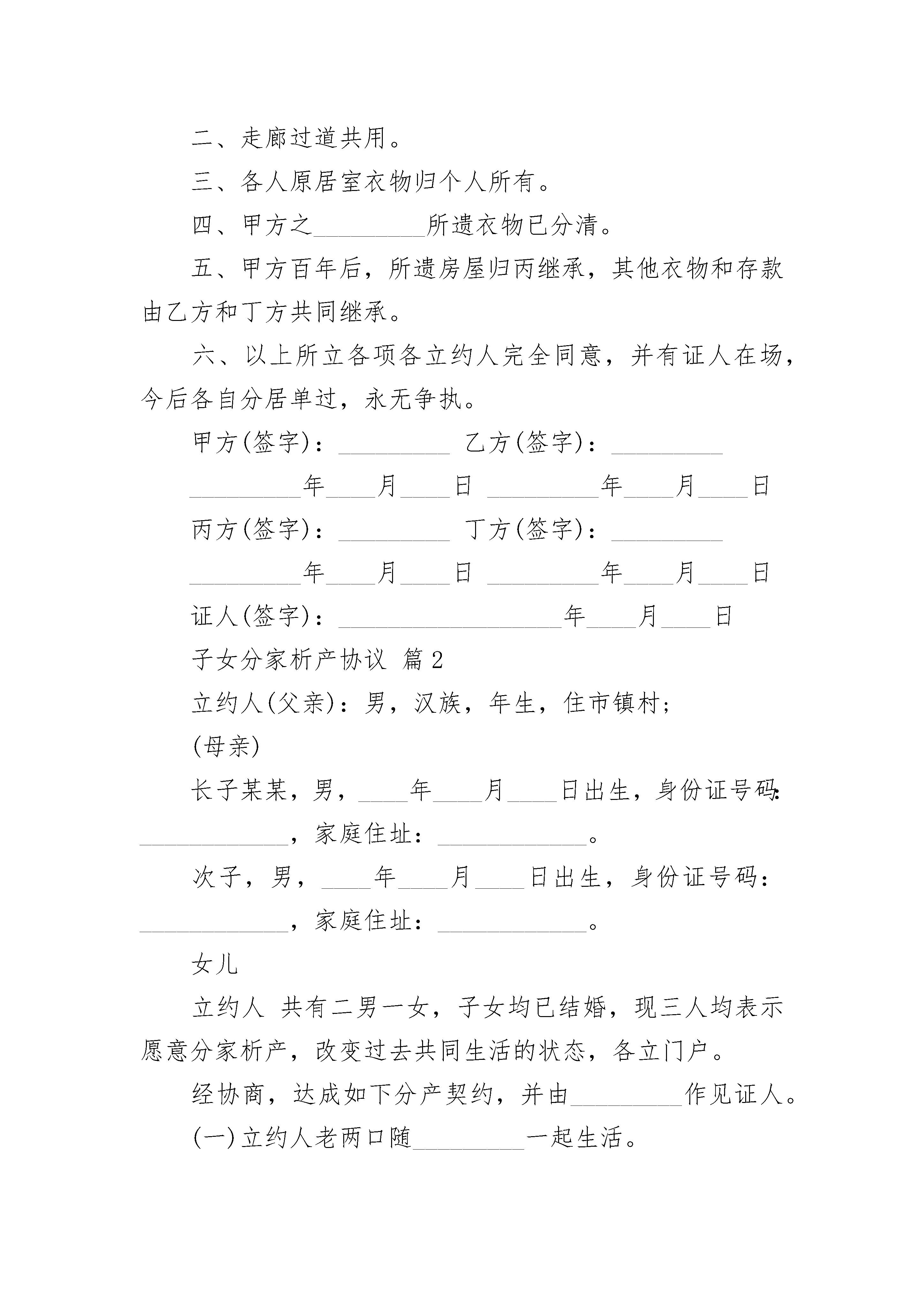 子女分家析产协议子女分家析产协议(精选3篇)子女分家析产协议篇1甲方:_________,_________(性别),_________岁,_________族,_________(职业),_________人,现住________。系下列立约人之_________。乙方:_________,_________(性别),_________岁,_________族,_________(职业),籍贯、住址同上,系甲之_______。丙方:_________,_________(性别),_________岁,_________族,_________(职业),籍贯、住址同上,系甲之_______。丁方:_________,_________(性别),_________岁,_________族,_________(职业),籍贯、住址同上,系甲之_______。甲方之_________于_________年病故,遗有楼房_________栋共_________间,存款_________元及家具衣物等。_________均己结婚,共同一起生活。现在_________均愿分家单过,甲方商得子女同意,并请_________作证人,根据每个子女的人口和经济状况,达成分产契约如下:一、甲方分得_________。乙方分得_________。丙方分得_________。丁方分得_________。二、走廊过道共用。三、各人原居室衣物归个人所有。四、甲方之_________所遗衣物已分清。五、甲方百年后,所遗房屋归丙继承,其他衣物和存款由乙方和丁方共同继承。六、以上所立各项各立约人完全同意,并有证人在场,今后各自分居单过,永无争执。甲方(签字):_________乙方(签字):__________________年____月____日_________年____月____日丙方(签字):_________丁方(签字):__________________年____月____日_________年____月____日证人(签字):__________________年____月____日子女分家析产协议篇2立约人(父亲):男,汉族,年生,住市镇村;(母亲)长子某某,男,____年____月____日出生,身份证号码:____________,家庭住址:____________。次子,男,____年____月____日出生,身份证号码:____________,家庭住址:____________。女儿立约人共有二男一女,子女均已结婚,现三人均表示愿意分家析产,改变过去共同生活的状态,各立门户。经协商,达成如下分产契约,并由_________作见证人。(一)立约人老两口随_________一起生活。(二)现村内住三处平房。将位于某地的五间砖瓦房及院落内附属物归长子王_______所有;将位于归次子_________。女儿愿意放弃财产权。(三)家具及家用。归其长子_________,耕地承包权分别归_________。(四)存款_________元,由其_________分得_________元,长子_________分得_________元。儿子每月平均负担其父母日常生活用,现每月二人给付200元。(五)立约人如遇重病或其他意外,费用由___________共同负担。(六)以上所列各项,立约人完全同意,并有见证人作证。(七)、本协议经当事人签字生效。(八)、本协议一式____份,当事人各执一份,公证处留存一份。父亲(签字):_________子女(签字):_________子女(签字):__________________年______月_______日见证人(签字):_____________________年______月_______日子女分家析产协议篇3当事人:______________(父亲),_________(母亲),_________(儿子),家住_________镇_________村。因儿子已经结婚成家,需要独立生活,家庭成员本着平等、自愿原则,经过协商同意分家,达成以下协议:一、_________亩承包田及______元山地由儿子使用,其余家庭承包田和山地归父母使用。二、现有住房两处。一处为土木结构老屋,另一处为二层半楼房。土木结构老屋由儿子居住使用,二层半楼房归父母居住。三、家庭无债权和债务。本协议经家庭成员平等协商达成,永不返悔。本协议一式叁份,双方当事人各一份,留村委会一份。当事人签字:_____日期:_____年_____月_____日