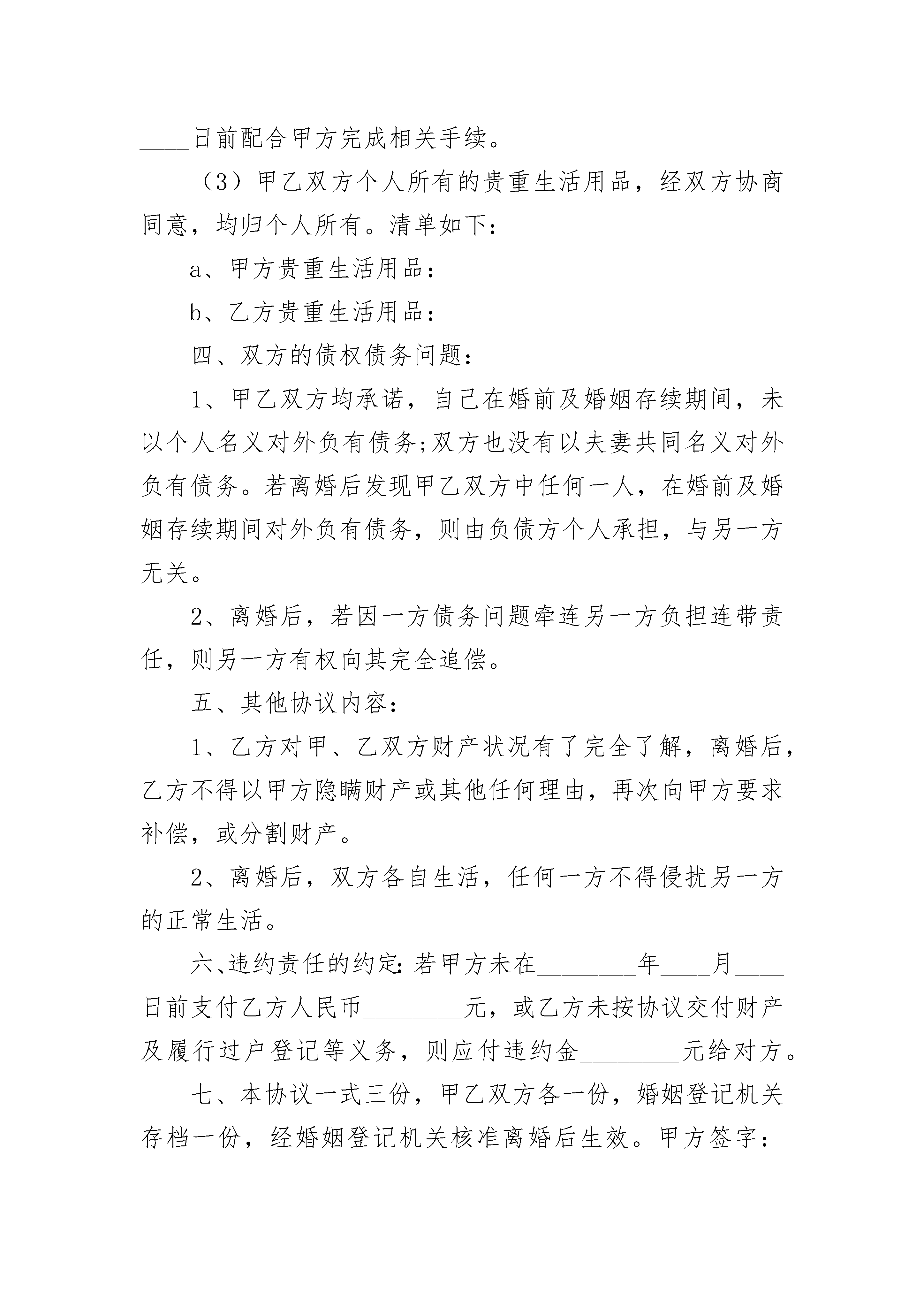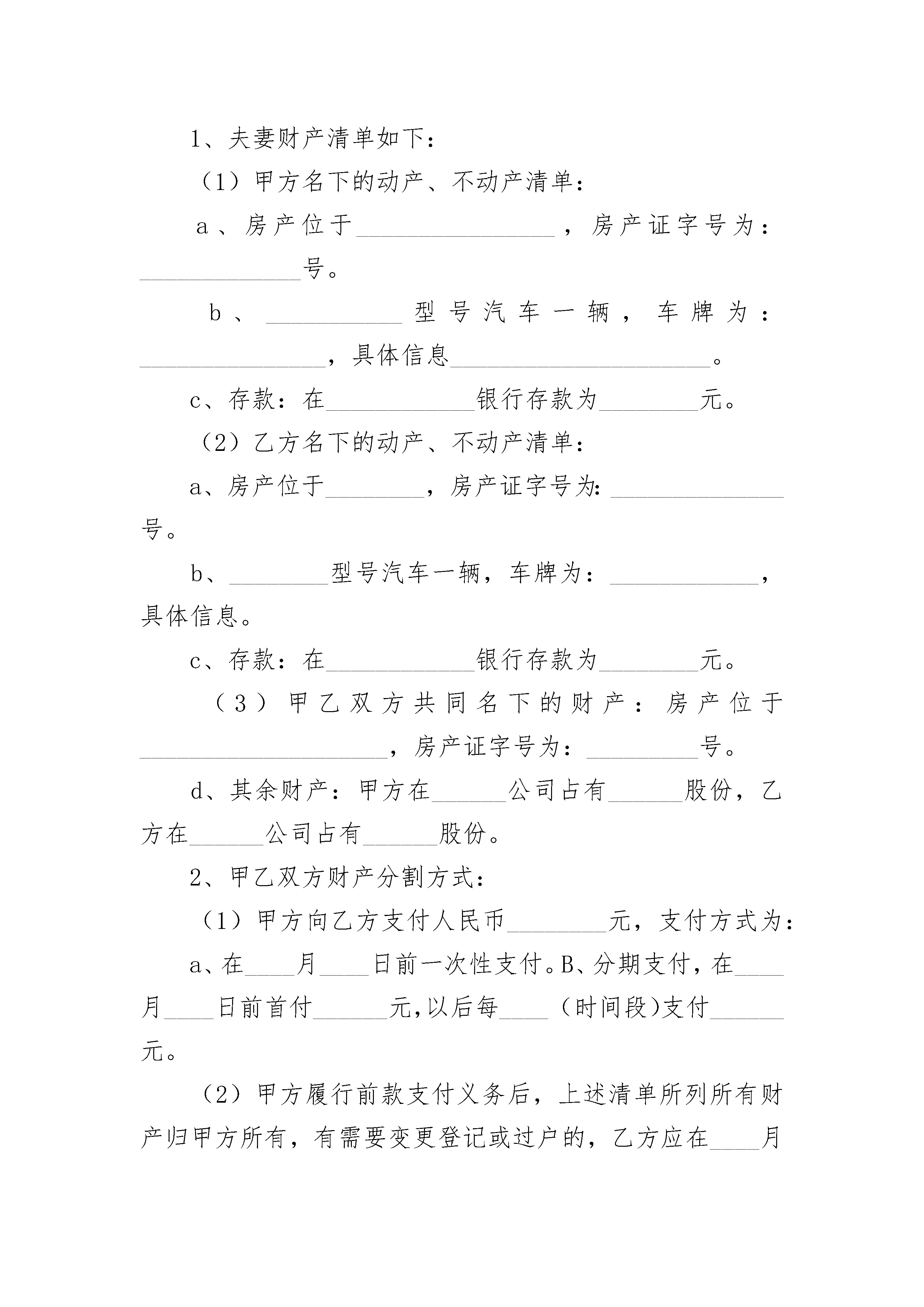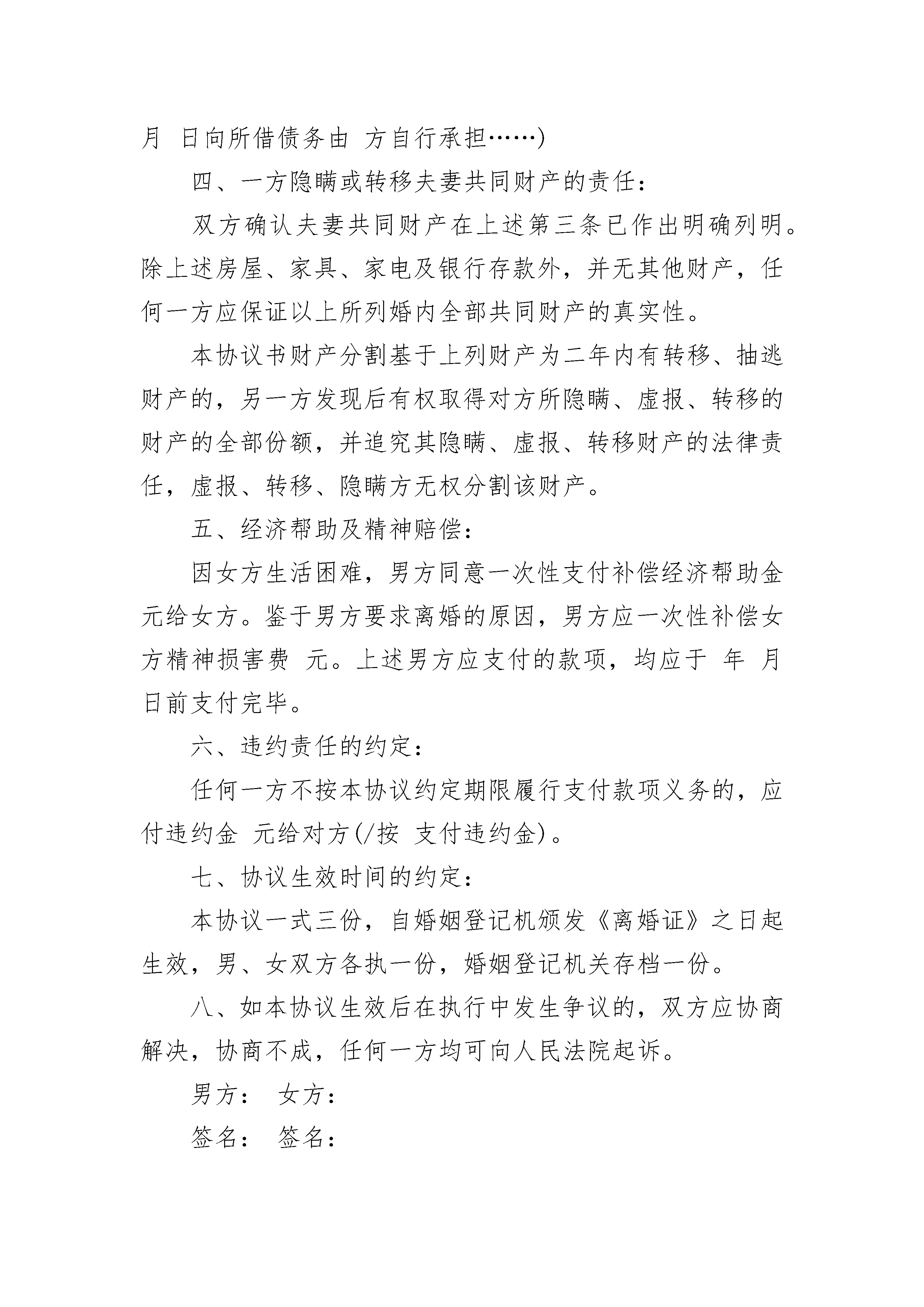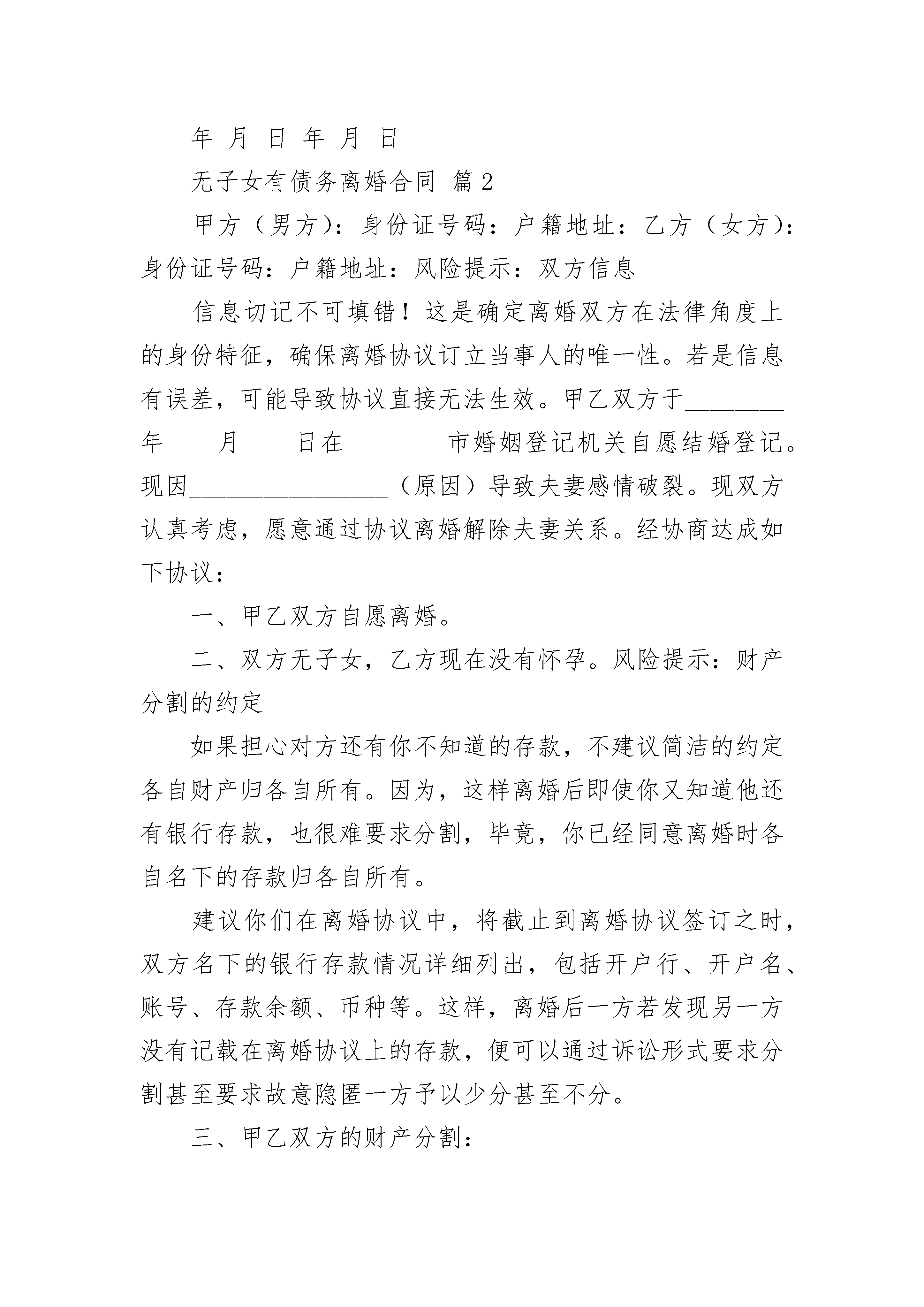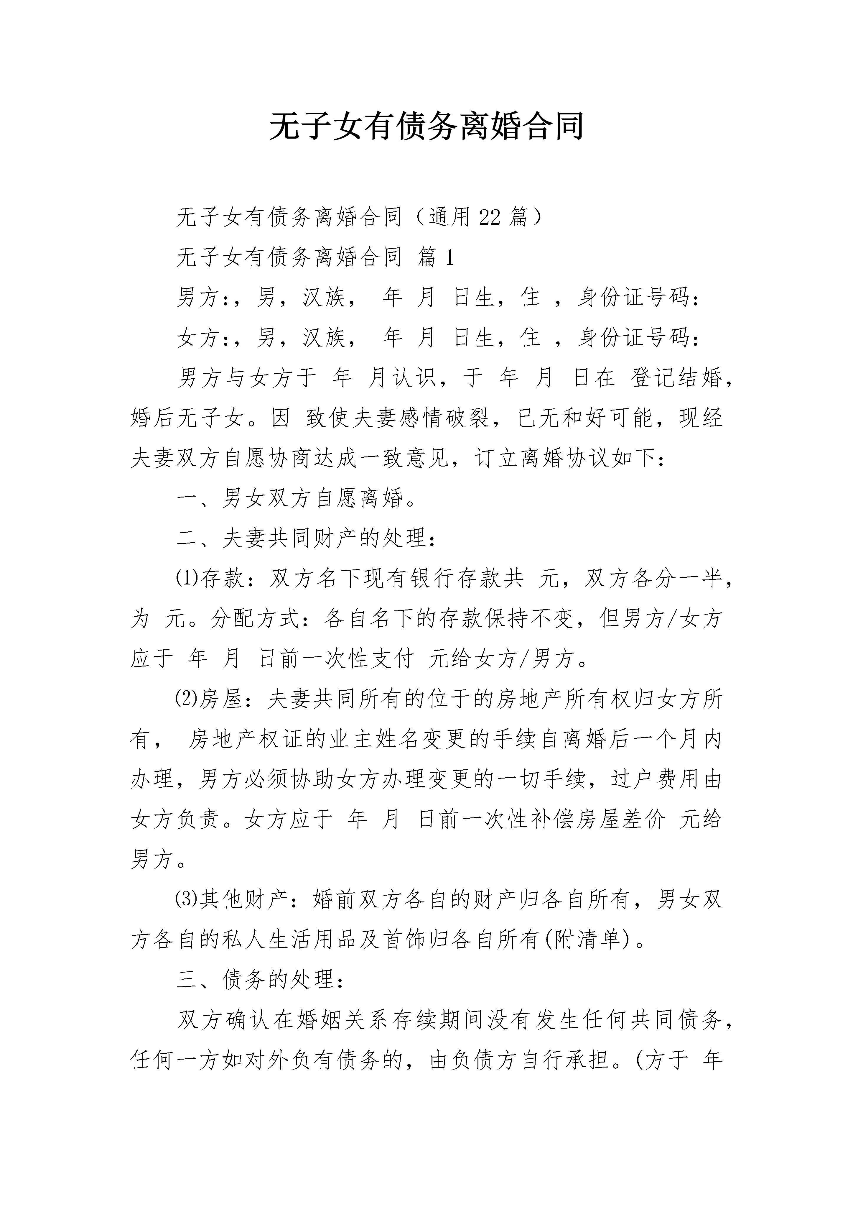 无子女有债务离婚合同无子女有债务离婚合同(通用22篇)无子女有债务离婚合同篇1男方:,男,汉族,年月日生,住,身份证号码:女方:,男,汉族,年月日生,住,身份证号码:男方与女方于年月认识,于年月日在登记结婚,婚后无子女。因致使夫妻感情破裂,已无和好可能,现经夫妻双方自愿协商达成一致意见,订立离婚协议如下:一、男女双方自愿离婚。二、夫妻共同财产的处理:⑴存款:双方名下现有银行存款共元,双方各分一半,为元。分配方式:各自名下的存款保持不变,但男方/女方应于年月日前一次性支付元给女方/男方。⑵房屋:夫妻共同所有的位于的房地产所有权归女方所有,房地产权证的业主姓名变更的手续自离婚后一个月内办理,男方必须协助女方办理变更的一切手续,过户费用由女方负责。女方应于年月日前一次性补偿房屋差价元给男方。⑶其他财产:婚前双方各自的财产归各自所有,男女双方各自的私人生活用品及首饰归各自所有(附清单)。三、债务的处理:双方确认在婚姻关系存续期间没有发生任何共同债务,任何一方如对外负有债务的,由负债方自行承担。(方于年月日向所借债务由方自行承担……)四、一方隐瞒或转移夫妻共同财产的责任:双方确认夫妻共同财产在上述第三条已作出明确列明。除上述房屋、家具、家电及银行存款外,并无其他财产,任何一方应保证以上所列婚内全部共同财产的真实性。本协议书财产分割基于上列财产为二年内有转移、抽逃财产的,另一方发现后有权取得对方所隐瞒、虚报、转移的财产的全部份额,并追究其隐瞒、虚报、转移财产的法律责任,虚报、转移、隐瞒方无权分割该财产。五、经济帮助及精神赔偿:因女方生活困难,男方同意一次性支付补偿经济帮助金元给女方。鉴于男方要求离婚的原因,男方应一次性补偿女方精神损害费元。上述男方应支付的款项,均应于年月日前支付完毕。六、违约责任的约定:任何一方不按本协议约定期限履行支付款项义务的,应付违约金元给对方(/按支付违约金)。七、协议生效时间的约定:本协议一式三份,自婚姻登记机颁发《离婚证》之日起生效,男、女双方各执一份,婚姻登记机关存档一份。八、如本协议生效后在执行中发生争议的,双方应协商解决,协商不成,任何一方均可向人民法院起诉。男方:女方:签名:签名:年月日年月日无子女有债务离婚合同篇2甲方(男方):身份证号码:户籍地址:乙方(女方):身份证号码:户籍地址:风险提示:双方信息信息切记不可填错!这是确定离婚双方在法律角度上的身份特征,确保离婚协议订立当事人的唯一性。若是信息有误差,可能导致协议直接无法生效。甲乙双方于________年____月____日在________市婚姻登记机关自愿结婚登记。现因________________(原因)导致夫妻感情破裂。现双方认真考虑,愿意通过协议离婚解除夫妻关系。经协商达成如下协议:一、甲乙双方自愿离婚。二、双方无子女,乙方现在没有怀孕。风险提示:财产分割的约定如果担心对方还有你不知道的存款,不建议简洁的约定各自财产归各自所有。因为,这样离婚后即使你又知道他还有银行存款,也很难要求分割,毕竟,你已经同意离婚时各自名下的存款归各自所有。建议你们在离婚协议中,将截止到离婚协议签订之时,双方名下的银行存款情况详细列出,包括开户行、开户名、账号、存款余额、币种等。这样,离婚后一方若发现另一方没有记载在离婚协议上的存款,便可以通过诉讼形式要求分割甚至要求故意隐匿一方予以少分甚至不分。三、甲乙双方的财产分割:1、夫妻财产清单如下:(1)甲方名下的动产、不动产清单:a、房产位于________________,房产证字号为:_____________号。b、___________型号汽车一辆,车牌为:_______________,具体信息_____________________。c、存款:在____________银行存款为________元。(2)乙方名下的动产、不动产清单:a、房产位于________,房产证字号为:______________号。b、________型号汽车一辆,车牌为:____________,具体信息。c、存款:在____________银行存款为________元。(3)甲乙双方共同名下的财产:房产位于____________________,房产证字号为:_________号。d、其余财产:甲方在______公司占有______股份,乙方在______公司占有______股份。2、甲乙双方财产分割方式:(1)甲方向乙方支付人民币________元,支付方式为:a、在____月____日前一次性支付。B、分期支付,在____月____日前首付______元,以后每____(时间段)支付______元。(2)甲方履行前款支付义务后,上述清单所列所有财产归甲方所有,有需要变更登记或过户的,乙方应在____月____