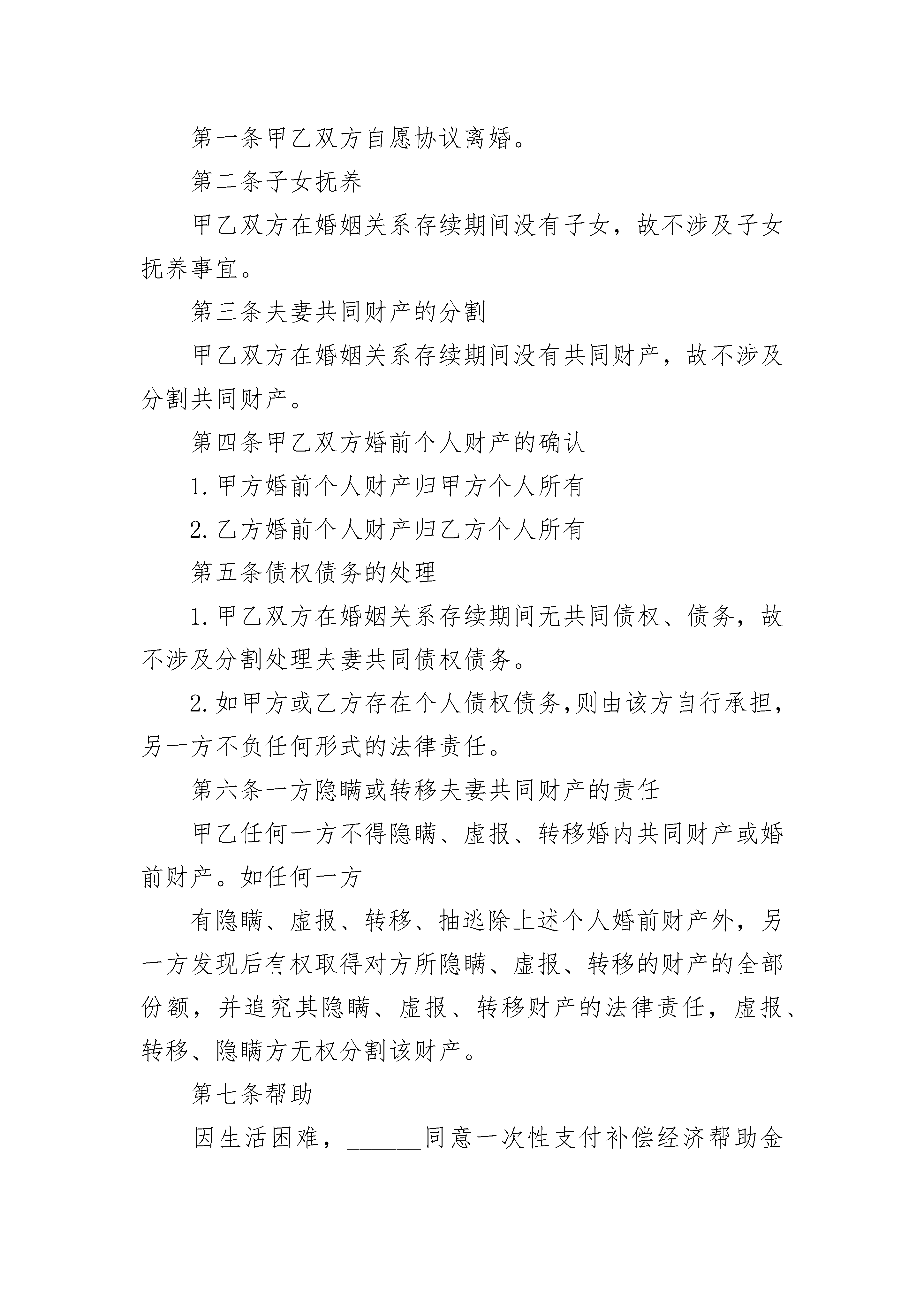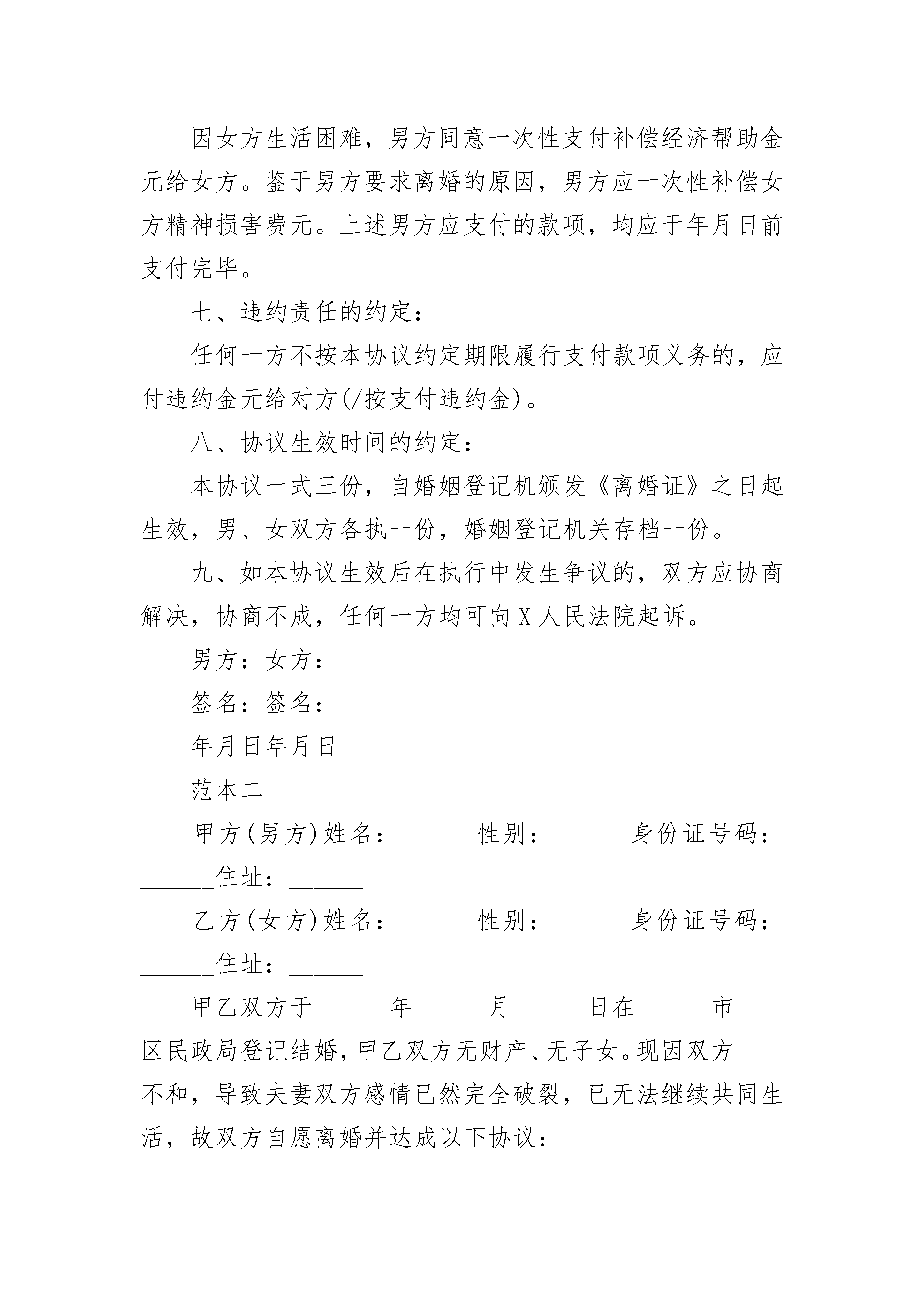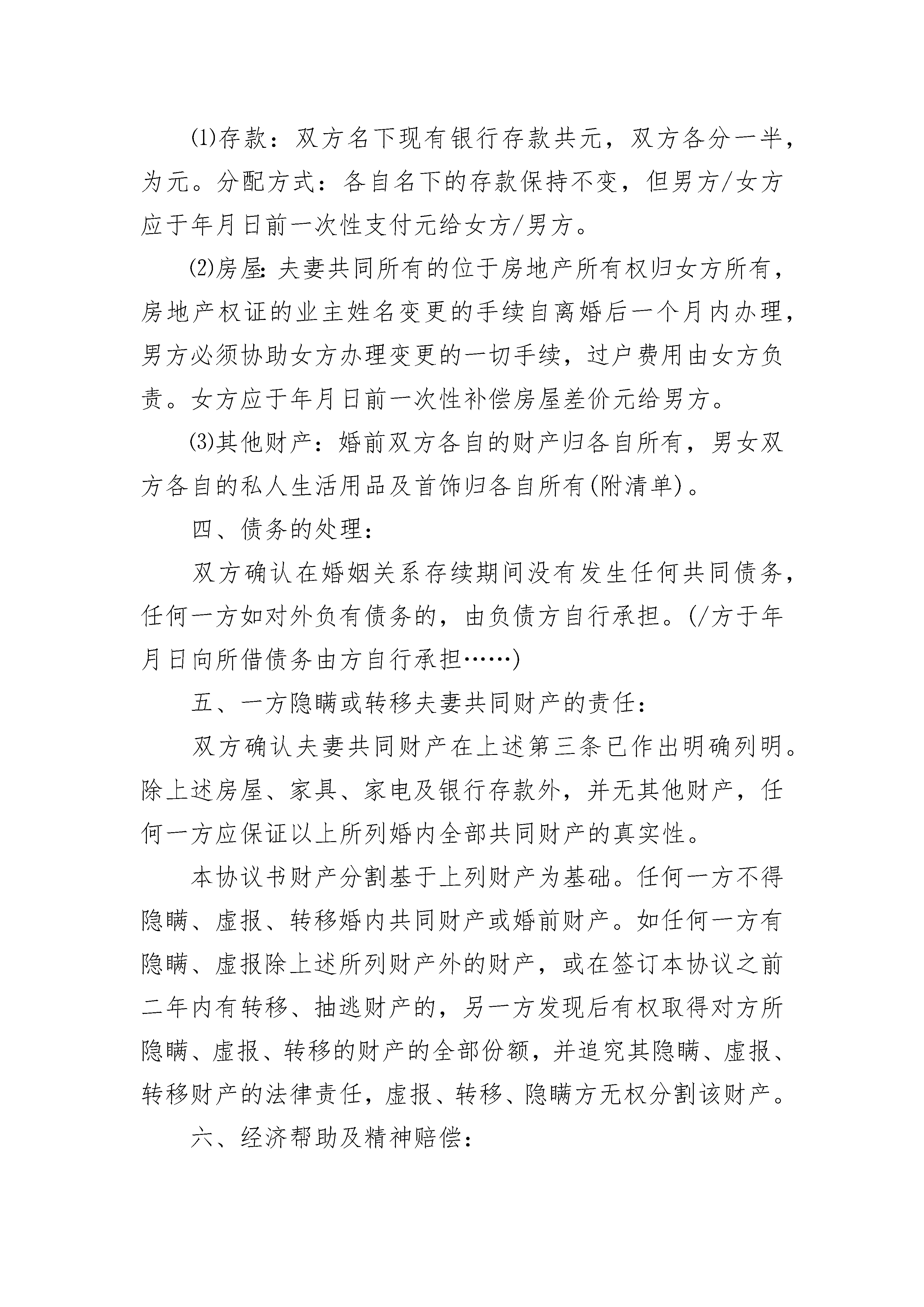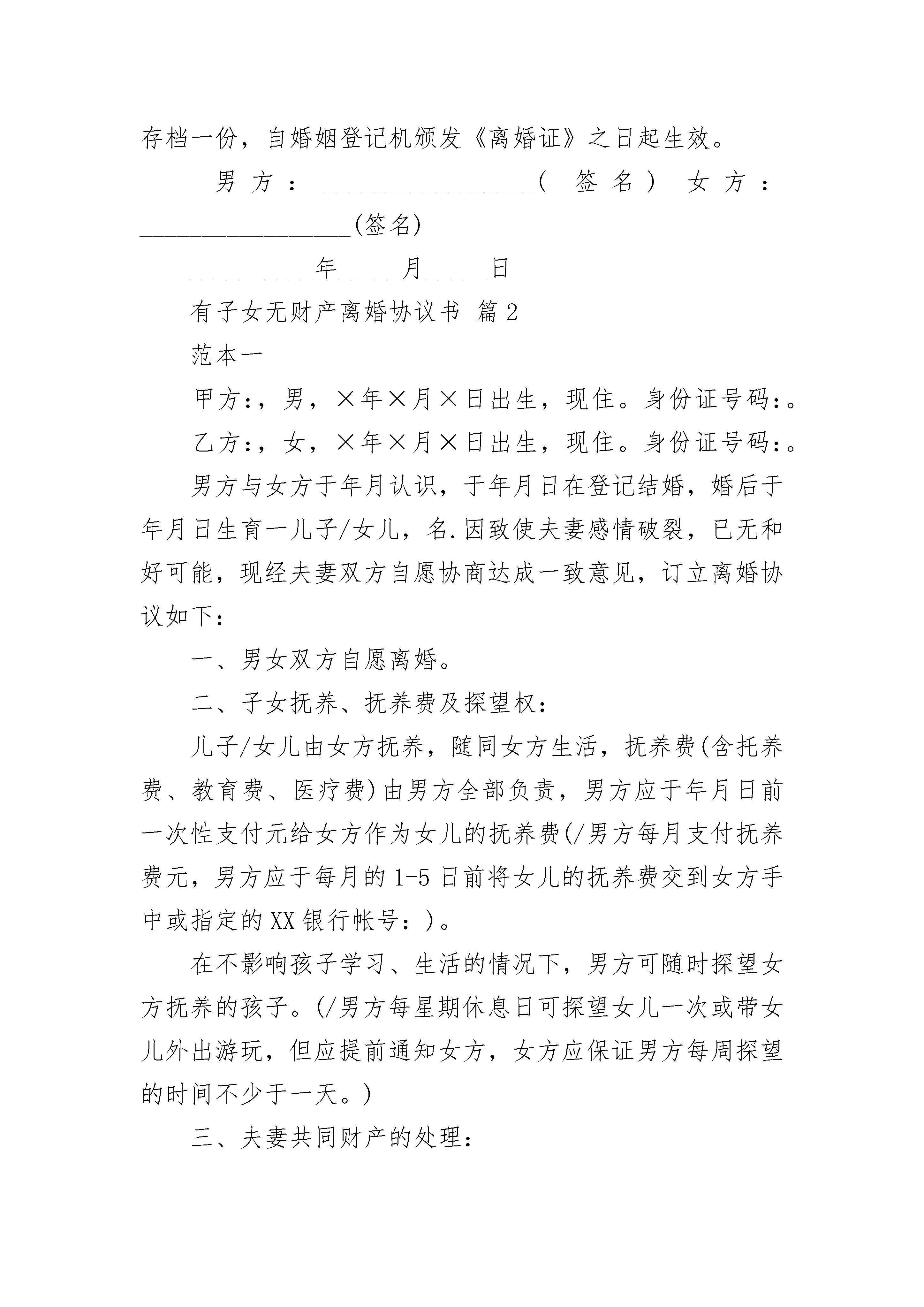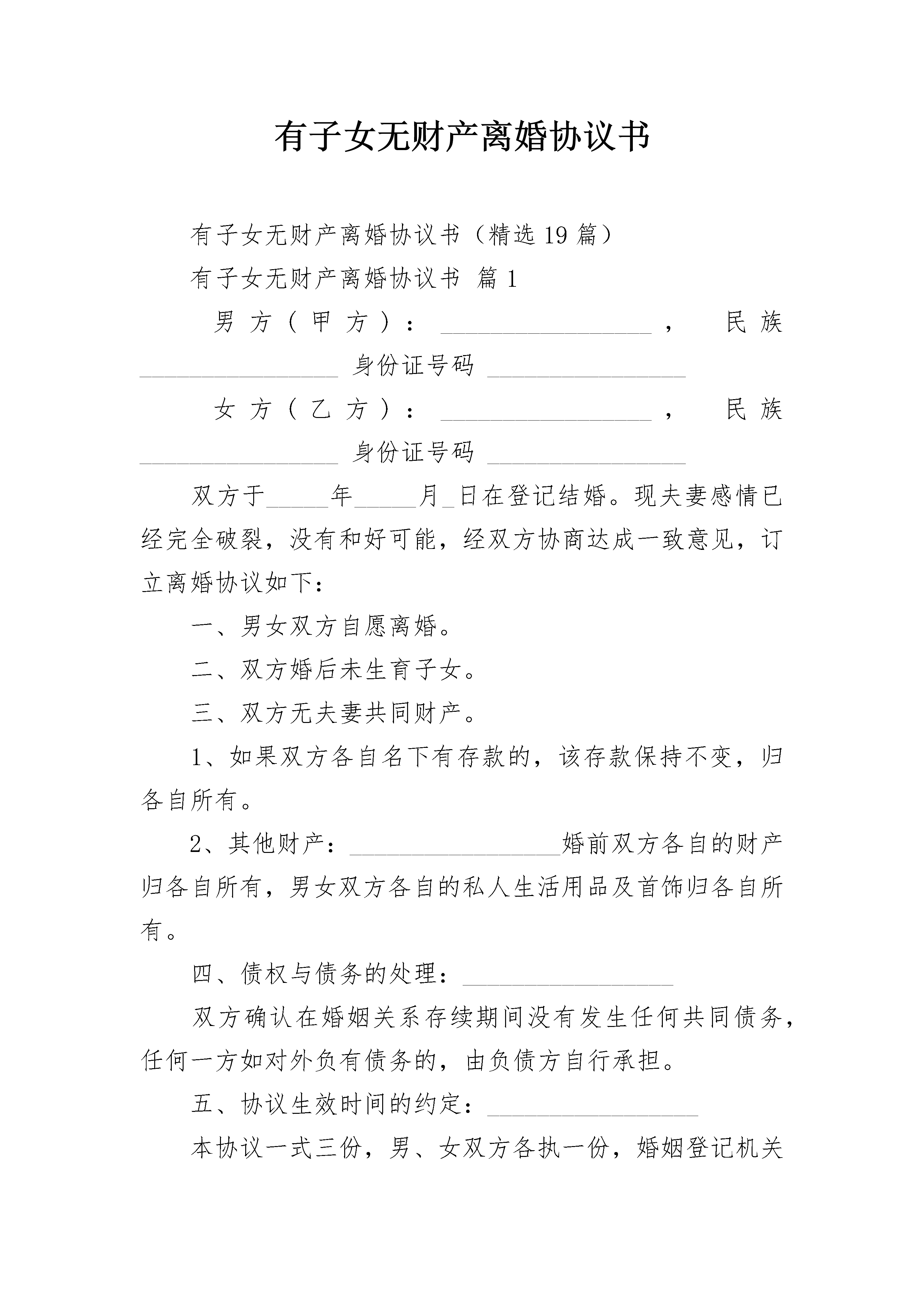有子女无财产离婚协议书有子女无财产离婚协议书(精选19篇)有子女无财产离婚协议书篇1男方(甲方):_________________,民族________________身份证号码________________女方(乙方):_________________,民族________________身份证号码________________双方于_____年_____月_日在登记结婚。现夫妻感情已经完全破裂,没有和好可能,经双方协商达成一致意见,订立离婚协议如下:一、男女双方自愿离婚。二、双方婚后未生育子女。三、双方无夫妻共同财产。1、如果双方各自名下有存款的,该存款保持不变,归各自所有。2、其他财产:_________________婚前双方各自的财产归各自所有,男女双方各自的私人生活用品及首饰归各自所有。四、债权与债务的处理:_________________双方确认在婚姻关系存续期间没有发生任何共同债务,任何一方如对外负有债务的,由负债方自行承担。五、协议生效时间的约定:_________________本协议一式三份,男、女双方各执一份,婚姻登记机关存档一份,自婚姻登记机颁发《离婚证》之日起生效。男方:_________________(签名)女方:_________________(签名)__________年_____月_____日有子女无财产离婚协议书篇2范本一甲方:,男,×年×月×日出生,现住。身份证号码:。乙方:,女,×年×月×日出生,现住。身份证号码:。男方与女方于年月认识,于年月日在登记结婚,婚后于年月日生育一儿子/女儿,名.因致使夫妻感情破裂,已无和好可能,现经夫妻双方自愿协商达成一致意见,订立离婚协议如下:一、男女双方自愿离婚。二、子女抚养、抚养费及探望权:儿子/女儿由女方抚养,随同女方生活,抚养费(含托养费、教育费、医疗费)由男方全部负责,男方应于年月日前一次性支付元给女方作为女儿的抚养费(/男方每月支付抚养费元,男方应于每月的1-5日前将女儿的抚养费交到女方手中或指定的XX银行帐号:)。在不影响孩子学习、生活的情况下,男方可随时探望女方抚养的孩子。(/男方每星期休息日可探望女儿一次或带女儿外出游玩,但应提前通知女方,女方应保证男方每周探望的时间不少于一天。)三、夫妻共同财产的处理:⑴存款:双方名下现有银行存款共元,双方各分一半,为元。分配方式:各自名下的存款保持不变,但男方/女方应于年月日前一次性支付元给女方/男方。⑵房屋:夫妻共同所有的位于房地产所有权归女方所有,房地产权证的业主姓名变更的手续自离婚后一个月内办理,男方必须协助女方办理变更的一切手续,过户费用由女方负责。女方应于年月日前一次性补偿房屋差价元给男方。⑶其他财产:婚前双方各自的财产归各自所有,男女双方各自的私人生活用品及首饰归各自所有(附清单)。四、债务的处理:双方确认在婚姻关系存续期间没有发生任何共同债务,任何一方如对外负有债务的,由负债方自行承担。(/方于年月日向所借债务由方自行承担……)五、一方隐瞒或转移夫妻共同财产的责任:双方确认夫妻共同财产在上述第三条已作出明确列明。除上述房屋、家具、家电及银行存款外,并无其他财产,任何一方应保证以上所列婚内全部共同财产的真实性。本协议书财产分割基于上列财产为基础。任何一方不得隐瞒、虚报、转移婚内共同财产或婚前财产。如任何一方有隐瞒、虚报除上述所列财产外的财产,或在签订本协议之前二年内有转移、抽逃财产的,另一方发现后有权取得对方所隐瞒、虚报、转移的财产的全部份额,并追究其隐瞒、虚报、转移财产的法律责任,虚报、转移、隐瞒方无权分割该财产。六、经济帮助及精神赔偿:因女方生活困难,男方同意一次性支付补偿经济帮助金元给女方。鉴于男方要求离婚的原因,男方应一次性补偿女方精神损害费元。上述男方应支付的款项,均应于年月日前支付完毕。七、违约责任的约定:任何一方不按本协议约定期限履行支付款项义务的,应付违约金元给对方(/按支付违约金)。八、协议生效时间的约定:本协议一式三份,自婚姻登记机颁发《离婚证》之日起生效,男、女双方各执一份,婚姻登记机关存档一份。九、如本协议生效后在执行中发生争议的,双方应协商解决,协商不成,任何一方均可向X人民法院起诉。男方:女方:签名:签名:年月日年月日范本二甲方(男方)姓名:______性别:______身份证号码:______住址:______乙方(女方)姓名:______性别:______身份证号码:______住址:______甲乙双方于______年______月______日在______市____区民政局登记结婚,甲乙双方无财产、无子女。现因双方____不和,导致夫妻双方感情已然完全破裂,已无法继续共同生活,故双方自愿离婚并达成以下协议:第一条甲乙双方自愿协议离婚