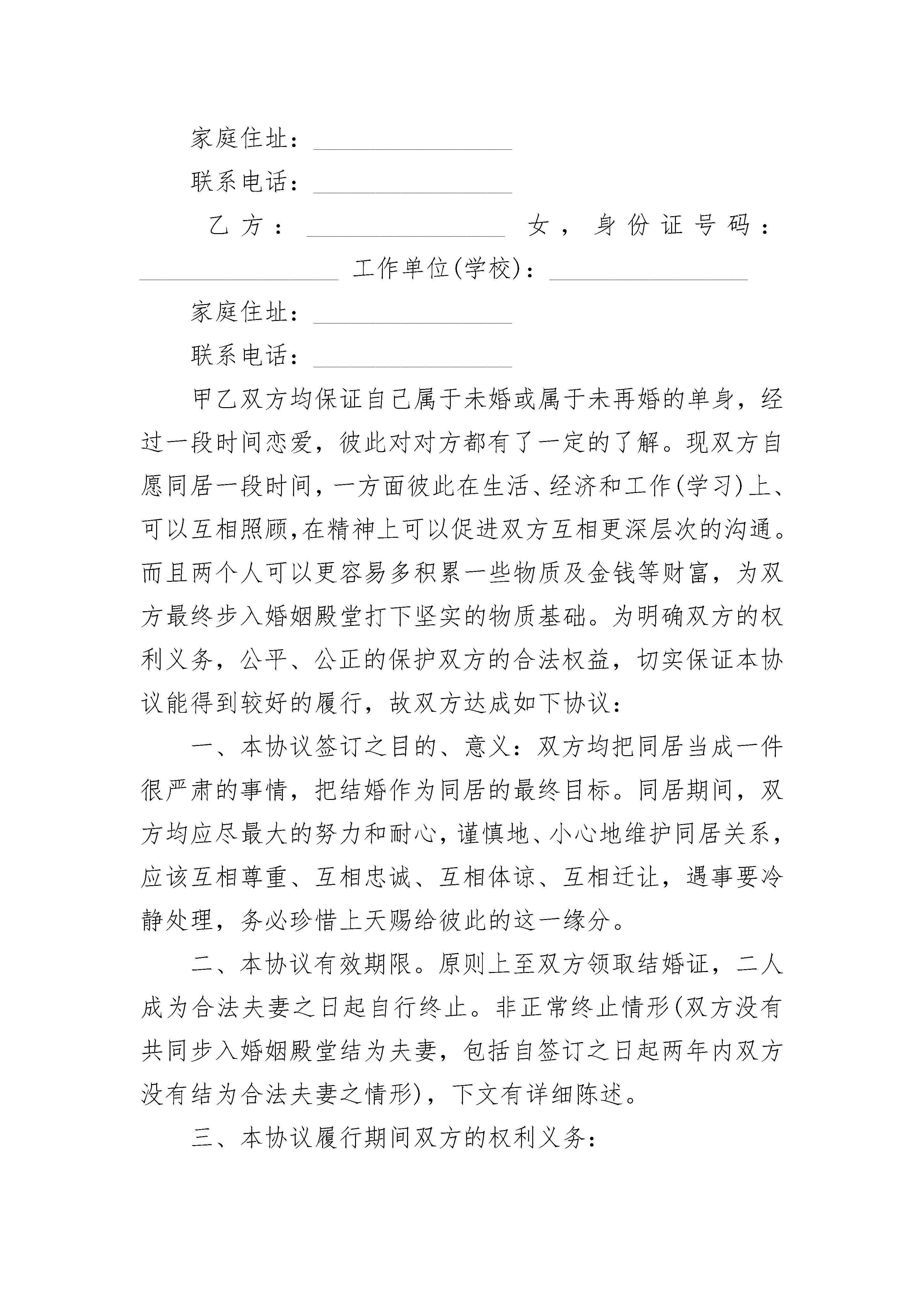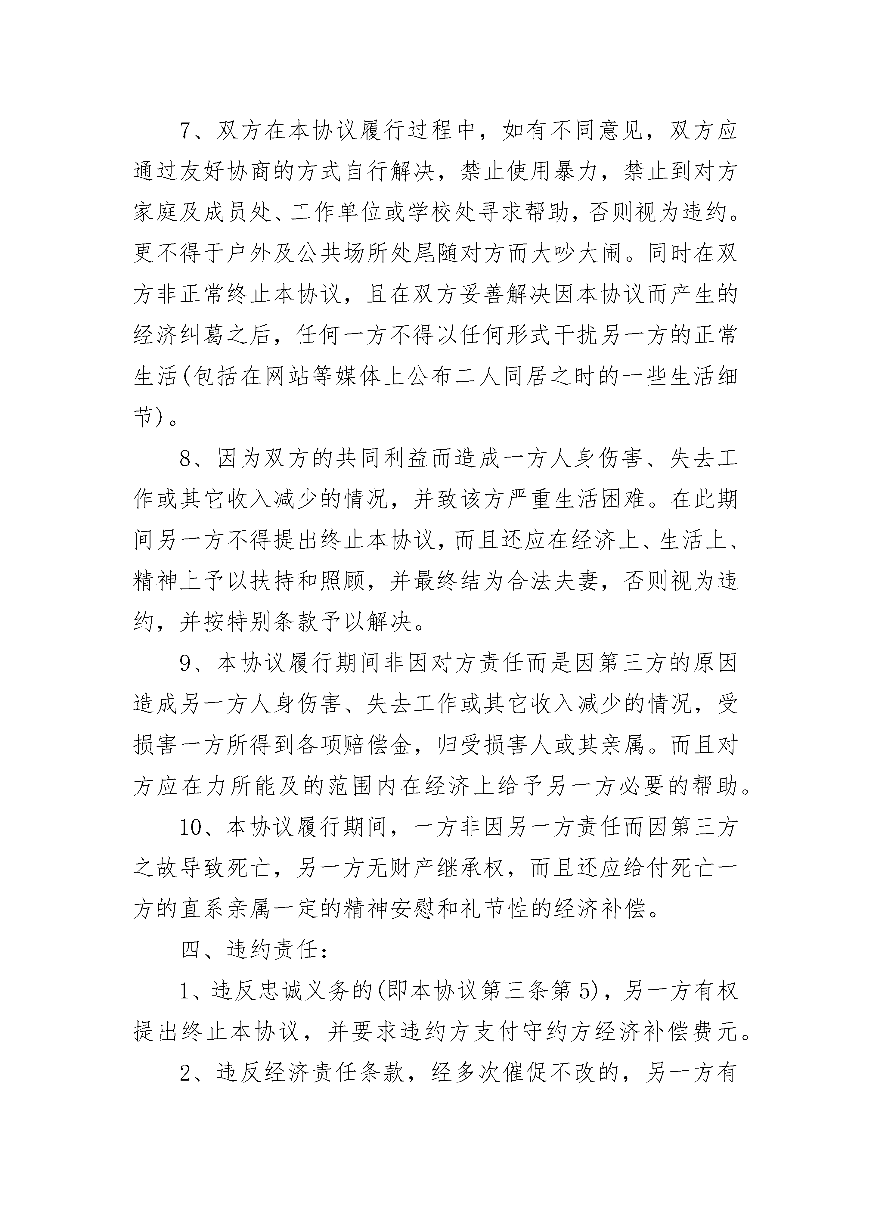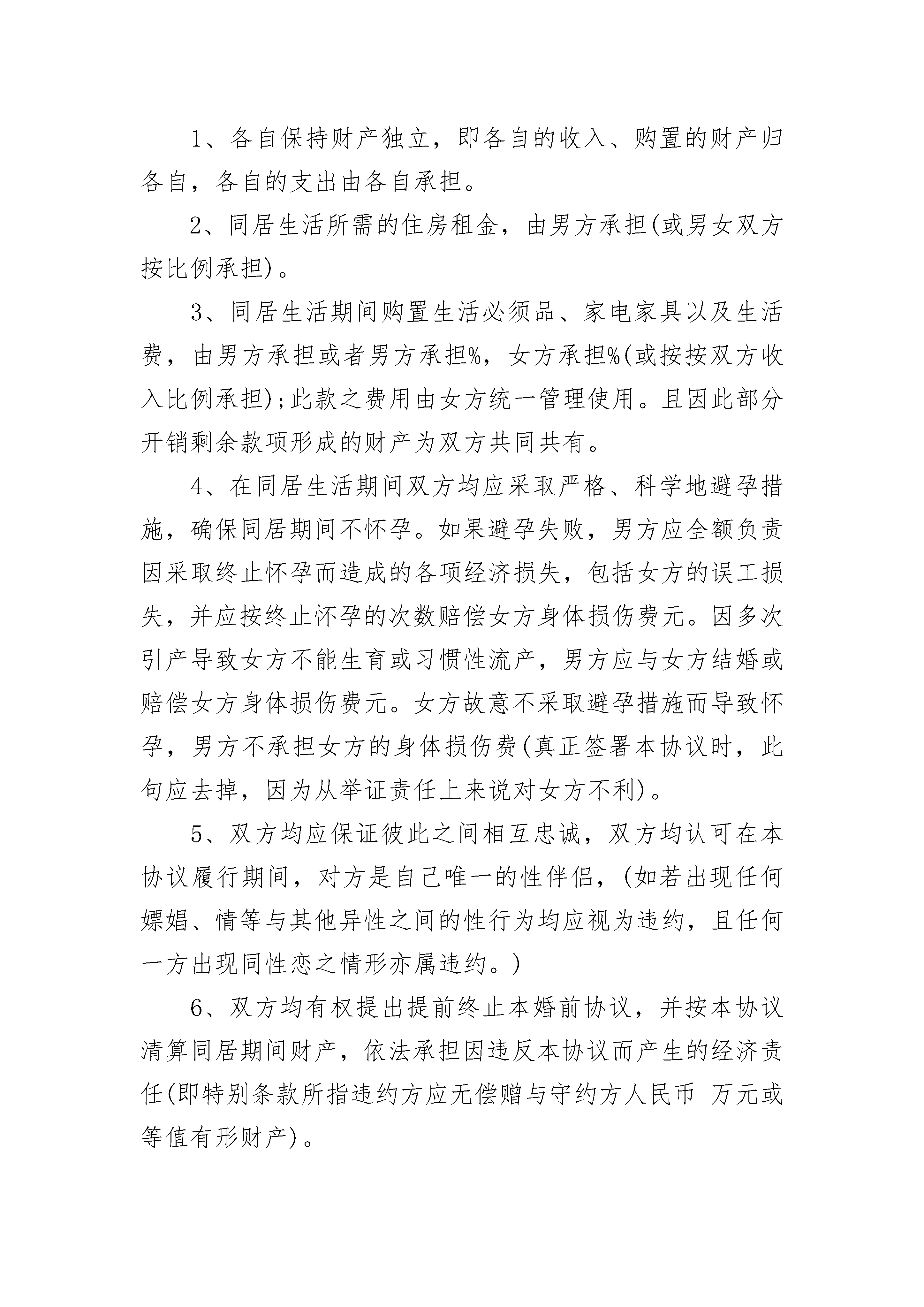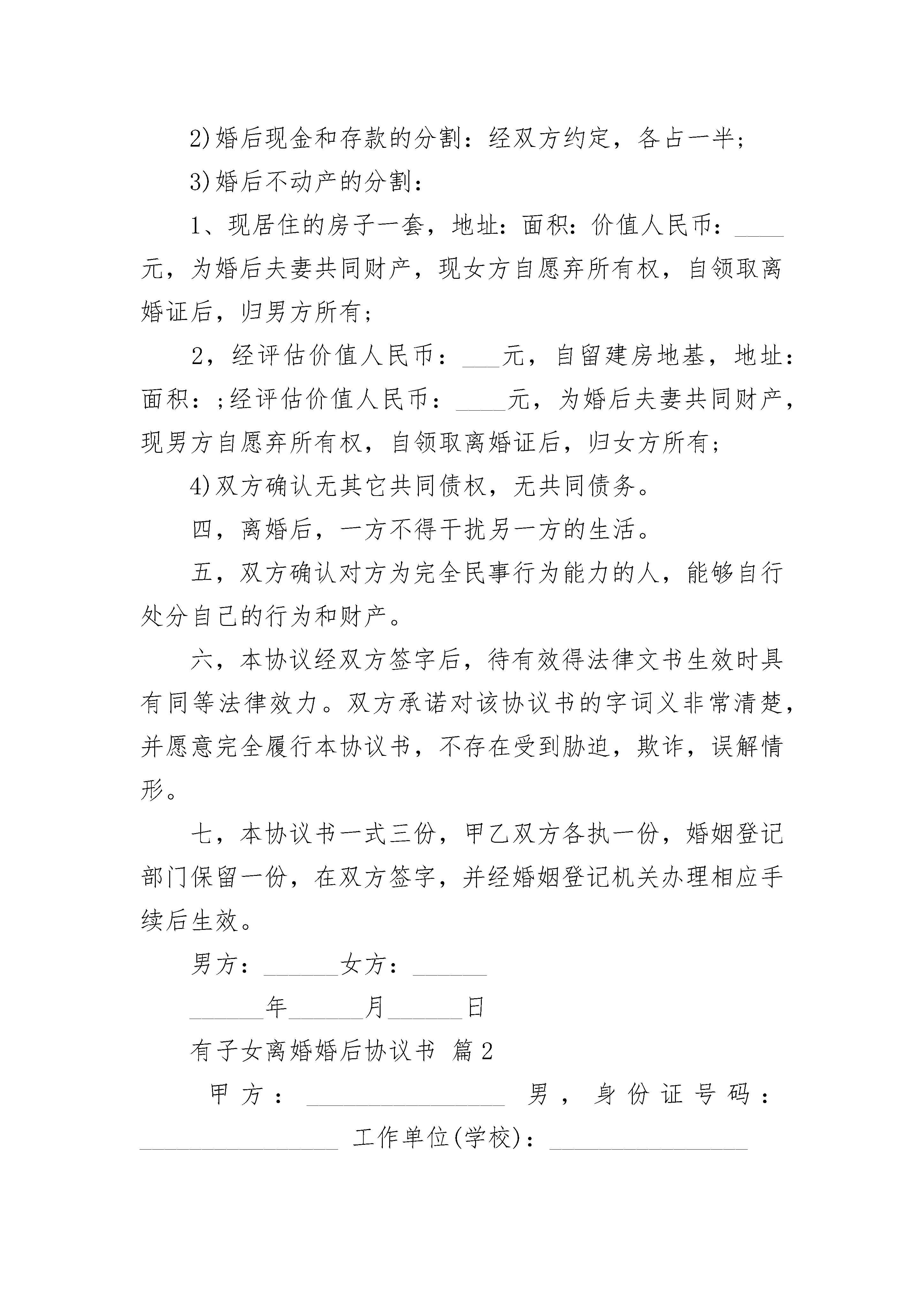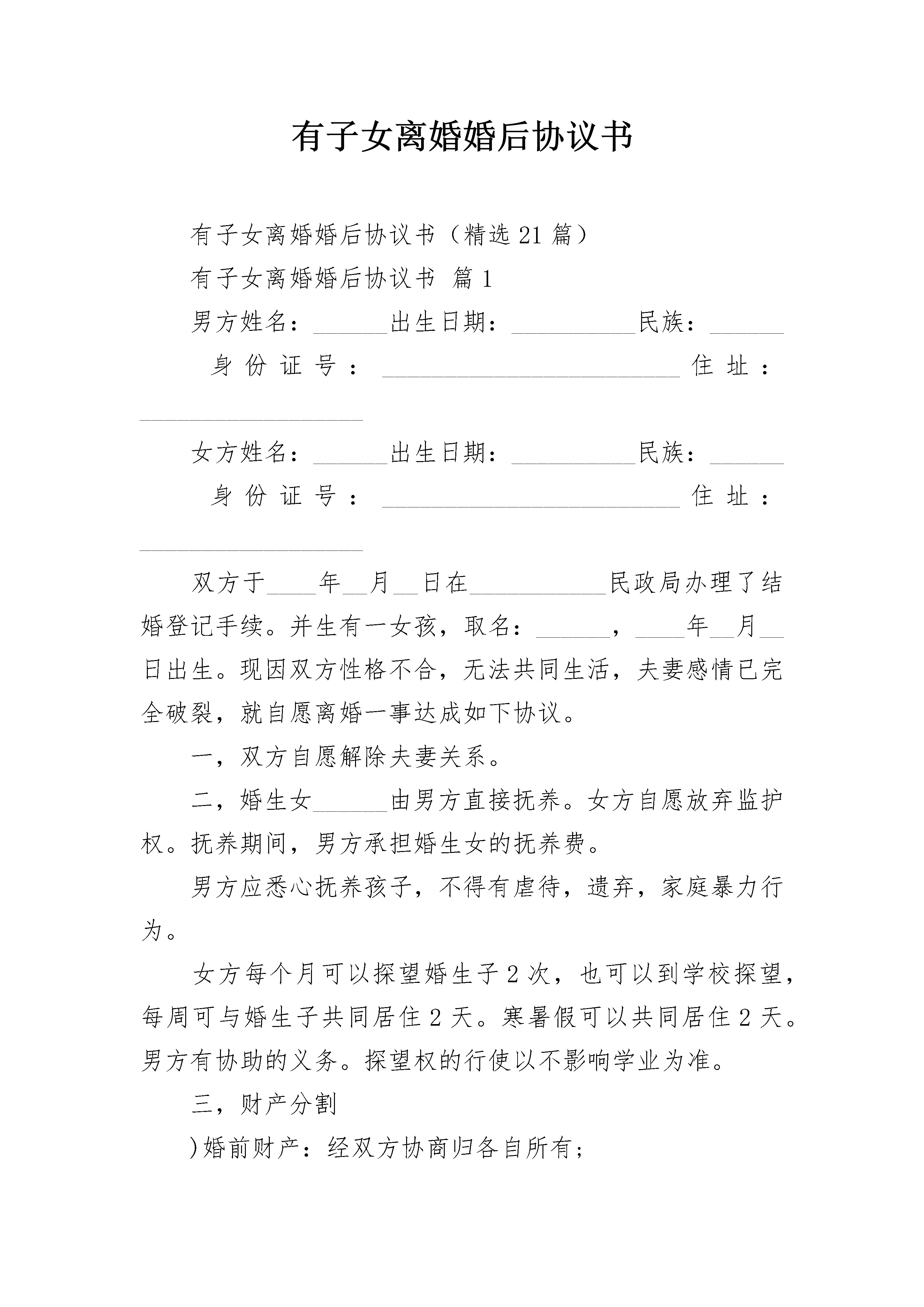 有子女离婚婚后协议书有子女离婚婚后协议书(精选21篇)有子女离婚婚后协议书篇1男方姓名:______出生日期:__________民族:______身份证号:________________________住址:__________________女方姓名:______出生日期:__________民族:______身份证号:________________________住址:__________________双方于____年__月__日在___________民政局办理了结婚登记手续。并生有一女孩,取名:______,____年__月__日出生。现因双方性格不合,无法共同生活,夫妻感情已完全破裂,就自愿离婚一事达成如下协议。一,双方自愿解除夫妻关系。二,婚生女______由男方直接抚养。女方自愿放弃监护权。抚养期间,男方承担婚生女的抚养费。男方应悉心抚养孩子,不得有虐待,遗弃,家庭暴力行为。女方每个月可以探望婚生子2次,也可以到学校探望,每周可与婚生子共同居住2天。寒暑假可以共同居住2天。男方有协助的义务。探望权的行使以不影响学业为准。三,财产分割)婚前财产:经双方协商归各自所有;2)婚后现金和存款的分割:经双方约定,各占一半;3)婚后不动产的分割:1、现居住的房子一套,地址:面积:价值人民币:____元,为婚后夫妻共同财产,现女方自愿弃所有权,自领取离婚证后,归男方所有;2,经评估价值人民币:___元,自留建房地基,地址:面积:;经评估价值人民币:____元,为婚后夫妻共同财产,现男方自愿弃所有权,自领取离婚证后,归女方所有;4)双方确认无其它共同债权,无共同债务。四,离婚后,一方不得干扰另一方的生活。五,双方确认对方为完全民事行为能力的人,能够自行处分自己的行为和财产。六,本协议经双方签字后,待有效得法律文书生效时具有同等法律效力。双方承诺对该协议书的字词义非常清楚,并愿意完全履行本协议书,不存在受到胁迫,欺诈,误解情形。七,本协议书一式三份,甲乙双方各执一份,婚姻登记部门保留一份,在双方签字,并经婚姻登记机关办理相应手续后生效。男方:______女方:____________年______月______日有子女离婚婚后协议书篇2甲方:________________男,身份证号码:________________工作单位(学校):________________家庭住址:________________联系电话:________________乙方:________________女,身份证号码:________________工作单位(学校):________________家庭住址:________________联系电话:________________甲乙双方均保证自己属于未婚或属于未再婚的单身,经过一段时间恋爱,彼此对对方都有了一定的了解。现双方自愿同居一段时间,一方面彼此在生活、经济和工作(学习)上、可以互相照顾,在精神上可以促进双方互相更深层次的沟通。而且两个人可以更容易多积累一些物质及金钱等财富,为双方最终步入婚姻殿堂打下坚实的物质基础。为明确双方的权利义务,公平、公正的保护双方的合法权益,切实保证本协议能得到较好的履行,故双方达成如下协议:一、本协议签订之目的、意义:双方均把同居当成一件很严肃的事情,把结婚作为同居的最终目标。同居期间,双方均应尽最大的努力和耐心,谨慎地、小心地维护同居关系,应该互相尊重、互相忠诚、互相体谅、互相迁让,遇事要冷静处理,务必珍惜上天赐给彼此的这一缘分。二、本协议有效期限。原则上至双方领取结婚证,二人成为合法夫妻之日起自行终止。非正常终止情形(双方没有共同步入婚姻殿堂结为夫妻,包括自签订之日起两年内双方没有结为合法夫妻之情形),下文有详细陈述。三、本协议履行期间双方的权利义务:1、各自保持财产独立,即各自的收入、购置的财产归各自,各自的支出由各自承担。2、同居生活所需的住房租金,由男方承担(或男女双方按比例承担)。3、同居生活期间购置生活必须品、家电家具以及生活费,由男方承担或者男方承担%,女方承担%(或按按双方收入比例承担);此款之费用由女方统一管理使用。且因此部分开销剩余款项形成的财产为双方共同共有。4、在同居生活期间双方均应采取严格、科学地避孕措施,确保同居期间不怀孕。如果避孕失败,男方应全额负责因采取终止怀孕而造成的各项经济损失,包括女方的误工损失,并应按终止怀孕的次数赔偿女方身体损伤费元。因多次引产导致女方不能生育或习惯性流产,男方应与女方结婚或赔偿女方身体损伤费元。女方故意不采取避孕措施而导致怀孕,男方不承担女方的身体损伤费(真正签署本协议时,此句应去掉,因为从举证责任上来说对女方不利)。5、双方均应保证彼此之间相互忠诚,双方均认可在本协议履行期间,对方
