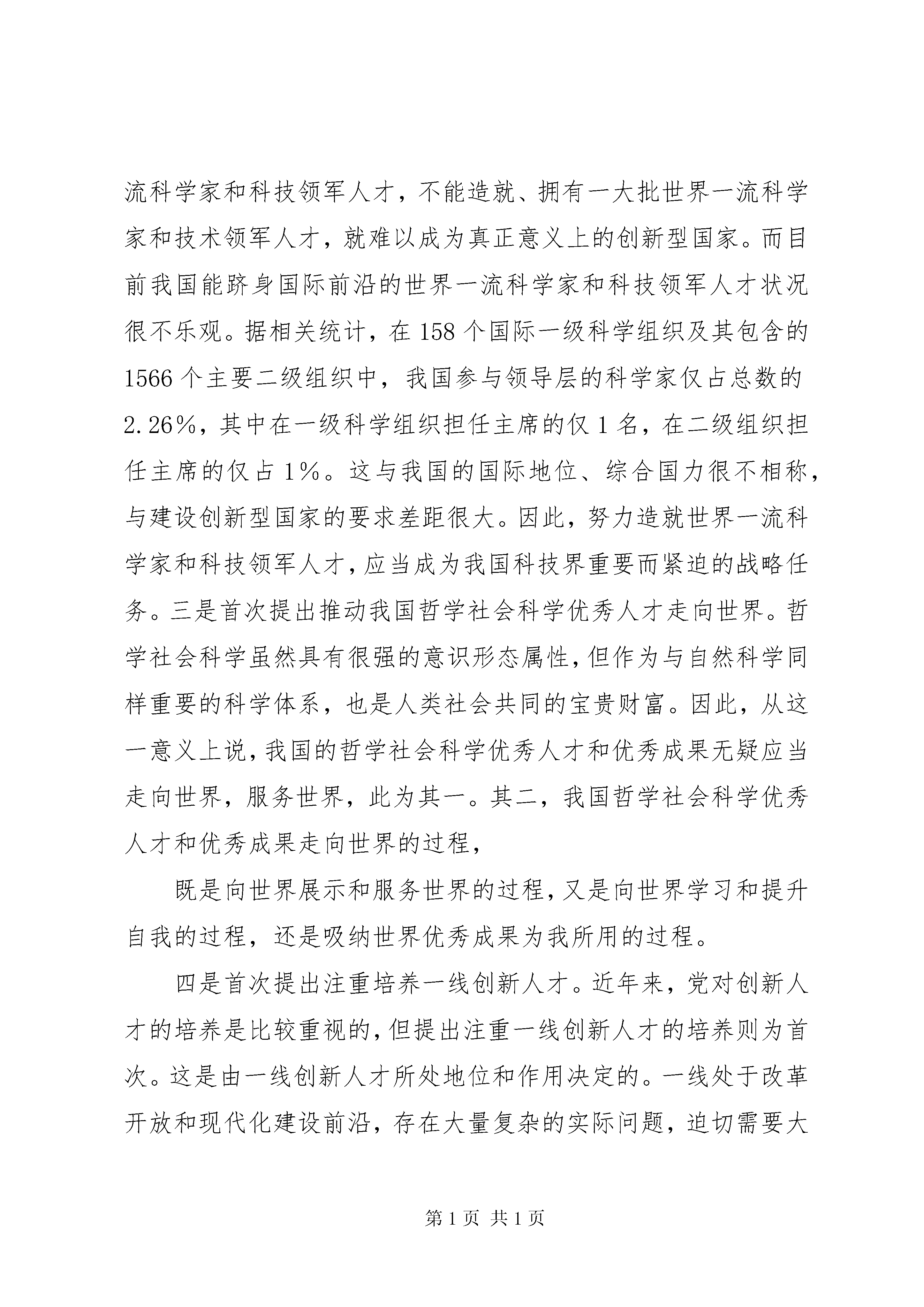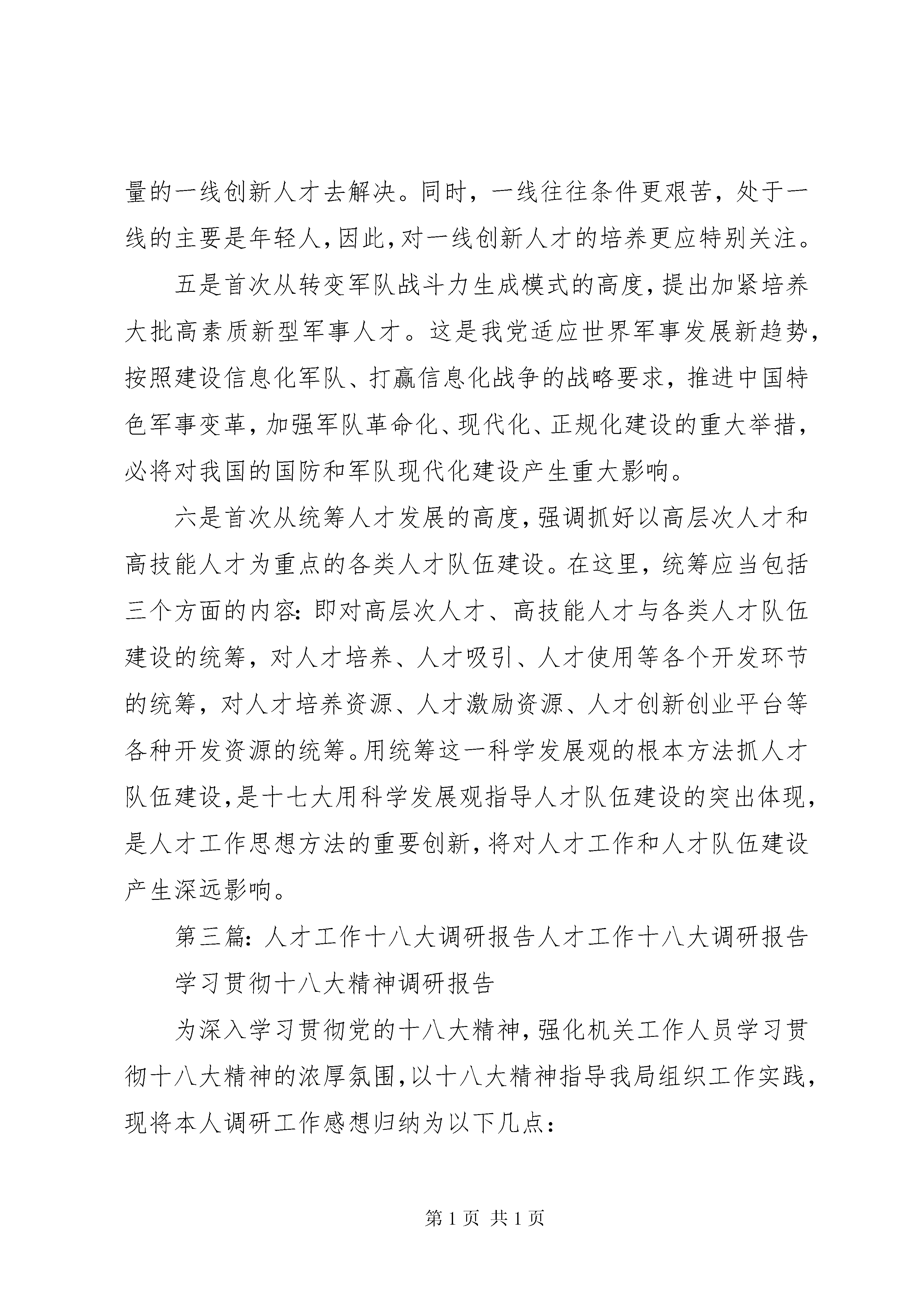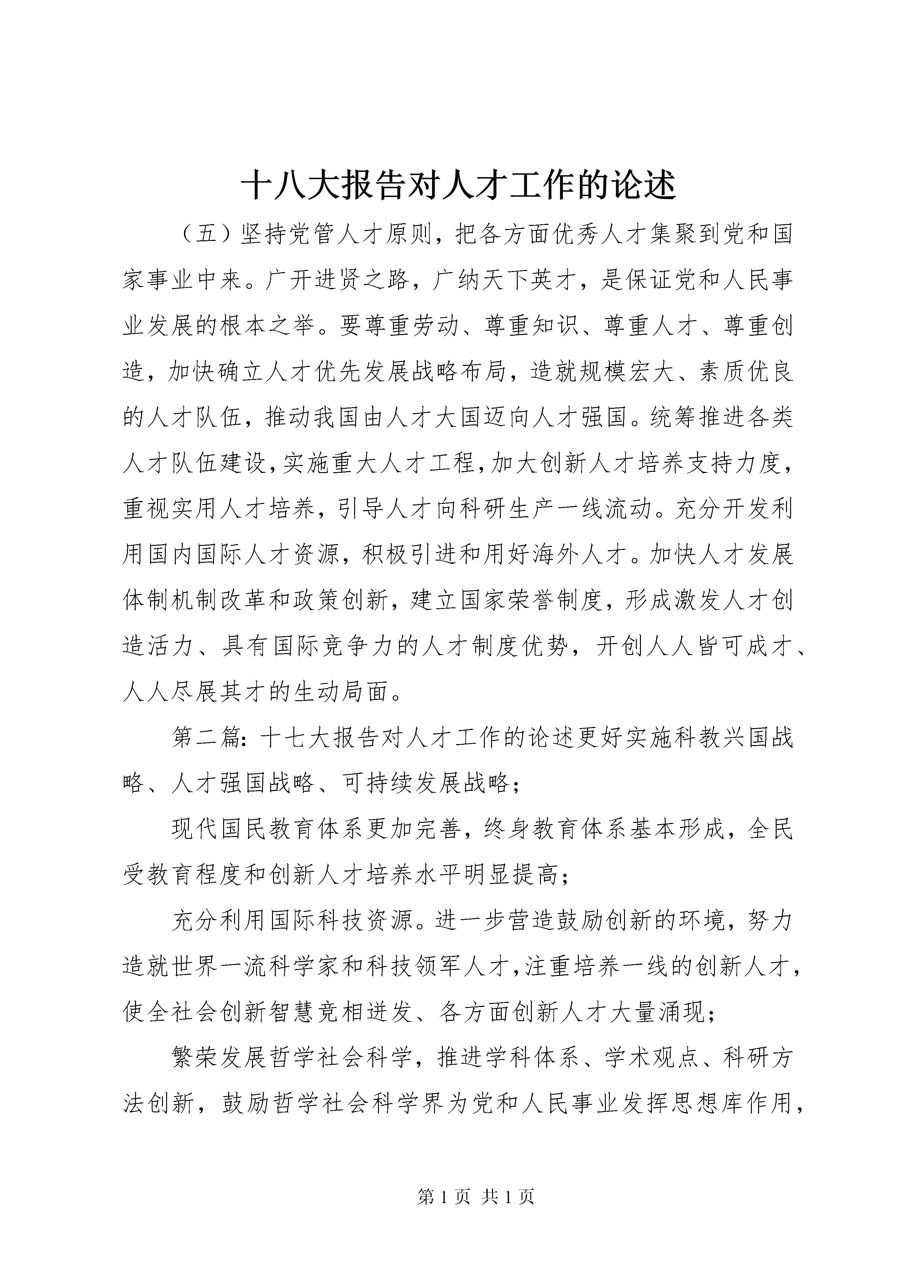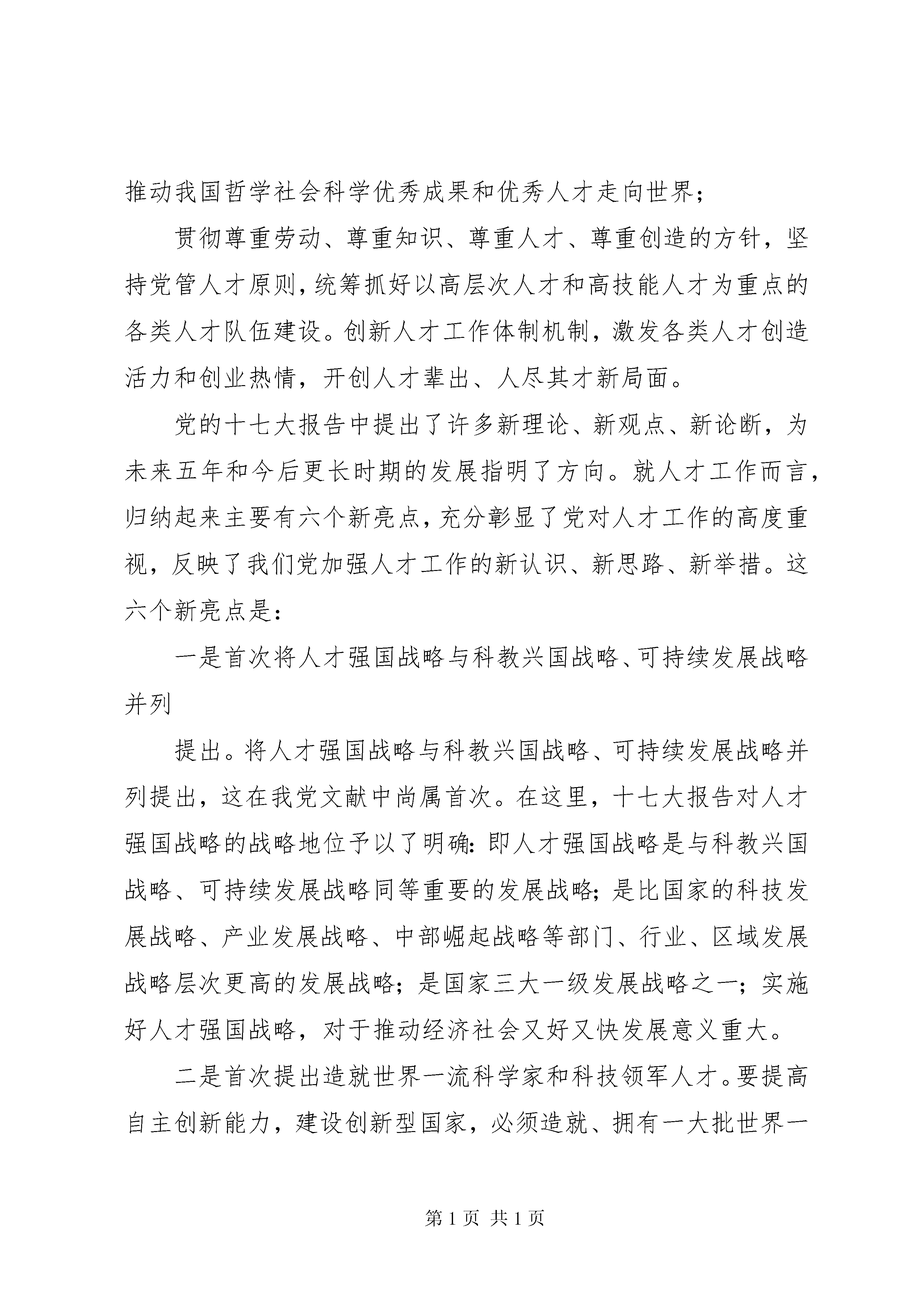 十八大报告对人才工作的论述(五)坚持党管人才原则,把各方面优秀人才集聚到党和国家事业中来。广开进贤之路,广纳天下英才,是保证党和人民事业发展的根本之举。要尊重劳动、尊重知识、尊重人才、尊重创造,加快确立人才优先发展战略布局,造就规模宏大、素质优良的人才队伍,推动我国由人才大国迈向人才强国。统筹推进各类人才队伍建设,实施重大人才工程,加大创新人才培养支持力度,重视实用人才培养,引导人才向科研生产一线流动。充分开发利用国内国际人才资源,积极引进和用好海外人才。加快人才发展体制机制改革和政策创新,建立国家荣誉制度,形成激发人才创造活力、具有国际竞争力的人才制度优势,开创人人皆可成才、人人尽展其才的生动局面。第二篇:十七大报告对人才工作的论述更好实施科教兴国战略、人才强国战略、可持续发展战略;现代国民教育体系更加完善,终身教育体系基本形成,全民受教育程度和创新人才培养水平明显提高;充分利用国际科技资源。进一步营造鼓励创新的环境,努力造就世界一流科学家和科技领军人才,注重培养一线的创新人才,使全社会创新智慧竞相迸发、各方面创新人才大量涌现;繁荣发展哲学社会科学,推进学科体系、学术观点、科研方法创新,鼓励哲学社会科学界为党和人民事业发挥思想库作用,推动我国哲学社会科学优秀成果和优秀人才走向世界;贯彻尊重劳动、尊重知识、尊重人才、尊重创造的方针,坚持党管人才原则,统筹抓好以高层次人才和高技能人才为重点的各类人才队伍建设。创新人才工作体制机制,激发各类人才创造活力和创业热情,开创人才辈出、人尽其才新局面。党的十七大报告中提出了许多新理论、新观点、新论断,为未来五年和今后更长时期的发展指明了方向。就人才工作而言,归纳起来主要有六个新亮点,充分彰显了党对人才工作的高度重视,反映了我们党加强人才工作的新认识、新思路、新举措。这六个新亮点是:一是首次将人才强国战略与科教兴国战略、可持续发展战略并列提出。将人才强国战略与科教兴国战略、可持续发展战略并列提出,这在我党文献中尚属首次。在这里,十七大报告对人才强国战略的战略地位予以了明确:即人才强国战略是与科教兴国战略、可持续发展战略同等重要的发展战略;是比国家的科技发展战略、产业发展战略、中部崛起战略等部门、行业、区域发展战略层次更高的发展战略;是国家三大一级发展战略之一;实施好人才强国战略,对于推动经济社会又好又快发展意义重大。二是首次提出造就世界一流科学家和科技领军人才。要提高自主创新能力,建设创新型国家,必须造就、拥有一大批世界一流科学家和科技领军人才,不能造就、拥有一大批世界一流科学家和技术领军人才,就难以成为真正意义上的创新型国家。而目前我国能跻身国际前沿的世界一流科学家和科技领军人才状况很不乐观。据相关统计,在158个国际一级科学组织及其包含的1566个主要二级组织中,我国参与领导层的科学家仅占总数的2.26%,其中在一级科学组织担任主席的仅1名,在二级组织担任主席的仅占1%。这与我国的国际地位、综合国力很不相称,与建设创新型国家的要求差距很大。因此,努力造就世界一流科学家和科技领军人才,应当成为我国科技界重要而紧迫的战略任务。三是首次提出推动我国哲学社会科学优秀人才走向世界。哲学社会科学虽然具有很强的意识形态属性,但作为与自然科学同样重要的科学体系,也是人类社会共同的宝贵财富。因此,从这一意义上说,我国的哲学社会科学优秀人才和优秀成果无疑应当走向世界,服务世界,此为其一。其二,我国哲学社会科学优秀人才和优秀成果走向世界的过程,既是向世界展示和服务世界的过程,又是向世界学习和提升自我的过程,还是吸纳世界优秀成果为我所用的过程。四是首次提出注重培养一线创新人才。近年来,党对创新人才的培养是比较重视的,但提出注重一线创新人才的培养则为首次。这是由一线创新人才所处地位和作用决定的。一线处于改革开放和现代化建设前沿,存在大量复杂的实际问题,迫切需要大量的一线创新人才去解决。同时,一线往往条件更艰苦,处于一线的主要是年轻人,因此,对一线创新人才的培养更应特别关注。五是首次从转变军队战斗力生成模式的高度,提出加紧培养大批高素质新型军事人才。这是我党适应世界军事发展新趋势,按照建设信息化军队、打赢信息化战争的战略要求,推进中国特色军事变革,加强军队革命化、现代化、正规化建设的重大举措,必将对我国的国防和军队现代化建设产生重大影响。六是首次从统筹人才发展的高度,强调抓好以高层次人才和高技能人才为重点的各类人才队伍建设。在这里,统筹应当包括三个方面的内容:即对高层次人才、高技能人才与各类人才队伍建设的统筹,对人才培养、人才吸引、人才使用等各个开发环节的统筹,对人才培养资源、人才激励资源、人才创新创业平台等各种开发资源的统筹。用统筹这一科学发展观的根本方法抓人才队伍建设,是十七大用科学发