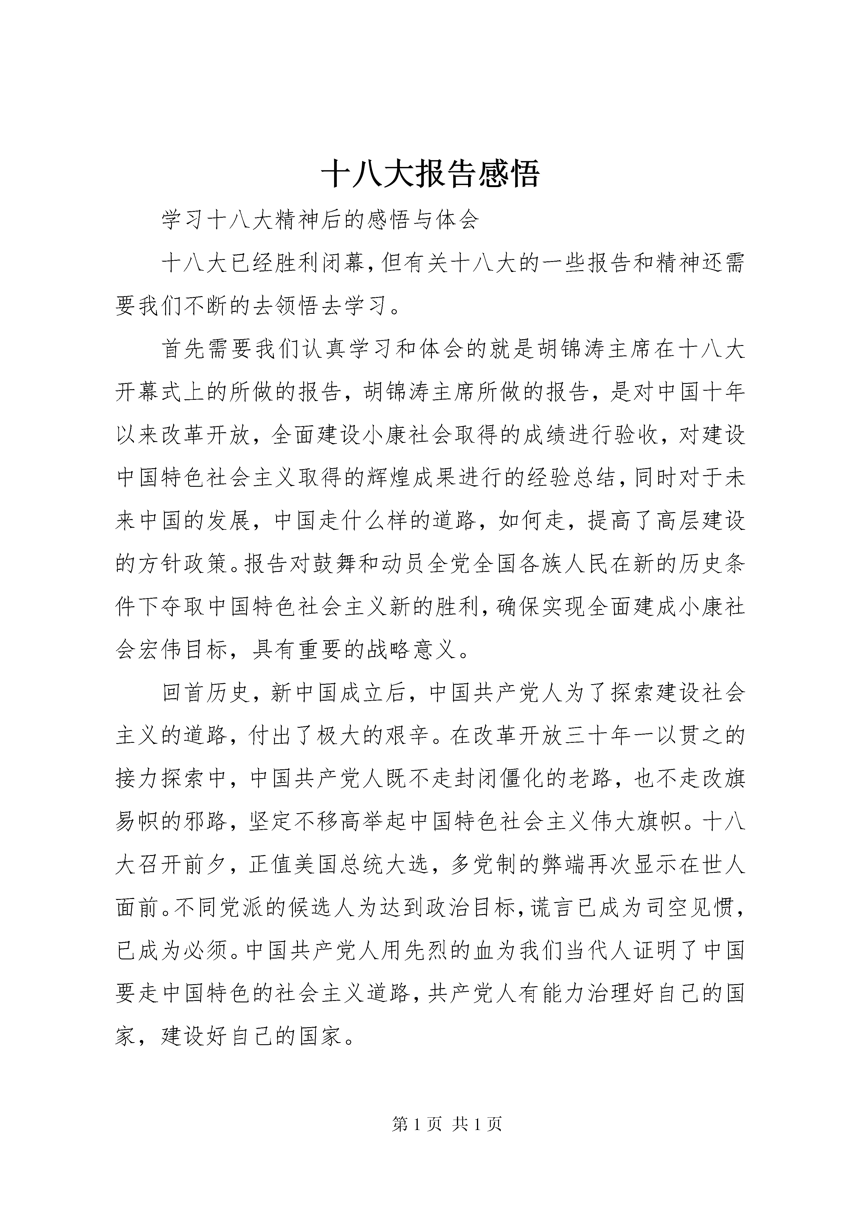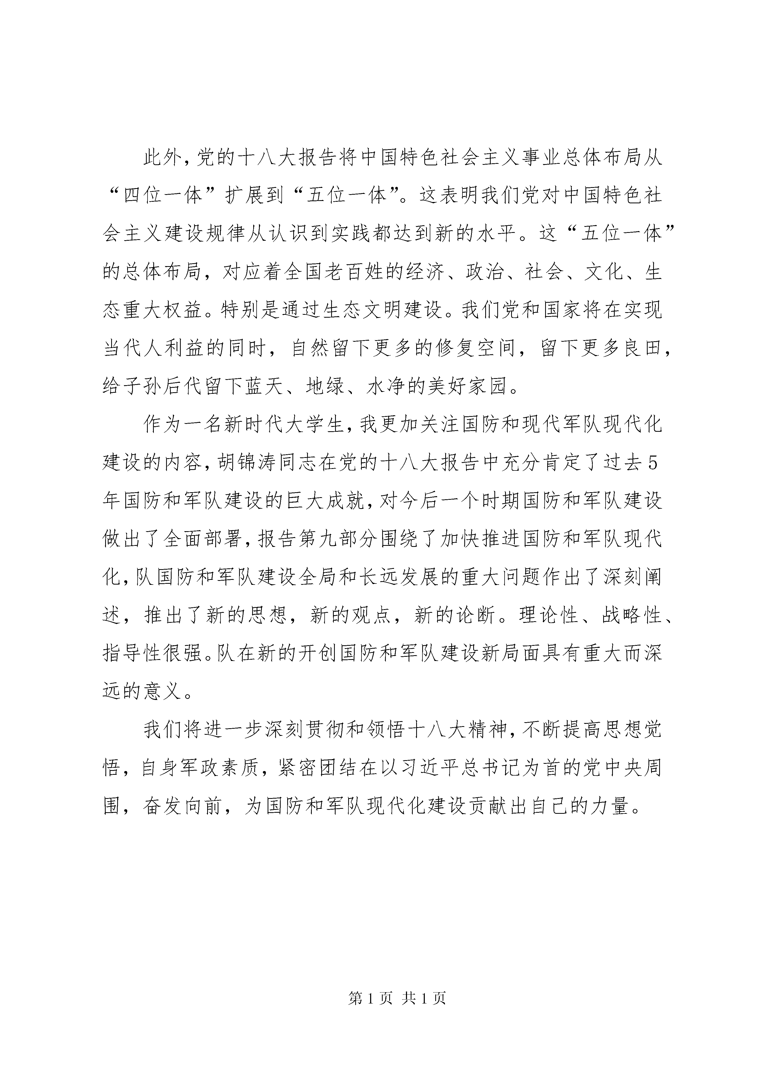 十八大报告感悟学习十八大精神后的感悟与体会十八大已经胜利闭幕,但有关十八大的一些报告和精神还需要我们不断的去领悟去学习。首先需要我们认真学习和体会的就是胡锦涛主席在十八大开幕式上的所做的报告,胡锦涛主席所做的报告,是对中国十年以来改革开放,全面建设小康社会取得的成绩进行验收,对建设中国特色社会主义取得的辉煌成果进行的经验总结,同时对于未来中国的发展,中国走什么样的道路,如何走,提高了高层建设的方针政策。报告对鼓舞和动员全党全国各族人民在新的历史条件下夺取中国特色社会主义新的胜利,确保实现全面建成小康社会宏伟目标,具有重要的战略意义。回首历史,新中国成立后,中国共产党人为了探索建设社会主义的道路,付出了极大的艰辛。在改革开放三十年一以贯之的接力探索中,中国共产党人既不走封闭僵化的老路,也不走改旗易帜的邪路,坚定不移高举起中国特色社会主义伟大旗帜。十八大召开前夕,正值美国总统大选,多党制的弊端再次显示在世人面前。不同党派的候选人为达到政治目标,谎言已成为司空见惯,已成为必须。中国共产党人用先烈的血为我们当代人证明了中国要走中国特色的社会主义道路,共产党人有能力治理好自己的国家,建设好自己的国家。此外,党的十八大报告将中国特色社会主义事业总体布局从“四位一体”扩展到“五位一体”。这表明我们党对中国特色社会主义建设规律从认识到实践都达到新的水平。这“五位一体”的总体布局,对应着全国老百姓的经济、政治、社会、文化、生态重大权益。特别是通过生态文明建设。我们党和国家将在实现当代人利益的同时,自然留下更多的修复空间,留下更多良田,给子孙后代留下蓝天、地绿、水净的美好家园。作为一名新时代大学生,我更加关注国防和现代军队现代化建设的内容,胡锦涛同志在党的十八大报告中充分肯定了过去5年国防和军队建设的巨大成就,对今后一个时期国防和军队建设做出了全面部署,报告第九部分围绕了加快推进国防和军队现代化,队国防和军队建设全局和长远发展的重大问题作出了深刻阐述,推出了新的思想,新的观点,新的论断。理论性、战略性、指导性很强。队在新的开创国防和军队建设新局面具有重大而深远的意义。我们将进一步深刻贯彻和领悟十八大精神,不断提高思想觉悟,自身军政素质,紧密团结在以习近平总书记为首的党中央周围,奋发向前,为国防和军队现代化建设贡献出自己的力量。