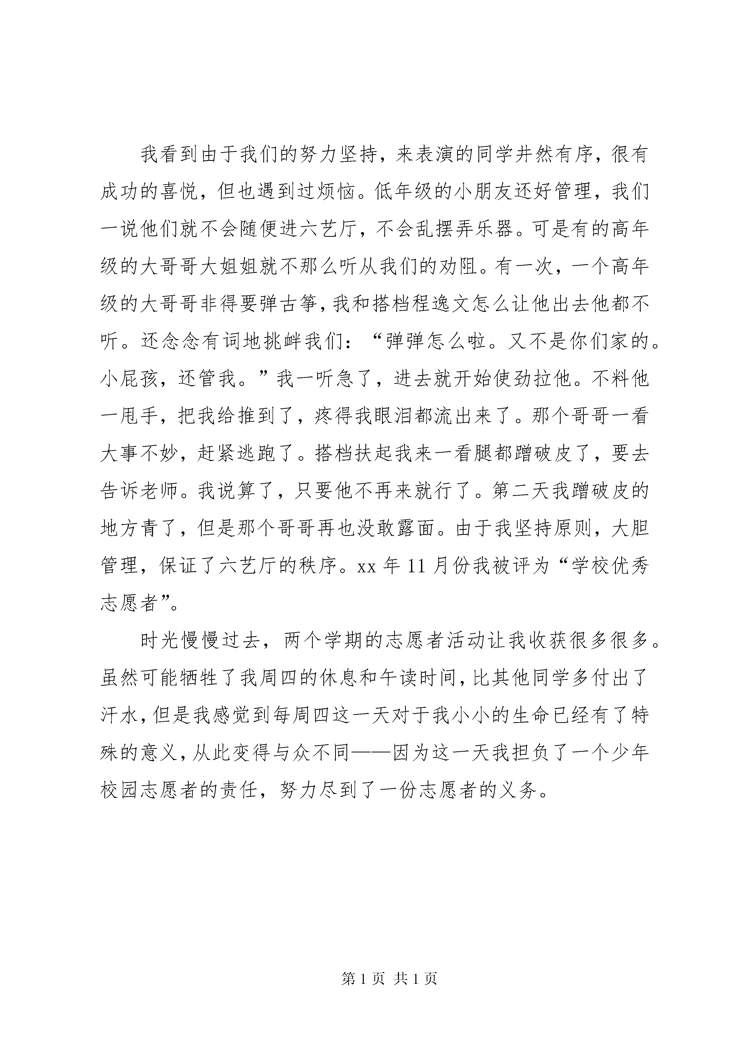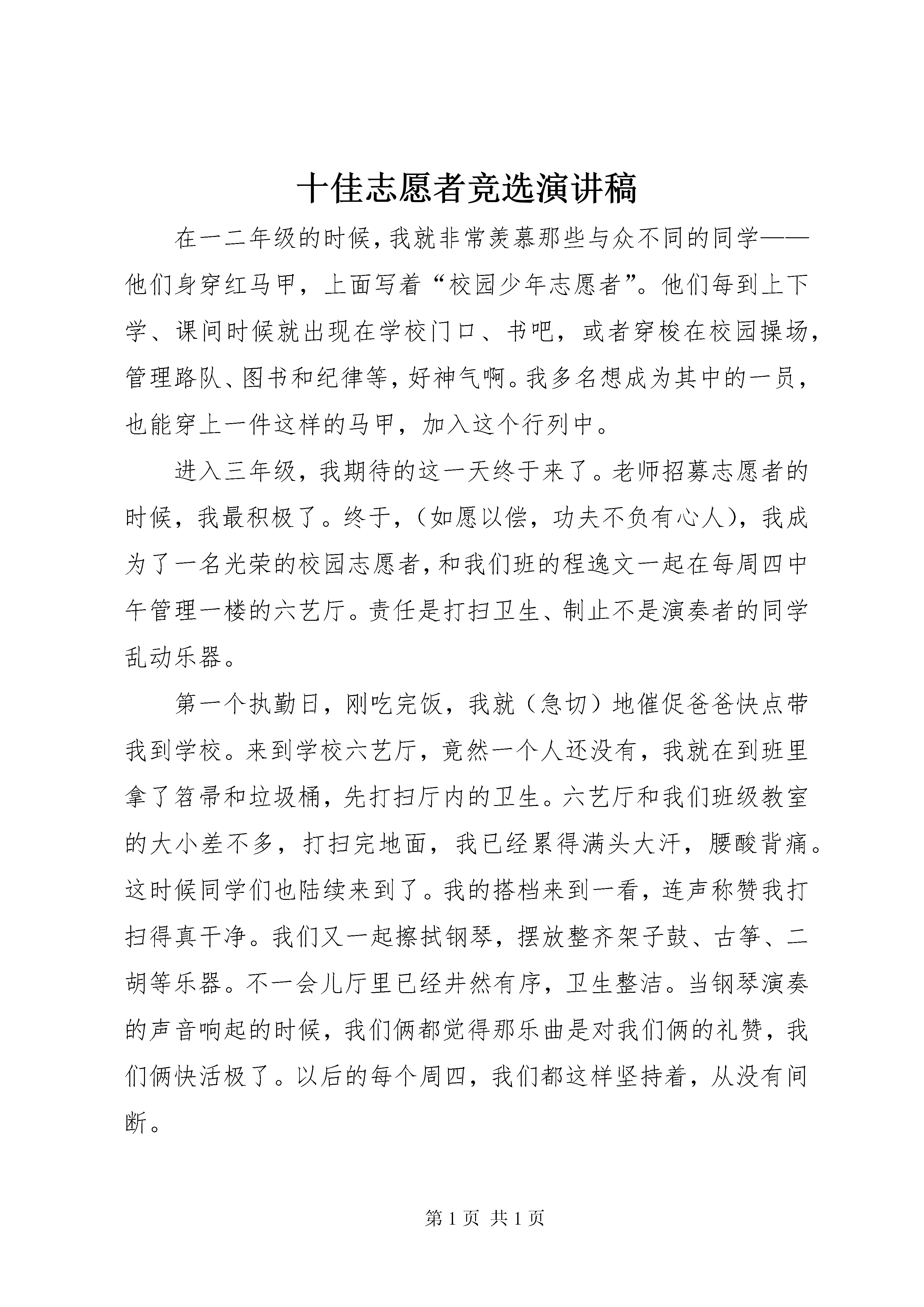 十佳志愿者竞选演讲稿在一二年级的时候,我就非常羡慕那些与众不同的同学——他们身穿红马甲,上面写着“校园少年志愿者”。他们每到上下学、课间时候就出现在学校门口、书吧,或者穿梭在校园操场,管理路队、图书和纪律等,好神气啊。我多名想成为其中的一员,也能穿上一件这样的马甲,加入这个行列中。进入三年级,我期待的这一天终于来了。老师招募志愿者的时候,我最积极了。终于,(如愿以偿,功夫不负有心人),我成为了一名光荣的校园志愿者,和我们班的程逸文一起在每周四中午管理一楼的六艺厅。责任是打扫卫生、制止不是演奏者的同学乱动乐器。第一个执勤日,刚吃完饭,我就(急切)地催促爸爸快点带我到学校。来到学校六艺厅,竟然一个人还没有,我就在到班里拿了笤帚和垃圾桶,先打扫厅内的卫生。六艺厅和我们班级教室的大小差不多,打扫完地面,我已经累得满头大汗,腰酸背痛。这时候同学们也陆续来到了。我的搭档来到一看,连声称赞我打扫得真干净。我们又一起擦拭钢琴,摆放整齐架子鼓、古筝、二胡等乐器。不一会儿厅里已经井然有序,卫生整洁。当钢琴演奏的声音响起的时候,我们俩都觉得那乐曲是对我们俩的礼赞,我们俩快活极了。以后的每个周四,我们都这样坚持着,从没有间断。我看到由于我们的努力坚持,来表演的同学井然有序,很有成功的喜悦,但也遇到过烦恼。低年级的小朋友还好管理,我们一说他们就不会随便进六艺厅,不会乱摆弄乐器。可是有的高年级的大哥哥大姐姐就不那么听从我们的劝阻。有一次,一个高年级的大哥哥非得要弹古筝,我和搭档程逸文怎么让他出去他都不听。还念念有词地挑衅我们:“弹弹怎么啦。又不是你们家的。小屁孩,还管我。”我一听急了,进去就开始使劲拉他。不料他一甩手,把我给推到了,疼得我眼泪都流出来了。那个哥哥一看大事不妙,赶紧逃跑了。搭档扶起我来一看腿都蹭破皮了,要去告诉老师。我说算了,只要他不再来就行了。第二天我蹭破皮的地方青了,但是那个哥哥再也没敢露面。由于我坚持原则,大胆管理,保证了六艺厅的秩序。xx年11月份我被评为“学校优秀志愿者”。时光慢慢过去,两个学期的志愿者活动让我收获很多很多。虽然可能牺牲了我周四的休息和午读时间,比其他同学多付出了汗水,但是我感觉到每周四这一天对于我小小的生命已经有了特殊的意义,从此变得与众不同——因为这一天我担负了一个少年校园志愿者的责任,努力尽到了一份志愿者的义务。