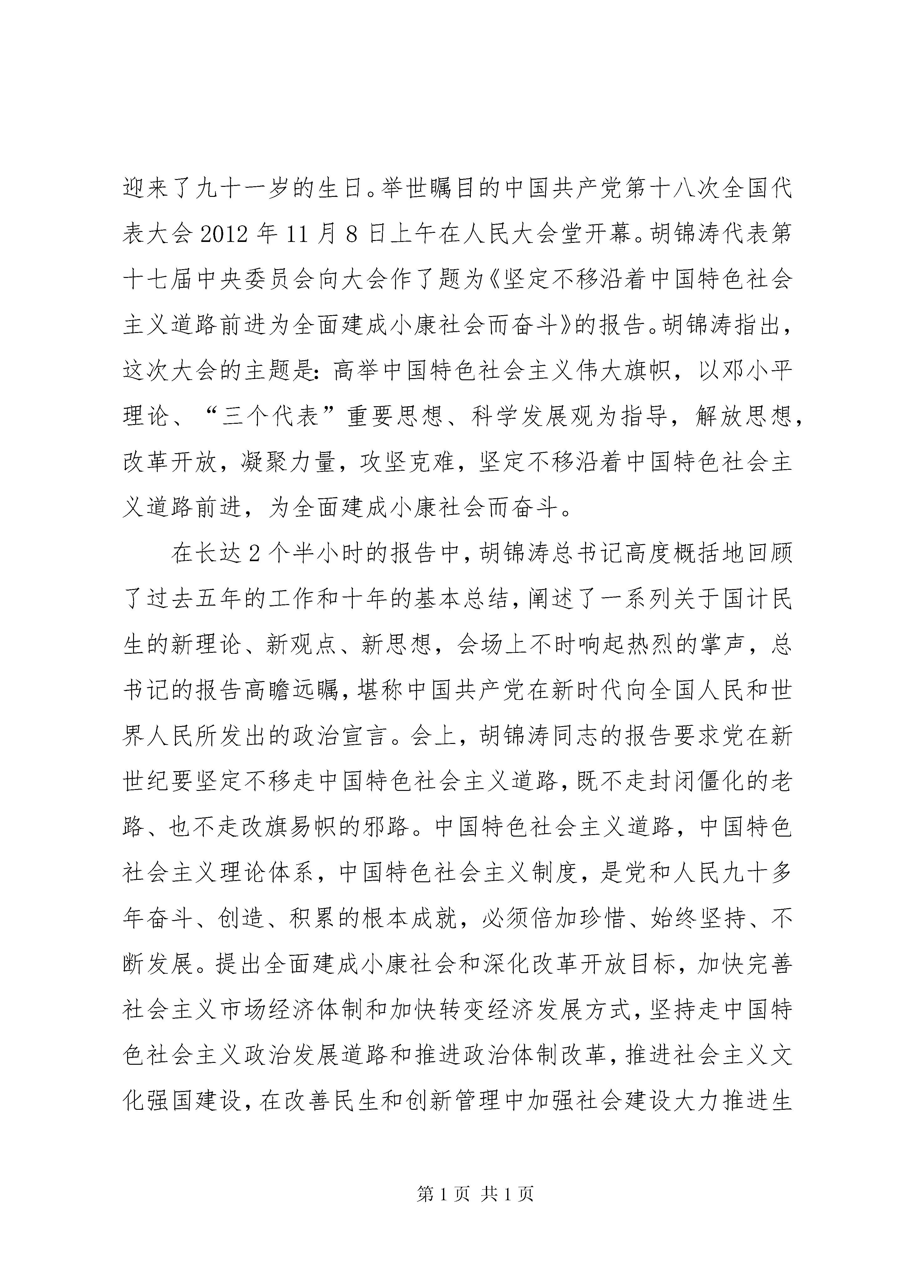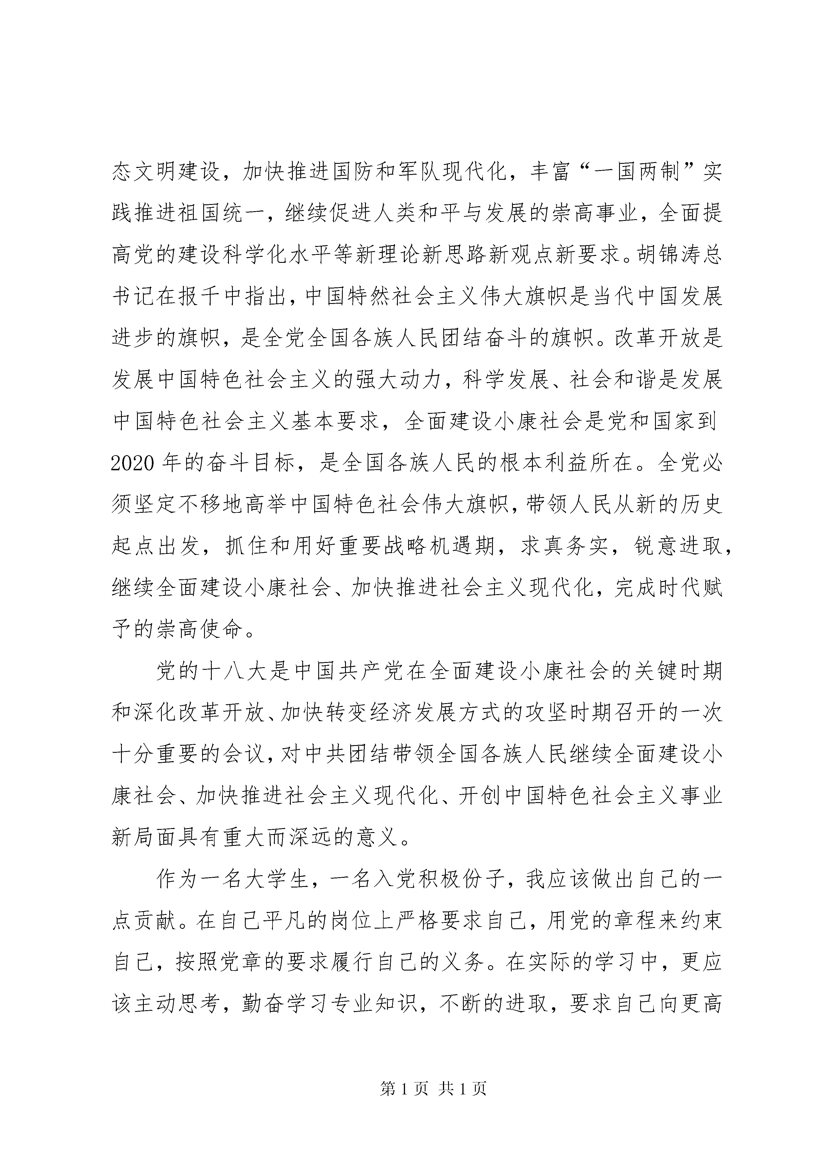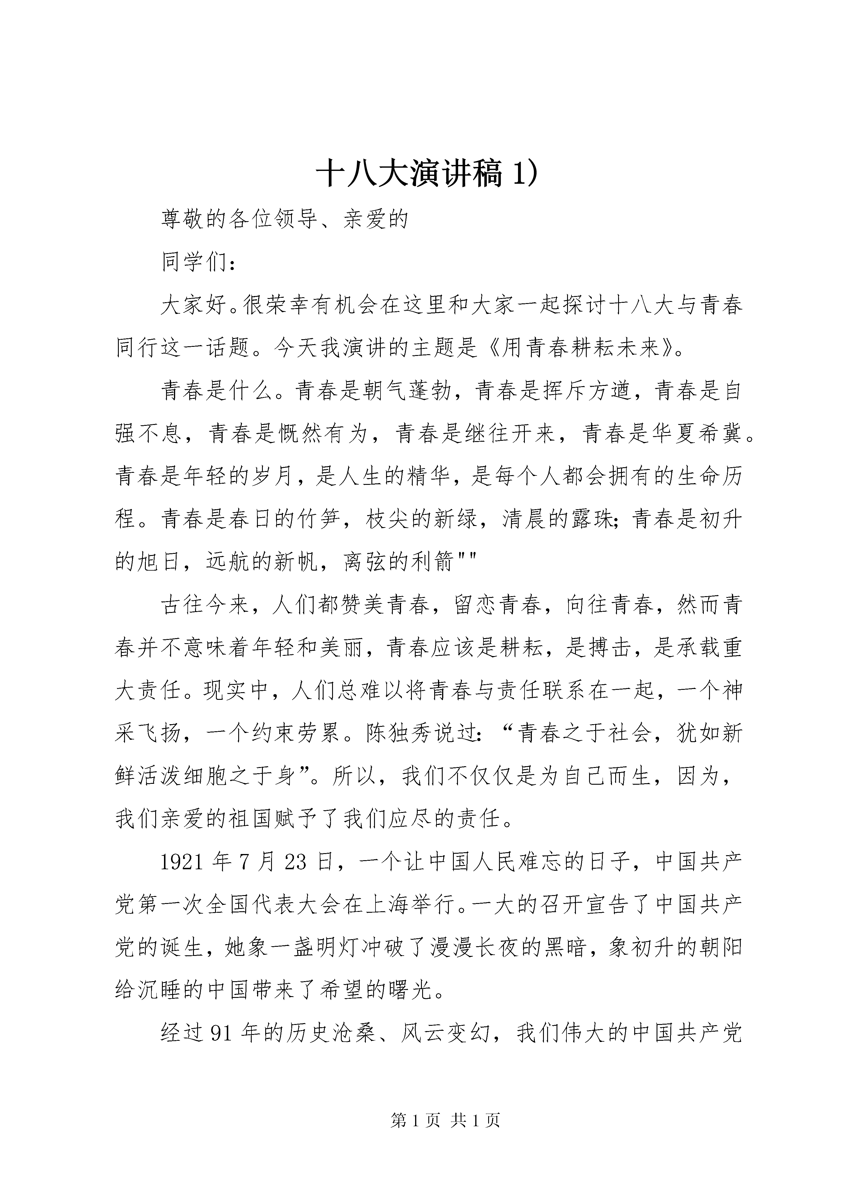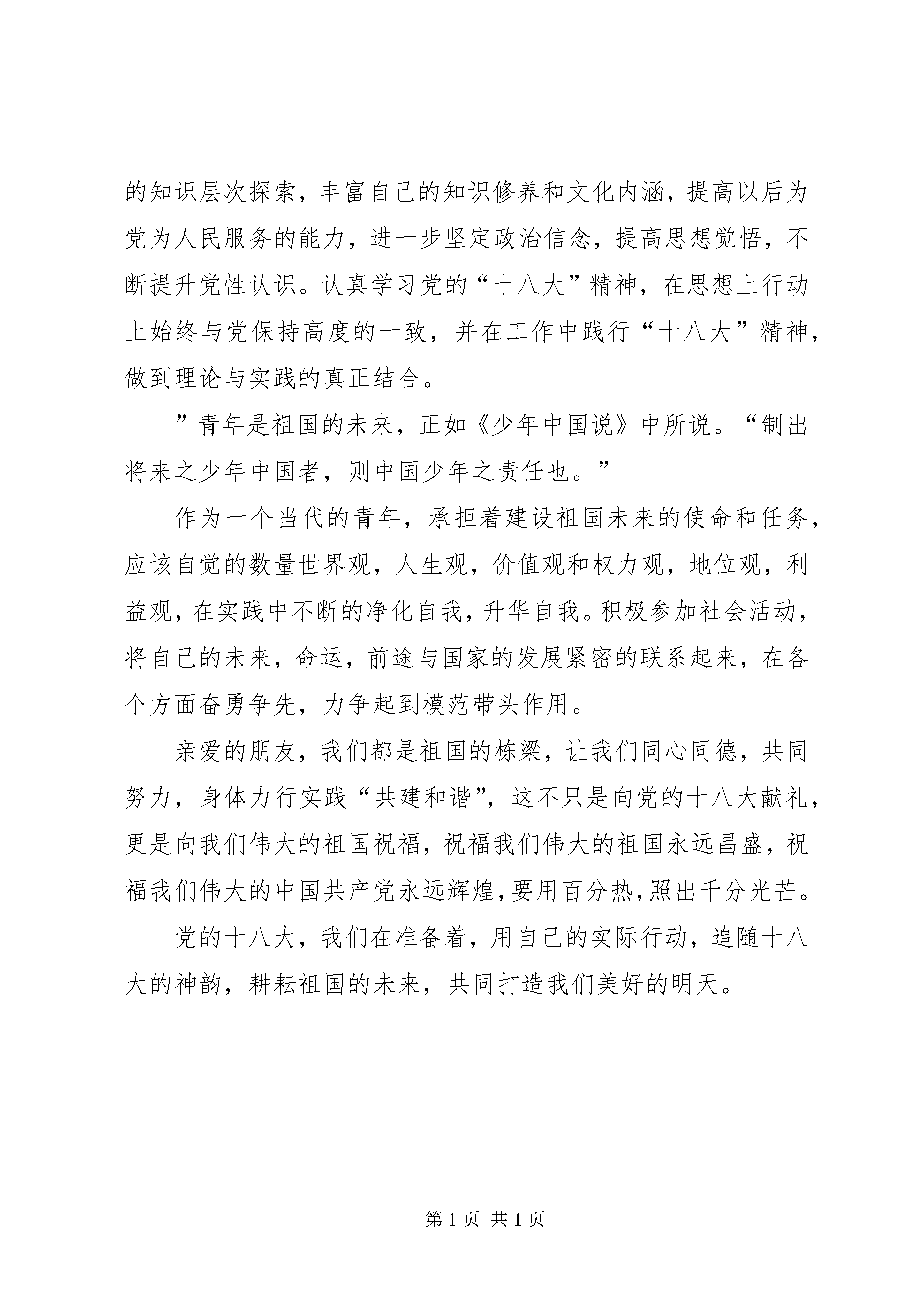 十八大演讲稿1)尊敬的各位领导、亲爱的同学们:大家好。很荣幸有机会在这里和大家一起探讨十八大与青春同行这一话题。今天我演讲的主题是《用青春耕耘未来》。青春是什么。青春是朝气蓬勃,青春是挥斥方遒,青春是自强不息,青春是慨然有为,青春是继往开来,青春是华夏希冀。青春是年轻的岁月,是人生的精华,是每个人都会拥有的生命历程。青春是春日的竹笋,枝尖的新绿,清晨的露珠;青春是初升的旭日,远航的新帆,离弦的利箭""古往今来,人们都赞美青春,留恋青春,向往青春,然而青春并不意味着年轻和美丽,青春应该是耕耘,是搏击,是承载重大责任。现实中,人们总难以将青春与责任联系在一起,一个神采飞扬,一个约束劳累。陈独秀说过:“青春之于社会,犹如新鲜活泼细胞之于身”。所以,我们不仅仅是为自己而生,因为,我们亲爱的祖国赋予了我们应尽的责任。1921年7月23日,一个让中国人民难忘的日子,中国共产党第一次全国代表大会在上海举行。一大的召开宣告了中国共产党的诞生,她象一盏明灯冲破了漫漫长夜的黑暗,象初升的朝阳给沉睡的中国带来了希望的曙光。经过91年的历史沧桑、风云变幻,我们伟大的中国共产党迎来了九十一岁的生日。举世瞩目的中国共产党第十八次全国代表大会2012年11月8日上午在人民大会堂开幕。胡锦涛代表第十七届中央委员会向大会作了题为《坚定不移沿着中国特色社会主义道路前进为全面建成小康社会而奋斗》的报告。胡锦涛指出,这次大会的主题是:高举中国特色社会主义伟大旗帜,以邓小平理论、“三个代表”重要思想、科学发展观为指导,解放思想,改革开放,凝聚力量,攻坚克难,坚定不移沿着中国特色社会主义道路前进,为全面建成小康社会而奋斗。在长达2个半小时的报告中,胡锦涛总书记高度概括地回顾了过去五年的工作和十年的基本总结,阐述了一系列关于国计民生的新理论、新观点、新思想,会场上不时响起热烈的掌声,总书记的报告高瞻远瞩,堪称中国共产党在新时代向全国人民和世界人民所发出的政治宣言。会上,胡锦涛同志的报告要求党在新世纪要坚定不移走中国特色社会主义道路,既不走封闭僵化的老路、也不走改旗易帜的邪路。中国特色社会主义道路,中国特色社会主义理论体系,中国特色社会主义制度,是党和人民九十多年奋斗、创造、积累的根本成就,必须倍加珍惜、始终坚持、不断发展。提出全面建成小康社会和深化改革开放目标,加快完善社会主义市场经济体制和加快转变经济发展方式,坚持走中国特色社会主义政治发展道路和推进政治体制改革,推进社会主义文化强国建设,在改善民生和创新管理中加强社会建设大力推进生态文明建设,加快推进国防和军队现代化,丰富“一国两制”实践推进祖国统一,继续促进人类和平与发展的崇高事业,全面提高党的建设科学化水平等新理论新思路新观点新要求。胡锦涛总书记在报千中指出,中国特然社会主义伟大旗帜是当代中国发展进步的旗帜,是全党全国各族人民团结奋斗的旗帜。改革开放是发展中国特色社会主义的强大动力,科学发展、社会和谐是发展中国特色社会主义基本要求,全面建设小康社会是党和国家到2020年的奋斗目标,是全国各族人民的根本利益所在。全党必须坚定不移地高举中国特色社会伟大旗帜,带领人民从新的历史起点出发,抓住和用好重要战略机遇期,求真务实,锐意进取,继续全面建设小康社会、加快推进社会主义现代化,完成时代赋予的崇高使命。党的十八大是中国共产党在全面建设小康社会的关键时期和深化改革开放、加快转变经济发展方式的攻坚时期召开的一次十分重要的会议,对中共团结带领全国各族人民继续全面建设小康社会、加快推进社会主义现代化、开创中国特色社会主义事业新局面具有重大而深远的意义。作为一名大学生,一名入党积极份子,我应该做出自己的一点贡献。在自己平凡的岗位上严格要求自己,用党的章程来约束自己,按照党章的要求履行自己的义务。在实际的学习中,更应该主动思考,勤奋学习专业知识,不断的进取,要求自己向更高的知识层次探索,丰富自己的知识修养和文化内涵,提高以后为党为人民服务的能力,进一步坚定政治信念,提高思想觉悟,不断提升党性认识。认真学习党的“十八大”精神,在思想上行动上始终与党保持高度的一致,并在工作中践行“十八大”精神,做到理论与实践的真正结合。”青年是祖国的未来,正如《少年中国说》中所说。“制出将来之少年中国者,则中国少年之责任也。”作为一个当代的青年,承担着建设祖国未来的使命和任务,应该自觉的数量世界观,人生观,价值观和权力观,地位观,利益观,在实践中不断的净化自我,升华自我。积极参加社会活动,将自己的未来,命运,前途与国家的发展紧密的联系起来,在各个方面奋勇争先,力争起到模范带头作用。亲爱的朋友,我们都是祖国的栋梁,让我们同心同德,共同努力,身体力行实践“共建和谐”,这不只是向党的十八大献礼,更是向我们伟大的祖国祝福,祝福我们伟大的