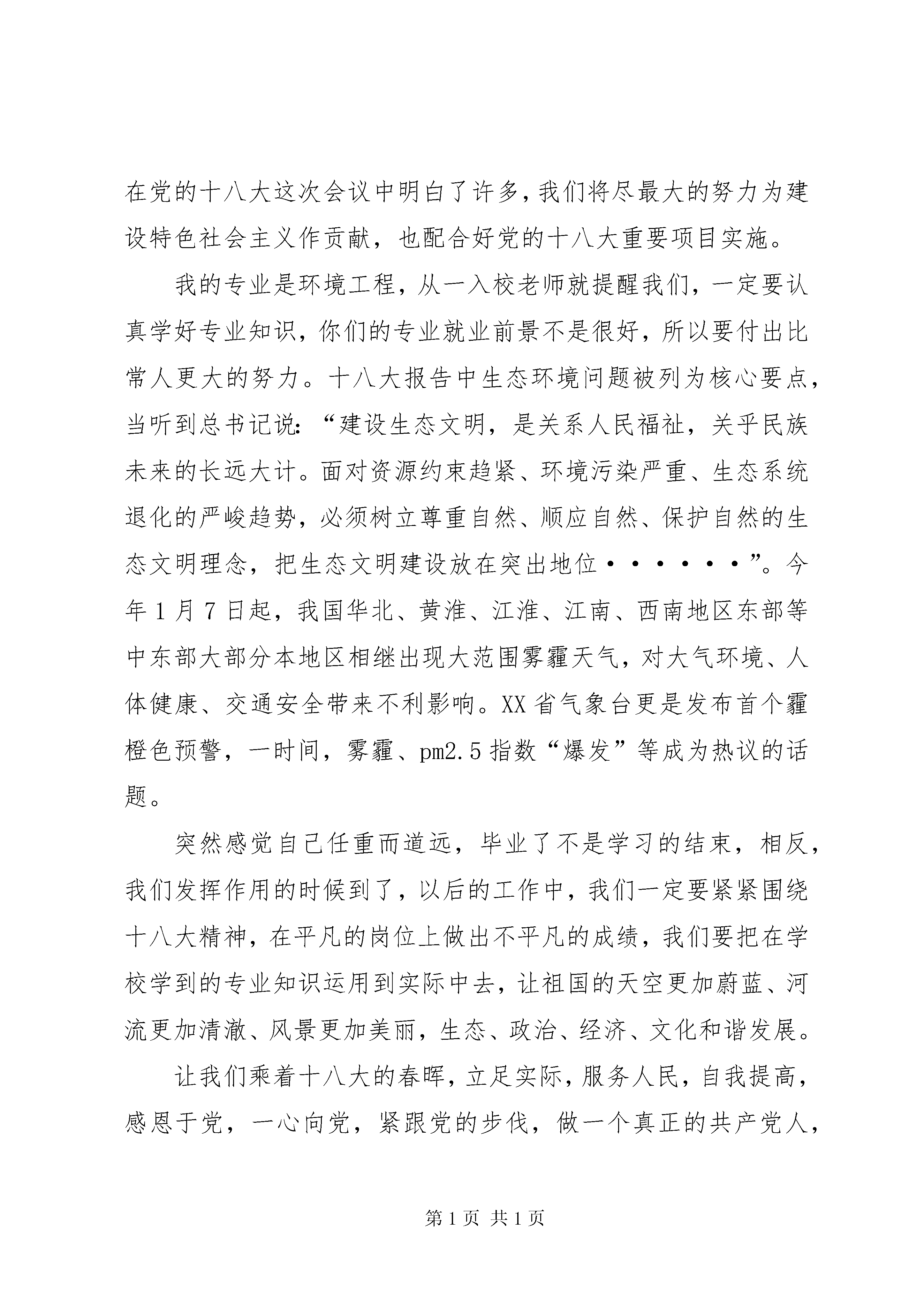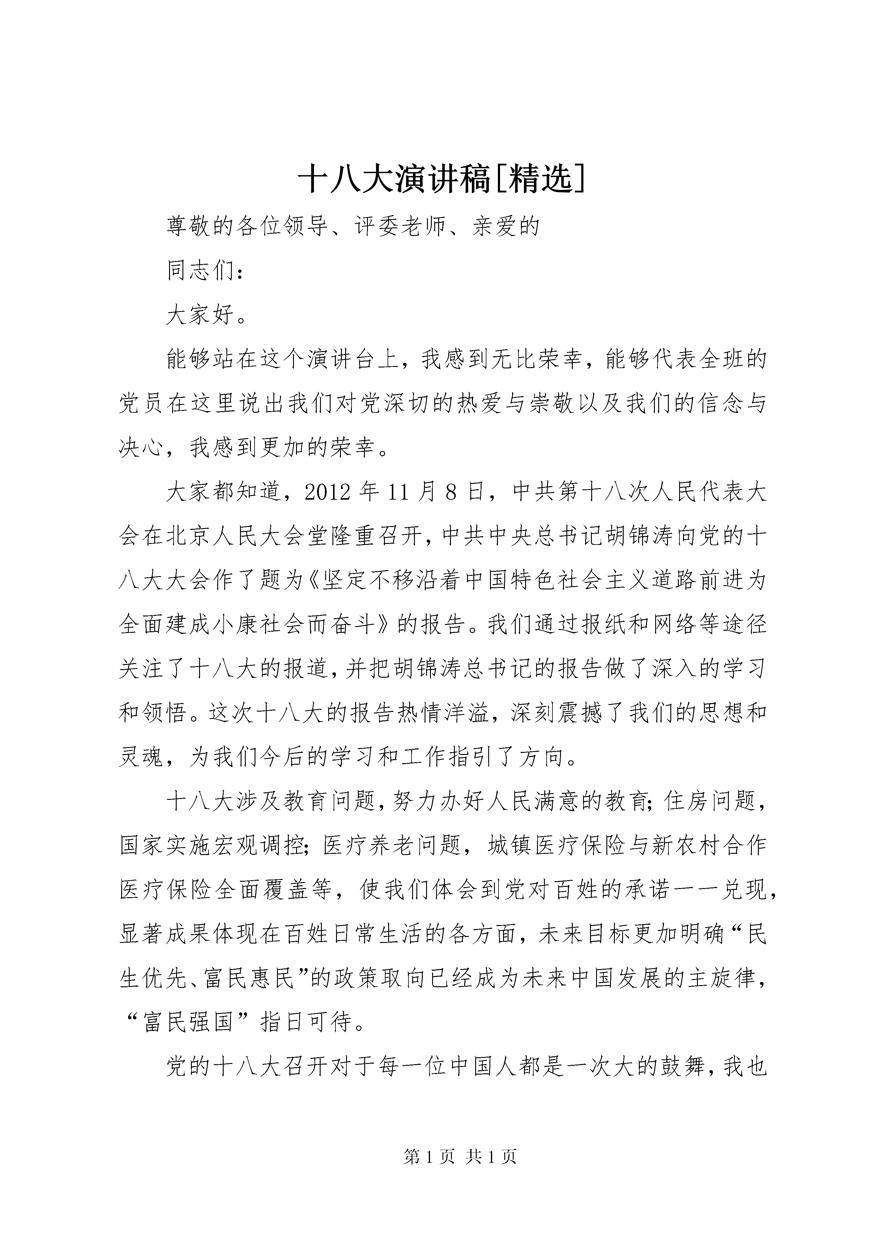 十八大演讲稿[精选]尊敬的各位领导、评委老师、亲爱的同志们:大家好。能够站在这个演讲台上,我感到无比荣幸,能够代表全班的党员在这里说出我们对党深切的热爱与崇敬以及我们的信念与决心,我感到更加的荣幸。大家都知道,2012年11月8日,中共第十八次人民代表大会在北京人民大会堂隆重召开,中共中央总书记胡锦涛向党的十八大大会作了题为《坚定不移沿着中国特色社会主义道路前进为全面建成小康社会而奋斗》的报告。我们通过报纸和网络等途径关注了十八大的报道,并把胡锦涛总书记的报告做了深入的学习和领悟。这次十八大的报告热情洋溢,深刻震撼了我们的思想和灵魂,为我们今后的学习和工作指引了方向。十八大涉及教育问题,努力办好人民满意的教育;住房问题,国家实施宏观调控;医疗养老问题,城镇医疗保险与新农村合作医疗保险全面覆盖等,使我们体会到党对百姓的承诺一一兑现,显著成果体现在百姓日常生活的各方面,未来目标更加明确“民生优先、富民惠民”的政策取向已经成为未来中国发展的主旋律,“富民强国”指日可待。党的十八大召开对于每一位中国人都是一次大的鼓舞,我也在党的十八大这次会议中明白了许多,我们将尽最大的努力为建设特色社会主义作贡献,也配合好党的十八大重要项目实施。我的专业是环境工程,从一入校老师就提醒我们,一定要认真学好专业知识,你们的专业就业前景不是很好,所以要付出比常人更大的努力。十八大报告中生态环境问题被列为核心要点,当听到总书记说:“建设生态文明,是关系人民福祉,关乎民族未来的长远大计。面对资源约束趋紧、环境污染严重、生态系统退化的严峻趋势,必须树立尊重自然、顺应自然、保护自然的生态文明理念,把生态文明建设放在突出地位······”。今年1月7日起,我国华北、黄淮、江淮、江南、西南地区东部等中东部大部分本地区相继出现大范围雾霾天气,对大气环境、人体健康、交通安全带来不利影响。XX省气象台更是发布首个霾橙色预警,一时间,雾霾、pm2.5指数“爆发”等成为热议的话题。突然感觉自己任重而道远,毕业了不是学习的结束,相反,我们发挥作用的时候到了,以后的工作中,我们一定要紧紧围绕十八大精神,在平凡的岗位上做出不平凡的成绩,我们要把在学校学到的专业知识运用到实际中去,让祖国的天空更加蔚蓝、河流更加清澈、风景更加美丽,生态、政治、经济、文化和谐发展。让我们乘着十八大的春晖,立足实际,服务人民,自我提高,感恩于党,一心向党,紧跟党的步伐,做一个真正的共产党人,做好一个党员应该做的事,实事求是,为党和人民的事业奋斗终生。西安石油大学环境0901杨红
