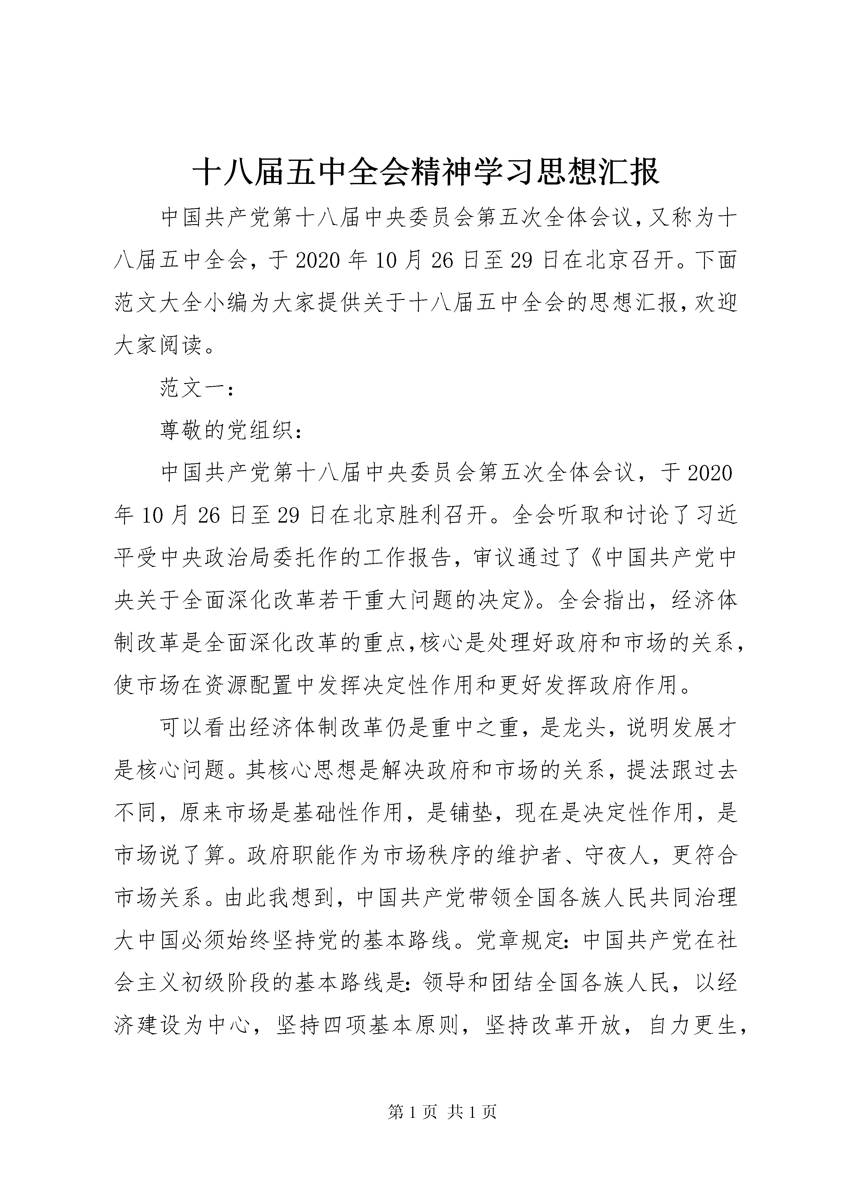十八届五中全会精神学习思想汇报中国共产党第十八届中央委员会第五次全体会议,又称为十八届五中全会,于2020年10月26日至29日在北京召开。下面范文大全小编为大家提供关于十八届五中全会的思想汇报,欢迎大家阅读。范文一:尊敬的党组织:中国共产党第十八届中央委员会第五次全体会议,于2020年10月26日至29日在北京胜利召开。全会听取和讨论了习近平受中央政治局委托作的工作报告,审议通过了《中国共产党中央关于全面深化改革若干重大问题的决定》。全会指出,经济体制改革是全面深化改革的重点,核心是处理好政府和市场的关系,使市场在资源配置中发挥决定性作用和更好发挥政府作用。可以看出经济体制改革仍是重中之重,是龙头,说明发展才是核心问题。其核心思想是解决政府和市场的关系,提法跟过去不同,原来市场是基础性作用,是铺垫,现在是决定性作用,是市场说了算。政府职能作为市场秩序的维护者、守夜人,更符合市场关系。由此我想到,中国共产党带领全国各族人民共同治理大中国必须始终坚持党的基本路线。党章规定:中国共产党在社会主义初级阶段的基本路线是:领导和团结全国各族人民,以经济建设为中心,坚持四项基本原则,坚持改革开放,自力更生,艰苦创业,为把我国建设成为富强民主文明和谐的社会主义现代化国家而奋斗。这是中国共产党第十八次全国代表大会于2020年10月14日通过的《中国共产党章程》新的规定。概括起来就是一个中心、两个基本点.党的基本路线,是相互贯通、相互依存、不可分割的统一整体,须臾不可偏离、丝毫不可偏废,必须全面坚持、一以贯之。党的基本路线是党和国家的生命线,是实现科学发展的政治保证。以经济建设为中心是兴国之要,是我们党、我们国家兴旺发达和长治久安的根本要求;四项基本原则是立国之本,是我们党、我们国家生存发展的政治基石;改革开放是强国之路,是我们党、我们国家发展进步的活力源泉。要坚持把以经济建设为中心同四项基本原则、改革开放这两个基本点统一于发展中国特色社会主义的伟大实践,任何时候都决不能动摇。否则其他改革都不能得到很好的保障,甚至一旦偏废于此就有可能让改革进度甚至方向得不到掌控。就真的会失去最最基础的力量的支持。引起中国历史上新的翻天覆地的具有很多不确定性的革命。当那时,普通百姓又要处在水深火热之中,又要苦苦探寻救国之路,又要在发展与倒退中反复,而现在经济发展了,人民受益了,并且一直受益下去,党的执政地位就在大中国的各个角落得到认可,得到维护,不容任何反党、反社会,破坏今天来之不易的各个方面都取得历史性,阶段性重大发展成果的大好局面。党的理论一直在实践中发展,在发展中创新,一直保持对中国特色社会主义制度的前瞻性的高度敏感,并善于总结发展实践中的经验教训,意在总结出其中的客观规律,并及时的上升到国家意志来指导中国的发展实践。相信中国的未来会更美好,只要我们都不懈努力。此致敬礼汇报人:范文大全times;times;times;times;年times;times;月times;times;日范文二:尊敬的党组织:您好。可以看出经济体制改革仍是重中之重,是龙头,说明发展才是核心问题。其核心思想是解决政府和市场的关系,提法跟过去不同,原来市场是基础性作用,是铺垫,现在是决定性作用,是市场说了算。政府职能作为市场秩序的维护者、守夜人,更符合市场关系。由此我想到,中国共产党带领全国各族人民共同治理大中国必须始终坚持党的基本路线。党章规定:中国共产党在社会主义初级阶段的基本路线是:领导和团结全国各族人民,以经济建设为中心,坚持四项基本原则,坚持改革开放,自力更生,艰苦创业,为把我国建设成为富强民主文明和谐的社会主义现代化国家而奋斗。这是中国共产党第十八次全国代表大会于2020年10月14日通过的《中国共产党章程》新的规定。概括起来就是一个中心、两个基本点。党的基本路线,是相互贯通、相互依存、不可分割的统一整体,须臾不可偏离、丝毫不可偏废,必须全面坚持、一以贯之。思想汇报党的基本路线是党和国家的生命线,是实现科学发展的政治保证。以经济建设为中心是兴国之要,是我们党、我们国家兴旺发达和长治久安的根本要求;四项基本原则是立国之本,是我们党、我们国家生存发展的政治基石;改革开放是强国之路,是我们党、我们国家发展进步的活力源泉。要坚持把以经济建设为中心同四项基本原则、改革开放这两个基本点统一于发展中国特色社会主义的伟大实践,任何时候都决不能动摇。否则其他改革都不能得到很好的保障,甚至一旦偏废于此就有可能让改革进度甚至方向得不到掌控。就真的会失去最最基础的力量的支持。引起中国历史上新的翻天覆地的具有很多不确定性的革命。当那时,普通百姓又要处在水深火热之中,又要苦苦探寻救国之路,又要在发展与倒退中反复,而现在经济发展了,人民受益了,并且一直受益下去,党的执政地