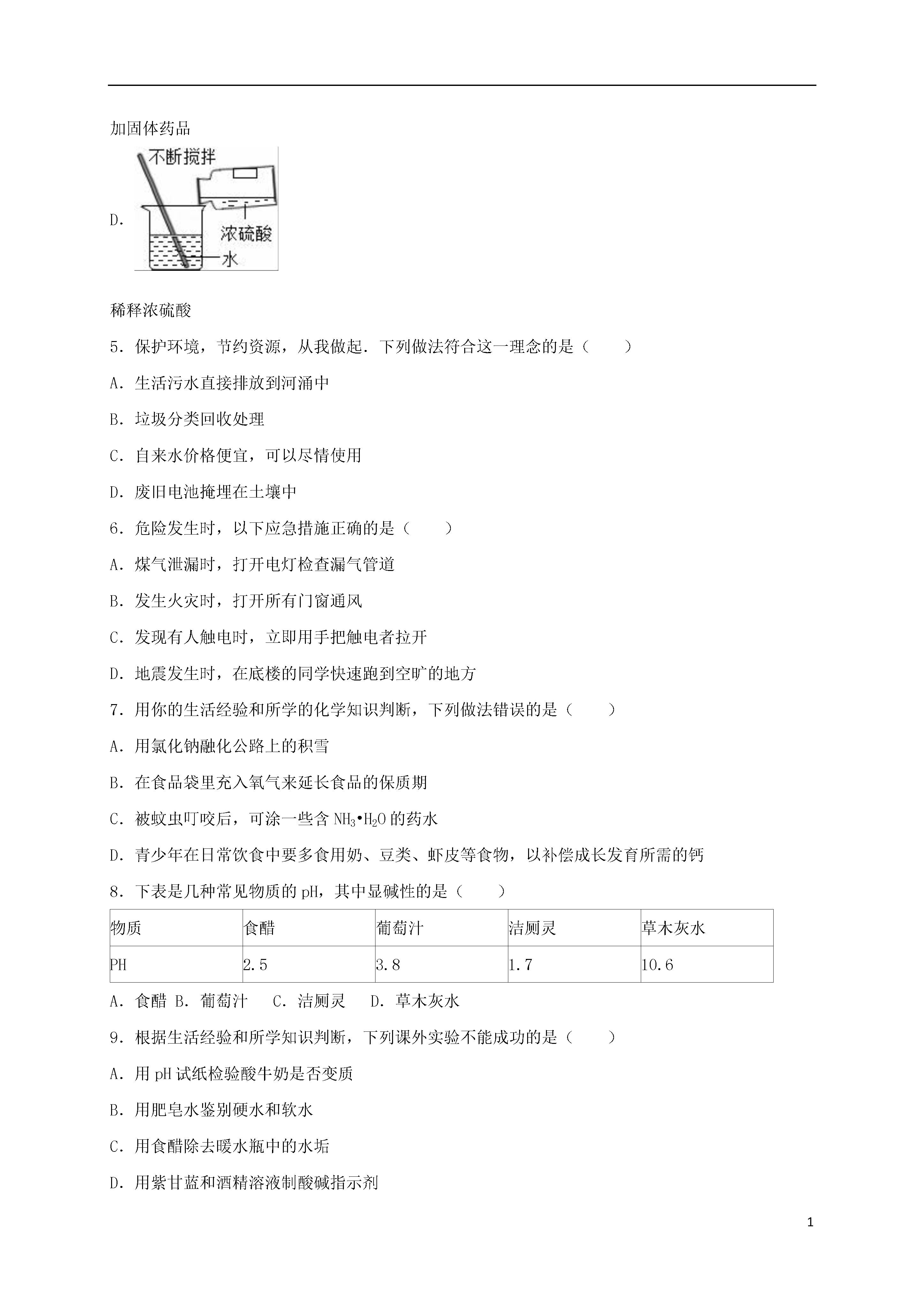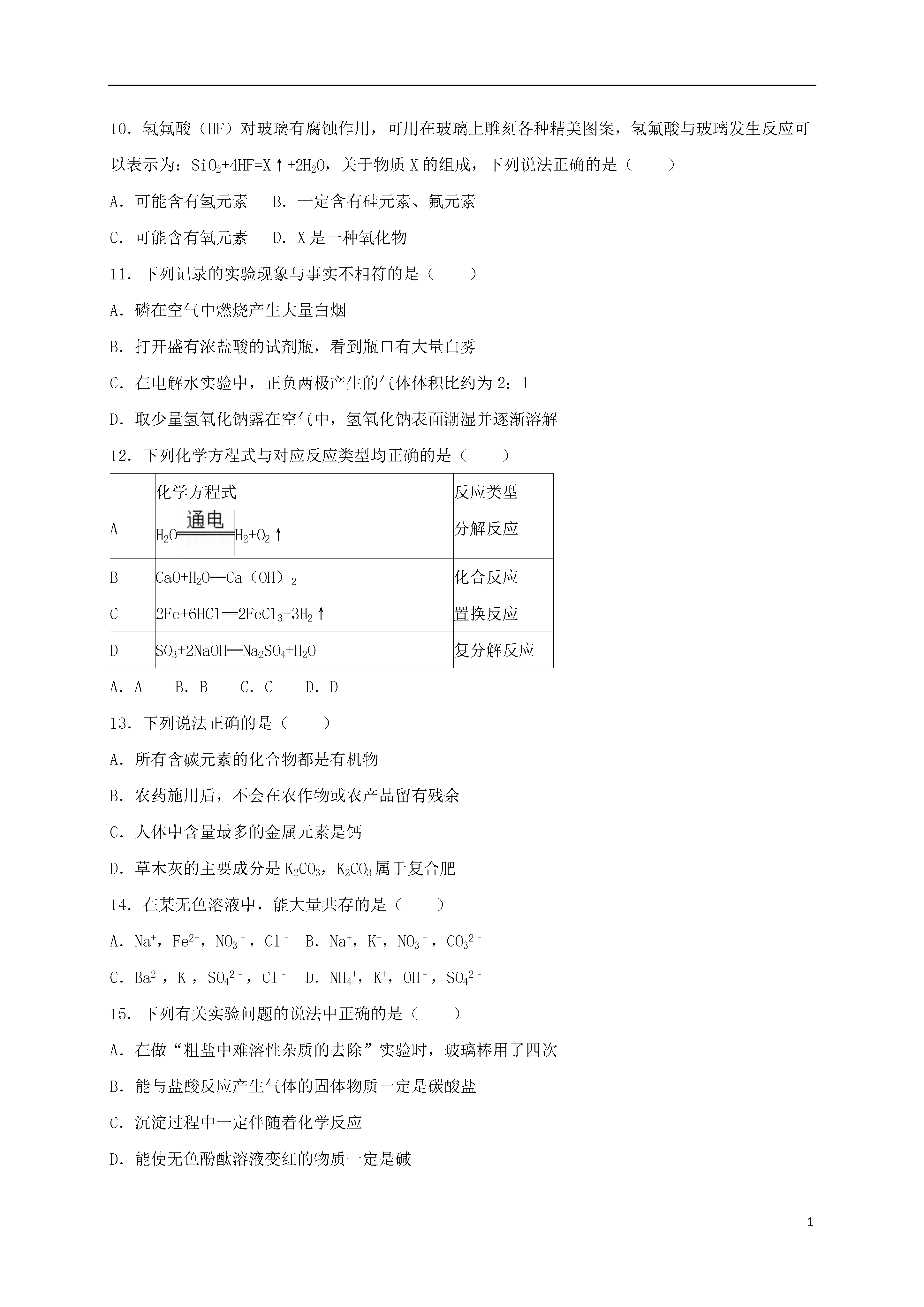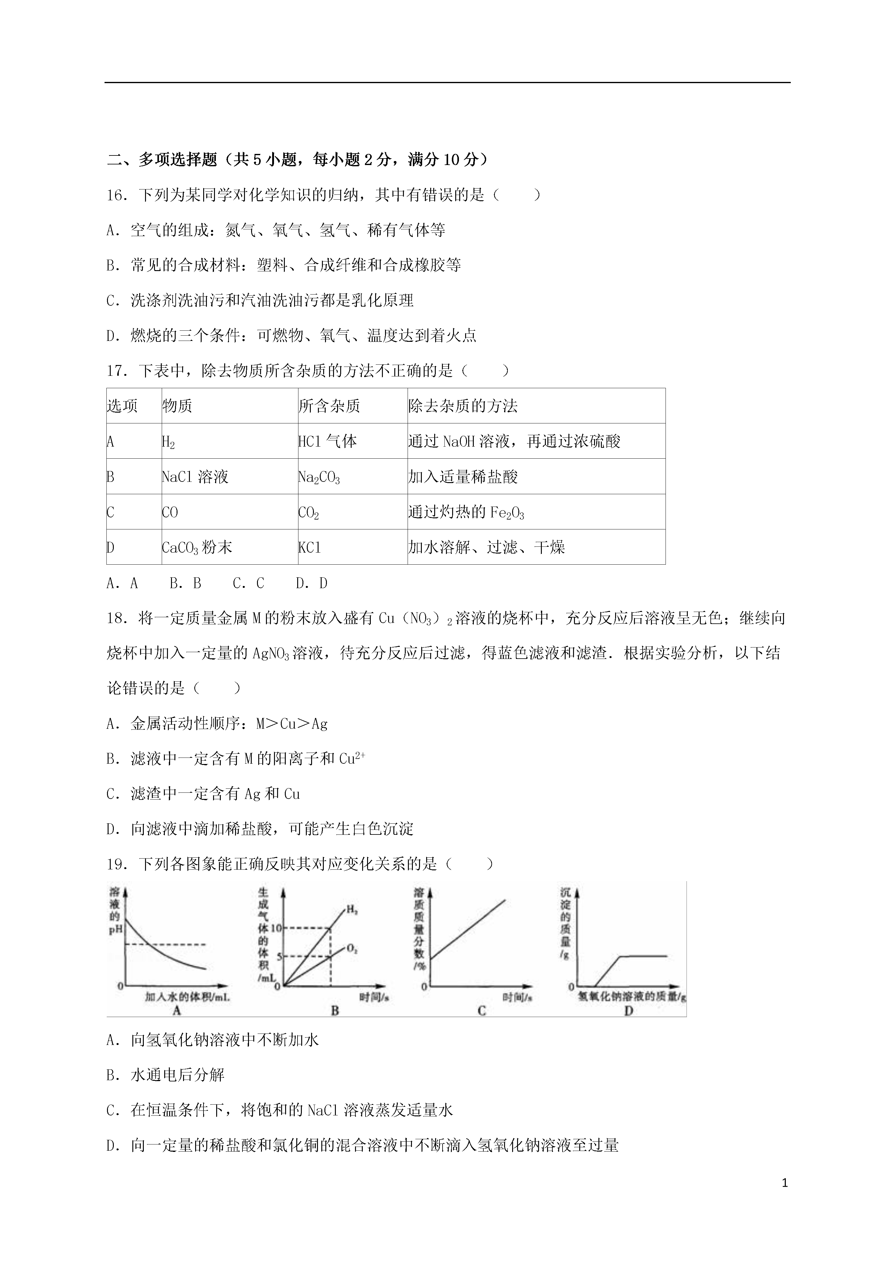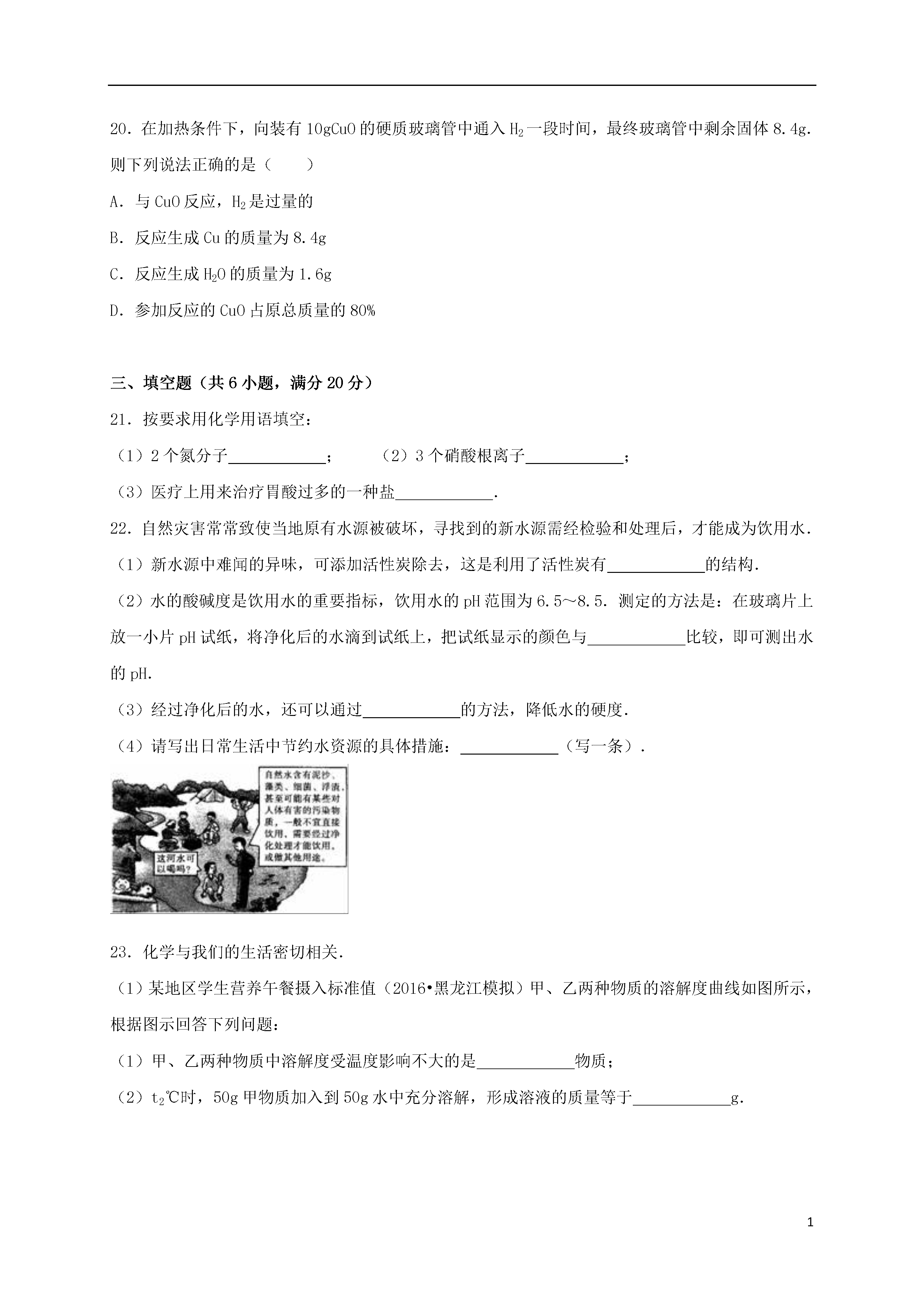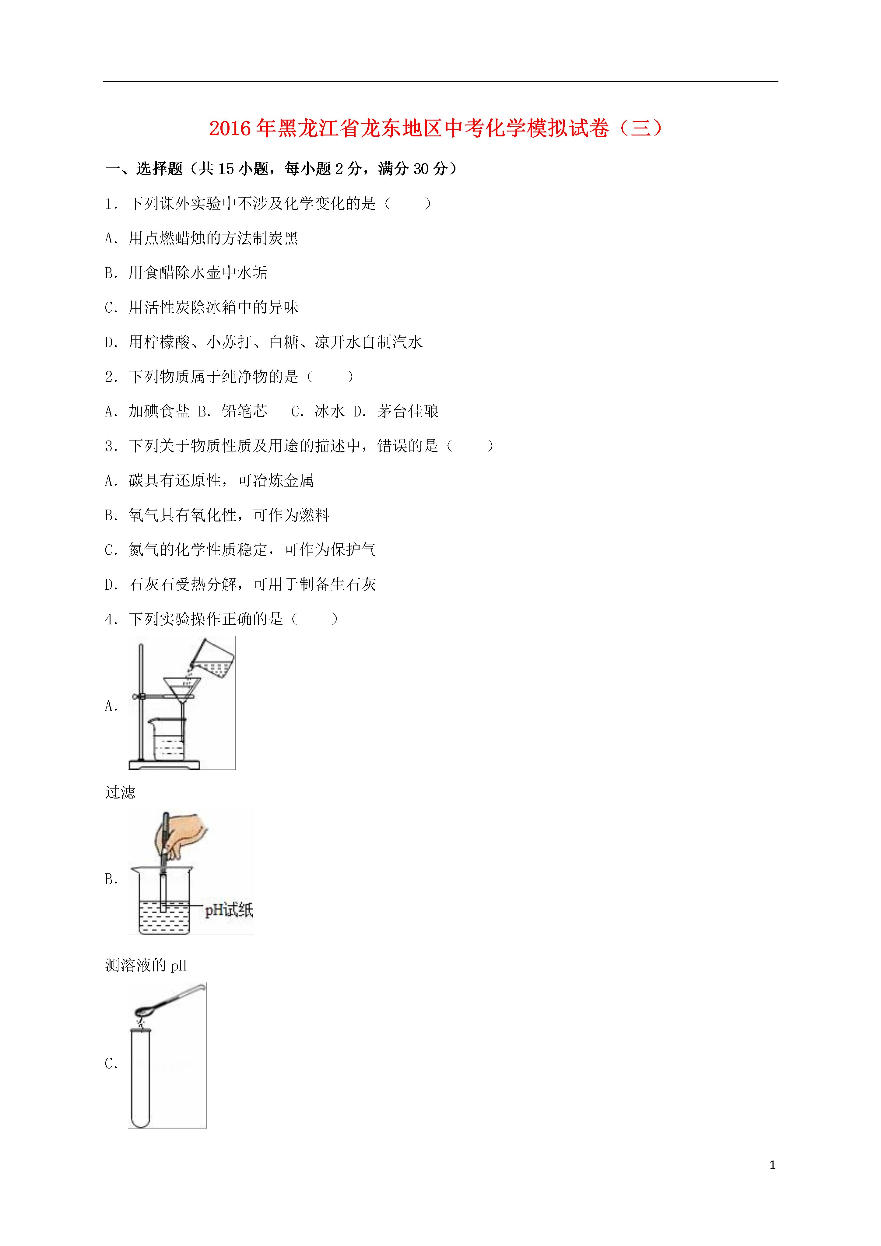 12016年黑龙江省龙东地区中考化学模拟试卷(三)一、选择题(共15小题,每小题2分,满分30分)1.下列课外实验中不涉及化学变化的是()A.用点燃蜡烛的方法制炭黑B.用食醋除水壶中水垢C.用活性炭除冰箱中的异味D.用柠檬酸、小苏打、白糖、凉开水自制汽水2.下列物质属于纯净物的是()A.加碘食盐B.铅笔芯C.冰水D.茅台佳酿3.下列关于物质性质及用途的描述中,错误的是()A.碳具有还原性,可冶炼金属B.氧气具有氧化性,可作为燃料C.氮气的化学性质稳定,可作为保护气D.石灰石受热分解,可用于制备生石灰4.下列实验操作正确的是()A.过滤B.测溶液的pHC.加固体药品D.稀释浓硫酸5.保护环境,节约资源,从我做起.下列做法符合这一理念的是()A.生活污水直接排放到河涌中B.垃圾分类回收处理C.自来水价格便宜,可以尽情使用D.废旧电池掩埋在土壤中6.危险发生时,以下应急措施正确的是()A.煤气泄漏时,打开电灯检查漏气管道B.发生火灾时,打开所有门窗通风C.发现有人触电时,立即用手把触电者拉开D.地震发生时,在底楼的同学快速跑到空旷的地方7.用你的生活经验和所学的化学知识判断,下列做法错误的是()A.用氯化钠融化公路上的积雪B.在食品袋里充入氧气来延长食品的保质期C.被蚊虫叮咬后,可涂一些含NH3•H2O的药水D.青少年在日常饮食中要多食用奶、豆类、虾皮等食物,以补偿成长发育所需的钙8.下表是几种常见物质的pH,其中显碱性的是()物质食醋葡萄汁洁厕灵草木灰水PH2.53.81.710.6A.食醋B.葡萄汁C.洁厕灵D.草木灰水9.根据生活经验和所学知识判断,下列课外实验不能成功的是()A.用pH试纸检验酸牛奶是否变质B.用肥皂水鉴别硬水和软水C.用食醋除去暖水瓶中的水垢D.用紫甘蓝和酒精溶液制酸碱指示剂10.氢氟酸(HF)对玻璃有腐蚀作用,可用在玻璃上雕刻各种精美图案,氢氟酸与玻璃发生反应可以表示为:SiO2+4HF=X↑+2H2O,关于物质X的组成,下列说法正确的是()A.可能含有氢元素B.一定含有硅元素、氟元素C.可能含有氧元素D.X是一种氧化物11.下列记录的实验现象与事实不相符的是()A.磷在空气中燃烧产生大量白烟B.打开盛有浓盐酸的试剂瓶,看到瓶口有大量白雾C.在电解水实验中,正负两极产生的气体体积比约为2:1D.取少量氢氧化钠露在空气中,氢氧化钠表面潮湿并逐渐溶解12.下列化学方程式与对应反应类型均正确的是()化学方程式反应类型AH2OH2+O2↑分解反应BCaO+H2O═Ca(OH)2化合反应C2Fe+6HCl═2FeCl3+3H2↑置换反应DSO3+2NaOH═Na2SO4+H2O复分解反应A.AB.BC.CD.D13.下列说法正确的是()A.所有含碳元素的化合物都是有机物B.农药施用后,不会在农作物或农产品留有残余C.人体中含量最多的金属元素是钙D.草木灰的主要成分是K2CO3,K2CO3属于复合肥14.在某无色溶液中,能大量共存的是()A.Na+,Fe2+,NO3﹣,Cl﹣B.Na+,K+,NO3﹣,CO32﹣C.Ba2+,K+,SO42﹣,Cl﹣D.NH4+,K+,OH﹣,SO42﹣15.下列有关实验问题的说法中正确的是()A.在做“粗盐中难溶性杂质的去除”实验时,玻璃棒用了四次B.能与盐酸反应产生气体的固体物质一定是碳酸盐C.沉淀过程中一定伴随着化学反应D.能使无色酚酞溶液变红的物质一定是碱二、多项选择题(共5小题,每小题2分,满分10分)16.下列为某同学对化学知识的归纳,其中有错误的是()A.空气的组成:氮气、氧气、氢气、稀有气体等B.常见的合成材料:塑料、合成纤维和合成橡胶等C.洗涤剂洗油污和汽油洗油污都是乳化原理D.燃烧的三个条件:可燃物、氧气、温度达到着火点17.下表中,除去物质所含杂质的方法不正确的是()选项物质所含杂质除去杂质的方法AH2HCl气体通过NaOH溶液,再通过浓硫酸BNaCl溶液Na2CO3加入适量稀盐酸CCOCO2通过灼热的Fe2O3DCaCO3粉末KCl加水溶解、过滤、干燥A.AB.BC.CD.D18.将一定质量金属M的粉末放入盛有Cu(NO3)2溶液的烧杯中,充分反应后溶液呈无色;继续向烧杯中加入一定量的AgNO3溶液,待充分反应后过滤,得蓝色滤液和滤渣.根据实验分析,以下结论错误的是()A.金属活动性顺序:M>Cu>AgB.滤液中一定含有M的阳离子和Cu2+C.滤渣中一定含有Ag和CuD.向滤液中滴加稀盐酸,可能产生白色沉淀19.下列各图象能正确反映其对应变化关系的是()A.向氢氧化钠溶液中不断加水