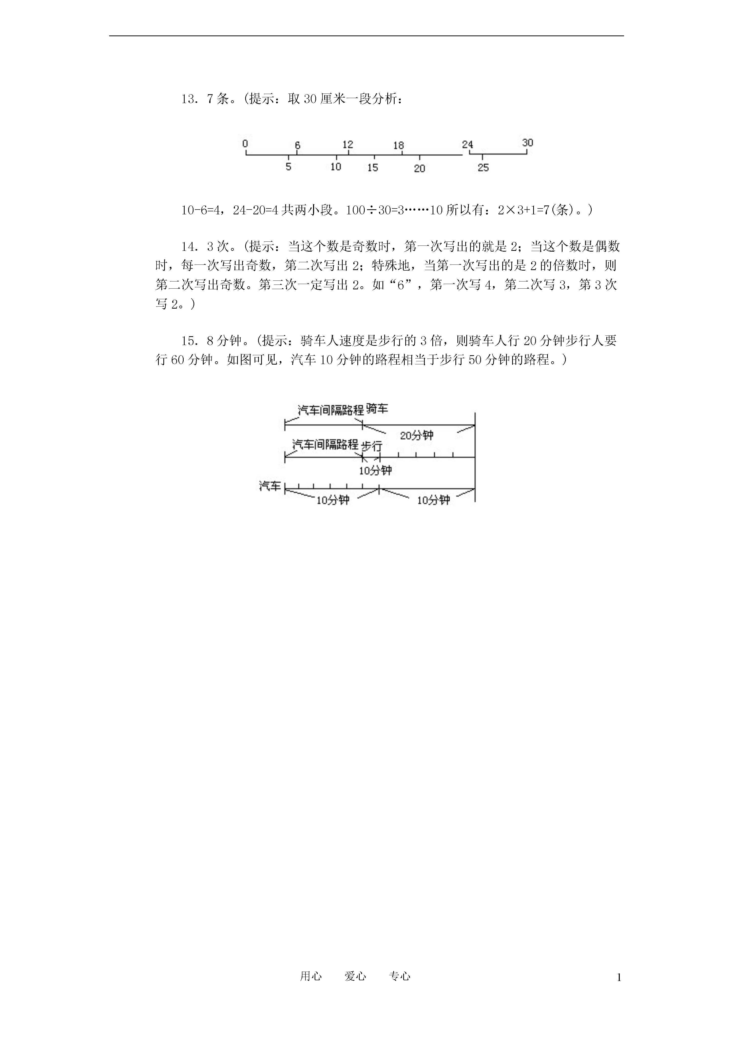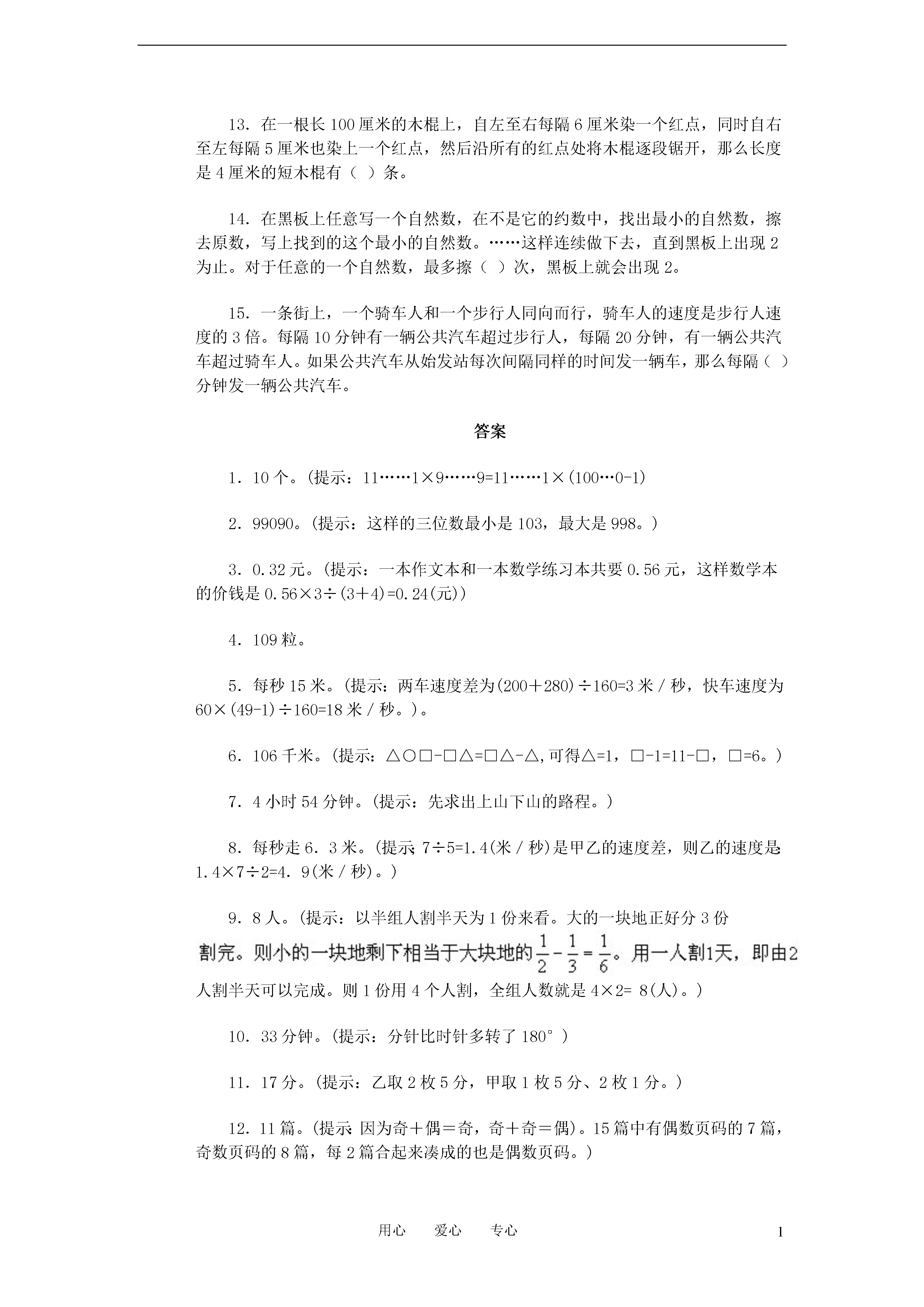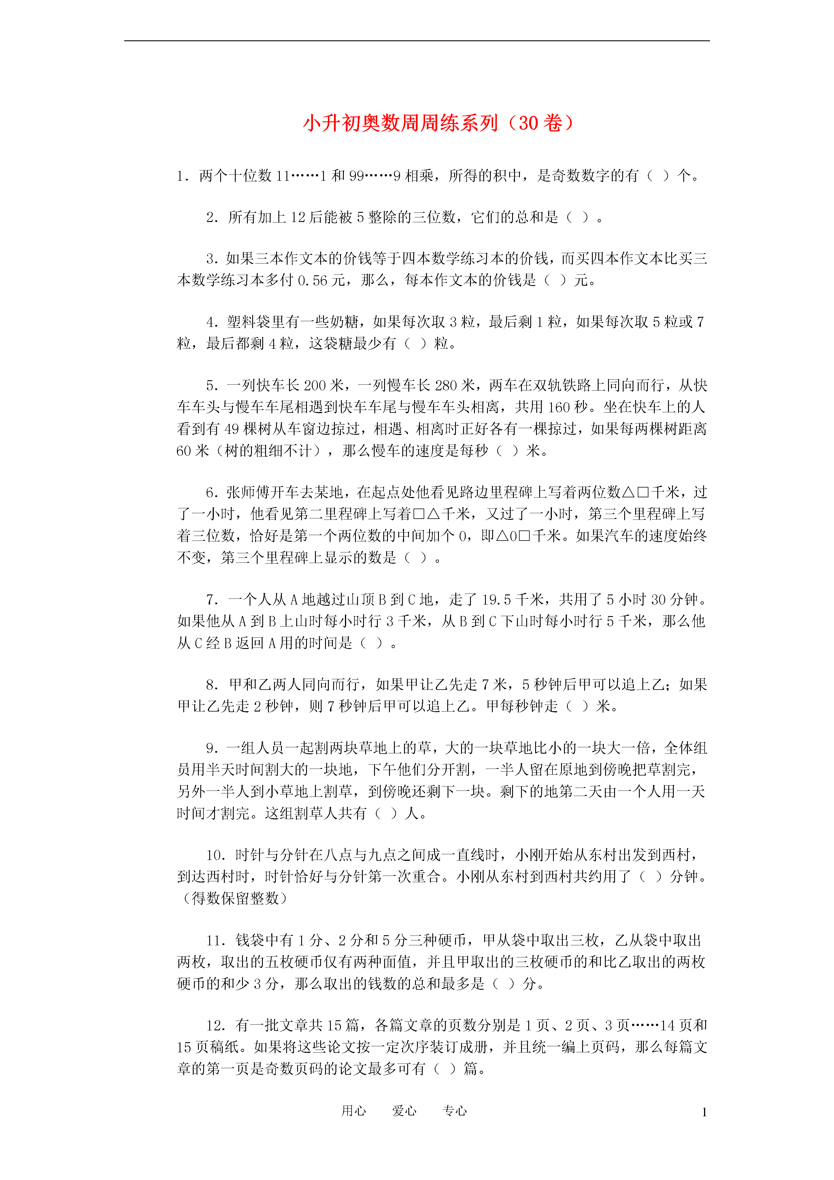 1用心爱心专心小升初奥数周周练系列(30卷)1.两个十位数11……1和99……9相乘,所得的积中,是奇数数字的有()个。2.所有加上12后能被5整除的三位数,它们的总和是()。3.如果三本作文本的价钱等于四本数学练习本的价钱,而买四本作文本比买三本数学练习本多付0.56元,那么,每本作文本的价钱是()元。4.塑料袋里有一些奶糖,如果每次取3粒,最后剩1粒,如果每次取5粒或7粒,最后都剩4粒,这袋糖最少有()粒。5.一列快车长200米,一列慢车长280米,两车在双轨铁路上同向而行,从快车车头与慢车车尾相遇到快车车尾与慢车车头相离,共用160秒。坐在快车上的人看到有49棵树从车窗边掠过,相遇、相离时正好各有一棵掠过,如果每两棵树距离60米(树的粗细不计),那么慢车的速度是每秒()米。6.张师傅开车去某地,在起点处他看见路边里程碑上写着两位数△□千米,过了一小时,他看见第二里程碑上写着□△千米,又过了一小时,第三个里程碑上写着三位数,恰好是第一个两位数的中间加个0,即△0□千米。如果汽车的速度始终不变,第三个里程碑上显示的数是()。7.一个人从A地越过山顶B到C地,走了19.5千米,共用了5小时30分钟。如果他从A到B上山时每小时行3千米,从B到C下山时每小时行5千米,那么他从C经B返回A用的时间是()。8.甲和乙两人同向而行,如果甲让乙先走7米,5秒钟后甲可以追上乙;如果甲让乙先走2秒钟,则7秒钟后甲可以追上乙。甲每秒钟走()米。9.一组人员一起割两块草地上的草,大的一块草地比小的一块大一倍,全体组员用半天时间割大的一块地,下午他们分开割,一半人留在原地到傍晚把草割完,另外一半人到小草地上割草,到傍晚还剩下一块。剩下的地第二天由一个人用一天时间才割完。这组割草人共有()人。10.时针与分针在八点与九点之间成一直线时,小刚开始从东村出发到西村,到达西村时,时针恰好与分针第一次重合。小刚从东村到西村共约用了()分钟。(得数保留整数)11.钱袋中有1分、2分和5分三种硬币,甲从袋中取出三枚,乙从袋中取出两枚,取出的五枚硬币仅有两种面值,并且甲取出的三枚硬币的和比乙取出的两枚硬币的和少3分,那么取出的钱数的总和最多是()分。12.有一批文章共15篇,各篇文章的页数分别是1页、2页、3页……14页和15页稿纸。如果将这些论文按一定次序装订成册,并且统一编上页码,那么每篇文章的第一页是奇数页码的论文最多可有()篇。13.在一根长100厘米的木棍上,自左至右每隔6厘米染一个红点,同时自右至左每隔5厘米也染上一个红点,然后沿所有的红点处将木棍逐段锯开,那么长度是4厘米的短木棍有()条。14.在黑板上任意写一个自然数,在不是它的约数中,找出最小的自然数,擦去原数,写上找到的这个最小的自然数。……这样连续做下去,直到黑板上出现2为止。对于任意的一个自然数,最多擦()次,黑板上就会出现2。15.一条街上,一个骑车人和一个步行人同向而行,骑车人的速度是步行人速度的3倍。每隔10分钟有一辆公共汽车超过步行人,每隔20分钟,有一辆公共汽车超过骑车人。如果公共汽车从始发站每次间隔同样的时间发一辆车,那么每隔()分钟发一辆公共汽车。答案1.10个。(提示:11……1×9……9=11……1×(100…0-1)2.99090。(提示:这样的三位数最小是103,最大是998。)3.0.32元。(提示:一本作文本和一本数学练习本共要0.56元,这样数学本的价钱是0.56×3÷(3+4)=0.24(元))4.109粒。5.每秒15米。(提示:两车速度差为(200+280)÷160=3米/秒,快车速度为60×(49-1)÷160=18米/秒。)。6.106千米。(提示:△○□-□△=□△-△,可得△=1,□-1=11-□,□=6。)7.4小时54分钟。(提示:先求出上山下山的路程。)8.每秒走6.3米。(提示;7÷5=1.4(米/秒)是甲乙的速度差,则乙的速度是:1.4×7÷2=4.9(米/秒)。)9.8人。(提示:以半组人割半天为1份来看。大的一块地正好分3份人割半天可以完成。则1份用4个人割,全组人数就是4×2=8(人)。)10.33分钟。(提示:分针比时针多转了180°)11.17分。(提示:乙取2枚5分,甲取1枚5分、2枚1分。)12.11篇。(提示:因为奇+偶=奇,奇+奇=偶)。15篇中有偶数页码的7篇,奇数页码的8篇,每2篇合起来凑成的也是偶数页码。)13.7条。(提示:取30厘米一段分析:10-6=4,24-20=4共两小段。100÷30=3……10所以有:2×3+1=7(条)。)14.3次。(提示:当这个数是奇数时,第一次写出的就是2;当这个数是偶数时,每一次写出奇数,第二次写出