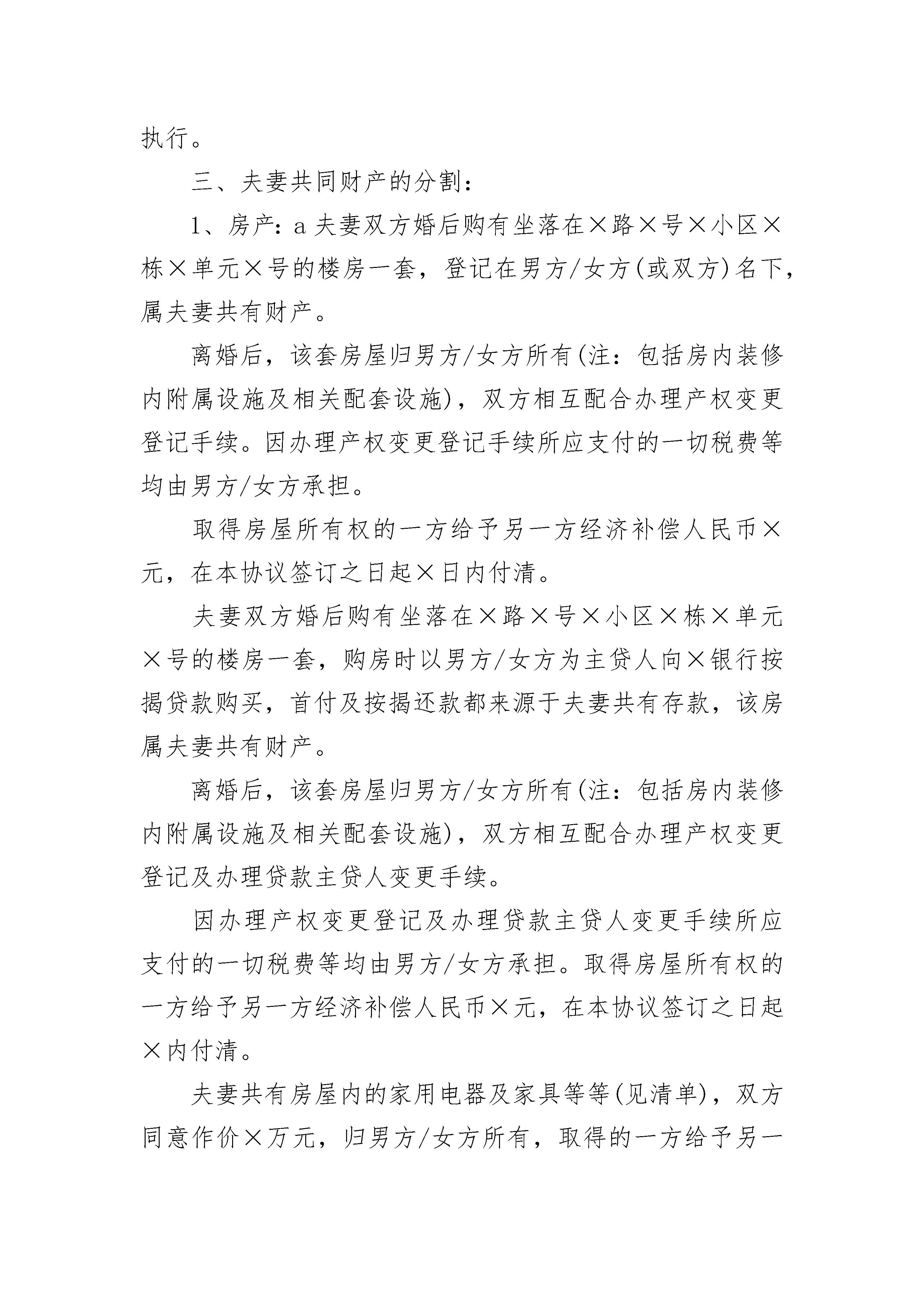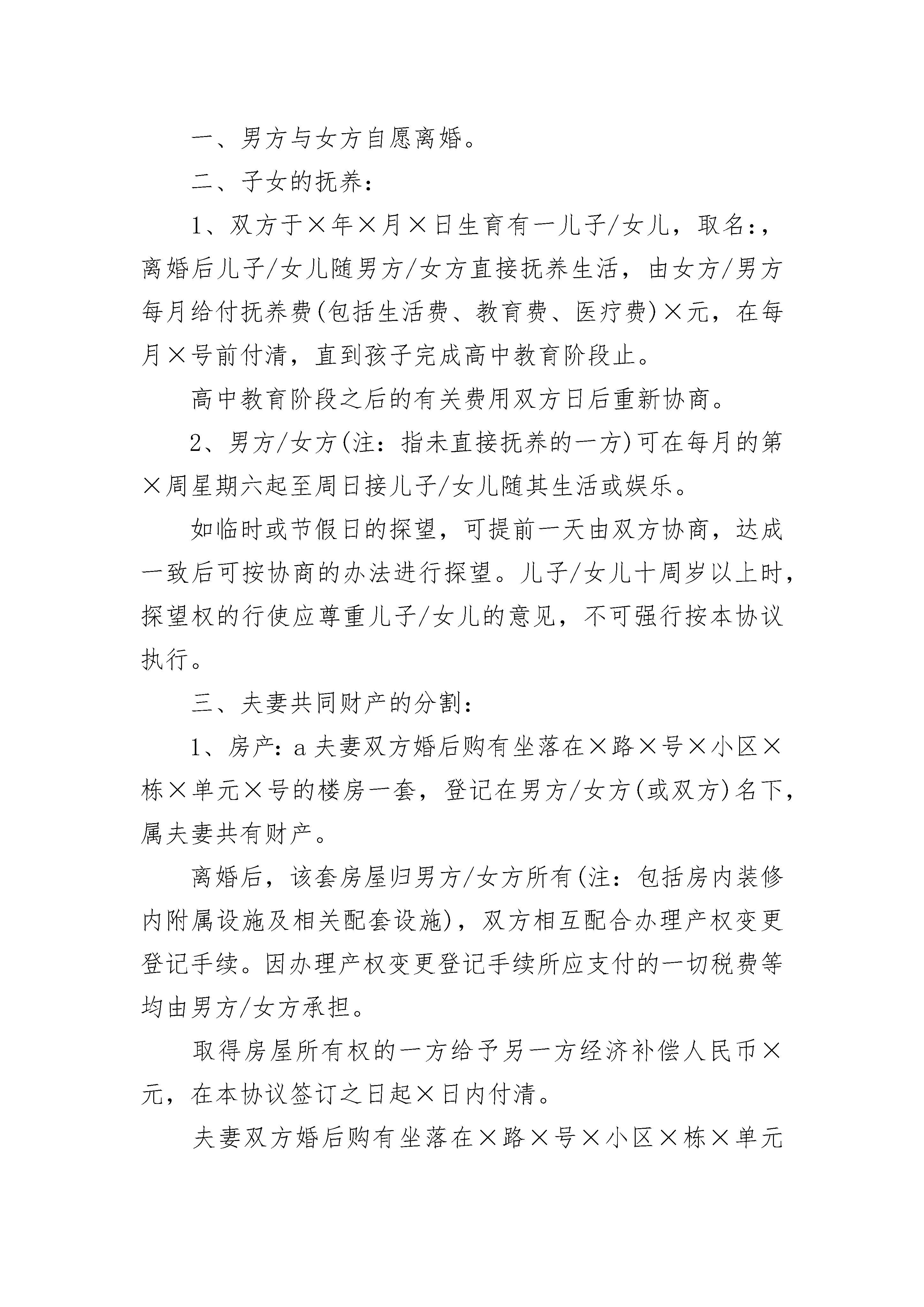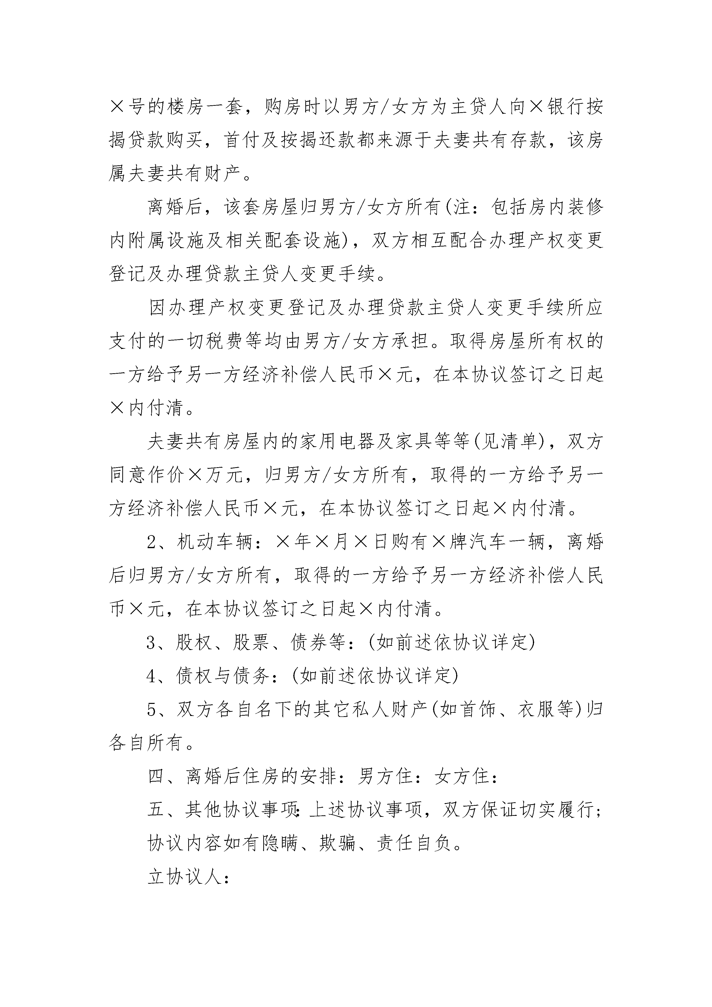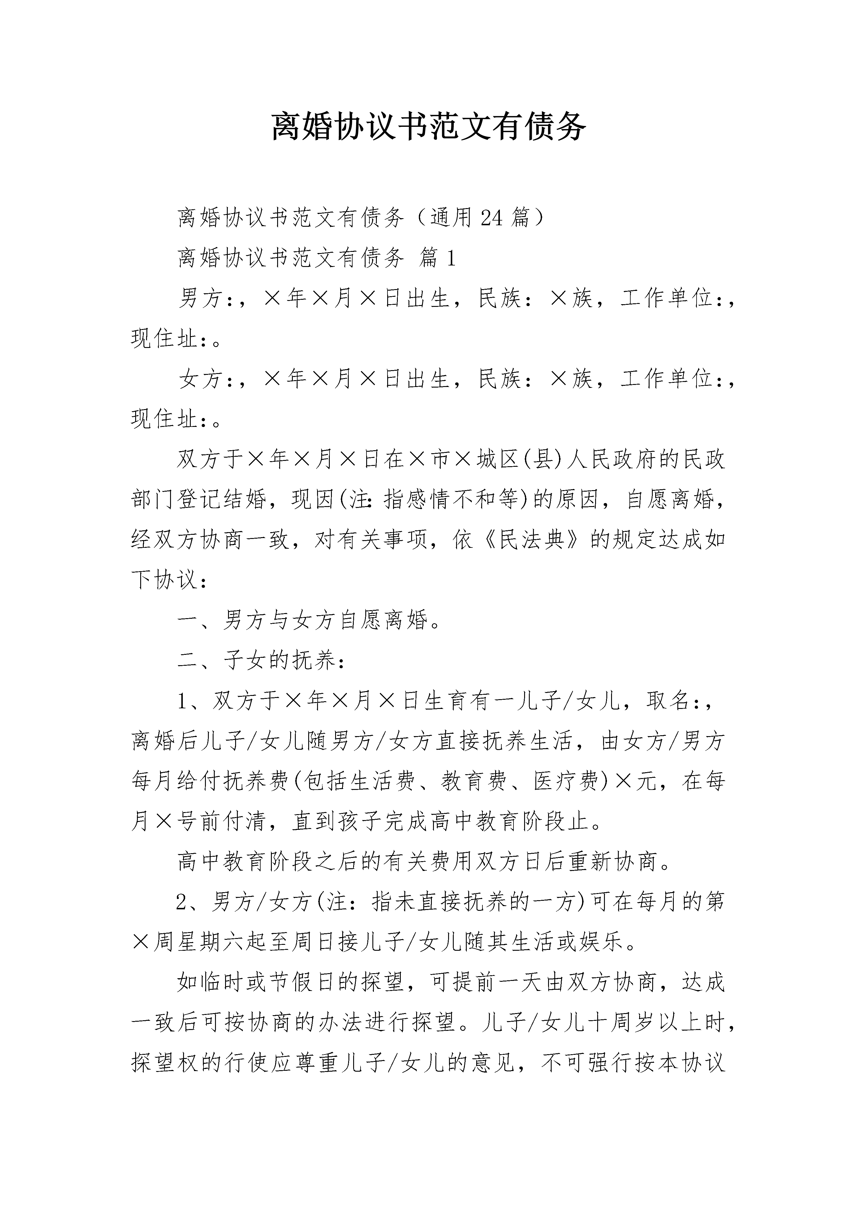离婚协议书范文有债务离婚协议书范文有债务(通用24篇)离婚协议书范文有债务篇1男方:,×年×月×日出生,民族:×族,工作单位:,现住址:。女方:,×年×月×日出生,民族:×族,工作单位:,现住址:。双方于×年×月×日在×市×城区(县)人民政府的民政部门登记结婚,现因(注:指感情不和等)的原因,自愿离婚,经双方协商一致,对有关事项,依《民法典》的规定达成如下协议:一、男方与女方自愿离婚。二、子女的抚养:1、双方于×年×月×日生育有一儿子/女儿,取名:,离婚后儿子/女儿随男方/女方直接抚养生活,由女方/男方每月给付抚养费(包括生活费、教育费、医疗费)×元,在每月×号前付清,直到孩子完成高中教育阶段止。高中教育阶段之后的有关费用双方日后重新协商。2、男方/女方(注:指未直接抚养的一方)可在每月的第×周星期六起至周日接儿子/女儿随其生活或娱乐。如临时或节假日的探望,可提前一天由双方协商,达成一致后可按协商的办法进行探望。儿子/女儿十周岁以上时,探望权的行使应尊重儿子/女儿的意见,不可强行按本协议执行。三、夫妻共同财产的分割:1、房产:a夫妻双方婚后购有坐落在×路×号×小区×栋×单元×号的楼房一套,登记在男方/女方(或双方)名下,属夫妻共有财产。离婚后,该套房屋归男方/女方所有(注:包括房内装修内附属设施及相关配套设施),双方相互配合办理产权变更登记手续。因办理产权变更登记手续所应支付的一切税费等均由男方/女方承担。取得房屋所有权的一方给予另一方经济补偿人民币×元,在本协议签订之日起×日内付清。夫妻双方婚后购有坐落在×路×号×小区×栋×单元×号的楼房一套,购房时以男方/女方为主贷人向×银行按揭贷款购买,首付及按揭还款都来源于夫妻共有存款,该房属夫妻共有财产。离婚后,该套房屋归男方/女方所有(注:包括房内装修内附属设施及相关配套设施),双方相互配合办理产权变更登记及办理贷款主贷人变更手续。因办理产权变更登记及办理贷款主贷人变更手续所应支付的一切税费等均由男方/女方承担。取得房屋所有权的一方给予另一方经济补偿人民币×元,在本协议签订之日起×内付清。夫妻共有房屋内的家用电器及家具等等(见清单),双方同意作价×万元,归男方/女方所有,取得的一方给予另一方经济补偿人民币×元,在本协议签订之日起×内付清。2、机动车辆:×年×月×日购有×牌汽车一辆,离婚后归男方/女方所有,取得的一方给予另一方经济补偿人民币×元,在本协议签订之日起×内付清。3、股权、股票、债券等:(如前述依协议详定)4、债权与债务:(如前述依协议详定)5、双方各自名下的其它私人财产(如首饰、衣服等)归各自所有。四、离婚后住房的安排:男方住:女方住:五、其他协议事项:上述协议事项,双方保证切实履行;协议内容如有隐瞒、欺骗、责任自负。立协议人:男方:(签章)女方:(签章)离婚协议书范文有债务篇2范文一男方:,×年×月×日出生,民族:×族,工作单位:,现住址:。女方:,×年×月×日出生,民族:×族,工作单位:,现住址:。双方于×年×月×日在×市×城区(县)人民政府的民政部门登记结婚,现因(注:指感情不和等)的原因,自愿离婚,经双方协商一致,对有关事项,依《民法典》的规定达成如下协议:一、男方与女方自愿离婚。二、子女的抚养:1、双方于×年×月×日生育有一儿子/女儿,取名:,离婚后儿子/女儿随男方/女方直接抚养生活,由女方/男方每月给付抚养费(包括生活费、教育费、医疗费)×元,在每月×号前付清,直到孩子完成高中教育阶段止。高中教育阶段之后的有关费用双方日后重新协商。2、男方/女方(注:指未直接抚养的一方)可在每月的第×周星期六起至周日接儿子/女儿随其生活或娱乐。如临时或节假日的探望,可提前一天由双方协商,达成一致后可按协商的办法进行探望。儿子/女儿十周岁以上时,探望权的行使应尊重儿子/女儿的意见,不可强行按本协议执行。三、夫妻共同财产的分割:1、房产:a夫妻双方婚后购有坐落在×路×号×小区×栋×单元×号的楼房一套,登记在男方/女方(或双方)名下,属夫妻共有财产。离婚后,该套房屋归男方/女方所有(注:包括房内装修内附属设施及相关配套设施),双方相互配合办理产权变更登记手续。因办理产权变更登记手续所应支付的一切税费等均由男方/女方承担。取得房屋所有权的一方给予另一方经济补偿人民币×元,在本协议签订之日起×日内付清。夫妻双方婚后购有坐落在×路×号×小区×栋×单元×号的楼房一套,购房时以男方/女方为主贷人向×银行按揭贷款购买,首付及按揭还款都来源于夫妻共有存款,该房属夫妻共有财产。离婚后,该套房屋归男方/女方所有(注:包括房内装修内附属设施及相关配套设施),双方相互配合办理产权变更登记及办理贷款主贷人变更手续。因办理产权变更登记及办理贷款主贷人变更手续所应支付的一切税费等均由男方/女方承担。取得房