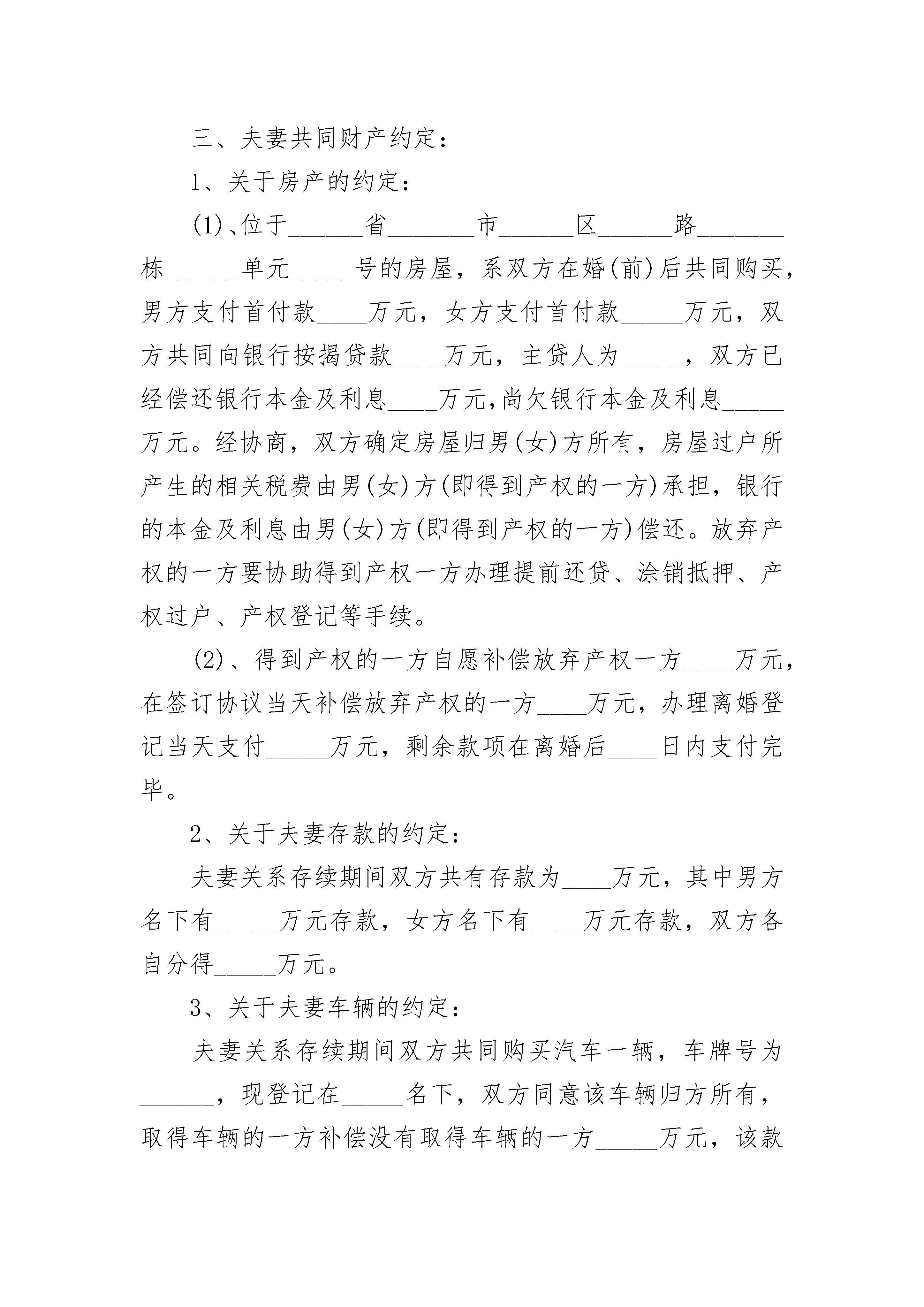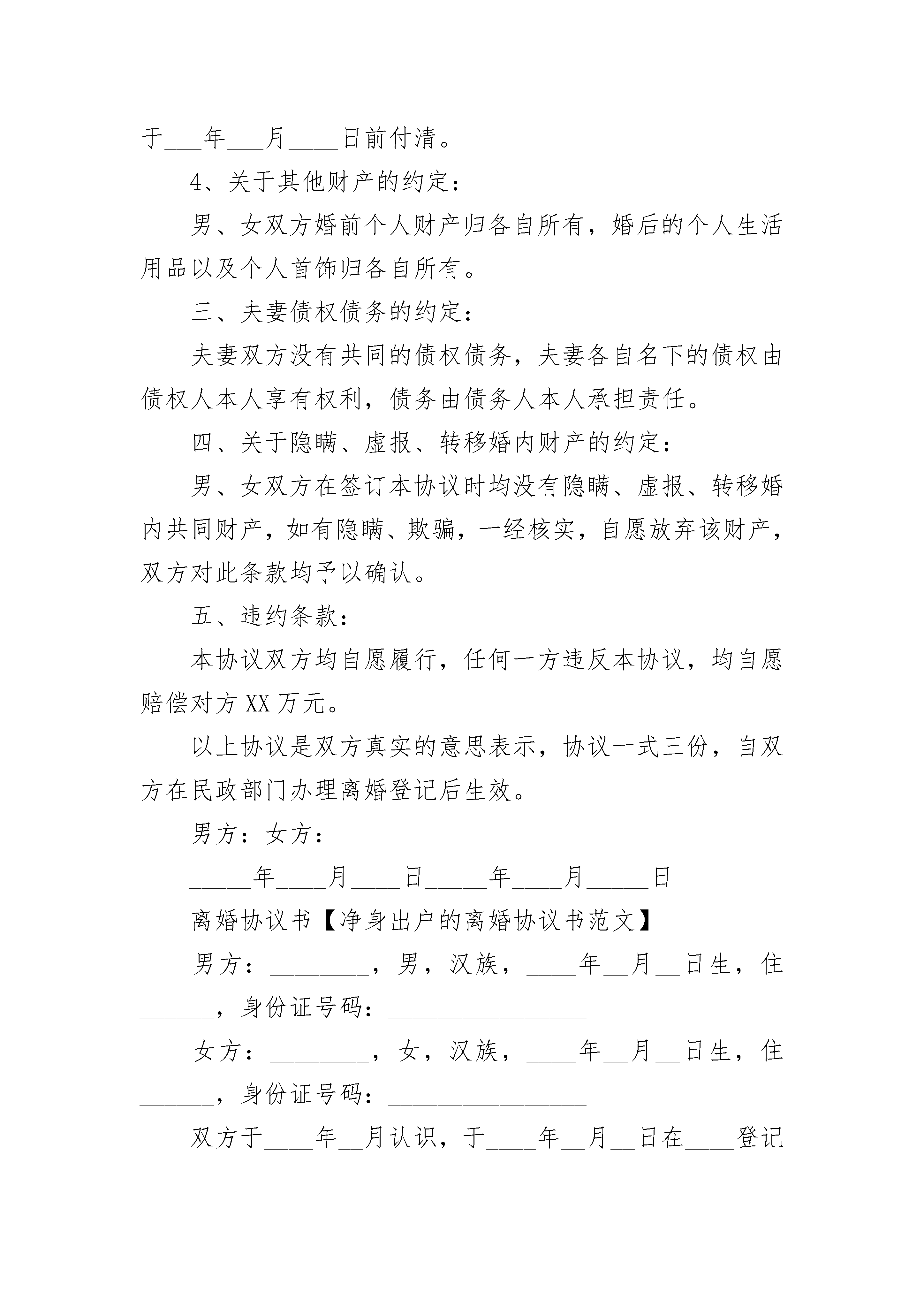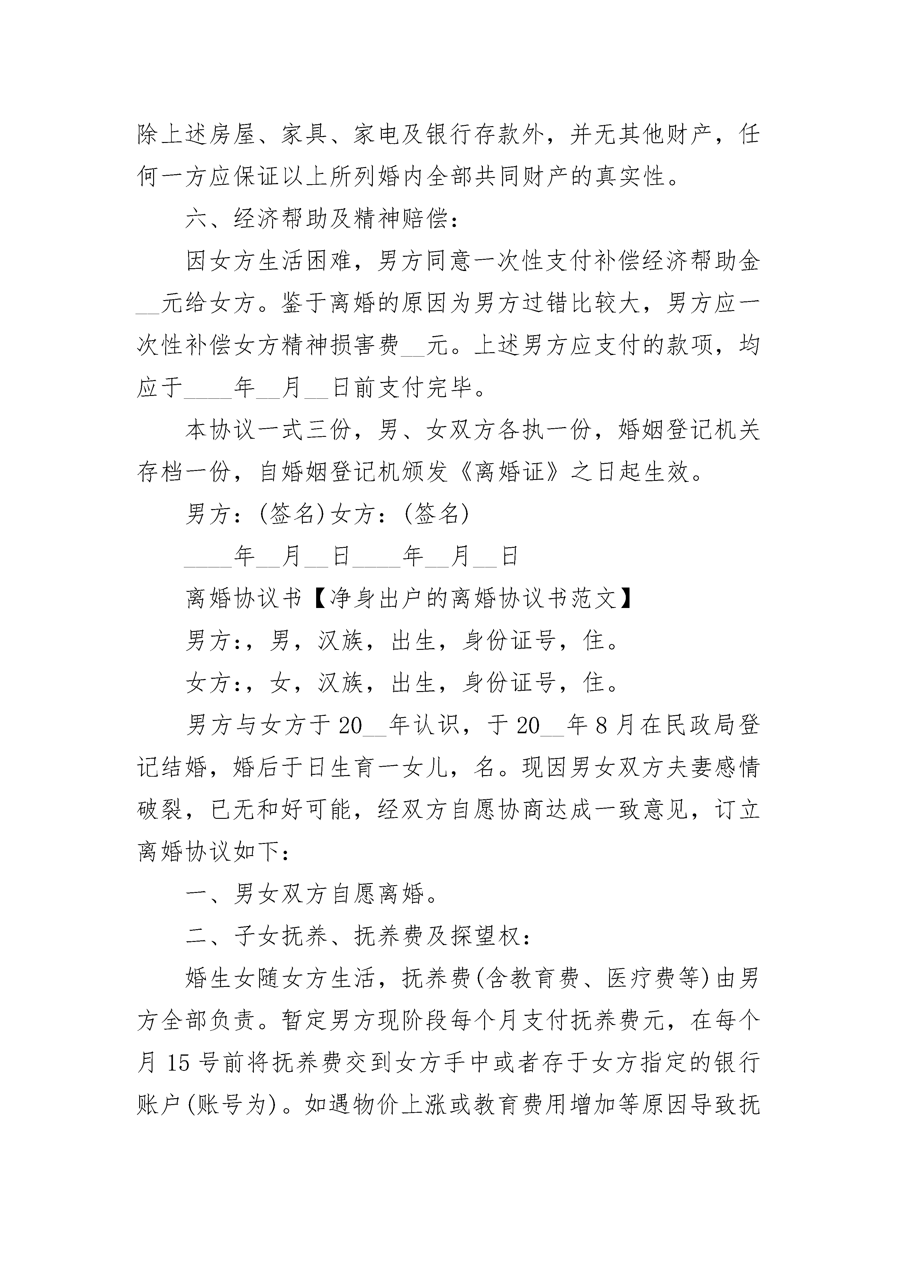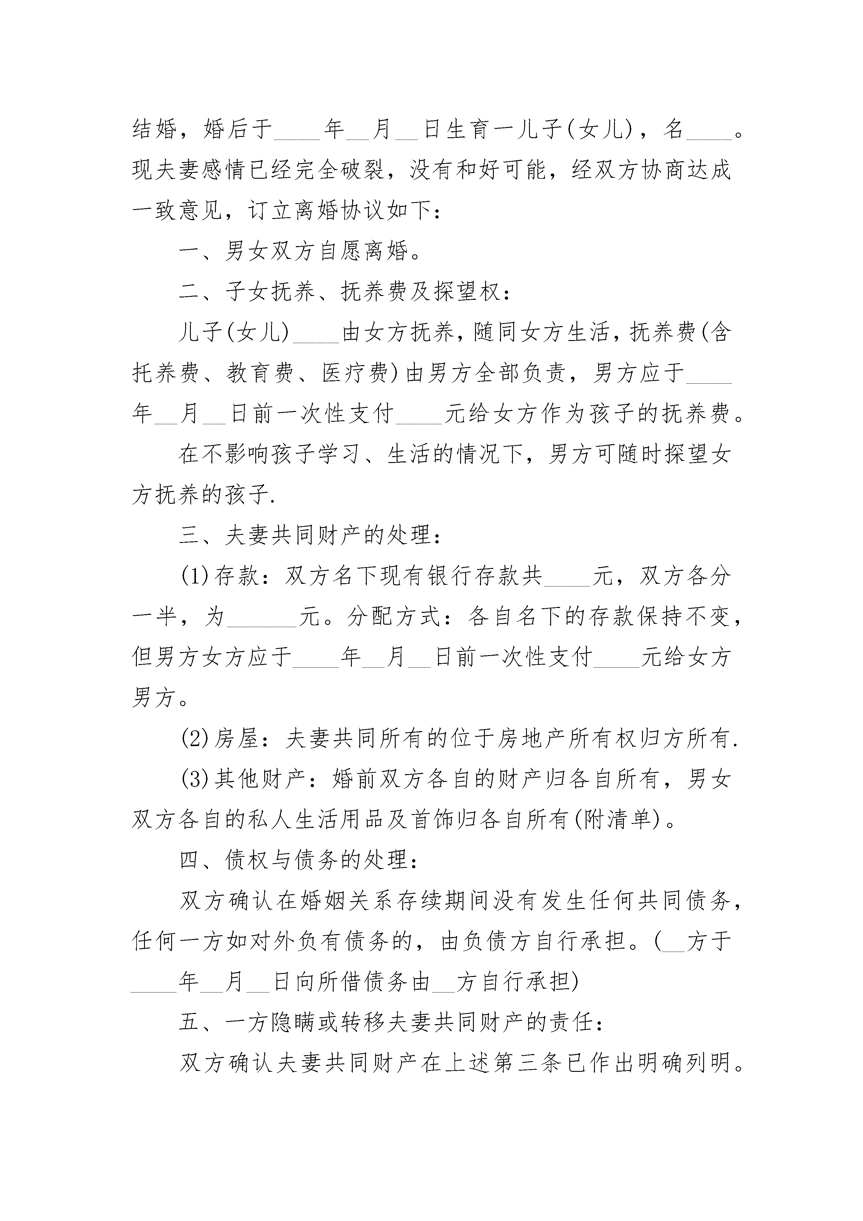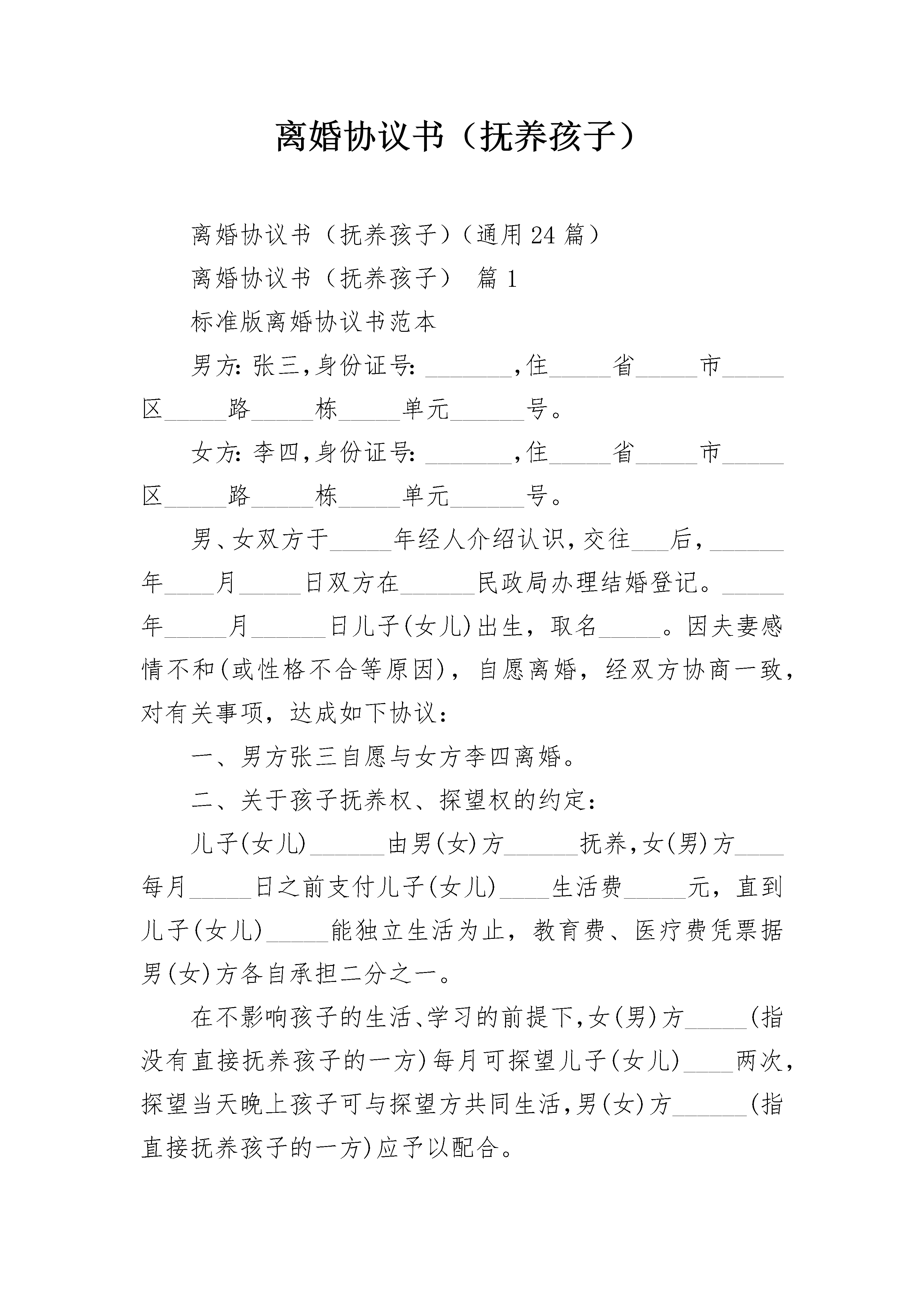 离婚协议书(抚养孩子)离婚协议书(抚养孩子)(通用24篇)离婚协议书(抚养孩子)篇1标准版离婚协议书范本男方:张三,身份证号:_______,住_____省_____市_____区_____路_____栋_____单元______号。女方:李四,身份证号:_______,住_____省_____市_____区_____路_____栋_____单元______号。男、女双方于_____年经人介绍认识,交往___后,______年____月_____日双方在______民政局办理结婚登记。_____年_____月______日儿子(女儿)出生,取名_____。因夫妻感情不和(或性格不合等原因),自愿离婚,经双方协商一致,对有关事项,达成如下协议:一、男方张三自愿与女方李四离婚。二、关于孩子抚养权、探望权的约定:儿子(女儿)______由男(女)方______抚养,女(男)方____每月_____日之前支付儿子(女儿)____生活费_____元,直到儿子(女儿)_____能独立生活为止,教育费、医疗费凭票据男(女)方各自承担二分之一。在不影响孩子的生活、学习的前提下,女(男)方_____(指没有直接抚养孩子的一方)每月可探望儿子(女儿)____两次,探望当天晚上孩子可与探望方共同生活,男(女)方______(指直接抚养孩子的一方)应予以配合。三、夫妻共同财产约定:1、关于房产的约定:(1)、位于______省_______市______区______路_______栋______单元_____号的房屋,系双方在婚(前)后共同购买,男方支付首付款____万元,女方支付首付款_____万元,双方共同向银行按揭贷款____万元,主贷人为_____,双方已经偿还银行本金及利息____万元,尚欠银行本金及利息_____万元。经协商,双方确定房屋归男(女)方所有,房屋过户所产生的相关税费由男(女)方(即得到产权的一方)承担,银行的本金及利息由男(女)方(即得到产权的一方)偿还。放弃产权的一方要协助得到产权一方办理提前还贷、涂销抵押、产权过户、产权登记等手续。(2)、得到产权的一方自愿补偿放弃产权一方____万元,在签订协议当天补偿放弃产权的一方____万元,办理离婚登记当天支付_____万元,剩余款项在离婚后____日内支付完毕。2、关于夫妻存款的约定:夫妻关系存续期间双方共有存款为____万元,其中男方名下有_____万元存款,女方名下有____万元存款,双方各自分得_____万元。3、关于夫妻车辆的约定:夫妻关系存续期间双方共同购买汽车一辆,车牌号为______,现登记在_____名下,双方同意该车辆归方所有,取得车辆的一方补偿没有取得车辆的一方_____万元,该款于___年___月____日前付清。4、关于其他财产的约定:男、女双方婚前个人财产归各自所有,婚后的个人生活用品以及个人首饰归各自所有。三、夫妻债权债务的约定:夫妻双方没有共同的债权债务,夫妻各自名下的债权由债权人本人享有权利,债务由债务人本人承担责任。四、关于隐瞒、虚报、转移婚内财产的约定:男、女双方在签订本协议时均没有隐瞒、虚报、转移婚内共同财产,如有隐瞒、欺骗,一经核实,自愿放弃该财产,双方对此条款均予以确认。五、违约条款:本协议双方均自愿履行,任何一方违反本协议,均自愿赔偿对方XX万元。以上协议是双方真实的意思表示,协议一式三份,自双方在民政部门办理离婚登记后生效。男方:女方:_____年____月____日_____年____月_____日离婚协议书【净身出户的离婚协议书范文】男方:________,男,汉族,____年__月__日生,住______,身份证号码:________________女方:________,女,汉族,____年__月__日生,住______,身份证号码:________________双方于____年__月认识,于____年__月__日在____登记结婚,婚后于____年__月__日生育一儿子(女儿),名____。现夫妻感情已经完全破裂,没有和好可能,经双方协商达成一致意见,订立离婚协议如下:一、男女双方自愿离婚。二、子女抚养、抚养费及探望权:儿子(女儿)____由女方抚养,随同女方生活,抚养费(含托养费、教育费、医疗费)由男方全部负责,男方应于____年__月__日前一次性支付____元给女方作为孩子的抚养费。在不影响孩子学习、生活的情况下,男方可随时探望女方抚养的孩子.三、夫妻共同财产的处理:(1)存款:双方名下现有银行存款共____元,双方各分一半,为______元。分配方式:各自名下的存款保持不变,但男方女方应于____年__月__日前一次性支付____元给女方男方。(2)房屋:夫妻共同所有的位于房地产所有权归方所有.(3)其他财