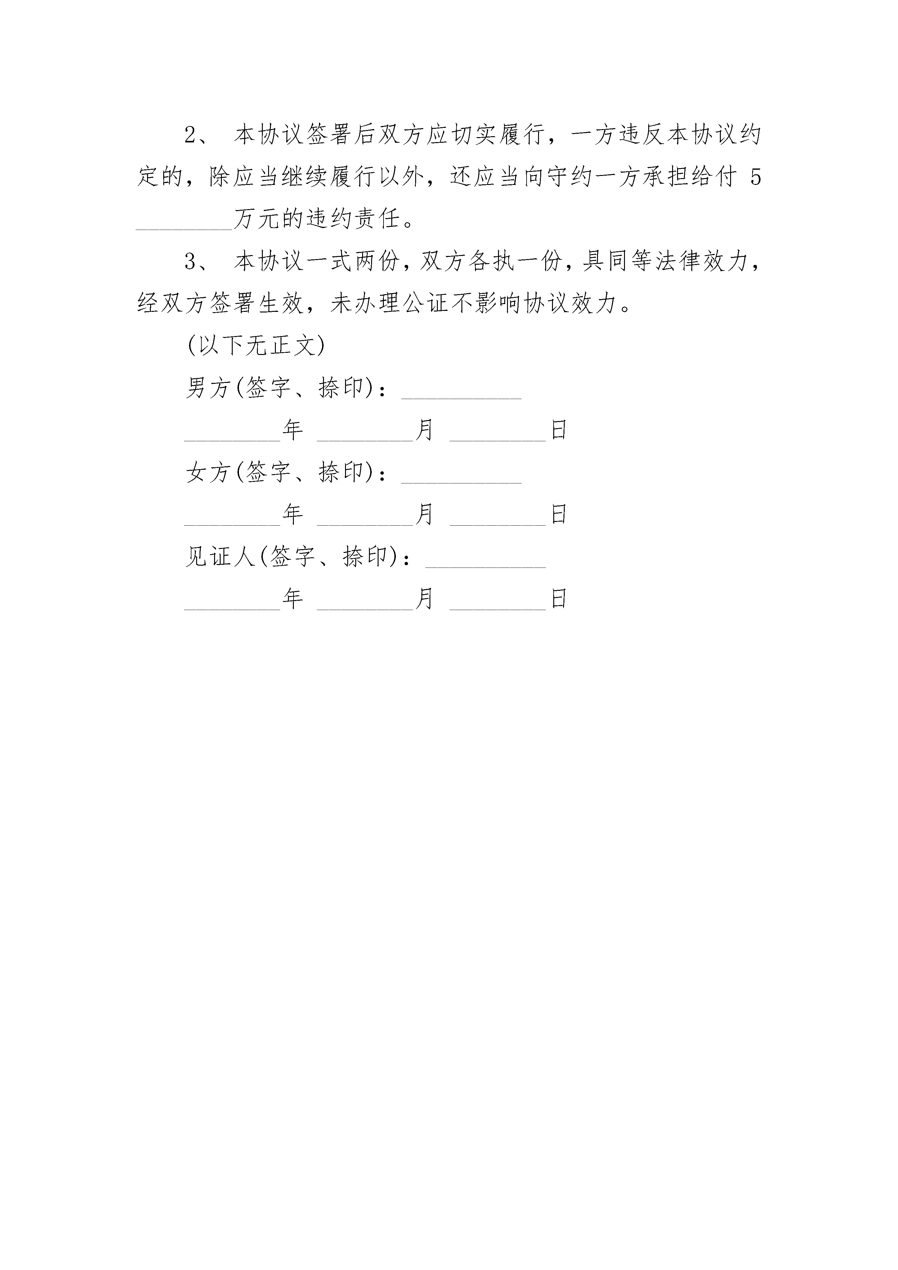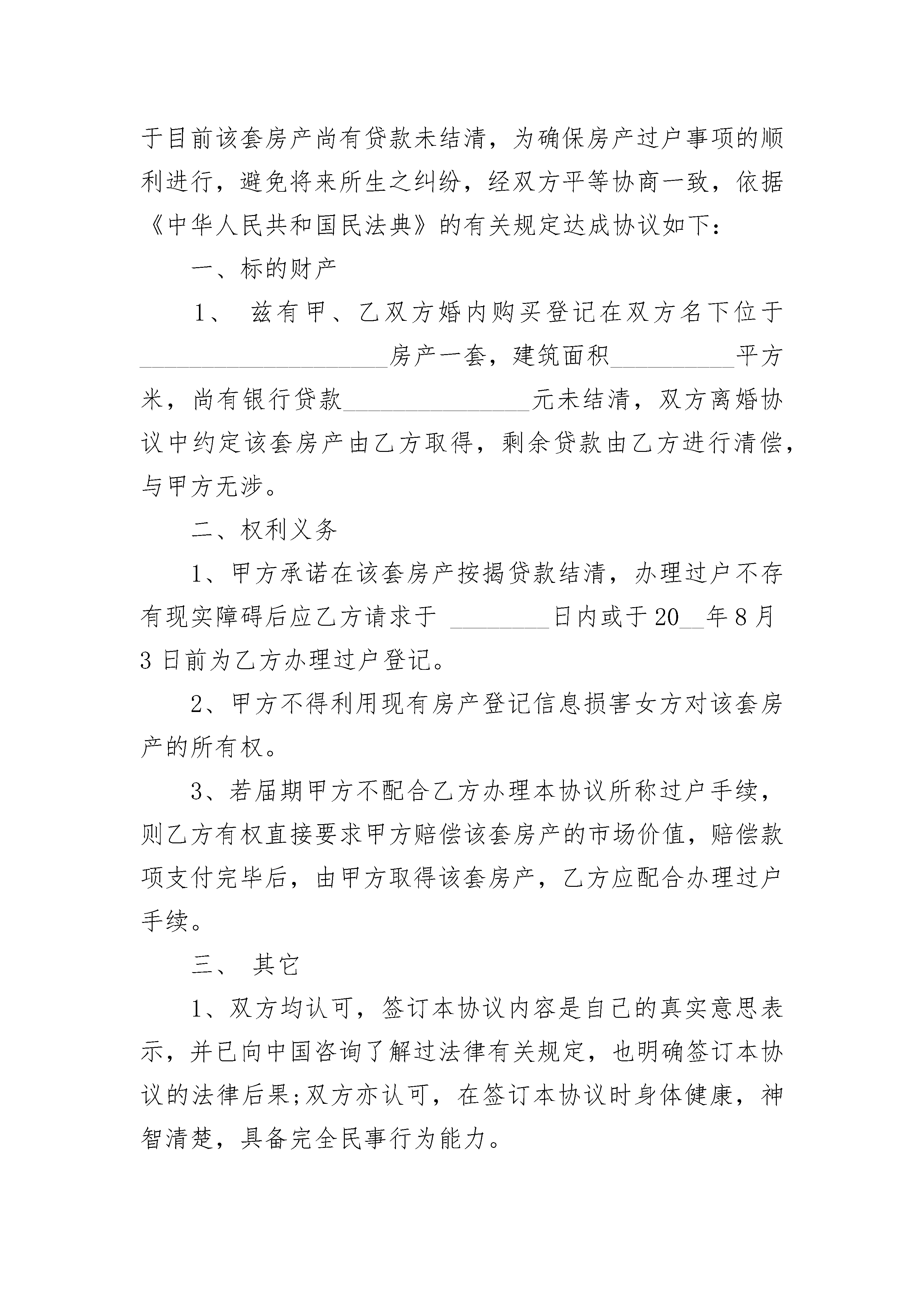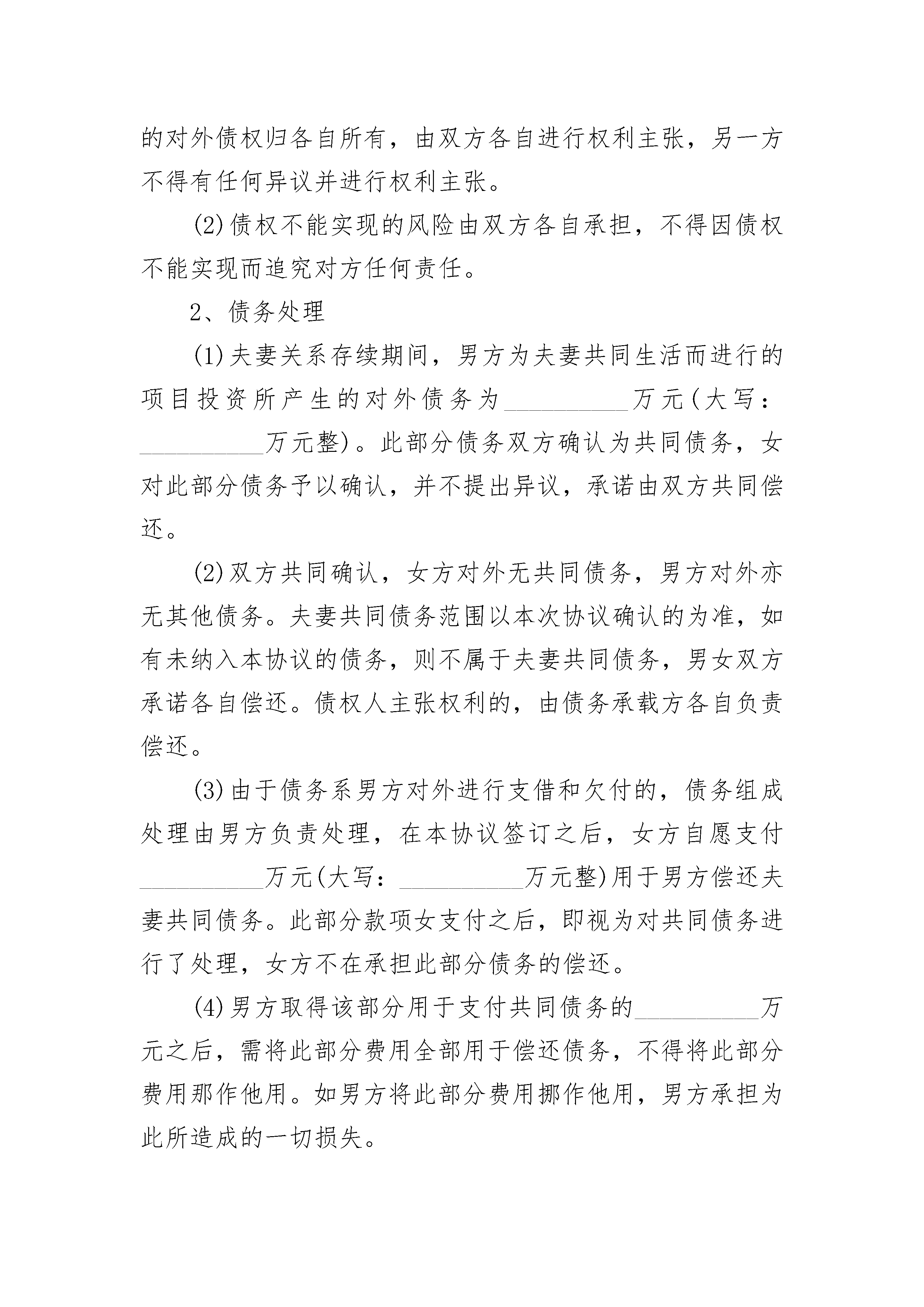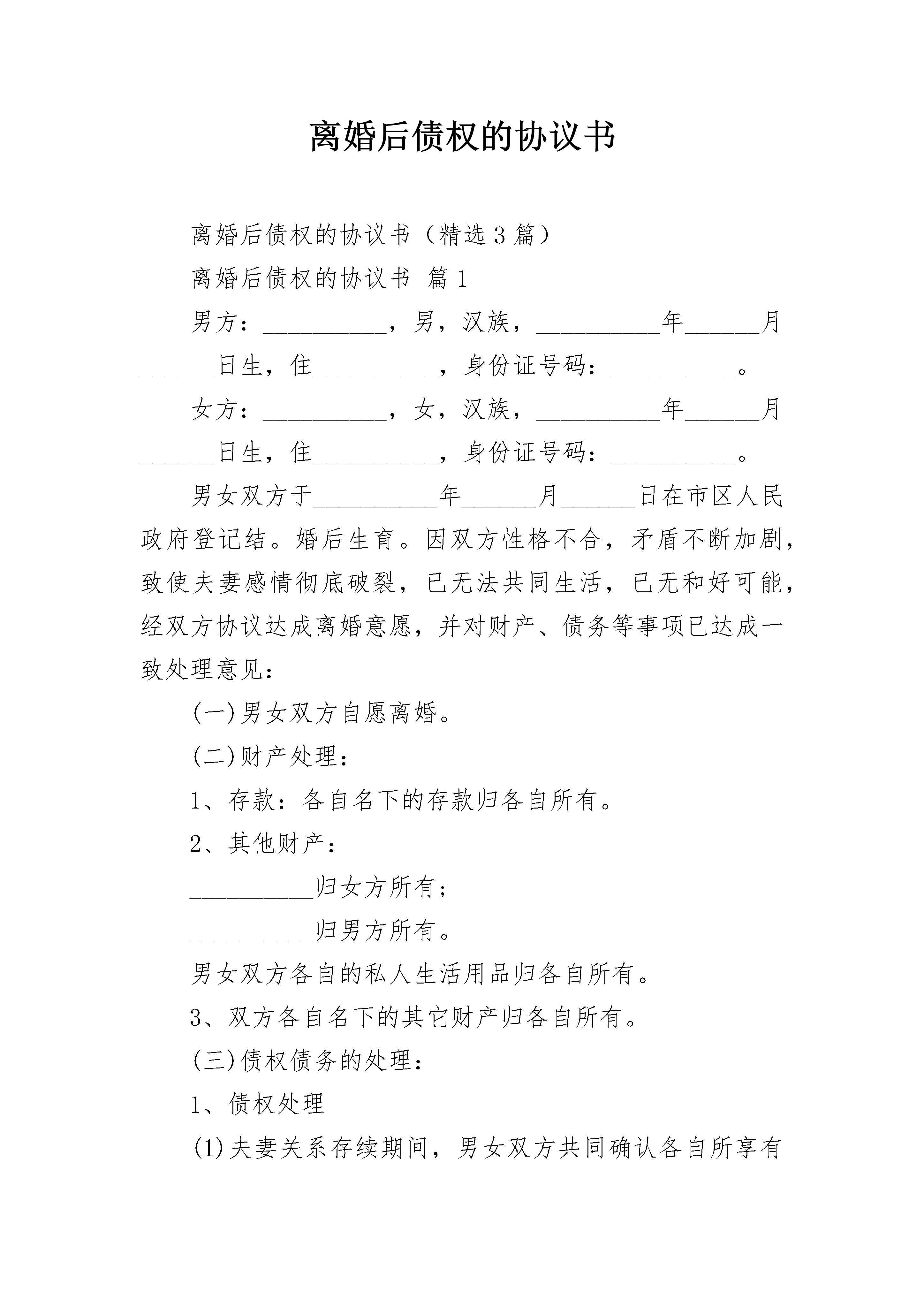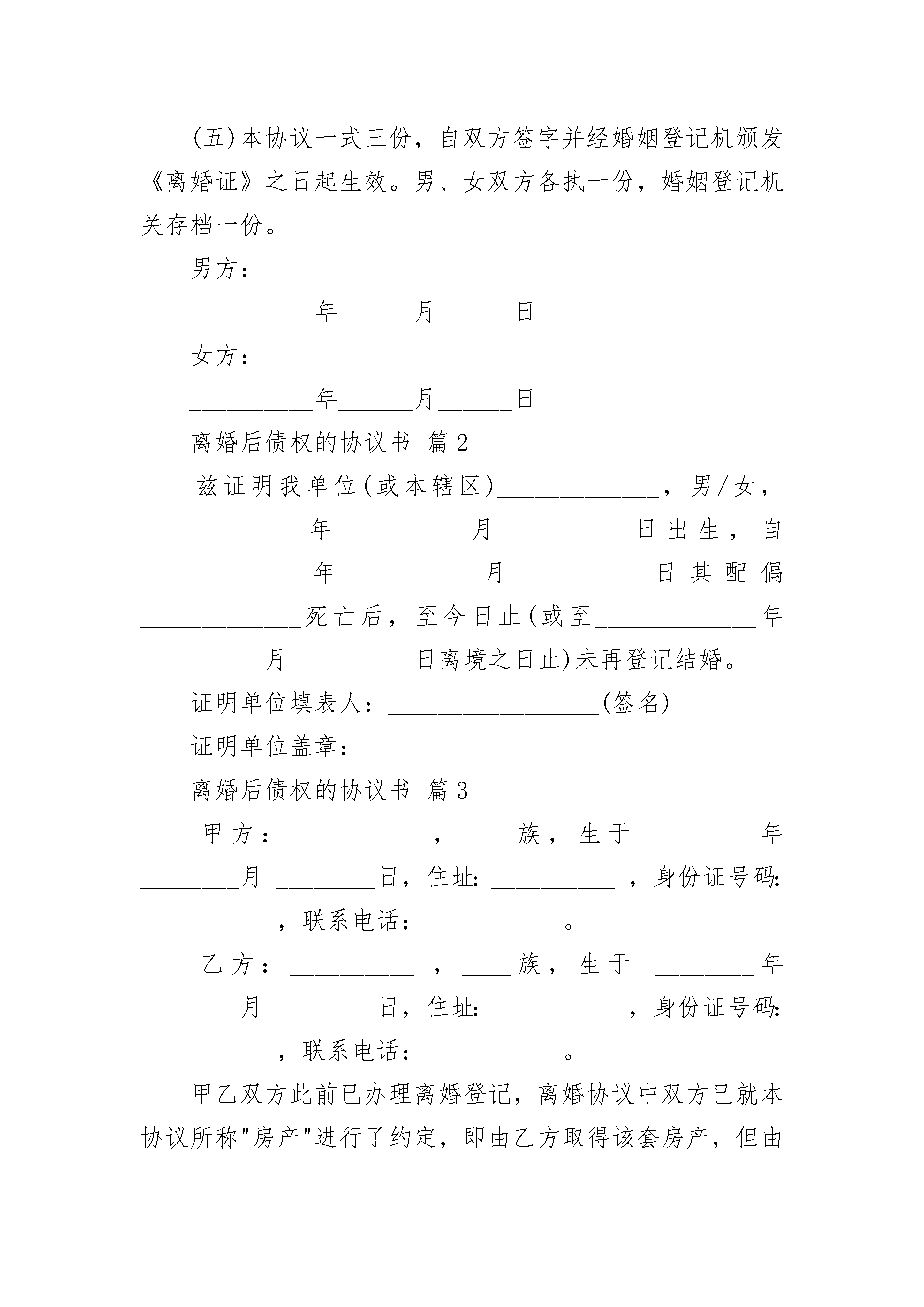 离婚后债权的协议书离婚后债权的协议书(精选3篇)离婚后债权的协议书篇1男方:__________,男,汉族,__________年______月______日生,住__________,身份证号码:__________。女方:__________,女,汉族,__________年______月______日生,住__________,身份证号码:__________。男女双方于__________年______月______日在市区人民政府登记结。婚后生育。因双方性格不合,矛盾不断加剧,致使夫妻感情彻底破裂,已无法共同生活,已无和好可能,经双方协议达成离婚意愿,并对财产、债务等事项已达成一致处理意见:(一)男女双方自愿离婚。(二)财产处理:1、存款:各自名下的存款归各自所有。2、其他财产:__________归女方所有;__________归男方所有。男女双方各自的私人生活用品归各自所有。3、双方各自名下的其它财产归各自所有。(三)债权债务的处理:1、债权处理(1)夫妻关系存续期间,男女双方共同确认各自所享有的对外债权归各自所有,由双方各自进行权利主张,另一方不得有任何异议并进行权利主张。(2)债权不能实现的风险由双方各自承担,不得因债权不能实现而追究对方任何责任。2、债务处理(1)夫妻关系存续期间,男方为夫妻共同生活而进行的项目投资所产生的对外债务为__________万元(大写:__________万元整)。此部分债务双方确认为共同债务,女对此部分债务予以确认,并不提出异议,承诺由双方共同偿还。(2)双方共同确认,女方对外无共同债务,男方对外亦无其他债务。夫妻共同债务范围以本次协议确认的为准,如有未纳入本协议的债务,则不属于夫妻共同债务,男女双方承诺各自偿还。债权人主张权利的,由债务承载方各自负责偿还。(3)由于债务系男方对外进行支借和欠付的,债务组成处理由男方负责处理,在本协议签订之后,女方自愿支付__________万元(大写:__________万元整)用于男方偿还夫妻共同债务。此部分款项女支付之后,即视为对共同债务进行了处理,女方不在承担此部分债务的偿还。(4)男方取得该部分用于支付共同债务的__________万元之后,需将此部分费用全部用于偿还债务,不得将此部分费用那作他用。如男方将此部分费用挪作他用,男方承担为此所造成的一切损失。(五)本协议一式三份,自双方签字并经婚姻登记机颁发《离婚证》之日起生效。男、女双方各执一份,婚姻登记机关存档一份。男方:__________________________年______月______日女方:__________________________年______月______日离婚后债权的协议书篇2兹证明我单位(或本辖区)_____________,男/女,_____________年__________月__________日出生,自_____________年__________月__________日其配偶_____________死亡后,至今日止(或至_____________年__________月__________日离境之日止)未再登记结婚。证明单位填表人:_________________(签名)证明单位盖章:_________________离婚后债权的协议书篇3甲方:__________,____族,生于________年________月________日,住址:__________,身份证号码:__________,联系电话:__________。乙方:__________,____族,生于________年________月________日,住址:__________,身份证号码:__________,联系电话:__________。甲乙双方此前已办理离婚登记,离婚协议中双方已就本协议所称"房产"进行了约定,即由乙方取得该套房产,但由于目前该套房产尚有贷款未结清,为确保房产过户事项的顺利进行,避免将来所生之纠纷,经双方平等协商一致,依据《中华人民共和国民法典》的有关规定达成协议如下:一、标的财产1、兹有甲、乙双方婚内购买登记在双方名下位于____________________房产一套,建筑面积__________平方米,尚有银行贷款_______________元未结清,双方离婚协议中约定该套房产由乙方取得,剩余贷款由乙方进行清偿,与甲方无涉。二、权利义务1、甲方承诺在该套房产按揭贷款结清,办理过户不存有现实障碍后应乙方请求于________日内或于20__年8月3日前为乙方办理过户登记。2、甲方不得利用现有房产登记信息损害女方对该套房产的所有权。3、若届期甲方不配合乙方办理本协议所称过户手续,则乙方有权直接要求甲方赔偿该套房产的市场价值