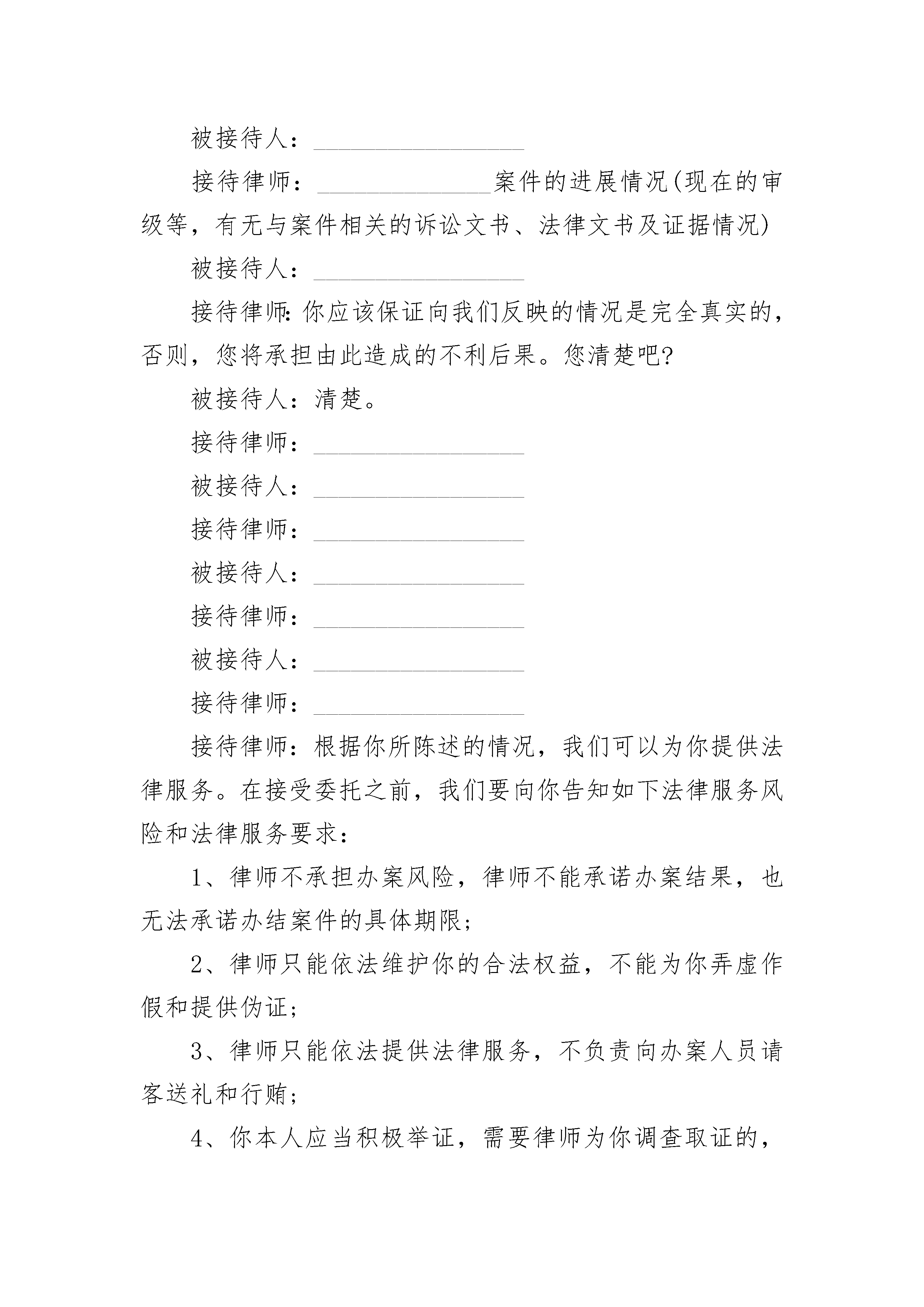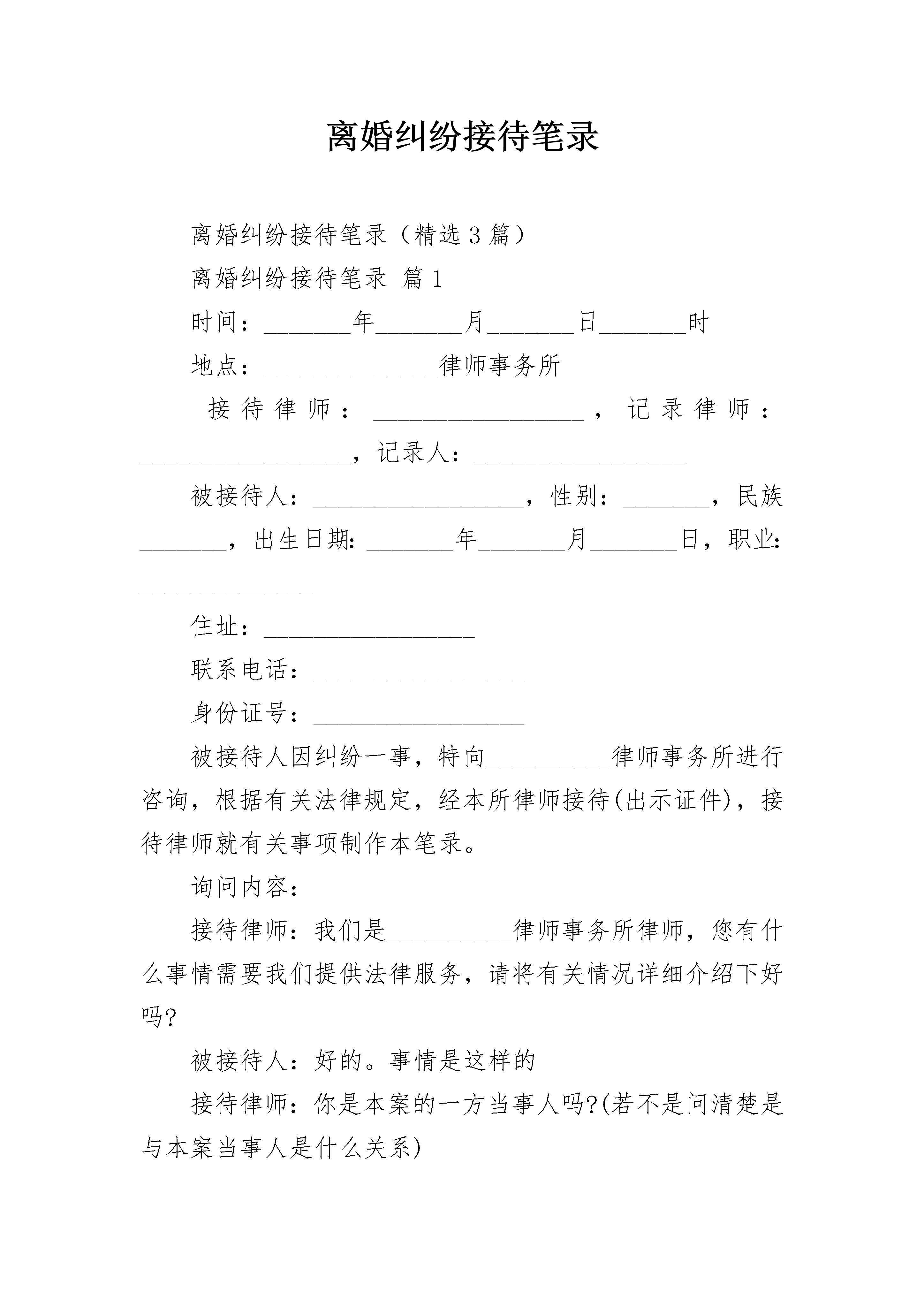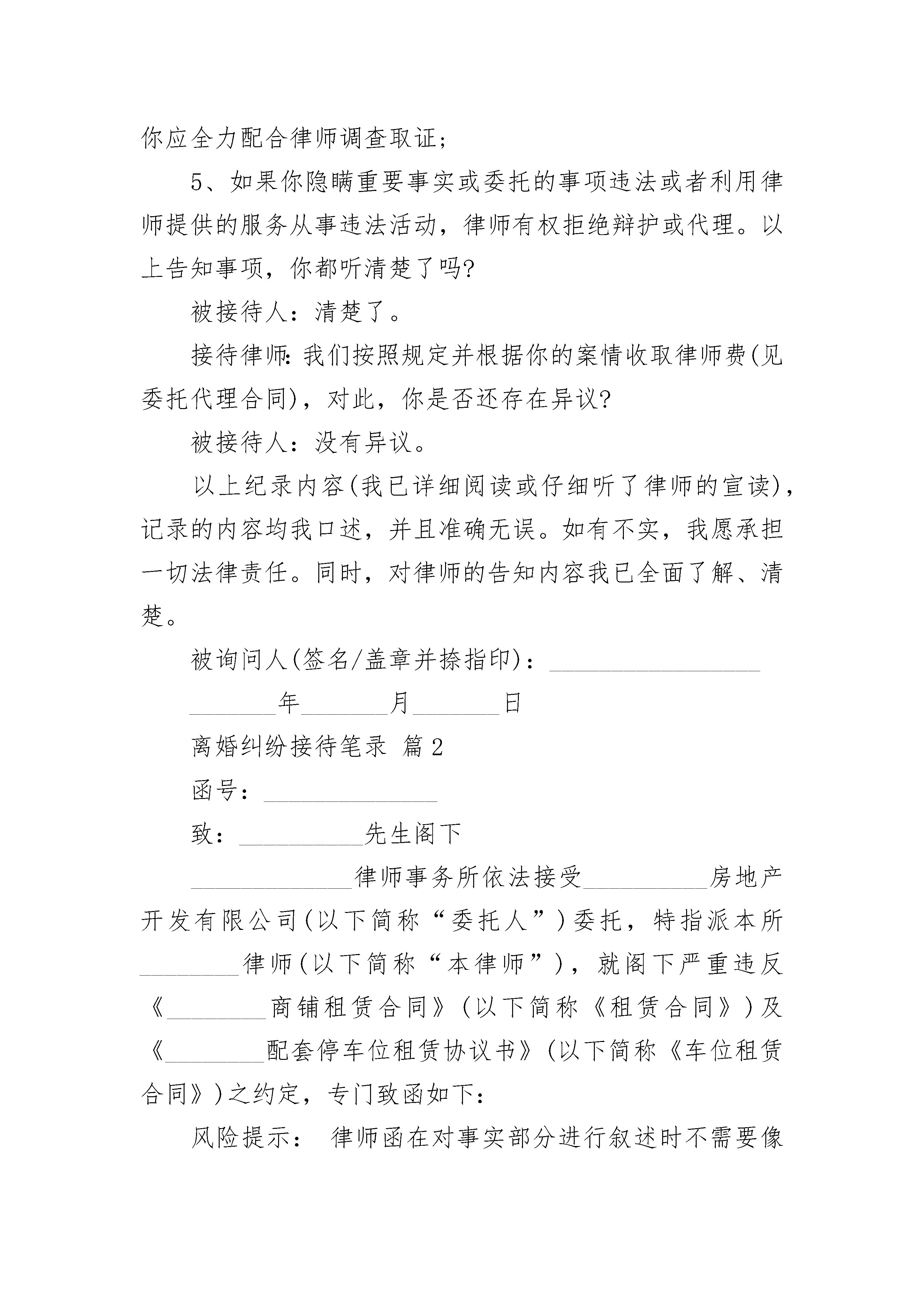 离婚纠纷接待笔录离婚纠纷接待笔录(精选3篇)离婚纠纷接待笔录篇1时间:_______年_______月_______日_______时地点:______________律师事务所接待律师:_________________,记录律师:_________________,记录人:_________________被接待人:_________________,性别:_______,民族_______,出生日期:_______年_______月_______日,职业:______________住址:_________________联系电话:_________________身份证号:_________________被接待人因纠纷一事,特向__________律师事务所进行咨询,根据有关法律规定,经本所律师接待(出示证件),接待律师就有关事项制作本笔录。询问内容:接待律师:我们是__________律师事务所律师,您有什么事情需要我们提供法律服务,请将有关情况详细介绍下好吗?被接待人:好的。事情是这样的接待律师:你是本案的一方当事人吗?(若不是问清楚是与本案当事人是什么关系)被接待人:_________________接待律师:______________案件的进展情况(现在的审级等,有无与案件相关的诉讼文书、法律文书及证据情况)被接待人:_________________接待律师:你应该保证向我们反映的情况是完全真实的,否则,您将承担由此造成的不利后果。您清楚吧?被接待人:清楚。接待律师:_________________被接待人:_________________接待律师:_________________被接待人:_________________接待律师:_________________被接待人:_________________接待律师:_________________接待律师:根据你所陈述的情况,我们可以为你提供法律服务。在接受委托之前,我们要向你告知如下法律服务风险和法律服务要求:1、律师不承担办案风险,律师不能承诺办案结果,也无法承诺办结案件的具体期限;2、律师只能依法维护你的合法权益,不能为你弄虚作假和提供伪证;3、律师只能依法提供法律服务,不负责向办案人员请客送礼和行贿;4、你本人应当积极举证,需要律师为你调查取证的,你应全力配合律师调查取证;5、如果你隐瞒重要事实或委托的事项违法或者利用律师提供的服务从事违法活动,律师有权拒绝辩护或代理。以上告知事项,你都听清楚了吗?被接待人:清楚了。接待律师:我们按照规定并根据你的案情收取律师费(见委托代理合同),对此,你是否还存在异议?被接待人:没有异议。以上纪录内容(我已详细阅读或仔细听了律师的宣读),记录的内容均我口述,并且准确无误。如有不实,我愿承担一切法律责任。同时,对律师的告知内容我已全面了解、清楚。被询问人(签名/盖章并捺指印):________________________年_______月_______日离婚纠纷接待笔录篇2函号:______________致:__________先生阁下_____________律师事务所依法接受__________房地产开发有限公司(以下简称“委托人”)委托,特指派本所________律师(以下简称“本律师”),就阁下严重违反《________商铺租赁合同》(以下简称《租赁合同》)及《________配套停车位租赁协议书》(以下简称《车位租赁合同》)之约定,专门致函如下:风险提示:律师函在对事实部分进行叙述时不需要像法律意见书那样详备,只需要根据委托人提供的材料,简明扼要地将事实与双方争议的焦点总结出来即可。律师函更多承担的是宣示功能而非分析功能,只是打前站用的,后面还有一系列组合动作,不宜详述,言多必失。根据委托人提供的资料及陈述:阁下与委托人于_______年_______月_______日签订《租赁合同》及《车位租赁合同》,约定:委托人将位于_______市______________之_______号、_______号商铺出租给阁下,每月租金_______元,租赁期满一年后,租金逐年递增_______%,管理费_______元/㎡,公用水电费按面积摊收,车位租金每月_______元,每月_______日前缴纳当月租金、管理费和其他费用。鉴于阁下并未能按照《租赁合同》及《车位租赁合同》之约定按期缴纳租金、管理费、公用水电费及车位费,委托人曾于_______年______月______日发《缴费通知》于阁下,要求阁下于_______年______月______日前缴清欠款,否则将依合同约定加收滞纳金。至此,阁下已拖欠租金、管理费、公用水电费及车位费共计_______元。然而,阁下自收讫《缴费通知》后,仍