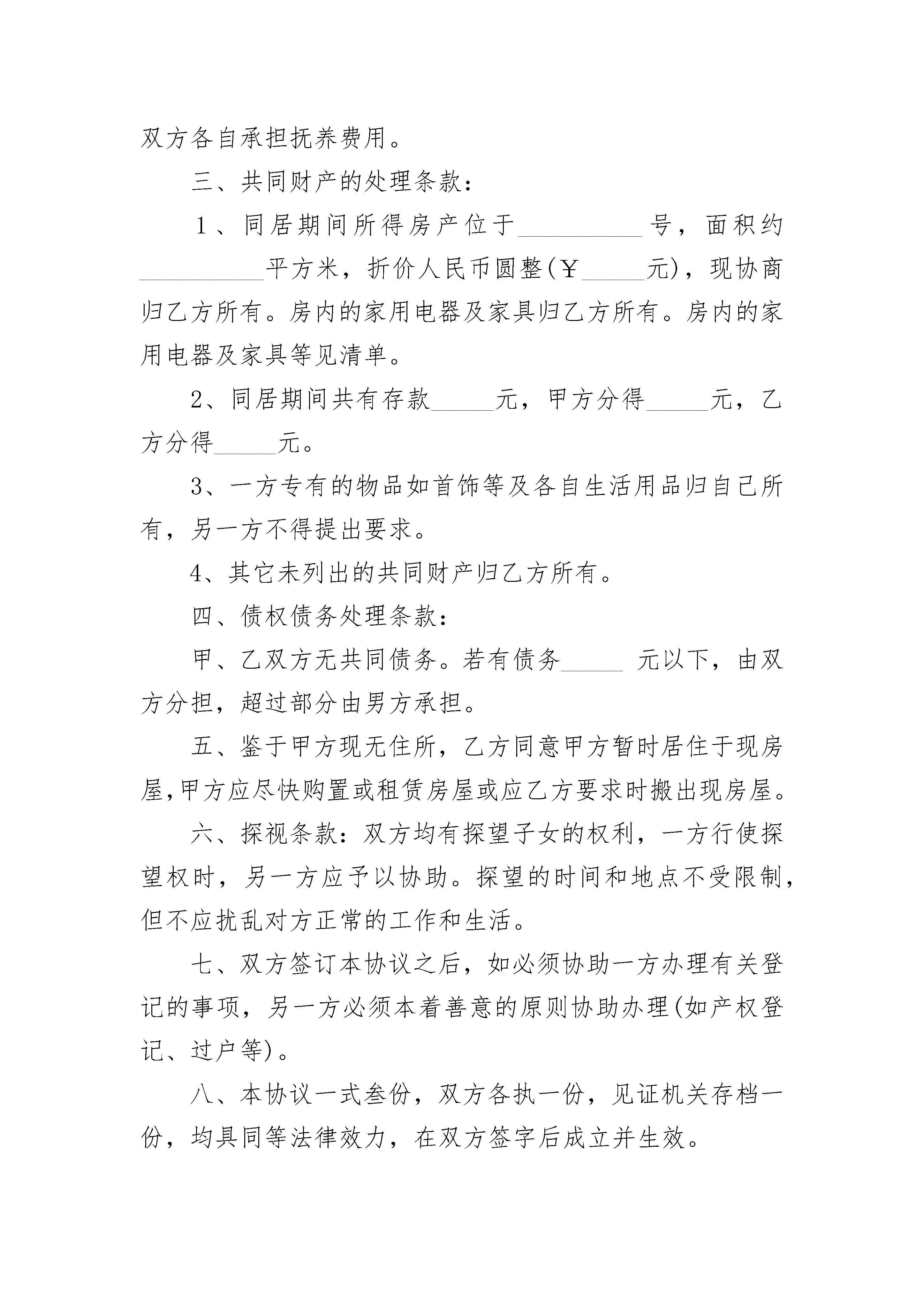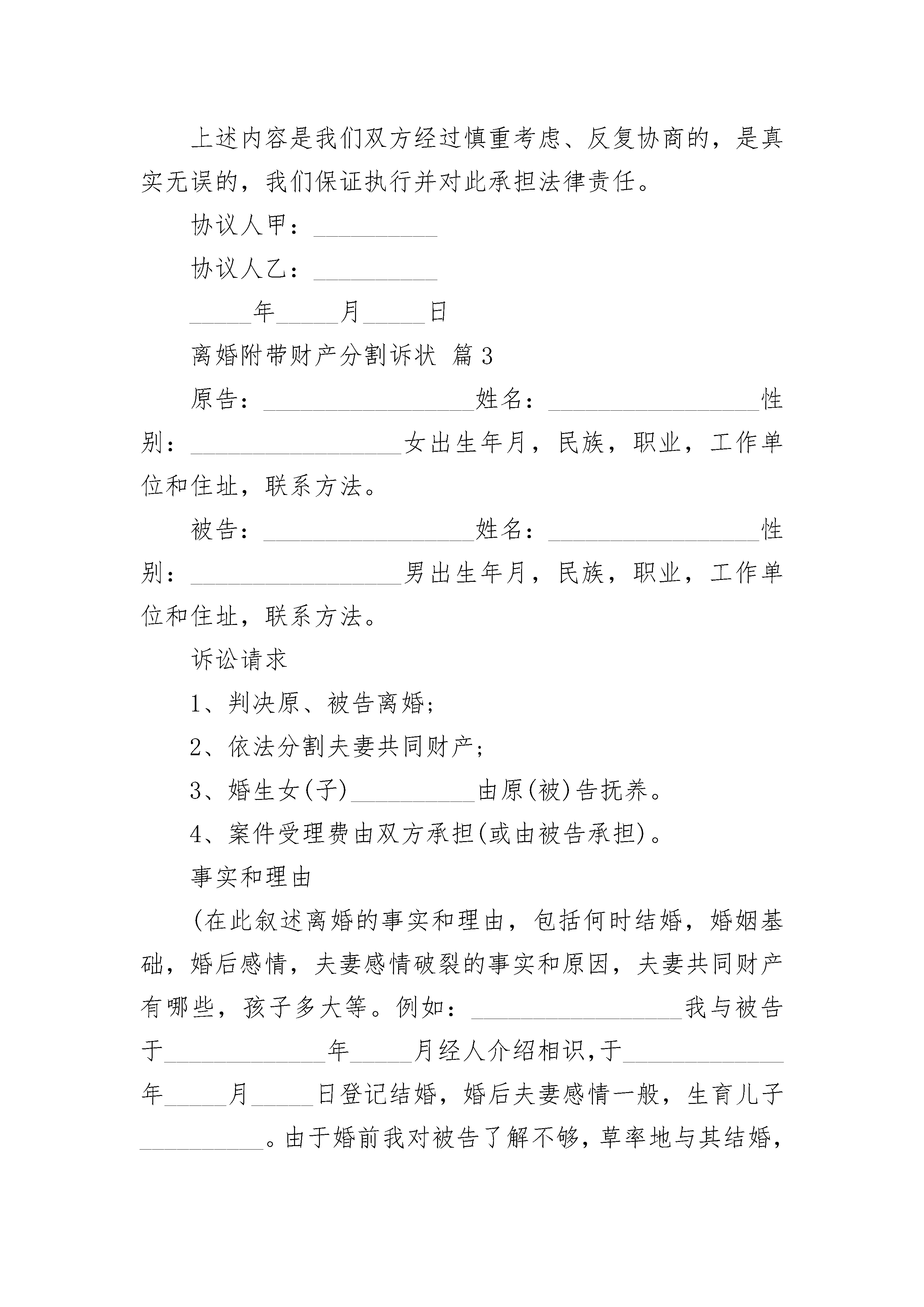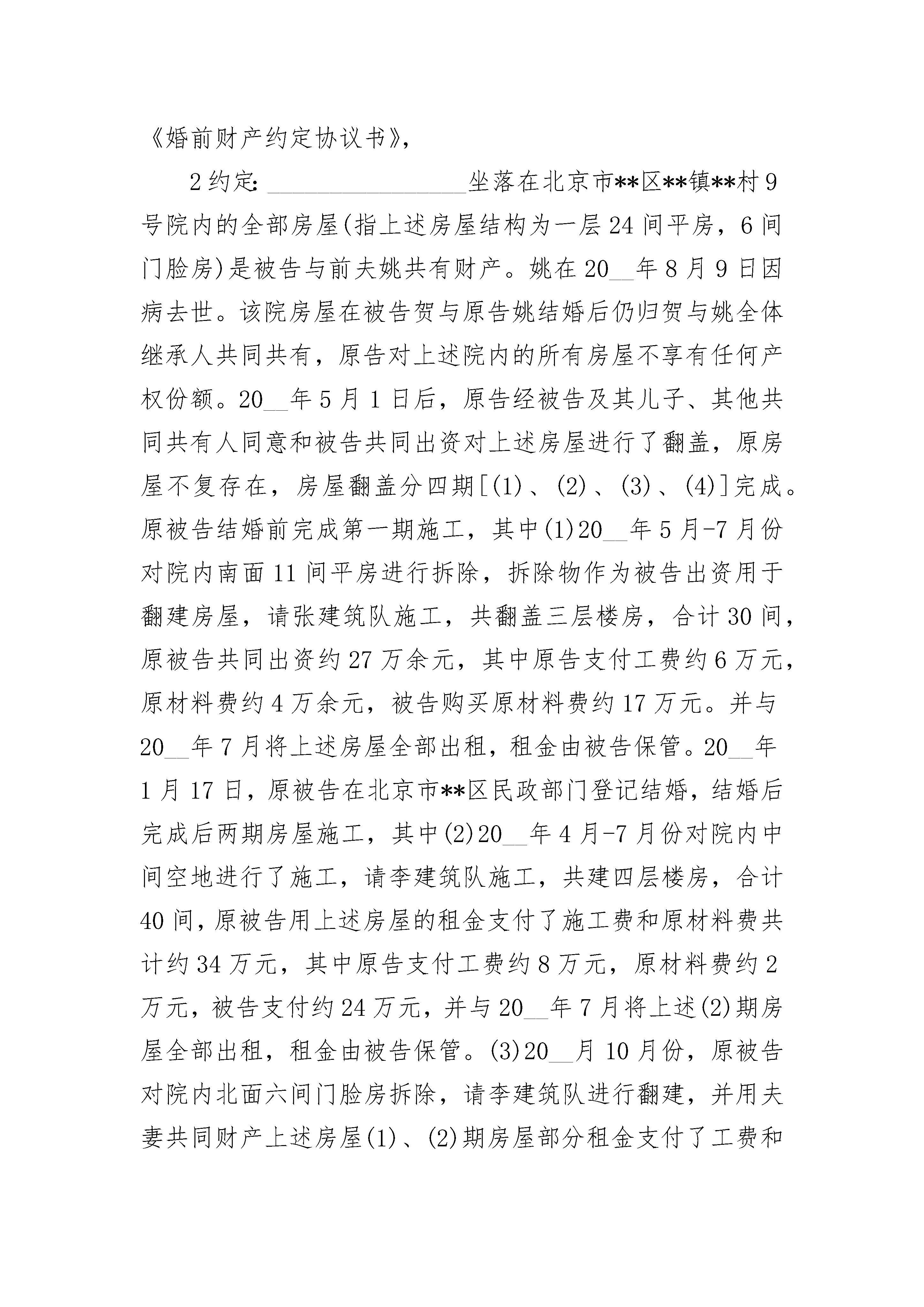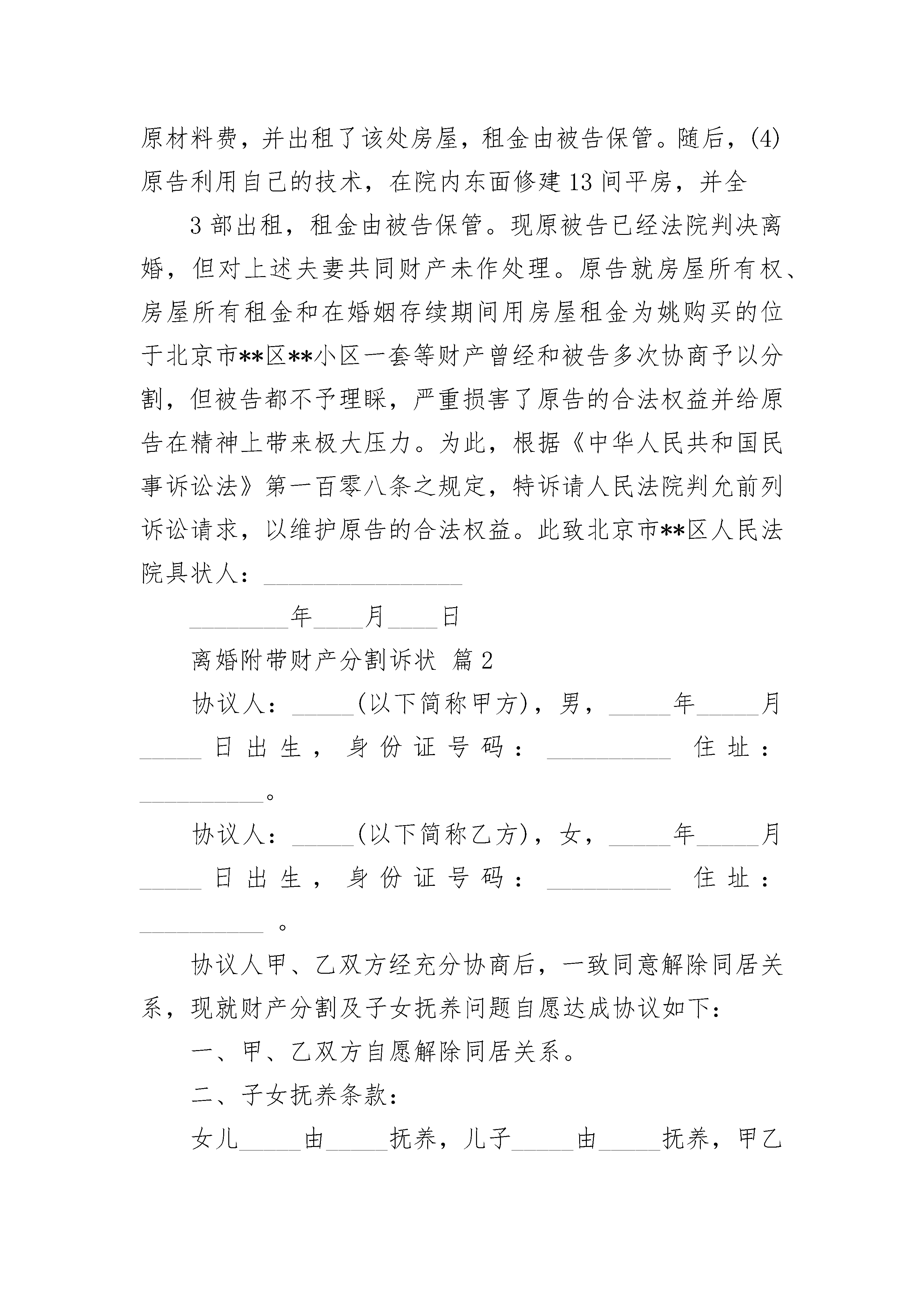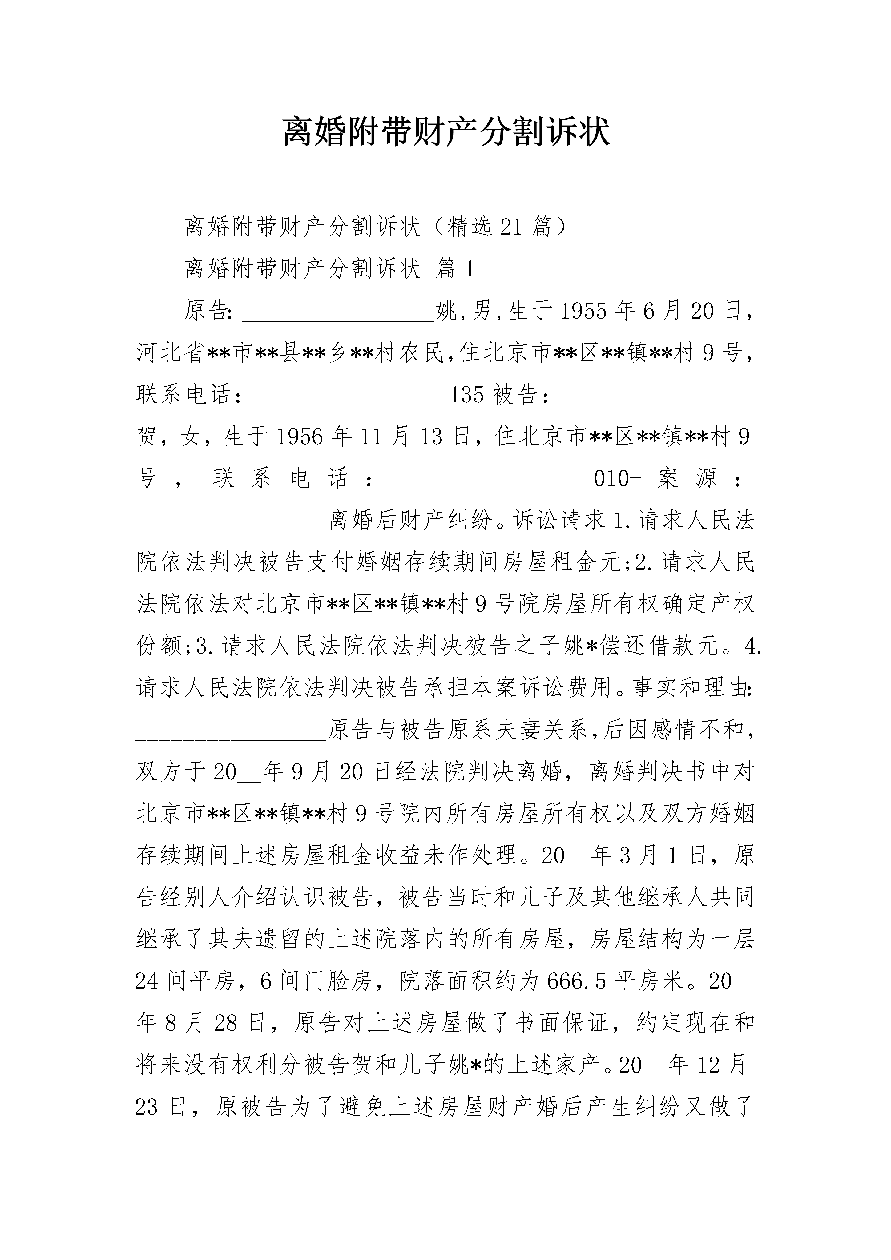 离婚附带财产分割诉状离婚附带财产分割诉状(精选21篇)离婚附带财产分割诉状篇1原告:________________姚,男,生于1955年6月20日,河北省**市**县**乡**村农民,住北京市**区**镇**村9号,联系电话:________________135被告:________________贺,女,生于1956年11月13日,住北京市**区**镇**村9号,联系电话:________________010-案源:________________离婚后财产纠纷。诉讼请求1.请求人民法院依法判决被告支付婚姻存续期间房屋租金元;2.请求人民法院依法对北京市**区**镇**村9号院房屋所有权确定产权份额;3.请求人民法院依法判决被告之子姚*偿还借款元。4.请求人民法院依法判决被告承担本案诉讼费用。事实和理由:________________原告与被告原系夫妻关系,后因感情不和,双方于20__年9月20日经法院判决离婚,离婚判决书中对北京市**区**镇**村9号院内所有房屋所有权以及双方婚姻存续期间上述房屋租金收益未作处理。20__年3月1日,原告经别人介绍认识被告,被告当时和儿子及其他继承人共同继承了其夫遗留的上述院落内的所有房屋,房屋结构为一层24间平房,6间门脸房,院落面积约为666.5平房米。20__年8月28日,原告对上述房屋做了书面保证,约定现在和将来没有权利分被告贺和儿子姚*的上述家产。20__年12月23日,原被告为了避免上述房屋财产婚后产生纠纷又做了《婚前财产约定协议书》,2约定:________________坐落在北京市**区**镇**村9号院内的全部房屋(指上述房屋结构为一层24间平房,6间门脸房)是被告与前夫姚共有财产。姚在20__年8月9日因病去世。该院房屋在被告贺与原告姚结婚后仍归贺与姚全体继承人共同共有,原告对上述院内的所有房屋不享有任何产权份额。20__年5月1日后,原告经被告及其儿子、其他共同共有人同意和被告共同出资对上述房屋进行了翻盖,原房屋不复存在,房屋翻盖分四期[(1)、(2)、(3)、(4)]完成。原被告结婚前完成第一期施工,其中(1)20__年5月-7月份对院内南面11间平房进行拆除,拆除物作为被告出资用于翻建房屋,请张建筑队施工,共翻盖三层楼房,合计30间,原被告共同出资约27万余元,其中原告支付工费约6万元,原材料费约4万余元,被告购买原材料费约17万元。并与20__年7月将上述房屋全部出租,租金由被告保管。20__年1月17日,原被告在北京市**区民政部门登记结婚,结婚后完成后两期房屋施工,其中(2)20__年4月-7月份对院内中间空地进行了施工,请李建筑队施工,共建四层楼房,合计40间,原被告用上述房屋的租金支付了施工费和原材料费共计约34万元,其中原告支付工费约8万元,原材料费约2万元,被告支付约24万元,并与20__年7月将上述(2)期房屋全部出租,租金由被告保管。(3)20__月10月份,原被告对院内北面六间门脸房拆除,请李建筑队进行翻建,并用夫妻共同财产上述房屋(1)、(2)期房屋部分租金支付了工费和原材料费,并出租了该处房屋,租金由被告保管。随后,(4)原告利用自己的技术,在院内东面修建13间平房,并全3部出租,租金由被告保管。现原被告已经法院判决离婚,但对上述夫妻共同财产未作处理。原告就房屋所有权、房屋所有租金和在婚姻存续期间用房屋租金为姚购买的位于北京市**区**小区一套等财产曾经和被告多次协商予以分割,但被告都不予理睬,严重损害了原告的合法权益并给原告在精神上带来极大压力。为此,根据《中华人民共和国民事诉讼法》第一百零八条之规定,特诉请人民法院判允前列诉讼请求,以维护原告的合法权益。此致北京市**区人民法院具状人:________________________年____月____日离婚附带财产分割诉状篇2协议人:_____(以下简称甲方),男,_____年_____月_____日出生,身份证号码:__________住址:__________。协议人:_____(以下简称乙方),女,_____年_____月_____日出生,身份证号码:__________住址:__________。协议人甲、乙双方经充分协商后,一致同意解除同居关系,现就财产分割及子女抚养问题自愿达成协议如下:一、甲、乙双方自愿解除同居关系。二、子女抚养条款:女儿_____由_____抚养,儿子_____由_____抚养,甲乙双方各自承担抚养费用。三、共同财产的处理条款:1、同居期间所得房产位于__________号,面积约__________平方米,折价人民币圆整(¥_____元),现协商归乙方所有。房内的家用电器及家具归乙方所有。房内的家用电器及家具等见清单。2、同居期间共有存款