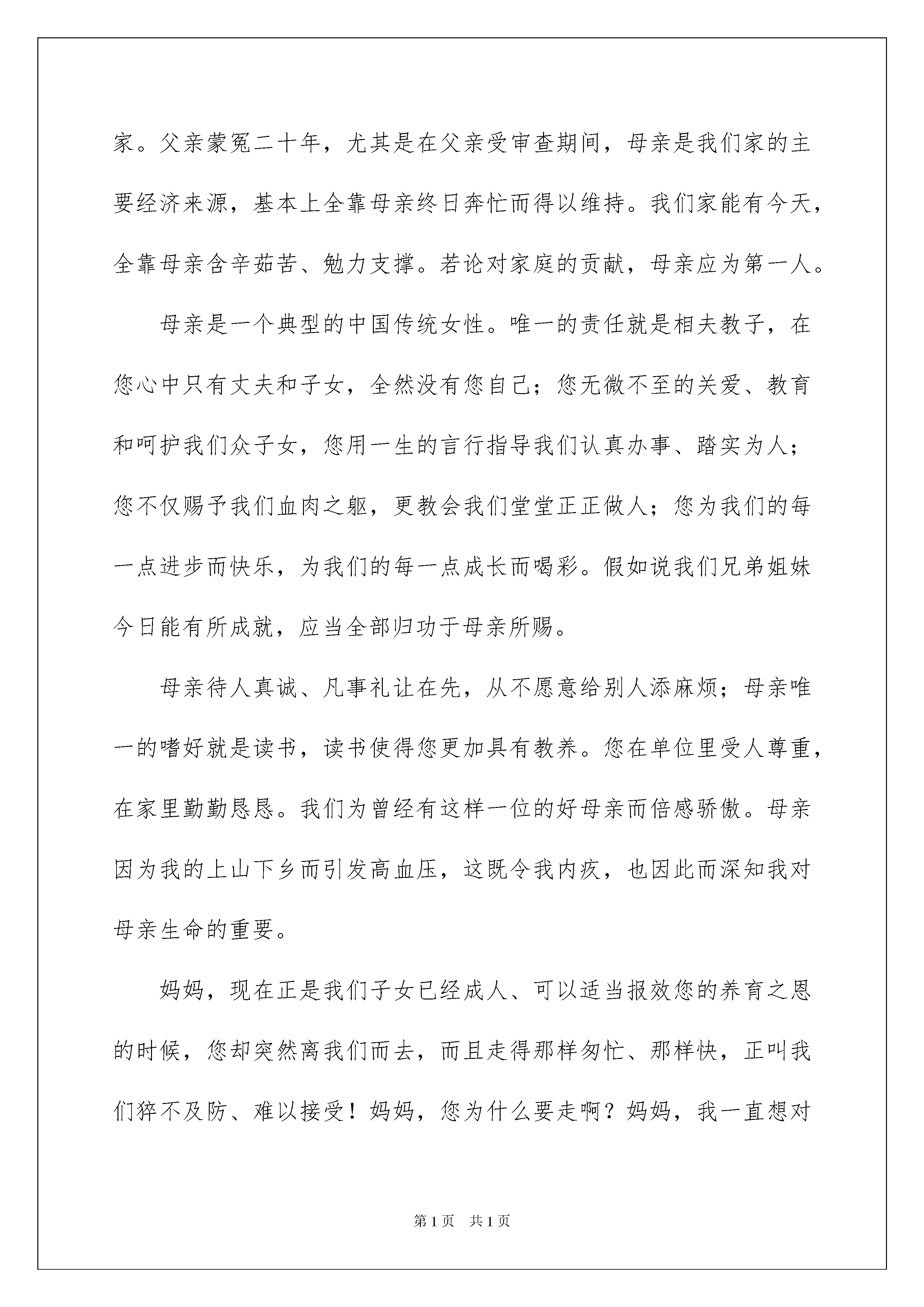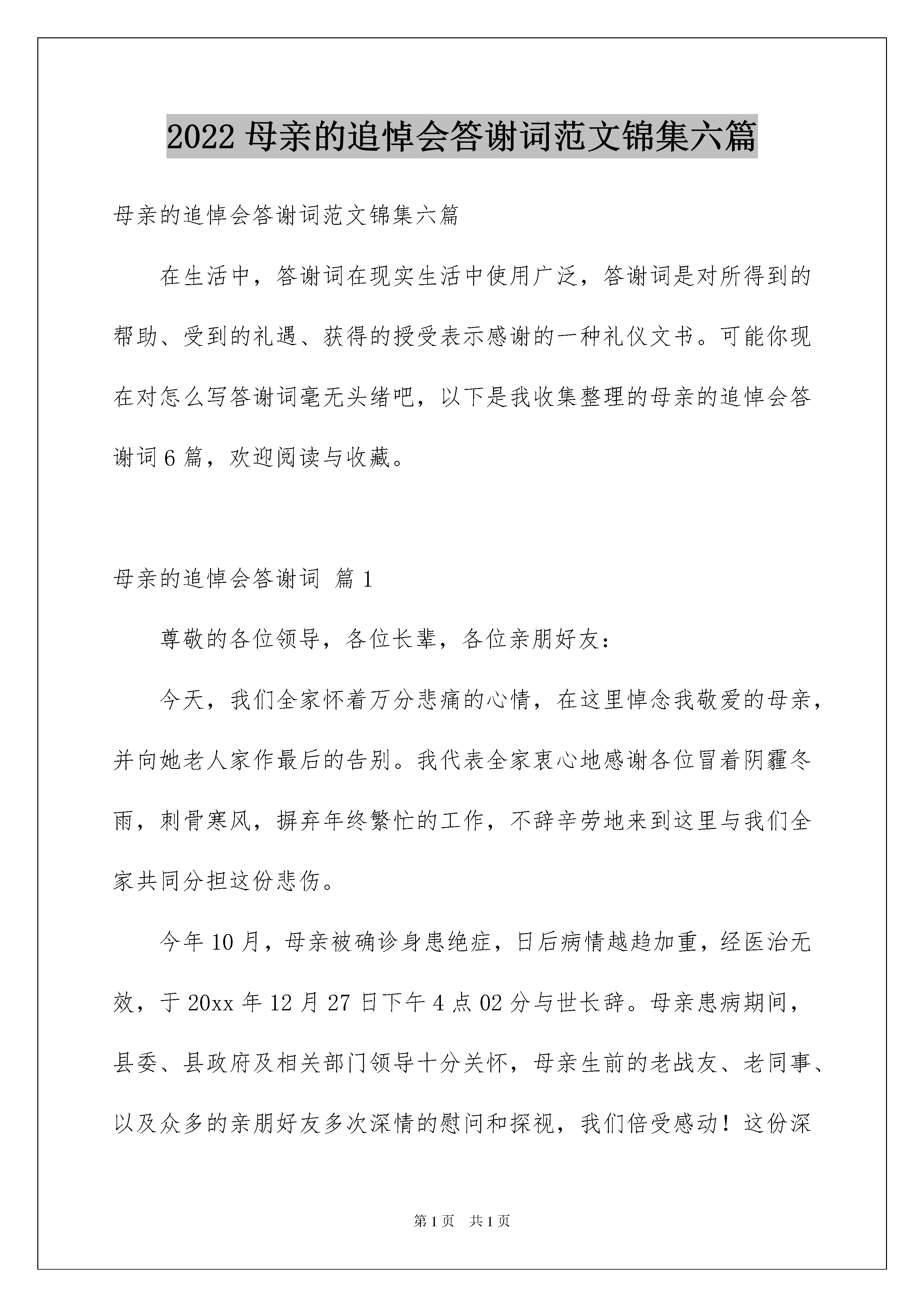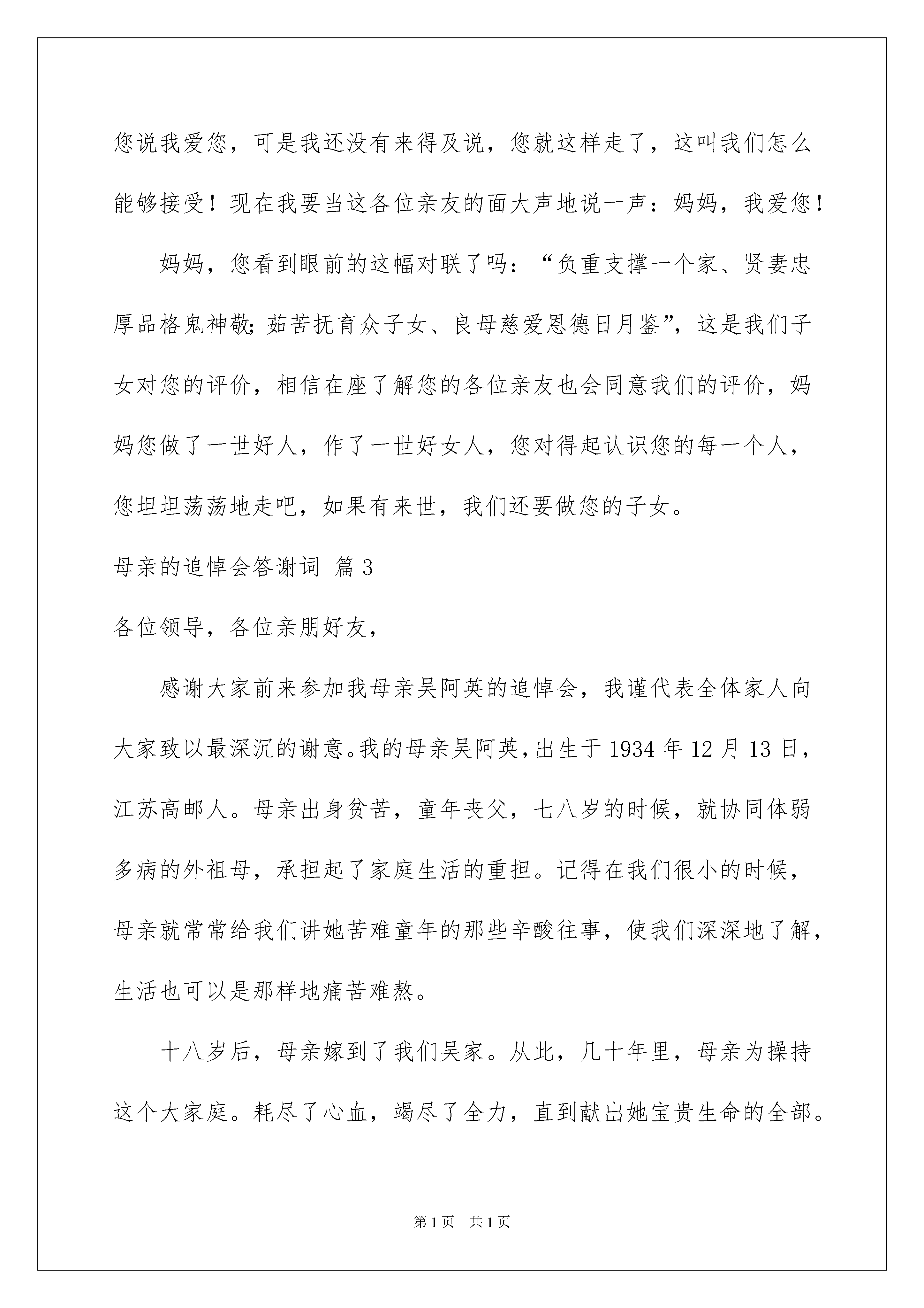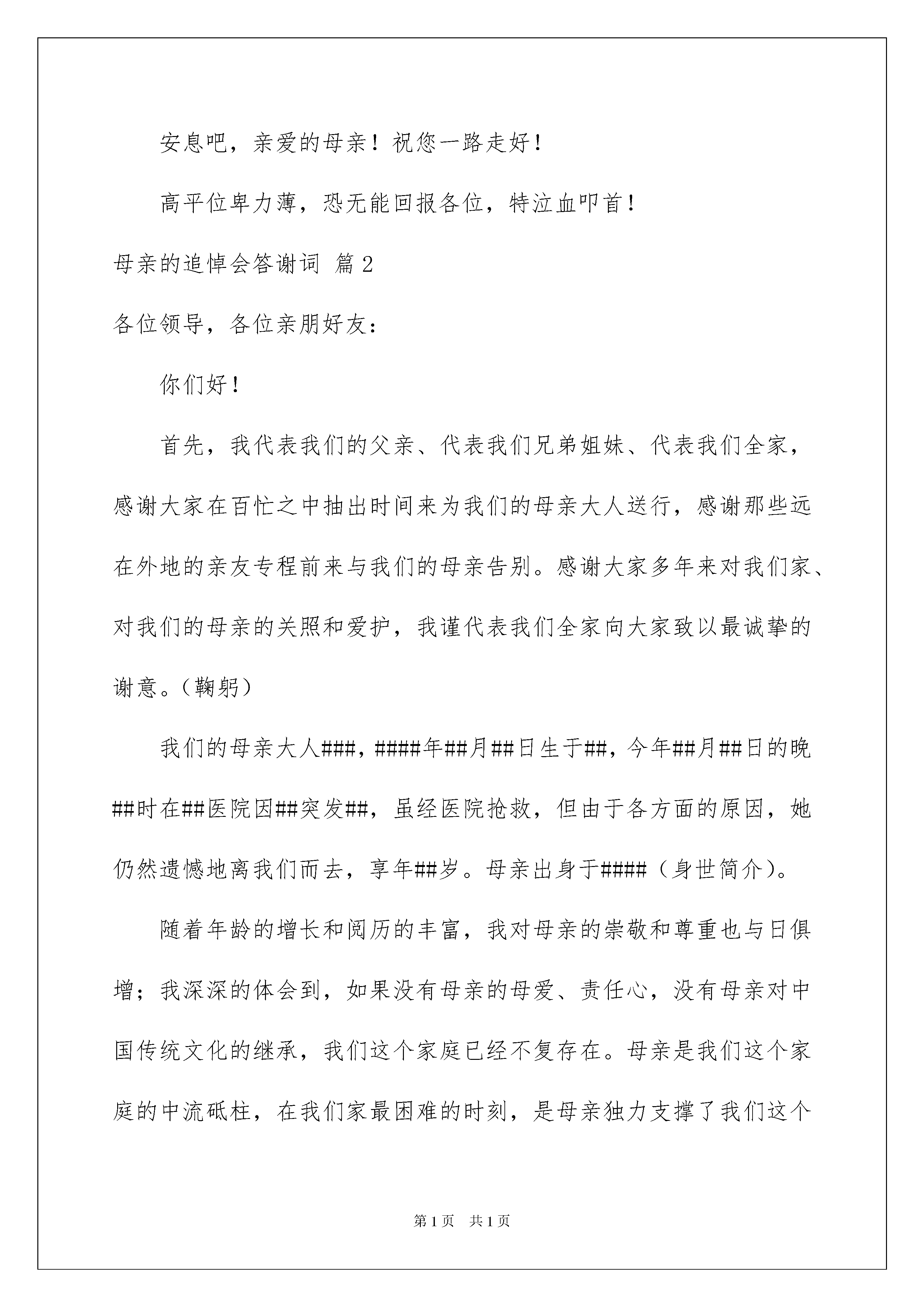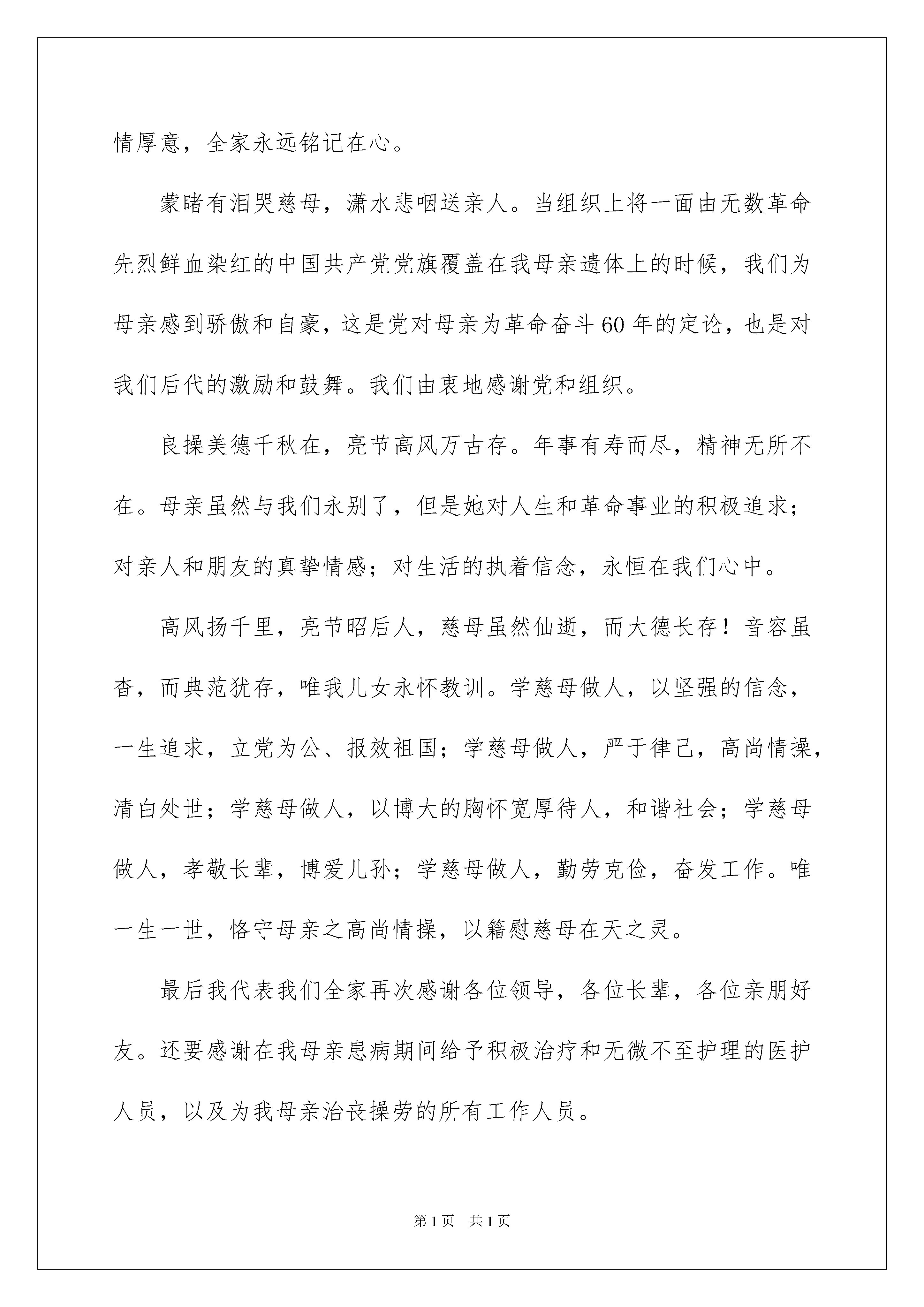 2022母亲的追悼会答谢词范文锦集六篇母亲的追悼会答谢词范文锦集六篇在生活中,答谢词在现实生活中使用广泛,答谢词是对所得到的帮助、受到的礼遇、获得的授受表示感谢的一种礼仪文书。可能你现在对怎么写答谢词毫无头绪吧,以下是我收集整理的母亲的追悼会答谢词6篇,欢迎阅读与收藏。母亲的追悼会答谢词篇1尊敬的各位领导,各位长辈,各位亲朋好友:今天,我们全家怀着万分悲痛的心情,在这里悼念我敬爱的母亲,并向她老人家作最后的告别。我代表全家衷心地感谢各位冒着阴霾冬雨,刺骨寒风,摒弃年终繁忙的工作,不辞辛劳地来到这里与我们全家共同分担这份悲伤。今年10月,母亲被确诊身患绝症,日后病情越趋加重,经医治无效,于20xx年12月27日下午4点02分与世长辞。母亲患病期间,县委、县政府及相关部门领导十分关怀,母亲生前的老战友、老同事、以及众多的亲朋好友多次深情的慰问和探视,我们倍受感动!这份深情厚意,全家永远铭记在心。蒙睹有泪哭慈母,潇水悲咽送亲人。当组织上将一面由无数革命先烈鲜血染红的中国共产党党旗覆盖在我母亲遗体上的时候,我们为母亲感到骄傲和自豪,这是党对母亲为革命奋斗60年的定论,也是对我们后代的激励和鼓舞。我们由衷地感谢党和组织。良操美德千秋在,亮节高风万古存。年事有寿而尽,精神无所不在。母亲虽然与我们永别了,但是她对人生和革命事业的积极追求;对亲人和朋友的真挚情感;对生活的执着信念,永恒在我们心中。高风扬千里,亮节昭后人,慈母虽然仙逝,而大德长存!音容虽杳,而典范犹存,唯我儿女永怀教训。学慈母做人,以坚强的信念,一生追求,立党为公、报效祖国;学慈母做人,严于律己,高尚情操,清白处世;学慈母做人,以博大的胸怀宽厚待人,和谐社会;学慈母做人,孝敬长辈,博爱儿孙;学慈母做人,勤劳克俭,奋发工作。唯一生一世,恪守母亲之高尚情操,以籍慰慈母在天之灵。最后我代表我们全家再次感谢各位领导,各位长辈,各位亲朋好友。还要感谢在我母亲患病期间给予积极治疗和无微不至护理的医护人员,以及为我母亲治丧操劳的所有工作人员。安息吧,亲爱的母亲!祝您一路走好!高平位卑力薄,恐无能回报各位,特泣血叩首!母亲的追悼会答谢词篇2各位领导,各位亲朋好友:你们好!首先,我代表我们的父亲、代表我们兄弟姐妹、代表我们全家,感谢大家在百忙之中抽出时间来为我们的母亲大人送行,感谢那些远在外地的亲友专程前来与我们的母亲告别。感谢大家多年来对我们家、对我们的母亲的关照和爱护,我谨代表我们全家向大家致以最诚挚的谢意。(鞠躬)我们的母亲大人###,####年##月##日生于##,今年##月##日的晚##时在##医院因##突发##,虽经医院抢救,但由于各方面的原因,她仍然遗憾地离我们而去,享年##岁。母亲出身于####(身世简介)。随着年龄的增长和阅历的丰富,我对母亲的崇敬和尊重也与日俱增;我深深的体会到,如果没有母亲的母爱、责任心,没有母亲对中国传统文化的继承,我们这个家庭已经不复存在。母亲是我们这个家庭的中流砥柱,在我们家最困难的时刻,是母亲独力支撑了我们这个家。父亲蒙冤二十年,尤其是在父亲受审查期间,母亲是我们家的主要经济来源,基本上全靠母亲终日奔忙而得以维持。我们家能有今天,全靠母亲含辛茹苦、勉力支撑。若论对家庭的贡献,母亲应为第一人。母亲是一个典型的中国传统女性。唯一的责任就是相夫教子,在您心中只有丈夫和子女,全然没有您自己;您无微不至的关爱、教育和呵护我们众子女,您用一生的言行指导我们认真办事、踏实为人;您不仅赐予我们血肉之躯,更教会我们堂堂正正做人;您为我们的每一点进步而快乐,为我们的每一点成长而喝彩。假如说我们兄弟姐妹今日能有所成就,应当全部归功于母亲所赐。母亲待人真诚、凡事礼让在先,从不愿意给别人添麻烦;母亲唯一的嗜好就是读书,读书使得您更加具有教养。您在单位里受人尊重,在家里勤勤恳恳。我们为曾经有这样一位的好母亲而倍感骄傲。母亲因为我的上山下乡而引发高血压,这既令我内疚,也因此而深知我对母亲生命的重要。妈妈,现在正是我们子女已经成人、可以适当报效您的养育之恩的时候,您却突然离我们而去,而且走得那样匆忙、那样快,正叫我们猝不及防、难以接受!妈妈,您为什么要走啊?妈妈,我一直想对您说我爱您,可是我还没有来得及说,您就这样走了,这叫我们怎么能够接受!现在我要当这各位亲友的面大声地说一声:妈妈,我爱您!妈妈,您看到眼前的这幅对联了吗:“负重支撑一个家、贤妻忠厚品格鬼神敬;茹苦抚育众子女、良母慈爱恩德日月鉴”,这是我们子女对您的评价,相信在座了解您的各位亲友也会同意我们的评价,妈妈您做了一世好人,作了一世好女人,您对得起认识您的每一个人,