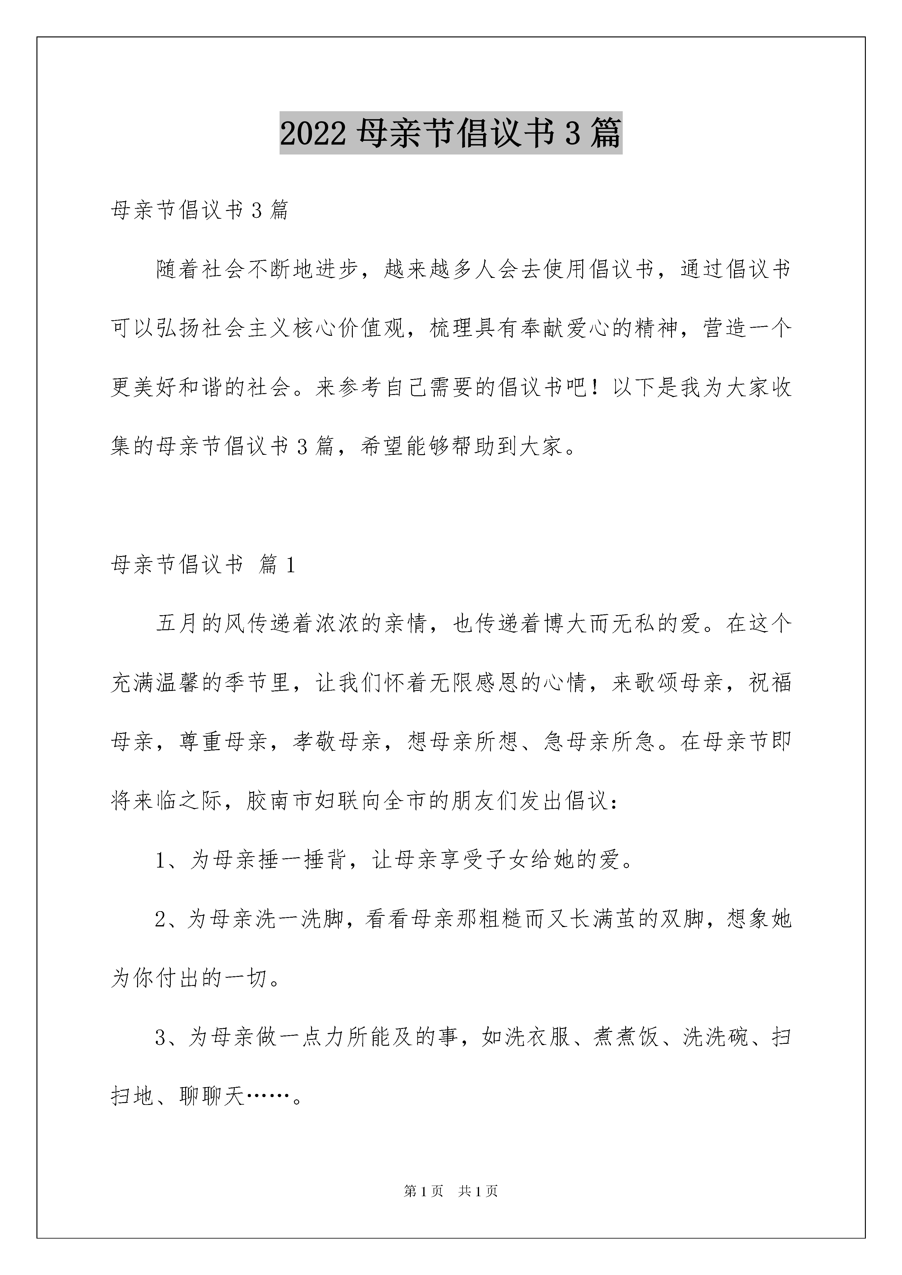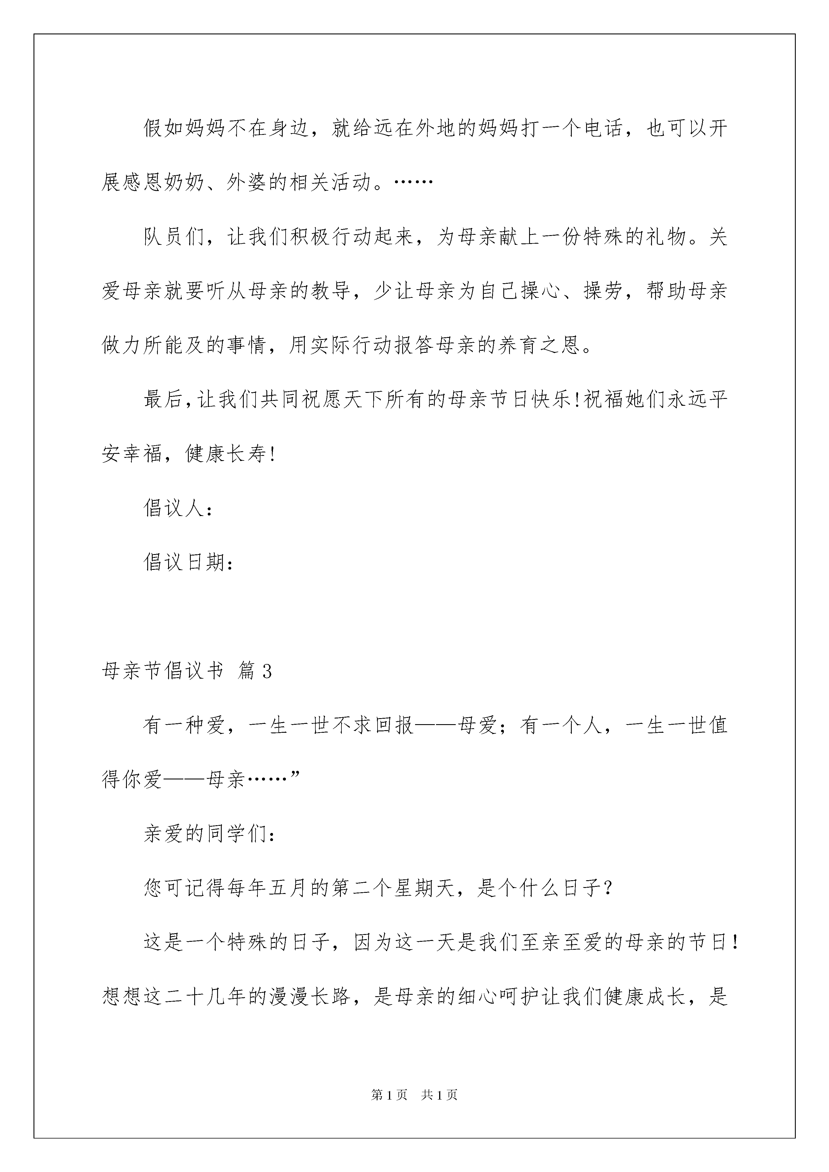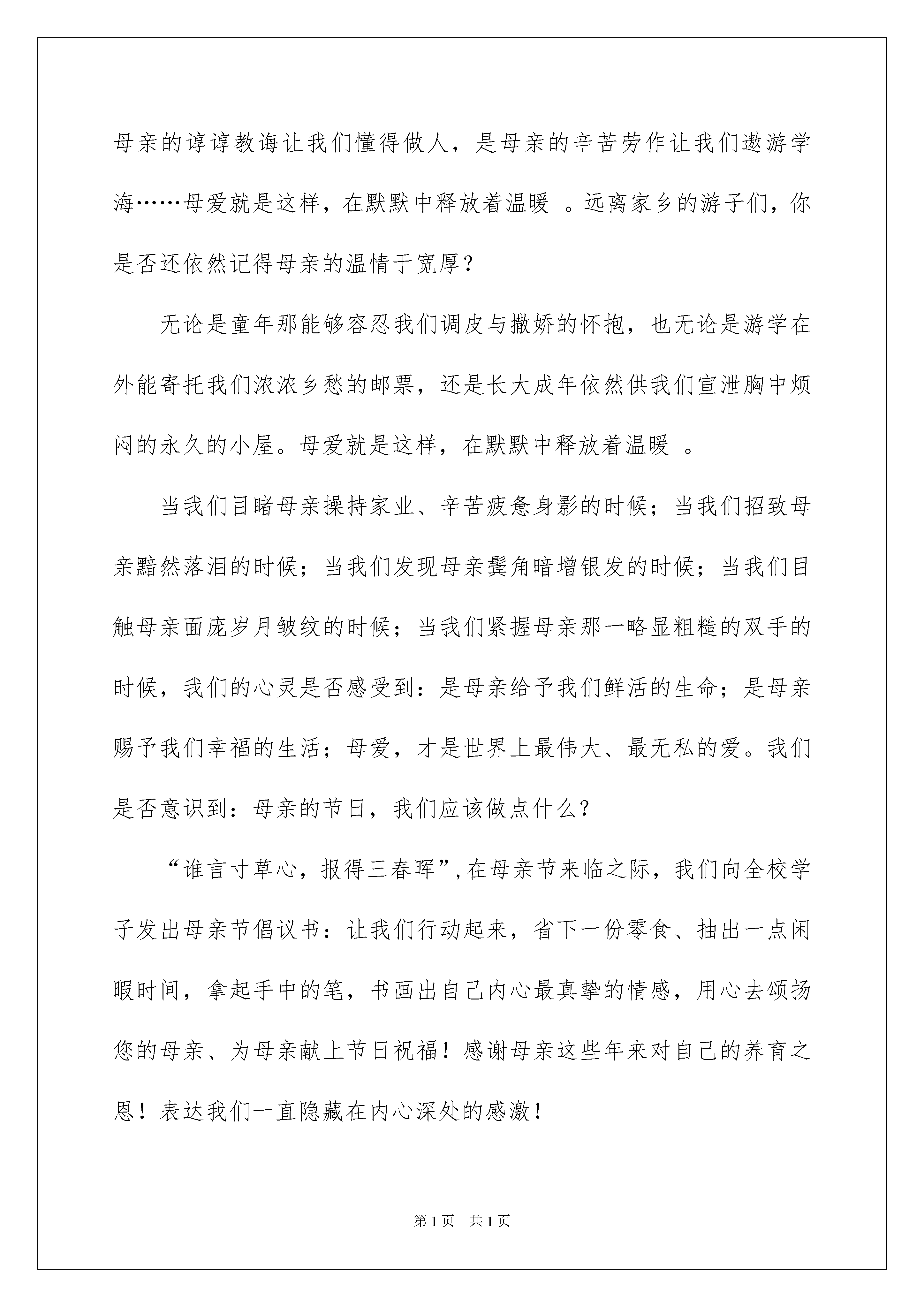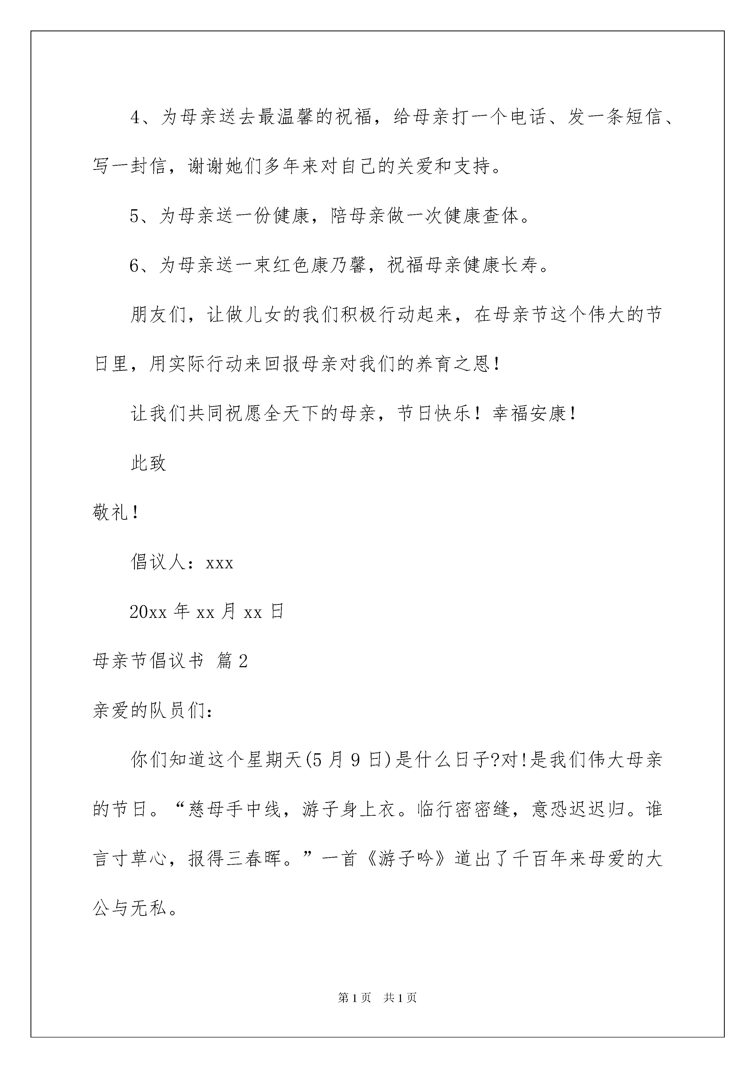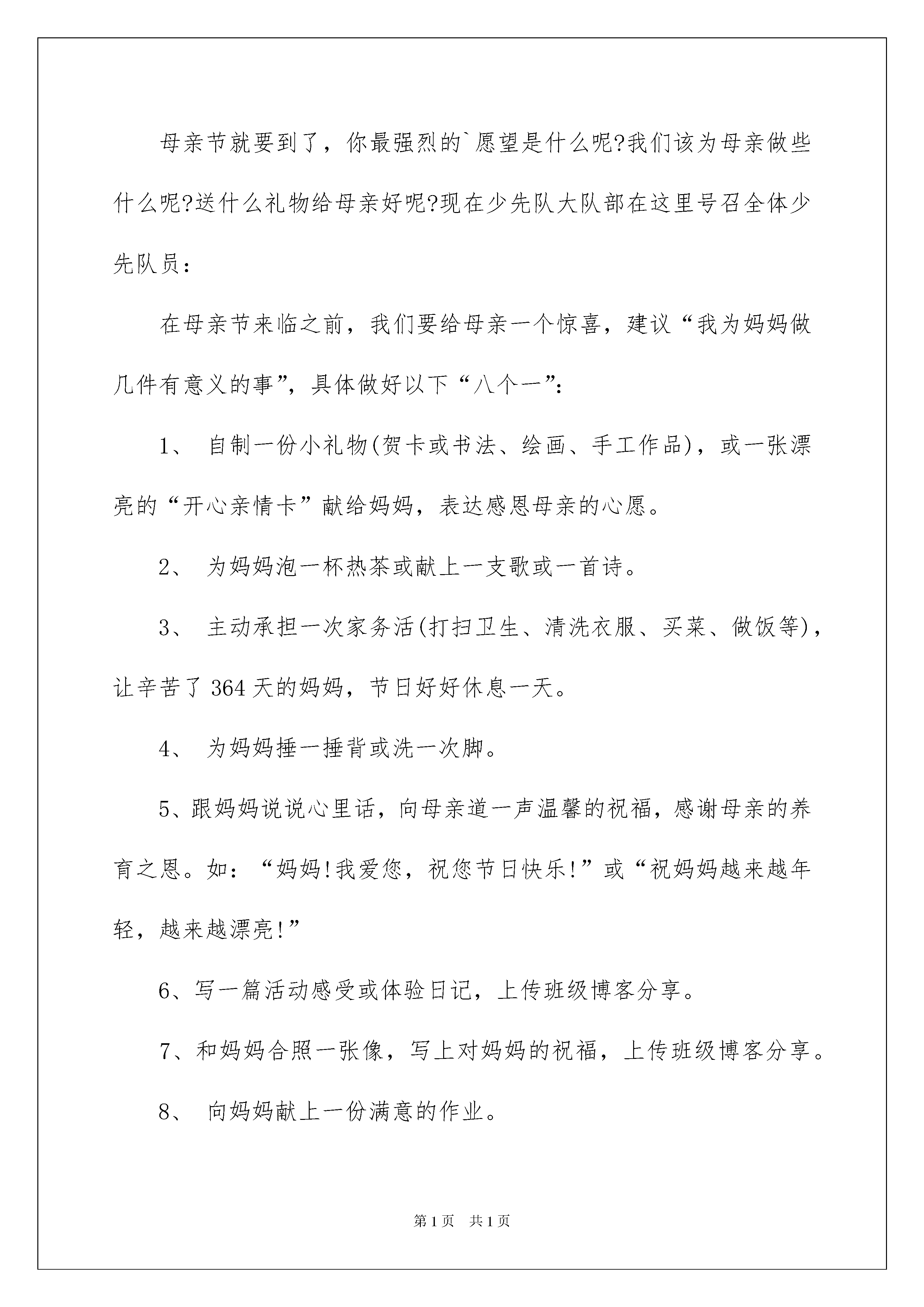 2022母亲节倡议书3篇母亲节倡议书3篇随着社会不断地进步,越来越多人会去使用倡议书,通过倡议书可以弘扬社会主义核心价值观,梳理具有奉献爱心的精神,营造一个更美好和谐的社会。来参考自己需要的倡议书吧!以下是我为大家收集的母亲节倡议书3篇,希望能够帮助到大家。母亲节倡议书篇1五月的风传递着浓浓的亲情,也传递着博大而无私的爱。在这个充满温馨的季节里,让我们怀着无限感恩的心情,来歌颂母亲,祝福母亲,尊重母亲,孝敬母亲,想母亲所想、急母亲所急。在母亲节即将来临之际,胶南市妇联向全市的朋友们发出倡议:1、为母亲捶一捶背,让母亲享受子女给她的爱。2、为母亲洗一洗脚,看看母亲那粗糙而又长满茧的双脚,想象她为你付出的一切。3、为母亲做一点力所能及的事,如洗衣服、煮煮饭、洗洗碗、扫扫地、聊聊天……。4、为母亲送去最温馨的祝福,给母亲打一个电话、发一条短信、写一封信,谢谢她们多年来对自己的关爱和支持。5、为母亲送一份健康,陪母亲做一次健康查体。6、为母亲送一束红色康乃馨,祝福母亲健康长寿。朋友们,让做儿女的我们积极行动起来,在母亲节这个伟大的节日里,用实际行动来回报母亲对我们的养育之恩!让我们共同祝愿全天下的母亲,节日快乐!幸福安康!此致敬礼!倡议人:xxx20xx年xx月xx日母亲节倡议书篇2亲爱的队员们:你们知道这个星期天(5月9日)是什么日子?对!是我们伟大母亲的节日。“慈母手中线,游子身上衣。临行密密缝,意恐迟迟归。谁言寸草心,报得三春晖。”一首《游子吟》道出了千百年来母爱的大公与无私。母亲节就要到了,你最强烈的`愿望是什么呢?我们该为母亲做些什么呢?送什么礼物给母亲好呢?现在少先队大队部在这里号召全体少先队员:在母亲节来临之前,我们要给母亲一个惊喜,建议“我为妈妈做几件有意义的事”,具体做好以下“八个一”:1、自制一份小礼物(贺卡或书法、绘画、手工作品),或一张漂亮的“开心亲情卡”献给妈妈,表达感恩母亲的心愿。2、为妈妈泡一杯热茶或献上一支歌或一首诗。3、主动承担一次家务活(打扫卫生、清洗衣服、买菜、做饭等),让辛苦了364天的妈妈,节日好好休息一天。4、为妈妈捶一捶背或洗一次脚。5、跟妈妈说说心里话,向母亲道一声温馨的祝福,感谢母亲的养育之恩。如:“妈妈!我爱您,祝您节日快乐!”或“祝妈妈越来越年轻,越来越漂亮!”6、写一篇活动感受或体验日记,上传班级博客分享。7、和妈妈合照一张像,写上对妈妈的祝福,上传班级博客分享。8、向妈妈献上一份满意的作业。假如妈妈不在身边,就给远在外地的妈妈打一个电话,也可以开展感恩奶奶、外婆的相关活动。……队员们,让我们积极行动起来,为母亲献上一份特殊的礼物。关爱母亲就要听从母亲的教导,少让母亲为自己操心、操劳,帮助母亲做力所能及的事情,用实际行动报答母亲的养育之恩。最后,让我们共同祝愿天下所有的母亲节日快乐!祝福她们永远平安幸福,健康长寿!倡议人:倡议日期:母亲节倡议书篇3有一种爱,一生一世不求回报——母爱;有一个人,一生一世值得你爱——母亲……”亲爱的同学们:您可记得每年五月的第二个星期天,是个什么日子?这是一个特殊的日子,因为这一天是我们至亲至爱的母亲的节日!想想这二十几年的漫漫长路,是母亲的细心呵护让我们健康成长,是母亲的谆谆教诲让我们懂得做人,是母亲的辛苦劳作让我们遨游学海……母爱就是这样,在默默中释放着温暖。远离家乡的游子们,你是否还依然记得母亲的温情于宽厚?无论是童年那能够容忍我们调皮与撒娇的怀抱,也无论是游学在外能寄托我们浓浓乡愁的邮票,还是长大成年依然供我们宣泄胸中烦闷的永久的小屋。母爱就是这样,在默默中释放着温暖。当我们目睹母亲操持家业、辛苦疲惫身影的时候;当我们招致母亲黯然落泪的时候;当我们发现母亲鬓角暗增银发的时候;当我们目触母亲面庞岁月皱纹的时候;当我们紧握母亲那一略显粗糙的双手的时候,我们的心灵是否感受到:是母亲给予我们鲜活的生命;是母亲赐予我们幸福的生活;母爱,才是世界上最伟大、最无私的爱。我们是否意识到:母亲的节日,我们应该做点什么?“谁言寸草心,报得三春晖”,在母亲节来临之际,我们向全校学子发出母亲节倡议书:让我们行动起来,省下一份零食、抽出一点闲暇时间,拿起手中的笔,书画出自己内心最真挚的情感,用心去颂扬您的母亲、为母亲献上节日祝福!感谢母亲这些年来对自己的养育之恩!表达我们一直隐藏在内心深处的感激!母亲节只是提醒着我们每一个人要懂得去珍惜母爱,哪怕一句短短的问候,一封直白的家书,因为母亲要求的并不多,儿女的幸福就是母亲最大的安慰……〈在母亲节来临之际,谨以此倡议书共同祝福为我们日夜操劳、担忧的所有伟大的母亲!〉本