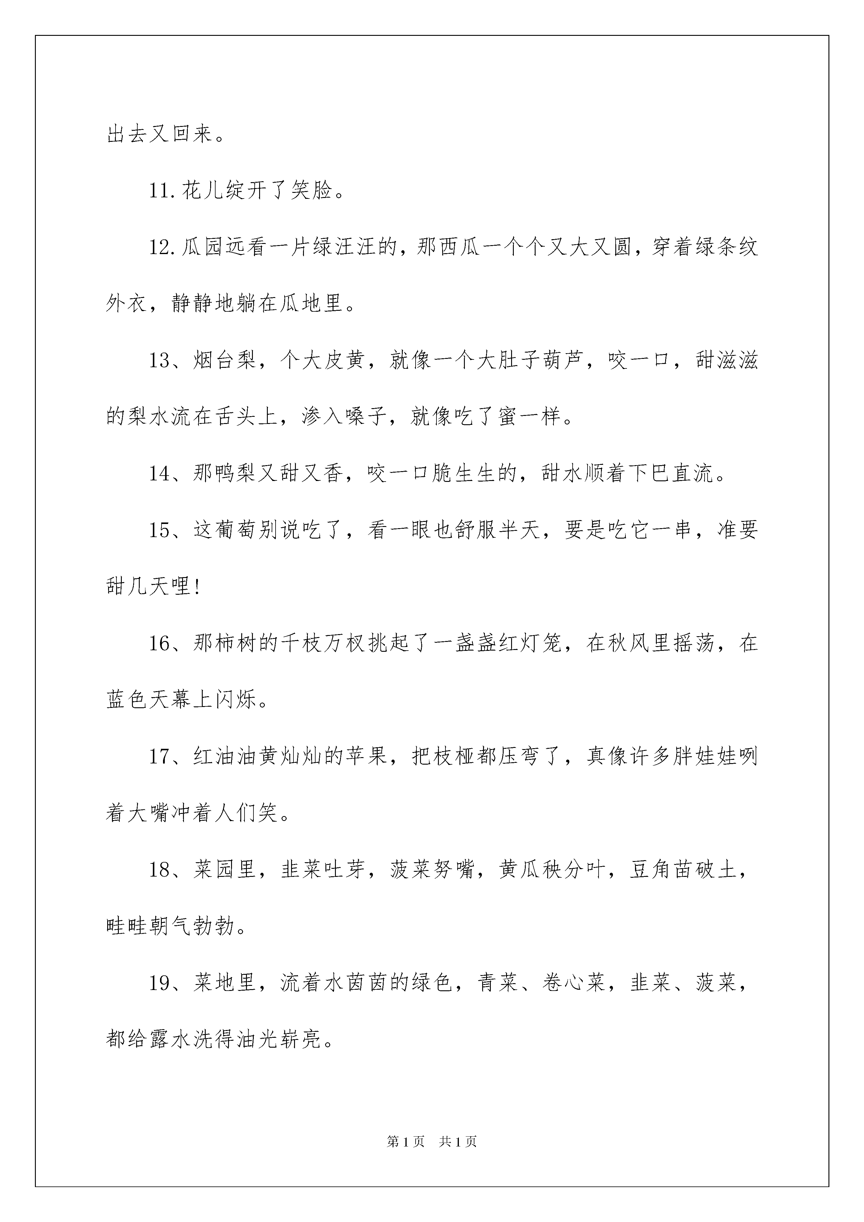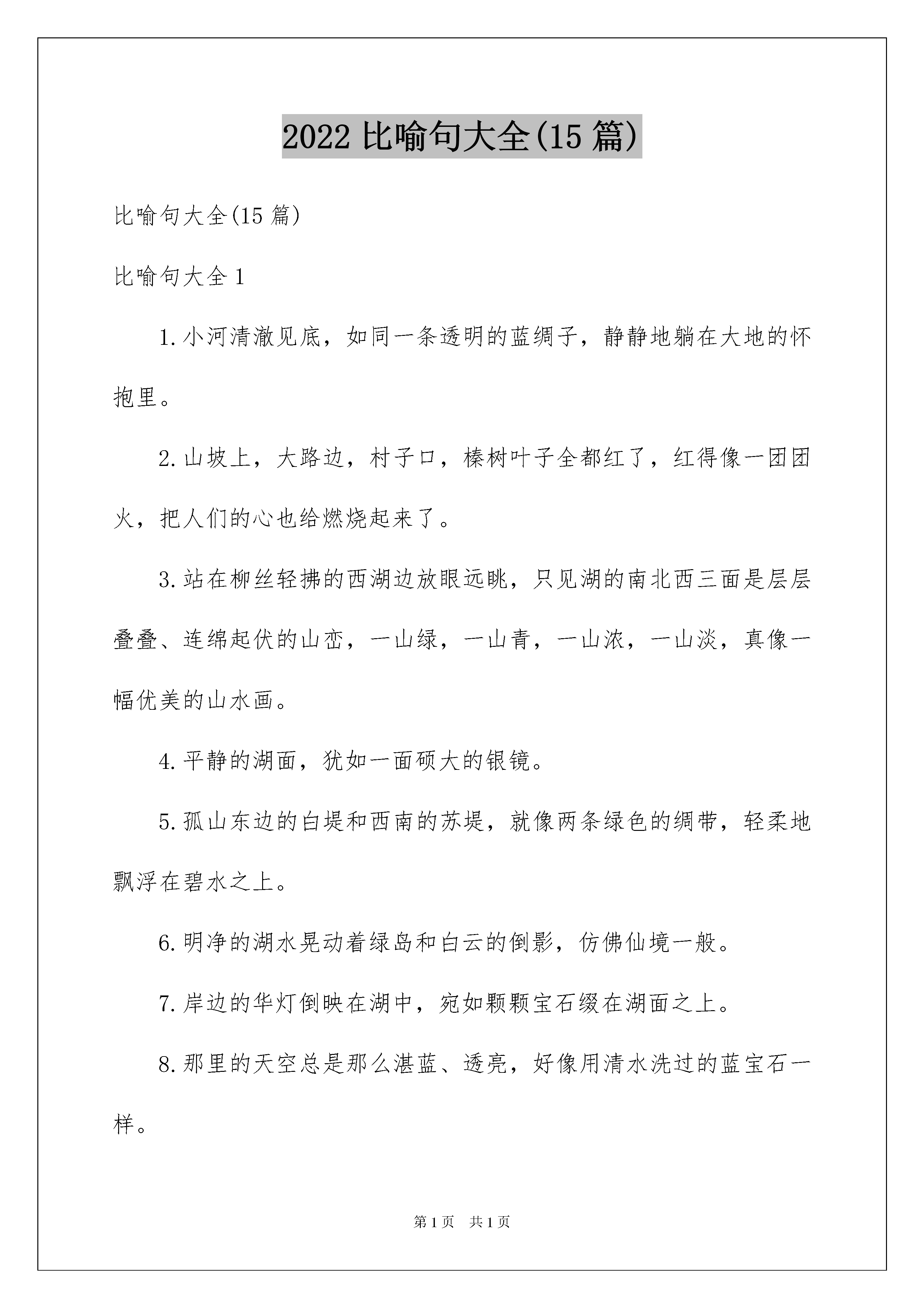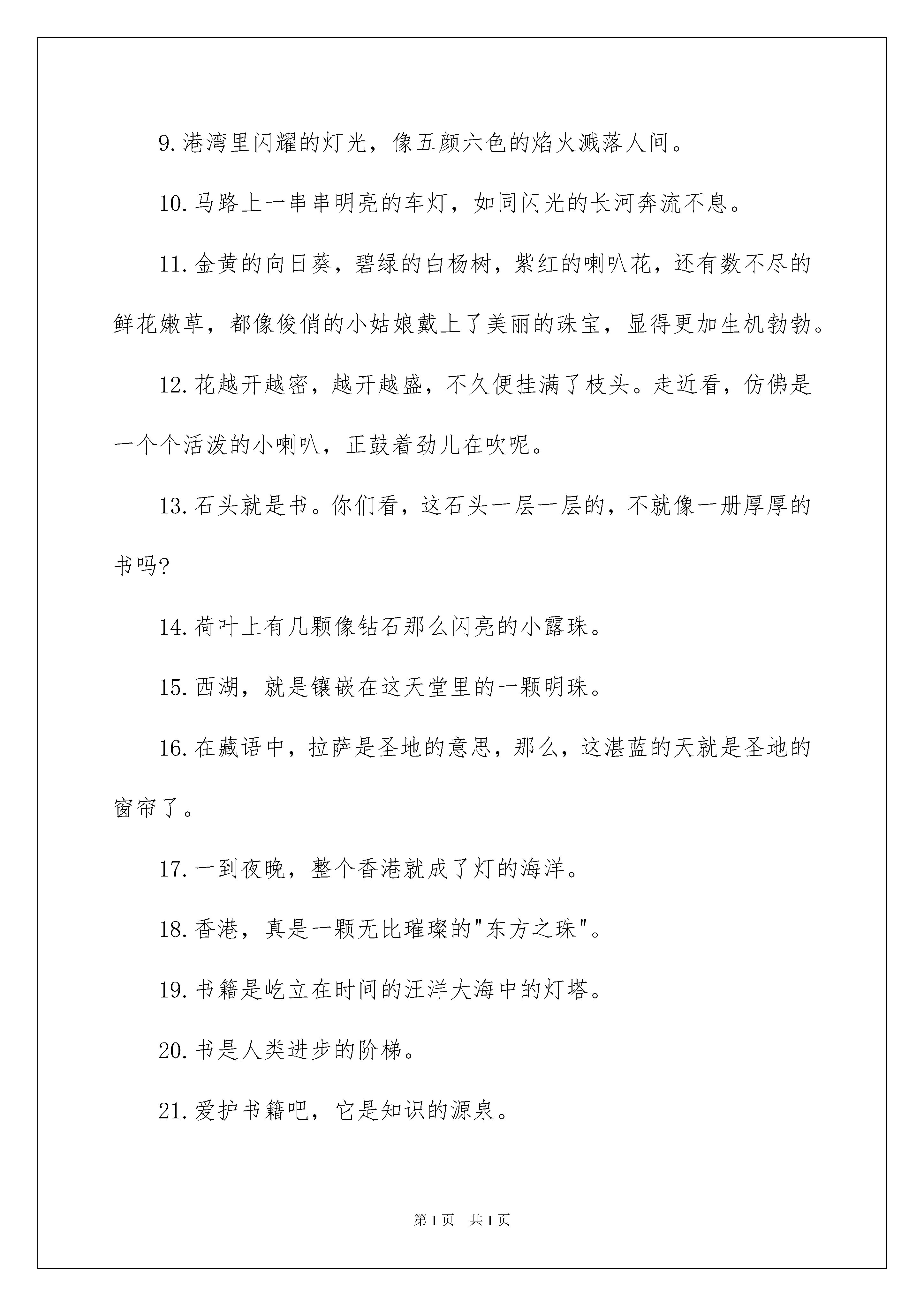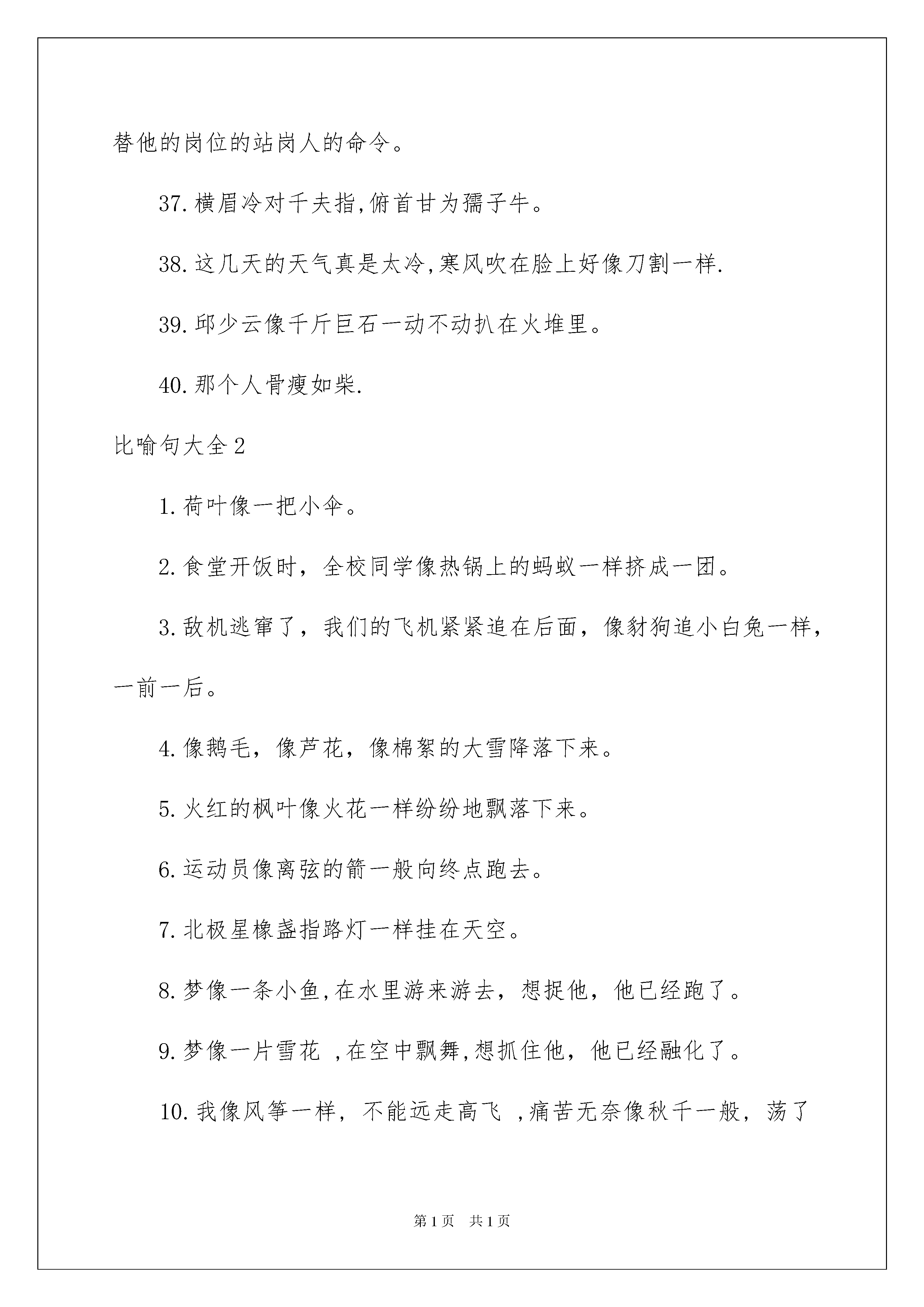 2022比喻句大全(15篇)比喻句大全(15篇)比喻句大全11.小河清澈见底,如同一条透明的蓝绸子,静静地躺在大地的怀抱里。2.山坡上,大路边,村子口,榛树叶子全都红了,红得像一团团火,把人们的心也给燃烧起来了。3.站在柳丝轻拂的西湖边放眼远眺,只见湖的南北西三面是层层叠叠、连绵起伏的山峦,一山绿,一山青,一山浓,一山淡,真像一幅优美的山水画。4.平静的湖面,犹如一面硕大的银镜。5.孤山东边的白堤和西南的苏堤,就像两条绿色的绸带,轻柔地飘浮在碧水之上。6.明净的湖水晃动着绿岛和白云的倒影,仿佛仙境一般。7.岸边的华灯倒映在湖中,宛如颗颗宝石缀在湖面之上。8.那里的天空总是那么湛蓝、透亮,好像用清水洗过的蓝宝石一样。9.港湾里闪耀的灯光,像五颜六色的焰火溅落人间。10.马路上一串串明亮的车灯,如同闪光的长河奔流不息。11.金黄的向日葵,碧绿的白杨树,紫红的喇叭花,还有数不尽的鲜花嫩草,都像俊俏的小姑娘戴上了美丽的珠宝,显得更加生机勃勃。12.花越开越密,越开越盛,不久便挂满了枝头。走近看,仿佛是一个个活泼的小喇叭,正鼓着劲儿在吹呢。13.石头就是书。你们看,这石头一层一层的,不就像一册厚厚的书吗?14.荷叶上有几颗像钻石那么闪亮的小露珠。15.西湖,就是镶嵌在这天堂里的一颗明珠。16.在藏语中,拉萨是圣地的意思,那么,这湛蓝的天就是圣地的窗帘了。17.一到夜晚,整个香港就成了灯的海洋。18.香港,真是一颗无比璀璨的"东方之珠"。19.书籍是屹立在时间的汪洋大海中的灯塔。20.书是人类进步的阶梯。21.爱护书籍吧,它是知识的源泉。22.一本好书就是一个好社会,它能够陶冶人的感情与气质,使人高尚。23.读一本好书等于和许多高尚的人谈话。24.选书应和交友一样谨慎。因为你的习性受书籍的影响不亚于朋友25.书是智慧的钥匙。26.政治家说:"书是时代的生命"。27.企业家说:"书是致富的信息"。28.文学家说:"书是人类的营养品"。29.学生们说:"书是不开口的老师"。30.迷惘者说:"书是心中的启明星"。31.探索者说:"书是通向彼岸的船"。32.奋斗者说:"书是人生的向导"。33.急于求知者说:"书是饥饿时的美餐"。34.书就药也,善读之可以医愚.。35.书——这是一代对另一代精神上的遗训,这是行将就木的老人对刚刚开始生活的青年人的中选,这是行将去休息的站岗人对走来接替他的岗位的站岗人的命令。37.横眉冷对千夫指,俯首甘为孺子牛。38.这几天的天气真是太冷,寒风吹在脸上好像刀割一样.39.邱少云像千斤巨石一动不动扒在火堆里。40.那个人骨瘦如柴.比喻句大全21.荷叶像一把小伞。2.食堂开饭时,全校同学像热锅上的蚂蚁一样挤成一团。3.敌机逃窜了,我们的飞机紧紧追在后面,像豺狗追小白兔一样,一前一后。4.像鹅毛,像芦花,像棉絮的大雪降落下来。5.火红的枫叶像火花一样纷纷地飘落下来。6.运动员像离弦的箭一般向终点跑去。7.北极星橡盏指路灯一样挂在天空。8.梦像一条小鱼,在水里游来游去,想捉他,他已经跑了。9.梦像一片雪花,在空中飘舞,想抓住他,他已经融化了。10.我像风筝一样,不能远走高飞,痛苦无奈像秋千一般,荡了出去又回来。11.花儿绽开了笑脸。12.瓜园远看一片绿汪汪的,那西瓜一个个又大又圆,穿着绿条纹外衣,静静地躺在瓜地里。13、烟台梨,个大皮黄,就像一个大肚子葫芦,咬一口,甜滋滋的梨水流在舌头上,渗入嗓子,就像吃了蜜一样。14、那鸭梨又甜又香,咬一口脆生生的,甜水顺着下巴直流。15、这葡萄别说吃了,看一眼也舒服半天,要是吃它一串,准要甜几天哩!16、那柿树的千枝万杈挑起了一盏盏红灯笼,在秋风里摇荡,在蓝色天幕上闪烁。17、红油油黄灿灿的苹果,把枝桠都压弯了,真像许多胖娃娃咧着大嘴冲着人们笑。18、菜园里,韭菜吐芽,菠菜努嘴,黄瓜秧分叶,豆角苗破土,畦畦朝气勃勃。19、菜地里,流着水茵茵的绿色,青菜、卷心菜,韭菜、菠菜,都给露水洗得油光崭亮。20、雨中的桃林,没有尘埃,没有鸣噪,幽静得像是仙境。21、原始森林就像是一个性格粗犷、骠悍的山野大汉。22、森林像母亲一样给我们女性的温柔。我们和初春的绿芽一起发育生长,在秋天的枫叶中带着松香的气息分娩。23、鸭梨的皮非常薄,薄得有时一碰就破;个大,大得叫你吃惊;汁多,咬一口像喝了一碗用甘泉冲出来的甜水。24、中秋时节,蜜桃成熟了,努着红扑扑的嘴巴,再配上一身小绒毛,显得那么好看,那么可爱,像含羞的姑娘一样,低垂着头,涨红了脸。25、那株碗口粗的桃树,长得枝繁叶茂,一个个的小毛桃,活像算盘珠子。26、石榴的外表像一个球状的小口花瓶,它的皮是