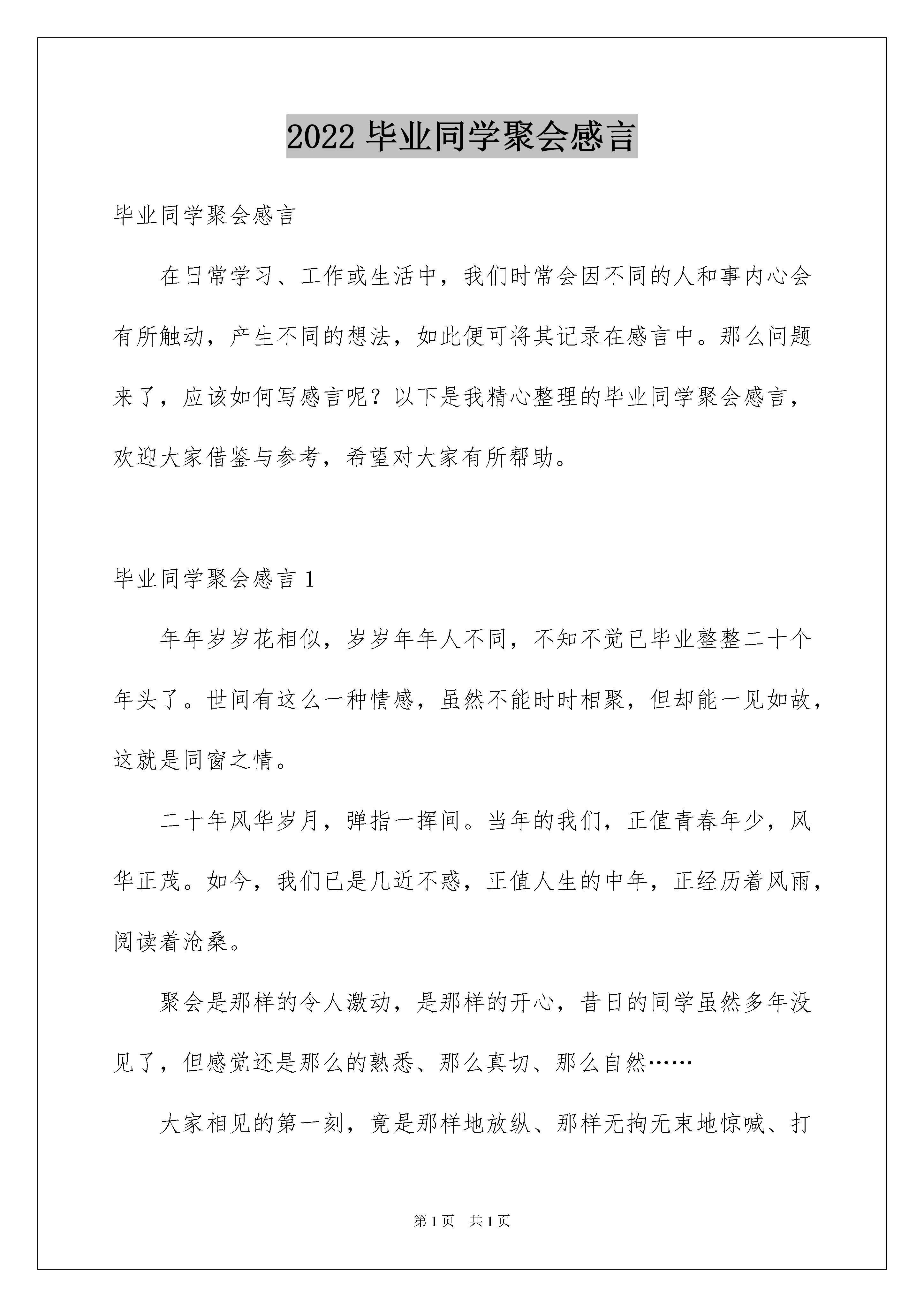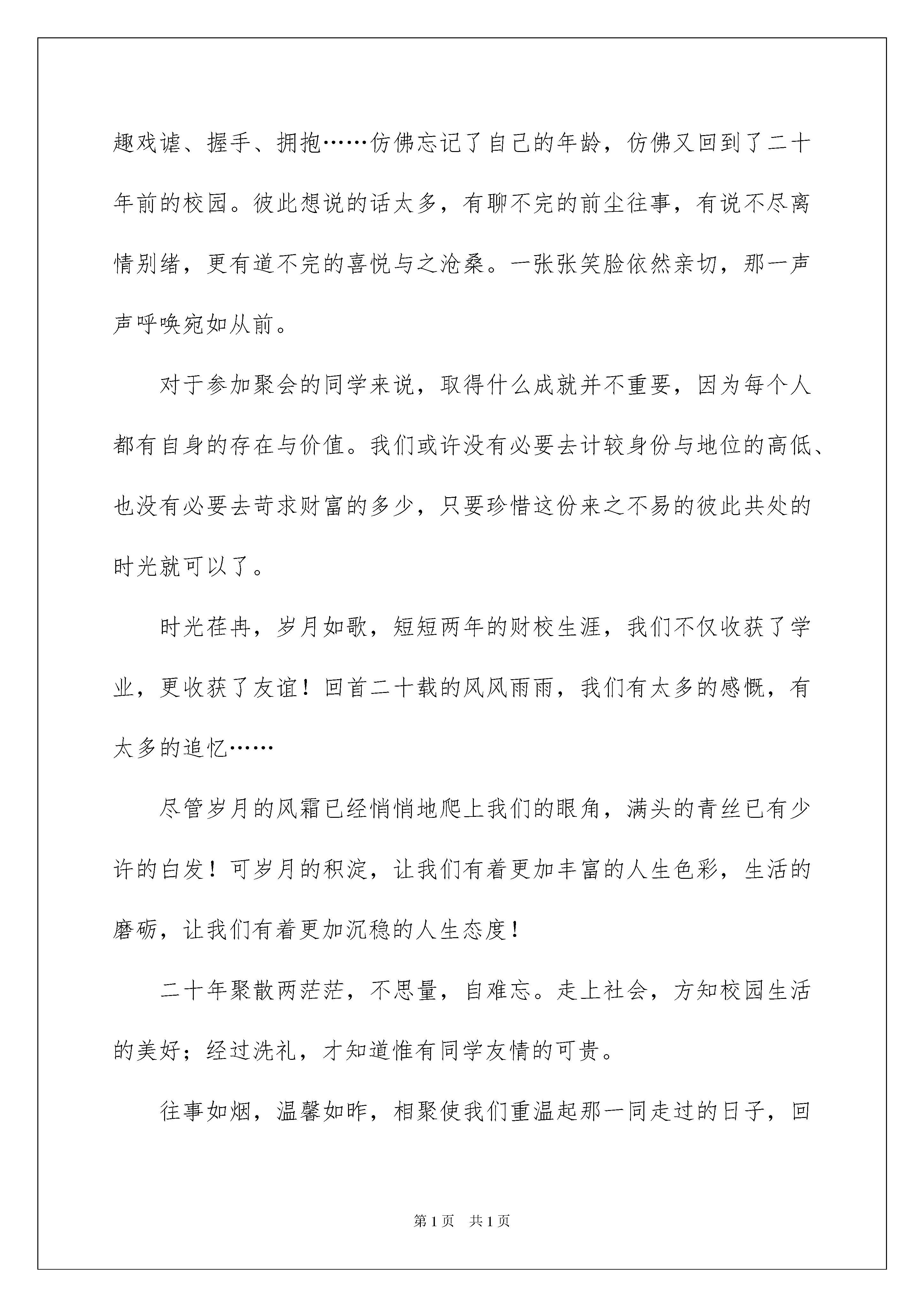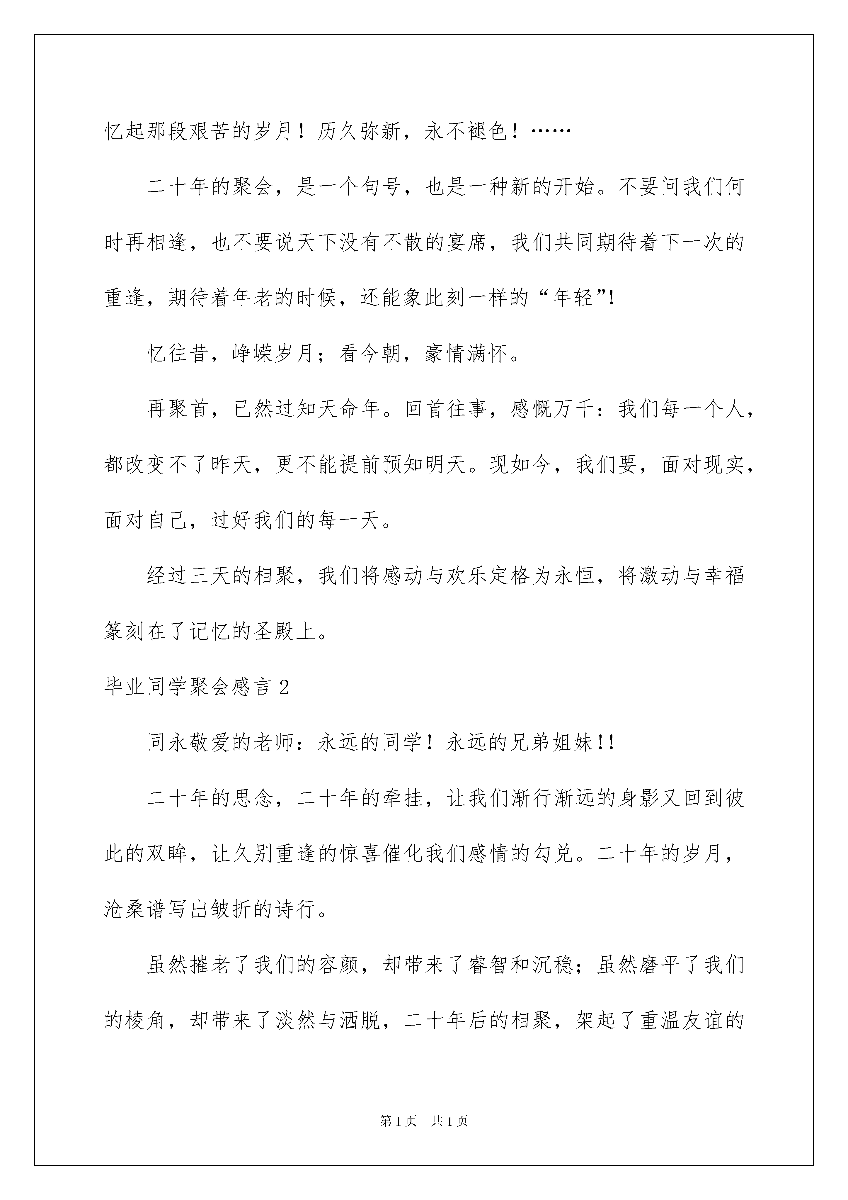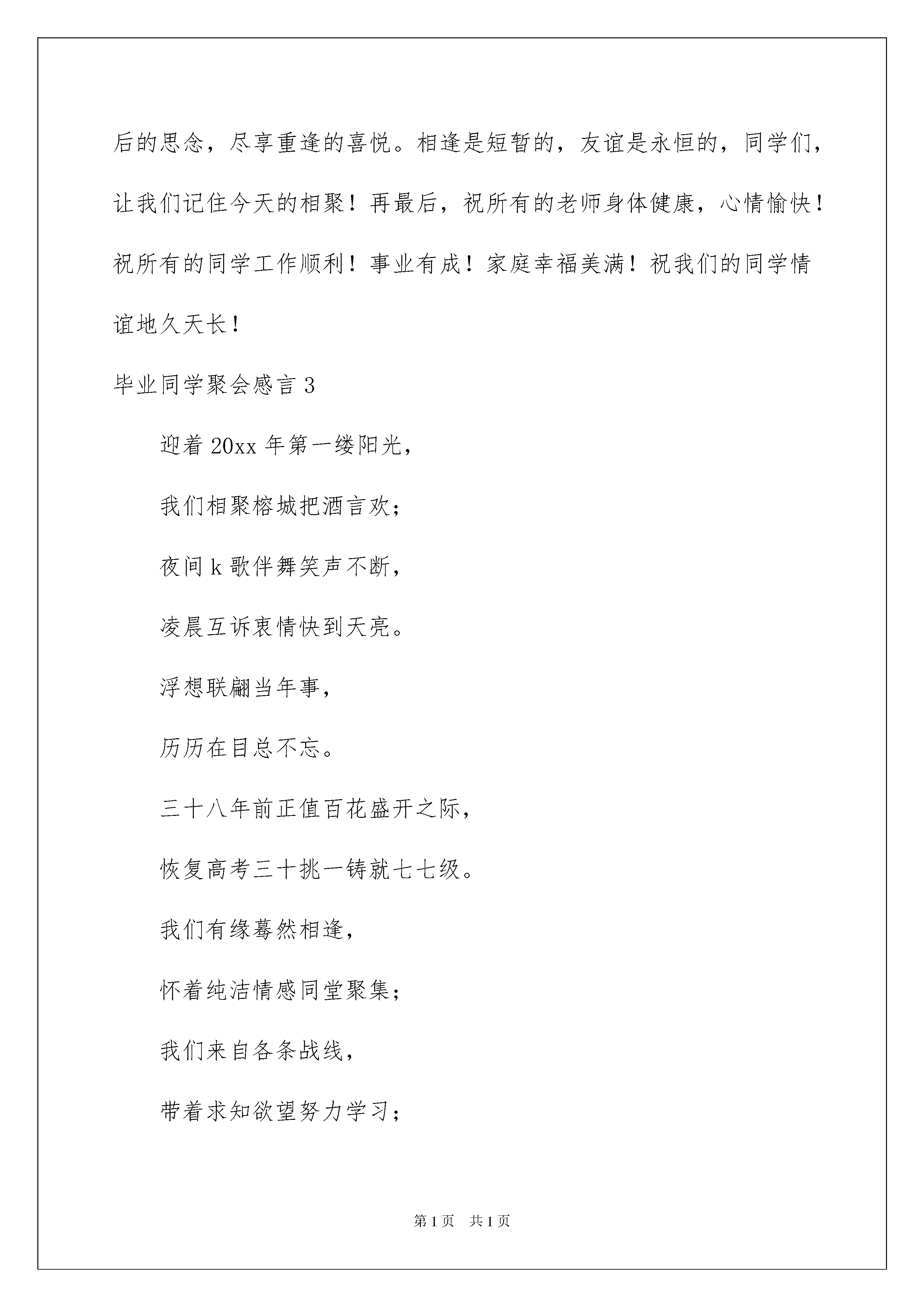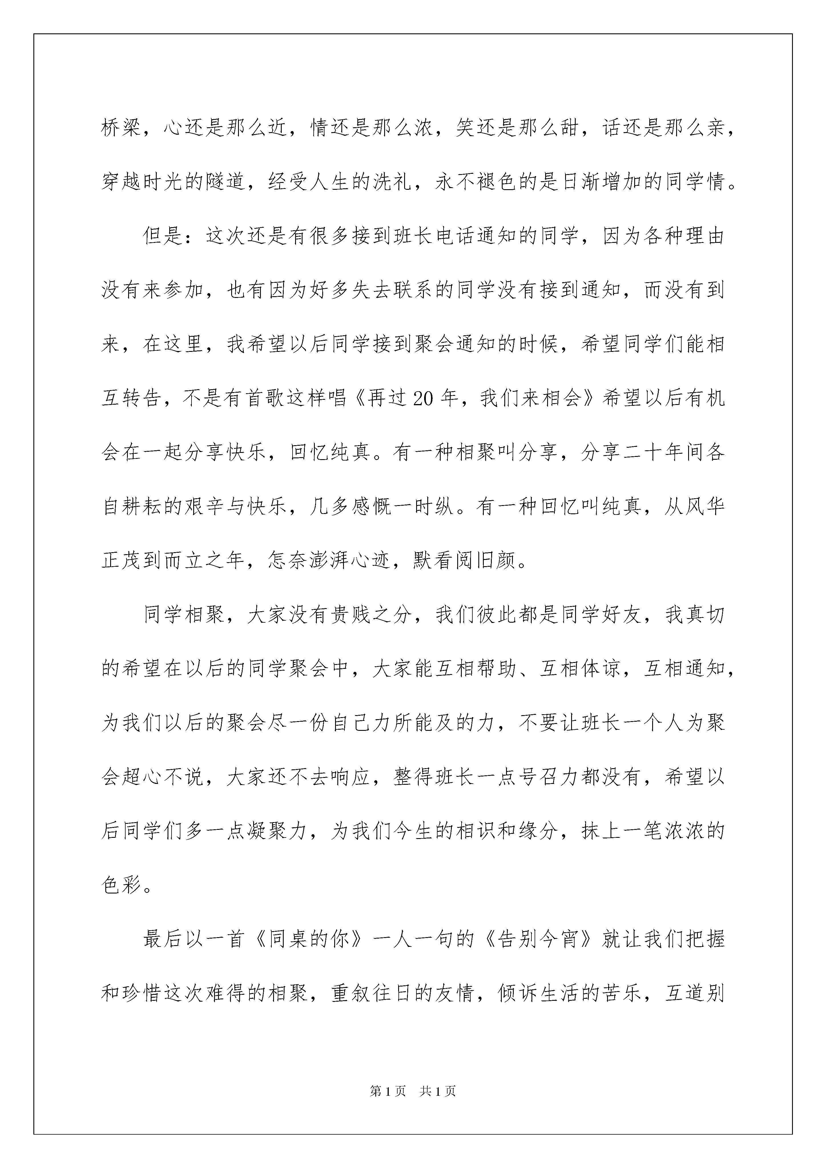 2022毕业同学聚会感言毕业同学聚会感言在日常学习、工作或生活中,我们时常会因不同的人和事内心会有所触动,产生不同的想法,如此便可将其记录在感言中。那么问题来了,应该如何写感言呢?以下是我精心整理的毕业同学聚会感言,欢迎大家借鉴与参考,希望对大家有所帮助。毕业同学聚会感言1年年岁岁花相似,岁岁年年人不同,不知不觉已毕业整整二十个年头了。世间有这么一种情感,虽然不能时时相聚,但却能一见如故,这就是同窗之情。二十年风华岁月,弹指一挥间。当年的我们,正值青春年少,风华正茂。如今,我们已是几近不惑,正值人生的中年,正经历着风雨,阅读着沧桑。聚会是那样的令人激动,是那样的开心,昔日的同学虽然多年没见了,但感觉还是那么的熟悉、那么真切、那么自然……大家相见的第一刻,竟是那样地放纵、那样无拘无束地惊喊、打趣戏谑、握手、拥抱……仿佛忘记了自己的年龄,仿佛又回到了二十年前的校园。彼此想说的话太多,有聊不完的前尘往事,有说不尽离情别绪,更有道不完的喜悦与之沧桑。一张张笑脸依然亲切,那一声声呼唤宛如从前。对于参加聚会的同学来说,取得什么成就并不重要,因为每个人都有自身的存在与价值。我们或许没有必要去计较身份与地位的高低、也没有必要去苛求财富的多少,只要珍惜这份来之不易的彼此共处的时光就可以了。时光荏冉,岁月如歌,短短两年的财校生涯,我们不仅收获了学业,更收获了友谊!回首二十载的风风雨雨,我们有太多的感慨,有太多的追忆……尽管岁月的风霜已经悄悄地爬上我们的眼角,满头的青丝已有少许的白发!可岁月的积淀,让我们有着更加丰富的人生色彩,生活的磨砺,让我们有着更加沉稳的人生态度!二十年聚散两茫茫,不思量,自难忘。走上社会,方知校园生活的美好;经过洗礼,才知道惟有同学友情的可贵。往事如烟,温馨如昨,相聚使我们重温起那一同走过的日子,回忆起那段艰苦的岁月!历久弥新,永不褪色!……二十年的聚会,是一个句号,也是一种新的开始。不要问我们何时再相逢,也不要说天下没有不散的宴席,我们共同期待着下一次的重逢,期待着年老的时候,还能象此刻一样的“年轻”!忆往昔,峥嵘岁月;看今朝,豪情满怀。再聚首,已然过知天命年。回首往事,感慨万千:我们每一个人,都改变不了昨天,更不能提前预知明天。现如今,我们要,面对现实,面对自己,过好我们的每一天。经过三天的相聚,我们将感动与欢乐定格为永恒,将激动与幸福篆刻在了记忆的圣殿上。毕业同学聚会感言2同永敬爱的老师:永远的同学!永远的兄弟姐妹!!二十年的思念,二十年的牵挂,让我们渐行渐远的身影又回到彼此的双眸,让久别重逢的惊喜催化我们感情的勾兑。二十年的岁月,沧桑谱写出皱折的诗行。虽然摧老了我们的容颜,却带来了睿智和沉稳;虽然磨平了我们的棱角,却带来了淡然与洒脱,二十年后的相聚,架起了重温友谊的桥梁,心还是那么近,情还是那么浓,笑还是那么甜,话还是那么亲,穿越时光的隧道,经受人生的洗礼,永不褪色的是日渐增加的同学情。但是:这次还是有很多接到班长电话通知的同学,因为各种理由没有来参加,也有因为好多失去联系的同学没有接到通知,而没有到来,在这里,我希望以后同学接到聚会通知的时候,希望同学们能相互转告,不是有首歌这样唱《再过20年,我们来相会》希望以后有机会在一起分享快乐,回忆纯真。有一种相聚叫分享,分享二十年间各自耕耘的艰辛与快乐,几多感慨一时纵。有一种回忆叫纯真,从风华正茂到而立之年,怎奈澎湃心迹,默看阅旧颜。同学相聚,大家没有贵贱之分,我们彼此都是同学好友,我真切的希望在以后的同学聚会中,大家能互相帮助、互相体谅,互相通知,为我们以后的聚会尽一份自己力所能及的力,不要让班长一个人为聚会超心不说,大家还不去响应,整得班长一点号召力都没有,希望以后同学们多一点凝聚力,为我们今生的相识和缘分,抹上一笔浓浓的色彩。最后以一首《同桌的你》一人一句的《告别今宵》就让我们把握和珍惜这次难得的相聚,重叙往日的友情,倾诉生活的苦乐,互道别后的思念,尽享重逢的喜悦。相逢是短暂的,友谊是永恒的,同学们,让我们记住今天的相聚!再最后,祝所有的老师身体健康,心情愉快!祝所有的同学工作顺利!事业有成!家庭幸福美满!祝我们的同学情谊地久天长!毕业同学聚会感言3迎着20xx年第一缕阳光,我们相聚榕城把酒言欢;夜间k歌伴舞笑声不断,凌晨互诉衷情快到天亮。浮想联翩当年事,历历在目总不忘。三十八年前正值百花盛开之际,恢复高考三十挑一铸就七七级。我们有缘蓦然相逢,怀着纯洁情感同堂聚集;我们来自各条战线,带着求知欲望努力学习;我们年岁相差甚多,为着共同目标相处朝夕;东湖塘畔回荡我们朗朗书声,芭蕉城里留下我们串串足迹;夜以继日刻苦攻关