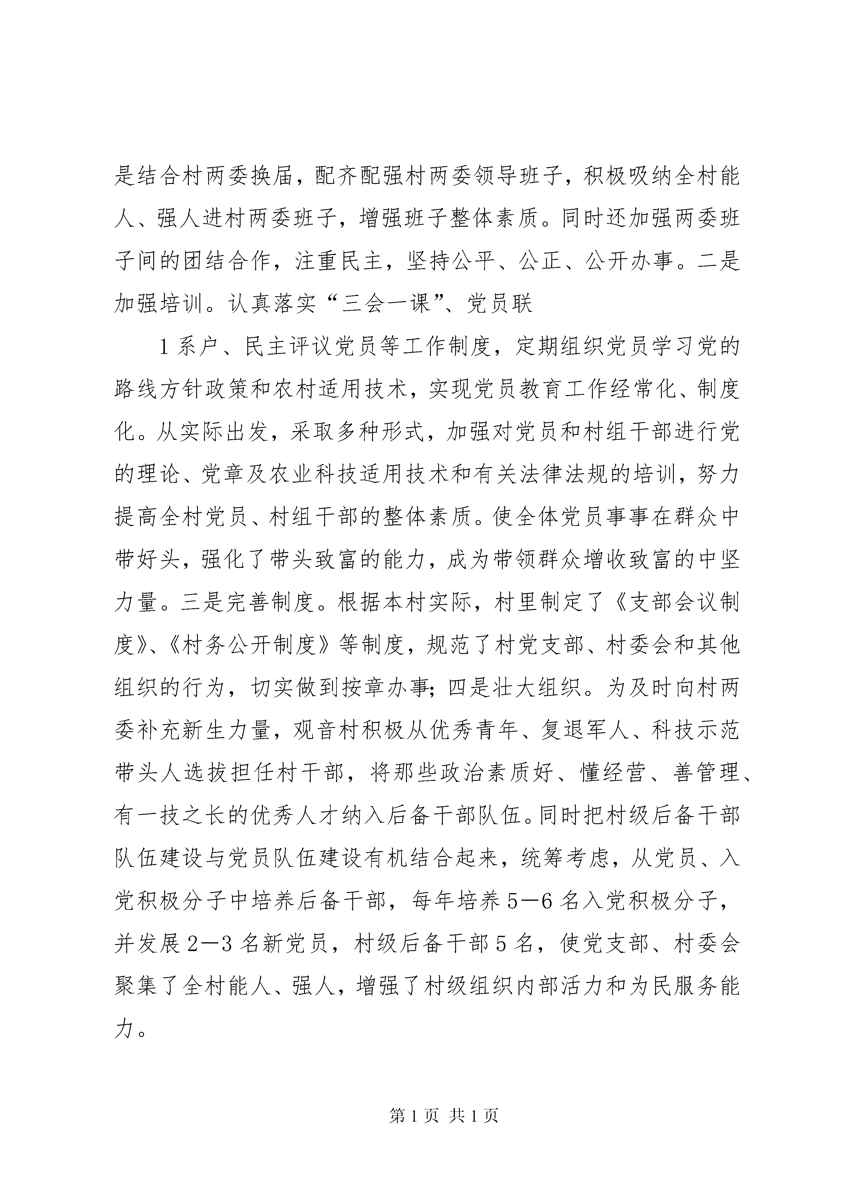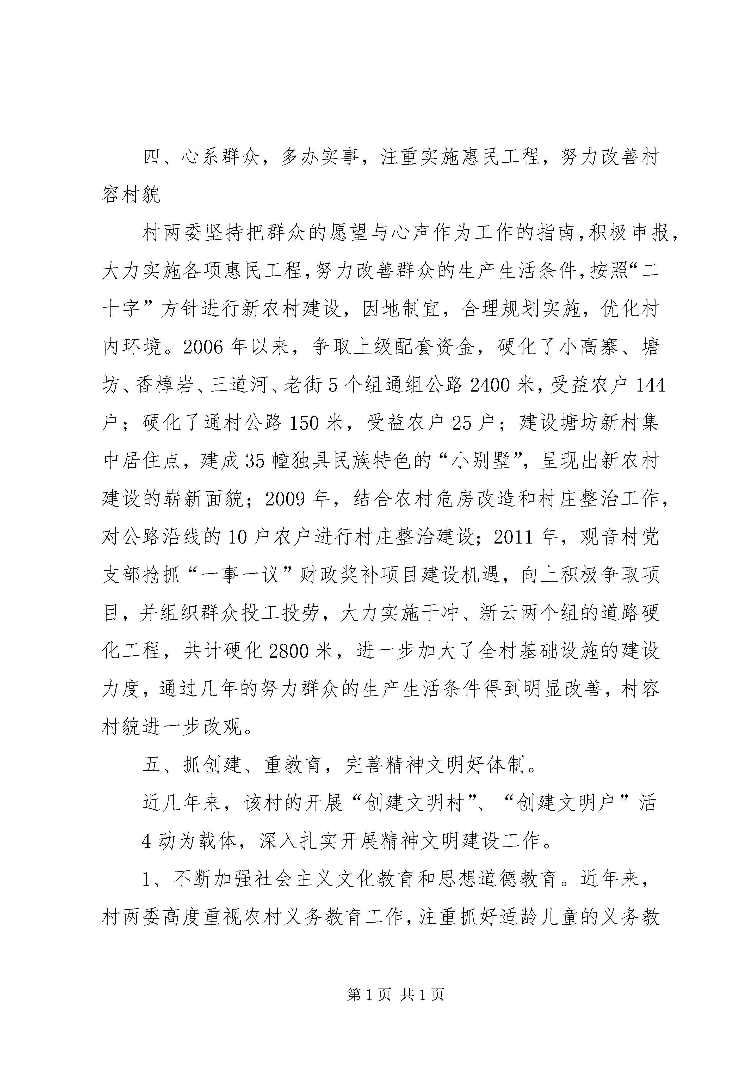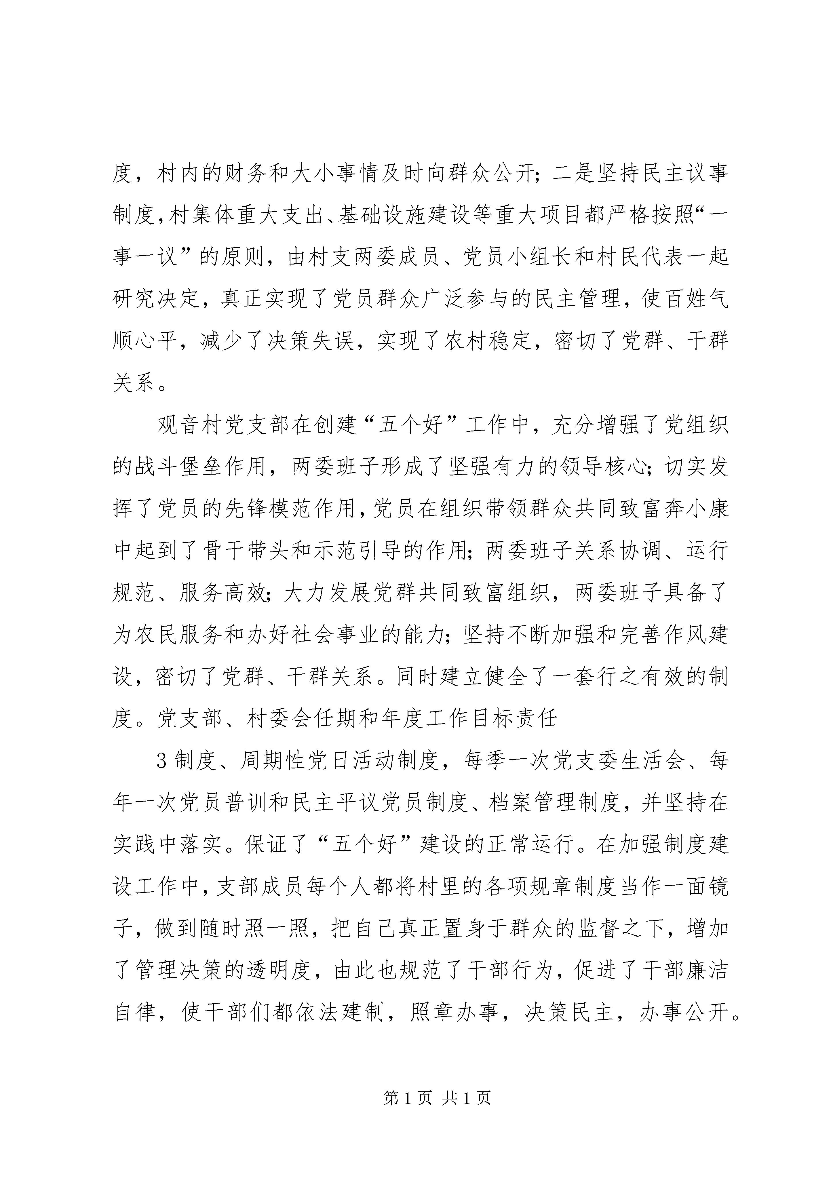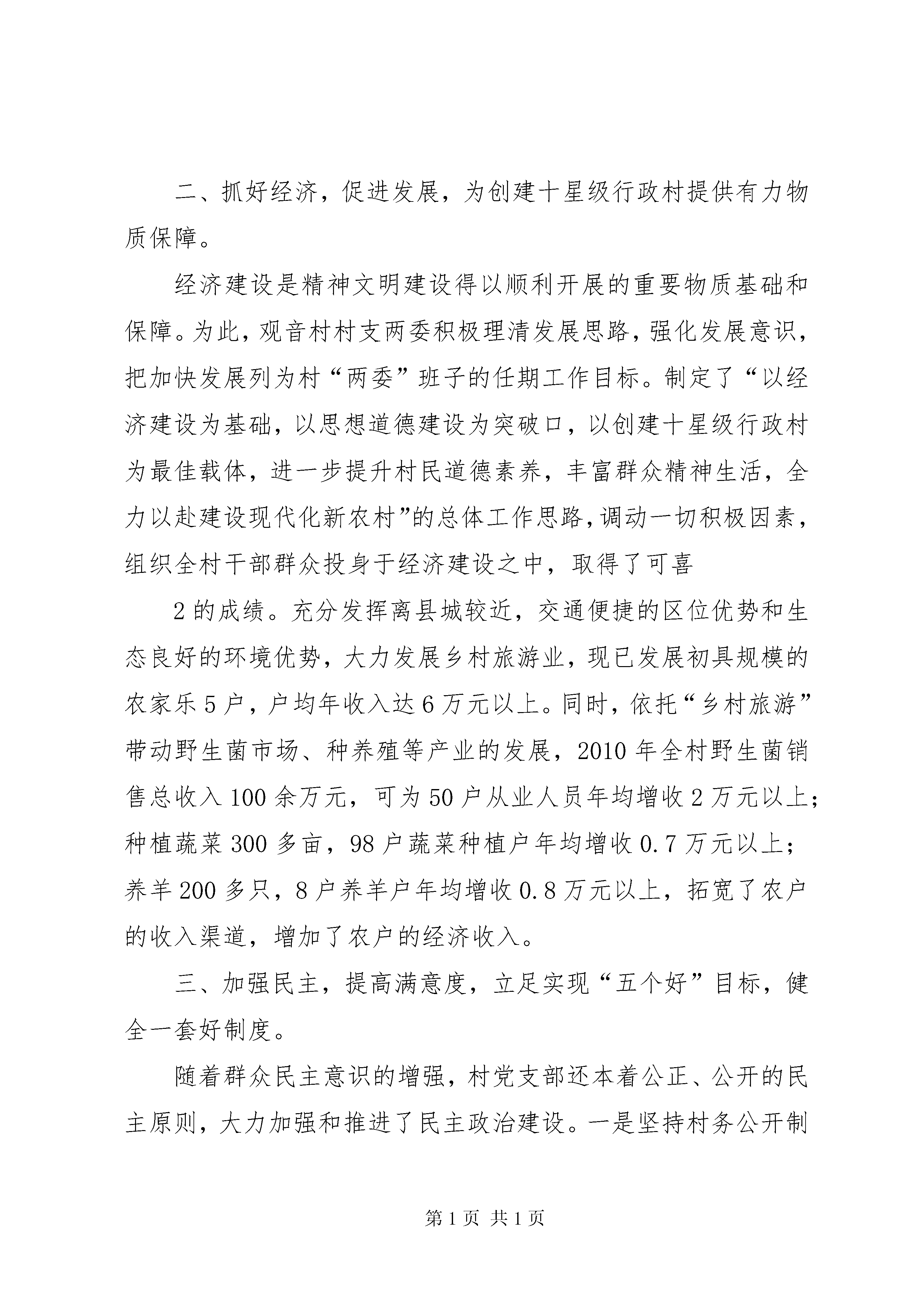 十星级行政村汇报材料谷脚镇观音村创建“十星级行政村”汇报材料观音村位于谷脚镇南部,紧靠210国道,距县城3公里。共辖18个自然村寨、19个村民组,共有554户、2530人,有耕地面积1524亩(其中水田983亩,旱地541亩),以苗族、布依族为主的少数民族人口占总人口的56%。党支部共有党员30名。近年来,观音村在县委、县政府及镇党委、政府的正确领导下,高举邓小平理论的伟大旗帜,努力学习实践科学发展观,解放思想,实事求是,积极开拓,勇于创新,使两个文明建设取得了显著成效,全村呈现出经济发展,村民安居乐业,群众思想健康向上的良好局面。多次被县委、县政府评为“平安创建先进村”、“先进党组织”。现将观音村近年来创建“十星级行政村”的主要工作做如下汇报:一、抓班子带队伍,发挥党支部的战斗堡垒作用和党员的先锋模范作用。加强村两委组织建设,是开展好村级各项工作的基础。近年来,观音村村两委非常注重组织建设。首先按照“五个好”要求,抓好支部班子自身建设,团结一致,不断进取,建立健全各级组织和规章制度,支部一班人紧紧围绕在党支部周围,齐心协力,充分发挥了党支部的战斗堡垒作用,在广大党员、群众中树立了良好的形象,因此,使村支部极具号召力、凝聚力和战斗力。一是结合村两委换届,配齐配强村两委领导班子,积极吸纳全村能人、强人进村两委班子,增强班子整体素质。同时还加强两委班子间的团结合作,注重民主,坚持公平、公正、公开办事。二是加强培训。认真落实“三会一课”、党员联1系户、民主评议党员等工作制度,定期组织党员学习党的路线方针政策和农村适用技术,实现党员教育工作经常化、制度化。从实际出发,采取多种形式,加强对党员和村组干部进行党的理论、党章及农业科技适用技术和有关法律法规的培训,努力提高全村党员、村组干部的整体素质。使全体党员事事在群众中带好头,强化了带头致富的能力,成为带领群众增收致富的中坚力量。三是完善制度。根据本村实际,村里制定了《支部会议制度》、《村务公开制度》等制度,规范了村党支部、村委会和其他组织的行为,切实做到按章办事;四是壮大组织。为及时向村两委补充新生力量,观音村积极从优秀青年、复退军人、科技示范带头人选拔担任村干部,将那些政治素质好、懂经营、善管理、有一技之长的优秀人才纳入后备干部队伍。同时把村级后备干部队伍建设与党员队伍建设有机结合起来,统筹考虑,从党员、入党积极分子中培养后备干部,每年培养5-6名入党积极分子,并发展2-3名新党员,村级后备干部5名,使党支部、村委会聚集了全村能人、强人,增强了村级组织内部活力和为民服务能力。二、抓好经济,促进发展,为创建十星级行政村提供有力物质保障。经济建设是精神文明建设得以顺利开展的重要物质基础和保障。为此,观音村村支两委积极理清发展思路,强化发展意识,把加快发展列为村“两委”班子的任期工作目标。制定了“以经济建设为基础,以思想道德建设为突破口,以创建十星级行政村为最佳载体,进一步提升村民道德素养,丰富群众精神生活,全力以赴建设现代化新农村”的总体工作思路,调动一切积极因素,组织全村干部群众投身于经济建设之中,取得了可喜2的成绩。充分发挥离县城较近,交通便捷的区位优势和生态良好的环境优势,大力发展乡村旅游业,现已发展初具规模的农家乐5户,户均年收入达6万元以上。同时,依托“乡村旅游”带动野生菌市场、种养殖等产业的发展,2010年全村野生菌销售总收入100余万元,可为50户从业人员年均增收2万元以上;种植蔬菜300多亩,98户蔬菜种植户年均增收0.7万元以上;养羊200多只,8户养羊户年均增收0.8万元以上,拓宽了农户的收入渠道,增加了农户的经济收入。三、加强民主,提高满意度,立足实现“五个好”目标,健全一套好制度。随着群众民主意识的增强,村党支部还本着公正、公开的民主原则,大力加强和推进了民主政治建设。一是坚持村务公开制度,村内的财务和大小事情及时向群众公开;二是坚持民主议事制度,村集体重大支出、基础设施建设等重大项目都严格按照“一事一议”的原则,由村支两委成员、党员小组长和村民代表一起研究决定,真正实现了党员群众广泛参与的民主管理,使百姓气顺心平,减少了决策失误,实现了农村稳定,密切了党群、干群关系。观音村党支部在创建“五个好”工作中,充分增强了党组织的战斗堡垒作用,两委班子形成了坚强有力的领导核心;切实发挥了党员的先锋模范作用,党员在组织带领群众共同致富奔小康中起到了骨干带头和示范引导的作用;两委班子关系协调、运行规范、服务高效;大力发展党群共同致富组织,两委班子具备了为农民服务和办好社会事业的能力;坚持不断加强和完善作风建设,密切了党群、干群关系。同时建立健全了一套行之有效的制度。党支部、村委会任期和年度工作目标责任3制度、周期性党日活动制度,每季一次党支委生活会、