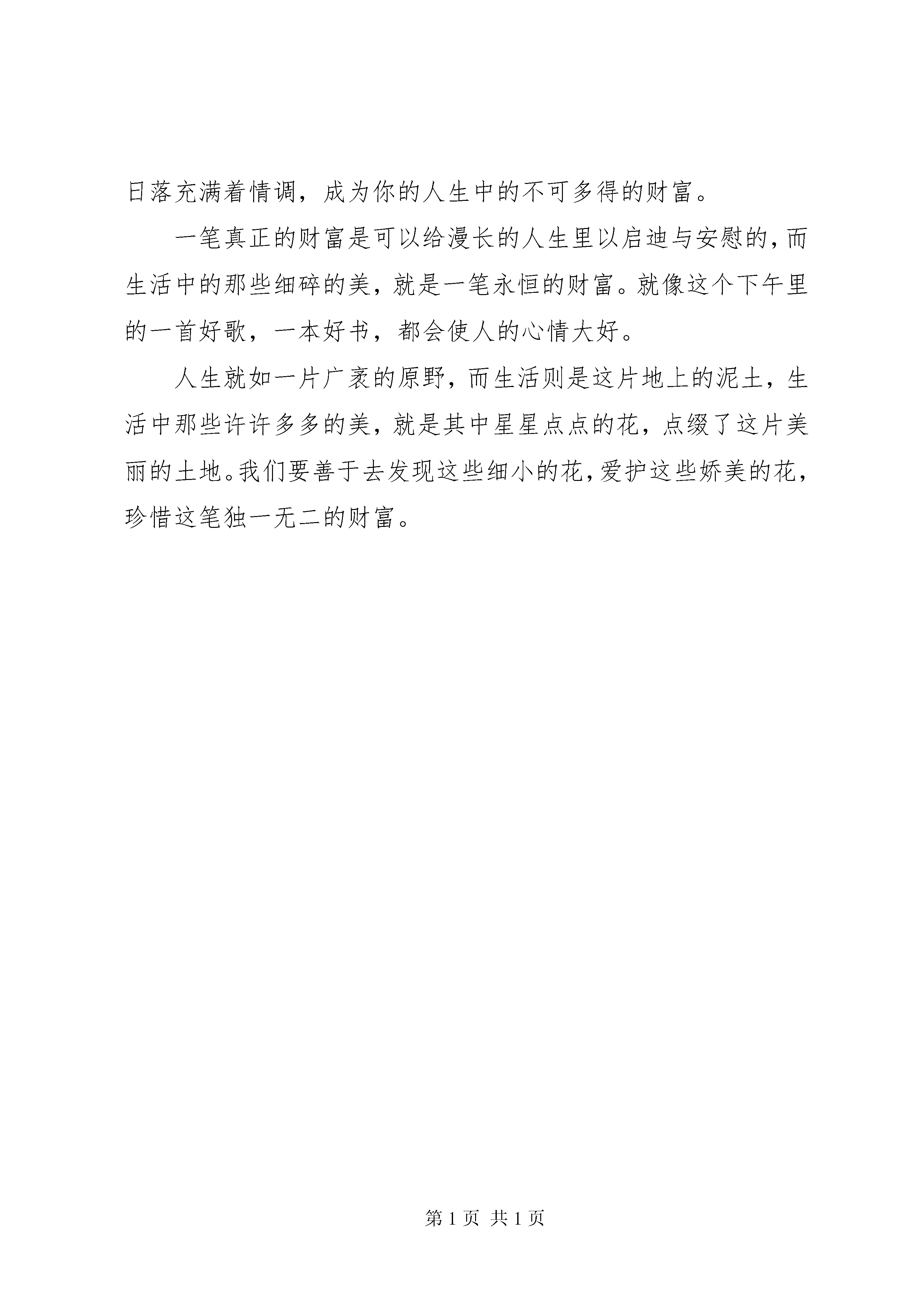 十大学星演讲稿:亦动亦静,学之境也又是一个百无聊赖的星期天下午,细碎的阳光像饼干屑一样,漫不经心地撒了一地,暖阳透过树梢零零星星的枝丫,如樱花般缓缓飘逝。而这明媚的下午似乎与我的烦闷格格不入。adele忧伤而又略显沙哑的嗓音从耳机里淌出,恰到好处却又是不经意间的伤感扣人心弦,若即若离而又挥之不去,一种散漫感蔓延开来……周末莫过于所有学生的“梦中情人”,好好的一个周末,我居然找不到些许感兴趣的事情做,无聊之余又不想让周末白白浪费,可就在我郁闷之时时间就过去了,无奈之下,我便手拿起了一本书。打开书,一股清香的油墨味扑鼻而来,目光游走在优美的字里行间,就像行走在无边的草原,草色温柔地蔓延到远方,离离野花烂漫地燃烧到天边,柔软的云装点着寂寞的苍穹,我甚至闻到了薰衣草浓郁的花香,在鼻腔来回游荡,就如杂技演员在向他人展示她优美的舞姿。我不可自拔的沉湎于书中,清新的文字犹如淌于心间的清泉。我用指尖触碰着一个个形如鲜活的文字,在心中细细摸索,午后的轻风调皮地游走着,舒适的阳光温度恰好,我突然感觉世界如同一片静谧而又温暖的海洋,而我则是一个孤单却不寂寞的小岛,任海浪轻拍着沙滩,沉浸在了自己心中的一片世外桃源。就这样,我翻过一张张书页,时间便如此温柔而又不动声色地溜走了。放下书本,揉揉看得酸胀的眼,我发现现在的心情平静而又微微洋溢着一种莫名的喜悦。透过阳台的纱窗帘往外看,这个原本单调而无趣的星期天下午突然显得格外可爱。而就在这个静谧而又美好的一个小小的瞬间里,我的脑子里忽然蹦出了一个问题,这些令人愉悦却又不起眼的东西,究竟是什么呢。我想,这些应该是生活中的琐碎小事中,或多或少地沉淀着的美吧。生活中的美并非我们想象中的那么与众不同抑或轰轰烈烈,它没有剔透的钻石的那般完美,不像飞蛾扑火的那般壮烈,生活中的美很简单,很纯粹,像一杯淡淡的清茶,淡雅而又馥郁芬芳,清新而又韵味犹存。而生活中这些天然而又不加修饰的美,则是一笔在漫长的人生道路中,不可多得的财富。然而,在这个瞬息万变的摩登时代里,城市犹如一台高速运转的机器,四处都是一派忙碌而繁华的气息。而财富这个词,或多或少地被尘世修改了它原有的意思,一提起财富,也许心中的第一反应就是金钱,名誉,权利……的确,这些都是财富,但它们不能完全的释义财富。金钱于名誉这些东西只是它小小的一部分,而真正且有价值的财富,是永恒的。生活中的这些细节美,就是一笔真正的财富,它们就像是平凡生活中的调味品,让你更加的珍惜生活,热爱生活,使你生活中的无数个平淡无奇的日出日落充满着情调,成为你的人生中的不可多得的财富。一笔真正的财富是可以给漫长的人生里以启迪与安慰的,而生活中的那些细碎的美,就是一笔永恒的财富。就像这个下午里的一首好歌,一本好书,都会使人的心情大好。人生就如一片广袤的原野,而生活则是这片地上的泥土,生活中那些许许多多的美,就是其中星星点点的花,点缀了这片美丽的土地。我们要善于去发现这些细小的花,爱护这些娇美的花,珍惜这笔独一无二的财富。