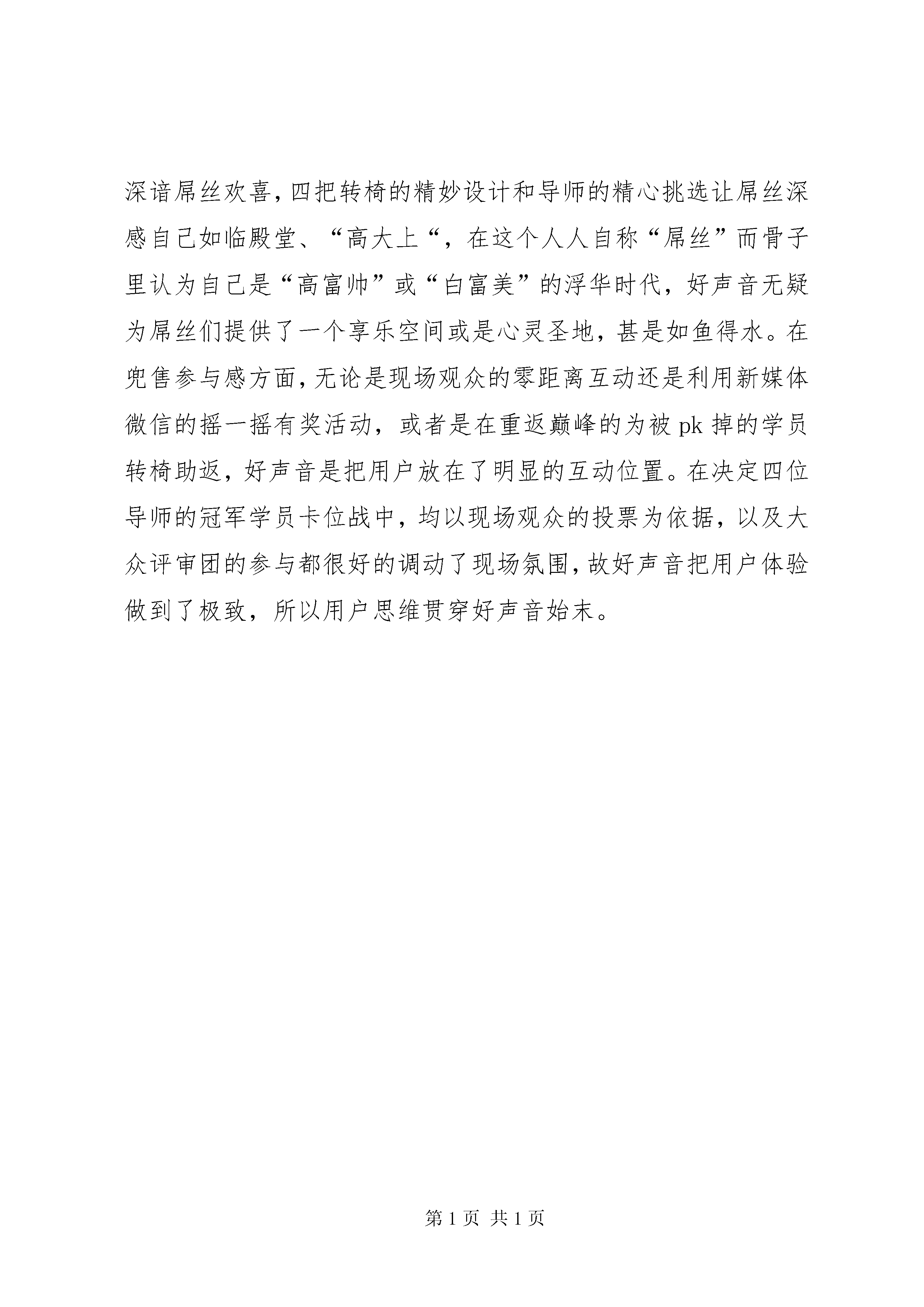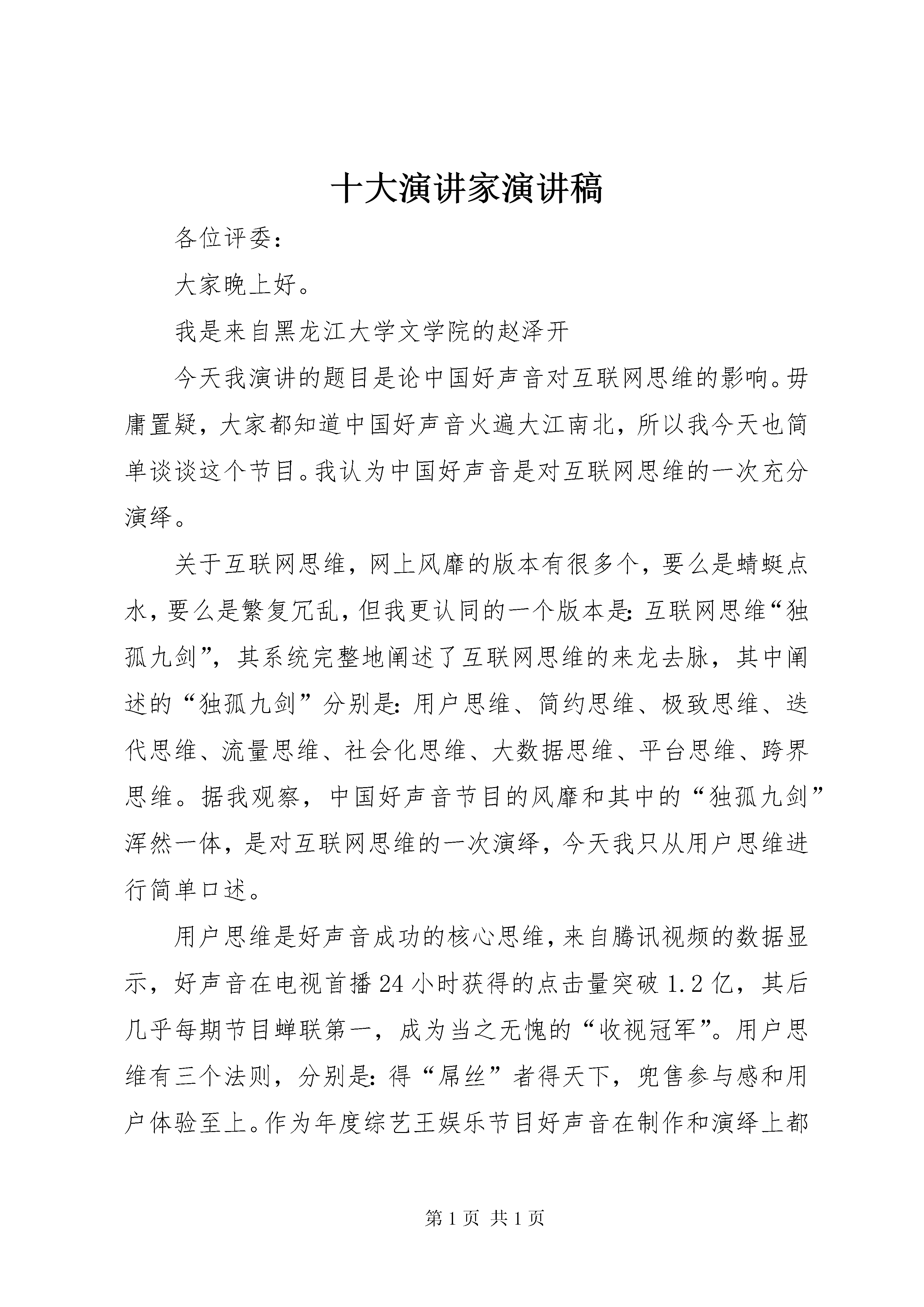 十大演讲家演讲稿各位评委:大家晚上好。我是来自黑龙江大学文学院的赵泽开今天我演讲的题目是论中国好声音对互联网思维的影响。毋庸置疑,大家都知道中国好声音火遍大江南北,所以我今天也简单谈谈这个节目。我认为中国好声音是对互联网思维的一次充分演绎。关于互联网思维,网上风靡的版本有很多个,要么是蜻蜓点水,要么是繁复冗乱,但我更认同的一个版本是:互联网思维“独孤九剑”,其系统完整地阐述了互联网思维的来龙去脉,其中阐述的“独孤九剑”分别是:用户思维、简约思维、极致思维、迭代思维、流量思维、社会化思维、大数据思维、平台思维、跨界思维。据我观察,中国好声音节目的风靡和其中的“独孤九剑”浑然一体,是对互联网思维的一次演绎,今天我只从用户思维进行简单口述。用户思维是好声音成功的核心思维,来自腾讯视频的数据显示,好声音在电视首播24小时获得的点击量突破1.2亿,其后几乎每期节目蝉联第一,成为当之无愧的“收视冠军”。用户思维有三个法则,分别是:得“屌丝”者得天下,兜售参与感和用户体验至上。作为年度综艺王娱乐节目好声音在制作和演绎上都深谙屌丝欢喜,四把转椅的精妙设计和导师的精心挑选让屌丝深感自己如临殿堂、“高大上“,在这个人人自称“屌丝”而骨子里认为自己是“高富帅”或“白富美”的浮华时代,好声音无疑为屌丝们提供了一个享乐空间或是心灵圣地,甚是如鱼得水。在兜售参与感方面,无论是现场观众的零距离互动还是利用新媒体微信的摇一摇有奖活动,或者是在重返巅峰的为被pk掉的学员转椅助返,好声音是把用户放在了明显的互动位置。在决定四位导师的冠军学员卡位战中,均以现场观众的投票为依据,以及大众评审团的参与都很好的调动了现场氛围,故好声音把用户体验做到了极致,所以用户思维贯穿好声音始末。