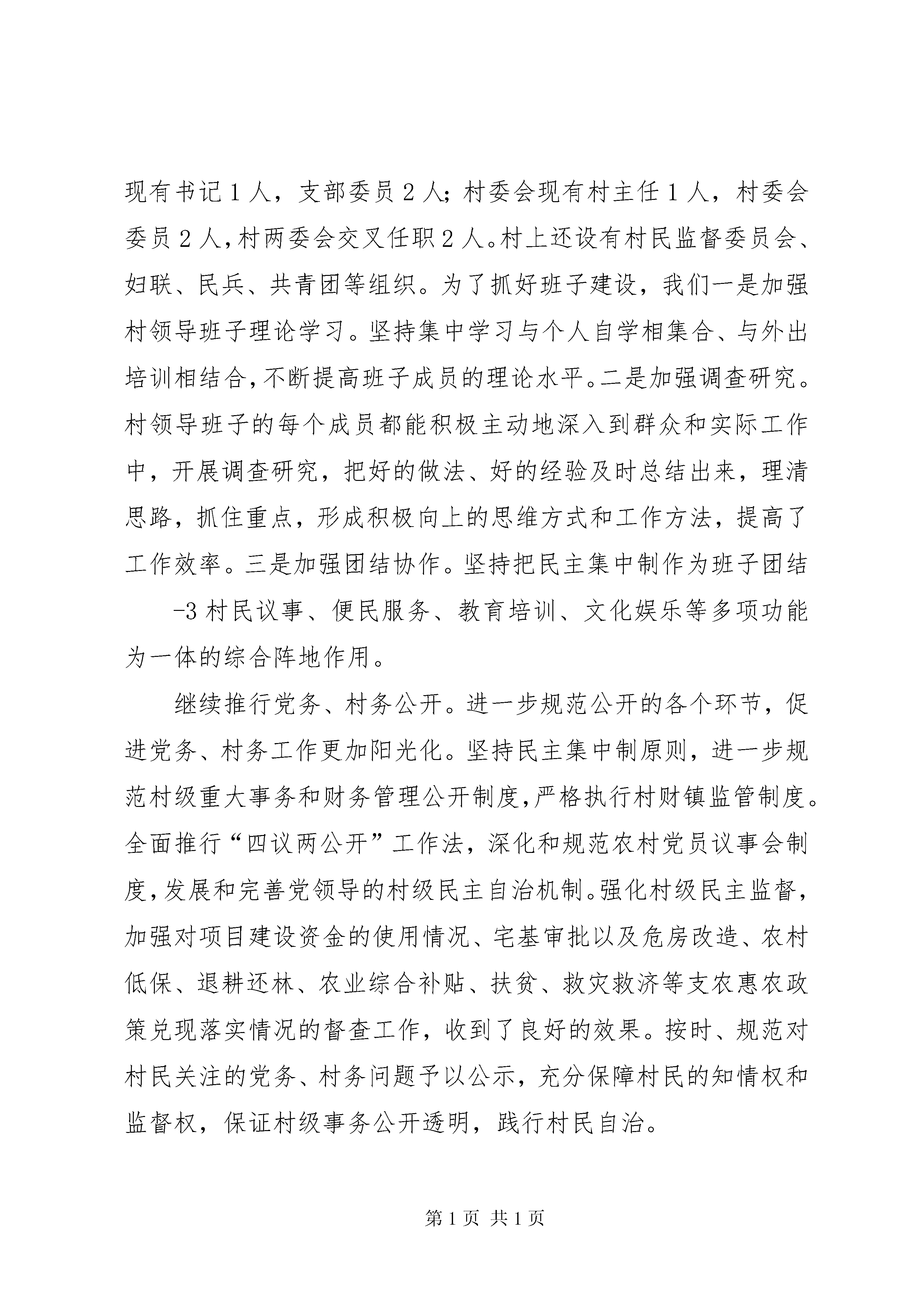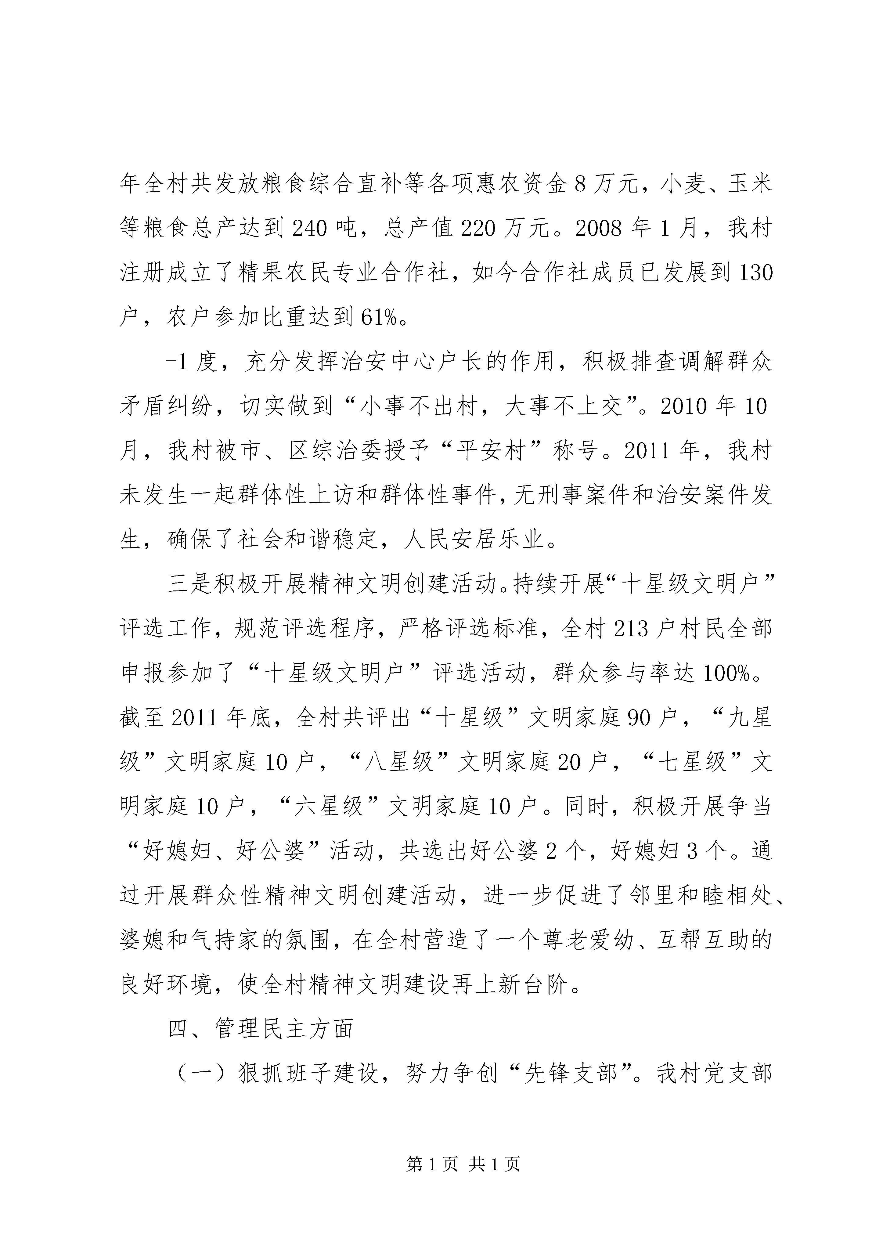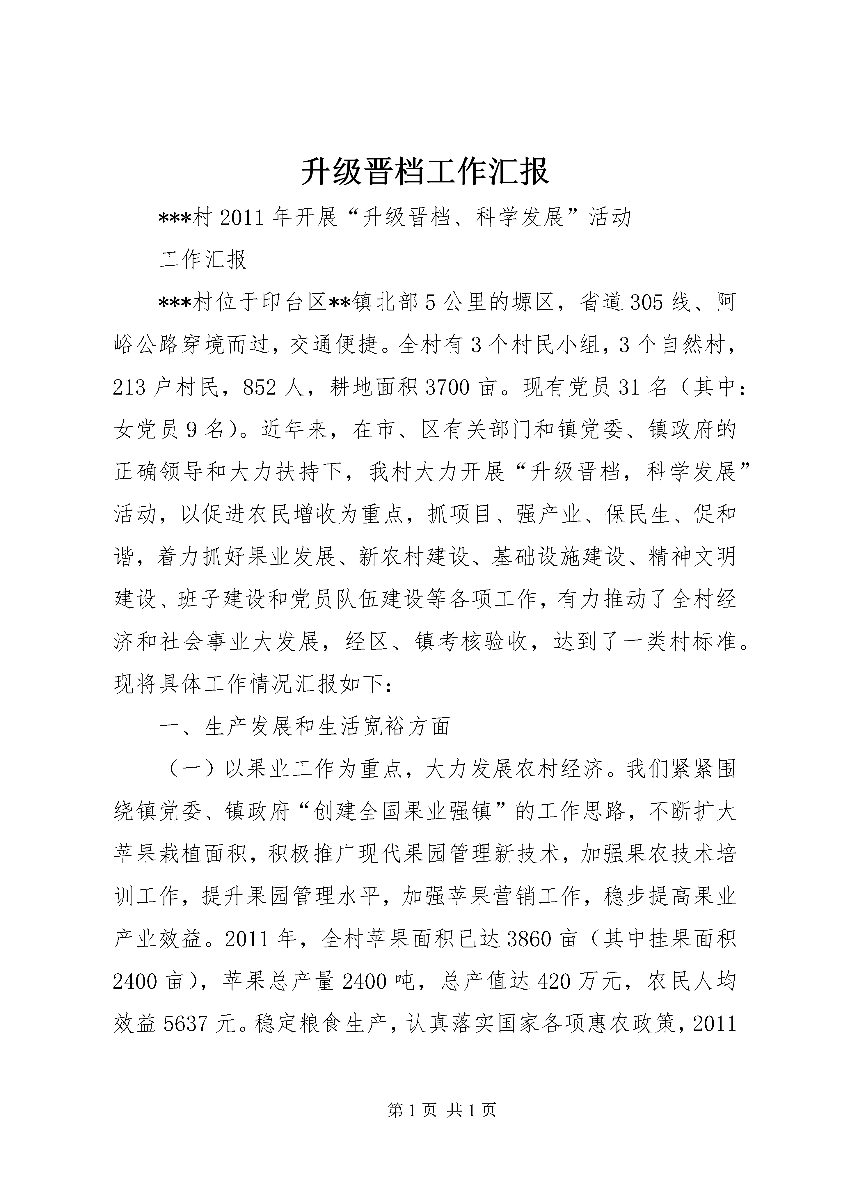 升级晋档工作汇报***村2011年开展“升级晋档、科学发展”活动工作汇报***村位于印台区**镇北部5公里的塬区,省道305线、阿峪公路穿境而过,交通便捷。全村有3个村民小组,3个自然村,213户村民,852人,耕地面积3700亩。现有党员31名(其中:女党员9名)。近年来,在市、区有关部门和镇党委、镇政府的正确领导和大力扶持下,我村大力开展“升级晋档,科学发展”活动,以促进农民增收为重点,抓项目、强产业、保民生、促和谐,着力抓好果业发展、新农村建设、基础设施建设、精神文明建设、班子建设和党员队伍建设等各项工作,有力推动了全村经济和社会事业大发展,经区、镇考核验收,达到了一类村标准。现将具体工作情况汇报如下:一、生产发展和生活宽裕方面(一)以果业工作为重点,大力发展农村经济。我们紧紧围绕镇党委、镇政府“创建全国果业强镇”的工作思路,不断扩大苹果栽植面积,积极推广现代果园管理新技术,加强果农技术培训工作,提升果园管理水平,加强苹果营销工作,稳步提高果业产业效益。2011年,全村苹果面积已达3860亩(其中挂果面积2400亩),苹果总产量2400吨,总产值达420万元,农民人均效益5637元。稳定粮食生产,认真落实国家各项惠农政策,2011年全村共发放粮食综合直补等各项惠农资金8万元,小麦、玉米等粮食总产达到240吨,总产值220万元。2008年1月,我村注册成立了精果农民专业合作社,如今合作社成员已发展到130户,农户参加比重达到61%。-1度,充分发挥治安中心户长的作用,积极排查调解群众矛盾纠纷,切实做到“小事不出村,大事不上交”。2010年10月,我村被市、区综治委授予“平安村”称号。2011年,我村未发生一起群体性上访和群体性事件,无刑事案件和治安案件发生,确保了社会和谐稳定,人民安居乐业。三是积极开展精神文明创建活动。持续开展“十星级文明户”评选工作,规范评选程序,严格评选标准,全村213户村民全部申报参加了“十星级文明户”评选活动,群众参与率达100%。截至2011年底,全村共评出“十星级”文明家庭90户,“九星级”文明家庭10户,“八星级”文明家庭20户,“七星级”文明家庭10户,“六星级”文明家庭10户。同时,积极开展争当“好媳妇、好公婆”活动,共选出好公婆2个,好媳妇3个。通过开展群众性精神文明创建活动,进一步促进了邻里和睦相处、婆媳和气持家的氛围,在全村营造了一个尊老爱幼、互帮互助的良好环境,使全村精神文明建设再上新台阶。四、管理民主方面(一)狠抓班子建设,努力争创“先锋支部”。我村党支部现有书记1人,支部委员2人;村委会现有村主任1人,村委会委员2人,村两委会交叉任职2人。村上还设有村民监督委员会、妇联、民兵、共青团等组织。为了抓好班子建设,我们一是加强村领导班子理论学习。坚持集中学习与个人自学相集合、与外出培训相结合,不断提高班子成员的理论水平。二是加强调查研究。村领导班子的每个成员都能积极主动地深入到群众和实际工作中,开展调查研究,把好的做法、好的经验及时总结出来,理清思路,抓住重点,形成积极向上的思维方式和工作方法,提高了工作效率。三是加强团结协作。坚持把民主集中制作为班子团结-3村民议事、便民服务、教育培训、文化娱乐等多项功能为一体的综合阵地作用。继续推行党务、村务公开。进一步规范公开的各个环节,促进党务、村务工作更加阳光化。坚持民主集中制原则,进一步规范村级重大事务和财务管理公开制度,严格执行村财镇监管制度。全面推行“四议两公开”工作法,深化和规范农村党员议事会制度,发展和完善党领导的村级民主自治机制。强化村级民主监督,加强对项目建设资金的使用情况、宅基审批以及危房改造、农村低保、退耕还林、农业综合补贴、扶贫、救灾救济等支农惠农政策兑现落实情况的督查工作,收到了良好的效果。按时、规范对村民关注的党务、村务问题予以公示,充分保障村民的知情权和监督权,保证村级事务公开透明,践行村民自治。回顾一年来的工作,我们虽然取得了一定的成绩,但离上级党委、政府的要求和群众的愿望还有不小的差距。在今后的工作中,我们要高举中国特色社会主义伟大旗帜,以邓小平理论和“三个代表”重要思想为指导,团结一致,扎实工作,落实科学发展观,以增加农民收入、促进科学发展为目标,建设富裕、文明、和谐的社会主义新农村。***村党支部2012年2月27日-5-