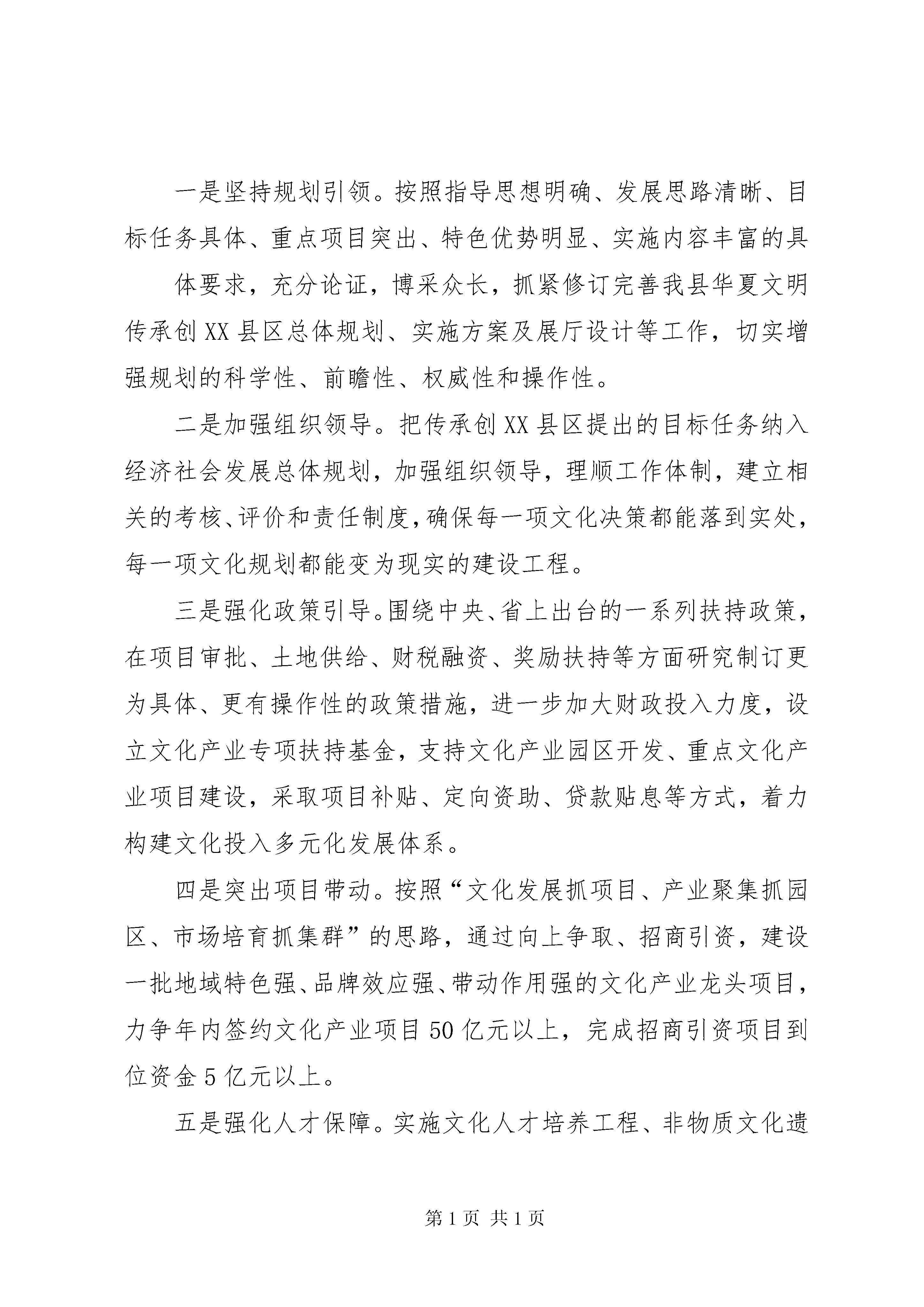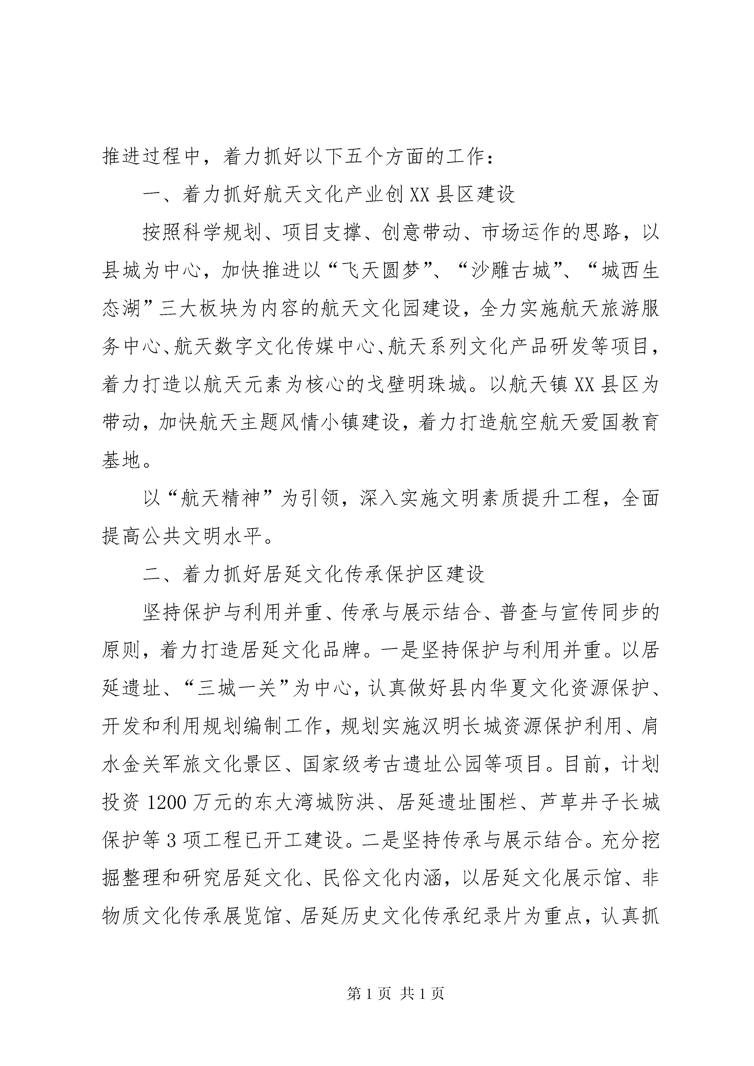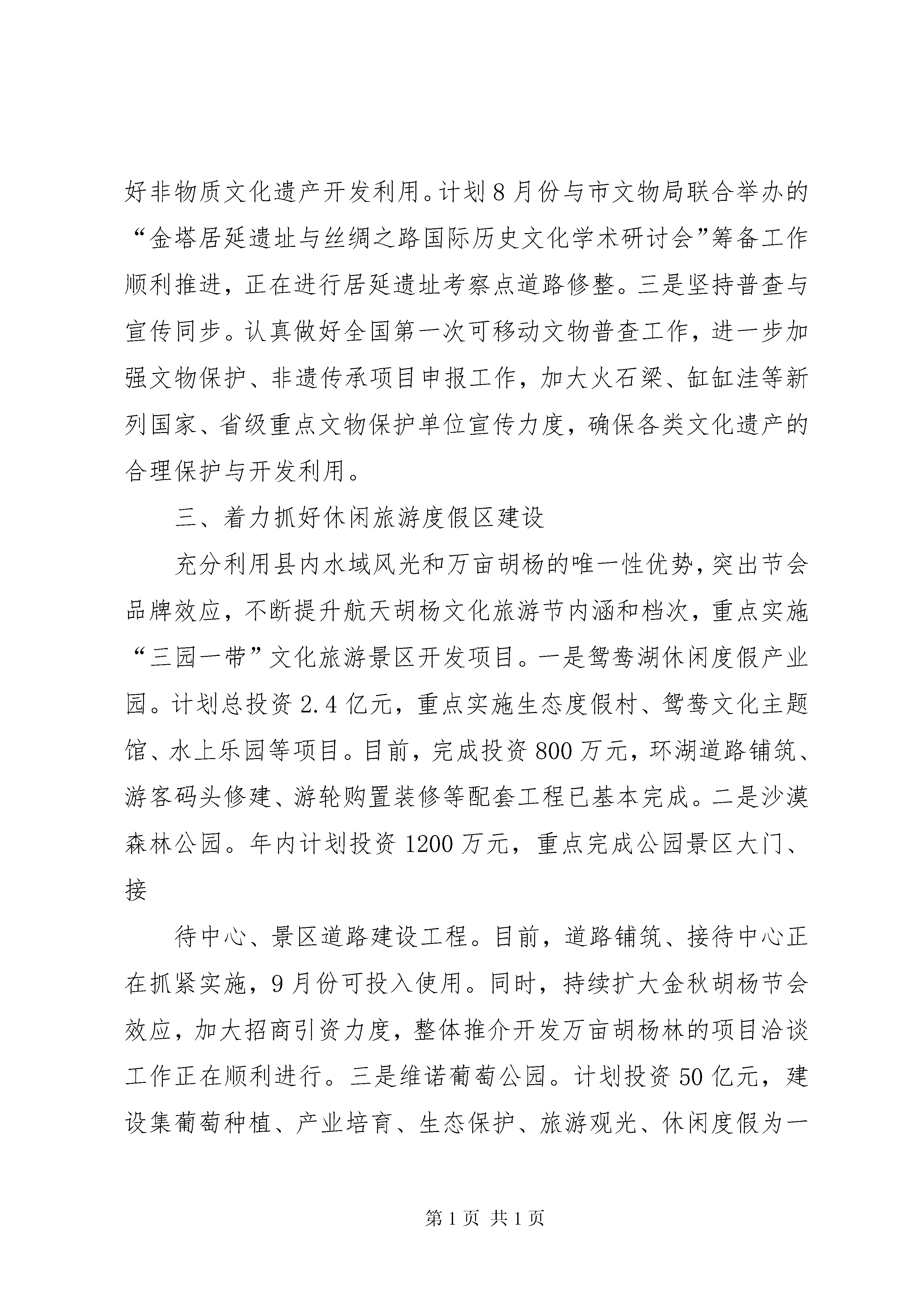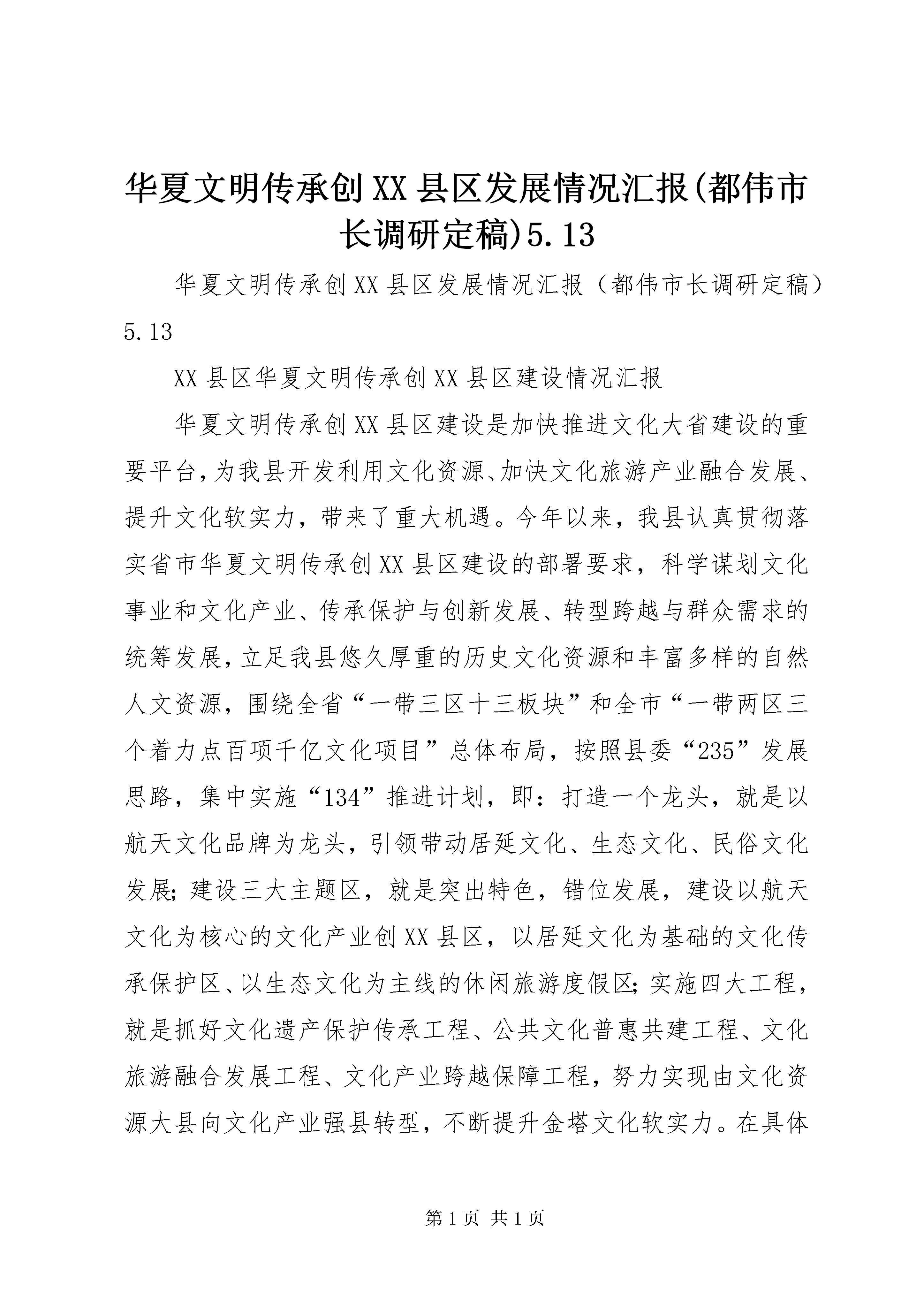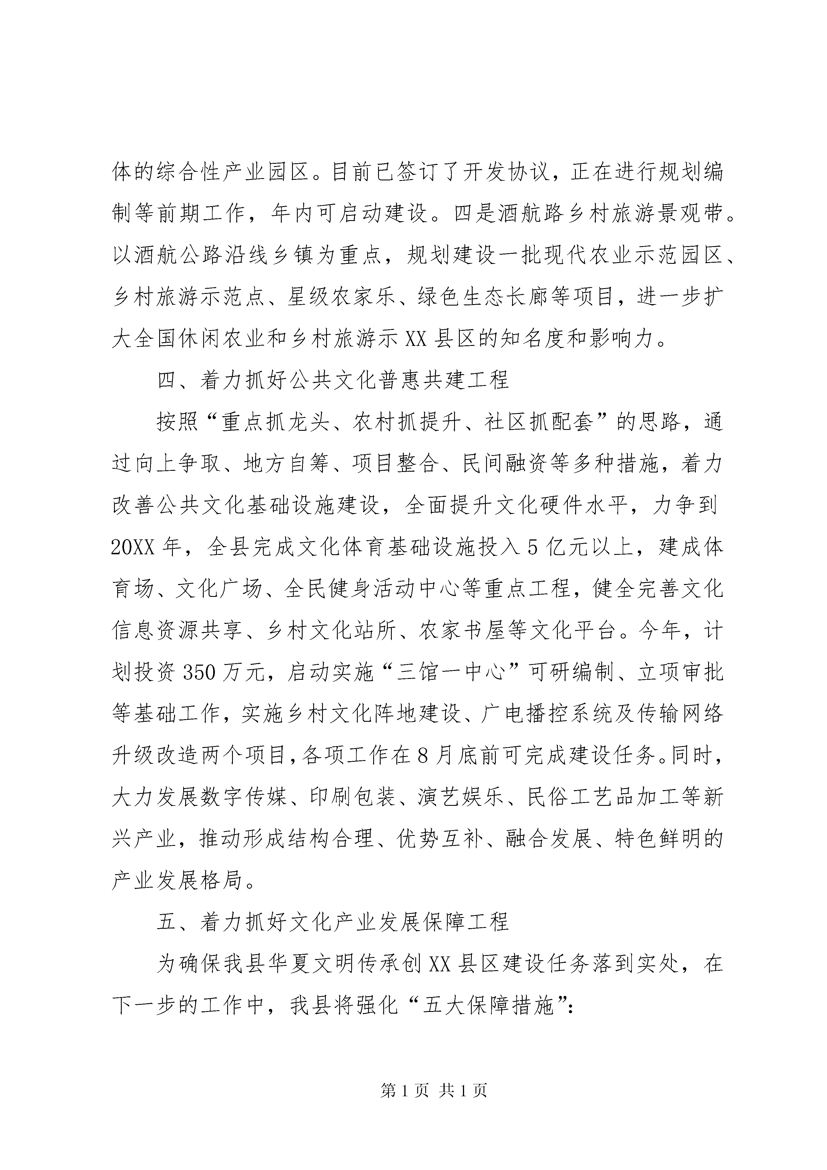 华夏文明传承创XX县区发展情况汇报(都伟市长调研定稿)5.13华夏文明传承创XX县区发展情况汇报(都伟市长调研定稿)5.13XX县区华夏文明传承创XX县区建设情况汇报华夏文明传承创XX县区建设是加快推进文化大省建设的重要平台,为我县开发利用文化资源、加快文化旅游产业融合发展、提升文化软实力,带来了重大机遇。今年以来,我县认真贯彻落实省市华夏文明传承创XX县区建设的部署要求,科学谋划文化事业和文化产业、传承保护与创新发展、转型跨越与群众需求的统筹发展,立足我县悠久厚重的历史文化资源和丰富多样的自然人文资源,围绕全省“一带三区十三板块”和全市“一带两区三个着力点百项千亿文化项目”总体布局,按照县委“235”发展思路,集中实施“134”推进计划,即:打造一个龙头,就是以航天文化品牌为龙头,引领带动居延文化、生态文化、民俗文化发展;建设三大主题区,就是突出特色,错位发展,建设以航天文化为核心的文化产业创XX县区,以居延文化为基础的文化传承保护区、以生态文化为主线的休闲旅游度假区;实施四大工程,就是抓好文化遗产保护传承工程、公共文化普惠共建工程、文化旅游融合发展工程、文化产业跨越保障工程,努力实现由文化资源大县向文化产业强县转型,不断提升金塔文化软实力。在具体推进过程中,着力抓好以下五个方面的工作:一、着力抓好航天文化产业创XX县区建设按照科学规划、项目支撑、创意带动、市场运作的思路,以县城为中心,加快推进以“飞天圆梦”、“沙雕古城”、“城西生态湖”三大板块为内容的航天文化园建设,全力实施航天旅游服务中心、航天数字文化传媒中心、航天系列文化产品研发等项目,着力打造以航天元素为核心的戈壁明珠城。以航天镇XX县区为带动,加快航天主题风情小镇建设,着力打造航空航天爱国教育基地。以“航天精神”为引领,深入实施文明素质提升工程,全面提高公共文明水平。二、着力抓好居延文化传承保护区建设坚持保护与利用并重、传承与展示结合、普查与宣传同步的原则,着力打造居延文化品牌。一是坚持保护与利用并重。以居延遗址、“三城一关”为中心,认真做好县内华夏文化资源保护、开发和利用规划编制工作,规划实施汉明长城资源保护利用、肩水金关军旅文化景区、国家级考古遗址公园等项目。目前,计划投资1200万元的东大湾城防洪、居延遗址围栏、芦草井子长城保护等3项工程已开工建设。二是坚持传承与展示结合。充分挖掘整理和研究居延文化、民俗文化内涵,以居延文化展示馆、非物质文化传承展览馆、居延历史文化传承纪录片为重点,认真抓好非物质文化遗产开发利用。计划8月份与市文物局联合举办的“金塔居延遗址与丝绸之路国际历史文化学术研讨会”筹备工作顺利推进,正在进行居延遗址考察点道路修整。三是坚持普查与宣传同步。认真做好全国第一次可移动文物普查工作,进一步加强文物保护、非遗传承项目申报工作,加大火石梁、缸缸洼等新列国家、省级重点文物保护单位宣传力度,确保各类文化遗产的合理保护与开发利用。三、着力抓好休闲旅游度假区建设充分利用县内水域风光和万亩胡杨的唯一性优势,突出节会品牌效应,不断提升航天胡杨文化旅游节内涵和档次,重点实施“三园一带”文化旅游景区开发项目。一是鸳鸯湖休闲度假产业园。计划总投资2.4亿元,重点实施生态度假村、鸳鸯文化主题馆、水上乐园等项目。目前,完成投资800万元,环湖道路铺筑、游客码头修建、游轮购置装修等配套工程已基本完成。二是沙漠森林公园。年内计划投资1200万元,重点完成公园景区大门、接待中心、景区道路建设工程。目前,道路铺筑、接待中心正在抓紧实施,9月份可投入使用。同时,持续扩大金秋胡杨节会效应,加大招商引资力度,整体推介开发万亩胡杨林的项目洽谈工作正在顺利进行。三是维诺葡萄公园。计划投资50亿元,建设集葡萄种植、产业培育、生态保护、旅游观光、休闲度假为一体的综合性产业园区。目前已签订了开发协议,正在进行规划编制等前期工作,年内可启动建设。四是酒航路乡村旅游景观带。以酒航公路沿线乡镇为重点,规划建设一批现代农业示范园区、乡村旅游示范点、星级农家乐、绿色生态长廊等项目,进一步扩大全国休闲农业和乡村旅游示XX县区的知名度和影响力。四、着力抓好公共文化普惠共建工程按照“重点抓龙头、农村抓提升、社区抓配套”的思路,通过向上争取、地方自筹、项目整合、民间融资等多种措施,着力改善公共文化基础设施建设,全面提升文化硬件水平,力争到20XX年,全县完成文化体育基础设施投入5亿元以上,建成体育场、文化广场、全民健身活动中心等重点工程,健全完善文化信息资源共享、乡村文化站所、农家书屋等文化平台。今年,计划投资350万元,启动实施“三馆一中心”可研编制、立项审批等基础工作,实施乡村文化阵地建设、广电播控系统及传输网络升级改造两个项目,各项工作在8月底前可完成建设任务。同时,大力发展