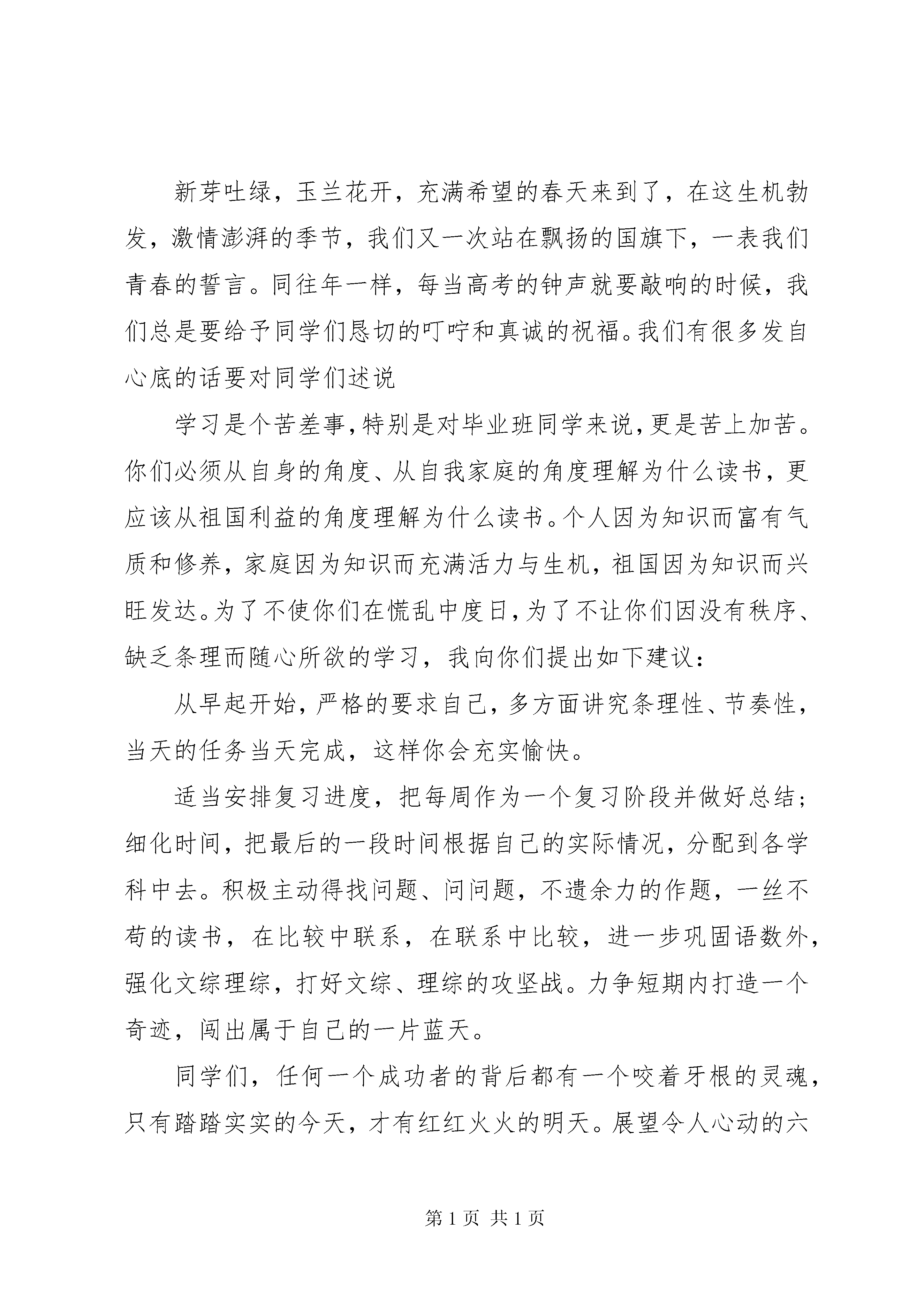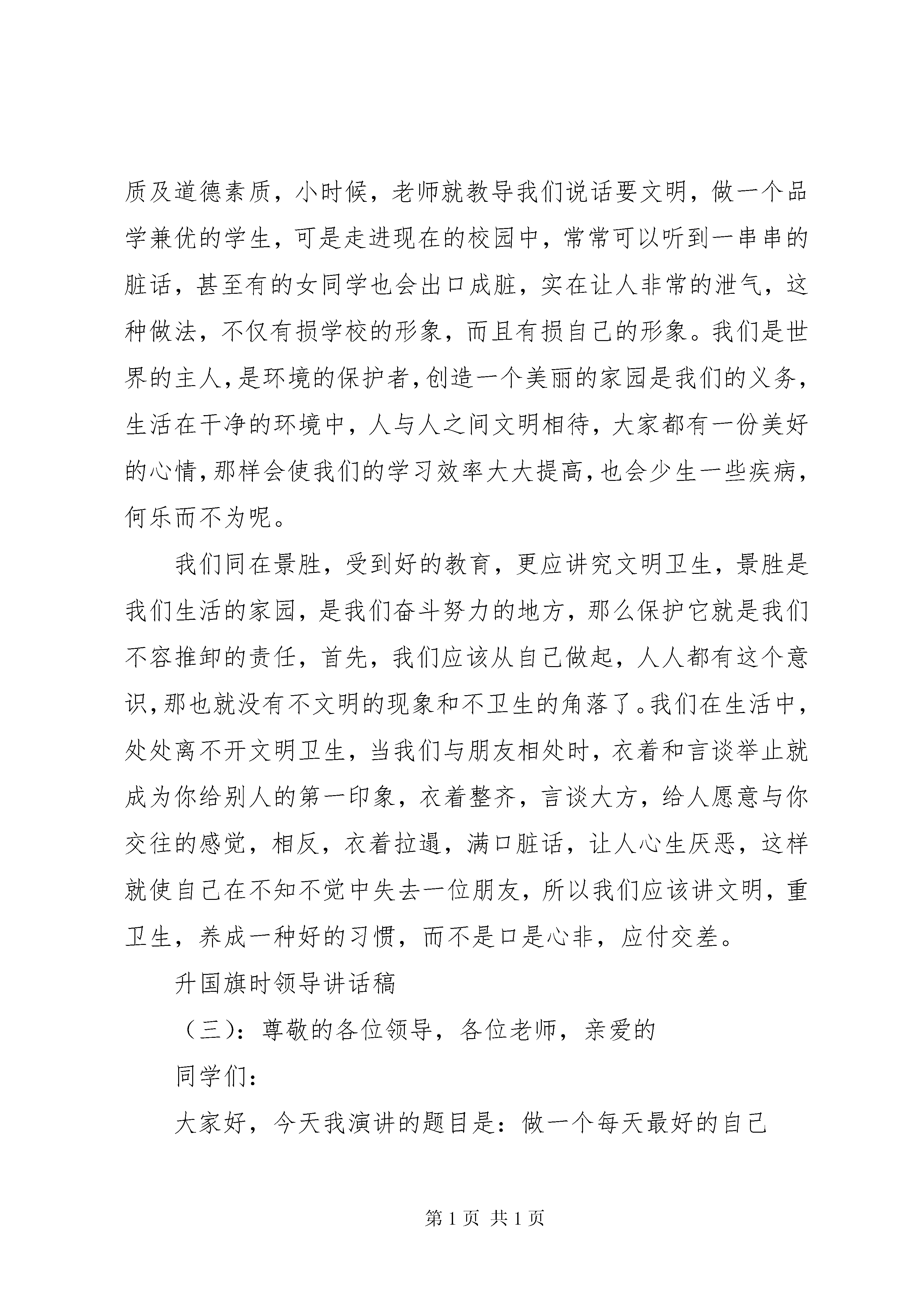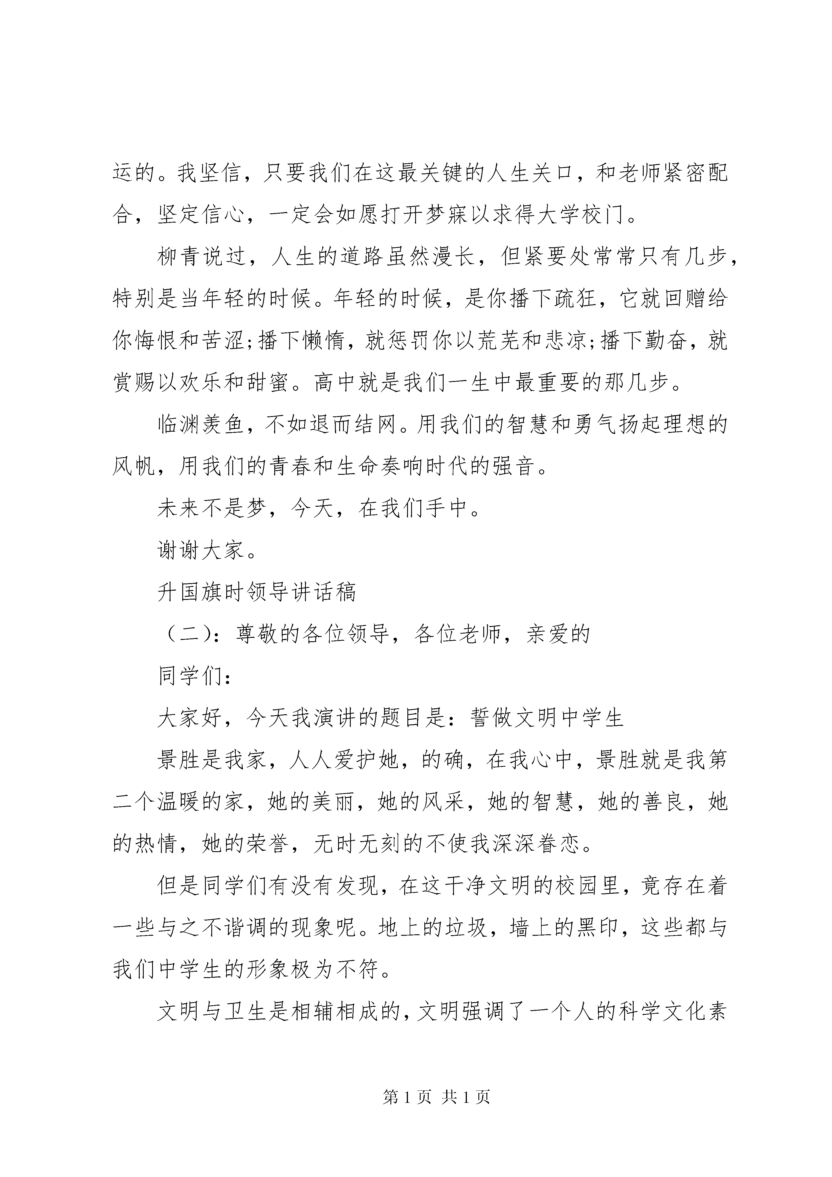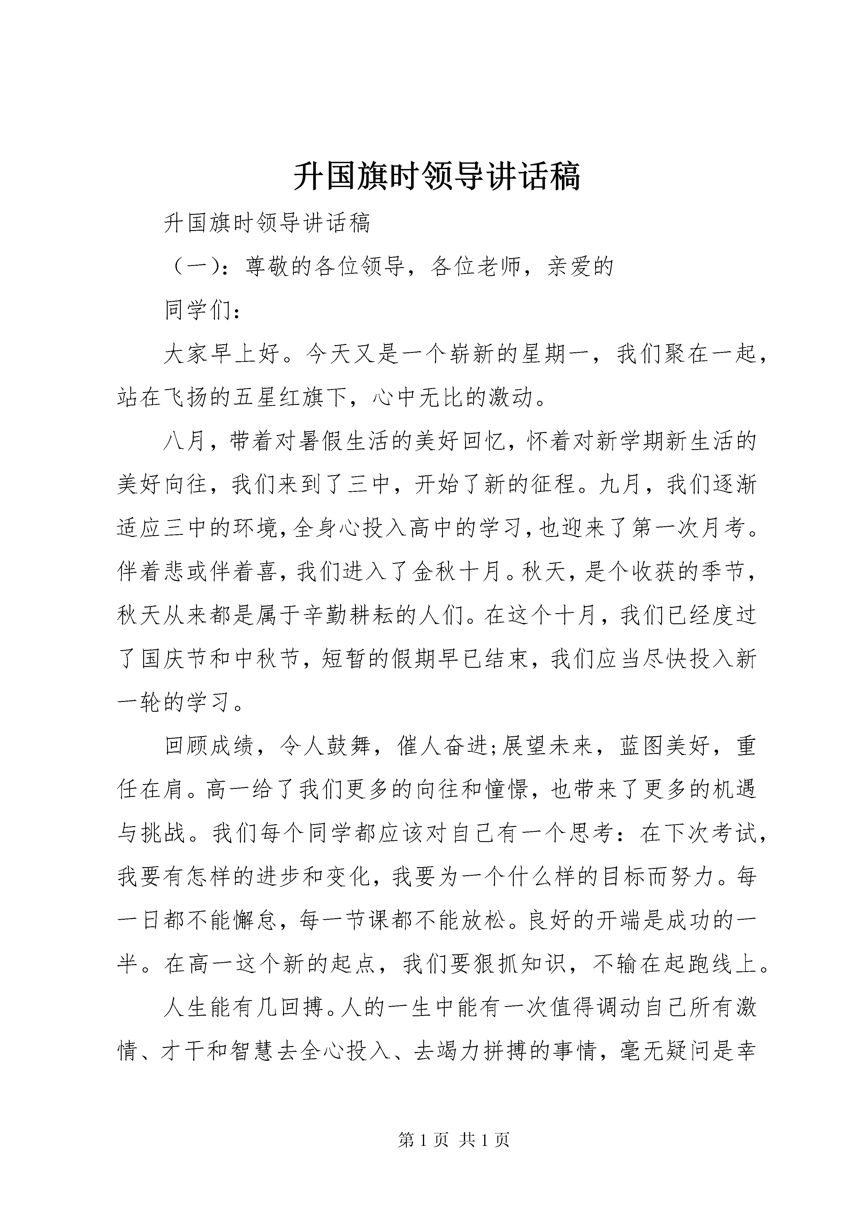 升国旗时领导讲话稿升国旗时领导讲话稿(一):尊敬的各位领导,各位老师,亲爱的同学们:大家早上好。今天又是一个崭新的星期一,我们聚在一起,站在飞扬的五星红旗下,心中无比的激动。八月,带着对暑假生活的美好回忆,怀着对新学期新生活的美好向往,我们来到了三中,开始了新的征程。九月,我们逐渐适应三中的环境,全身心投入高中的学习,也迎来了第一次月考。伴着悲或伴着喜,我们进入了金秋十月。秋天,是个收获的季节,秋天从来都是属于辛勤耕耘的人们。在这个十月,我们已经度过了国庆节和中秋节,短暂的假期早已结束,我们应当尽快投入新一轮的学习。回顾成绩,令人鼓舞,催人奋进;展望未来,蓝图美好,重任在肩。高一给了我们更多的向往和憧憬,也带来了更多的机遇与挑战。我们每个同学都应该对自己有一个思考:在下次考试,我要有怎样的进步和变化,我要为一个什么样的目标而努力。每一日都不能懈怠,每一节课都不能放松。良好的开端是成功的一半。在高一这个新的起点,我们要狠抓知识,不输在起跑线上。人生能有几回搏。人的一生中能有一次值得调动自己所有激情、才干和智慧去全心投入、去竭力拼搏的事情,毫无疑问是幸运的。我坚信,只要我们在这最关键的人生关口,和老师紧密配合,坚定信心,一定会如愿打开梦寐以求得大学校门。柳青说过,人生的道路虽然漫长,但紧要处常常只有几步,特别是当年轻的时候。年轻的时候,是你播下疏狂,它就回赠给你悔恨和苦涩;播下懒惰,就惩罚你以荒芜和悲凉;播下勤奋,就赏赐以欢乐和甜蜜。高中就是我们一生中最重要的那几步。临渊羡鱼,不如退而结网。用我们的智慧和勇气扬起理想的风帆,用我们的青春和生命奏响时代的强音。未来不是梦,今天,在我们手中。谢谢大家。升国旗时领导讲话稿(二):尊敬的各位领导,各位老师,亲爱的同学们:大家好,今天我演讲的题目是:誓做文明中学生景胜是我家,人人爱护她,的确,在我心中,景胜就是我第二个温暖的家,她的美丽,她的风采,她的智慧,她的善良,她的热情,她的荣誉,无时无刻的不使我深深眷恋。但是同学们有没有发现,在这干净文明的校园里,竟存在着一些与之不谐调的现象呢。地上的垃圾,墙上的黑印,这些都与我们中学生的形象极为不符。文明与卫生是相辅相成的,文明强调了一个人的科学文化素质及道德素质,小时候,老师就教导我们说话要文明,做一个品学兼优的学生,可是走进现在的校园中,常常可以听到一串串的脏话,甚至有的女同学也会出口成脏,实在让人非常的泄气,这种做法,不仅有损学校的形象,而且有损自己的形象。我们是世界的主人,是环境的保护者,创造一个美丽的家园是我们的义务,生活在干净的环境中,人与人之间文明相待,大家都有一份美好的心情,那样会使我们的学习效率大大提高,也会少生一些疾病,何乐而不为呢。我们同在景胜,受到好的教育,更应讲究文明卫生,景胜是我们生活的家园,是我们奋斗努力的地方,那么保护它就是我们不容推卸的责任,首先,我们应该从自己做起,人人都有这个意识,那也就没有不文明的现象和不卫生的角落了。我们在生活中,处处离不开文明卫生,当我们与朋友相处时,衣着和言谈举止就成为你给别人的第一印象,衣着整齐,言谈大方,给人愿意与你交往的感觉,相反,衣着拉遢,满口脏话,让人心生厌恶,这样就使自己在不知不觉中失去一位朋友,所以我们应该讲文明,重卫生,养成一种好的习惯,而不是口是心非,应付交差。升国旗时领导讲话稿(三):尊敬的各位领导,各位老师,亲爱的同学们:大家好,今天我演讲的题目是:做一个每天最好的自己新芽吐绿,玉兰花开,充满希望的春天来到了,在这生机勃发,激情澎湃的季节,我们又一次站在飘扬的国旗下,一表我们青春的誓言。同往年一样,每当高考的钟声就要敲响的时候,我们总是要给予同学们恳切的叮咛和真诚的祝福。我们有很多发自心底的话要对同学们述说学习是个苦差事,特别是对毕业班同学来说,更是苦上加苦。你们必须从自身的角度、从自我家庭的角度理解为什么读书,更应该从祖国利益的角度理解为什么读书。个人因为知识而富有气质和修养,家庭因为知识而充满活力与生机,祖国因为知识而兴旺发达。为了不使你们在慌乱中度日,为了不让你们因没有秩序、缺乏条理而随心所欲的学习,我向你们提出如下建议:从早起开始,严格的要求自己,多方面讲究条理性、节奏性,当天的任务当天完成,这样你会充实愉快。适当安排复习进度,把每周作为一个复习阶段并做好总结;细化时间,把最后的一段时间根据自己的实际情况,分配到各学科中去。积极主动得找问题、问问题,不遗余力的作题,一丝不苟的读书,在比较中联系,在联系中比较,进一步巩固语数外,强化文综理综,打好文综、理综的攻坚战。力争短期内打造一个奇迹,闯出属于自己的一片蓝天。同学们,任何一个成功者的背后都有一个咬着牙根的灵魂,只有踏踏实实的今天,才有红红火火的明天。展望令人心动的六月,思考激情满怀