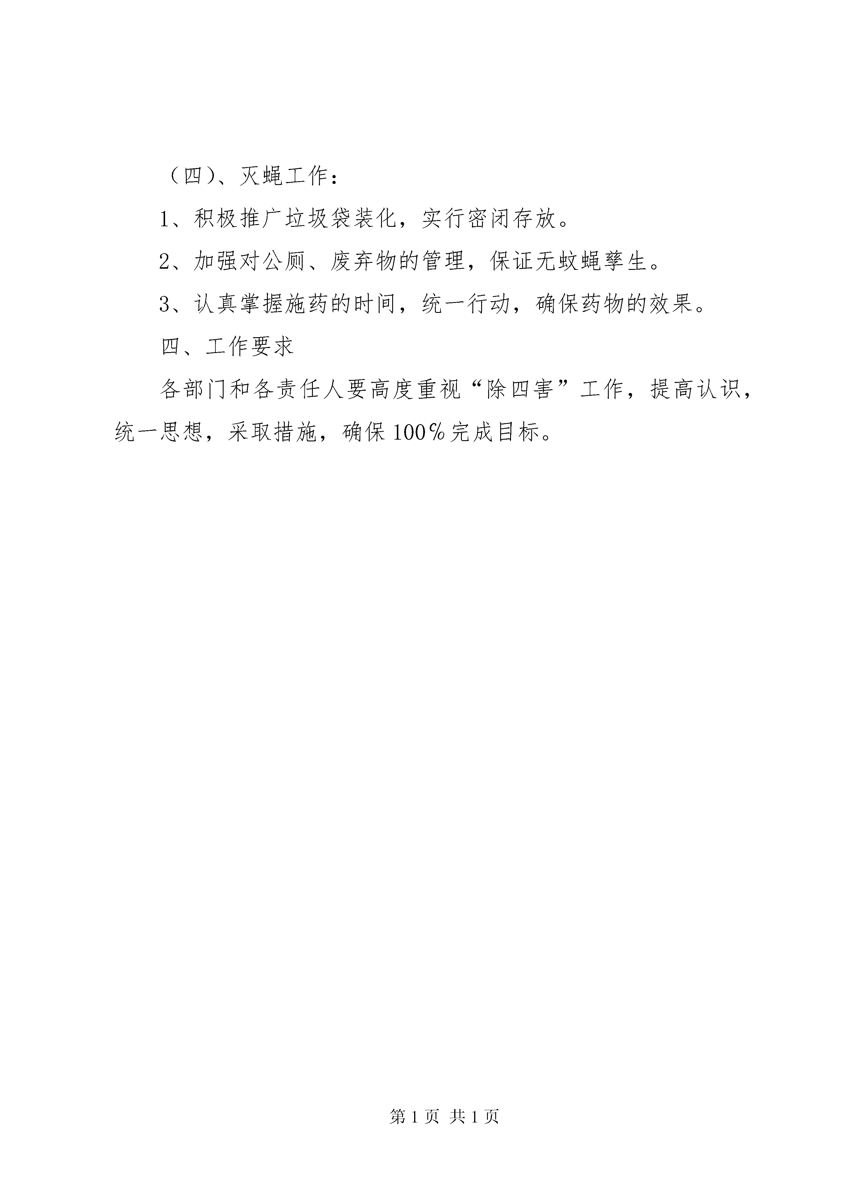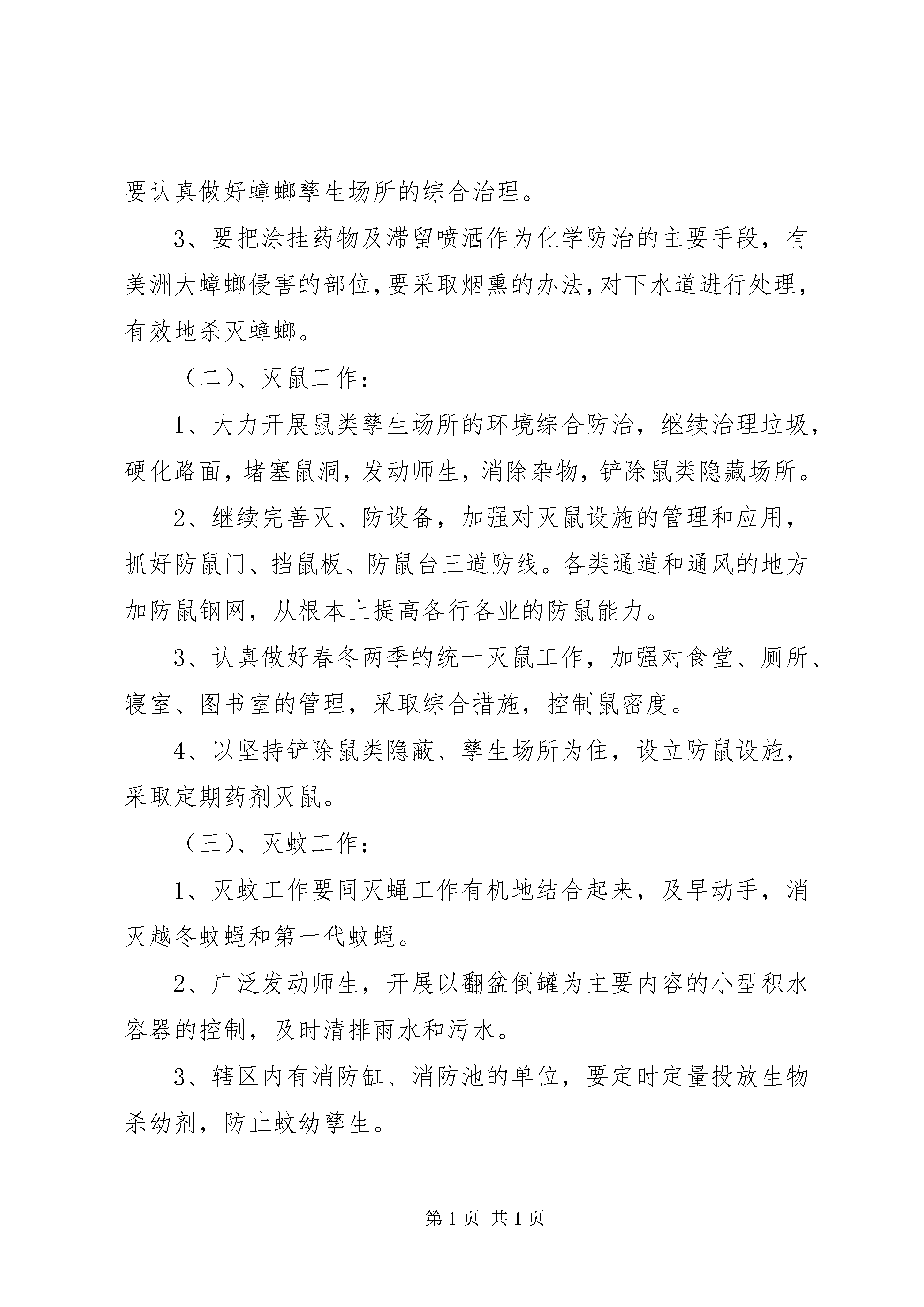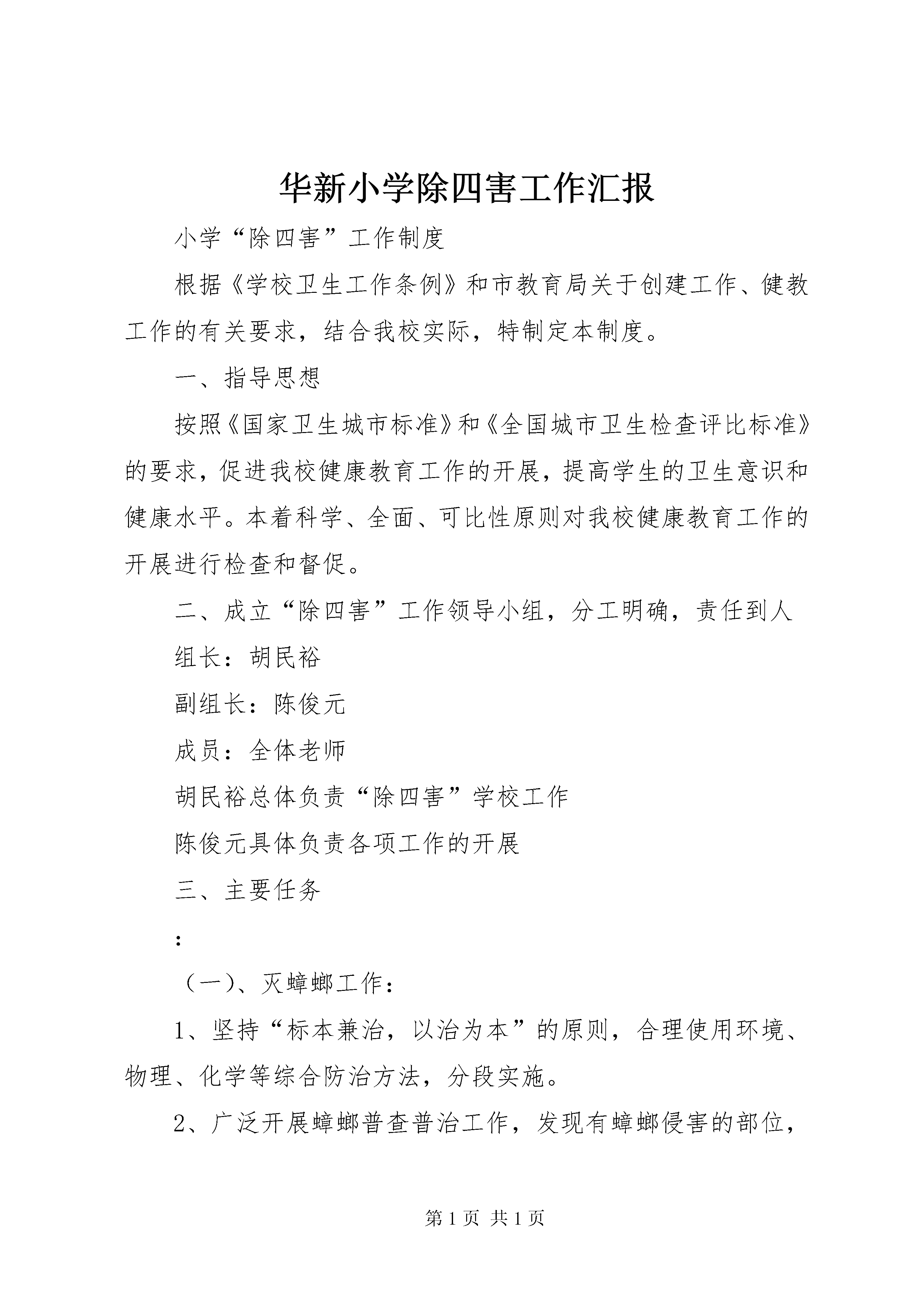 华新小学除四害工作汇报小学“除四害”工作制度根据《学校卫生工作条例》和市教育局关于创建工作、健教工作的有关要求,结合我校实际,特制定本制度。一、指导思想按照《国家卫生城市标准》和《全国城市卫生检查评比标准》的要求,促进我校健康教育工作的开展,提高学生的卫生意识和健康水平。本着科学、全面、可比性原则对我校健康教育工作的开展进行检查和督促。二、成立“除四害”工作领导小组,分工明确,责任到人组长:胡民裕副组长:陈俊元成员:全体老师胡民裕总体负责“除四害”学校工作陈俊元具体负责各项工作的开展三、主要任务:(一)、灭蟑螂工作:1、坚持“标本兼治,以治为本”的原则,合理使用环境、物理、化学等综合防治方法,分段实施。2、广泛开展蟑螂普查普治工作,发现有蟑螂侵害的部位,要认真做好蟑螂孳生场所的综合治理。3、要把涂挂药物及滞留喷洒作为化学防治的主要手段,有美洲大蟑螂侵害的部位,要采取烟熏的办法,对下水道进行处理,有效地杀灭蟑螂。(二)、灭鼠工作:1、大力开展鼠类孳生场所的环境综合防治,继续治理垃圾,硬化路面,堵塞鼠洞,发动师生,消除杂物,铲除鼠类隐藏场所。2、继续完善灭、防设备,加强对灭鼠设施的管理和应用,抓好防鼠门、挡鼠板、防鼠台三道防线。各类通道和通风的地方加防鼠钢网,从根本上提高各行各业的防鼠能力。3、认真做好春冬两季的统一灭鼠工作,加强对食堂、厕所、寝室、图书室的管理,采取综合措施,控制鼠密度。4、以坚持铲除鼠类隐蔽、孳生场所为住,设立防鼠设施,采取定期药剂灭鼠。(三)、灭蚊工作:1、灭蚊工作要同灭蝇工作有机地结合起来,及早动手,消灭越冬蚊蝇和第一代蚊蝇。2、广泛发动师生,开展以翻盆倒罐为主要内容的小型积水容器的控制,及时清排雨水和污水。3、辖区内有消防缸、消防池的单位,要定时定量投放生物杀幼剂,防止蚊幼孳生。(四)、灭蝇工作:1、积极推广垃圾袋装化,实行密闭存放。2、加强对公厕、废弃物的管理,保证无蚊蝇孳生。3、认真掌握施药的时间,统一行动,确保药物的效果。四、工作要求各部门和各责任人要高度重视“除四害”工作,提高认识,统一思想,采取措施,确保100℅完成目标。