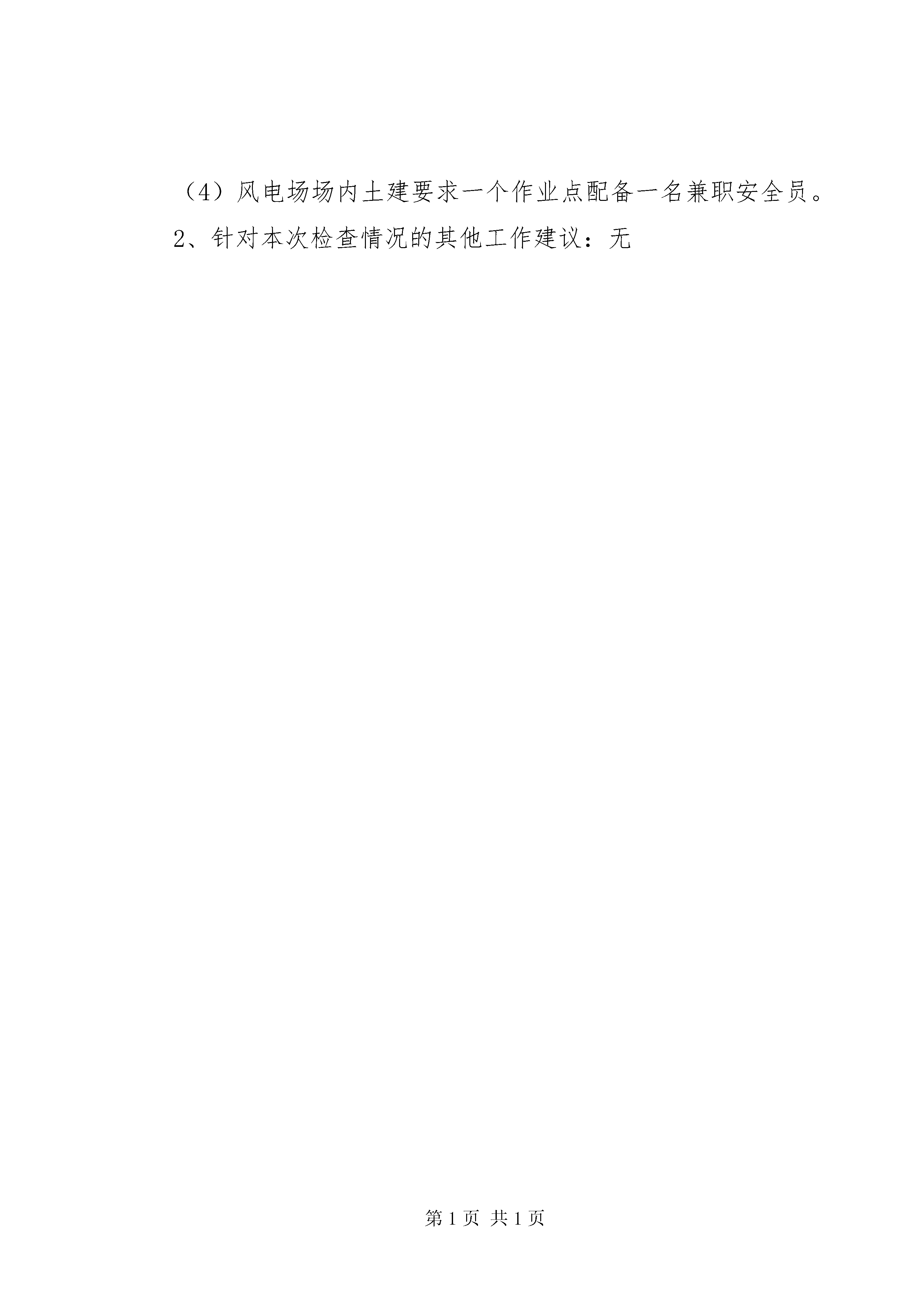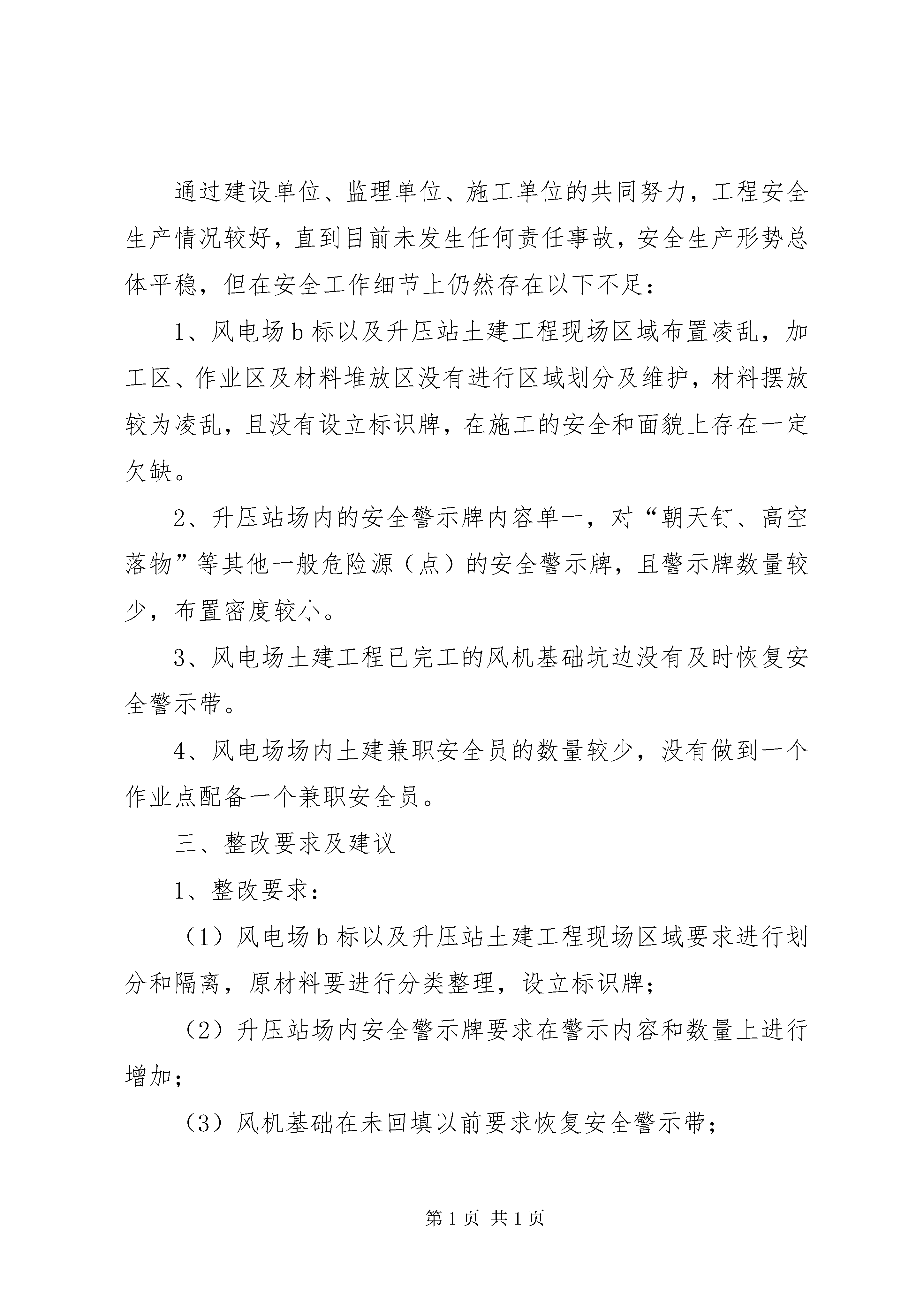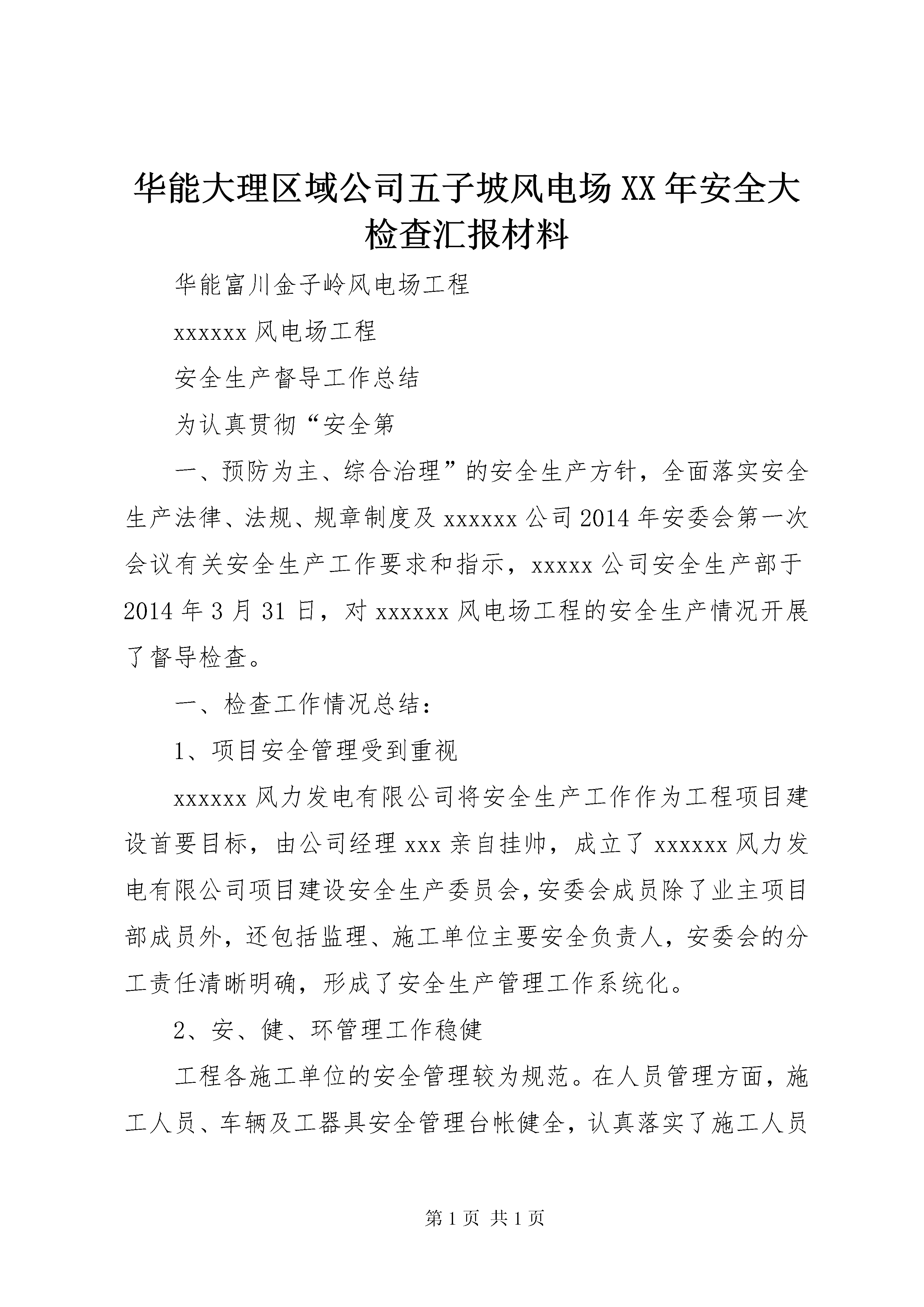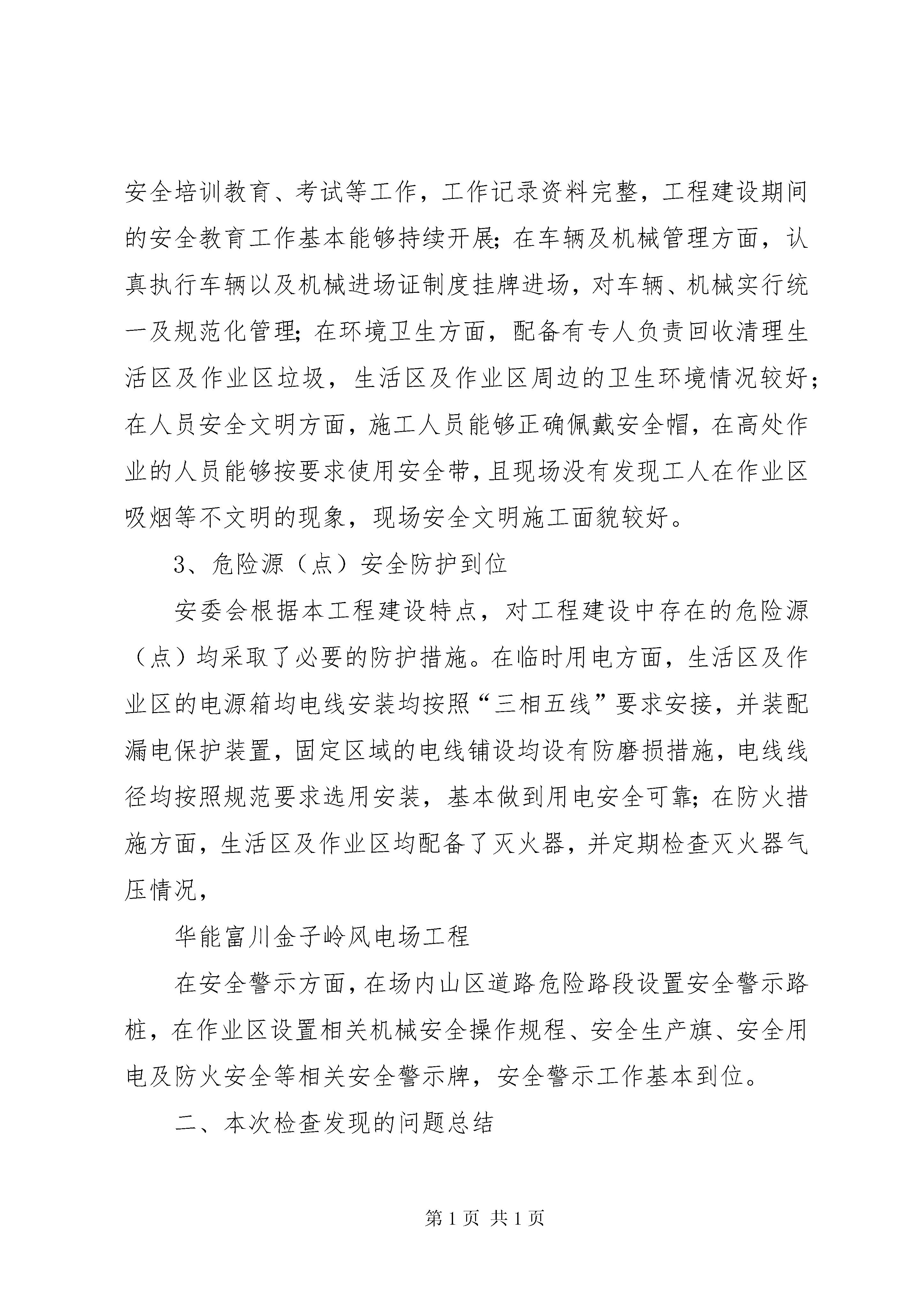华能大理区域公司五子坡风电场XX年安全大检查汇报材料华能富川金子岭风电场工程xxxxxx风电场工程安全生产督导工作总结为认真贯彻“安全第一、预防为主、综合治理”的安全生产方针,全面落实安全生产法律、法规、规章制度及xxxxxx公司2014年安委会第一次会议有关安全生产工作要求和指示,xxxxx公司安全生产部于2014年3月31日,对xxxxxx风电场工程的安全生产情况开展了督导检查。一、检查工作情况总结:1、项目安全管理受到重视xxxxxx风力发电有限公司将安全生产工作作为工程项目建设首要目标,由公司经理xxx亲自挂帅,成立了xxxxxx风力发电有限公司项目建设安全生产委员会,安委会成员除了业主项目部成员外,还包括监理、施工单位主要安全负责人,安委会的分工责任清晰明确,形成了安全生产管理工作系统化。2、安、健、环管理工作稳健工程各施工单位的安全管理较为规范。在人员管理方面,施工人员、车辆及工器具安全管理台帐健全,认真落实了施工人员安全培训教育、考试等工作,工作记录资料完整,工程建设期间的安全教育工作基本能够持续开展;在车辆及机械管理方面,认真执行车辆以及机械进场证制度挂牌进场,对车辆、机械实行统一及规范化管理;在环境卫生方面,配备有专人负责回收清理生活区及作业区垃圾,生活区及作业区周边的卫生环境情况较好;在人员安全文明方面,施工人员能够正确佩戴安全帽,在高处作业的人员能够按要求使用安全带,且现场没有发现工人在作业区吸烟等不文明的现象,现场安全文明施工面貌较好。3、危险源(点)安全防护到位安委会根据本工程建设特点,对工程建设中存在的危险源(点)均采取了必要的防护措施。在临时用电方面,生活区及作业区的电源箱均电线安装均按照“三相五线”要求安接,并装配漏电保护装置,固定区域的电线铺设均设有防磨损措施,电线线径均按照规范要求选用安装,基本做到用电安全可靠;在防火措施方面,生活区及作业区均配备了灭火器,并定期检查灭火器气压情况,华能富川金子岭风电场工程在安全警示方面,在场内山区道路危险路段设置安全警示路桩,在作业区设置相关机械安全操作规程、安全生产旗、安全用电及防火安全等相关安全警示牌,安全警示工作基本到位。二、本次检查发现的问题总结通过建设单位、监理单位、施工单位的共同努力,工程安全生产情况较好,直到目前未发生任何责任事故,安全生产形势总体平稳,但在安全工作细节上仍然存在以下不足:1、风电场b标以及升压站土建工程现场区域布置凌乱,加工区、作业区及材料堆放区没有进行区域划分及维护,材料摆放较为凌乱,且没有设立标识牌,在施工的安全和面貌上存在一定欠缺。2、升压站场内的安全警示牌内容单一,对“朝天钉、高空落物”等其他一般危险源(点)的安全警示牌,且警示牌数量较少,布置密度较小。3、风电场土建工程已完工的风机基础坑边没有及时恢复安全警示带。4、风电场场内土建兼职安全员的数量较少,没有做到一个作业点配备一个兼职安全员。三、整改要求及建议1、整改要求:(1)风电场b标以及升压站土建工程现场区域要求进行划分和隔离,原材料要进行分类整理,设立标识牌;(2)升压站场内安全警示牌要求在警示内容和数量上进行增加;(3)风机基础在未回填以前要求恢复安全警示带;(4)风电场场内土建要求一个作业点配备一名兼职安全员。2、针对本次检查情况的其他工作建议:无