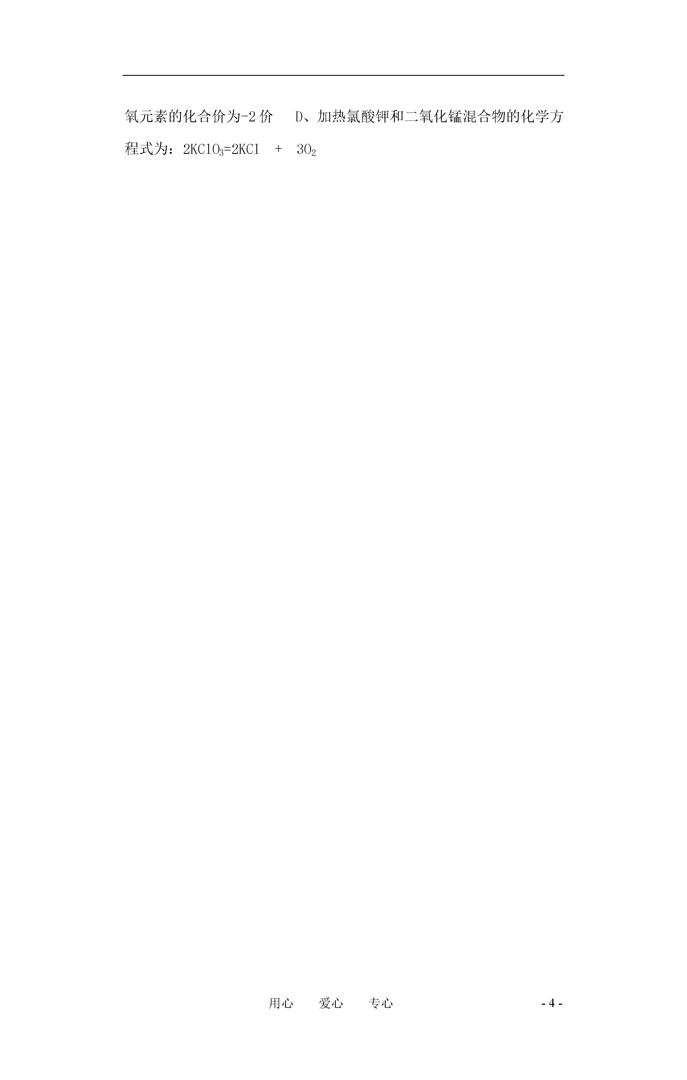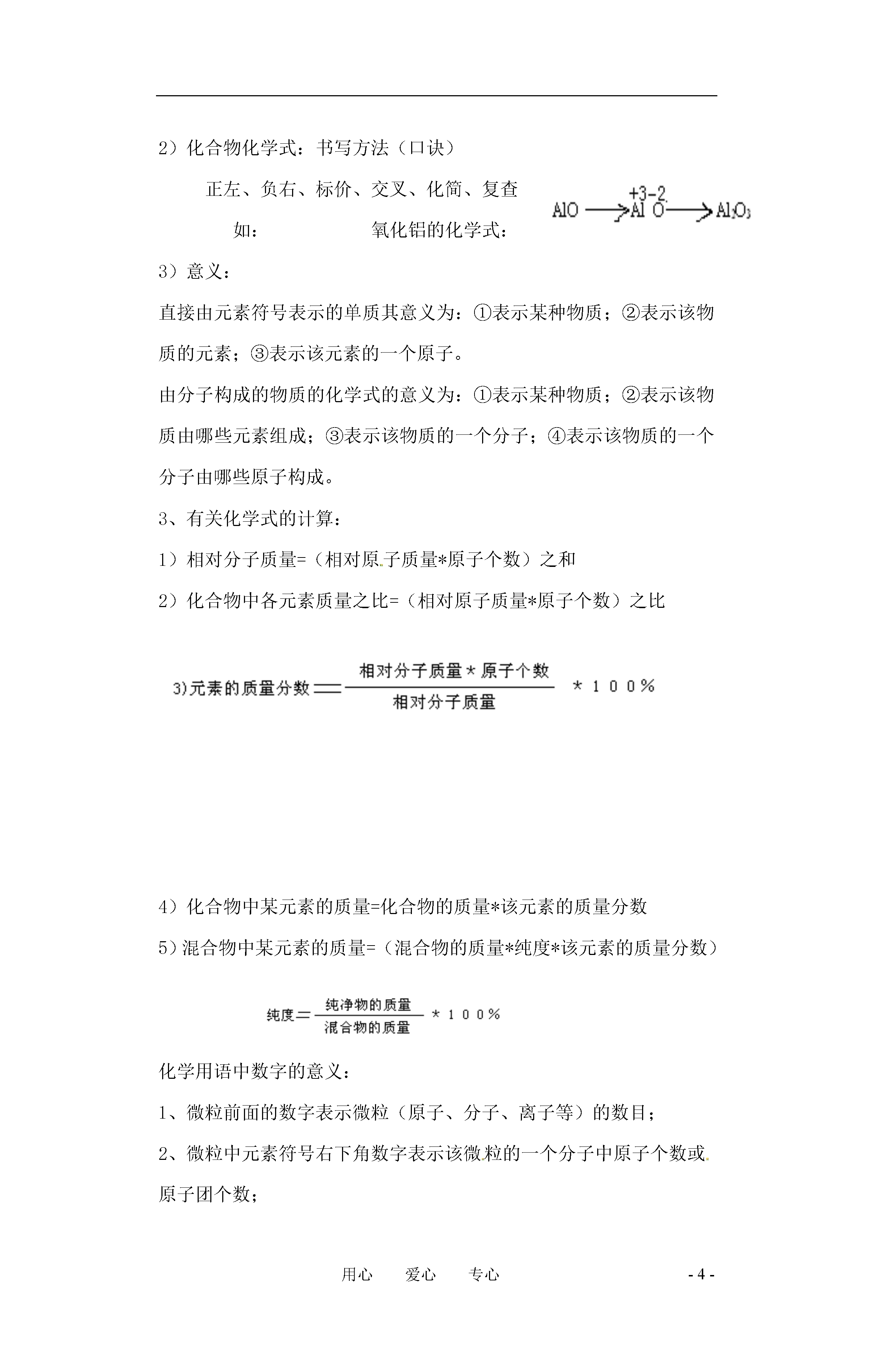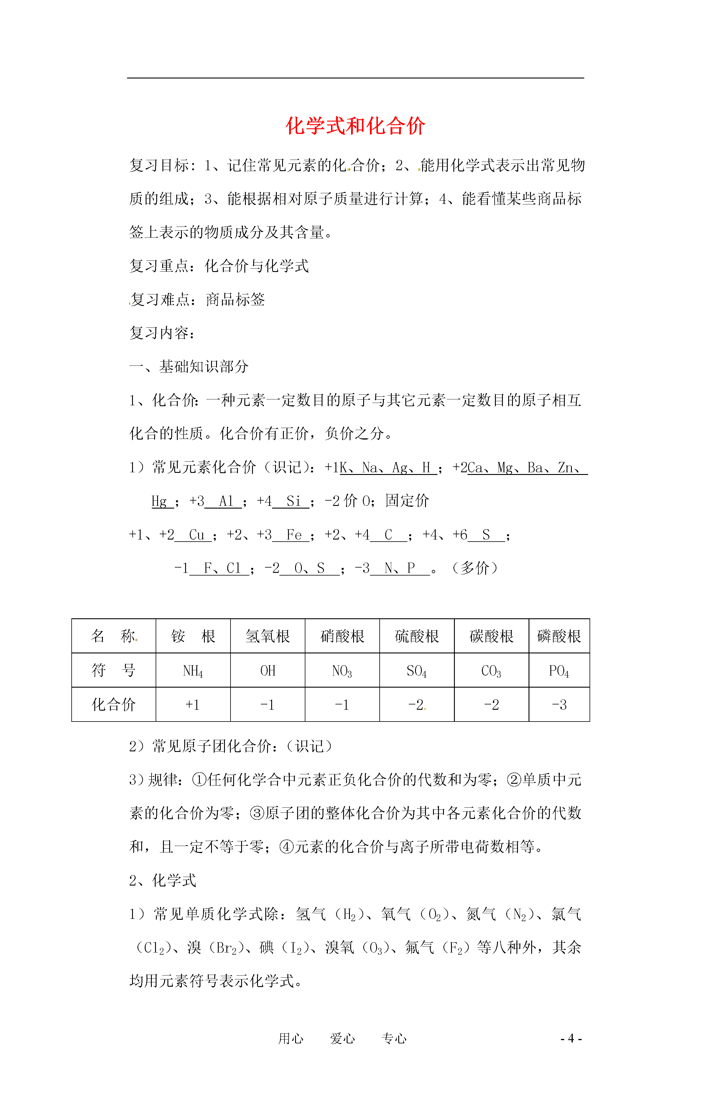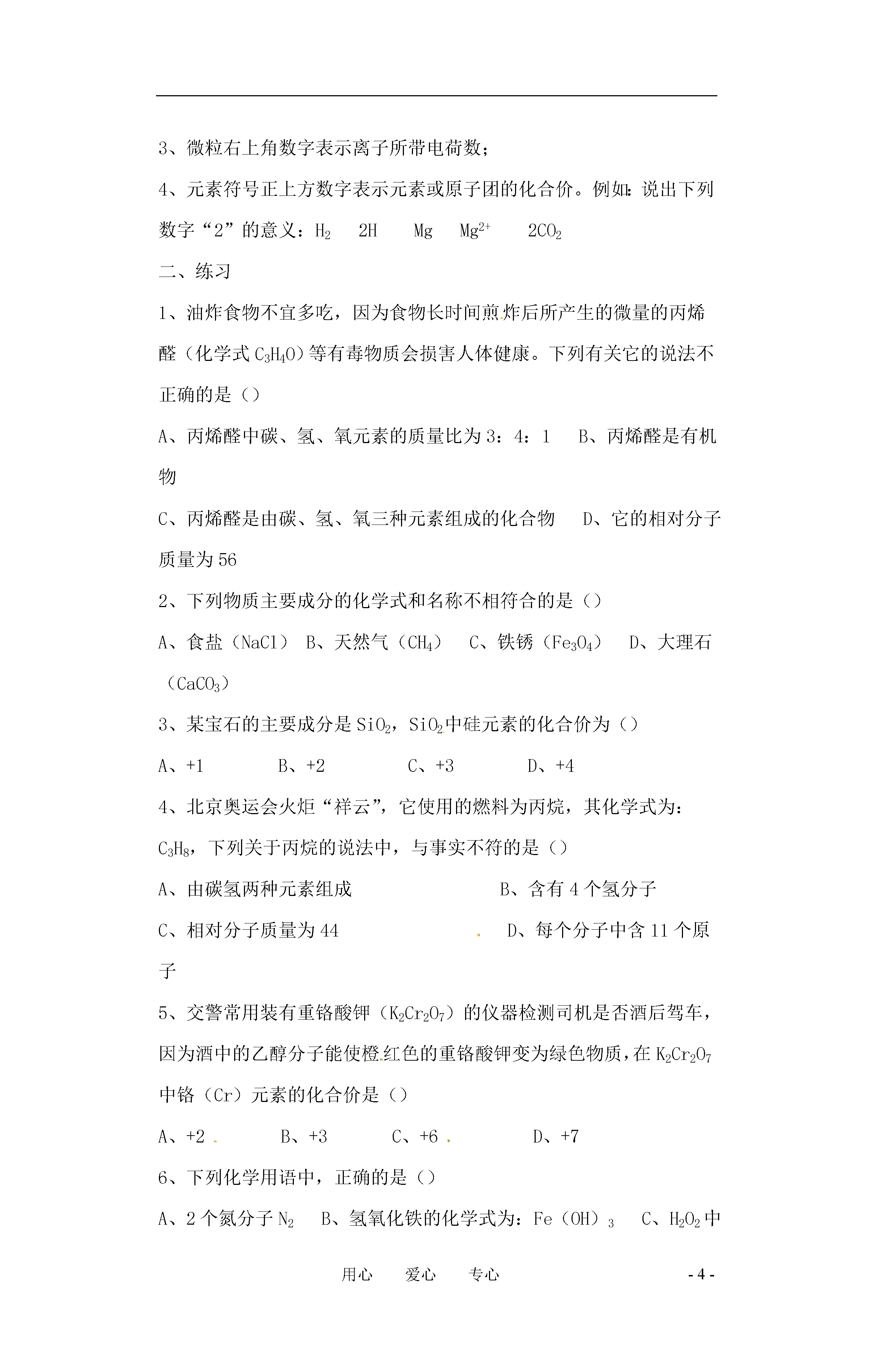 -4-用心爱心专心化学式和化合价复习目标:1、记住常见元素的化合价;2、能用化学式表示出常见物质的组成;3、能根据相对原子质量进行计算;4、能看懂某些商品标签上表示的物质成分及其含量。复习重点:化合价与化学式复习难点:商品标签复习内容:一、基础知识部分1、化合价:一种元素一定数目的原子与其它元素一定数目的原子相互化合的性质。化合价有正价,负价之分。1)常见元素化合价(识记):+1K、Na、Ag、H;+2Ca、Mg、Ba、Zn、Hg;+3Al;+4Si;-2价O;固定价+1、+2Cu;+2、+3Fe;+2、+4C;+4、+6S;-1F、Cl;-2O、S;-3N、P。(多价)名称铵根氢氧根硝酸根硫酸根碳酸根磷酸根符号NH4OHNO3SO4CO3PO4化合价+1-1-1-2-2-32)常见原子团化合价:(识记)3)规律:①任何化学合中元素正负化合价的代数和为零;②单质中元素的化合价为零;③原子团的整体化合价为其中各元素化合价的代数和,且一定不等于零;④元素的化合价与离子所带电荷数相等。2、化学式1)常见单质化学式除:氢气(H2)、氧气(O2)、氮气(N2)、氯气(Cl2)、溴(Br2)、碘(I2)、溴氧(O3)、氟气(F2)等八种外,其余均用元素符号表示化学式。2)化合物化学式:书写方法(口诀)正左、负右、标价、交叉、化简、复查如:氧化铝的化学式:3)意义:直接由元素符号表示的单质其意义为:①表示某种物质;②表示该物质的元素;③表示该元素的一个原子。由分子构成的物质的化学式的意义为:①表示某种物质;②表示该物质由哪些元素组成;③表示该物质的一个分子;④表示该物质的一个分子由哪些原子构成。3、有关化学式的计算:1)相对分子质量=(相对原子质量*原子个数)之和2)化合物中各元素质量之比=(相对原子质量*原子个数)之比4)化合物中某元素的质量=化合物的质量*该元素的质量分数5)混合物中某元素的质量=(混合物的质量*纯度*该元素的质量分数)化学用语中数字的意义:1、微粒前面的数字表示微粒(原子、分子、离子等)的数目;2、微粒中元素符号右下角数字表示该微粒的一个分子中原子个数或原子团个数;3、微粒右上角数字表示离子所带电荷数;4、元素符号正上方数字表示元素或原子团的化合价。例如:说出下列数字“2”的意义:H22HMgMg2+2CO2二、练习1、油炸食物不宜多吃,因为食物长时间煎炸后所产生的微量的丙烯醛(化学式C3H4O)等有毒物质会损害人体健康。下列有关它的说法不正确的是()A、丙烯醛中碳、氢、氧元素的质量比为3:4:1B、丙烯醛是有机物C、丙烯醛是由碳、氢、氧三种元素组成的化合物D、它的相对分子质量为562、下列物质主要成分的化学式和名称不相符合的是()A、食盐(NaCl)B、天然气(CH4)C、铁锈(Fe3O4)D、大理石(CaCO3)3、某宝石的主要成分是SiO2,SiO2中硅元素的化合价为()A、+1B、+2C、+3D、+44、北京奥运会火炬“祥云”,它使用的燃料为丙烷,其化学式为:C3H8,下列关于丙烷的说法中,与事实不符的是()A、由碳氢两种元素组成B、含有4个氢分子C、相对分子质量为44D、每个分子中含11个原子5、交警常用装有重铬酸钾(K2Cr2O7)的仪器检测司机是否酒后驾车,因为酒中的乙醇分子能使橙红色的重铬酸钾变为绿色物质,在K2Cr2O7中铬(Cr)元素的化合价是()A、+2B、+3C、+6D、+76、下列化学用语中,正确的是()A、2个氮分子N2B、氢氧化铁的化学式为:Fe(OH)3C、H2O2中氧元素的化合价为-2价D、加热氯酸钾和二氧化锰混合物的化学方程式为:2KClO3=2KCl+3O2