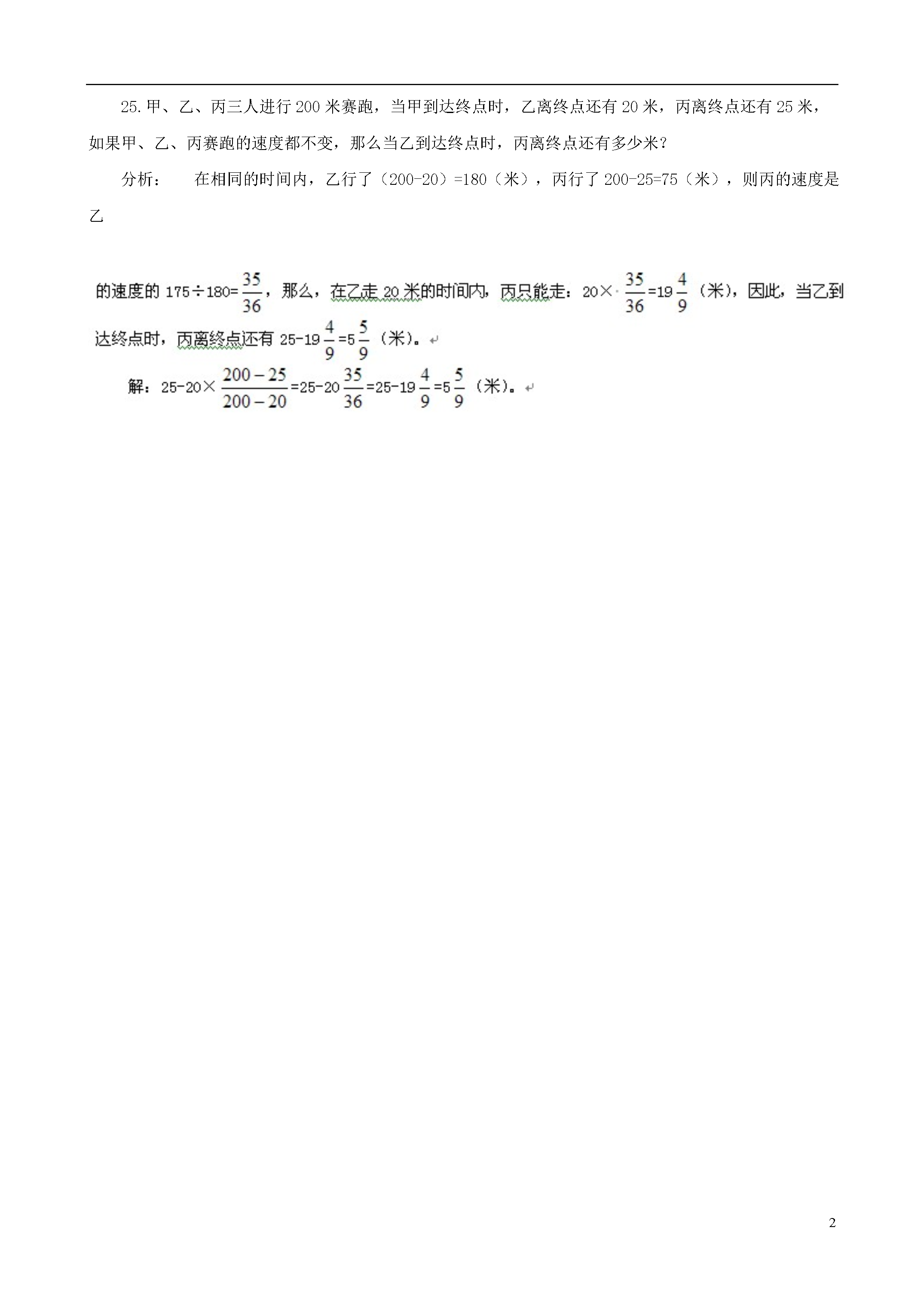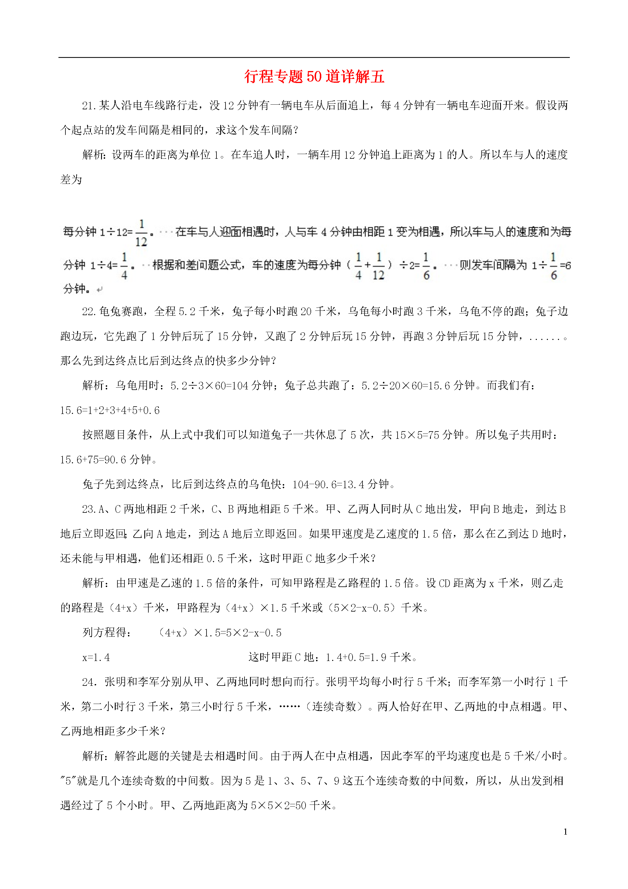 2行程专题50道详解五21.某人沿电车线路行走,没12分钟有一辆电车从后面追上,每4分钟有一辆电车迎面开来。假设两个起点站的发车间隔是相同的,求这个发车间隔?解析:设两车的距离为单位1。在车追人时,一辆车用12分钟追上距离为1的人。所以车与人的速度差为22.龟兔赛跑,全程5.2千米,兔子每小时跑20千米,乌龟每小时跑3千米,乌龟不停的跑;兔子边跑边玩,它先跑了1分钟后玩了15分钟,又跑了2分钟后玩15分钟,再跑3分钟后玩15分钟,......。那么先到达终点比后到达终点的快多少分钟?解析:乌龟用时:5.2÷3×60=104分钟;兔子总共跑了:5.2÷20×60=15.6分钟。而我们有:15.6=1+2+3+4+5+0.6按照题目条件,从上式中我们可以知道兔子一共休息了5次,共15×5=75分钟。所以兔子共用时:15.6+75=90.6分钟。兔子先到达终点,比后到达终点的乌龟快:104-90.6=13.4分钟。23.A、C两地相距2千米,C、B两地相距5千米。甲、乙两人同时从C地出发,甲向B地走,到达B地后立即返回;乙向A地走,到达A地后立即返回。如果甲速度是乙速度的1.5倍,那么在乙到达D地时,还未能与甲相遇,他们还相距0.5千米,这时甲距C地多少千米?解析:由甲速是乙速的1.5倍的条件,可知甲路程是乙路程的1.5倍。设CD距离为x千米,则乙走的路程是(4+x)千米,甲路程为(4+x)×1.5千米或(5×2-x-0.5)千米。列方程得:(4+x)×1.5=5×2-x-0.5x=1.4这时甲距C地:1.4+0.5=1.9千米。24.张明和李军分别从甲、乙两地同时想向而行。张明平均每小时行5千米;而李军第一小时行1千米,第二小时行3千米,第三小时行5千米,……(连续奇数)。两人恰好在甲、乙两地的中点相遇。甲、乙两地相距多少千米?解析:解答此题的关键是去相遇时间。由于两人在中点相遇,因此李军的平均速度也是5千米/小时。"5"就是几个连续奇数的中间数。因为5是1、3、5、7、9这五个连续奇数的中间数,所以,从出发到相遇经过了5个小时。甲、乙两地距离为5×5×2=50千米。25.甲、乙、丙三人进行200米赛跑,当甲到达终点时,乙离终点还有20米,丙离终点还有25米,如果甲、乙、丙赛跑的速度都不变,那么当乙到达终点时,丙离终点还有多少米?分析:在相同的时间内,乙行了(200-20)=180(米),丙行了200-25=75(米),则丙的速度是乙
