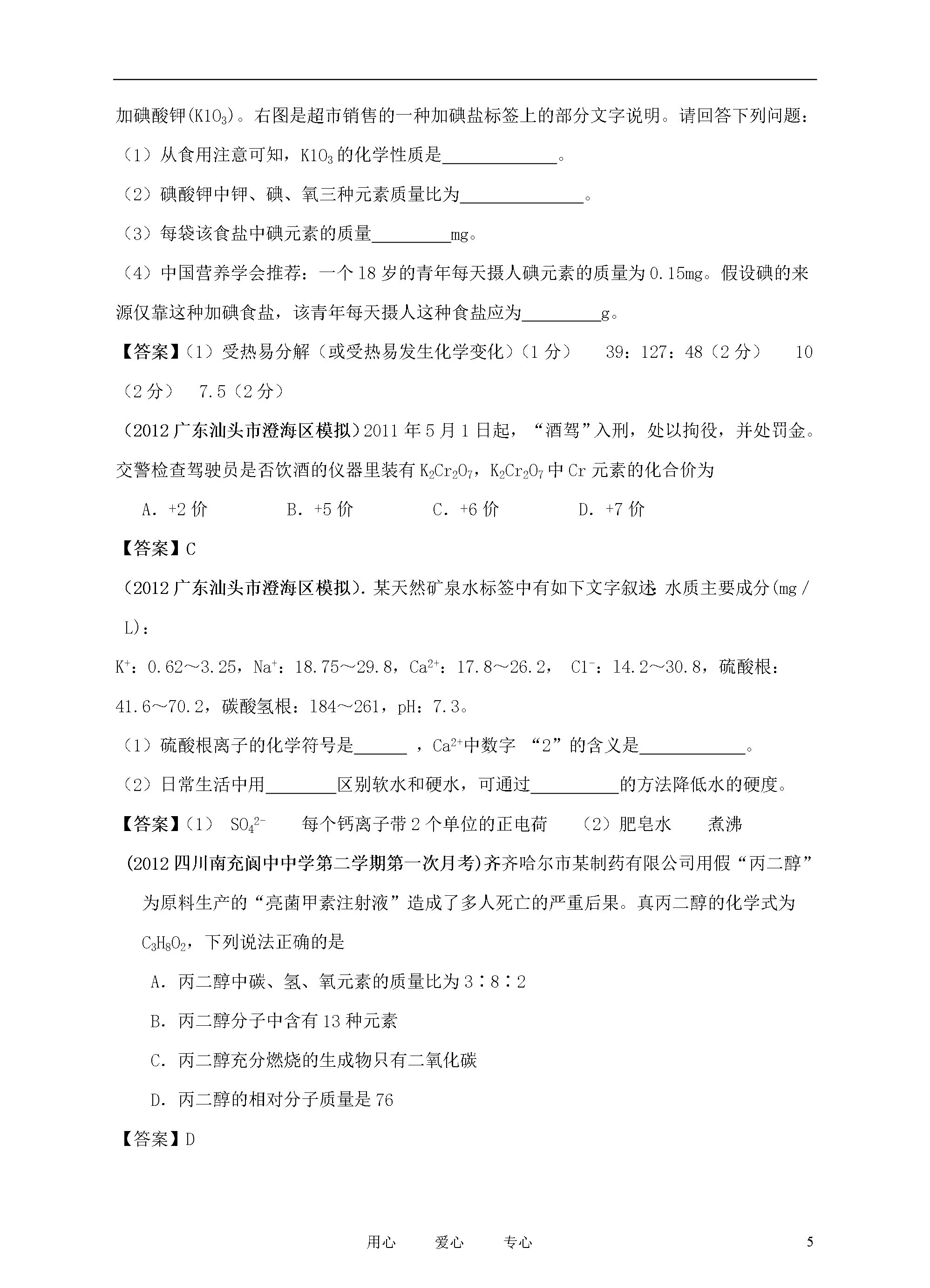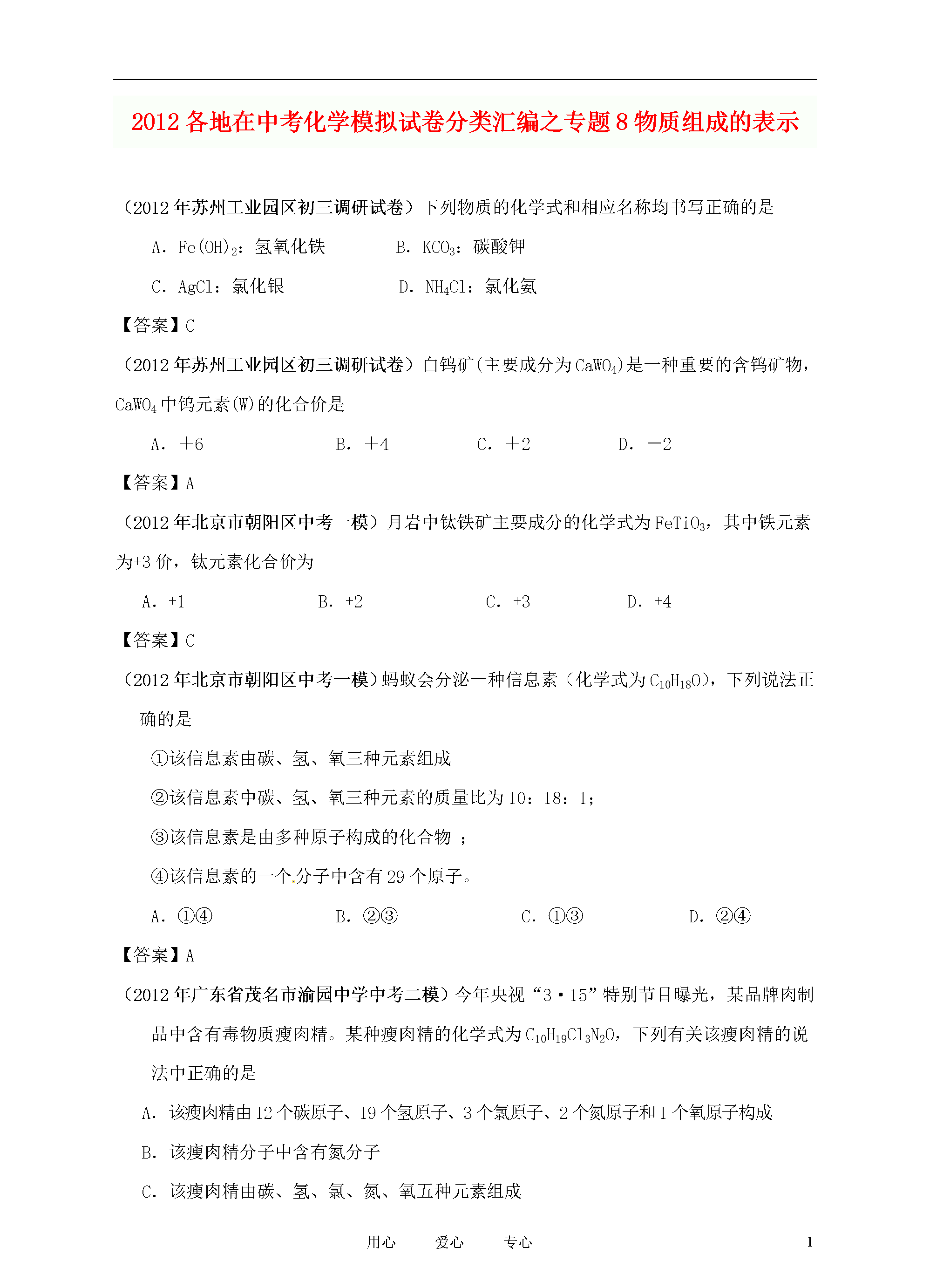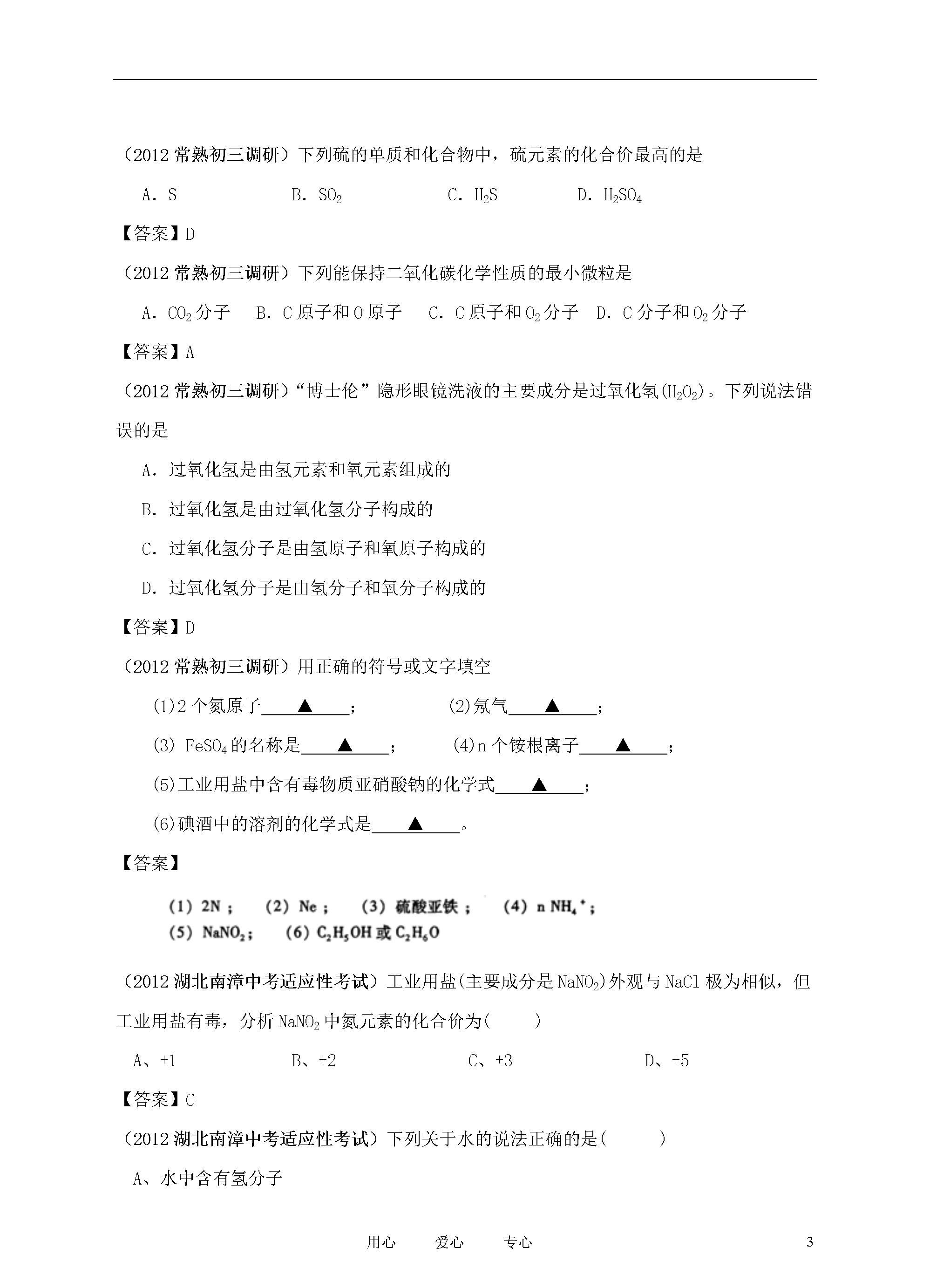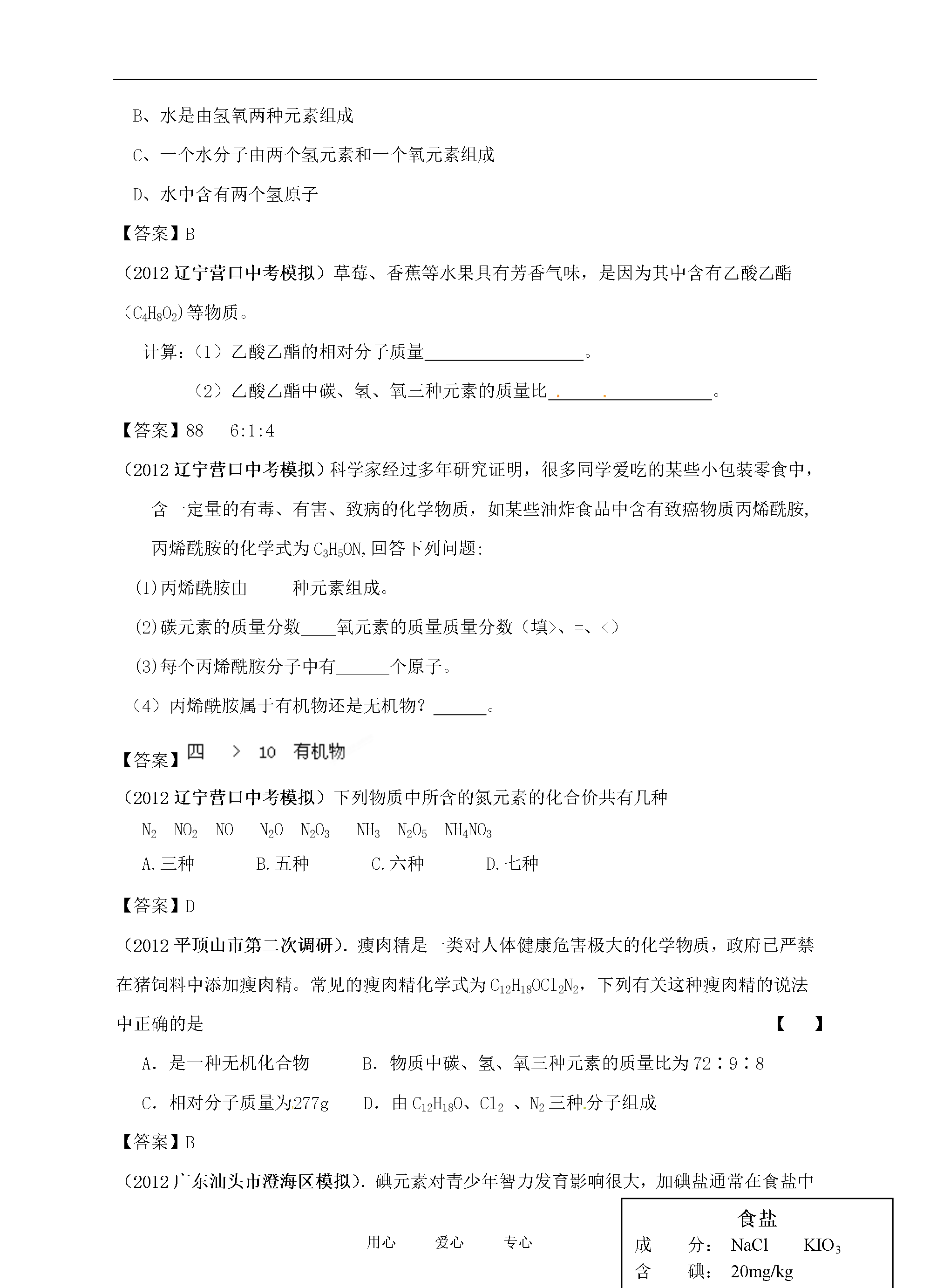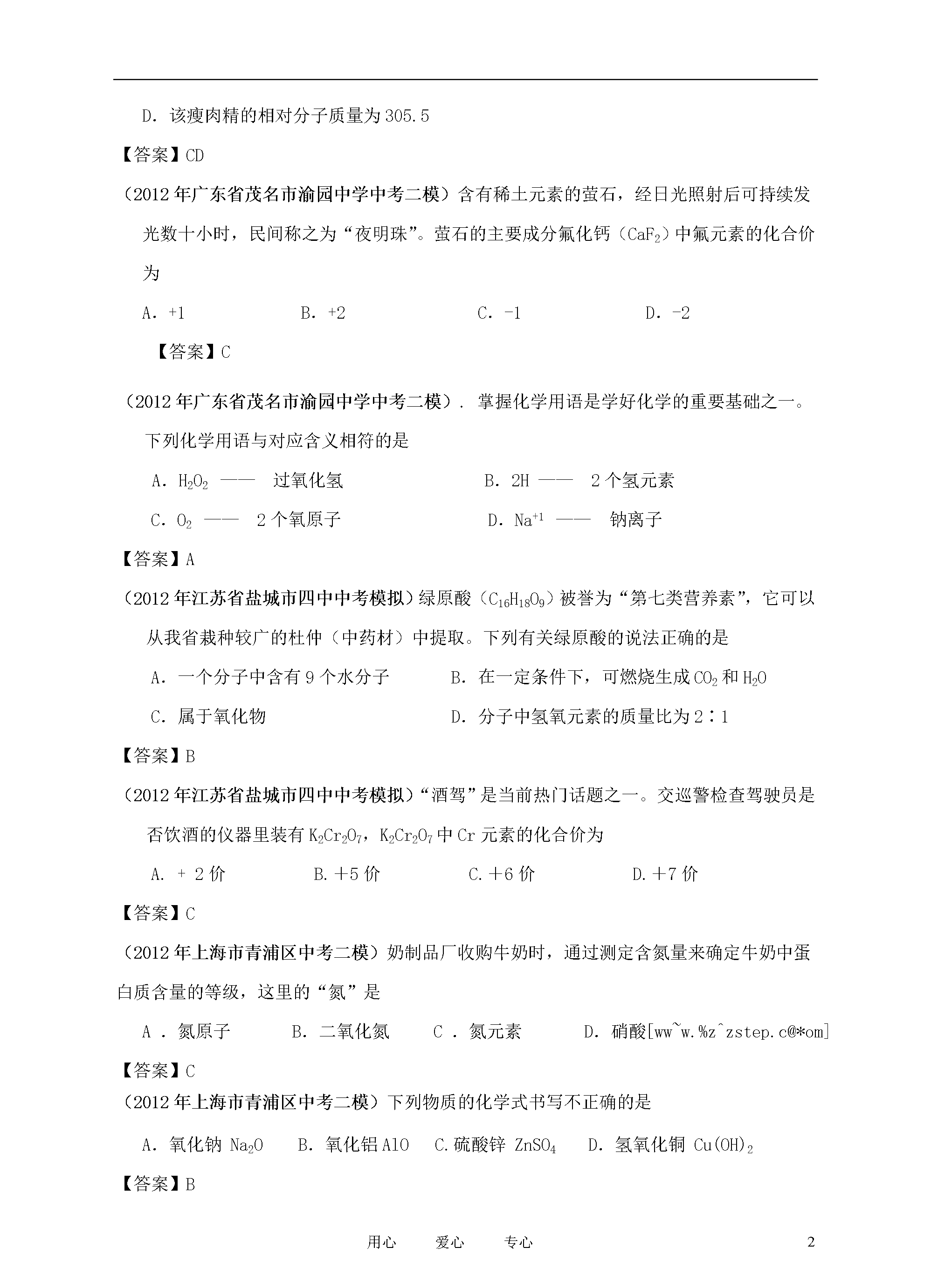 21世纪教育网www.21cnjy.com精品试卷·第页()9用心爱心专心2012各地在中考化学模拟试卷分类汇编之专题8物质组成的表示(2012年苏州工业园区初三调研试卷)下列物质的化学式和相应名称均书写正确的是A.Fe(OH)2:氢氧化铁B.KCO3:碳酸钾C.AgCl:氯化银D.NH4Cl:氯化氨【答案】C(2012年苏州工业园区初三调研试卷)白钨矿(主要成分为CaWO4)是一种重要的含钨矿物,CaWO4中钨元素(W)的化合价是A.+6B.+4C.+2D.-2【答案】A(2012年北京市朝阳区中考一模)月岩中钛铁矿主要成分的化学式为FeTiO3,其中铁元素为+3价,钛元素化合价为A.+1B.+2C.+3D.+4【答案】C(2012年北京市朝阳区中考一模)蚂蚁会分泌一种信息素(化学式为C10H18O),下列说法正确的是①该信息素由碳、氢、氧三种元素组成②该信息素中碳、氢、氧三种元素的质量比为10:18:1;③该信息素是由多种原子构成的化合物;④该信息素的一个分子中含有29个原子。A.①④B.②③C.①③D.②④【答案】A(2012年广东省茂名市渝园中学中考二模)今年央视“3·15”特别节目曝光,某品牌肉制品中含有毒物质瘦肉精。某种瘦肉精的化学式为C10H19Cl3N2O,下列有关该瘦肉精的说法中正确的是A.该瘦肉精由12个碳原子、19个氢原子、3个氯原子、2个氮原子和1个氧原子构成B.该瘦肉精分子中含有氮分子C.该瘦肉精由碳、氢、氯、氮、氧五种元素组成D.该瘦肉精的相对分子质量为305.5【答案】CD(2012年广东省茂名市渝园中学中考二模)含有稀土元素的萤石,经日光照射后可持续发光数十小时,民间称之为“夜明珠”。萤石的主要成分氟化钙(CaF2)中氟元素的化合价为A.+1B.+2C.-1D.-2【答案】C(2012年广东省茂名市渝园中学中考二模).掌握化学用语是学好化学的重要基础之一。下列化学用语与对应含义相符的是A.H2O2——过氧化氢B.2H——2个氢元素C.O2——2个氧原子D.Na+1——钠离子【答案】A(2012年江苏省盐城市四中中考模拟)绿原酸(C16H18O9)被誉为“第七类营养素”,它可以从我省栽种较广的杜仲(中药材)中提取。下列有关绿原酸的说法正确的是A.一个分子中含有9个水分子B.在一定条件下,可燃烧生成CO2和H2OC.属于氧化物D.分子中氢氧元素的质量比为2∶1【答案】B(2012年江苏省盐城市四中中考模拟)“酒驾”是当前热门话题之一。交巡警检查驾驶员是否饮酒的仪器里装有K2Cr2O7,K2Cr2O7中Cr元素的化合价为A.+2价B.+5价C.+6价D.+7价【答案】C(2012年上海市青浦区中考二模)奶制品厂收购牛奶时,通过测定含氮量来确定牛奶中蛋白质含量的等级,这里的“氮”是A.氮原子B.二氧化氮C.氮元素D.硝酸[ww~w.%z^zstep.c@*om]【答案】C(2012年上海市青浦区中考二模)下列物质的化学式书写不正确的是A.氧化钠Na2OB.氧化铝AlOC.硫酸锌ZnSO4D.氢氧化铜Cu(OH)2【答案】B(2012常熟初三调研)下列硫的单质和化合物中,硫元素的化合价最高的是A.SB.SO2C.H2SD.H2SO4【答案】D(2012常熟初三调研)下列能保持二氧化碳化学性质的最小微粒是A.CO2分子B.C原子和O原子C.C原子和O2分子D.C分子和O2分子【答案】A(2012常熟初三调研)“博士伦”隐形眼镜洗液的主要成分是过氧化氢(H2O2)。下列说法错误的是A.过氧化氢是由氢元素和氧元素组成的B.过氧化氢是由过氧化氢分子构成的C.过氧化氢分子是由氢原子和氧原子构成的D.过氧化氢分子是由氢分子和氧分子构成的【答案】D(2012常熟初三调研)用正确的符号或文字填空(1)2个氮原子▲;(2)氖气▲;(3)FeSO4的名称是▲;(4)n个铵根离子▲;(5)工业用盐中含有毒物质亚硝酸钠的化学式▲;(6)碘酒中的溶剂的化学式是▲。【答案】(2012湖北南漳中考适应性考试)工业用盐(主要成分是NaNO2)外观与NaCl极为相似,但工业用盐有毒,分析NaNO2中氮元素的化合价为()A、+1B、+2C、+3D、+5【答案】C(2012湖北南漳中考适应性考试)下列关于水的说法正确的是()A、水中含有氢分子B、水是由氢氧两种元素组成C、一个水分子由两个氢元素和一个氧元素组成D、水中含有两个氢原子【答案】B(2012辽宁营口中考模拟)草莓、香蕉等水果具有芳香气味,是因为其中含有乙酸乙酯(C4H8O2)等物质。计算:(1)乙酸乙酯的相对分子质量。(2)乙酸乙酯中碳、氢、氧三种元素的质量比。【答案】886:1:4(2012辽宁营口中考模拟)科学家经过多年研究证明,很多同学爱吃的某些小包装零食中,含一定量的有