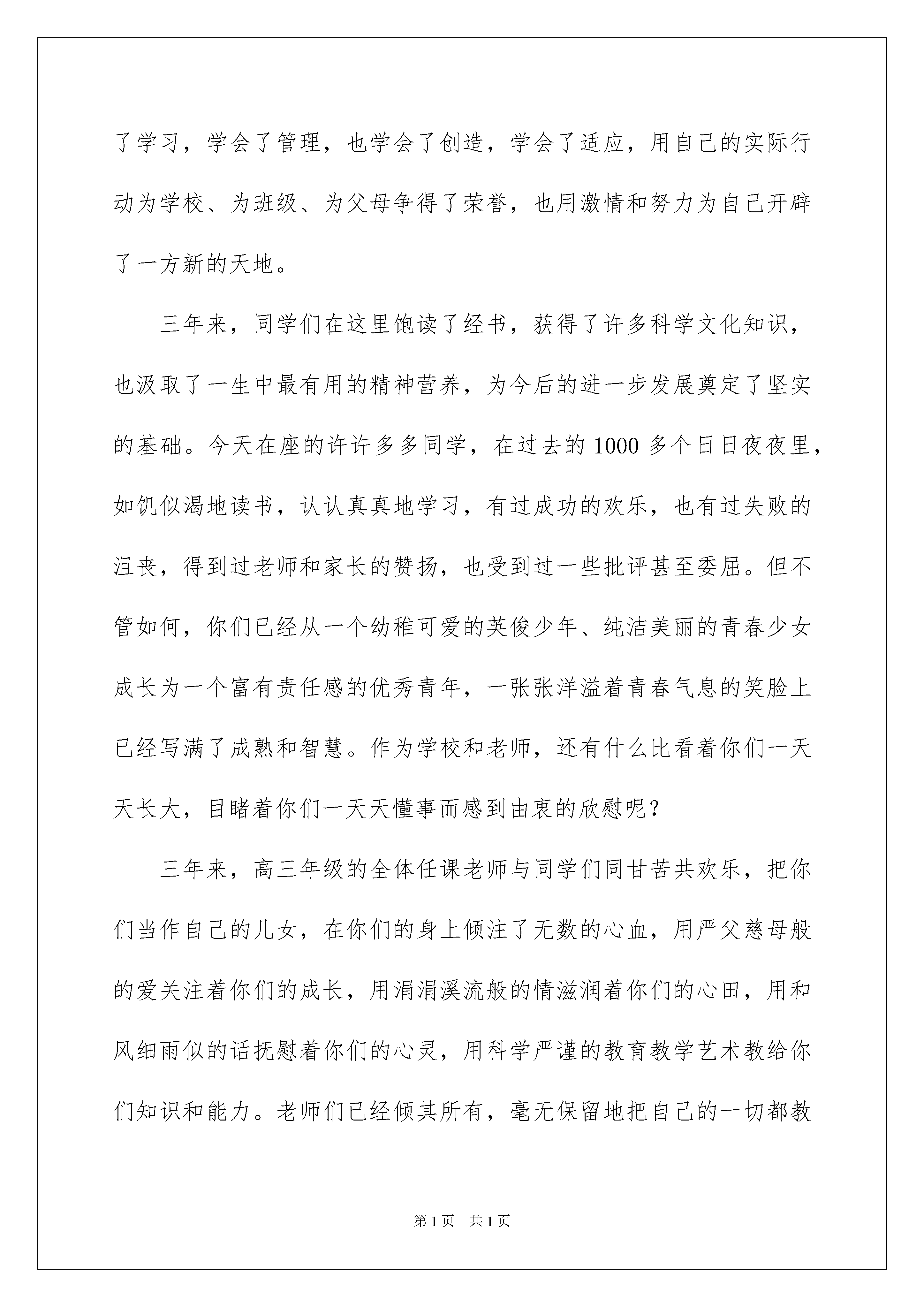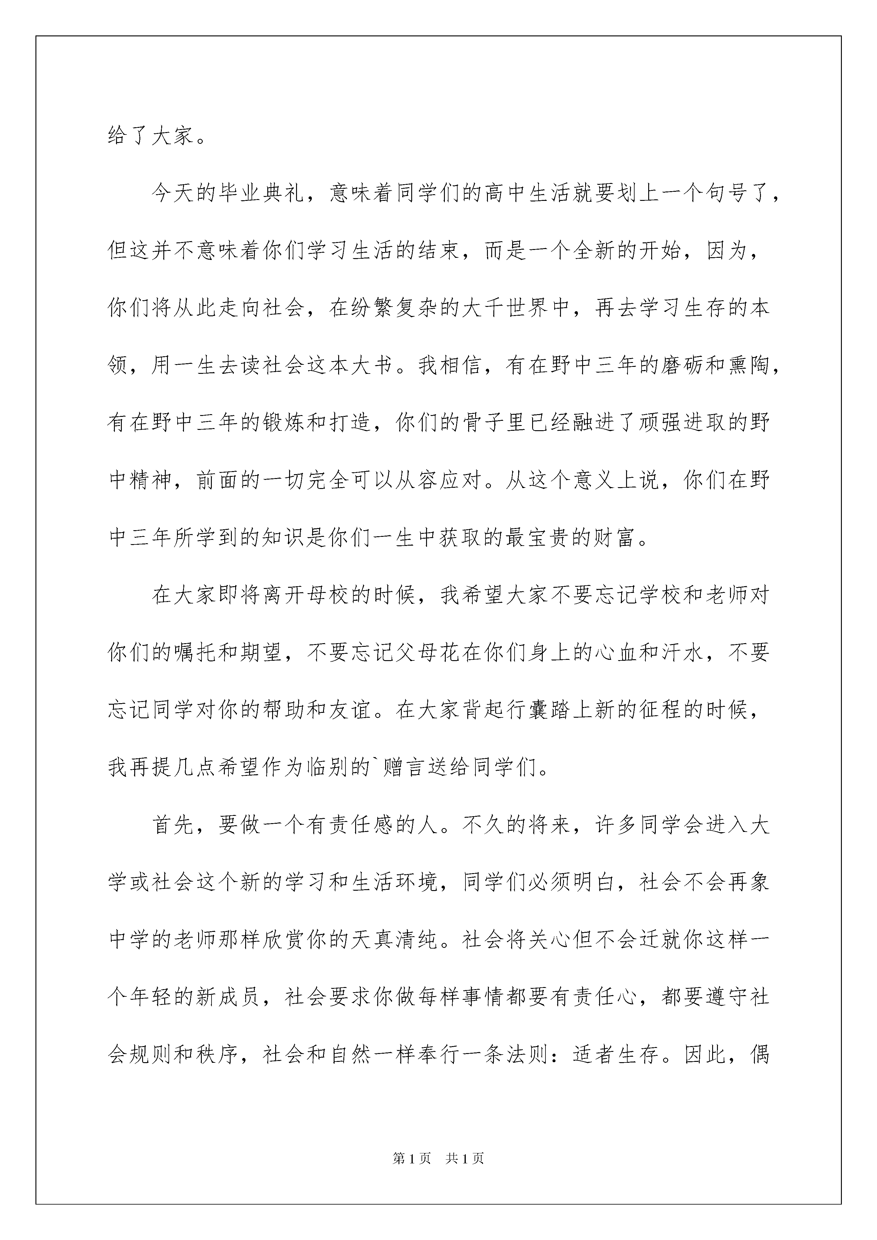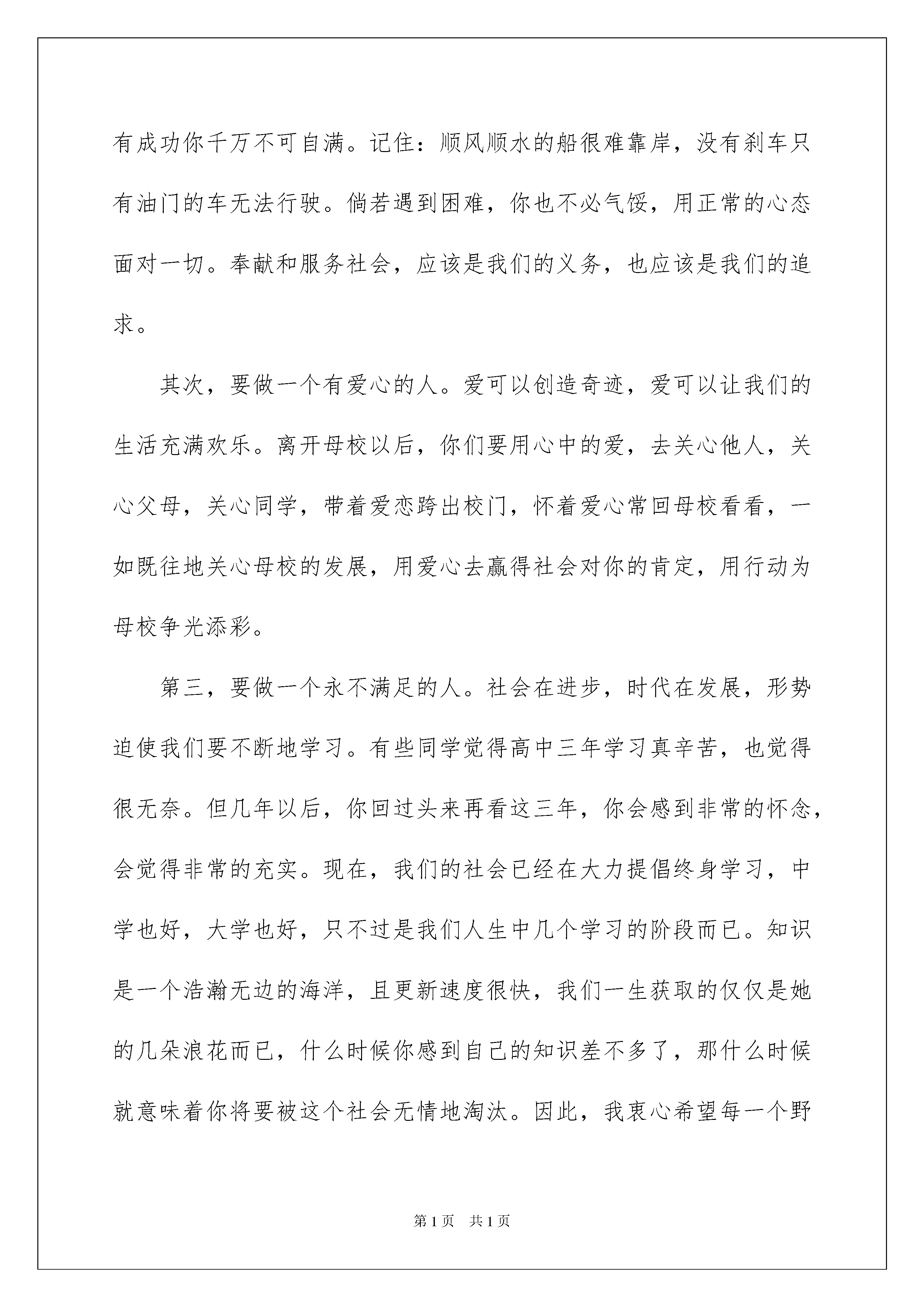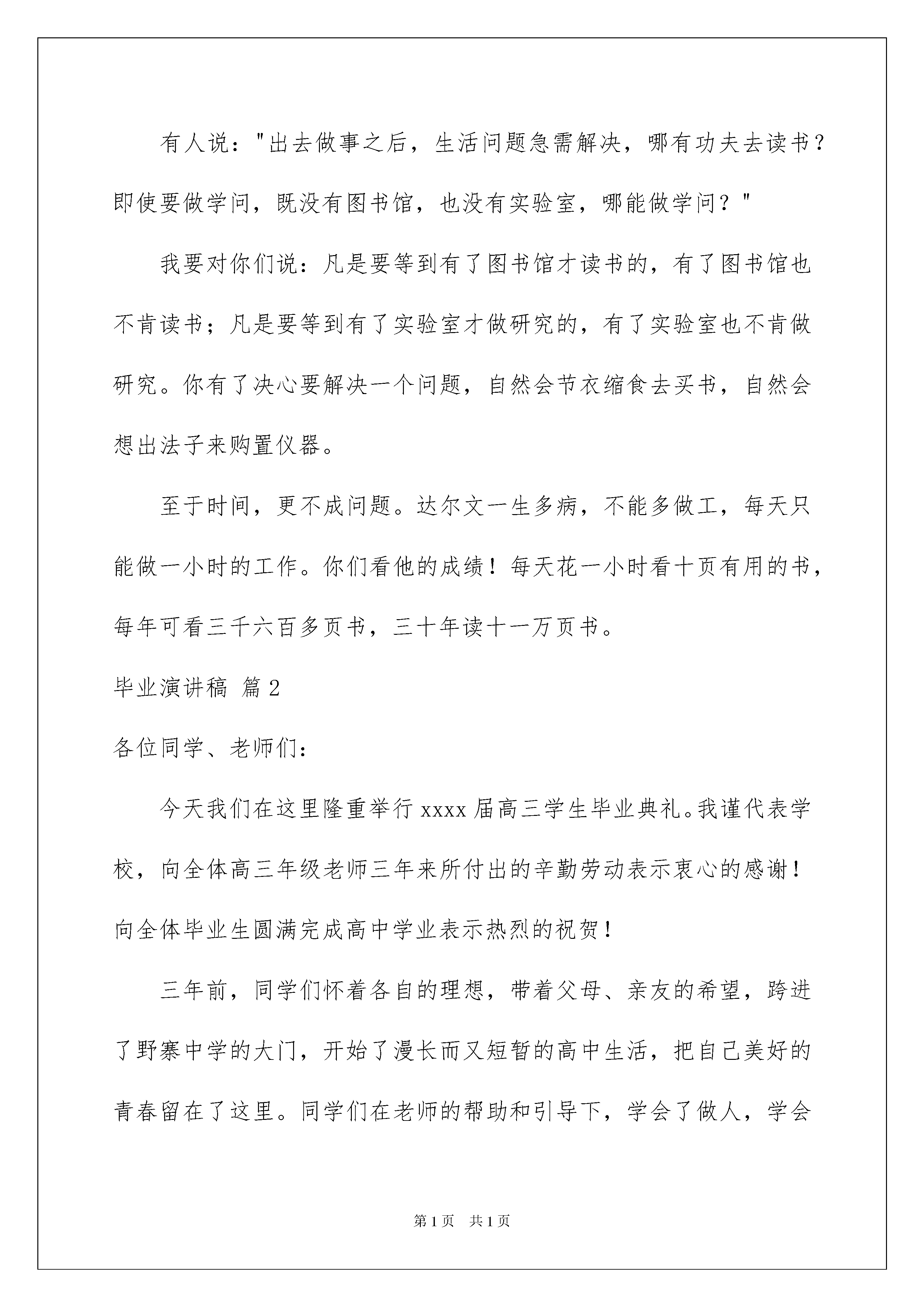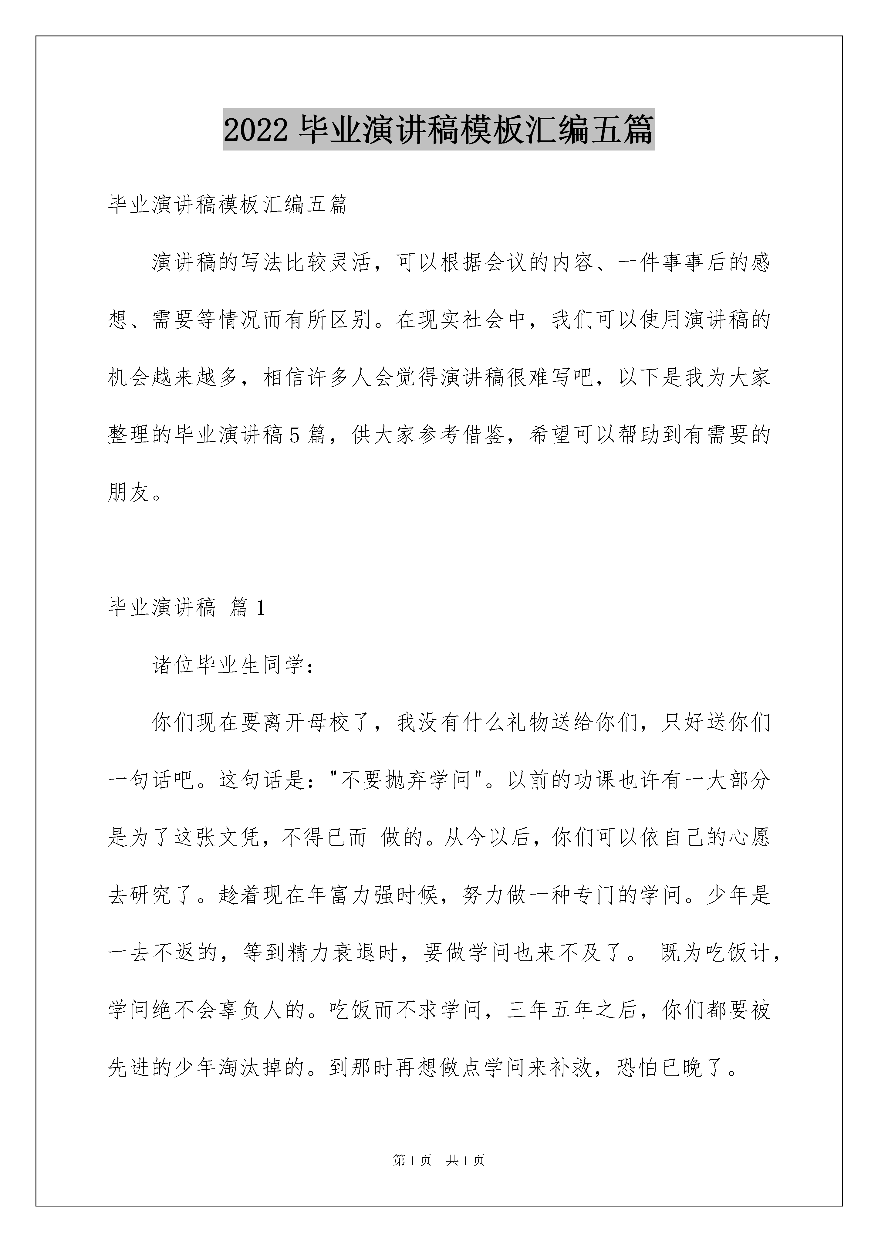 2022毕业演讲稿模板汇编五篇毕业演讲稿模板汇编五篇演讲稿的写法比较灵活,可以根据会议的内容、一件事事后的感想、需要等情况而有所区别。在现实社会中,我们可以使用演讲稿的机会越来越多,相信许多人会觉得演讲稿很难写吧,以下是我为大家整理的毕业演讲稿5篇,供大家参考借鉴,希望可以帮助到有需要的朋友。毕业演讲稿篇1诸位毕业生同学:你们现在要离开母校了,我没有什么礼物送给你们,只好送你们一句话吧。这句话是:"不要抛弃学问"。以前的功课也许有一大部分是为了这张文凭,不得已而做的。从今以后,你们可以依自己的心愿去研究了。趁着现在年富力强时候,努力做一种专门的学问。少年是一去不返的,等到精力衰退时,要做学问也来不及了。既为吃饭计,学问绝不会辜负人的。吃饭而不求学问,三年五年之后,你们都要被先进的少年淘汰掉的。到那时再想做点学问来补救,恐怕已晚了。有人说:"出去做事之后,生活问题急需解决,哪有功夫去读书?即使要做学问,既没有图书馆,也没有实验室,哪能做学问?"我要对你们说:凡是要等到有了图书馆才读书的,有了图书馆也不肯读书;凡是要等到有了实验室才做研究的,有了实验室也不肯做研究。你有了决心要解决一个问题,自然会节衣缩食去买书,自然会想出法子来购置仪器。至于时间,更不成问题。达尔文一生多病,不能多做工,每天只能做一小时的工作。你们看他的成绩!每天花一小时看十页有用的书,每年可看三千六百多页书,三十年读十一万页书。毕业演讲稿篇2各位同学、老师们:今天我们在这里隆重举行xxxx届高三学生毕业典礼。我谨代表学校,向全体高三年级老师三年来所付出的辛勤劳动表示衷心的感谢!向全体毕业生圆满完成高中学业表示热烈的祝贺!三年前,同学们怀着各自的理想,带着父母、亲友的希望,跨进了野寨中学的大门,开始了漫长而又短暂的高中生活,把自己美好的青春留在了这里。同学们在老师的帮助和引导下,学会了做人,学会了学习,学会了管理,也学会了创造,学会了适应,用自己的实际行动为学校、为班级、为父母争得了荣誉,也用激情和努力为自己开辟了一方新的天地。三年来,同学们在这里饱读了经书,获得了许多科学文化知识,也汲取了一生中最有用的精神营养,为今后的进一步发展奠定了坚实的基础。今天在座的许许多多同学,在过去的1000多个日日夜夜里,如饥似渴地读书,认认真真地学习,有过成功的欢乐,也有过失败的沮丧,得到过老师和家长的赞扬,也受到过一些批评甚至委屈。但不管如何,你们已经从一个幼稚可爱的英俊少年、纯洁美丽的青春少女成长为一个富有责任感的优秀青年,一张张洋溢着青春气息的笑脸上已经写满了成熟和智慧。作为学校和老师,还有什么比看着你们一天天长大,目睹着你们一天天懂事而感到由衷的欣慰呢?三年来,高三年级的全体任课老师与同学们同甘苦共欢乐,把你们当作自己的儿女,在你们的身上倾注了无数的心血,用严父慈母般的爱关注着你们的成长,用涓涓溪流般的情滋润着你们的心田,用和风细雨似的话抚慰着你们的心灵,用科学严谨的教育教学艺术教给你们知识和能力。老师们已经倾其所有,毫无保留地把自己的一切都教给了大家。今天的毕业典礼,意味着同学们的高中生活就要划上一个句号了,但这并不意味着你们学习生活的结束,而是一个全新的开始,因为,你们将从此走向社会,在纷繁复杂的大千世界中,再去学习生存的本领,用一生去读社会这本大书。我相信,有在野中三年的磨砺和熏陶,有在野中三年的锻炼和打造,你们的骨子里已经融进了顽强进取的野中精神,前面的一切完全可以从容应对。从这个意义上说,你们在野中三年所学到的知识是你们一生中获取的最宝贵的财富。在大家即将离开母校的时候,我希望大家不要忘记学校和老师对你们的嘱托和期望,不要忘记父母花在你们身上的心血和汗水,不要忘记同学对你的帮助和友谊。在大家背起行囊踏上新的征程的时候,我再提几点希望作为临别的`赠言送给同学们。首先,要做一个有责任感的人。不久的将来,许多同学会进入大学或社会这个新的学习和生活环境,同学们必须明白,社会不会再象中学的老师那样欣赏你的天真清纯。社会将关心但不会迁就你这样一个年轻的新成员,社会要求你做每样事情都要有责任心,都要遵守社会规则和秩序,社会和自然一样奉行一条法则:适者生存。因此,偶有成功你千万不可自满。记住:顺风顺水的船很难靠岸,没有刹车只有油门的车无法行驶。倘若遇到困难,你也不必气馁,用正常的心态面对一切。奉献和服务社会,应该是我们的义务,也应该是我们的追求。其次,要做一个有爱心的人。爱可以创造奇迹,爱可以让我们的生活充满欢乐。离开母校以后,你们要用心中的爱,去关心他人,关心父母,关心同学,带着爱恋跨出校门,怀着爱心常回母校看看,一如既