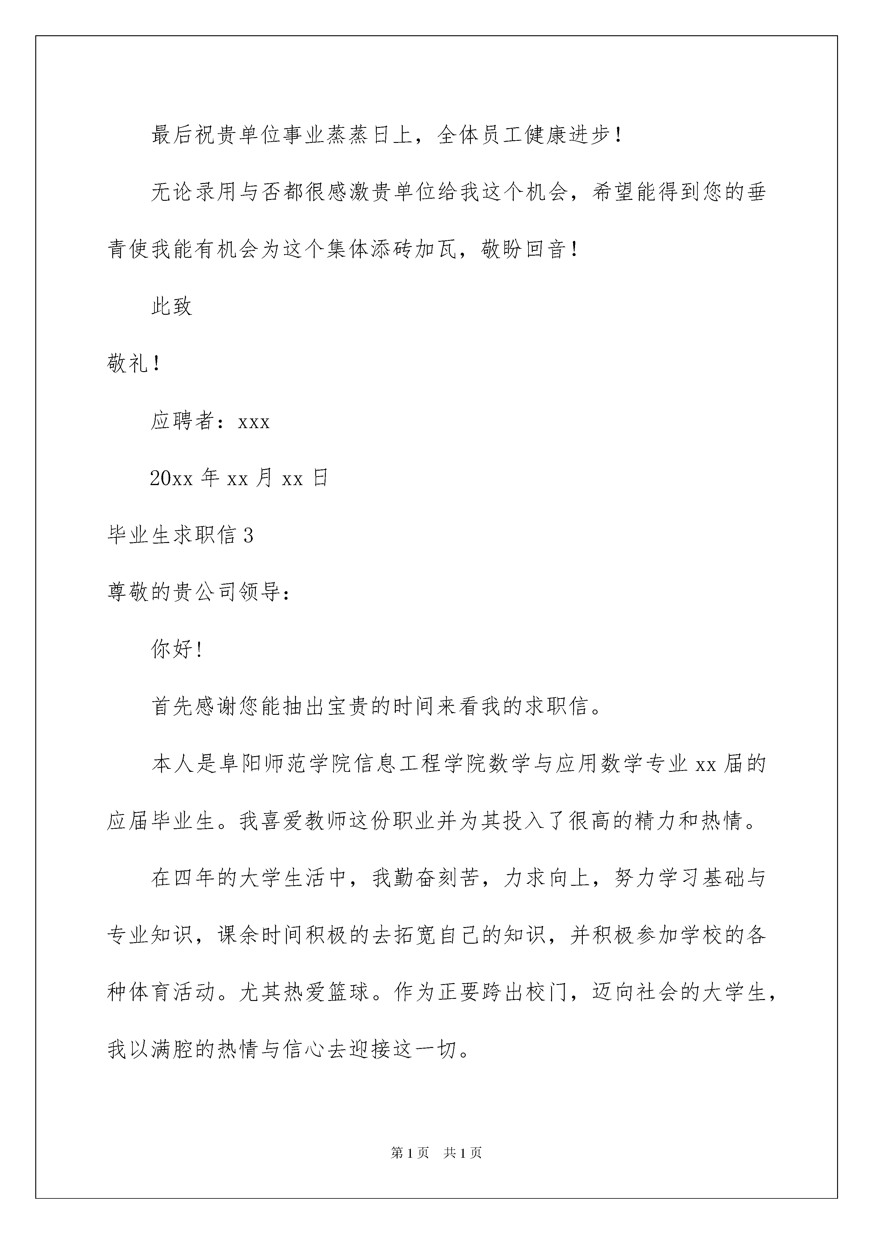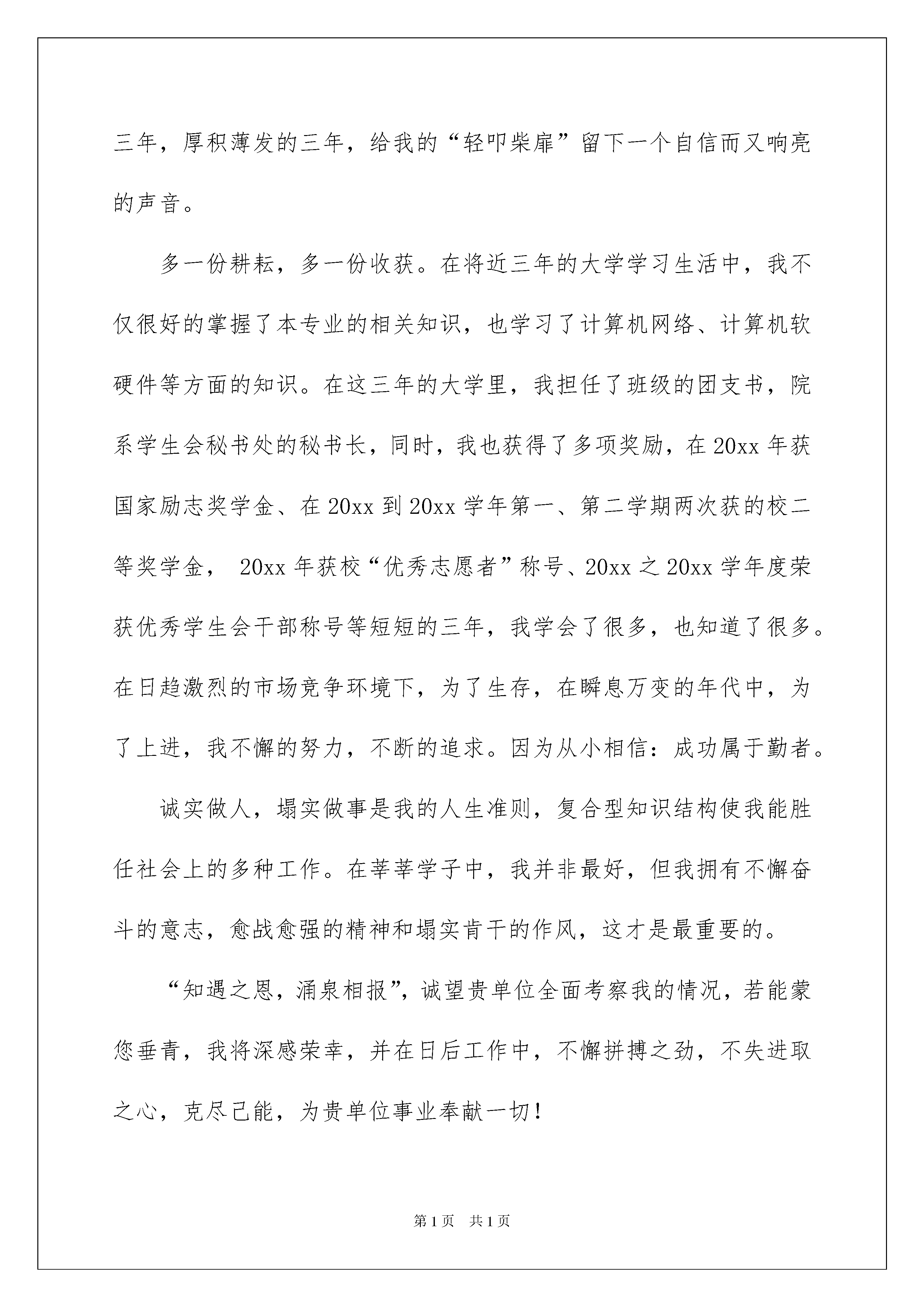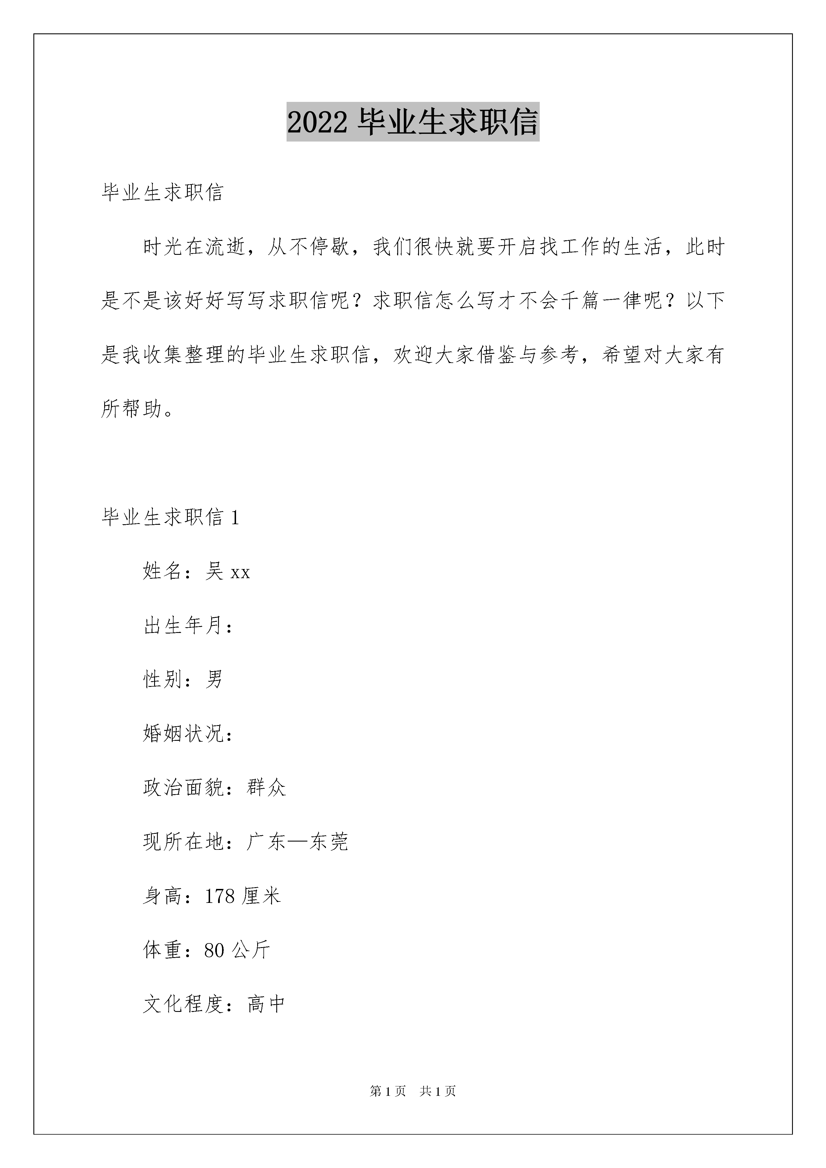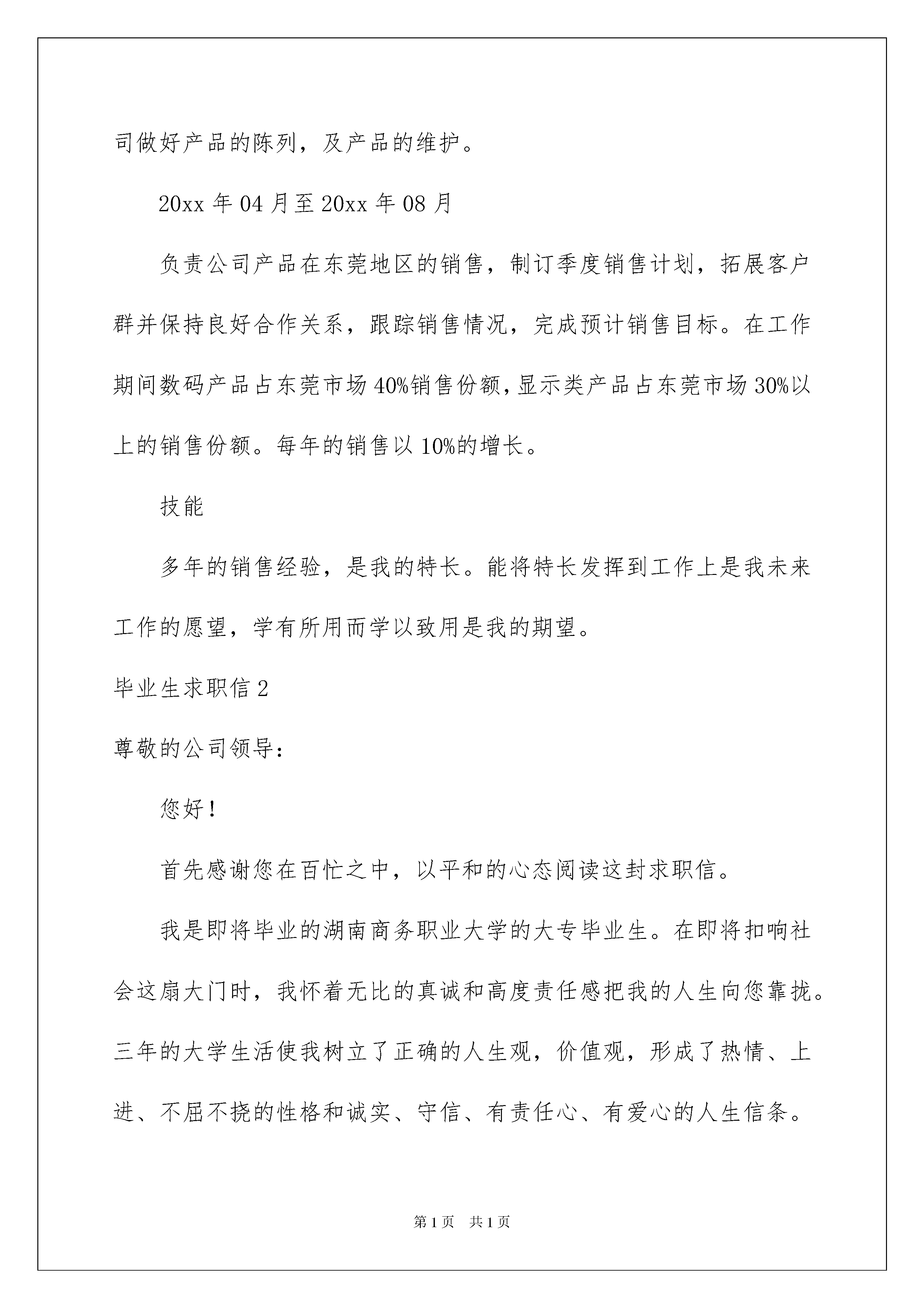 2022毕业生求职信毕业生求职信时光在流逝,从不停歇,我们很快就要开启找工作的生活,此时是不是该好好写写求职信呢?求职信怎么写才不会千篇一律呢?以下是我收集整理的毕业生求职信,欢迎大家借鉴与参考,希望对大家有所帮助。毕业生求职信1姓名:吴xx出生年月:性别:男婚姻状况:政治面貌:群众现所在地:广东—东莞身高:178厘米体重:80公斤文化程度:高中技术职称:销售代表毕业时间:毕业学校:xxx学校所学专业:会计工作年限:求职意向工作性质:全职欲从事岗位一:销售管理主管欲从事岗位二:渠道销售主管欲从事岗位三:销售督导地区:广东—东莞—东莞市月薪要求:面议教育经历20xx年09月至20xx年07月xxx大学会计工作经历20xx年10月至xxxx年xx月主要是负责销售索尼的家电产品,完成公司下达的任务,配合公司做好产品的陈列,及产品的维护。20xx年04月至20xx年08月负责公司产品在东莞地区的销售,制订季度销售计划,拓展客户群并保持良好合作关系,跟踪销售情况,完成预计销售目标。在工作期间数码产品占东莞市场40%销售份额,显示类产品占东莞市场30%以上的销售份额。每年的销售以10%的增长。技能多年的销售经验,是我的特长。能将特长发挥到工作上是我未来工作的愿望,学有所用而学以致用是我的期望。毕业生求职信2尊敬的公司领导:您好!首先感谢您在百忙之中,以平和的心态阅读这封求职信。我是即将毕业的湖南商务职业大学的大专毕业生。在即将扣响社会这扇大门时,我怀着无比的真诚和高度责任感把我的人生向您靠拢。三年的大学生活使我树立了正确的人生观,价值观,形成了热情、上进、不屈不挠的性格和诚实、守信、有责任心、有爱心的人生信条。三年,厚积薄发的三年,给我的“轻叩柴扉”留下一个自信而又响亮的声音。多一份耕耘,多一份收获。在将近三年的大学学习生活中,我不仅很好的掌握了本专业的相关知识,也学习了计算机网络、计算机软硬件等方面的知识。在这三年的大学里,我担任了班级的团支书,院系学生会秘书处的秘书长,同时,我也获得了多项奖励,在20xx年获国家励志奖学金、在20xx到20xx学年第一、第二学期两次获的校二等奖学金,20xx年获校“优秀志愿者”称号、20xx之20xx学年度荣获优秀学生会干部称号等短短的三年,我学会了很多,也知道了很多。在日趋激烈的市场竞争环境下,为了生存,在瞬息万变的年代中,为了上进,我不懈的努力,不断的追求。因为从小相信:成功属于勤者。诚实做人,塌实做事是我的人生准则,复合型知识结构使我能胜任社会上的多种工作。在莘莘学子中,我并非最好,但我拥有不懈奋斗的意志,愈战愈强的精神和塌实肯干的作风,这才是最重要的。“知遇之恩,涌泉相报”,诚望贵单位全面考察我的情况,若能蒙您垂青,我将深感荣幸,并在日后工作中,不懈拼搏之劲,不失进取之心,克尽己能,为贵单位事业奉献一切!最后祝贵单位事业蒸蒸日上,全体员工健康进步!无论录用与否都很感激贵单位给我这个机会,希望能得到您的垂青使我能有机会为这个集体添砖加瓦,敬盼回音!此致敬礼!应聘者:xxx20xx年xx月xx日毕业生求职信3尊敬的贵公司领导:你好!首先感谢您能抽出宝贵的时间来看我的求职信。本人是阜阳师范学院信息工程学院数学与应用数学专业xx届的应届毕业生。我喜爱教师这份职业并为其投入了很高的精力和热情。在四年的大学生活中,我勤奋刻苦,力求向上,努力学习基础与专业知识,课余时间积极的去拓宽自己的知识,并积极参加学校的各种体育活动。尤其热爱篮球。作为正要跨出校门,迈向社会的大学生,我以满腔的热情与信心去迎接这一切。当今社会需要高质量的复合型人才,因此我时刻注意自身的全面提高,建立合理的知识结构。在学习专业知识的同时,我也努力学习课外知识,提高自身素质。四年大学生活的学习和锻炼,给我仅是初步的经验积累,对于迈向社会远远不够的,但所谓士为知已者死,我相信自己的饱满的工作热情以及认真好学的态度完全可以弥补暂时的不足。因此,面对过去,我无怨无悔,来到这里是一种明智的选择;面对现在,我努力拼搏;面对将来,我期待更多的挑战。战胜困难,抓住每一个机遇,相信自己一定会演绎出精彩的一幕.希望通过我的这封求职信,能使您对我有一个更全面深入的了解,我愿意以极大的热情与责任心投入到贵校的发展建设中去。您的选择是我的期望。给我一次机会还您一份惊喜。期待您的回复。最后祝贵校的事业蒸蒸日上--稳步发展!此致敬礼!自荐人:时间:毕业生求职信4敬爱的xxx领导:您好!见信首先祝您身体健康、工作顺利;蒸蒸日上。同时感谢您在百忙之中垂阅我的求职信,相信我这样一个热心求职者一定不会让你失望的。我对公司