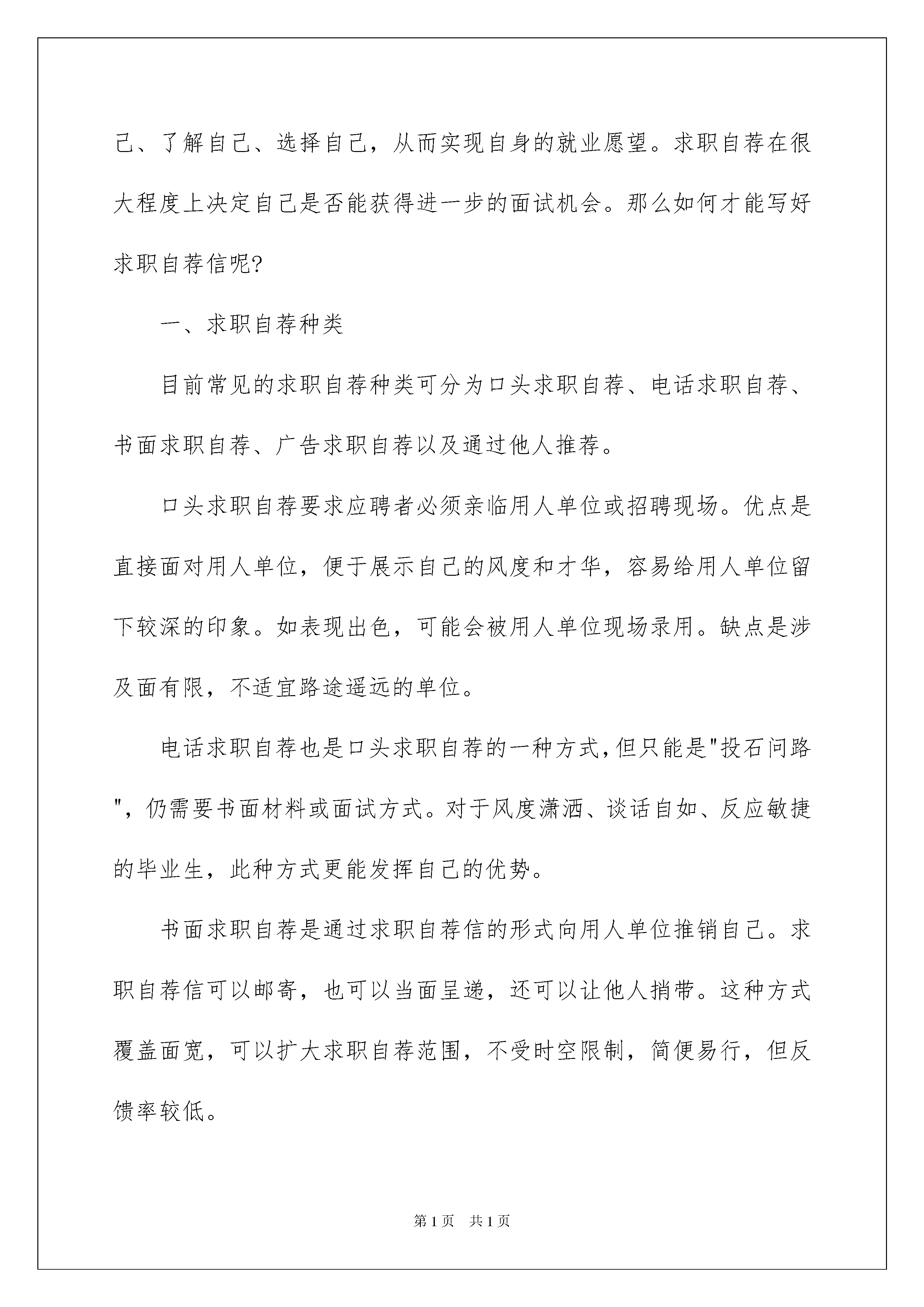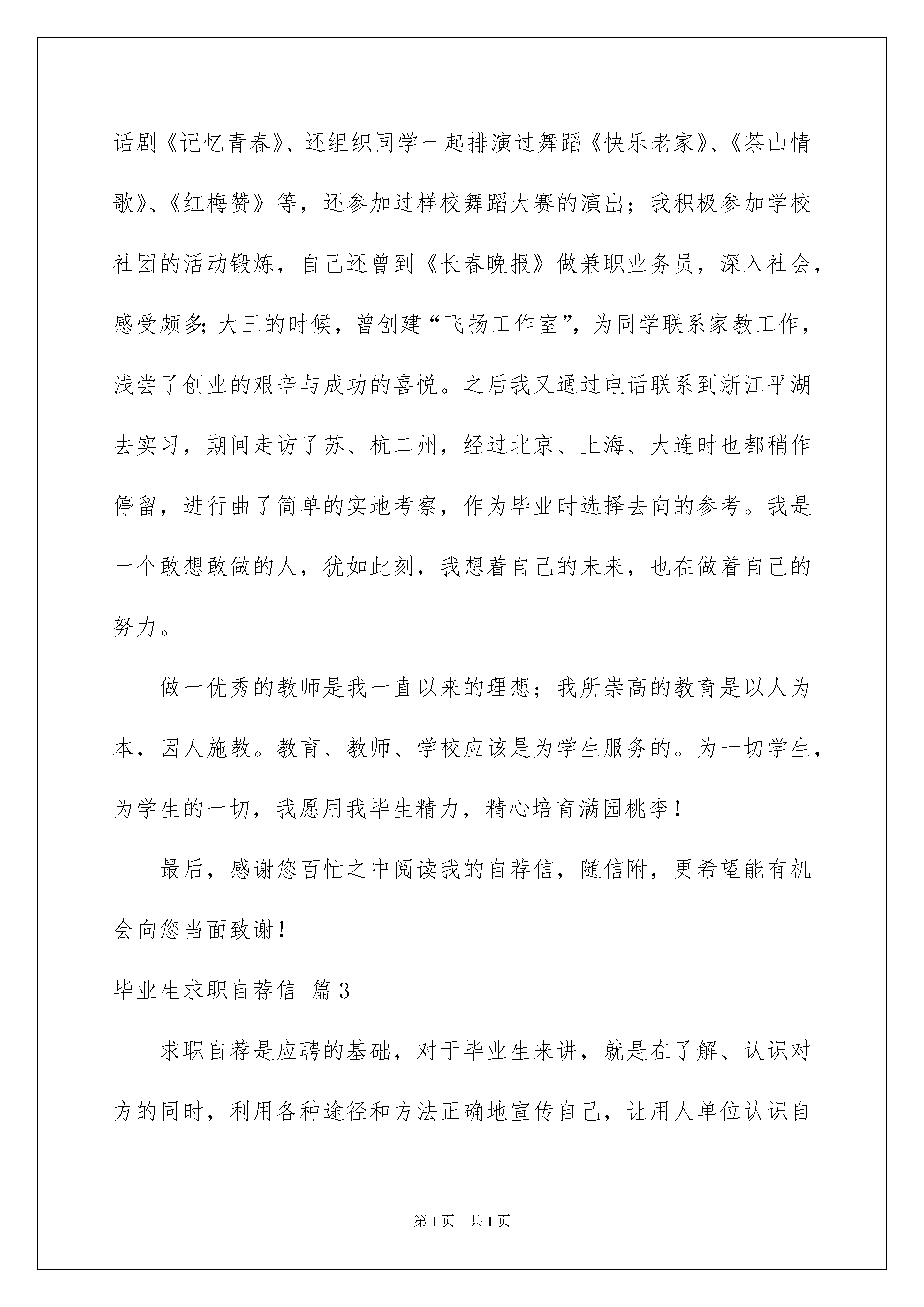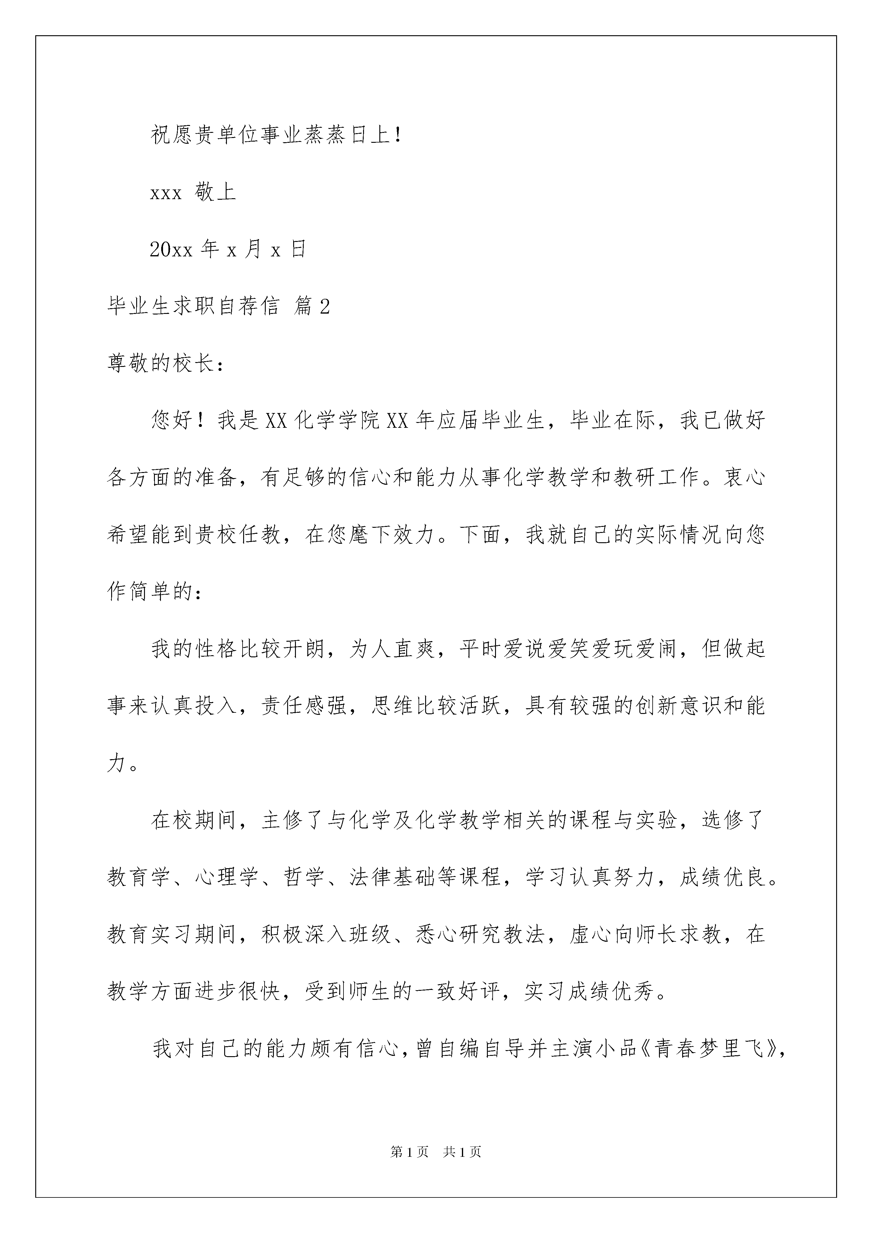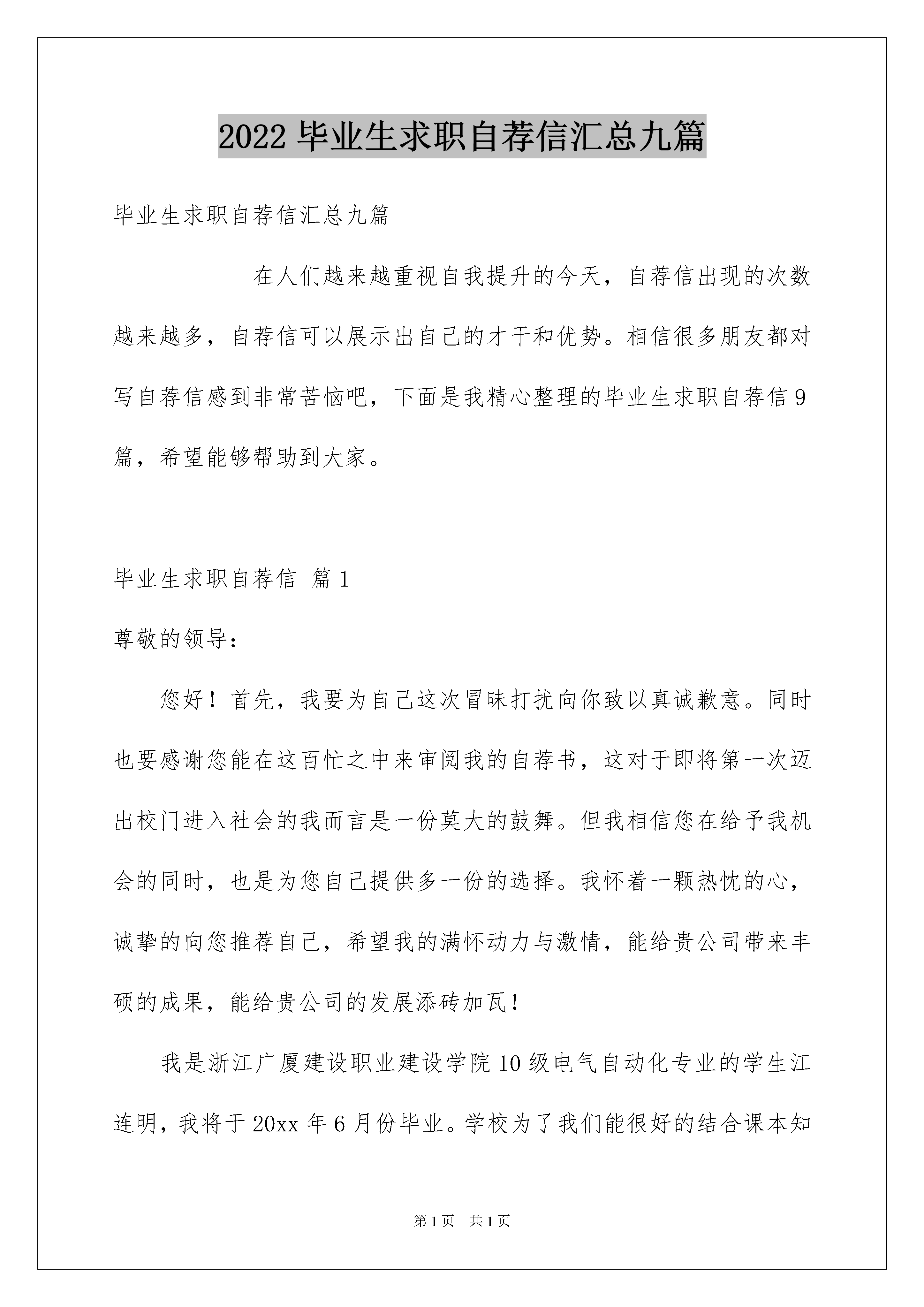 2022毕业生求职自荐信汇总九篇毕业生求职自荐信汇总九篇在人们越来越重视自我提升的今天,自荐信出现的次数越来越多,自荐信可以展示出自己的才干和优势。相信很多朋友都对写自荐信感到非常苦恼吧,下面是我精心整理的毕业生求职自荐信9篇,希望能够帮助到大家。毕业生求职自荐信篇1尊敬的领导:您好!首先,我要为自己这次冒昧打扰向你致以真诚歉意。同时也要感谢您能在这百忙之中来审阅我的自荐书,这对于即将第一次迈出校门进入社会的我而言是一份莫大的鼓舞。但我相信您在给予我机会的同时,也是为您自己提供多一份的选择。我怀着一颗热忱的心,诚挚的向您推荐自己,希望我的满怀动力与激情,能给贵公司带来丰硕的成果,能给贵公司的发展添砖加瓦!我是浙江广厦建设职业建设学院10级电气自动化专业的学生江连明,我将于20xx年6月份毕业。学校为了我们能很好的结合课本知识与社会实践,所以给了我们一年的时间进行社会实践学习,也就是说我在今年的五月份就可以进入社会实习。在校期间,我努力学习各科基础课程与专业课程,并取得比较不错的成绩。两年的大学生涯让我学会了自立,自强。同时也学到了作为一个电气专业的学生应具备的知识,知道如何检测电力方面的故障,了解电力生产方面的重要性。通过两年的努力我考取了计算机二级证书和中级电工证书。因为我来自温州这片神奇的土地,自小就清楚公司的发展需要技术的革新,所以我在广厦两年时间中利用课余时间努力学习计算机知识,希望自己能够成为一位技术与动手方面都出色的学生。我知道一个公司的发展离不开诚信,对一个求职者来说更是如此,而一个好的公司也不会对他的求职者视而不见,小小的A4纸上无法记录我的全部,更多的言语希望能通过行动来记录。我深知一个大专毕业生不会有多么地优秀,也知道自己还存在许许多多的缺点,所以希望贵公司能为我提供一面明镜,在贵公司我能将自己的优点无限放大,在提升自己的同时,也能回报贵公司的培养。收笔之际,郑重地提一个小要求:无论您是否选择我,尊敬的领导,希望您能够接受我诚恳的谢意!祝愿贵单位事业蒸蒸日上!xxx敬上20xx年x月x日毕业生求职自荐信篇2尊敬的校长:您好!我是XX化学学院XX年应届毕业生,毕业在际,我已做好各方面的准备,有足够的信心和能力从事化学教学和教研工作。衷心希望能到贵校任教,在您麾下效力。下面,我就自己的实际情况向您作简单的:我的性格比较开朗,为人直爽,平时爱说爱笑爱玩爱闹,但做起事来认真投入,责任感强,思维比较活跃,具有较强的创新意识和能力。在校期间,主修了与化学及化学教学相关的课程与实验,选修了教育学、心理学、哲学、法律基础等课程,学习认真努力,成绩优良。教育实习期间,积极深入班级、悉心研究教法,虚心向师长求教,在教学方面进步很快,受到师生的一致好评,实习成绩优秀。我对自己的能力颇有信心,曾自编自导并主演小品《青春梦里飞》,话剧《记忆青春》、还组织同学一起排演过舞蹈《快乐老家》、《茶山情歌》、《红梅赞》等,还参加过样校舞蹈大赛的演出;我积极参加学校社团的活动锻炼,自己还曾到《长春晚报》做兼职业务员,深入社会,感受颇多;大三的时候,曾创建“飞扬工作室”,为同学联系家教工作,浅尝了创业的艰辛与成功的喜悦。之后我又通过电话联系到浙江平湖去实习,期间走访了苏、杭二州,经过北京、上海、大连时也都稍作停留,进行曲了简单的实地考察,作为毕业时选择去向的参考。我是一个敢想敢做的人,犹如此刻,我想着自己的未来,也在做着自己的努力。做一优秀的教师是我一直以来的理想;我所崇高的教育是以人为本,因人施教。教育、教师、学校应该是为学生服务的。为一切学生,为学生的一切,我愿用我毕生精力,精心培育满园桃李!最后,感谢您百忙之中阅读我的自荐信,随信附,更希望能有机会向您当面致谢!毕业生求职自荐信篇3求职自荐是应聘的基础,对于毕业生来讲,就是在了解、认识对方的同时,利用各种途径和方法正确地宣传自己,让用人单位认识自己、了解自己、选择自己,从而实现自身的就业愿望。求职自荐在很大程度上决定自己是否能获得进一步的面试机会。那么如何才能写好求职自荐信呢?一、求职自荐种类目前常见的求职自荐种类可分为口头求职自荐、电话求职自荐、书面求职自荐、广告求职自荐以及通过他人推荐。口头求职自荐要求应聘者必须亲临用人单位或招聘现场。优点是直接面对用人单位,便于展示自己的风度和才华,容易给用人单位留下较深的印象。如表现出色,可能会被用人单位现场录用。缺点是涉及面有限,不适宜路途遥远的单位。电话求职自荐也是口头求职自荐的一种方式,但只能是"投石问路",仍需要书面材料或面试方式。对于风度潇洒、谈话自如、反应敏捷的毕业生,此种方式更能发