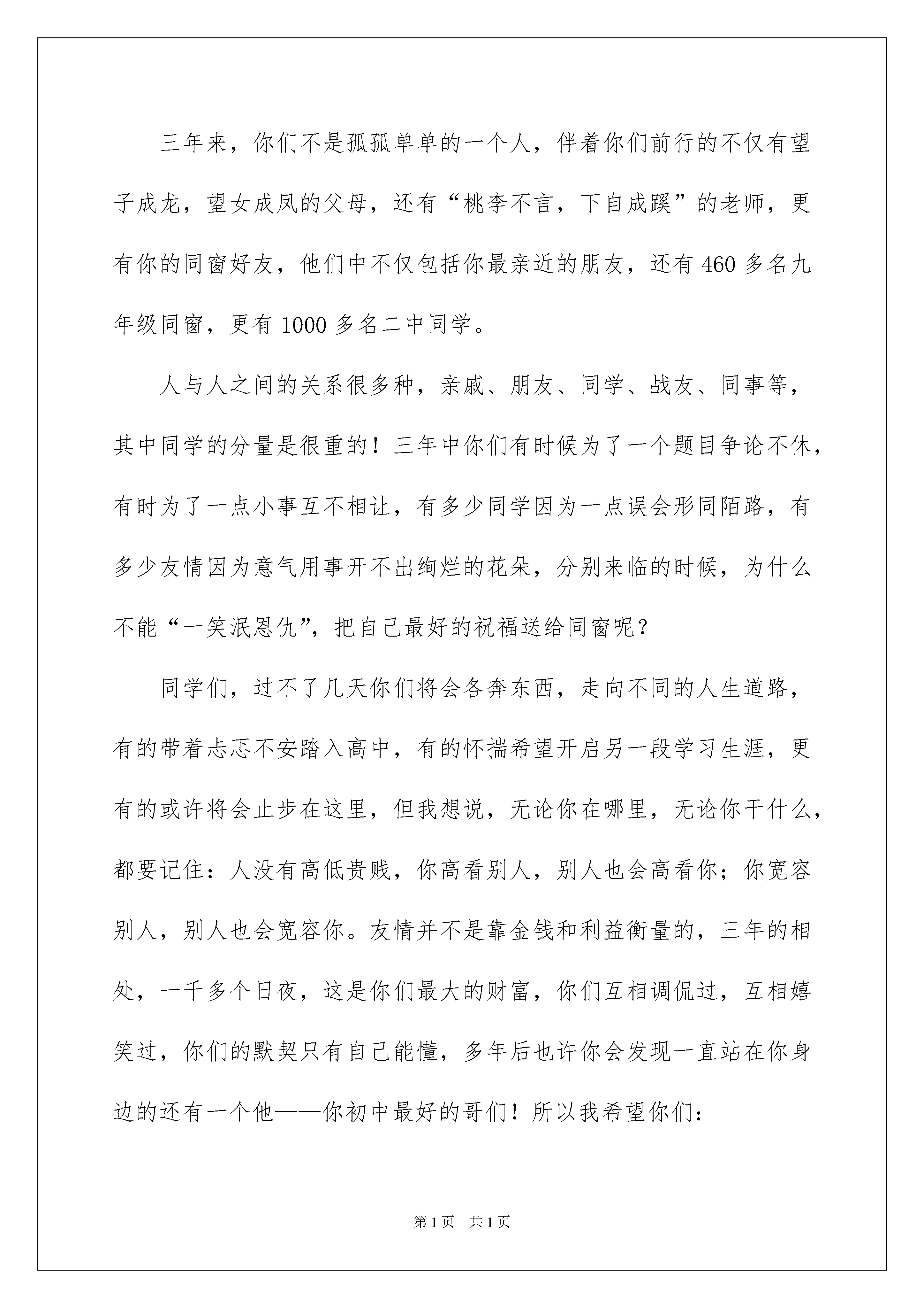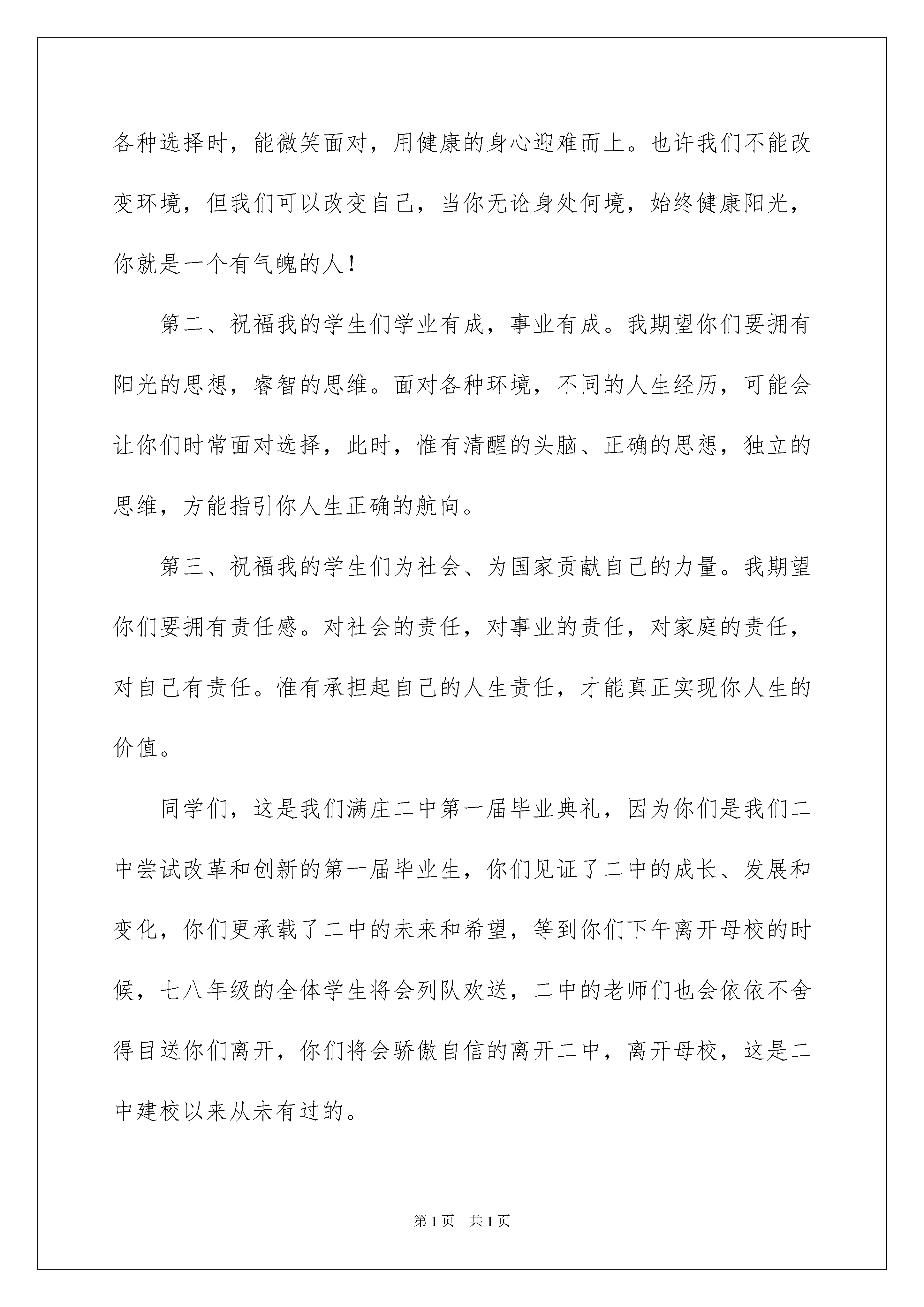 2022毕业生的讲话稿(精选5篇)毕业生的讲话稿(精选5篇)在生活中,越来越多人会去使用讲话稿,讲话稿可以起到指引或总结会议,传达贯彻上级精神等作用。你写讲话稿时总是无从下笔?以下是我为大家整理的毕业生的讲话稿(精选5篇),仅供参考,大家一起来看看吧。毕业生的讲话稿1老师们、同学们:大家好!今天,我们怀着激动的心情,在这里隆重举行满庄二中20xx级九年级毕业典礼。值此,我代表学校对圆满完成初中三年学业的460多名毕业生表示热烈的祝贺,向三年来倾注心血、辛勤育人的老师们表示衷心的感谢和崇高的敬意!同学们,这是一个庄严时刻,也是一个充满希望、迈向未来的美好时刻。今天我们聚在一起,不仅是为了举行一个毕业典礼,更是为了见证你们来之不易的成长与进步,见证你们崭新未来的开始。三年来,你们不是孤孤单单的一个人,伴着你们前行的不仅有望子成龙,望女成凤的父母,还有“桃李不言,下自成蹊”的老师,更有你的同窗好友,他们中不仅包括你最亲近的朋友,还有460多名九年级同窗,更有1000多名二中同学。人与人之间的关系很多种,亲戚、朋友、同学、战友、同事等,其中同学的分量是很重的!三年中你们有时候为了一个题目争论不休,有时为了一点小事互不相让,有多少同学因为一点误会形同陌路,有多少友情因为意气用事开不出绚烂的花朵,分别来临的时候,为什么不能“一笑泯恩仇”,把自己最好的祝福送给同窗呢?同学们,过不了几天你们将会各奔东西,走向不同的人生道路,有的带着忐忑不安踏入高中,有的怀揣希望开启另一段学习生涯,更有的或许将会止步在这里,但我想说,无论你在哪里,无论你干什么,都要记住:人没有高低贵贱,你高看别人,别人也会高看你;你宽容别人,别人也会宽容你。友情并不是靠金钱和利益衡量的,三年的相处,一千多个日夜,这是你们最大的财富,你们互相调侃过,互相嬉笑过,你们的默契只有自己能懂,多年后也许你会发现一直站在你身边的还有一个他——你初中最好的哥们!所以我希望你们:1、珍惜以前共度的时光,珍惜聚在一起的缘分,在这最后的三四天里,跟你们的兄弟姐妹先道声“谢谢”,再道声“珍重”,谢谢他们这三年陪你最多,谢谢他们在离别的日子里依然站在你身边;希望你们能互相珍重,珍重你们的友谊;2、珍惜6月11、12、13、这仅有的在一起的三四天时间。在这最后的三四天里,跟你们的老师们道声“辛苦”,没有他们的辛勤付出就没有你的今天。3、珍惜以后的每一天。将来你们会有成功的喜悦,也会有失败的烦恼,但是不经一番寒彻骨,哪有梅花扑鼻香。很多新的高峰要你们去攀登,但请记住无论哪个位置,哪个地方,唯有勤奋才能超越他人,创造辉煌。希望在最后的三四天里,你们能把自己美好的一面留给同学,留给老师,留给给母校。你们即将毕业离校,我也有三个祝福要送给你们:第一、祝福我的学生们永远保持年轻的身心,我期望你们把健康当成一种气魄。纷纷扰扰的生活,也许会让你感到困惑迷失自我;林林总总的人生,并非都是平坦宽阔的通天大道。我只希望当大家面对各种选择时,能微笑面对,用健康的身心迎难而上。也许我们不能改变环境,但我们可以改变自己,当你无论身处何境,始终健康阳光,你就是一个有气魄的人!第二、祝福我的学生们学业有成,事业有成。我期望你们要拥有阳光的思想,睿智的思维。面对各种环境,不同的人生经历,可能会让你们时常面对选择,此时,惟有清醒的头脑、正确的思想,独立的思维,方能指引你人生正确的航向。第三、祝福我的学生们为社会、为国家贡献自己的力量。我期望你们要拥有责任感。对社会的责任,对事业的责任,对家庭的责任,对自己有责任。惟有承担起自己的人生责任,才能真正实现你人生的价值。同学们,这是我们满庄二中第一届毕业典礼,因为你们是我们二中尝试改革和创新的第一届毕业生,你们见证了二中的成长、发展和变化,你们更承载了二中的未来和希望,等到你们下午离开母校的时候,七八年级的全体学生将会列队欢送,二中的老师们也会依依不舍得目送你们离开,你们将会骄傲自信的离开二中,离开母校,这是二中建校以来从未有过的。最后,希望你们带着自信出发,用微笑去面对中考,祝愿学生们在中考中金榜题名!谢谢大家!毕业生的讲话稿2亲爱的同学们:大家下午好!再过三个月,你们就要离开母校,升入高一级中学了!坐在这里,看到大家一张张熟悉的脸庞,作为你们母校的老师感到分外的高兴,同时也感到责任的重大。你们在洪家楼第三小学学习了将近六年,你们从一年级的aoe123学起,到现在能写作善表达,老师们为了你们健康的成长付出了很多很多!他们如父母一样不仅关心你的学习,也关心着你的生活,现在老师们仍然一如既往地关心着你们,希望你们能顺利的毕业,能以一个优异