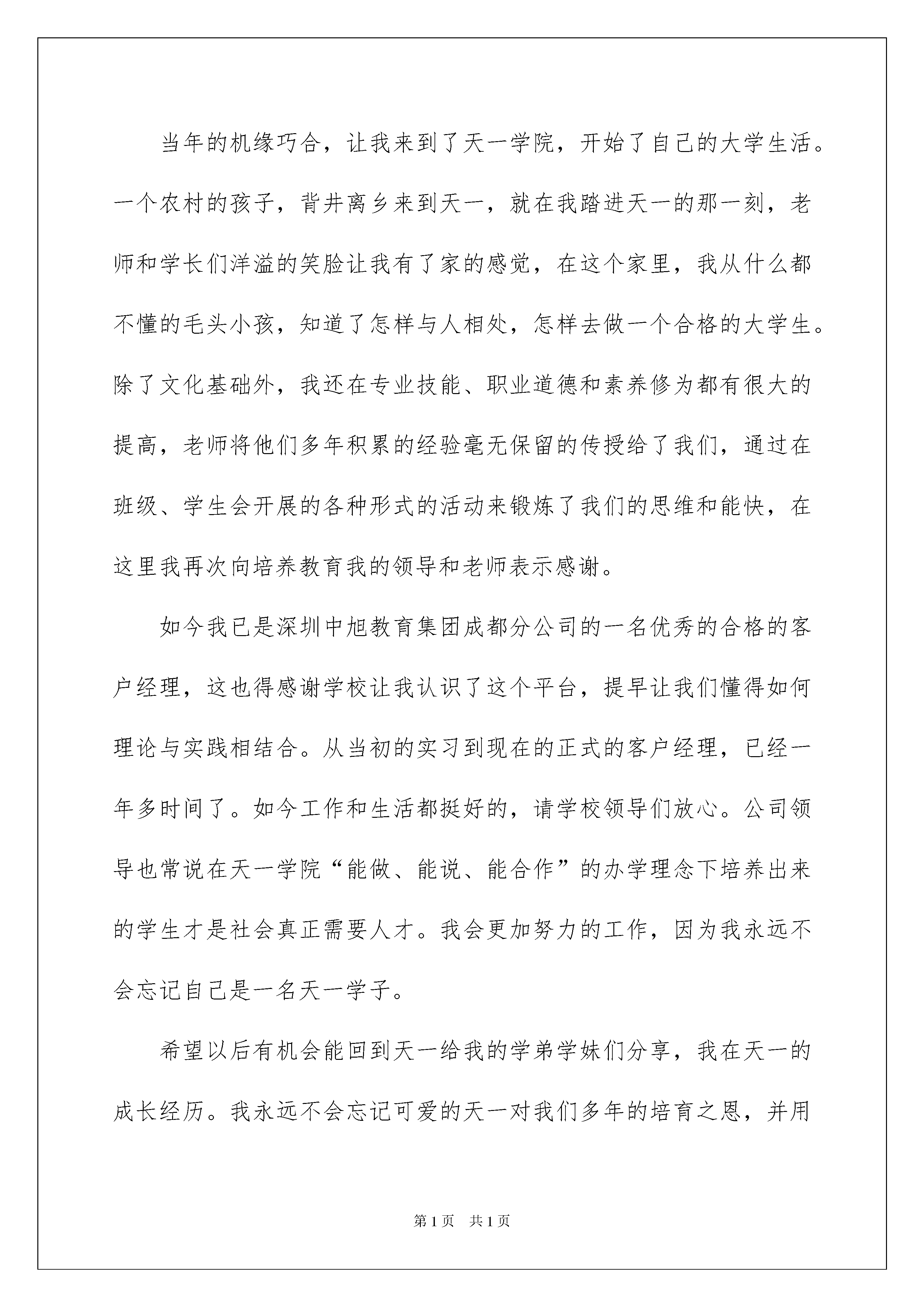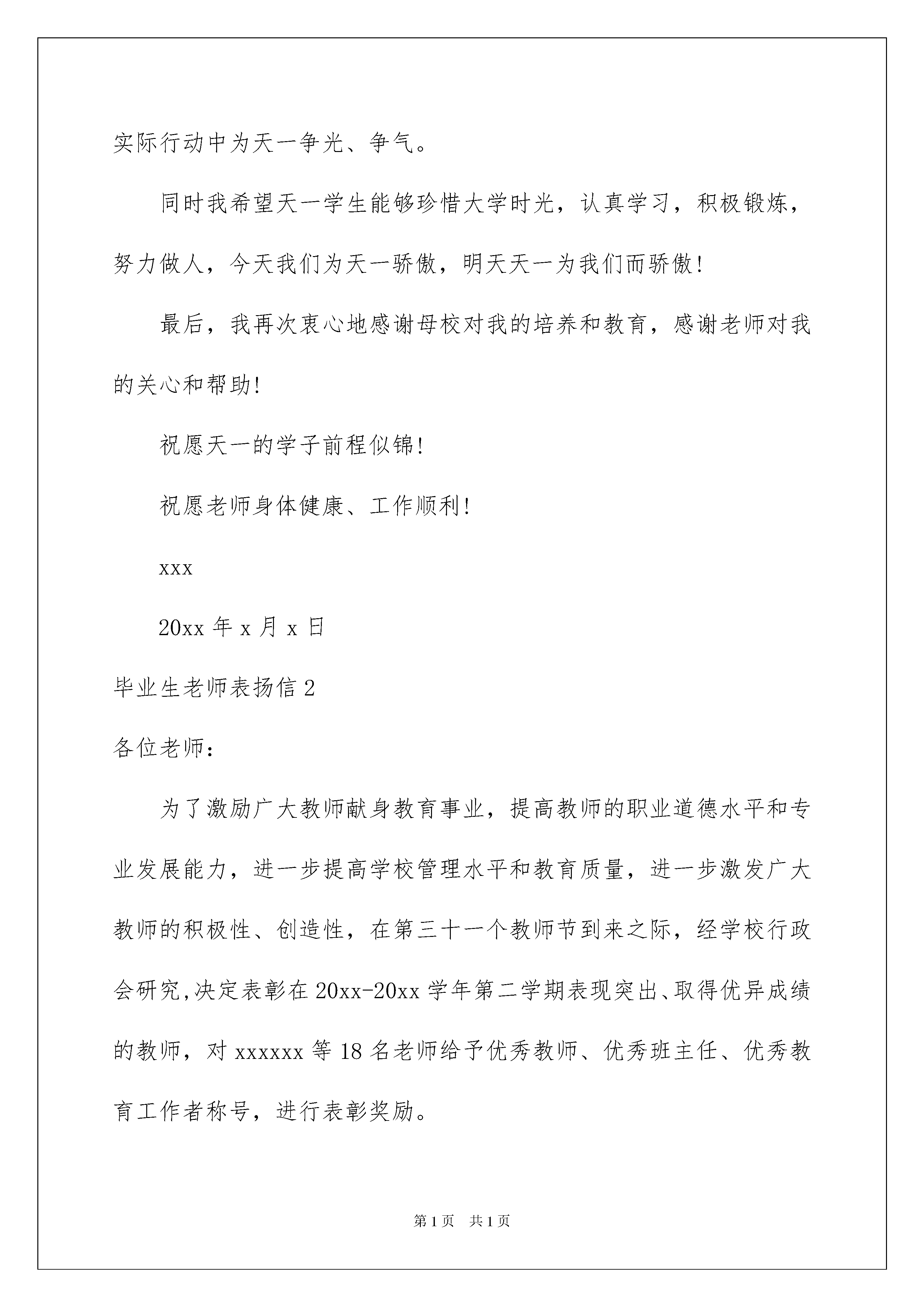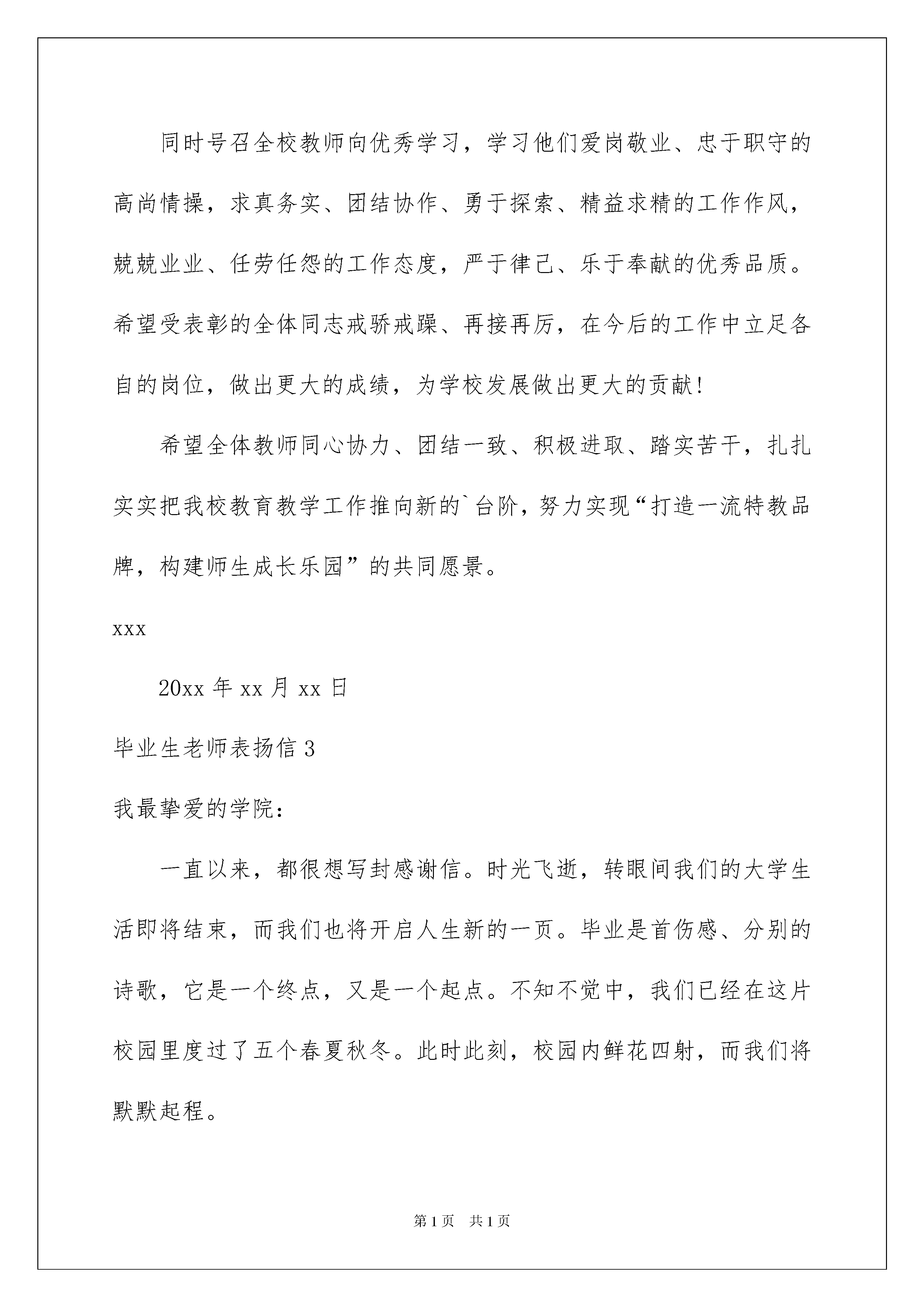 2022毕业生老师表扬信毕业生老师表扬信在社会一步步向前发展的今天,表扬信与我们的生活息息相关,通过表扬信可以对他人的行为表示赞扬。相信写表扬信是一个让许多人都头痛的问题,以下是我为大家整理的毕业生老师表扬信,希望能够帮助到大家。毕业生老师表扬信1敬爱的天一学院经济系各位领导、老师:您们好!我是天一学院经济系20xx届国际贸易专业毕业生赵恋。今天写这封信给母校,是希望对母校老师三年的悉心培养和教育表示由衷的感谢!时光飞逝,毕业已经几个月时间了,但是母校的点点滴滴犹在眼前,XX年8月29日第一次踏进天一的那一激动的心情仿佛就在昨天。老师在讲台上的背影,辅导员的关爱和指导,我曾经活跃过的各种活动场所,这一幕幕都记忆犹新。当年的机缘巧合,让我来到了天一学院,开始了自己的大学生活。一个农村的孩子,背井离乡来到天一,就在我踏进天一的那一刻,老师和学长们洋溢的笑脸让我有了家的感觉,在这个家里,我从什么都不懂的毛头小孩,知道了怎样与人相处,怎样去做一个合格的大学生。除了文化基础外,我还在专业技能、职业道德和素养修为都有很大的提高,老师将他们多年积累的经验毫无保留的传授给了我们,通过在班级、学生会开展的各种形式的活动来锻炼了我们的思维和能快,在这里我再次向培养教育我的领导和老师表示感谢。如今我已是深圳中旭教育集团成都分公司的一名优秀的合格的客户经理,这也得感谢学校让我认识了这个平台,提早让我们懂得如何理论与实践相结合。从当初的实习到现在的正式的客户经理,已经一年多时间了。如今工作和生活都挺好的,请学校领导们放心。公司领导也常说在天一学院“能做、能说、能合作”的办学理念下培养出来的学生才是社会真正需要人才。我会更加努力的工作,因为我永远不会忘记自己是一名天一学子。希望以后有机会能回到天一给我的学弟学妹们分享,我在天一的成长经历。我永远不会忘记可爱的天一对我们多年的培育之恩,并用实际行动中为天一争光、争气。同时我希望天一学生能够珍惜大学时光,认真学习,积极锻炼,努力做人,今天我们为天一骄傲,明天天一为我们而骄傲!最后,我再次衷心地感谢母校对我的培养和教育,感谢老师对我的关心和帮助!祝愿天一的学子前程似锦!祝愿老师身体健康、工作顺利!xxx20xx年x月x日毕业生老师表扬信2各位老师:为了激励广大教师献身教育事业,提高教师的职业道德水平和专业发展能力,进一步提高学校管理水平和教育质量,进一步激发广大教师的积极性、创造性,在第三十一个教师节到来之际,经学校行政会研究,决定表彰在20xx-20xx学年第二学期表现突出、取得优异成绩的教师,对xxxxxx等18名老师给予优秀教师、优秀班主任、优秀教育工作者称号,进行表彰奖励。同时号召全校教师向优秀学习,学习他们爱岗敬业、忠于职守的高尚情操,求真务实、团结协作、勇于探索、精益求精的工作作风,兢兢业业、任劳任怨的工作态度,严于律己、乐于奉献的优秀品质。希望受表彰的全体同志戒骄戒躁、再接再厉,在今后的工作中立足各自的岗位,做出更大的成绩,为学校发展做出更大的贡献!希望全体教师同心协力、团结一致、积极进取、踏实苦干,扎扎实实把我校教育教学工作推向新的`台阶,努力实现“打造一流特教品牌,构建师生成长乐园”的共同愿景。xxx20xx年xx月xx日毕业生老师表扬信3我最挚爱的学院:一直以来,都很想写封感谢信。时光飞逝,转眼间我们的大学生活即将结束,而我们也将开启人生新的一页。毕业是首伤感、分别的诗歌,它是一个终点,又是一个起点。不知不觉中,我们已经在这片校园里度过了五个春夏秋冬。此时此刻,校园内鲜花四射,而我们将默默起程。五年前,我们从五湖四海相聚在这里。人生!梦想!我们在这五年的时间里寻找、追求、奋斗!学校的周到关怀,老师的谆谆教导,同学们的互敬互爱都是我们青春记忆里永不抹灭的亮点。回首五年匆匆,我们哭过、笑过、吵过、闹过。感谢那些教育我们的领导、老师,是你们让我们明白知识的重量;感谢那些帮助我们的师长、朋友,是你们让我们明白友情的存在;感谢那些关心我们的同窗、知己,是你们让我们明白岁月的珍贵。感谢授课老师们的辛勤耕耘,你们的努力使得我们收获到了知识的果实。感谢学院各职能部门老师的努力,你们的辛勤汗水换来的是大家美满的学习、生活环境。感谢所有学工的老师们,是你们的付出,保障了学校教学秩序的正常运转,才能有了我们丰富的业余文化生活。还记得军训开始那晚,嘈杂的操场还回响着教官嘹亮的口号,烈日炎炎的晌午,整齐的队列前是滴滴未干的汗水。还记得实习离校的早晨,宁静的校园还没有上课铃声的打扰,校车也只能在晨雾的远处若隐若现;还记得第一次看到满实验室标本时的惊叹;还记得第一次