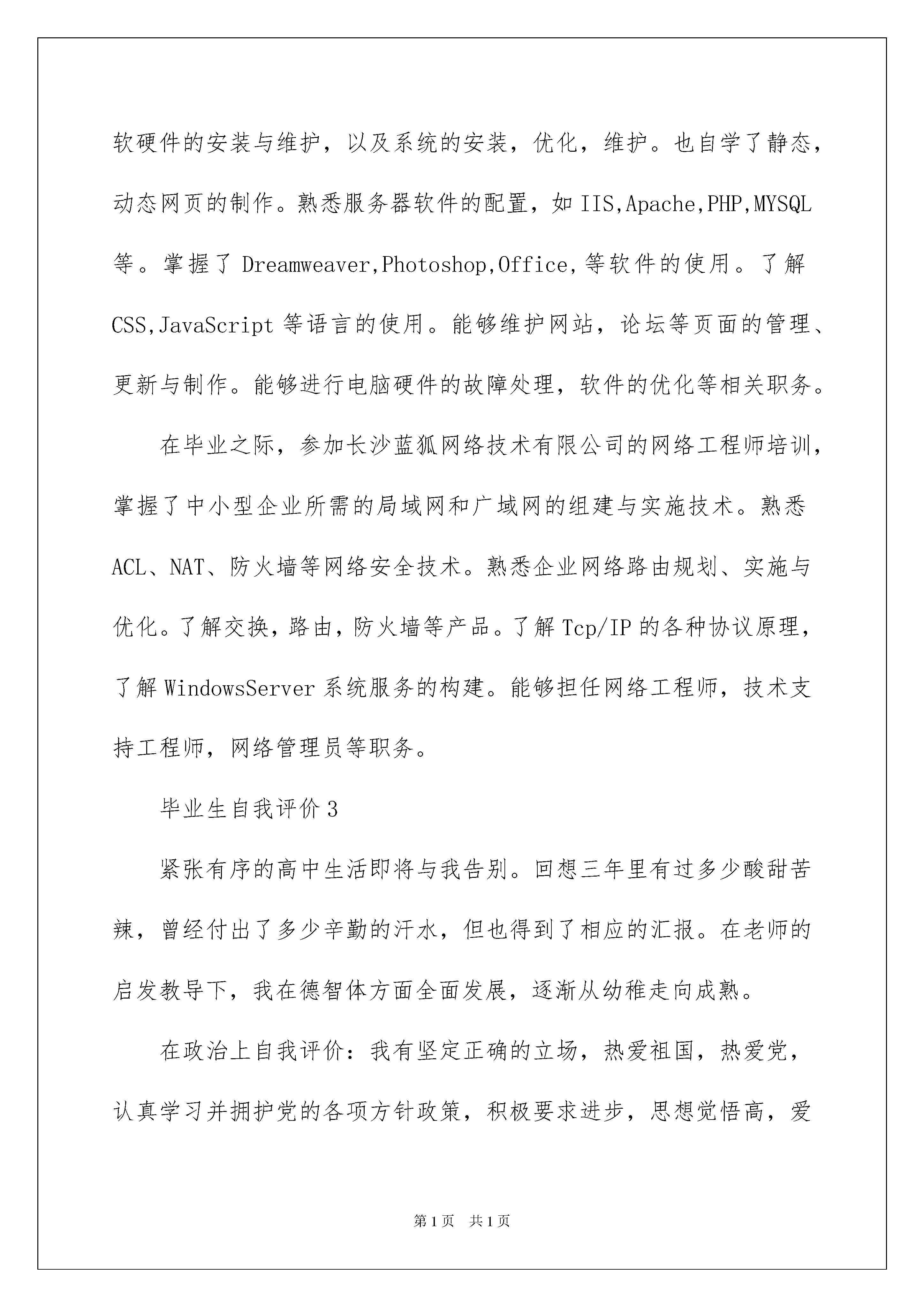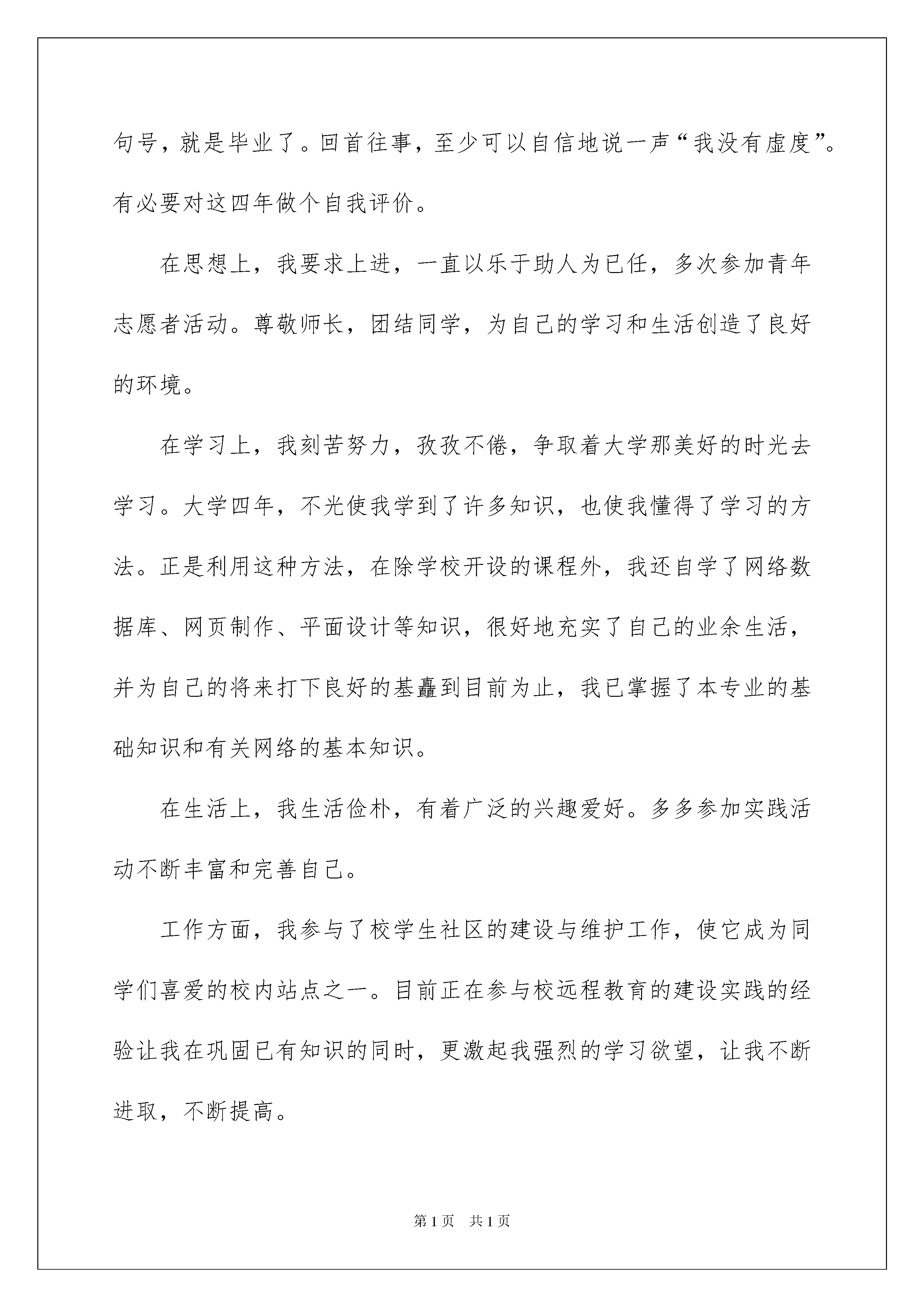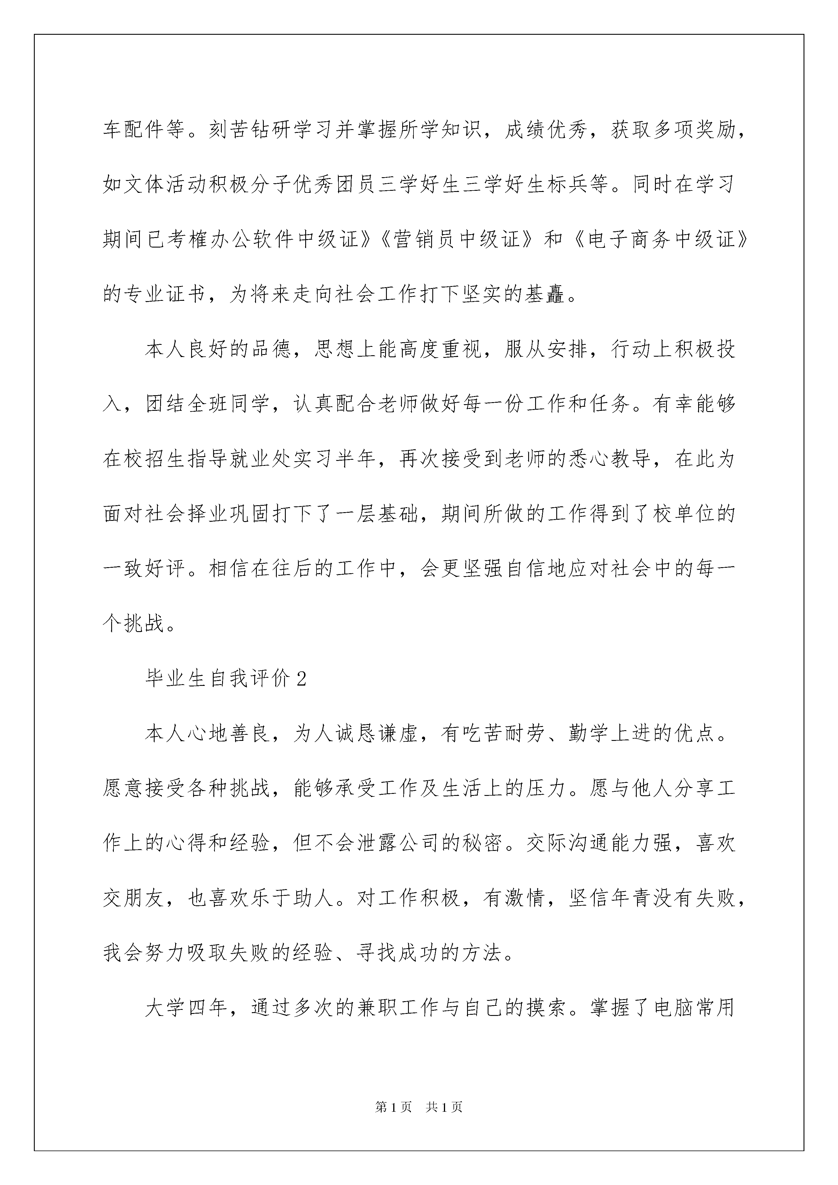 2022毕业生自我评价(精选6篇)毕业生自我评价(精选6篇)在平日的学习、工作和生活里,我们总免不了要写自我评价,自我评价是进行自我教育、自我完善的重要途径之一。如何写一份恰当的自我评价呢?以下是我精心整理的毕业生自我评价(精选6篇),仅供参考,欢迎大家阅读。毕业生自我评价1中专三年的学习生活如流星一瞬间就过去了,面对社会就业的挑战,从容地面对现实、面对择业,自己会把压力促使变为动力。回顾中专三年的历程,从踏入班的那一步起,承蒙班主任的提拔担任班长一职至毕业,自觉在各方面都得到很好的磨练。跨入中专的门槛时的迷茫,再经过刻苦学习,充实自己,面临走向社会工作,从而又多了一份从容,多了一份自信。自身能力的提高,除了自己保持乐观的人生态度外,更重要的是得益于中专三年的学习积累和技术的培养。在中专的三年学习过程中,自己所学的专业课程主要有:顾客心理学、市场营销、汽车保险与理赔、机械制图、市场调查与分析、汽车配件等。刻苦钻研学习并掌握所学知识,成绩优秀,获取多项奖励,如文体活动积极分子优秀团员三学好生三学好生标兵等。同时在学习期间已考榷办公软件中级证》《营销员中级证》和《电子商务中级证》的专业证书,为将来走向社会工作打下坚实的基矗。本人良好的品德,思想上能高度重视,服从安排,行动上积极投入,团结全班同学,认真配合老师做好每一份工作和任务。有幸能够在校招生指导就业处实习半年,再次接受到老师的悉心教导,在此为面对社会择业巩固打下了一层基础,期间所做的工作得到了校单位的一致好评。相信在往后的工作中,会更坚强自信地应对社会中的每一个挑战。毕业生自我评价2本人心地善良,为人诚恳谦虚,有吃苦耐劳、勤学上进的优点。愿意接受各种挑战,能够承受工作及生活上的压力。愿与他人分享工作上的心得和经验,但不会泄露公司的秘密。交际沟通能力强,喜欢交朋友,也喜欢乐于助人。对工作积极,有激情,坚信年青没有失败,我会努力吸取失败的经验、寻找成功的方法。大学四年,通过多次的兼职工作与自己的摸索。掌握了电脑常用软硬件的安装与维护,以及系统的安装,优化,维护。也自学了静态,动态网页的制作。熟悉服务器软件的配置,如IIS,Apache,PHP,MYSQL等。掌握了Dreamweaver,Photoshop,Office,等软件的使用。了解CSS,JavaScript等语言的使用。能够维护网站,论坛等页面的管理、更新与制作。能够进行电脑硬件的故障处理,软件的优化等相关职务。在毕业之际,参加长沙蓝狐网络技术有限公司的网络工程师培训,掌握了中小型企业所需的局域网和广域网的组建与实施技术。熟悉ACL、NAT、防火墙等网络安全技术。熟悉企业网络路由规划、实施与优化。了解交换,路由,防火墙等产品。了解Tcp/IP的各种协议原理,了解WindowsServer系统服务的构建。能够担任网络工程师,技术支持工程师,网络管理员等职务。毕业生自我评价3紧张有序的高中生活即将与我告别。回想三年里有过多少酸甜苦辣,曾经付出了多少辛勤的汗水,但也得到了相应的汇报。在老师的启发教导下,我在德智体方面全面发展,逐渐从幼稚走向成熟。在政治上自我评价:我有坚定正确的立场,热爱祖国,热爱党,认真学习并拥护党的各项方针政策,积极要求进步,思想觉悟高,爱憎分明,踊跃参加各项社会公益活动,主动投入捐款救灾行列,用微薄的力量,表达自己的爱心,做一个文明市民。在学习上自我评价:我有刻苦钻研的学习精神,学习态度端正,目的明确,专心上课并做好笔记,注重理解和掌握,强化练习,学会分类归纳,不断评价,摸索出适合自己的`学习方法,养成良好的学习习惯。在学习中知难而进,敢于正视自己的弱点并及时纠正,同时我也积极参加社会实践,将书本知识与实践知识相结合,使自己有适应社会的能力,应变能力有进一步提高。在课余时间里,我喜欢博览群书,开拓视野,增长知识,不断充实自己。还利用假期参加电脑培训,并取得结业证书,高三年被评为校级三好生。高中生自我评价于此,这三年生活有使我清醒地认识到自己的不足之处,如有时学习时间抓不紧,各科学习时间安排不尽合理。因此,我将加倍努力,不断改正缺点,挖掘潜力,以开拓进取、热情务实的精神面貌去迎接未来的挑战。毕业生自我评价4大学四年中,我各方面的能力都得到了发展,可以说,经过大学四年的学习,我已经具备了适应社会工作的能力。这学期即将画上了句号,就是毕业了。回首往事,至少可以自信地说一声“我没有虚度”。有必要对这四年做个自我评价。在思想上,我要求上进,一直以乐于助人为已任,多次参加青年志愿者活动。尊敬师长,团结同学,为自己的学习和生活创造了良好的环境。在学习上,我刻苦努力