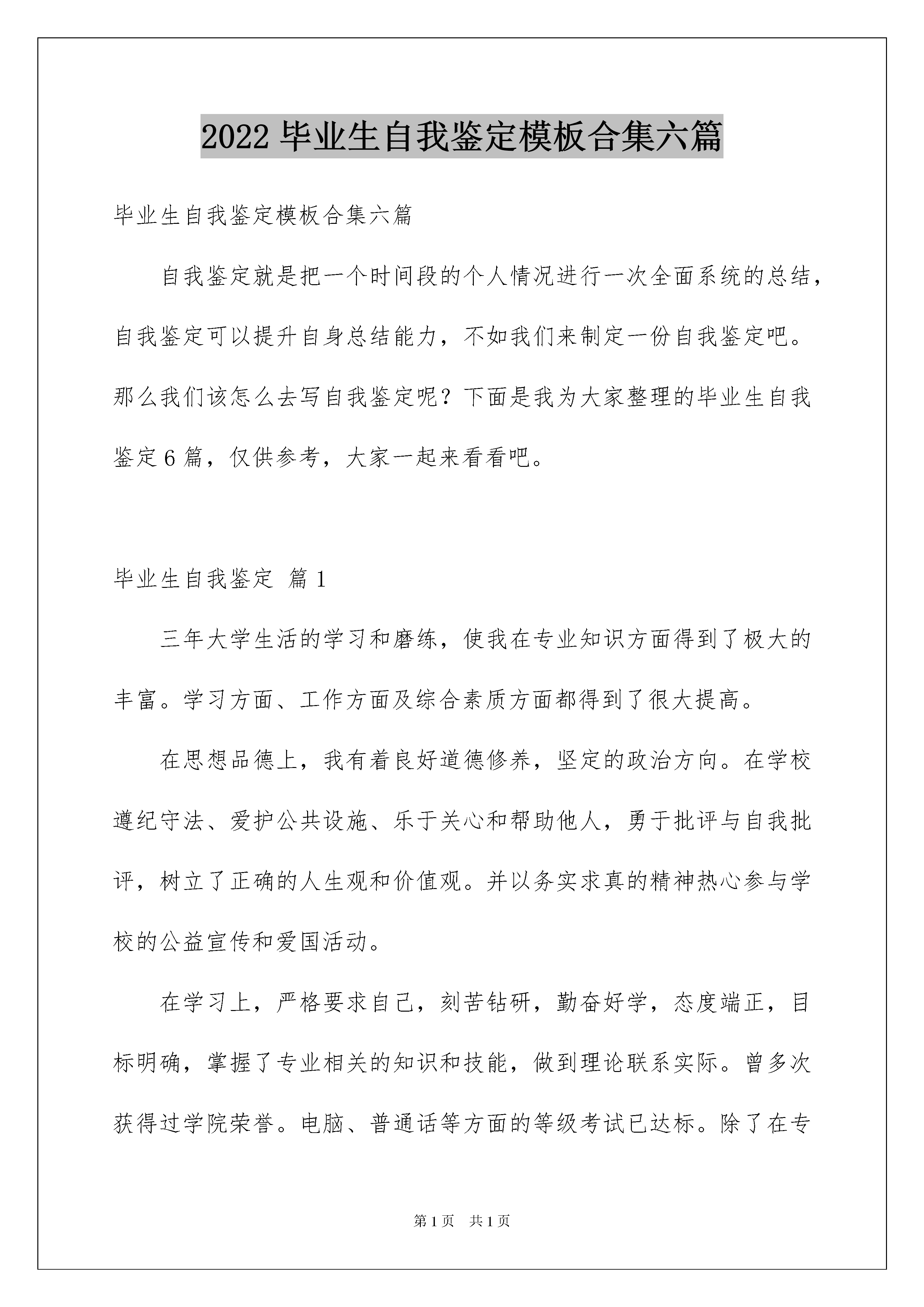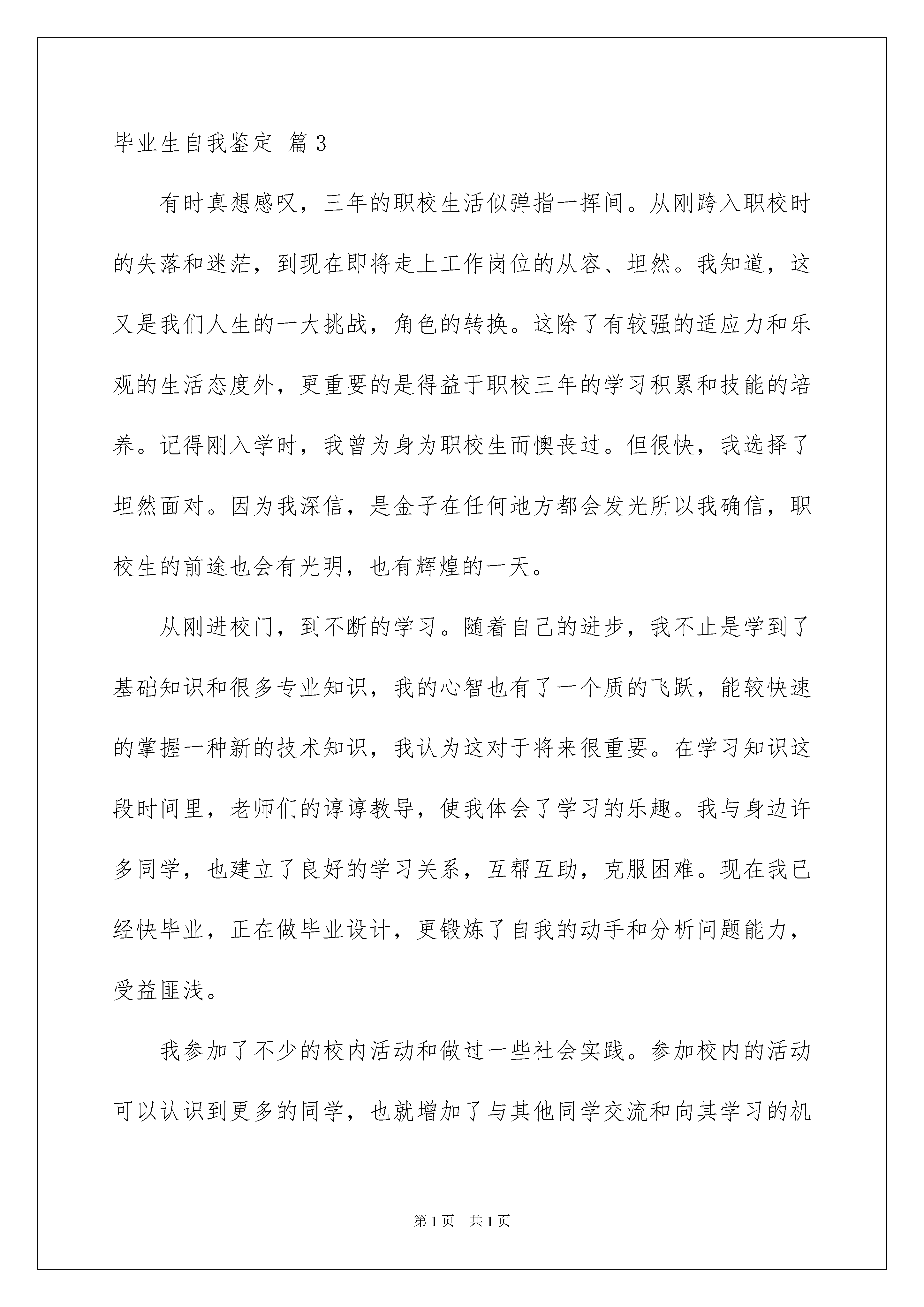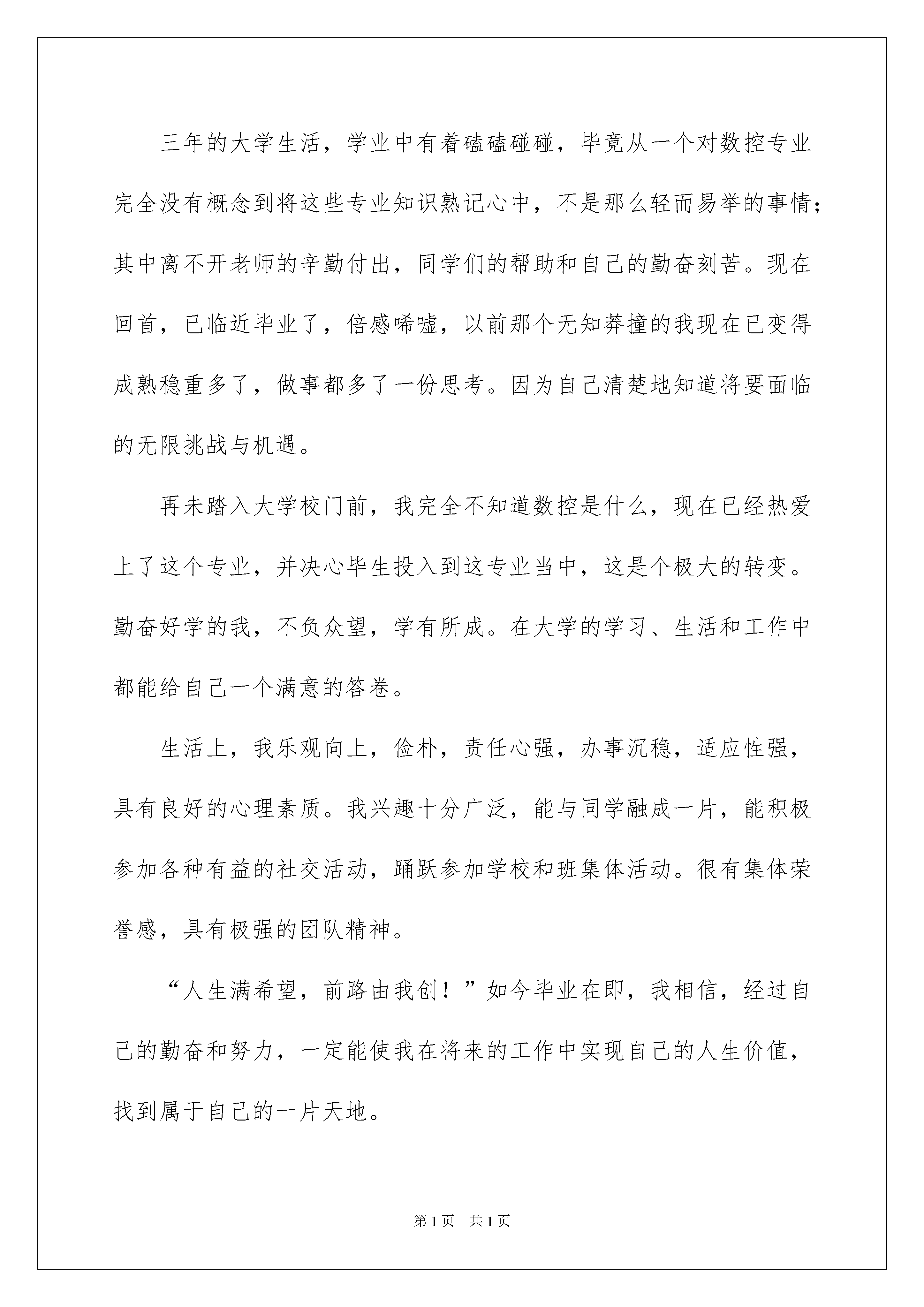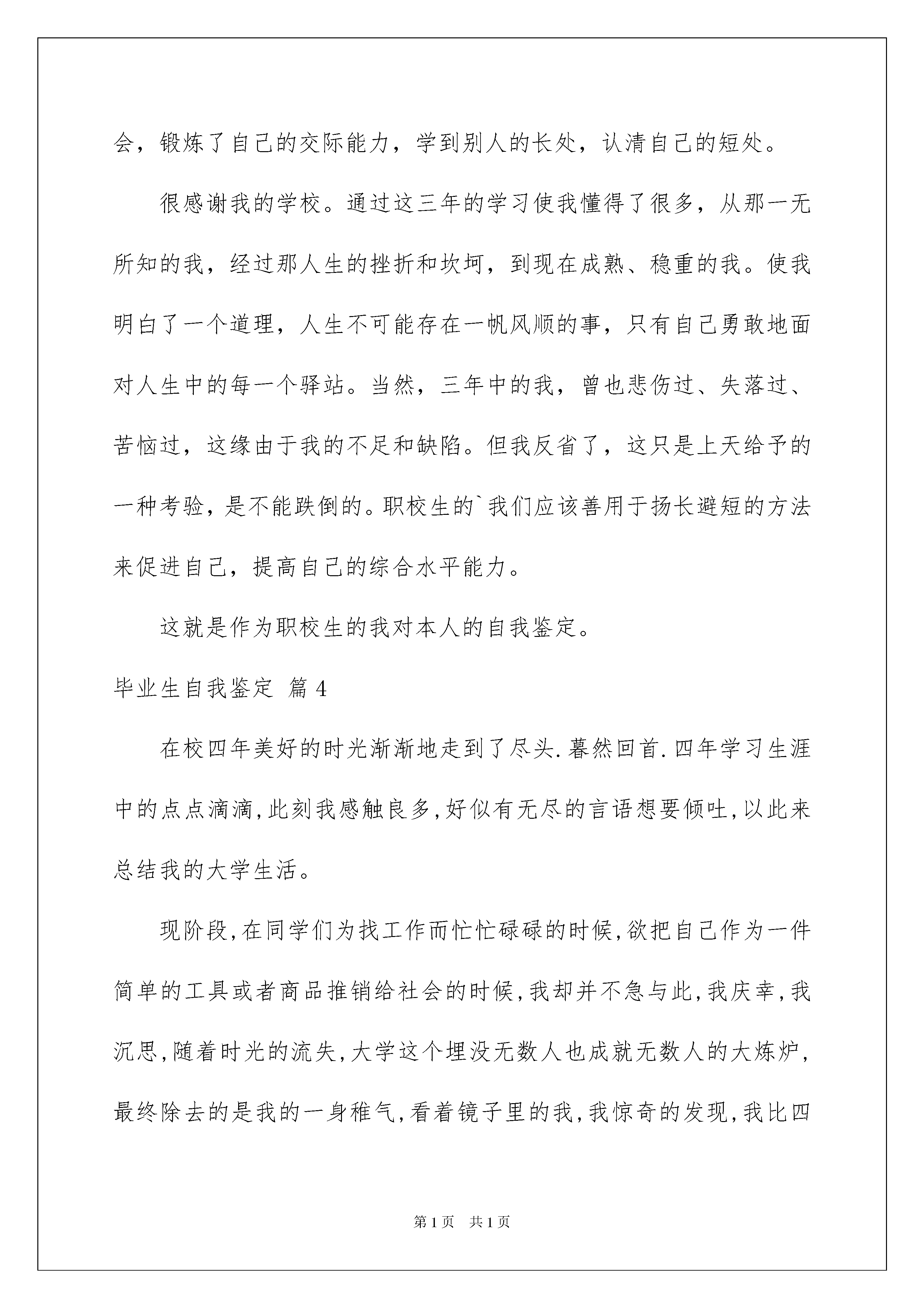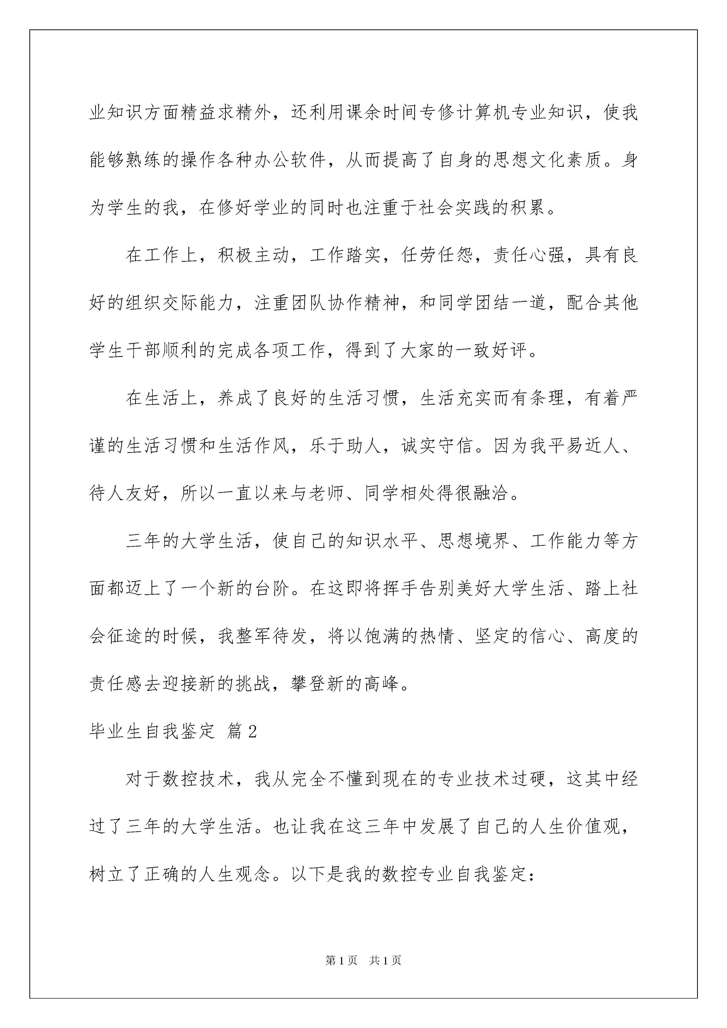 2022毕业生自我鉴定模板合集六篇毕业生自我鉴定模板合集六篇自我鉴定就是把一个时间段的个人情况进行一次全面系统的总结,自我鉴定可以提升自身总结能力,不如我们来制定一份自我鉴定吧。那么我们该怎么去写自我鉴定呢?下面是我为大家整理的毕业生自我鉴定6篇,仅供参考,大家一起来看看吧。毕业生自我鉴定篇1三年大学生活的学习和磨练,使我在专业知识方面得到了极大的丰富。学习方面、工作方面及综合素质方面都得到了很大提高。在思想品德上,我有着良好道德修养,坚定的政治方向。在学校遵纪守法、爱护公共设施、乐于关心和帮助他人,勇于批评与自我批评,树立了正确的人生观和价值观。并以务实求真的精神热心参与学校的公益宣传和爱国活动。在学习上,严格要求自己,刻苦钻研,勤奋好学,态度端正,目标明确,掌握了专业相关的知识和技能,做到理论联系实际。曾多次获得过学院荣誉。电脑、普通话等方面的等级考试已达标。除了在专业知识方面精益求精外,还利用课余时间专修计算机专业知识,使我能够熟练的操作各种办公软件,从而提高了自身的思想文化素质。身为学生的我,在修好学业的同时也注重于社会实践的积累。在工作上,积极主动,工作踏实,任劳任怨,责任心强,具有良好的组织交际能力,注重团队协作精神,和同学团结一道,配合其他学生干部顺利的完成各项工作,得到了大家的一致好评。在生活上,养成了良好的生活习惯,生活充实而有条理,有着严谨的生活习惯和生活作风,乐于助人,诚实守信。因为我平易近人、待人友好,所以一直以来与老师、同学相处得很融洽。三年的大学生活,使自己的知识水平、思想境界、工作能力等方面都迈上了一个新的台阶。在这即将挥手告别美好大学生活、踏上社会征途的时候,我整军待发,将以饱满的热情、坚定的信心、高度的责任感去迎接新的挑战,攀登新的高峰。毕业生自我鉴定篇2对于数控技术,我从完全不懂到现在的专业技术过硬,这其中经过了三年的大学生活。也让我在这三年中发展了自己的人生价值观,树立了正确的人生观念。以下是我的数控专业自我鉴定:三年的大学生活,学业中有着磕磕碰碰,毕竟从一个对数控专业完全没有概念到将这些专业知识熟记心中,不是那么轻而易举的事情;其中离不开老师的辛勤付出,同学们的帮助和自己的勤奋刻苦。现在回首,已临近毕业了,倍感唏嘘,以前那个无知莽撞的我现在已变得成熟稳重多了,做事都多了一份思考。因为自己清楚地知道将要面临的无限挑战与机遇。再未踏入大学校门前,我完全不知道数控是什么,现在已经热爱上了这个专业,并决心毕生投入到这专业当中,这是个极大的转变。勤奋好学的我,不负众望,学有所成。在大学的学习、生活和工作中都能给自己一个满意的答卷。生活上,我乐观向上,俭朴,责任心强,办事沉稳,适应性强,具有良好的心理素质。我兴趣十分广泛,能与同学融成一片,能积极参加各种有益的社交活动,踊跃参加学校和班集体活动。很有集体荣誉感,具有极强的团队精神。“人生满希望,前路由我创!”如今毕业在即,我相信,经过自己的勤奋和努力,一定能使我在将来的工作中实现自己的人生价值,找到属于自己的一片天地。毕业生自我鉴定篇3有时真想感叹,三年的职校生活似弹指一挥间。从刚跨入职校时的失落和迷茫,到现在即将走上工作岗位的从容、坦然。我知道,这又是我们人生的一大挑战,角色的转换。这除了有较强的适应力和乐观的生活态度外,更重要的是得益于职校三年的学习积累和技能的培养。记得刚入学时,我曾为身为职校生而懊丧过。但很快,我选择了坦然面对。因为我深信,是金子在任何地方都会发光所以我确信,职校生的前途也会有光明,也有辉煌的一天。从刚进校门,到不断的学习。随着自己的进步,我不止是学到了基础知识和很多专业知识,我的心智也有了一个质的飞跃,能较快速的掌握一种新的技术知识,我认为这对于将来很重要。在学习知识这段时间里,老师们的谆谆教导,使我体会了学习的乐趣。我与身边许多同学,也建立了良好的学习关系,互帮互助,克服困难。现在我已经快毕业,正在做毕业设计,更锻炼了自我的动手和分析问题能力,受益匪浅。我参加了不少的校内活动和做过一些社会实践。参加校内的活动可以认识到更多的同学,也就增加了与其他同学交流和向其学习的机会,锻炼了自己的交际能力,学到别人的长处,认清自己的短处。很感谢我的学校。通过这三年的学习使我懂得了很多,从那一无所知的我,经过那人生的挫折和坎坷,到现在成熟、稳重的我。使我明白了一个道理,人生不可能存在一帆风顺的事,只有自己勇敢地面对人生中的每一个驿站。当然,三年中的我,曾也悲伤过、失落过、苦恼过,这缘由于我的不足和缺陷。但我反省了,这只是上天给予的一种考验,是不能跌倒的。职校生的`我们应该善用于扬长避