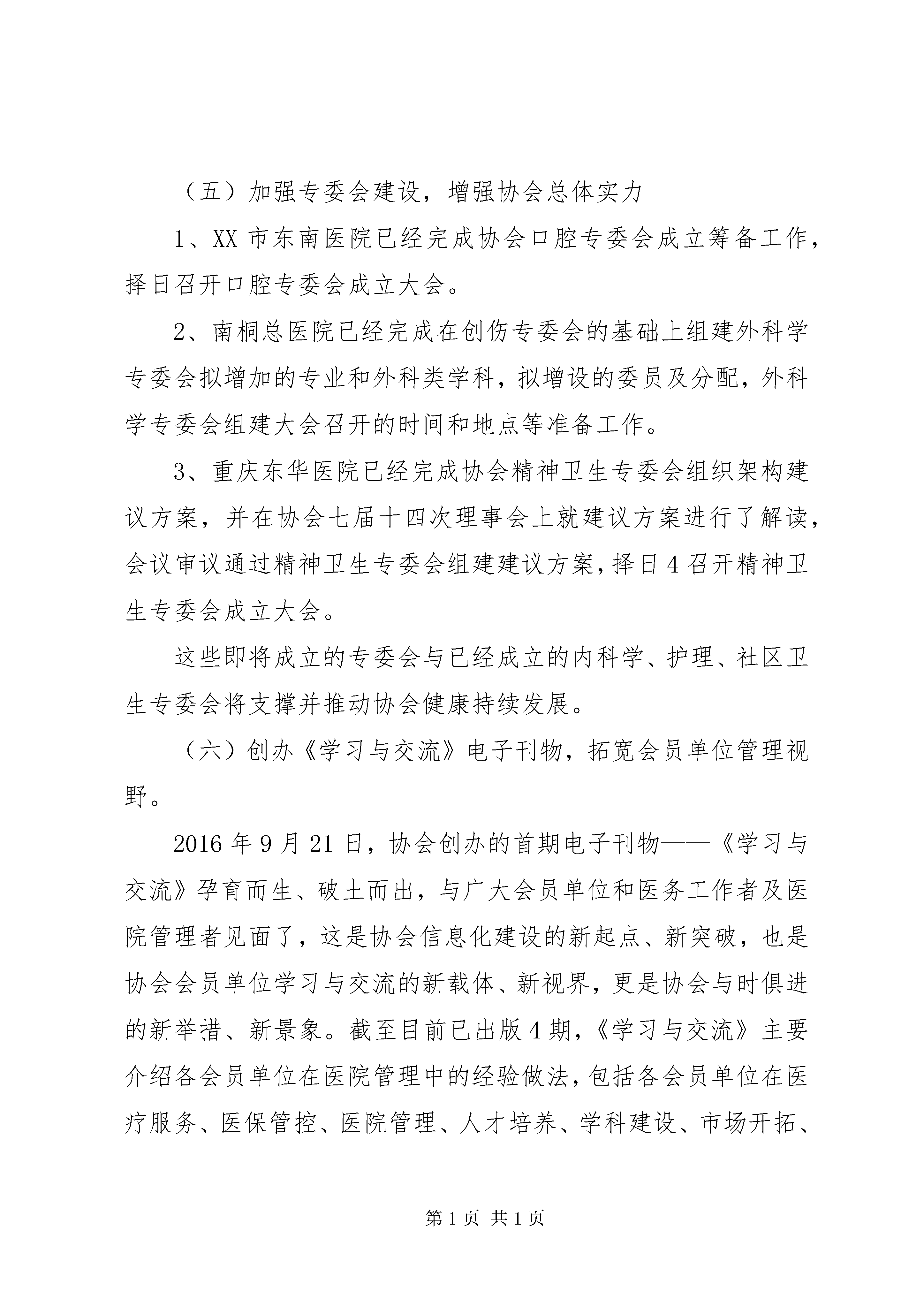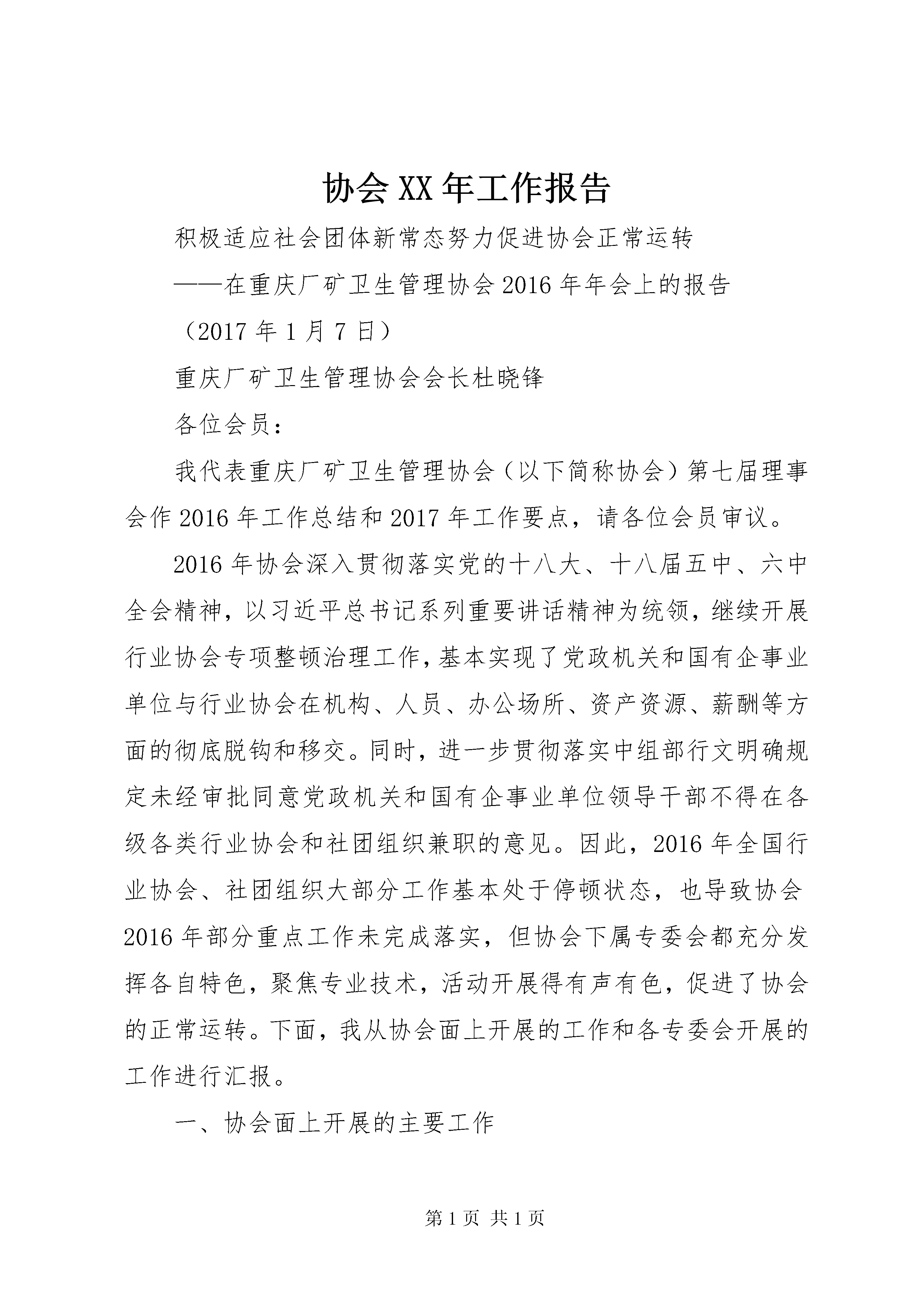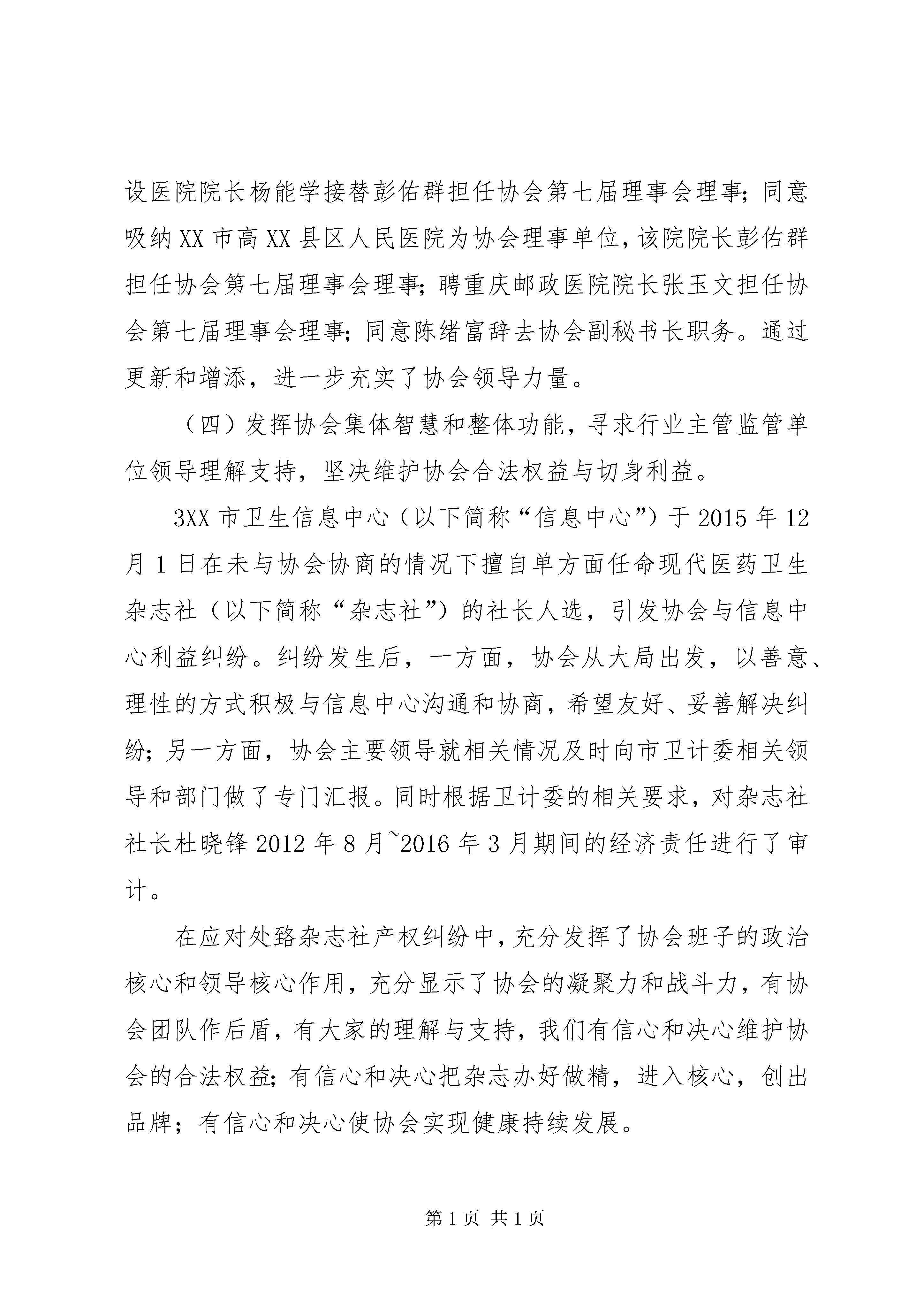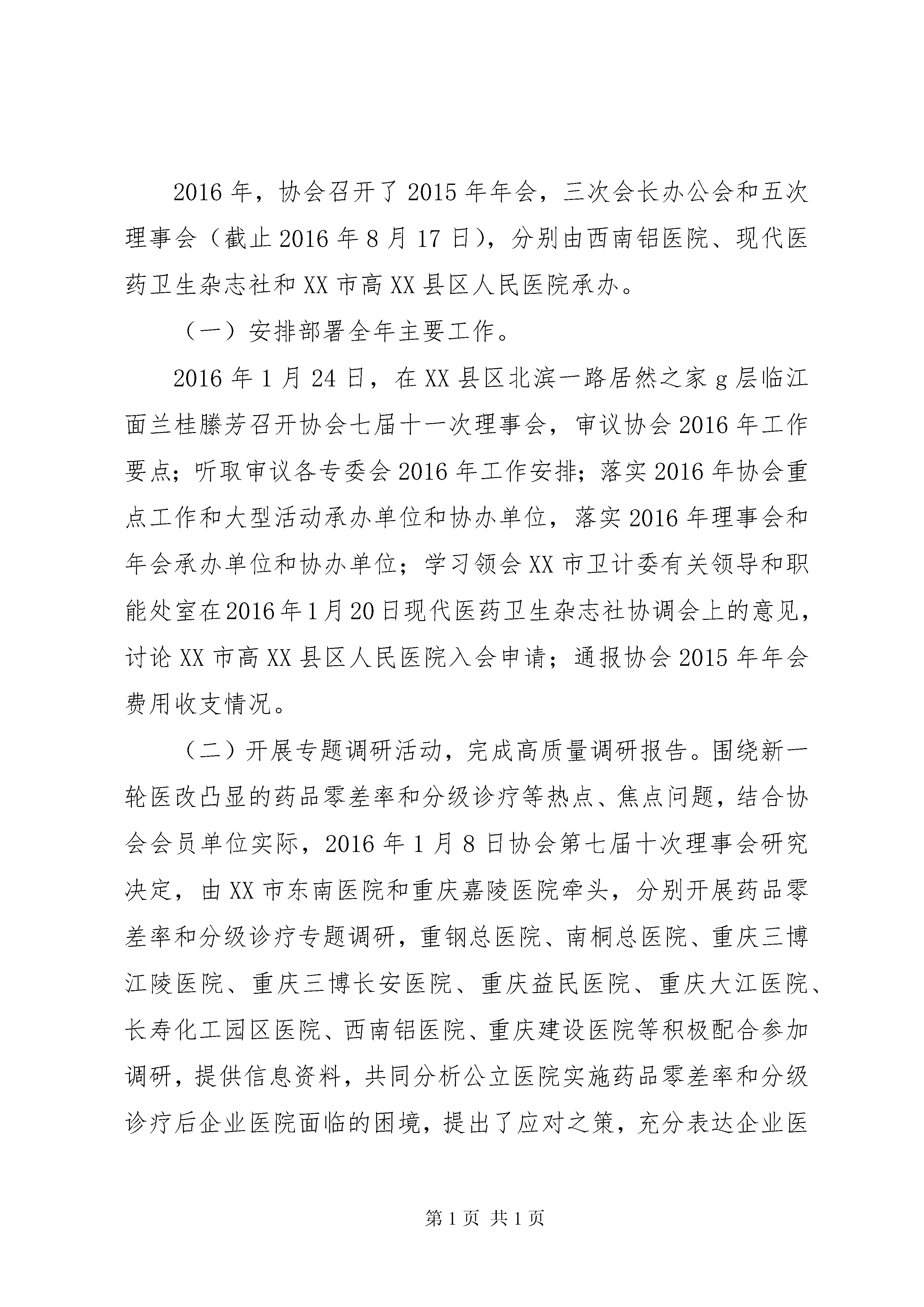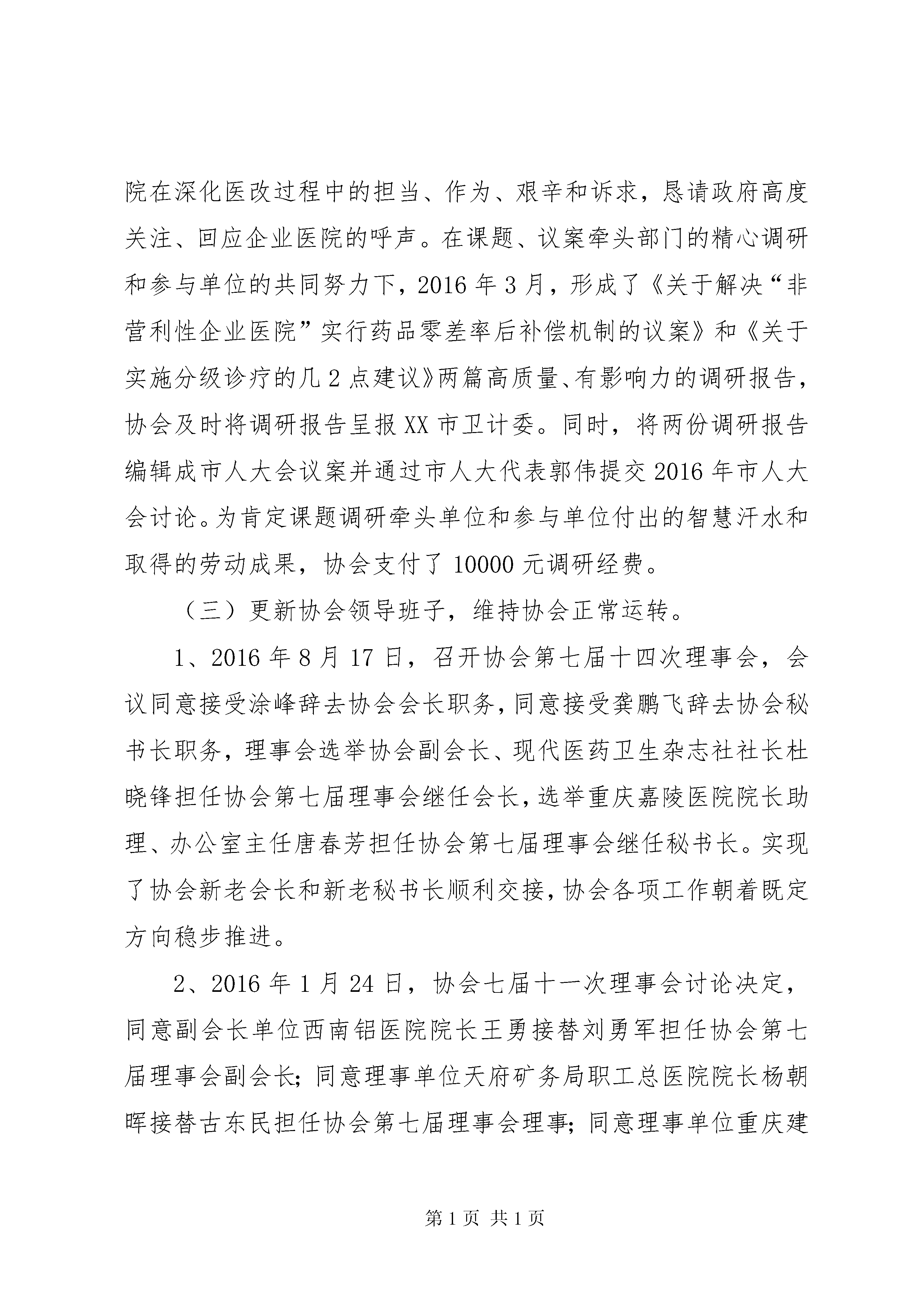 协会XX年工作报告积极适应社会团体新常态努力促进协会正常运转——在重庆厂矿卫生管理协会2016年年会上的报告(2017年1月7日)重庆厂矿卫生管理协会会长杜晓锋各位会员:我代表重庆厂矿卫生管理协会(以下简称协会)第七届理事会作2016年工作总结和2017年工作要点,请各位会员审议。2016年协会深入贯彻落实党的十八大、十八届五中、六中全会精神,以习近平总书记系列重要讲话精神为统领,继续开展行业协会专项整顿治理工作,基本实现了党政机关和国有企事业单位与行业协会在机构、人员、办公场所、资产资源、薪酬等方面的彻底脱钩和移交。同时,进一步贯彻落实中组部行文明确规定未经审批同意党政机关和国有企事业单位领导干部不得在各级各类行业协会和社团组织兼职的意见。因此,2016年全国行业协会、社团组织大部分工作基本处于停顿状态,也导致协会2016年部分重点工作未完成落实,但协会下属专委会都充分发挥各自特色,聚焦专业技术,活动开展得有声有色,促进了协会的正常运转。下面,我从协会面上开展的工作和各专委会开展的工作进行汇报。一、协会面上开展的主要工作2016年,协会召开了2015年年会,三次会长办公会和五次理事会(截止2016年8月17日),分别由西南铝医院、现代医药卫生杂志社和XX市高XX县区人民医院承办。(一)安排部署全年主要工作。2016年1月24日,在XX县区北滨一路居然之家g层临江面兰桂縢芳召开协会七届十一次理事会,审议协会2016年工作要点;听取审议各专委会2016年工作安排;落实2016年协会重点工作和大型活动承办单位和协办单位,落实2016年理事会和年会承办单位和协办单位;学习领会XX市卫计委有关领导和职能处室在2016年1月20日现代医药卫生杂志社协调会上的意见,讨论XX市高XX县区人民医院入会申请;通报协会2015年年会费用收支情况。(二)开展专题调研活动,完成高质量调研报告。围绕新一轮医改凸显的药品零差率和分级诊疗等热点、焦点问题,结合协会会员单位实际,2016年1月8日协会第七届十次理事会研究决定,由XX市东南医院和重庆嘉陵医院牵头,分别开展药品零差率和分级诊疗专题调研,重钢总医院、南桐总医院、重庆三博江陵医院、重庆三博长安医院、重庆益民医院、重庆大江医院、长寿化工园区医院、西南铝医院、重庆建设医院等积极配合参加调研,提供信息资料,共同分析公立医院实施药品零差率和分级诊疗后企业医院面临的困境,提出了应对之策,充分表达企业医院在深化医改过程中的担当、作为、艰辛和诉求,恳请政府高度关注、回应企业医院的呼声。在课题、议案牵头部门的精心调研和参与单位的共同努力下,2016年3月,形成了《关于解决“非营利性企业医院”实行药品零差率后补偿机制的议案》和《关于实施分级诊疗的几2点建议》两篇高质量、有影响力的调研报告,协会及时将调研报告呈报XX市卫计委。同时,将两份调研报告编辑成市人大会议案并通过市人大代表郭伟提交2016年市人大会讨论。为肯定课题调研牵头单位和参与单位付出的智慧汗水和取得的劳动成果,协会支付了10000元调研经费。(三)更新协会领导班子,维持协会正常运转。1、2016年8月17日,召开协会第七届十四次理事会,会议同意接受涂峰辞去协会会长职务,同意接受龚鹏飞辞去协会秘书长职务,理事会选举协会副会长、现代医药卫生杂志社社长杜晓锋担任协会第七届理事会继任会长,选举重庆嘉陵医院院长助理、办公室主任唐春芳担任协会第七届理事会继任秘书长。实现了协会新老会长和新老秘书长顺利交接,协会各项工作朝着既定方向稳步推进。2、2016年1月24日,协会七届十一次理事会讨论决定,同意副会长单位西南铝医院院长王勇接替刘勇军担任协会第七届理事会副会长;同意理事单位天府矿务局职工总医院院长杨朝晖接替古东民担任协会第七届理事会理事;同意理事单位重庆建设医院院长杨能学接替彭佑群担任协会第七届理事会理事;同意吸纳XX市高XX县区人民医院为协会理事单位,该院院长彭佑群担任协会第七届理事会理事;聘重庆邮政医院院长张玉文担任协会第七届理事会理事;同意陈绪富辞去协会副秘书长职务。通过更新和增添,进一步充实了协会领导力量。(四)发挥协会集体智慧和整体功能,寻求行业主管监管单位领导理解支持,坚决维护协会合法权益与切身利益。3XX市卫生信息中心(以下简称“信息中心”)于2015年12月1日在未与协会协商的情况下擅自单方面任命现代医药卫生杂志社(以下简称“杂志社”)的社长人选,引发协会与信息中心利益纠纷。纠纷发生后,一方面,协会从大局出发,以善意、理性的方式积极与信息中心沟通和协商,希望友好、妥善解决纠纷;另一方面,协会主要领导就相关情况及时向市卫计委相关领导和部门做了专门汇报。同时根据卫计委的相关要求,对杂志社社长杜晓锋2012年8月~2016年3月期间