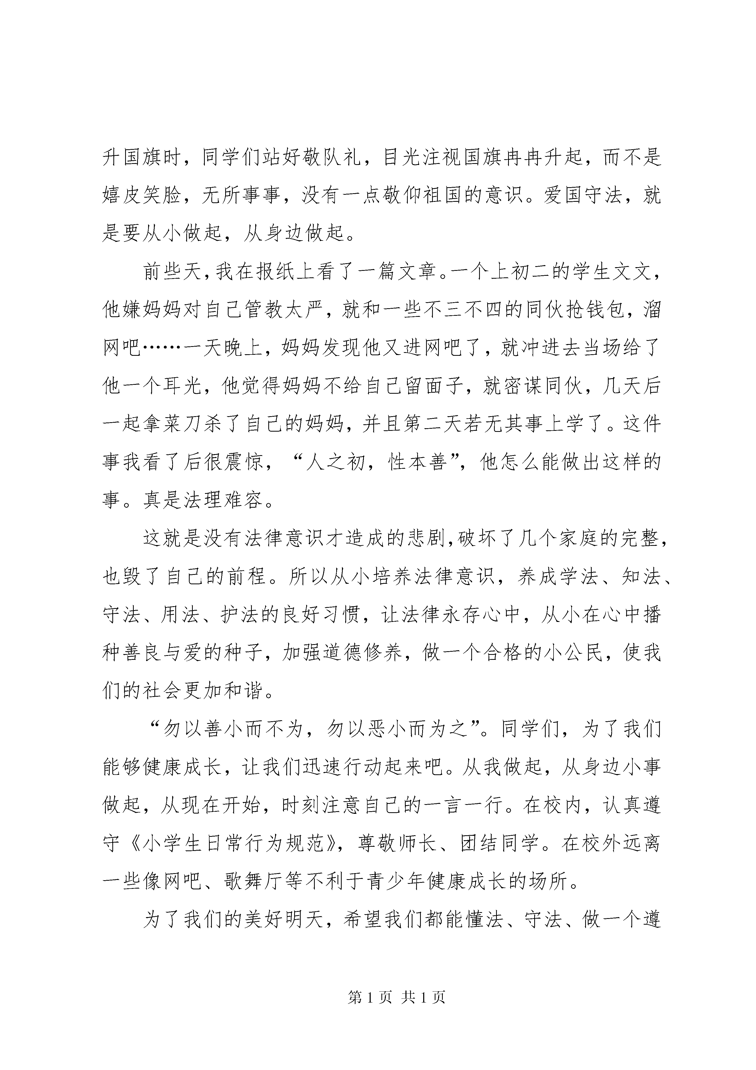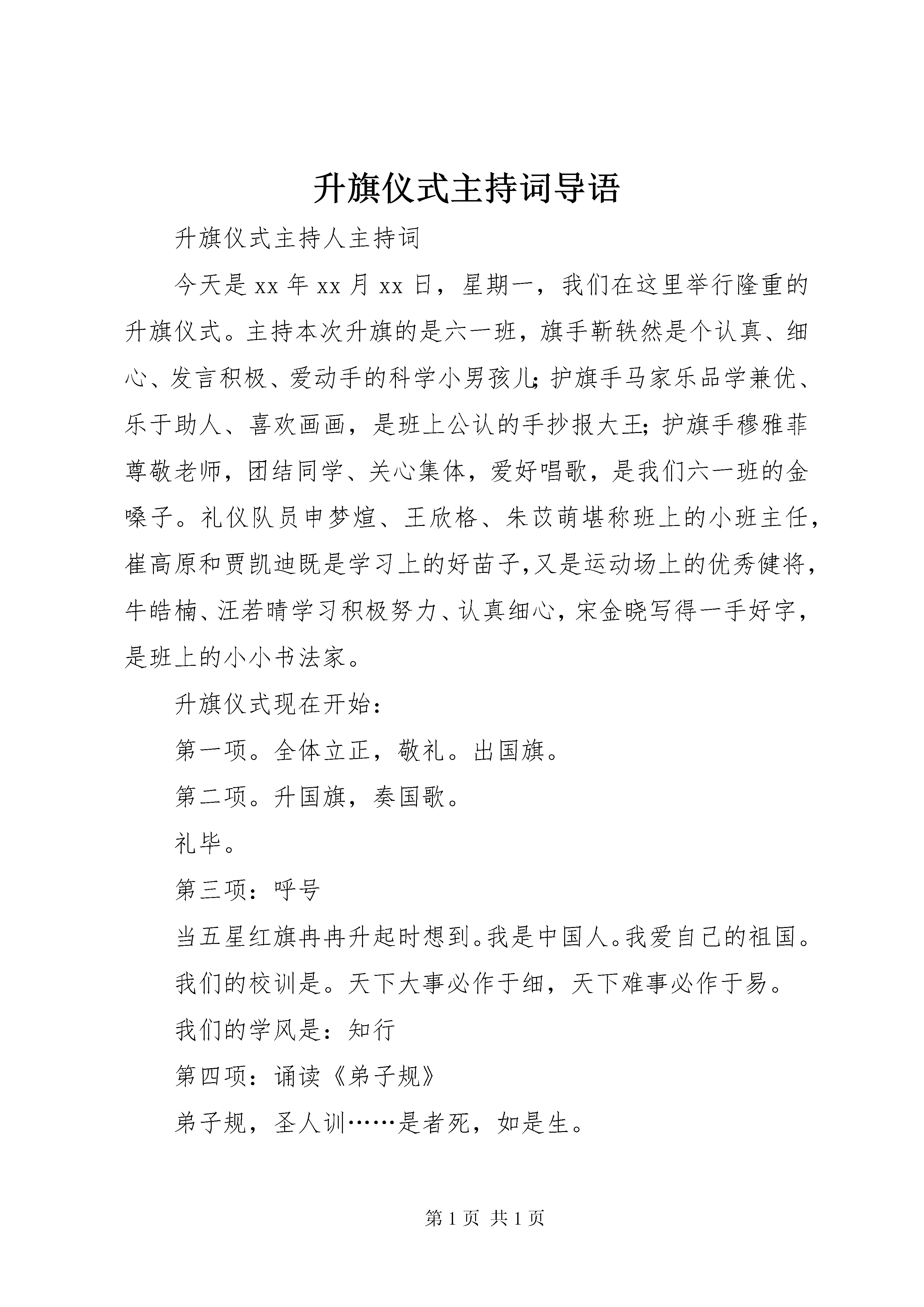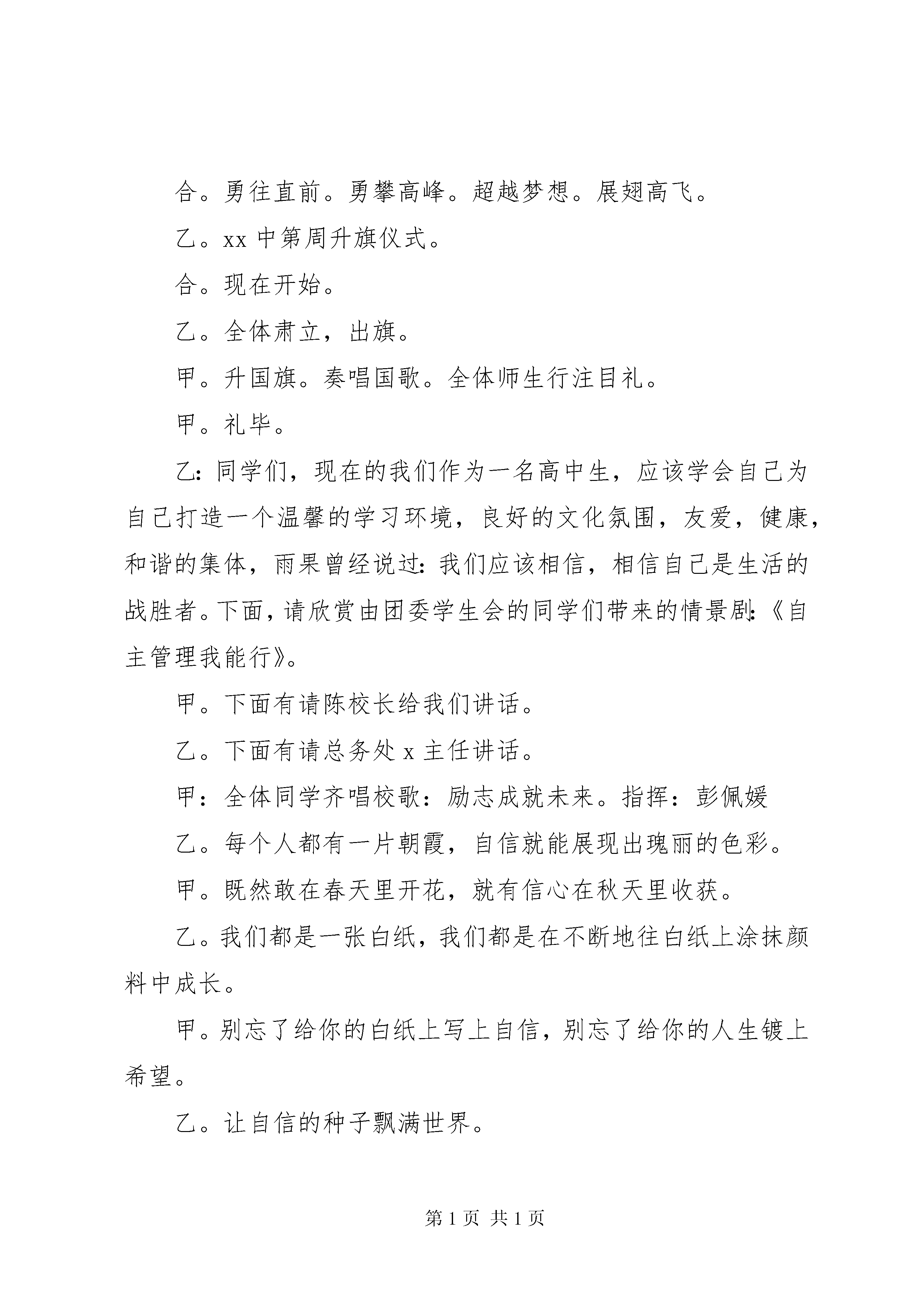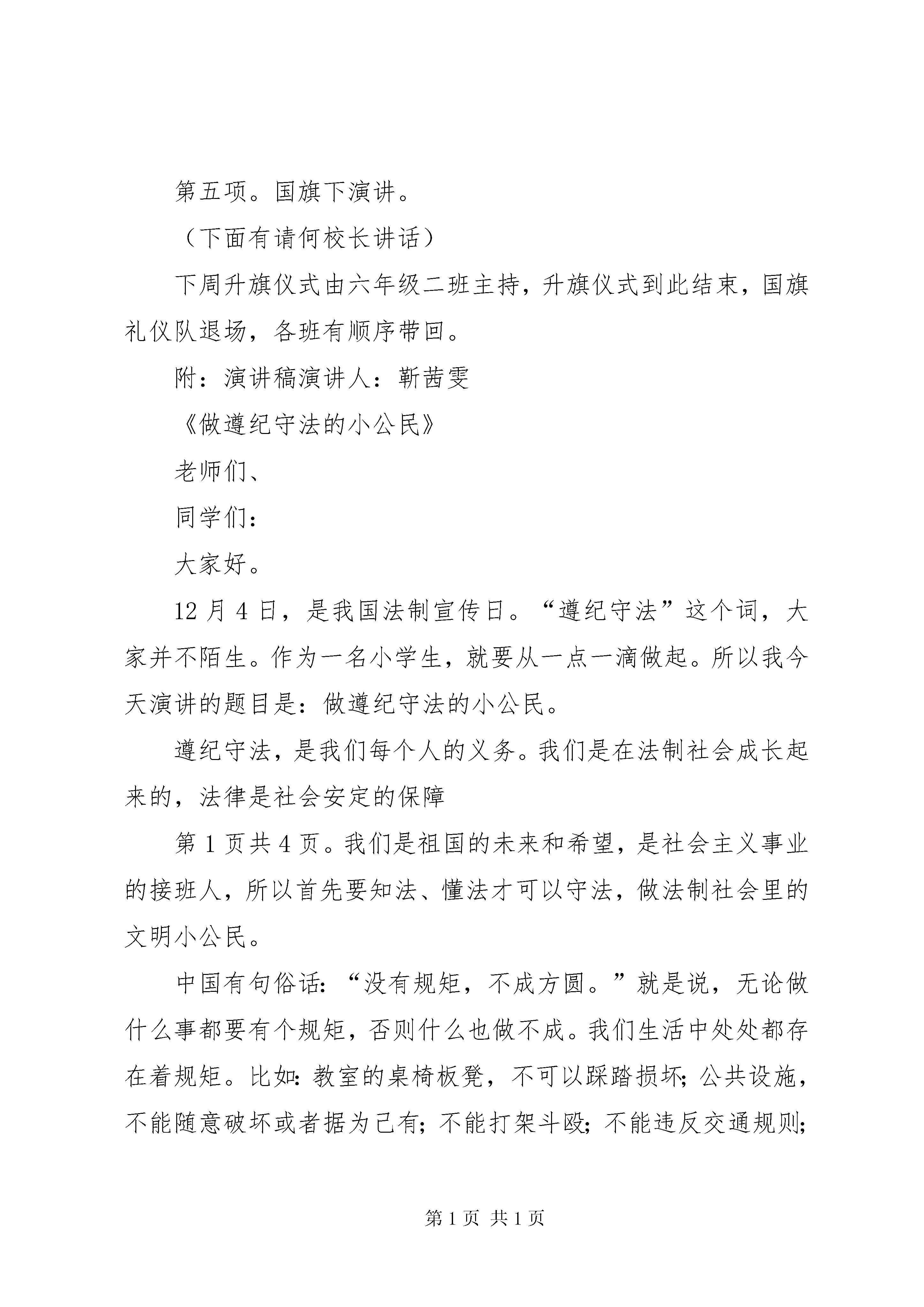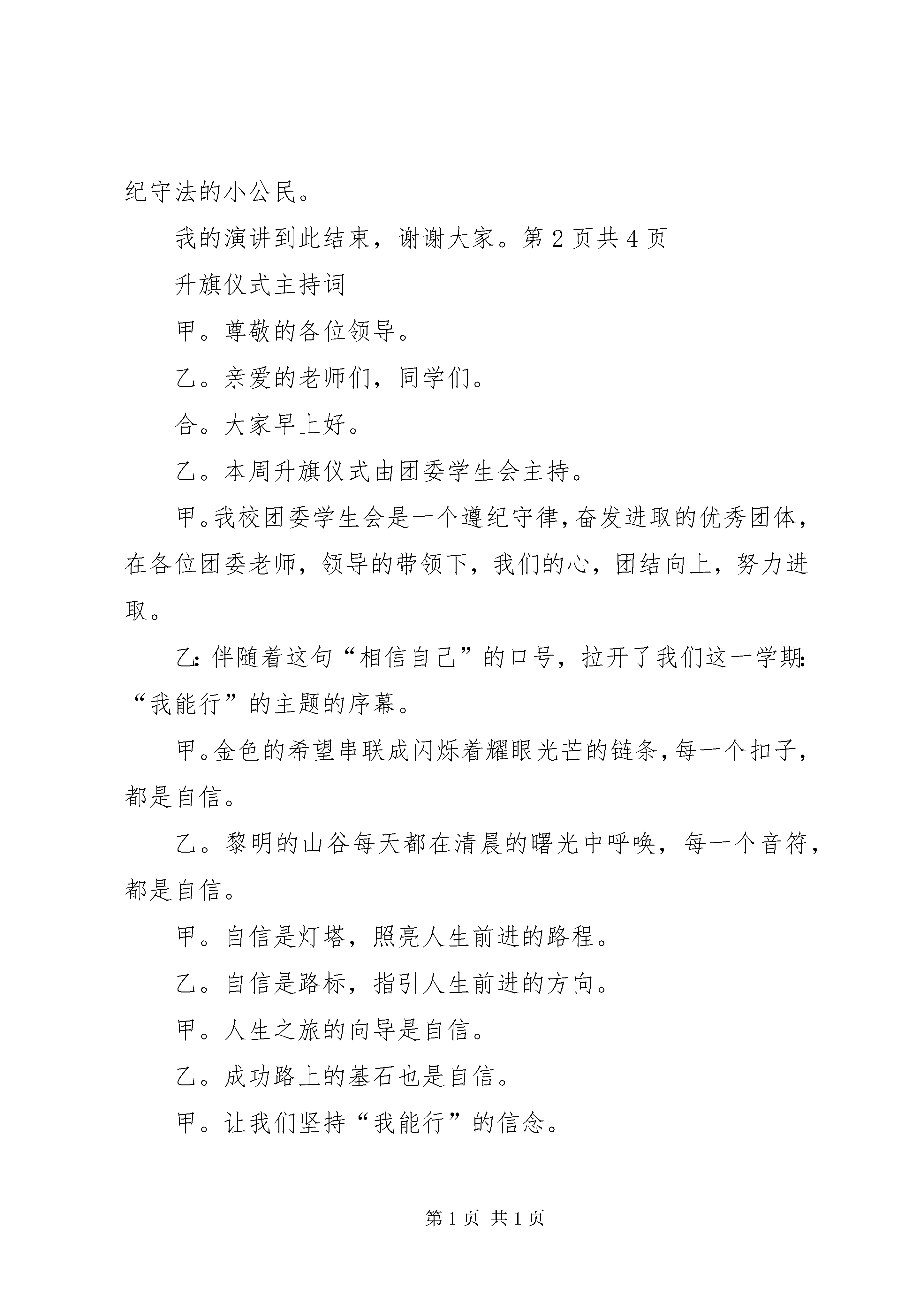 升旗仪式主持词导语升旗仪式主持人主持词今天是xx年xx月xx日,星期一,我们在这里举行隆重的升旗仪式。主持本次升旗的是六一班,旗手靳轶然是个认真、细心、发言积极、爱动手的科学小男孩儿;护旗手马家乐品学兼优、乐于助人、喜欢画画,是班上公认的手抄报大王;护旗手穆雅菲尊敬老师,团结同学、关心集体,爱好唱歌,是我们六一班的金嗓子。礼仪队员申梦煊、王欣格、朱苡萌堪称班上的小班主任,崔高原和贾凯迪既是学习上的好苗子,又是运动场上的优秀健将,牛皓楠、汪若晴学习积极努力、认真细心,宋金晓写得一手好字,是班上的小小书法家。升旗仪式现在开始:第一项。全体立正,敬礼。出国旗。第二项。升国旗,奏国歌。礼毕。第三项:呼号当五星红旗冉冉升起时想到。我是中国人。我爱自己的祖国。我们的校训是。天下大事必作于细,天下难事必作于易。我们的学风是:知行第四项:诵读《弟子规》弟子规,圣人训……是者死,如是生。第五项。国旗下演讲。(下面有请何校长讲话)下周升旗仪式由六年级二班主持,升旗仪式到此结束,国旗礼仪队退场,各班有顺序带回。附:演讲稿演讲人:靳茜雯《做遵纪守法的小公民》老师们、同学们:大家好。12月4日,是我国法制宣传日。“遵纪守法”这个词,大家并不陌生。作为一名小学生,就要从一点一滴做起。所以我今天演讲的题目是:做遵纪守法的小公民。遵纪守法,是我们每个人的义务。我们是在法制社会成长起来的,法律是社会安定的保障。我们是祖国的未来和希望,是社会主义事业的接班人,所以首先要知法、懂法才可以守法,做法制社会里的文明小公民。中国有句俗话:“没有规矩,不成方圆。”就是说,无论做什么事都要有个规矩,否则什么也做不成。我们生活中处处都存在着规矩。比如:教室的桌椅板凳,不可以踩踏损坏;公共设施,不能随意破坏或者据为己有;不能打架斗殴;不能违反交通规则;升国旗时,同学们站好敬队礼,目光注视国旗冉冉升起,而不是嬉皮笑脸,无所事事,没有一点敬仰祖国的意识。爱国守法,就是要从小做起,从身边做起。前些天,我在报纸上看了一篇文章。一个上初二的学生文文,他嫌妈妈对自己管教太严,就和一些不三不四的同伙抢钱包,溜网吧……一天晚上,妈妈发现他又进网吧了,就冲进去当场给了他一个耳光,他觉得妈妈不给自己留面子,就密谋同伙,几天后一起拿菜刀杀了自己的妈妈,并且第二天若无其事上学了。这件事我看了后很震惊,“人之初,性本善”,他怎么能做出这样的事。真是法理难容。这就是没有法律意识才造成的悲剧,破坏了几个家庭的完整,也毁了自己的前程。所以从小培养法律意识,养成学法、知法、守法、用法、护法的良好习惯,让法律永存心中,从小在心中播种善良与爱的种子,加强道德修养,做一个合格的小公民,使我们的社会更加和谐。“勿以善小而不为,勿以恶小而为之”。同学们,为了我们能够健康成长,让我们迅速行动起来吧。从我做起,从身边小事做起,从现在开始,时刻注意自己的一言一行。在校内,认真遵守《小学生日常行为规范》,尊敬师长、团结同学。在校外远离一些像网吧、歌舞厅等不利于青少年健康成长的场所。为了我们的美好明天,希望我们都能懂法、守法、做一个遵纪守法的小公民。我的演讲到此结束,谢谢大家。升旗仪式主持词甲。尊敬的各位领导。乙。亲爱的老师们,同学们。合。大家早上好。乙。本周升旗仪式由团委学生会主持。甲。我校团委学生会是一个遵纪守律,奋发进取的优秀团体,在各位团委老师,领导的带领下,我们的心,团结向上,努力进取。乙:伴随着这句“相信自己”的口号,拉开了我们这一学期:“我能行”的主题的序幕。甲。金色的希望串联成闪烁着耀眼光芒的链条,每一个扣子,都是自信。乙。黎明的山谷每天都在清晨的曙光中呼唤,每一个音符,都是自信。甲。自信是灯塔,照亮人生前进的路程。乙。自信是路标,指引人生前进的方向。甲。人生之旅的向导是自信。乙。成功路上的基石也是自信。甲。让我们坚持“我能行”的信念。合。勇往直前。勇攀高峰。超越梦想。展翅高飞。乙。xx中第周升旗仪式。合。现在开始。乙。全体肃立,出旗。甲。升国旗。奏唱国歌。全体师生行注目礼。甲。礼毕。乙:同学们,现在的我们作为一名高中生,应该学会自己为自己打造一个温馨的学习环境,良好的文化氛围,友爱,健康,和谐的集体,雨果曾经说过:我们应该相信,相信自己是生活的战胜者。下面,请欣赏由团委学生会的同学们带来的情景剧:《自主管理我能行》。甲。下面有请陈校长给我们讲话。乙。下面有请总务处x主任讲话。甲:全体同学齐唱校歌:励志成就未来。指挥:彭佩媛乙。每个人都有一片朝霞,自信就能展现出瑰丽的色彩。甲。既然敢在春天里开花,就有信心在秋天里收获。乙。我们都是一张白纸,我们都是在不断地往白纸上涂抹颜料中成长。甲。别忘了给你的白纸上写上自信,别忘了给你的人生镀上希望。乙。让自信的种子飘满世界。甲。
