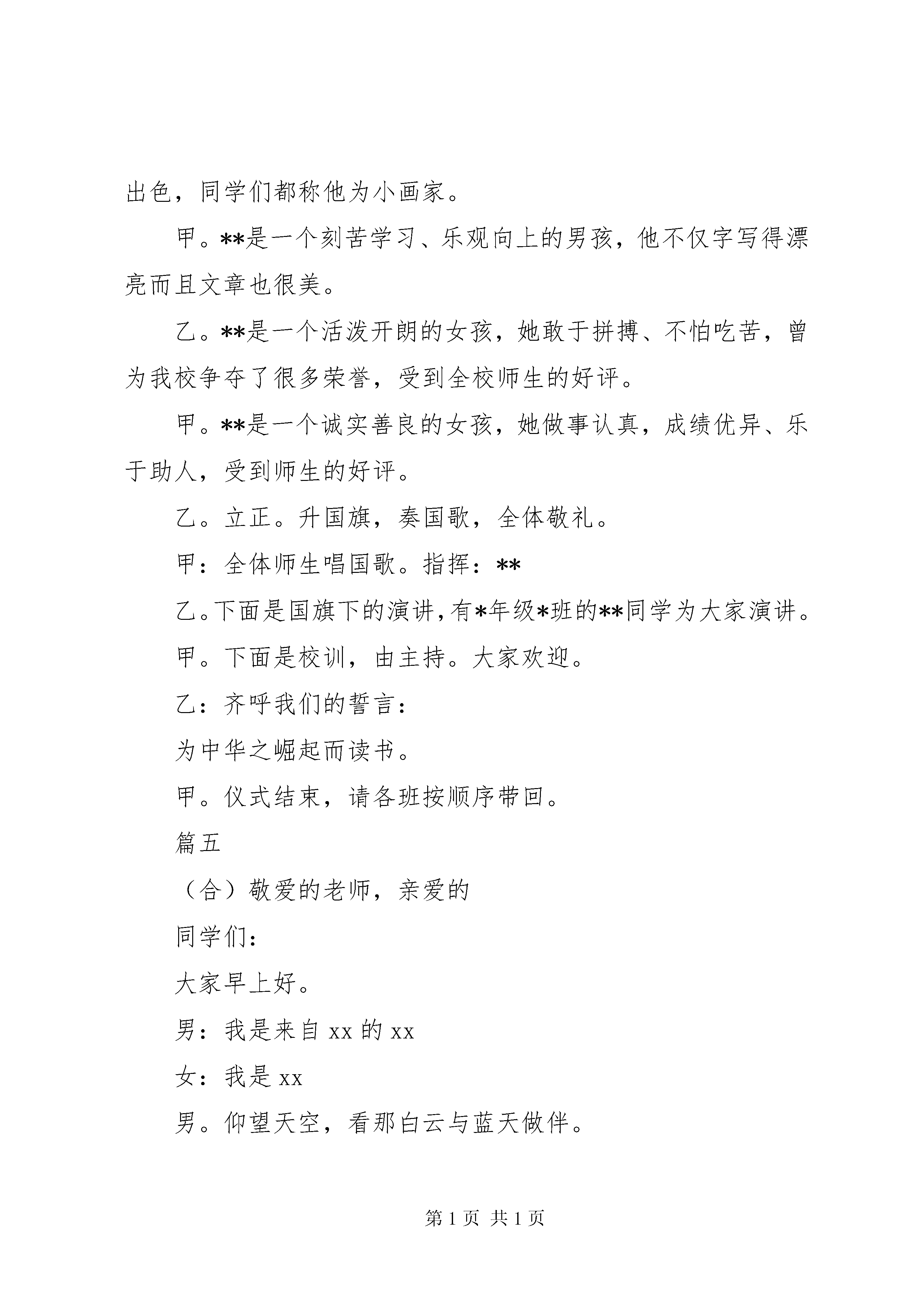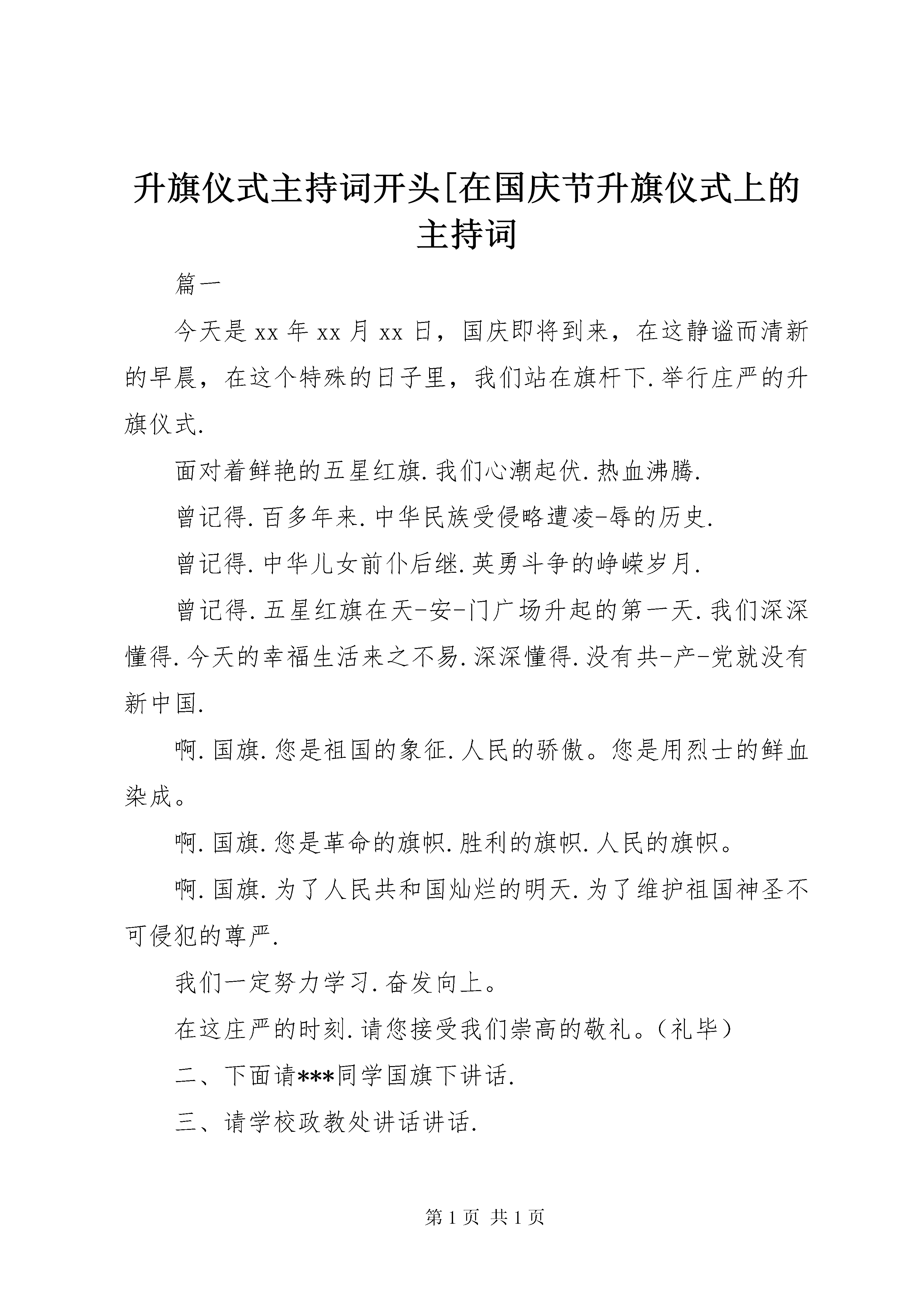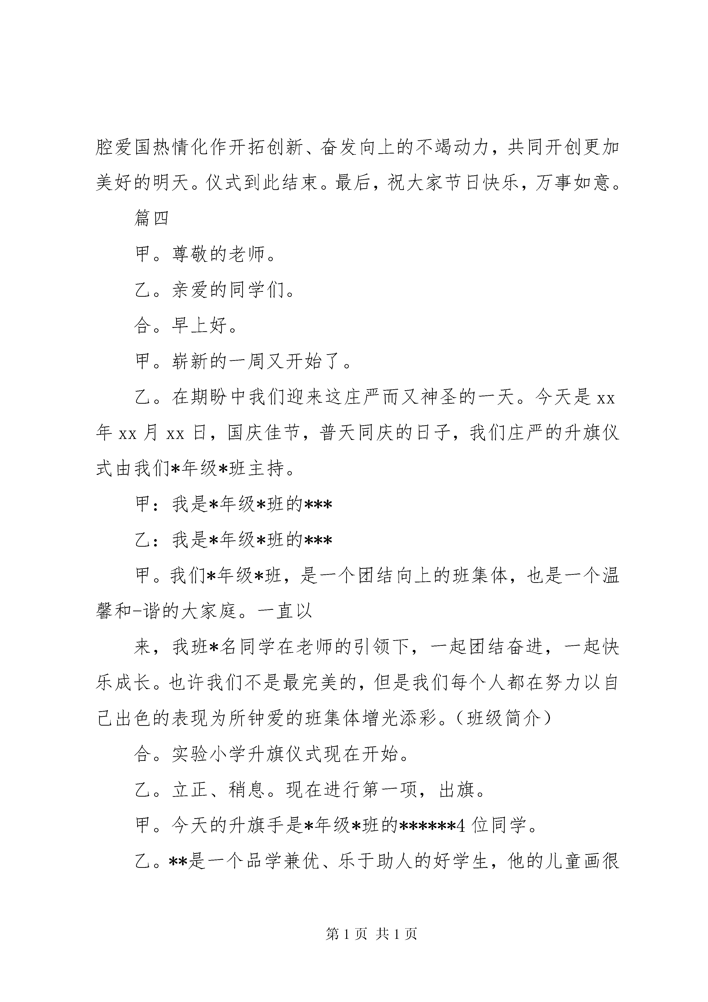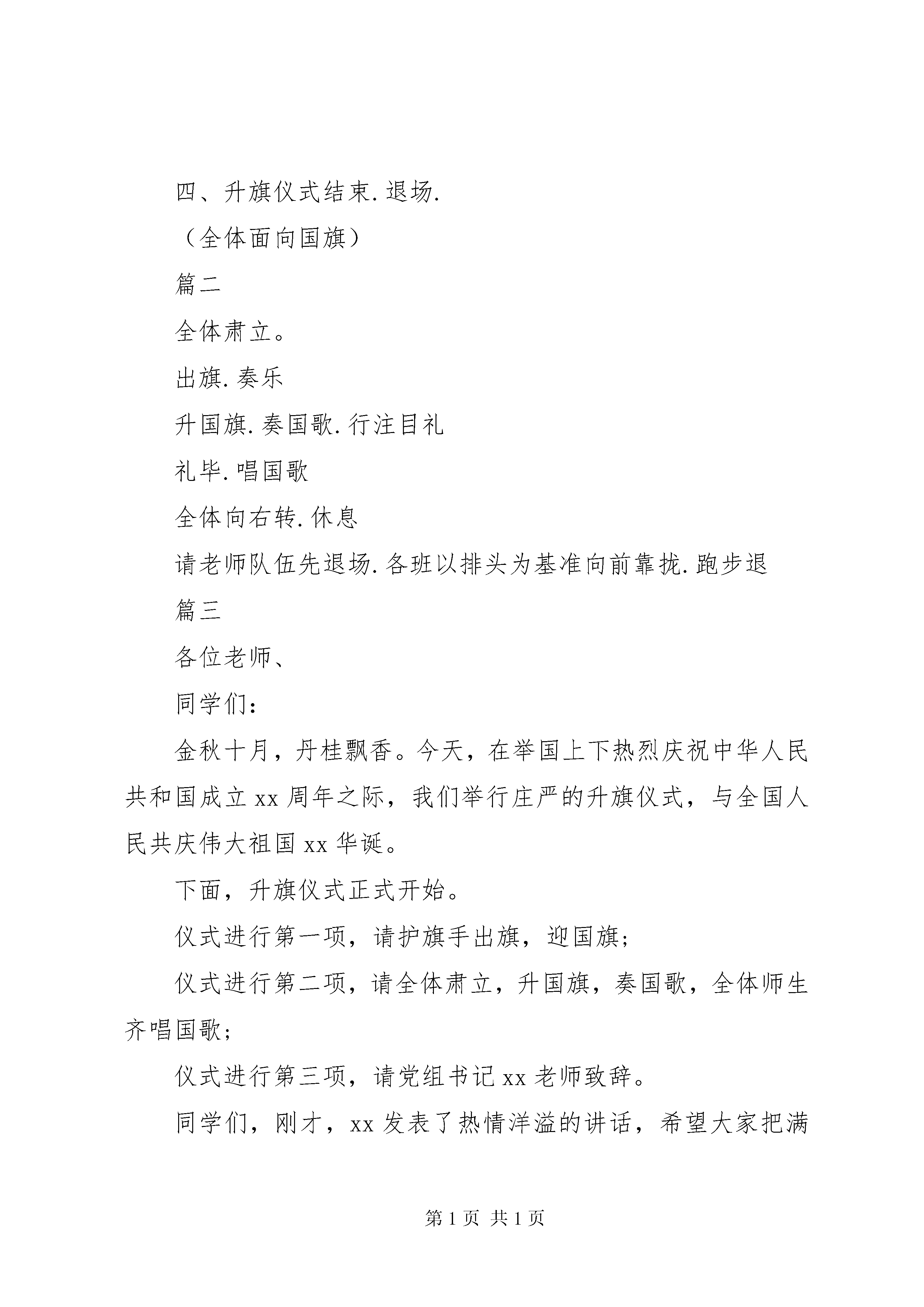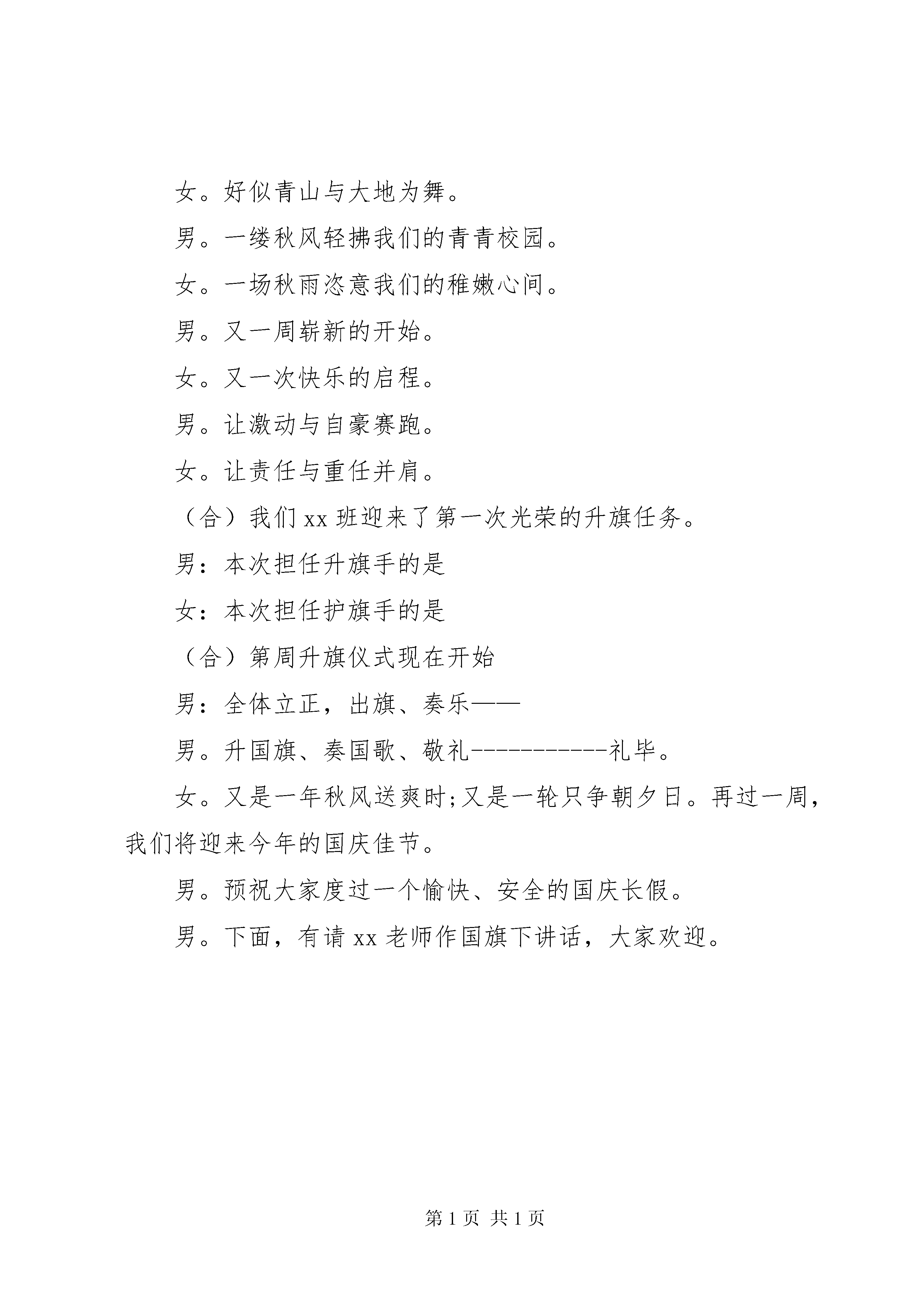 升旗仪式主持词开头[在国庆节升旗仪式上的主持词篇一今天是xx年xx月xx日,国庆即将到来,在这静谧而清新的早晨,在这个特殊的日子里,我们站在旗杆下.举行庄严的升旗仪式.面对着鲜艳的五星红旗.我们心潮起伏.热血沸腾.曾记得.百多年来.中华民族受侵略遭凌-辱的历史.曾记得.中华儿女前仆后继.英勇斗争的峥嵘岁月.曾记得.五星红旗在天-安-门广场升起的第一天.我们深深懂得.今天的幸福生活来之不易.深深懂得.没有共-产-党就没有新中国.啊.国旗.您是祖国的象征.人民的骄傲。您是用烈士的鲜血染成。啊.国旗.您是革命的旗帜.胜利的旗帜.人民的旗帜。啊.国旗.为了人民共和国灿烂的明天.为了维护祖国神圣不可侵犯的尊严.我们一定努力学习.奋发向上。在这庄严的时刻.请您接受我们崇高的敬礼。(礼毕)二、下面请***同学国旗下讲话.三、请学校政教处讲话讲话.四、升旗仪式结束.退场.(全体面向国旗)篇二全体肃立。出旗.奏乐升国旗.奏国歌.行注目礼礼毕.唱国歌全体向右转.休息请老师队伍先退场.各班以排头为基准向前靠拢.跑步退篇三各位老师、同学们:金秋十月,丹桂飘香。今天,在举国上下热烈庆祝中华人民共和国成立xx周年之际,我们举行庄严的升旗仪式,与全国人民共庆伟大祖国xx华诞。下面,升旗仪式正式开始。仪式进行第一项,请护旗手出旗,迎国旗;仪式进行第二项,请全体肃立,升国旗,奏国歌,全体师生齐唱国歌;仪式进行第三项,请党组书记xx老师致辞。同学们,刚才,xx发表了热情洋溢的讲话,希望大家把满腔爱国热情化作开拓创新、奋发向上的不竭动力,共同开创更加美好的明天。仪式到此结束。最后,祝大家节日快乐,万事如意。篇四甲。尊敬的老师。乙。亲爱的同学们。合。早上好。甲。崭新的一周又开始了。乙。在期盼中我们迎来这庄严而又神圣的一天。今天是xx年xx月xx日,国庆佳节,普天同庆的日子,我们庄严的升旗仪式由我们*年级*班主持。甲:我是*年级*班的***乙:我是*年级*班的***甲。我们*年级*班,是一个团结向上的班集体,也是一个温馨和-谐的大家庭。一直以来,我班*名同学在老师的引领下,一起团结奋进,一起快乐成长。也许我们不是最完美的,但是我们每个人都在努力以自己出色的表现为所钟爱的班集体增光添彩。(班级简介)合。实验小学升旗仪式现在开始。乙。立正、稍息。现在进行第一项,出旗。甲。今天的升旗手是*年级*班的******4位同学。乙。**是一个品学兼优、乐于助人的好学生,他的儿童画很出色,同学们都称他为小画家。甲。**是一个刻苦学习、乐观向上的男孩,他不仅字写得漂亮而且文章也很美。乙。**是一个活泼开朗的女孩,她敢于拼搏、不怕吃苦,曾为我校争夺了很多荣誉,受到全校师生的好评。甲。**是一个诚实善良的女孩,她做事认真,成绩优异、乐于助人,受到师生的好评。乙。立正。升国旗,奏国歌,全体敬礼。甲:全体师生唱国歌。指挥:**乙。下面是国旗下的演讲,有*年级*班的**同学为大家演讲。甲。下面是校训,由主持。大家欢迎。乙:齐呼我们的誓言:为中华之崛起而读书。甲。仪式结束,请各班按顺序带回。篇五(合)敬爱的老师,亲爱的同学们:大家早上好。男:我是来自xx的xx女:我是xx男。仰望天空,看那白云与蓝天做伴。女。好似青山与大地为舞。男。一缕秋风轻拂我们的青青校园。女。一场秋雨恣意我们的稚嫩心间。男。又一周崭新的开始。女。又一次快乐的启程。男。让激动与自豪赛跑。女。让责任与重任并肩。(合)我们xx班迎来了第一次光荣的升旗任务。男:本次担任升旗手的是女:本次担任护旗手的是(合)第周升旗仪式现在开始男:全体立正,出旗、奏乐——男。升国旗、奏国歌、敬礼-----------礼毕。女。又是一年秋风送爽时;又是一轮只争朝夕日。再过一周,我们将迎来今年的国庆佳节。男。预祝大家度过一个愉快、安全的国庆长假。男。下面,有请xx老师作国旗下讲话,大家欢迎。